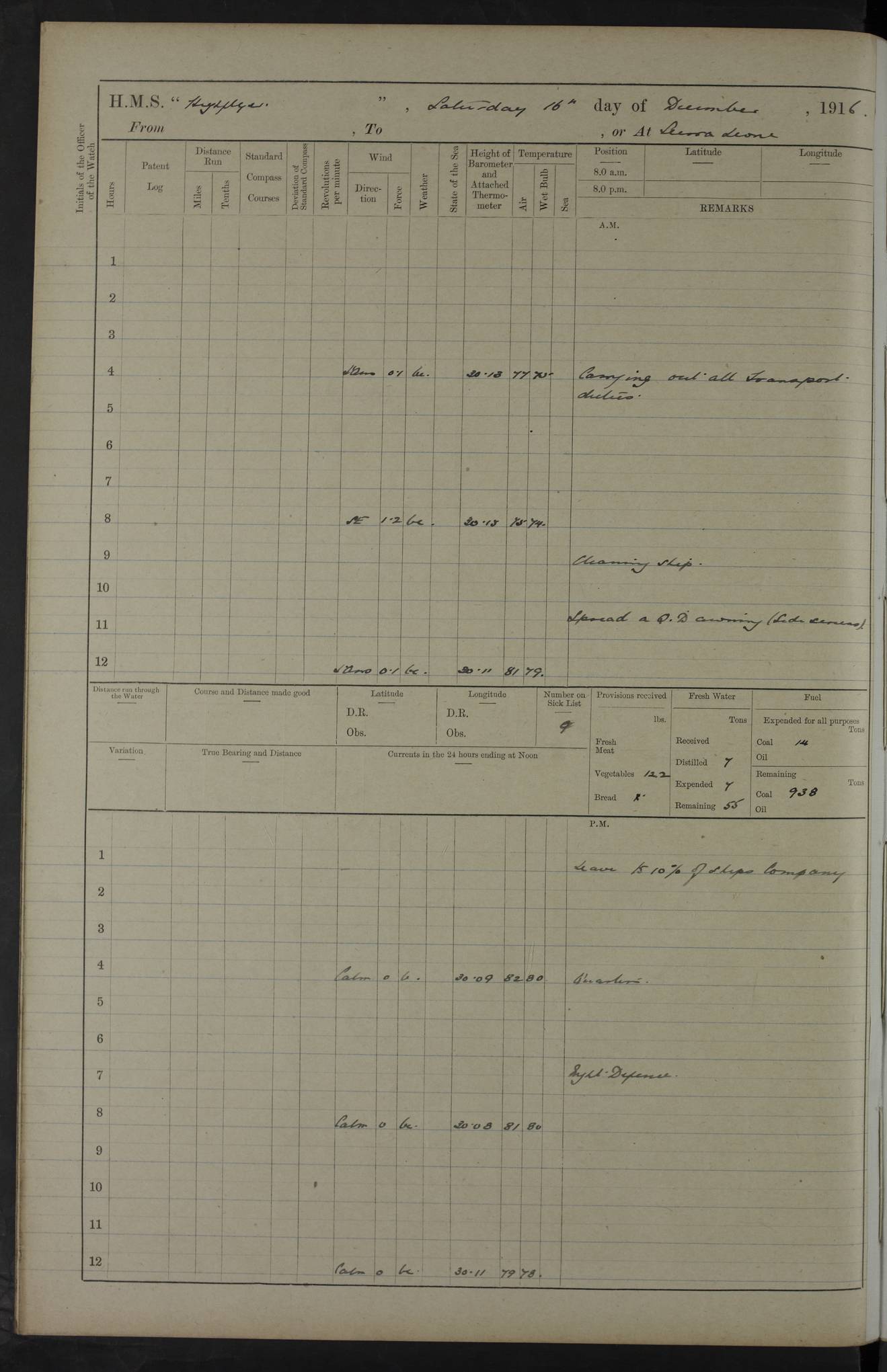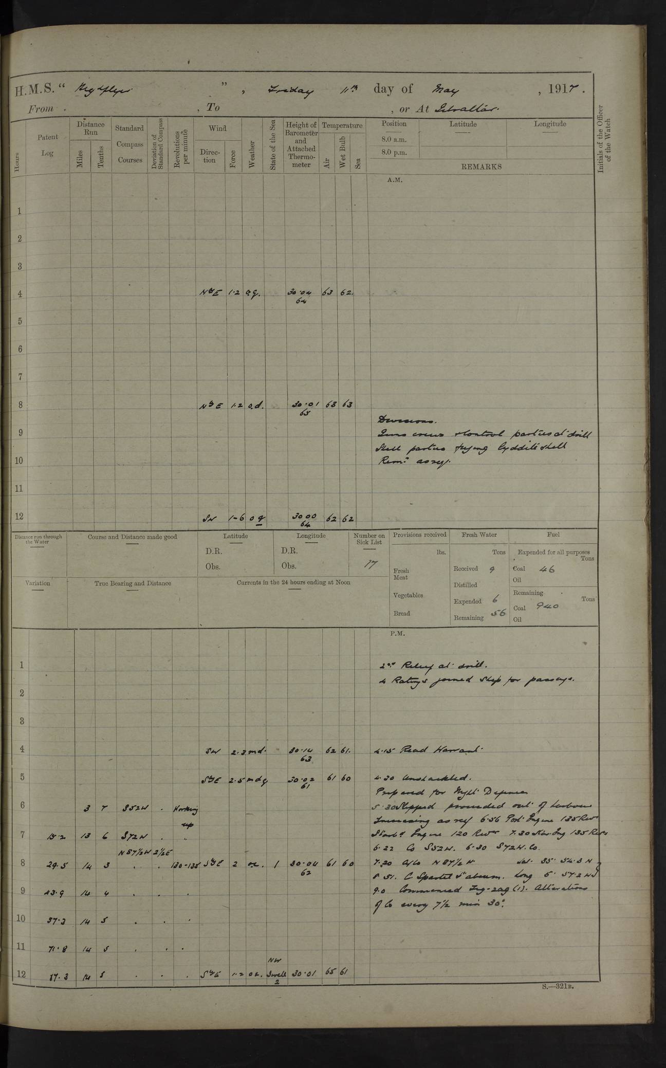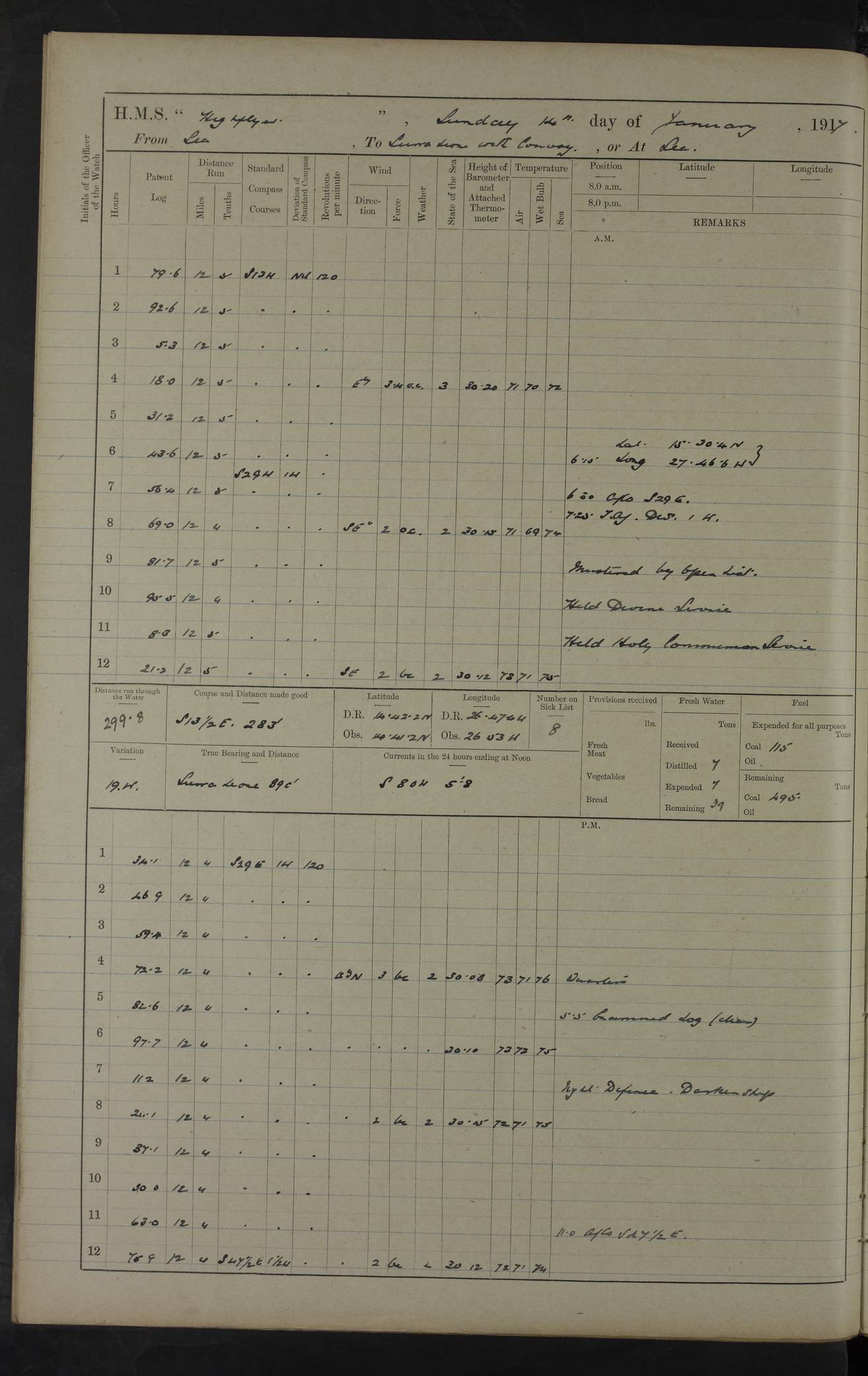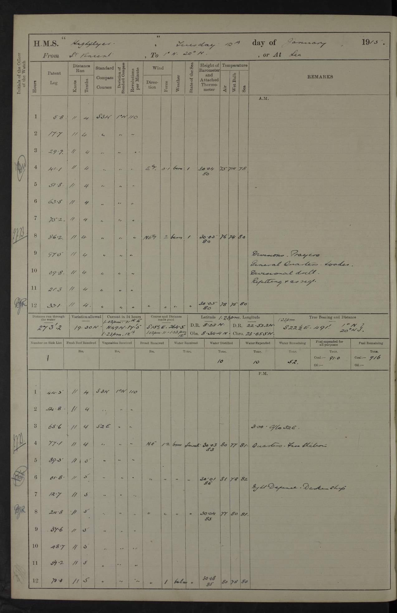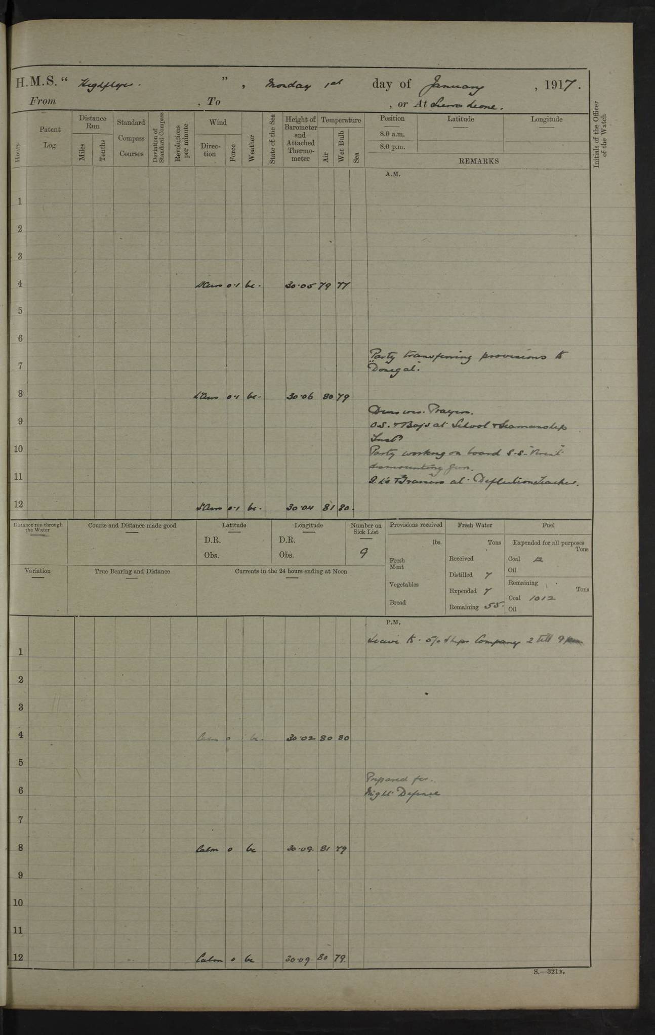 LOGS FOR JANUARY 1917 4ef4f321e53e0a0c91000902: (https://s3.amazonaws.com:443/oldweather/ADM53-44307/ADM 53-44307-129_1.jpg) 4ef4f321e53e0a0c91000903: (https://s3.amazonaws.com:443/oldweather/ADM53-44307/ADM 53-44307-130_0.jpg) 4ef4f321e53e0a0c91000904: (https://s3.amazonaws.com:443/oldweather/ADM53-44307/ADM 53-44307-130_1.jpg) 4ef4f321e53e0a0c91000905: (https://s3.amazonaws.com:443/oldweather/ADM53-44307/ADM 53-44307-131_0.jpg) 4ef4f321e53e0a0c91000906: (https://s3.amazonaws.com:443/oldweather/ADM53-44307/ADM 53-44307-131_1.jpg) 1 January 1917 Sierra Leone Lat 8.5, Long -13.2 6.30am: Party transferring provisions to DONEGAL. 10.00am: Party working on board SS VIRENT dismounting gun. 4ef4f321e53e0a0c91000907: (https://s3.amazonaws.com:443/oldweather/ADM53-44307/ADM 53-44307-132_0.jpg) 2 January 1917 Sierra Leone to St. Vincent Lat 8.7, Long -13.6 6.55am: SS ATLANTIC CITY came alongside. Coaling ship. 9.20am: Weighed and proceeded as requisite out of harbour. 4ef4f321e53e0a0c91000908: (https://s3.amazonaws.com:443/oldweather/ADM53-44307/ADM 53-44307-132_1.jpg) 3 January 1917 Sierra Leone to St. Vincent Lat 11.1, Long -17.7 2.30pm: Sighted SS on P bow steering to SE’d. 4ef4f321e53e0a0c91000909: (https://s3.amazonaws.com:443/oldweather/ADM53-44307/ADM 53-44307-133_0.jpg) 4 January 1917 Sierra Leone to St. Vincent Lat 13.8, Long -21.5 Boys and OS at school and seamanship instruction. Marines at drill. 11.30pm: Passing between St. Jago and Mayo Id. 4ef4f321e53e0a0c9100090a: (https://s3.amazonaws.com:443/oldweather/ADM53-44307/ADM 53-44307-133_1.jpg) 5 January 1917 Sierra Leone to St. Vincent Lat 16.8828, Long -25.0106 6.40am: Sighted San Nicholas Id. abeam. 11.58am: Came to SB 9 fathoms, 4½ shackles. 12.30pm: Lighters came alongside. 2.00pm: Coaling ship. 5.00pm: Stopped coaling for night. 4ef4f321e53e0a0c9100090b: (https://s3.amazonaws.com:443/oldweather/ADM53-44307/ADM 53-44307-134_0.jpg) 6 January 1917 St. Vincent Lat 16.8828, Long -25.0106 6.30am: Coaling ship from lighters. 12.30pm: Finished coaling; received 433 tons including deck cargo. 2.00pm: Prepared for sea. 4ef4f321e53e0a0c9100090c: (https://s3.amazonaws.com:443/oldweather/ADM53-44307/ADM 53-44307-134_1.jpg) 7 January 1917 St. Vincent to rendezvous to meet HMS Shannon and convoy Lat 17.4, Long -25.5 6.35am: Weighed and proceeded as requisite, 100 revs, to southward by San Antonio. 4ef4f321e53e0a0c9100090d: (https://s3.amazonaws.com:443/oldweather/ADM53-44307/ADM 53-44307-135_0.jpg) 8 January 1917 St. Vincent to meet HMS Shannon and convoy Lat 21.2, Long -26.3 9.30am: Party striking down coal. 4ef4f321e53e0a0c9100090e: (https://s3.amazonaws.com:443/oldweather/ADM53-44307/ADM 53-44307-135_1.jpg) 9 January 1917 St. Vincent to meet HMS Shannon and convoy Lat 23.9, Long -25.5 Cleaning ship. 9.00pm: Group closed up exercised during watch. 4ef4f322e53e0a0c9100090f: (https://s3.amazonaws.com:443/oldweather/ADM53-44307/ADM 53-44307-136_0.jpg) 10 January 1917 St. Vincent to meet HMS Shannon and convoy Lat 27.4, Long -25.1 2.00am: Groups closed up, exercised frequently during each watch. 6.30am: Sighted SS on southward beam steering NE’d. 4ef4f322e53e0a0c91000910: (https://s3.amazonaws.com:443/oldweather/ADM53-44307/ADM 53-44307-136_1.jpg) 11 January 1917 St. Vincent to meet HMS Shannon and convoy and to Sierra Leone Lat 29.7, Long -24.7 2.00am: Groups closed up, exercised frequently during each watch. 5.20am: Sighted SHANNON and convoy ahead – CARONIA, EMPRESS OF BRITAIN, WALMER CASTLE, TYNDAREUS, PAKEHA, NESTOR, CORINTHIC. 6.13am: Stopped. Communicated by boat with SHANNON. 6.25am: Course S17W. 115 rev. SHANNON proceeded NE’d., course as requisite to take up station with convoy. [A sketch is included showing the position of the ships. HIGHFLYER is in the middle of the front row with PAKEHA 10 cables to port and WALMER CASTLE 10 cables to starboard. NESTOR, then TYNDAREUS, follow PAKEHA. EMPRESS OF BRITAIN, then CARONIA, follow WALMER CASTLE. CORINTHIC is evenly spaced between TYNDAREUS and CARONIA.] 4ef4f322e53e0a0c91000911: (https://s3.amazonaws.com:443/oldweather/ADM53-44307/ADM 53-44307-137_0.jpg) 12 January 1917 To Sierra Leone with convoy Lat 23.9, Long -26.3 Guns’ crews closed up exercised frequently during day. Boys and OS to school and seamanship instruction. 4ef4f322e53e0a0c91000912: (https://s3.amazonaws.com:443/oldweather/ADM53-44307/ADM 53-44307-137_1.jpg) 13 January 1917 To Sierra Leone with convoy Lat 19.3, Long -28.0 3.57am: 80 rev. to allow TYNDAREUS to remedy engine defect. 4ef4f322e53e0a0c91000913: (https://s3.amazonaws.com:443/oldweather/ADM53-44307/ADM 53-44307-138_0.jpg) 14 January 1917 To Sierra Leone with convoy Lat 14.7, Long -26.9 9.00am: Mustered by Open List. 10.00am: Held Divine Service. 4ef4f322e53e0a0c91000914: (https://s3.amazonaws.com:443/oldweather/ADM53-44307/ADM 53-44307-138_1.jpg) 15 January 1917 To Sierra Leone with convoy Lat 12.3, Long -23.7 Party in stokehold trimming. 4ef4f322e53e0a0c91000915: (https://s3.amazonaws.com:443/oldweather/ADM53-44307/ADM 53-44307-139_0.jpg) 16 January 1917 To Sierra Leone with convoy Lat 10.4, Long -18.1 1.00pm: Hoisted colours half-mast. (Death on board EMPRESS OF BRITAIN.) 4ef4f322e53e0a0c91000916: (https://s3.amazonaws.com:443/oldweather/ADM53-44307/ADM 53-44307-139_1.jpg) 17 January 1917 To Sierra Leone with convoy Lat 8.5, Long -13.2 9.15am: Observed land ahead. Prepared for coaling. 10.40am: Formed single line ahead. 12.30pm: Transports proceeded independently to anchoring berths. 1.12pm: Came to with PB anchor in 10 fathoms, veered to 4 shackles, A3 berth. 5.30pm: SS MANSFIELD came alongside. 4ef4f322e53e0a0c91000917: (https://s3.amazonaws.com:443/oldweather/ADM53-44307/ADM 53-44307-140_0.jpg) 18 January 1917 Sierra Leone Lat 8.5, Long -13.2 6.00am: Commenced coaling. 2.15pm: Finished coaling; received 840 tons. 4ef4f322e53e0a0c91000918: (https://s3.amazonaws.com:443/oldweather/ADM53-44307/ADM 53-44307-140_1.jpg) 19 January 1917 Sierra Leone Lat 8.5, 