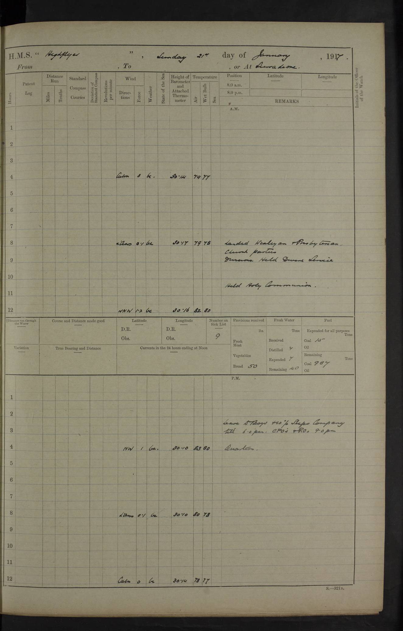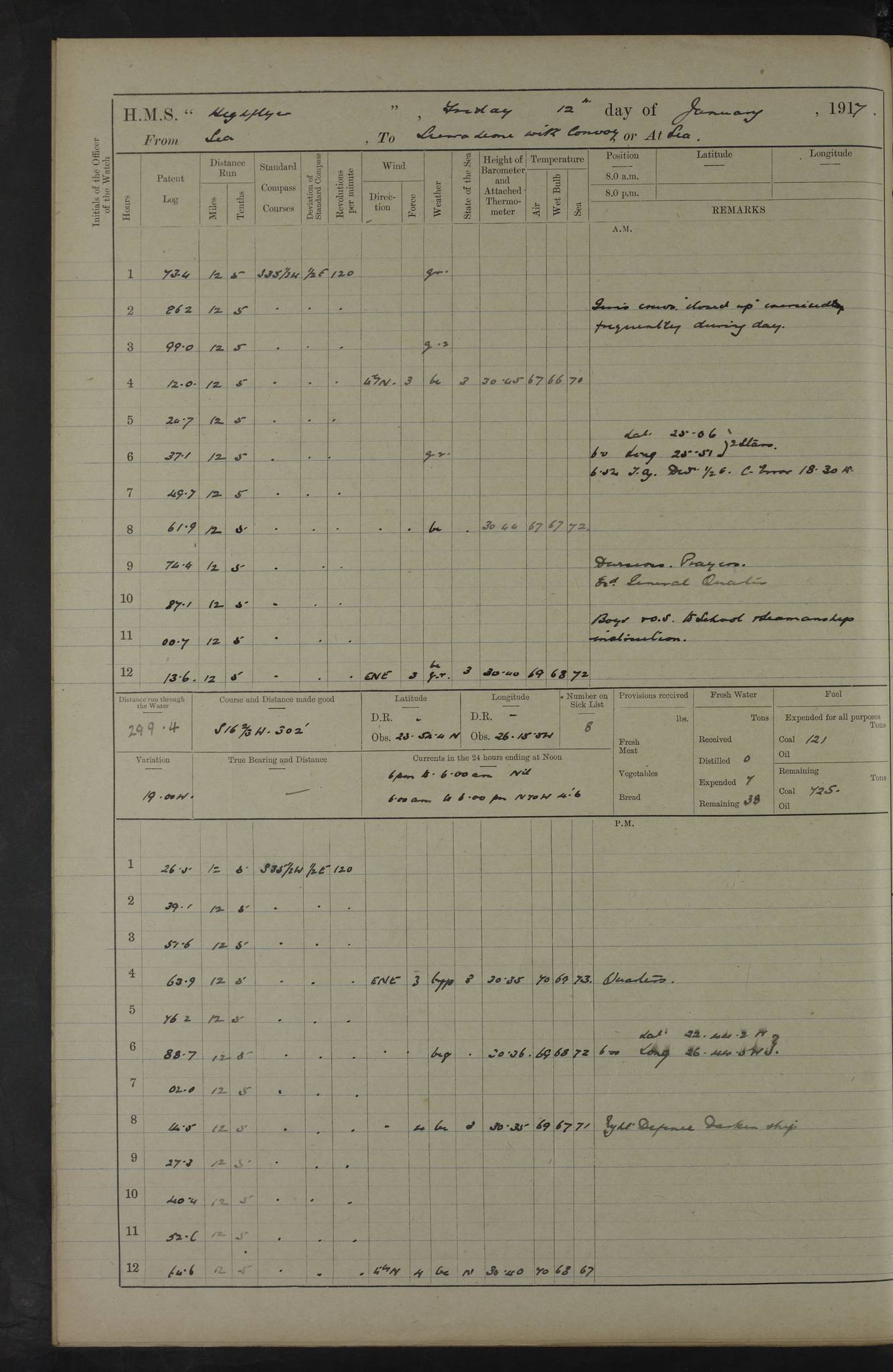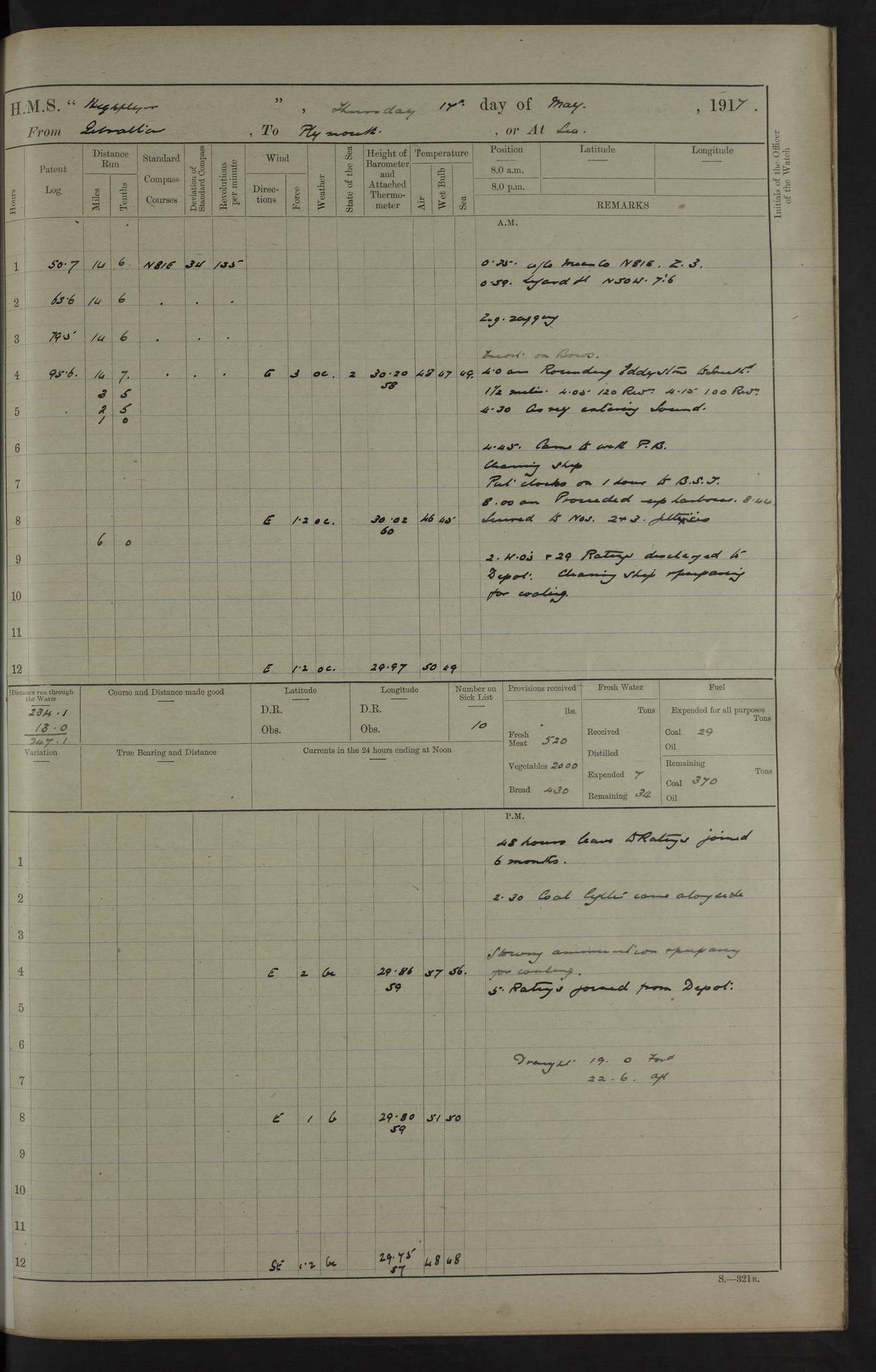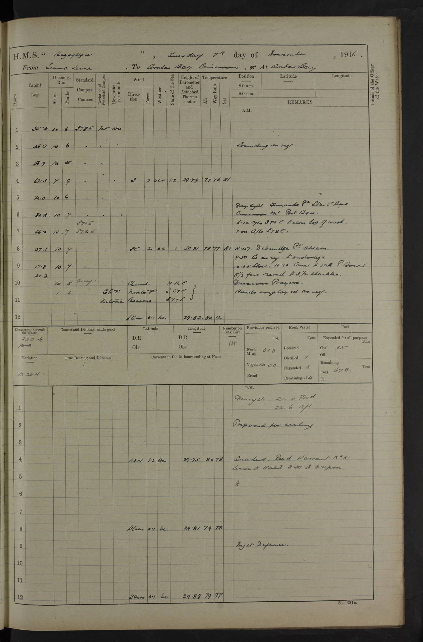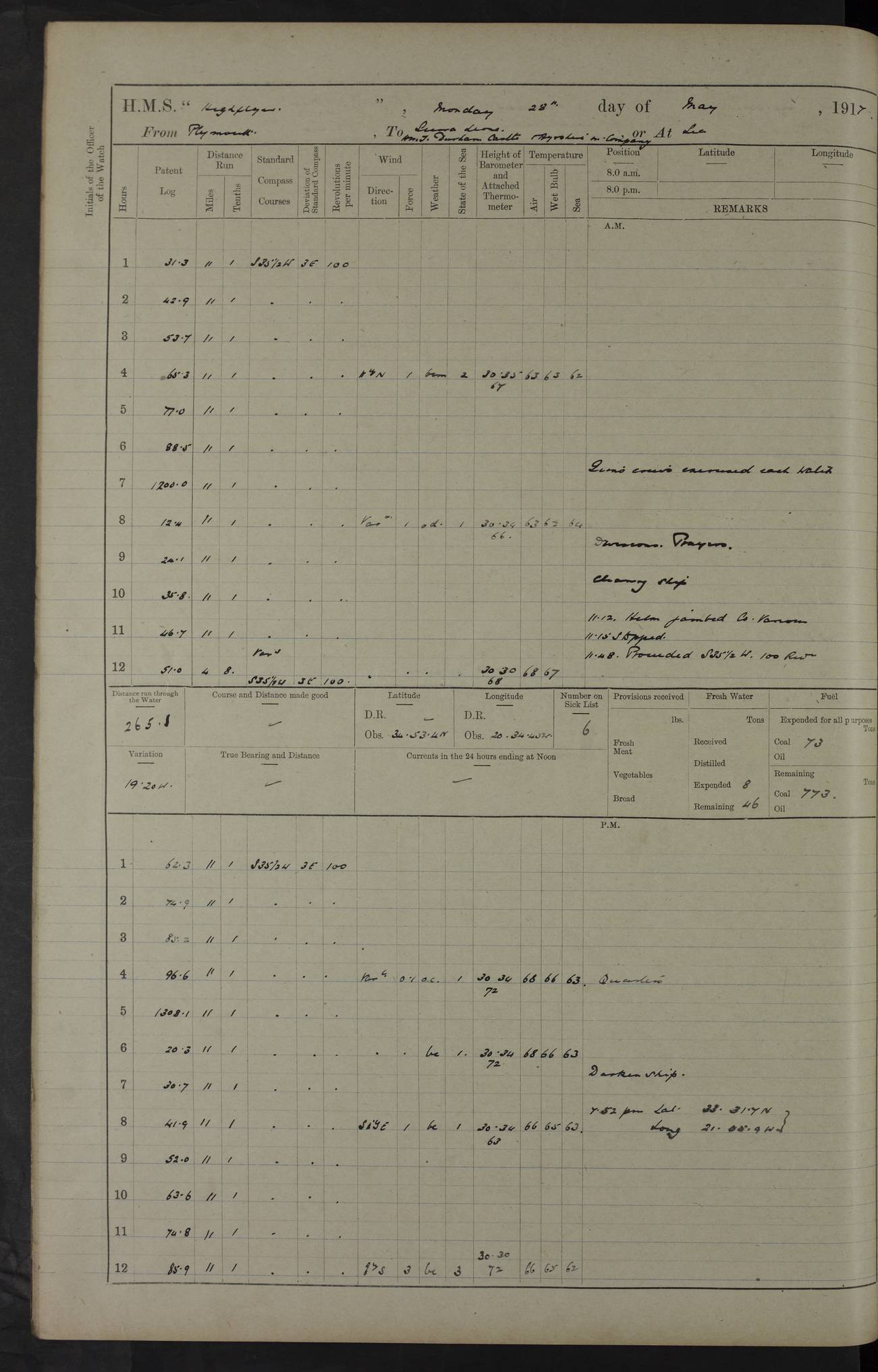 LOGS FOR JANUARY 1917 4ef4f321e53e0a0c91000902: (https://s3.amazonaws.com:443/oldweather/ADM53-44307/ADM 53-44307-129_1.jpg) 4ef4f321e53e0a0c91000903: (https://s3.amazonaws.com:443/oldweather/ADM53-44307/ADM 53-44307-130_0.jpg) 4ef4f321e53e0a0c91000904: (https://s3.amazonaws.com:443/oldweather/ADM53-44307/ADM 53-44307-130_1.jpg) 4ef4f321e53e0a0c91000905: (https://s3.amazonaws.com:443/oldweather/ADM53-44307/ADM 53-44307-131_0.jpg) 4ef4f321e53e0a0c91000906: (https://s3.amazonaws.com:443/oldweather/ADM53-44307/ADM 53-44307-131_1.jpg) 1 January 1917 Sierra Leone Lat 8.5, Long -13.2 6.30am: Party transferring provisions to DONEGAL. 10.00am: Party working on board SS VIRENT dismounting gun. 4ef4f321e53e0a0c91000907: (https://s3.amazonaws.com:443/oldweather/ADM53-44307/ADM 53-44307-132_0.jpg) 2 January 1917 Sierra Leone to St. Vincent Lat 8.7, Long -13.6 6.55am: SS ATLANTIC CITY came alongside. Coaling ship. 9.20am: Weighed and proceeded as requisite out of harbour. 4ef4f321e53e0a0c91000908: (https://s3.amazonaws.com:443/oldweather/ADM53-44307/ADM 53-44307-132_1.jpg) 3 January 1917 Sierra Leone to St. Vincent Lat 11.1, Long -17.7 2.30pm: Sighted SS on P bow steering to SE’d. 4ef4f321e53e0a0c91000909: (https://s3.amazonaws.com:443/oldweather/ADM53-44307/ADM 53-44307-133_0.jpg) 4 January 1917 Sierra Leone to St. Vincent Lat 13.8, Long -21.5 Boys and OS at school and seamanship instruction. Marines at drill. 11.30pm: Passing between St. Jago and Mayo Id. 4ef4f321e53e0a0c9100090a: (https://s3.amazonaws.com:443/oldweather/ADM53-44307/ADM 53-44307-133_1.jpg) 5 January 1917 Sierra Leone to St. Vincent Lat 16.8828, Long -25.0106 6.40am: Sighted San Nicholas Id. abeam. 11.58am: Came to SB 9 fathoms, 4½ shackles. 12.30pm: Lighters came alongside. 2.00pm: Coaling ship. 5.00pm: Stopped coaling for night. 4ef4f321e53e0a0c9100090b: (https://s3.amazonaws.com:443/oldweather/ADM53-44307/ADM 53-44307-134_0.jpg) 6 January 1917 St. Vincent Lat 16.8828, Long -25.0106 6.30am: Coaling ship from lighters. 12.30pm: Finished coaling; received 433 tons including deck cargo. 2.00pm: Prepared for sea. 4ef4f321e53e0a0c9100090c: (https://s3.amazonaws.com:443/oldweather/ADM53-44307/ADM 53-44307-134_1.jpg) 7 January 1917 St. Vincent to rendezvous to meet HMS Shannon and convoy Lat 17.4, Long -25.5 6.35am: Weighed and proceeded as requisite, 100 revs, to southward by San Antonio. 4ef4f321e53e0a0c9100090d: (https://s3.amazonaws.com:443/oldweather/ADM53-44307/ADM 53-44307-135_0.jpg) 8 January 1917 St. Vincent to meet HMS Shannon and convoy Lat 21.2, Long -26.3 9.30am: Party striking down coal. 4ef4f321e53e0a0c9100090e: (https://s3.amazonaws.com:443/oldweather/ADM53-44307/ADM 53-44307-135_1.jpg) 9 January 1917 St. Vincent to meet HMS Shannon and convoy Lat 23.9, Long -25.5 Cleaning ship. 9.00pm: Group closed up exercised during watch. 4ef4f322e53e0a0c9100090f: (https://s3.amazonaws.com:443/oldweather/ADM53-44307/ADM 53-44307-136_0.jpg) 10 January 1917 St. Vincent to meet HMS Shannon and convoy Lat 27.4, Long -25.1 2.00am: Groups closed up, exercised frequently during each watch. 6.30am: Sighted SS on southward beam steering NE’d. 4ef4f322e53e0a0c91000910: (https://s3.amazonaws.com:443/oldweather/ADM53-44307/ADM 53-44307-136_1.jpg) 11 January 1917 St. Vincent to meet HMS Shannon and convoy and to Sierra Leone Lat 29.7, Long -24.7 2.00am: Groups closed up, exercised frequently during each watch. 5.20am: Sighted SHANNON and convoy ahead – CARONIA, EMPRESS OF BRITAIN, WALMER CASTLE, TYNDAREUS, PAKEHA, NESTOR, CORINTHIC. 6.13am: Stopped. Communicated by boat with SHANNON. 6.25am: Course S17W. 115 rev. SHANNON proceeded NE’d., course as requisite to take up station with convoy. [A sketch is included showing the position of the ships. HIGHFLYER is in the middle of the front row with PAKEHA 10 cables to port and WALMER CASTLE 10 cables to starboard. NESTOR, then TYNDAREUS, follow PAKEHA. EMPRESS OF BRITAIN, then CARONIA, follow WALMER CASTLE. CORINTHIC is evenly spaced between TYNDAREUS and CARONIA.] 4ef4f322e53e0a0c91000911: (https://s3.amazonaws.com:443/oldweather/ADM53-44307/ADM 53-44307-137_0.jpg) 12 January 1917 To Sierra Leone with convoy Lat 23.9, Long -26.3 Guns’ crews closed up exercised frequently during day. Boys and OS to school and seamanship instruction. 4ef4f322e53e0a0c91000912: (https://s3.amazonaws.com:443/oldweather/ADM53-44307/ADM 53-44307-137_1.jpg) 13 January 1917 To Sierra Leone with convoy Lat 19.3, Long -28.0 3.57am: 80 rev. to allow TYNDAREUS to remedy engine defect. 4ef4f322e53e0a0c91000913: (https://s3.amazonaws.com:443/oldweather/ADM53-44307/ADM 53-44307-138_0.jpg) 14 January 1917 To Sierra Leone with convoy Lat 14.7, Long -26.9 9.00am: Mustered by Open List. 10.00am: Held Divine Service. 4ef4f322e53e0a0c91000914: (https://s3.amazonaws.com:443/oldweather/ADM53-44307/ADM 53-44307-138_1.jpg) 15 January 1917 To Sierra Leone with convoy Lat 12.3, Long -23.7 Party in stokehold trimming. 4ef4f322e53e0a0c91000915: (https://s3.amazonaws.com:443/oldweather/ADM53-44307/ADM 53-44307-139_0.jpg) 16 January 1917 To Sierra Leone with convoy Lat 10.4, Long -18.1 1.00pm: Hoisted colours half-mast. (Death on board EMPRESS OF BRITAIN.) 4ef4f322e53e0a0c91000916: (https://s3.amazonaws.com:443/oldweather/ADM53-44307/ADM 53-44307-139_1.jpg) 17 January 1917 To Sierra Leone with convoy Lat 8.5, Long -13.2 9.15am: Observed land ahead. Prepared for coaling. 10.40am: Formed single line ahead. 12.30pm: Transports proceeded independently to anchoring berths. 1.12pm: Came to with PB anchor in 10 fathoms, veered to 4 shackles, A3 berth. 5.30pm: SS MANSFIELD came alongside. 4ef4f322e53e0a0c91000917: (https://s3.amazonaws.com:443/oldweather/ADM53-44307/ADM 53-44307-140_0.jpg) 18 January 1917 Sierra Leone Lat 8.5, Long -13.2 6.00am: Commenced coaling. 2.15pm: Finished coaling; received 840 tons. 4ef4f322e53e0a0c91000918: (https://s3.amazonaws.com:443/oldweather/ADM53-44307/ADM 53-44307-140_1.jpg) 19 January 1917 Sierra Leone Lat 8.5, 