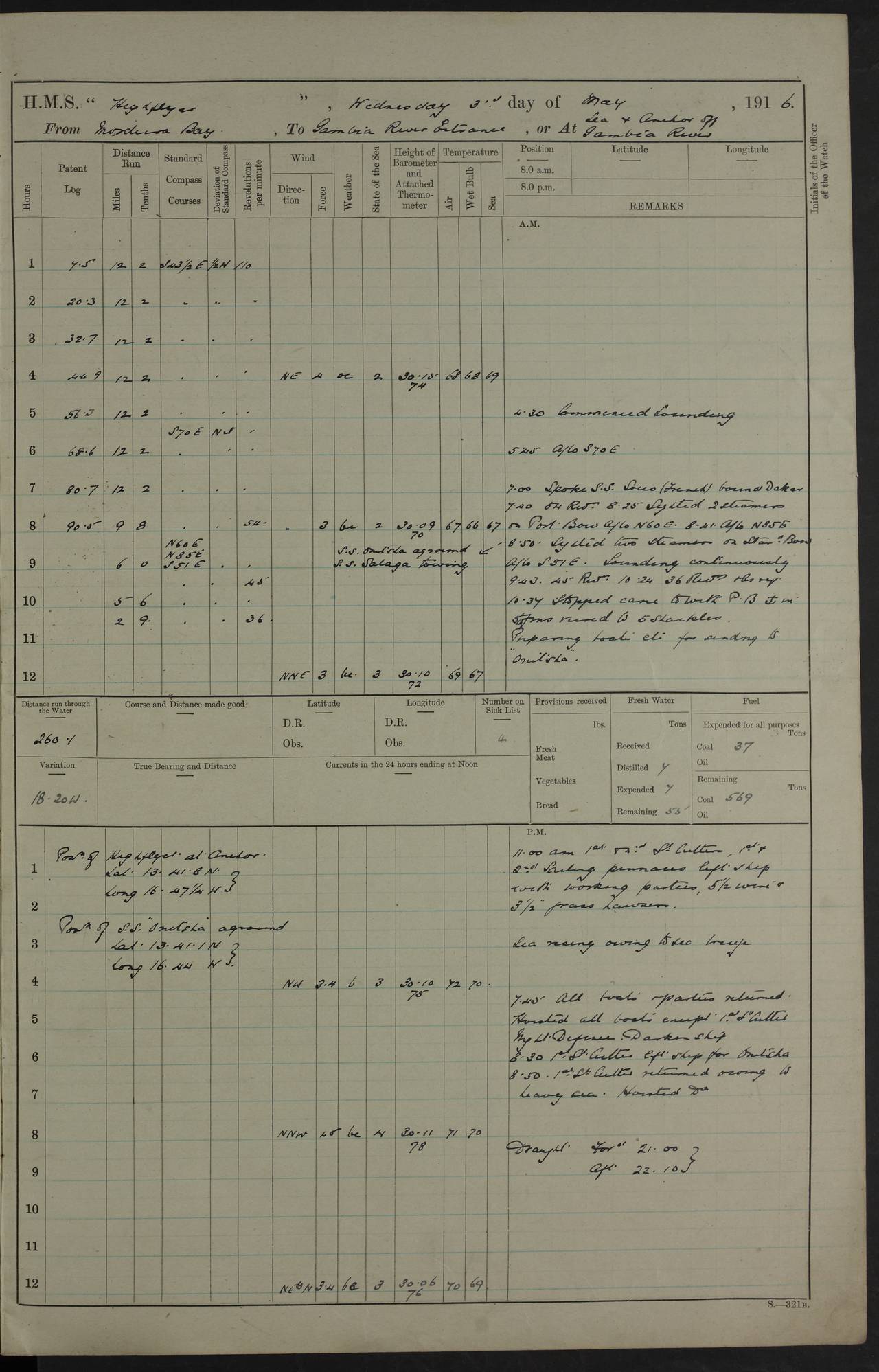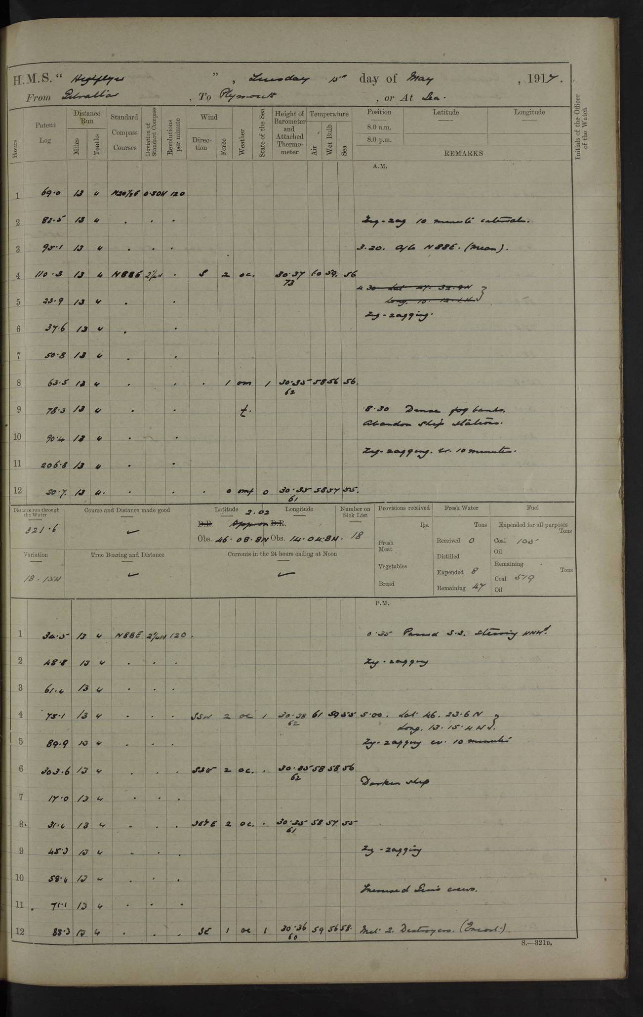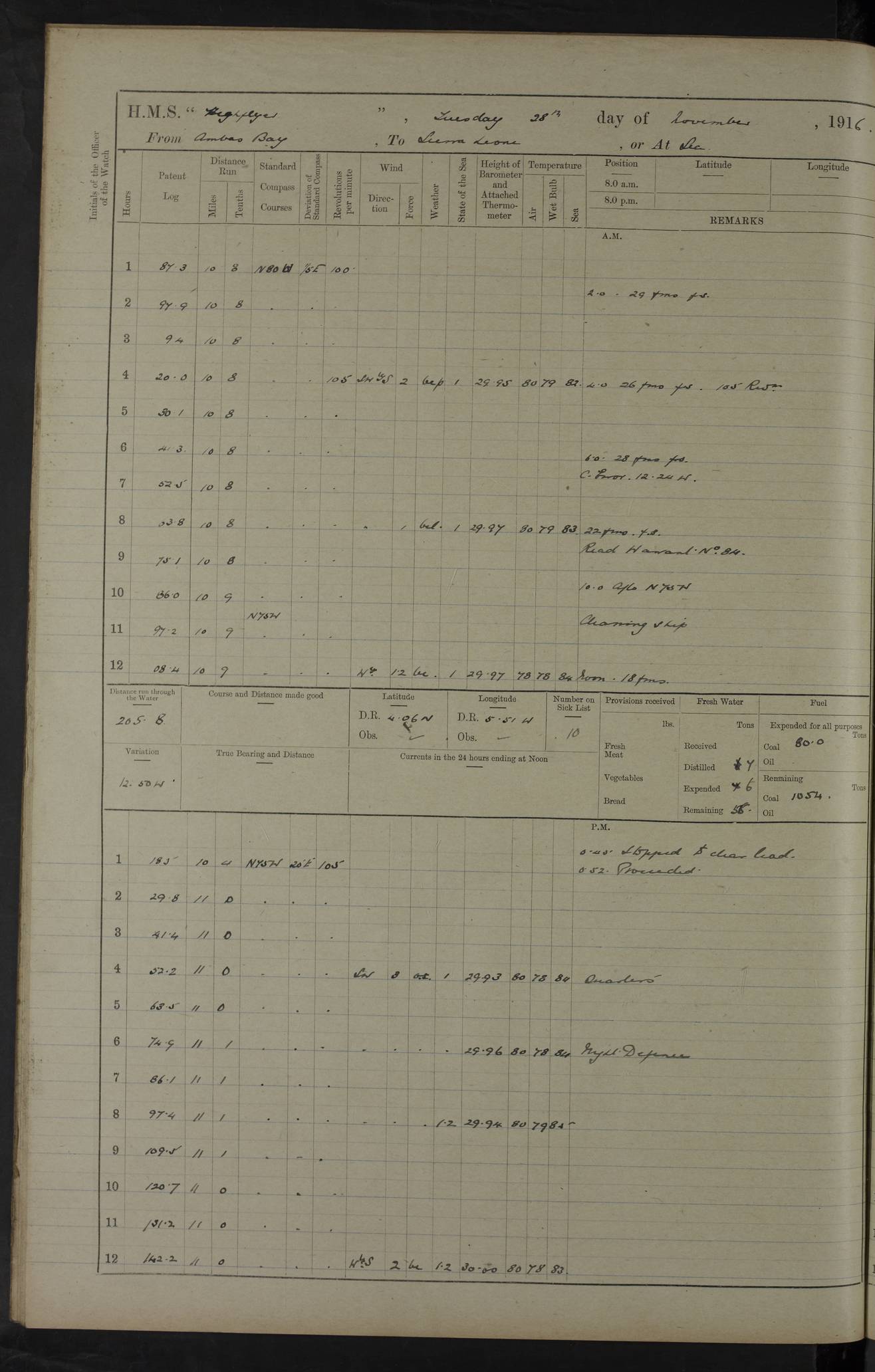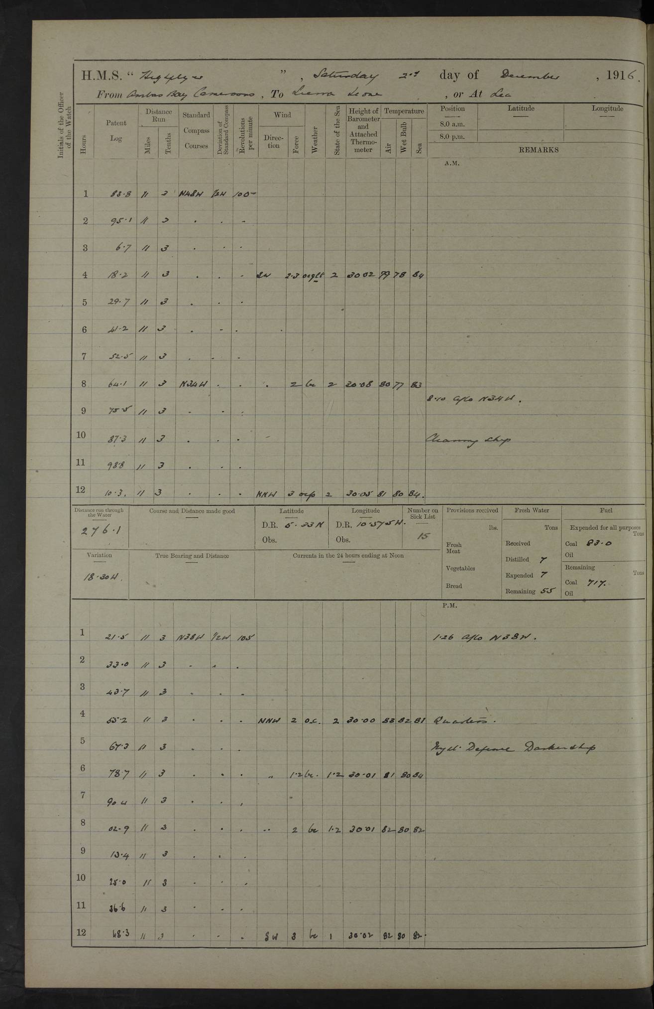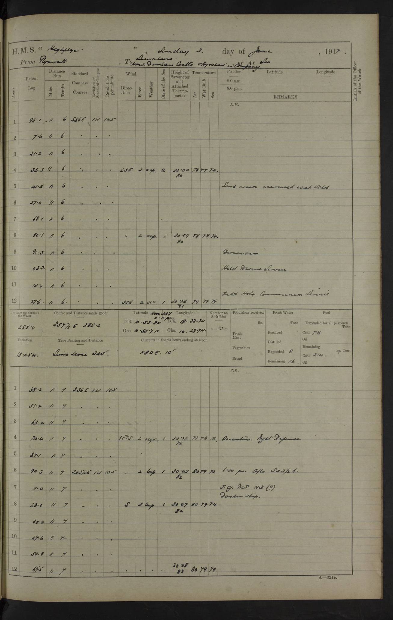 LOGS FOR JANUARY 1917 4ef4f321e53e0a0c91000902: (https://s3.amazonaws.com:443/oldweather/ADM53-44307/ADM 53-44307-129_1.jpg) 4ef4f321e53e0a0c91000903: (https://s3.amazonaws.com:443/oldweather/ADM53-44307/ADM 53-44307-130_0.jpg) 4ef4f321e53e0a0c91000904: (https://s3.amazonaws.com:443/oldweather/ADM53-44307/ADM 53-44307-130_1.jpg) 4ef4f321e53e0a0c91000905: (https://s3.amazonaws.com:443/oldweather/ADM53-44307/ADM 53-44307-131_0.jpg) 4ef4f321e53e0a0c91000906: (https://s3.amazonaws.com:443/oldweather/ADM53-44307/ADM 53-44307-131_1.jpg) 1 January 1917 Sierra Leone Lat 8.5, Long -13.2 6.30am: Party transferring provisions to DONEGAL. 10.00am: Party working on board SS VIRENT dismounting gun. 4ef4f321e53e0a0c91000907: (https://s3.amazonaws.com:443/oldweather/ADM53-44307/ADM 53-44307-132_0.jpg) 2 January 1917 Sierra Leone to St. Vincent Lat 8.7, Long -13.6 6.55am: SS ATLANTIC CITY came alongside. Coaling ship. 9.20am: Weighed and proceeded as requisite out of harbour. 4ef4f321e53e0a0c91000908: (https://s3.amazonaws.com:443/oldweather/ADM53-44307/ADM 53-44307-132_1.jpg) 3 January 1917 Sierra Leone to St. Vincent Lat 11.1, Long -17.7 2.30pm: Sighted SS on P bow steering to SE’d. 4ef4f321e53e0a0c91000909: (https://s3.amazonaws.com:443/oldweather/ADM53-44307/ADM 53-44307-133_0.jpg) 4 January 1917 Sierra Leone to St. Vincent Lat 13.8, Long -21.5 Boys and OS at school and seamanship instruction. Marines at drill. 11.30pm: Passing between St. Jago and Mayo Id. 4ef4f321e53e0a0c9100090a: (https://s3.amazonaws.com:443/oldweather/ADM53-44307/ADM 53-44307-133_1.jpg) 5 January 1917 Sierra Leone to St. Vincent Lat 16.8828, Long -25.0106 6.40am: Sighted San Nicholas Id. abeam. 11.58am: Came to SB 9 fathoms, 4½ shackles. 12.30pm: Lighters came alongside. 2.00pm: Coaling ship. 5.00pm: Stopped coaling for night. 4ef4f321e53e0a0c9100090b: (https://s3.amazonaws.com:443/oldweather/ADM53-44307/ADM 53-44307-134_0.jpg) 6 January 1917 St. Vincent Lat 16.8828, Long -25.0106 6.30am: Coaling ship from lighters. 12.30pm: Finished coaling; received 433 tons including deck cargo. 2.00pm: Prepared for sea. 4ef4f321e53e0a0c9100090c: (https://s3.amazonaws.com:443/oldweather/ADM53-44307/ADM 53-44307-134_1.jpg) 7 January 1917 St. Vincent to rendezvous to meet HMS Shannon and convoy Lat 17.4, Long -25.5 6.35am: Weighed and proceeded as requisite, 100 revs, to southward by San Antonio. 4ef4f321e53e0a0c9100090d: (https://s3.amazonaws.com:443/oldweather/ADM53-44307/ADM 53-44307-135_0.jpg) 8 January 1917 St. Vincent to meet HMS Shannon and convoy Lat 21.2, Long -26.3 9.30am: Party striking down coal. 4ef4f321e53e0a0c9100090e: (https://s3.amazonaws.com:443/oldweather/ADM53-44307/ADM 53-44307-135_1.jpg) 9 January 1917 St. Vincent to meet HMS Shannon and convoy Lat 23.9, Long -25.5 Cleaning ship. 9.00pm: Group closed up exercised during watch. 4ef4f322e53e0a0c9100090f: (https://s3.amazonaws.com:443/oldweather/ADM53-44307/ADM 53-44307-136_0.jpg) 10 January 1917 St. Vincent to meet HMS Shannon and convoy Lat 27.4, Long -25.1 2.00am: Groups closed up, exercised frequently during each watch. 6.30am: Sighted SS on southward beam steering NE’d. 4ef4f322e53e0a0c91000910: (https://s3.amazonaws.com:443/oldweather/ADM53-44307/ADM 53-44307-136_1.jpg) 11 January 1917 St. Vincent to meet HMS Shannon and convoy and to Sierra Leone Lat 29.7, Long -24.7 2.00am: Groups closed up, exercised frequently during each watch. 5.20am: Sighted SHANNON and convoy ahead – CARONIA, EMPRESS OF BRITAIN, WALMER CASTLE, TYNDAREUS, PAKEHA, NESTOR, CORINTHIC. 6.13am: Stopped. Communicated by boat with SHANNON. 6.25am: Course S17W. 115 rev. SHANNON proceeded NE’d., course as requisite to take up station with convoy. [A sketch is included showing the position of the ships. HIGHFLYER is in the middle of the front row with PAKEHA 10 cables to port and WALMER CASTLE 10 cables to starboard. NESTOR, then TYNDAREUS, follow PAKEHA. EMPRESS OF BRITAIN, then CARONIA, follow WALMER CASTLE. CORINTHIC is evenly spaced between TYNDAREUS and CARONIA.] 4ef4f322e53e0a0c91000911: (https://s3.amazonaws.com:443/oldweather/ADM53-44307/ADM 53-44307-137_0.jpg) 12 January 1917 To Sierra Leone with convoy Lat 23.9, Long -26.3 Guns’ crews closed up exercised frequently during day. Boys and OS to school and seamanship instruction. 4ef4f322e53e0a0c91000912: (https://s3.amazonaws.com:443/oldweather/ADM53-44307/ADM 53-44307-137_1.jpg) 13 January 1917 To Sierra Leone with convoy Lat 19.3, Long -28.0 3.57am: 80 rev. to allow TYNDAREUS to remedy engine defect. 4ef4f322e53e0a0c91000913: (https://s3.amazonaws.com:443/oldweather/ADM53-44307/ADM 53-44307-138_0.jpg) 14 January 1917 To Sierra Leone with convoy Lat 14.7, Long -26.9 9.00am: Mustered by Open List. 10.00am: Held Divine Service. 4ef4f322e53e0a0c91000914: (https://s3.amazonaws.com:443/oldweather/ADM53-44307/ADM 53-44307-138_1.jpg) 15 January 1917 To Sierra Leone with convoy Lat 12.3, Long -23.7 Party in stokehold trimming. 4ef4f322e53e0a0c91000915: (https://s3.amazonaws.com:443/oldweather/ADM53-44307/ADM 53-44307-139_0.jpg) 16 January 1917 To Sierra Leone with convoy Lat 10.4, Long -18.1 1.00pm: Hoisted colours half-mast. (Death on board EMPRESS OF BRITAIN.) 4ef4f322e53e0a0c91000916: (https://s3.amazonaws.com:443/oldweather/ADM53-44307/ADM 53-44307-139_1.jpg) 17 January 1917 To Sierra Leone with convoy Lat 8.5, Long -13.2 9.15am: Observed land ahead. Prepared for coaling. 10.40am: Formed single line ahead. 12.30pm: Transports proceeded independently to anchoring berths. 1.12pm: Came to with PB anchor in 10 fathoms, veered to 4 shackles, A3 berth. 5.30pm: SS MANSFIELD came alongside. 4ef4f322e53e0a0c91000917: (https://s3.amazonaws.com:443/oldweather/ADM53-44307/ADM 53-44307-140_0.jpg) 18 January 1917 Sierra Leone Lat 8.5, Long -13.2 6.00am: Commenced coaling. 2.15pm: Finished coaling; received 840 tons. 4ef4f322e53e0a0c91000918: (https://s3.amazonaws.com:443/oldweather/ADM53-44307/ADM 53-44307-140_1.jpg) 19 January 1917 Sierra Leone Lat 8.5, 