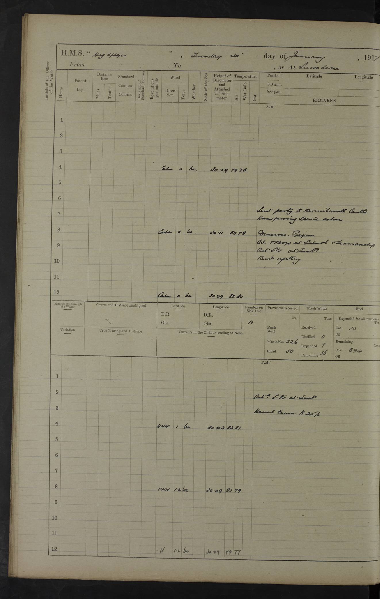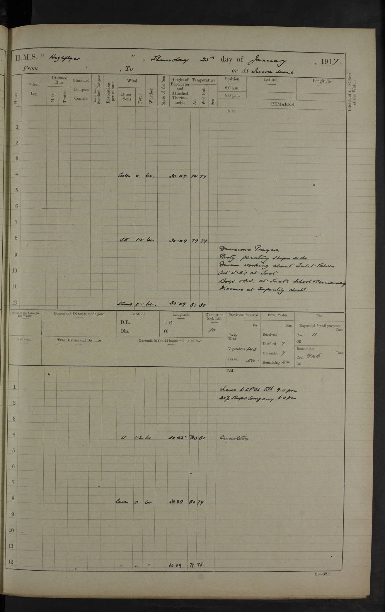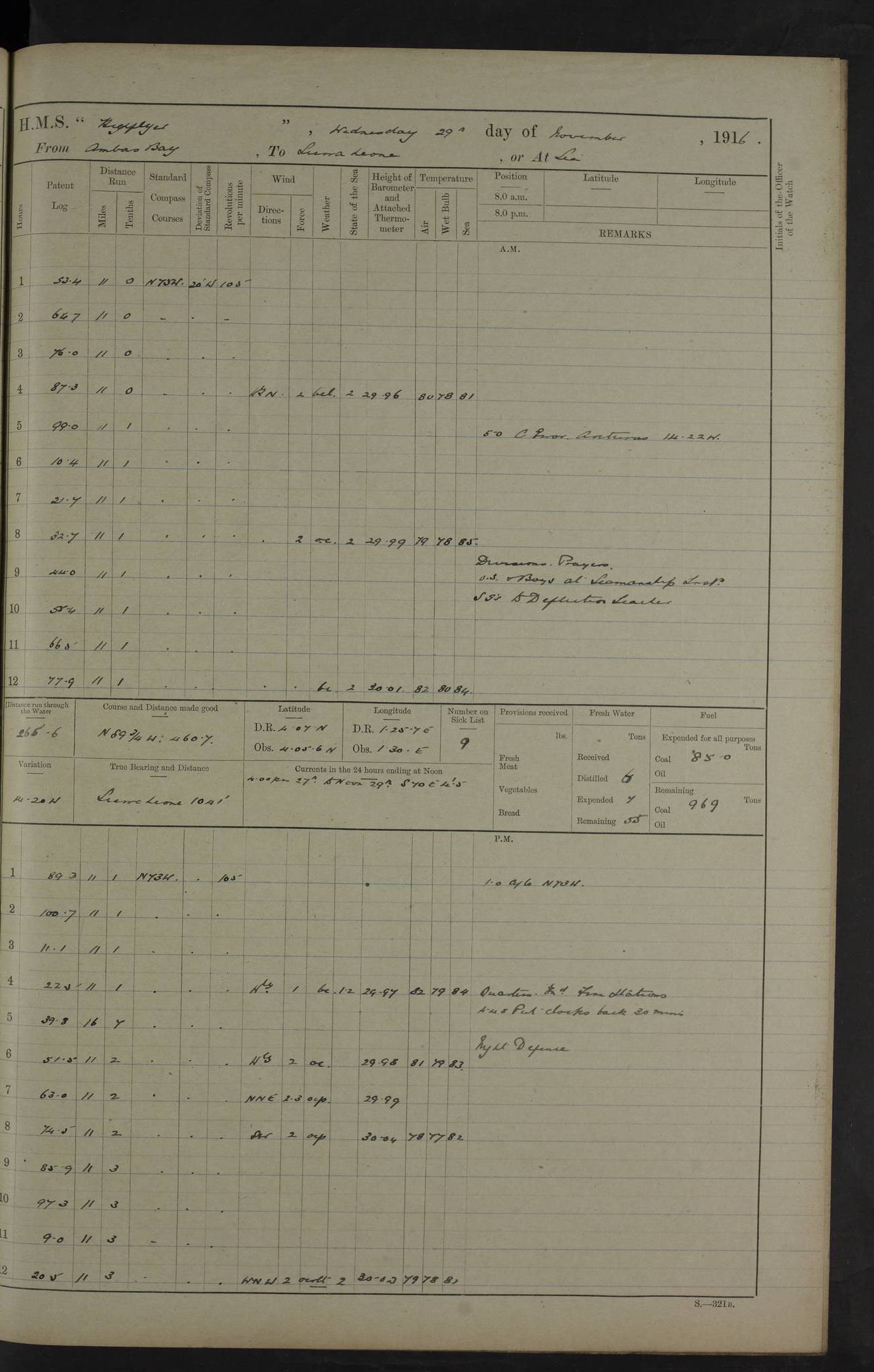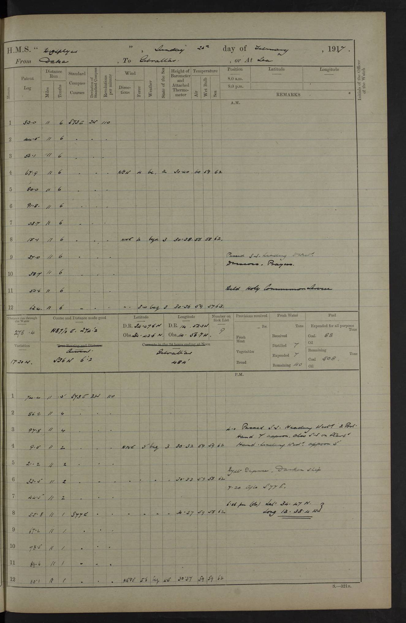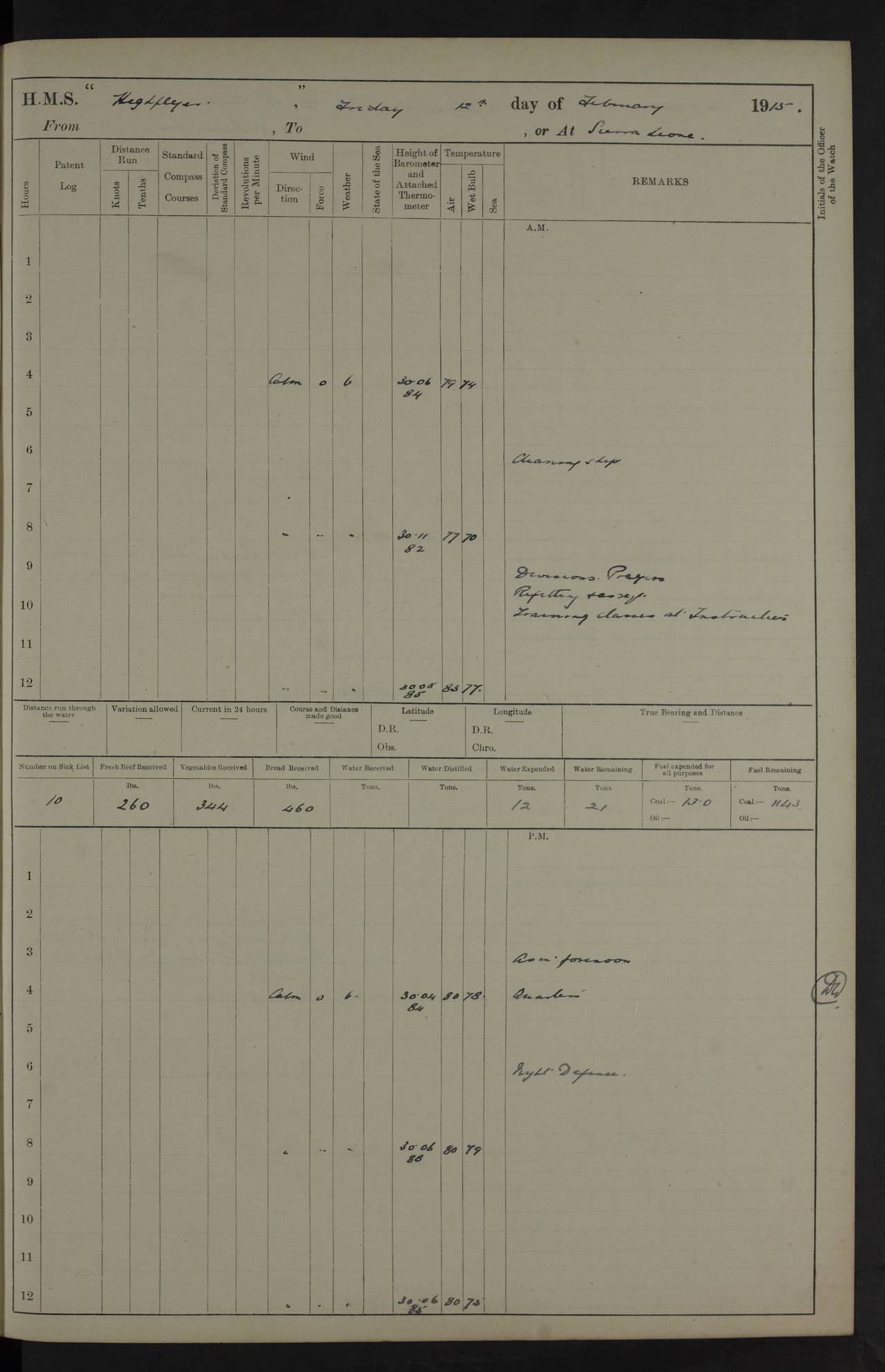 LOGS FOR JANUARY 1917 4ef4f321e53e0a0c91000902: (https://s3.amazonaws.com:443/oldweather/ADM53-44307/ADM 53-44307-129_1.jpg) 4ef4f321e53e0a0c91000903: (https://s3.amazonaws.com:443/oldweather/ADM53-44307/ADM 53-44307-130_0.jpg) 4ef4f321e53e0a0c91000904: (https://s3.amazonaws.com:443/oldweather/ADM53-44307/ADM 53-44307-130_1.jpg) 4ef4f321e53e0a0c91000905: (https://s3.amazonaws.com:443/oldweather/ADM53-44307/ADM 53-44307-131_0.jpg) 4ef4f321e53e0a0c91000906: (https://s3.amazonaws.com:443/oldweather/ADM53-44307/ADM 53-44307-131_1.jpg) 1 January 1917 Sierra Leone Lat 8.5, Long -13.2 6.30am: Party transferring provisions to DONEGAL. 10.00am: Party working on board SS VIRENT dismounting gun. 4ef4f321e53e0a0c91000907: (https://s3.amazonaws.com:443/oldweather/ADM53-44307/ADM 53-44307-132_0.jpg) 2 January 1917 Sierra Leone to St. Vincent Lat 8.7, Long -13.6 6.55am: SS ATLANTIC CITY came alongside. Coaling ship. 9.20am: Weighed and proceeded as requisite out of harbour. 4ef4f321e53e0a0c91000908: (https://s3.amazonaws.com:443/oldweather/ADM53-44307/ADM 53-44307-132_1.jpg) 3 January 1917 Sierra Leone to St. Vincent Lat 11.1, Long -17.7 2.30pm: Sighted SS on P bow steering to SE’d. 4ef4f321e53e0a0c91000909: (https://s3.amazonaws.com:443/oldweather/ADM53-44307/ADM 53-44307-133_0.jpg) 4 January 1917 Sierra Leone to St. Vincent Lat 13.8, Long -21.5 Boys and OS at school and seamanship instruction. Marines at drill. 11.30pm: Passing between St. Jago and Mayo Id. 4ef4f321e53e0a0c9100090a: (https://s3.amazonaws.com:443/oldweather/ADM53-44307/ADM 53-44307-133_1.jpg) 5 January 1917 Sierra Leone to St. Vincent Lat 16.8828, Long -25.0106 6.40am: Sighted San Nicholas Id. abeam. 11.58am: Came to SB 9 fathoms, 4½ shackles. 12.30pm: Lighters came alongside. 2.00pm: Coaling ship. 5.00pm: Stopped coaling for night. 4ef4f321e53e0a0c9100090b: (https://s3.amazonaws.com:443/oldweather/ADM53-44307/ADM 53-44307-134_0.jpg) 6 January 1917 St. Vincent Lat 16.8828, Long -25.0106 6.30am: Coaling ship from lighters. 12.30pm: Finished coaling; received 433 tons including deck cargo. 2.00pm: Prepared for sea. 4ef4f321e53e0a0c9100090c: (https://s3.amazonaws.com:443/oldweather/ADM53-44307/ADM 53-44307-134_1.jpg) 7 January 1917 St. Vincent to rendezvous to meet HMS Shannon and convoy Lat 17.4, Long -25.5 6.35am: Weighed and proceeded as requisite, 100 revs, to southward by San Antonio. 4ef4f321e53e0a0c9100090d: (https://s3.amazonaws.com:443/oldweather/ADM53-44307/ADM 53-44307-135_0.jpg) 8 January 1917 St. Vincent to meet HMS Shannon and convoy Lat 21.2, Long -26.3 9.30am: Party striking down coal. 4ef4f321e53e0a0c9100090e: (https://s3.amazonaws.com:443/oldweather/ADM53-44307/ADM 53-44307-135_1.jpg) 9 January 1917 St. Vincent to meet HMS Shannon and convoy Lat 23.9, Long -25.5 Cleaning ship. 9.00pm: Group closed up exercised during watch. 4ef4f322e53e0a0c9100090f: (https://s3.amazonaws.com:443/oldweather/ADM53-44307/ADM 53-44307-136_0.jpg) 10 January 1917 St. Vincent to meet HMS Shannon and convoy Lat 27.4, Long -25.1 2.00am: Groups closed up, exercised frequently during each watch. 6.30am: Sighted SS on southward beam steering NE’d. 4ef4f322e53e0a0c91000910: (https://s3.amazonaws.com:443/oldweather/ADM53-44307/ADM 53-44307-136_1.jpg) 11 January 1917 St. Vincent to meet HMS Shannon and convoy and to Sierra Leone Lat 29.7, Long -24.7 2.00am: Groups closed up, exercised frequently during each watch. 5.20am: Sighted SHANNON and convoy ahead – CARONIA, EMPRESS OF BRITAIN, WALMER CASTLE, TYNDAREUS, PAKEHA, NESTOR, CORINTHIC. 6.13am: Stopped. Communicated by boat with SHANNON. 6.25am: Course S17W. 115 rev. SHANNON proceeded NE’d., course as requisite to take up station with convoy. [A sketch is included showing the position of the ships. HIGHFLYER is in the middle of the front row with PAKEHA 10 cables to port and WALMER CASTLE 10 cables to starboard. NESTOR, then TYNDAREUS, follow PAKEHA. EMPRESS OF BRITAIN, then CARONIA, follow WALMER CASTLE. CORINTHIC is evenly spaced between TYNDAREUS and CARONIA.] 4ef4f322e53e0a0c91000911: (https://s3.amazonaws.com:443/oldweather/ADM53-44307/ADM 53-44307-137_0.jpg) 12 January 1917 To Sierra Leone with convoy Lat 23.9, Long -26.3 Guns’ crews closed up exercised frequently during day. Boys and OS to school and seamanship instruction. 4ef4f322e53e0a0c91000912: (https://s3.amazonaws.com:443/oldweather/ADM53-44307/ADM 53-44307-137_1.jpg) 13 January 1917 To Sierra Leone with convoy Lat 19.3, Long -28.0 3.57am: 80 rev. to allow TYNDAREUS to remedy engine defect. 4ef4f322e53e0a0c91000913: (https://s3.amazonaws.com:443/oldweather/ADM53-44307/ADM 53-44307-138_0.jpg) 14 January 1917 To Sierra Leone with convoy Lat 14.7, Long -26.9 9.00am: Mustered by Open List. 10.00am: Held Divine Service. 4ef4f322e53e0a0c91000914: (https://s3.amazonaws.com:443/oldweather/ADM53-44307/ADM 53-44307-138_1.jpg) 15 January 1917 To Sierra Leone with convoy Lat 12.3, Long -23.7 Party in stokehold trimming. 4ef4f322e53e0a0c91000915: (https://s3.amazonaws.com:443/oldweather/ADM53-44307/ADM 53-44307-139_0.jpg) 16 January 1917 To Sierra Leone with convoy Lat 10.4, Long -18.1 1.00pm: Hoisted colours half-mast. (Death on board EMPRESS OF BRITAIN.) 4ef4f322e53e0a0c91000916: (https://s3.amazonaws.com:443/oldweather/ADM53-44307/ADM 53-44307-139_1.jpg) 17 January 1917 To Sierra Leone with convoy Lat 8.5, Long -13.2 9.15am: Observed land ahead. Prepared for coaling. 10.40am: Formed single line ahead. 12.30pm: Transports proceeded independently to anchoring berths. 1.12pm: Came to with PB anchor in 10 fathoms, veered to 4 shackles, A3 berth. 5.30pm: SS MANSFIELD came alongside. 4ef4f322e53e0a0c91000917: (https://s3.amazonaws.com:443/oldweather/ADM53-44307/ADM 53-44307-140_0.jpg) 18 January 1917 Sierra Leone Lat 8.5, Long -13.2 6.00am: Commenced coaling. 2.15pm: Finished coaling; received 840 tons. 4ef4f322e53e0a0c91000918: (https://s3.amazonaws.com:443/oldweather/ADM53-44307/ADM 53-44307-140_1.jpg) 19 January 1917 Sierra Leone Lat 8.5, 