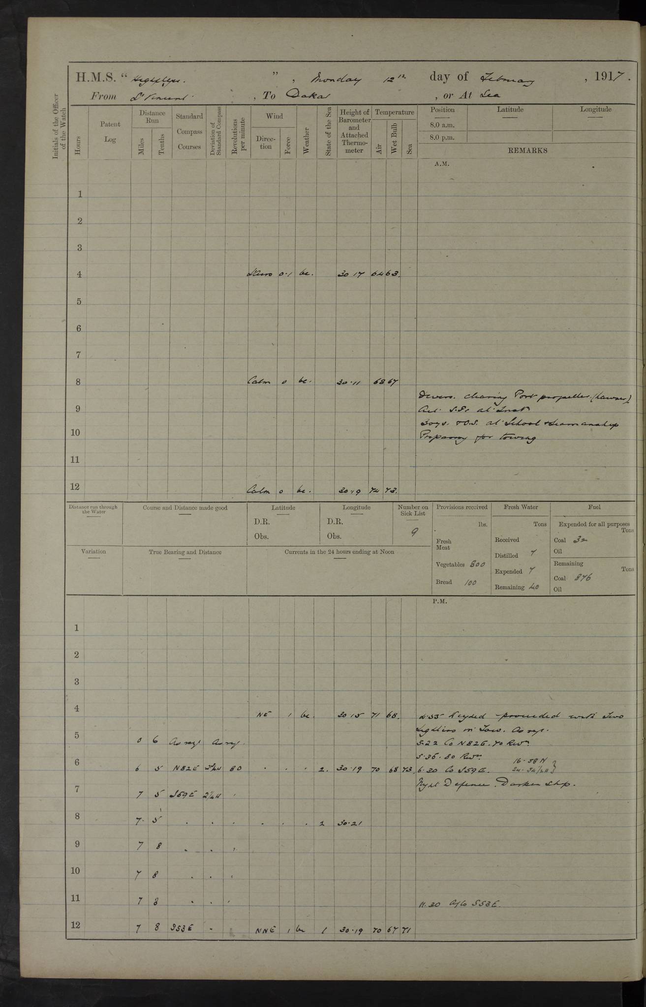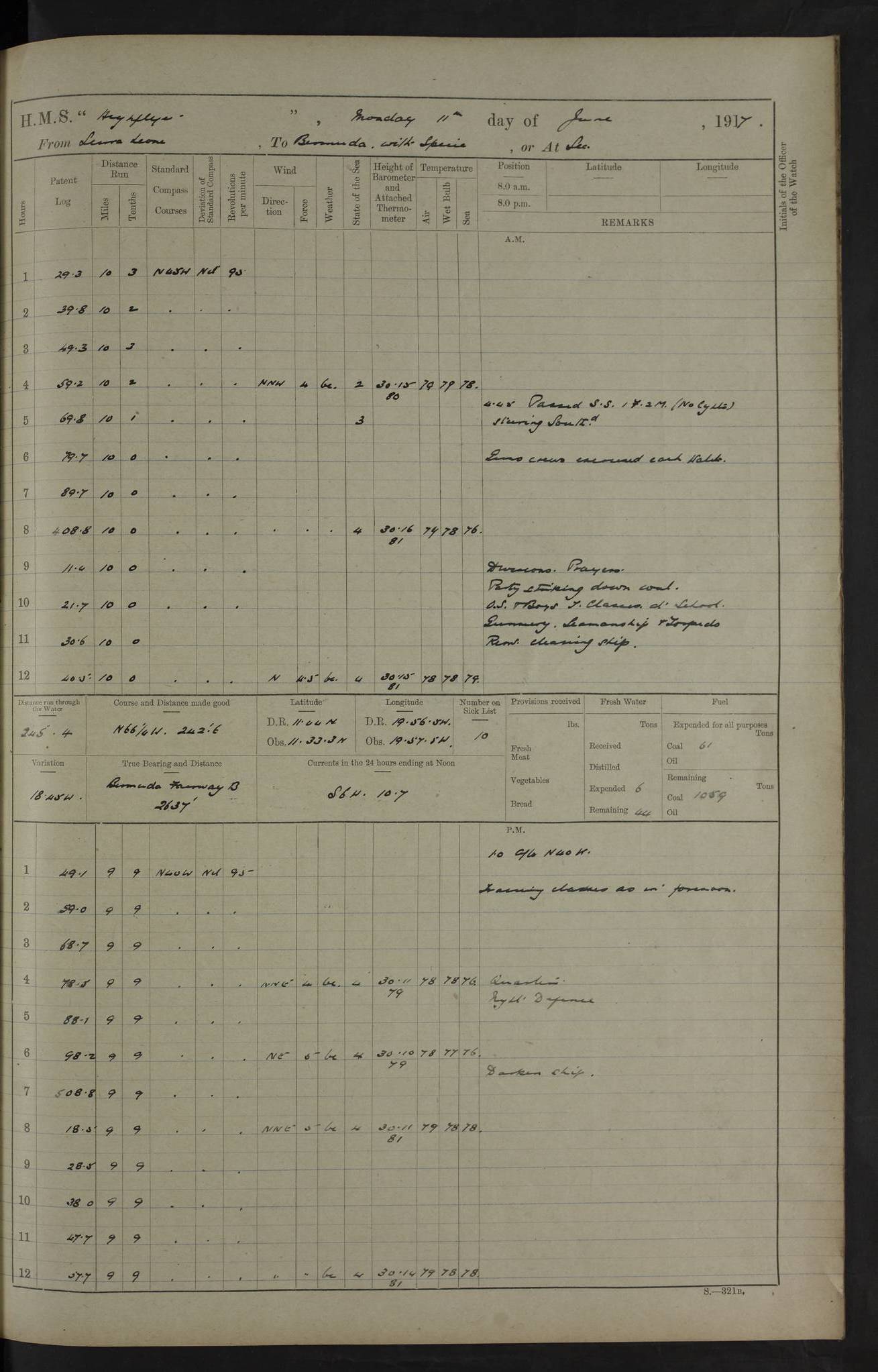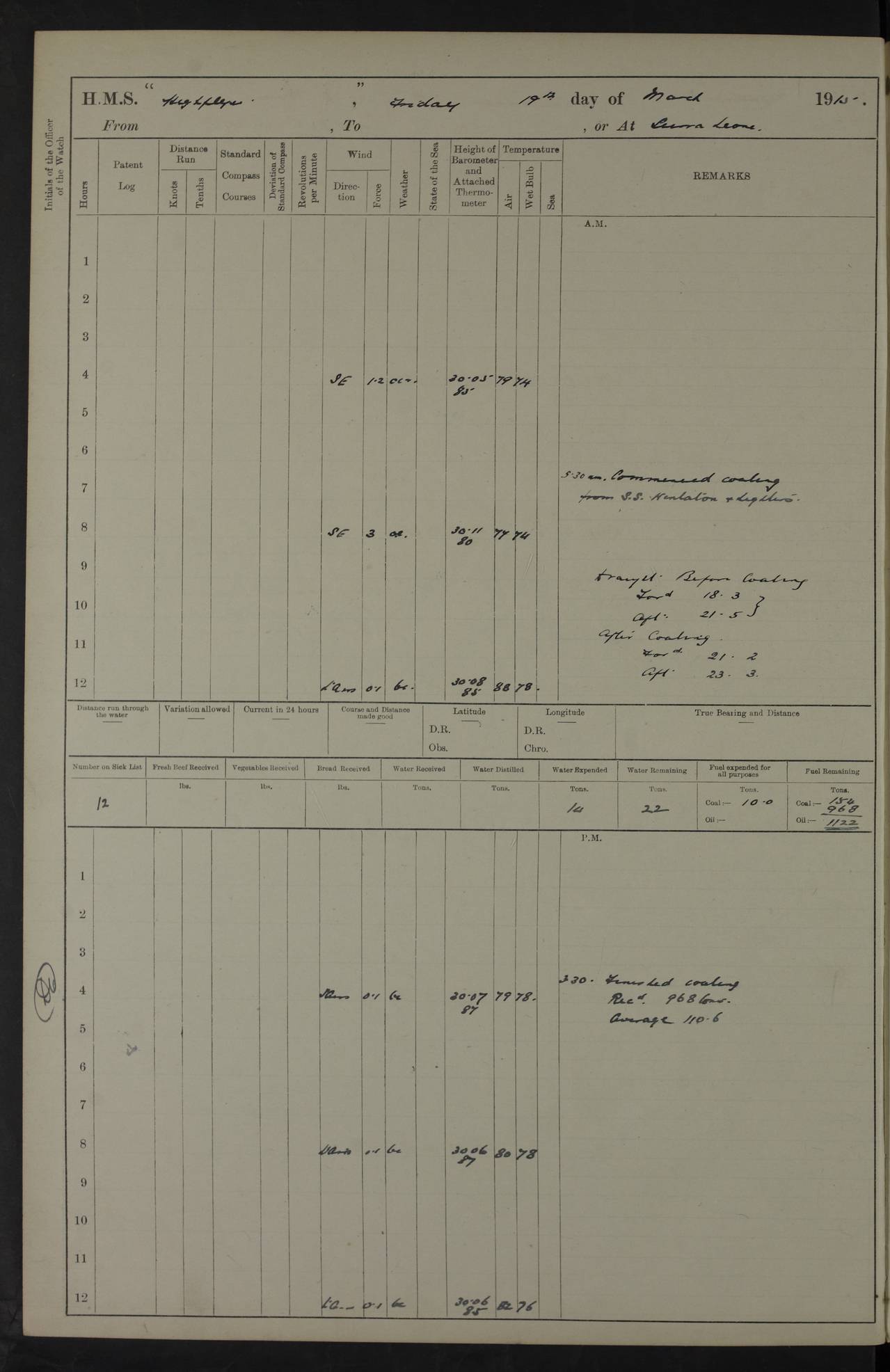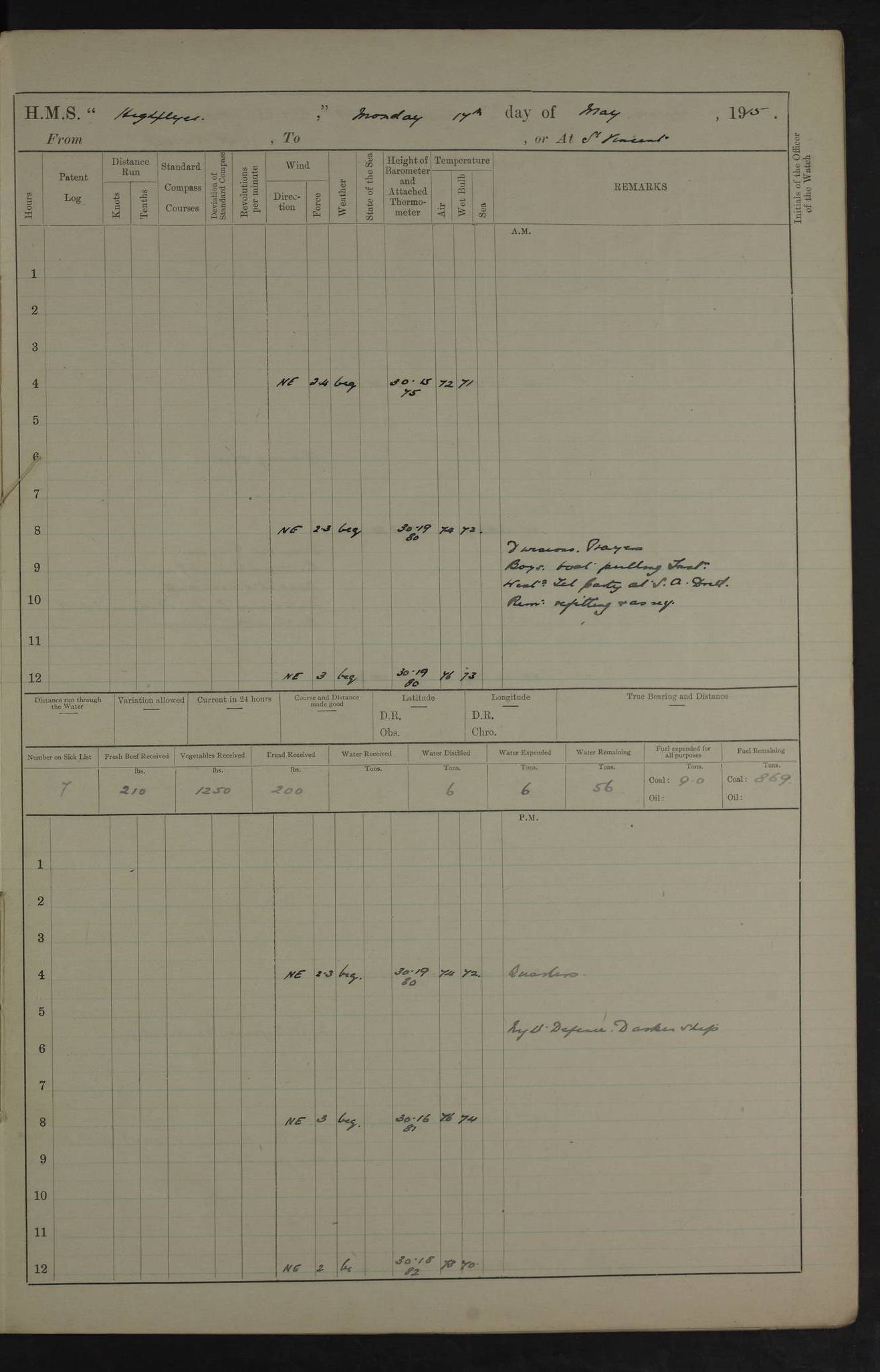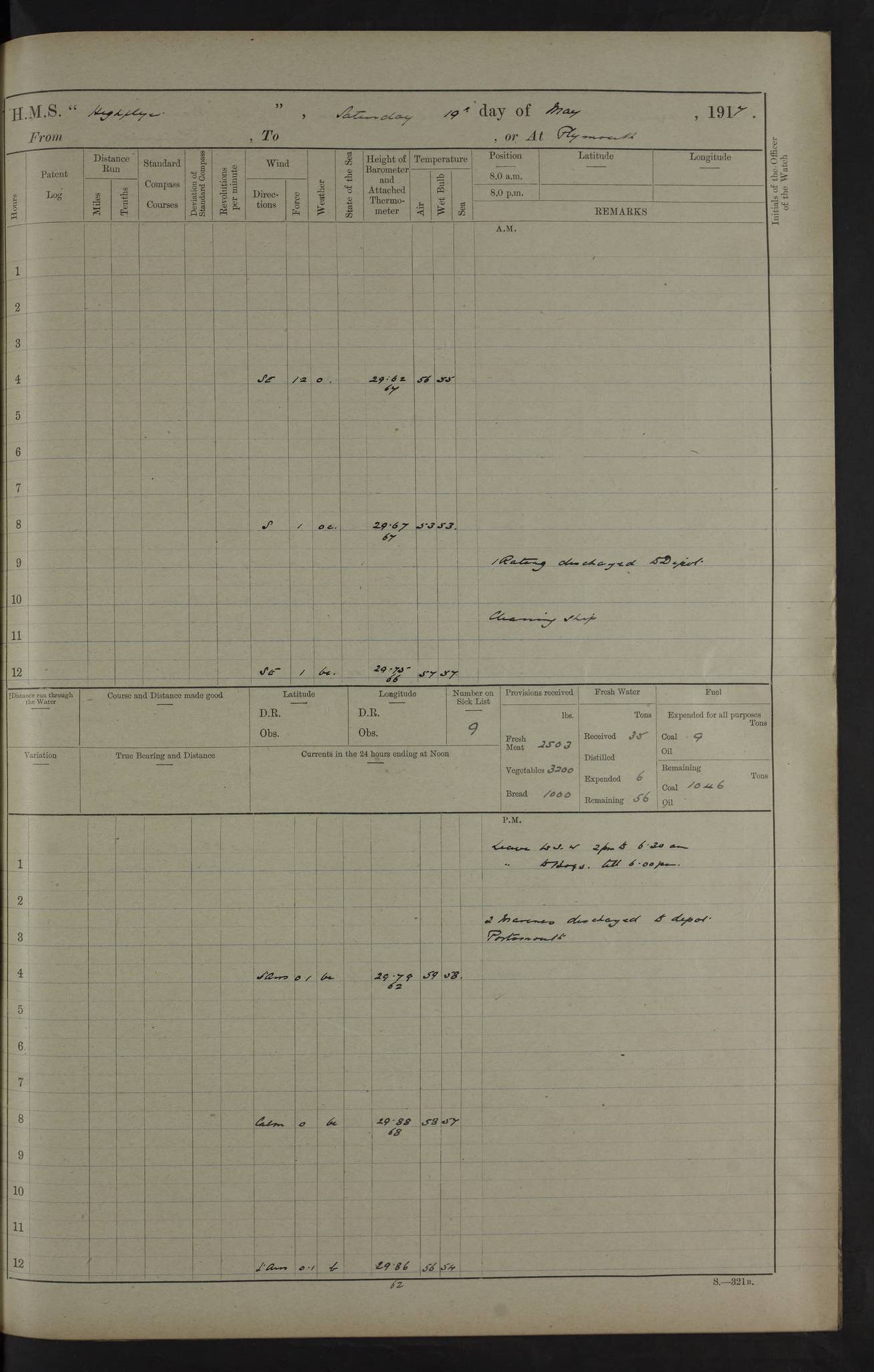 LOGS FOR JANUARY 1917 4ef4f321e53e0a0c91000902: (https://s3.amazonaws.com:443/oldweather/ADM53-44307/ADM 53-44307-129_1.jpg) 4ef4f321e53e0a0c91000903: (https://s3.amazonaws.com:443/oldweather/ADM53-44307/ADM 53-44307-130_0.jpg) 4ef4f321e53e0a0c91000904: (https://s3.amazonaws.com:443/oldweather/ADM53-44307/ADM 53-44307-130_1.jpg) 4ef4f321e53e0a0c91000905: (https://s3.amazonaws.com:443/oldweather/ADM53-44307/ADM 53-44307-131_0.jpg) 4ef4f321e53e0a0c91000906: (https://s3.amazonaws.com:443/oldweather/ADM53-44307/ADM 53-44307-131_1.jpg) 1 January 1917 Sierra Leone Lat 8.5, Long -13.2 6.30am: Party transferring provisions to DONEGAL. 10.00am: Party working on board SS VIRENT dismounting gun. 4ef4f321e53e0a0c91000907: (https://s3.amazonaws.com:443/oldweather/ADM53-44307/ADM 53-44307-132_0.jpg) 2 January 1917 Sierra Leone to St. Vincent Lat 8.7, Long -13.6 6.55am: SS ATLANTIC CITY came alongside. Coaling ship. 9.20am: Weighed and proceeded as requisite out of harbour. 4ef4f321e53e0a0c91000908: (https://s3.amazonaws.com:443/oldweather/ADM53-44307/ADM 53-44307-132_1.jpg) 3 January 1917 Sierra Leone to St. Vincent Lat 11.1, Long -17.7 2.30pm: Sighted SS on P bow steering to SE’d. 4ef4f321e53e0a0c91000909: (https://s3.amazonaws.com:443/oldweather/ADM53-44307/ADM 53-44307-133_0.jpg) 4 January 1917 Sierra Leone to St. Vincent Lat 13.8, Long -21.5 Boys and OS at school and seamanship instruction. Marines at drill. 11.30pm: Passing between St. Jago and Mayo Id. 4ef4f321e53e0a0c9100090a: (https://s3.amazonaws.com:443/oldweather/ADM53-44307/ADM 53-44307-133_1.jpg) 5 January 1917 Sierra Leone to St. Vincent Lat 16.8828, Long -25.0106 6.40am: Sighted San Nicholas Id. abeam. 11.58am: Came to SB 9 fathoms, 4½ shackles. 12.30pm: Lighters came alongside. 2.00pm: Coaling ship. 5.00pm: Stopped coaling for night. 4ef4f321e53e0a0c9100090b: (https://s3.amazonaws.com:443/oldweather/ADM53-44307/ADM 53-44307-134_0.jpg) 6 January 1917 St. Vincent Lat 16.8828, Long -25.0106 6.30am: Coaling ship from lighters. 12.30pm: Finished coaling; received 433 tons including deck cargo. 2.00pm: Prepared for sea. 4ef4f321e53e0a0c9100090c: (https://s3.amazonaws.com:443/oldweather/ADM53-44307/ADM 53-44307-134_1.jpg) 7 January 1917 St. Vincent to rendezvous to meet HMS Shannon and convoy Lat 17.4, Long -25.5 6.35am: Weighed and proceeded as requisite, 100 revs, to southward by San Antonio. 4ef4f321e53e0a0c9100090d: (https://s3.amazonaws.com:443/oldweather/ADM53-44307/ADM 53-44307-135_0.jpg) 8 January 1917 St. Vincent to meet HMS Shannon and convoy Lat 21.2, Long -26.3 9.30am: Party striking down coal. 4ef4f321e53e0a0c9100090e: (https://s3.amazonaws.com:443/oldweather/ADM53-44307/ADM 53-44307-135_1.jpg) 9 January 1917 St. Vincent to meet HMS Shannon and convoy Lat 23.9, Long -25.5 Cleaning ship. 9.00pm: Group closed up exercised during watch. 4ef4f322e53e0a0c9100090f: (https://s3.amazonaws.com:443/oldweather/ADM53-44307/ADM 53-44307-136_0.jpg) 10 January 1917 St. Vincent to meet HMS Shannon and convoy Lat 27.4, Long -25.1 2.00am: Groups closed up, exercised frequently during each watch. 6.30am: Sighted SS on southward beam steering NE’d. 4ef4f322e53e0a0c91000910: (https://s3.amazonaws.com:443/oldweather/ADM53-44307/ADM 53-44307-136_1.jpg) 11 January 1917 St. Vincent to meet HMS Shannon and convoy and to Sierra Leone Lat 29.7, Long -24.7 2.00am: Groups closed up, exercised frequently during each watch. 5.20am: Sighted SHANNON and convoy ahead – CARONIA, EMPRESS OF BRITAIN, WALMER CASTLE, TYNDAREUS, PAKEHA, NESTOR, CORINTHIC. 6.13am: Stopped. Communicated by boat with SHANNON. 6.25am: Course S17W. 115 rev. SHANNON proceeded NE’d., course as requisite to take up station with convoy. [A sketch is included showing the position of the ships. HIGHFLYER is in the middle of the front row with PAKEHA 10 cables to port and WALMER CASTLE 10 cables to starboard. NESTOR, then TYNDAREUS, follow PAKEHA. EMPRESS OF BRITAIN, then CARONIA, follow WALMER CASTLE. CORINTHIC is evenly spaced between TYNDAREUS and CARONIA.] 4ef4f322e53e0a0c91000911: (https://s3.amazonaws.com:443/oldweather/ADM53-44307/ADM 53-44307-137_0.jpg) 12 January 1917 To Sierra Leone with convoy Lat 23.9, Long -26.3 Guns’ crews closed up exercised frequently during day. Boys and OS to school and seamanship instruction. 4ef4f322e53e0a0c91000912: (https://s3.amazonaws.com:443/oldweather/ADM53-44307/ADM 53-44307-137_1.jpg) 13 January 1917 To Sierra Leone with convoy Lat 19.3, Long -28.0 3.57am: 80 rev. to allow TYNDAREUS to remedy engine defect. 4ef4f322e53e0a0c91000913: (https://s3.amazonaws.com:443/oldweather/ADM53-44307/ADM 53-44307-138_0.jpg) 14 January 1917 To Sierra Leone with convoy Lat 14.7, Long -26.9 9.00am: Mustered by Open List. 10.00am: Held Divine Service. 4ef4f322e53e0a0c91000914: (https://s3.amazonaws.com:443/oldweather/ADM53-44307/ADM 53-44307-138_1.jpg) 15 January 1917 To Sierra Leone with convoy Lat 12.3, Long -23.7 Party in stokehold trimming. 4ef4f322e53e0a0c91000915: (https://s3.amazonaws.com:443/oldweather/ADM53-44307/ADM 53-44307-139_0.jpg) 16 January 1917 To Sierra Leone with convoy Lat 10.4, Long -18.1 1.00pm: Hoisted colours half-mast. (Death on board EMPRESS OF BRITAIN.) 4ef4f322e53e0a0c91000916: (https://s3.amazonaws.com:443/oldweather/ADM53-44307/ADM 53-44307-139_1.jpg) 17 January 1917 To Sierra Leone with convoy Lat 8.5, Long -13.2 9.15am: Observed land ahead. Prepared for coaling. 10.40am: Formed single line ahead. 12.30pm: Transports proceeded independently to anchoring berths. 1.12pm: Came to with PB anchor in 10 fathoms, veered to 4 shackles, A3 berth. 5.30pm: SS MANSFIELD came alongside. 4ef4f322e53e0a0c91000917: (https://s3.amazonaws.com:443/oldweather/ADM53-44307/ADM 53-44307-140_0.jpg) 18 January 1917 Sierra Leone Lat 8.5, Long -13.2 6.00am: Commenced coaling. 2.15pm: Finished coaling; received 840 tons. 4ef4f322e53e0a0c91000918: (https://s3.amazonaws.com:443/oldweather/ADM53-44307/ADM 53-44307-140_1.jpg) 19 January 1917 Sierra Leone Lat 8.5, 