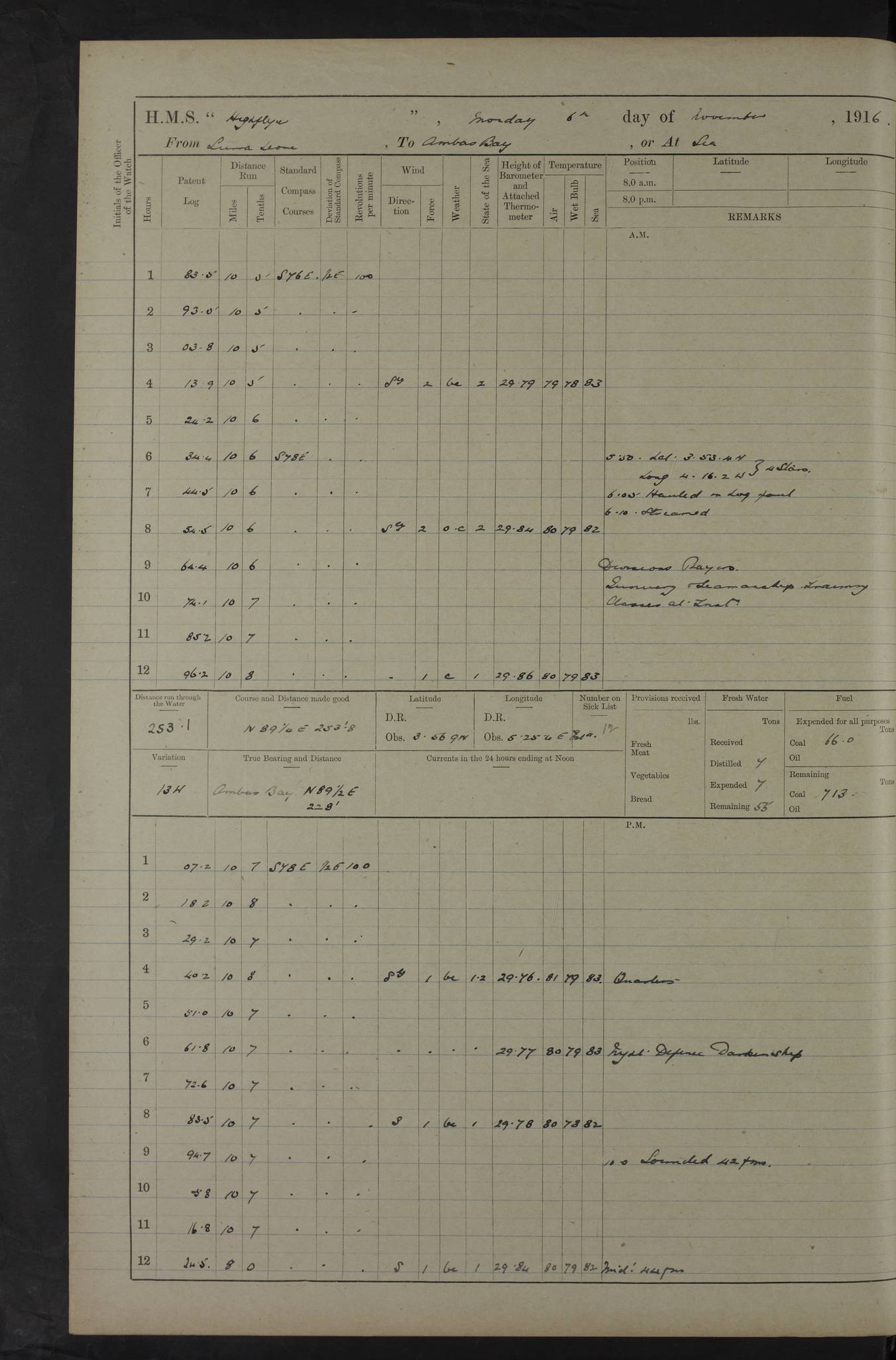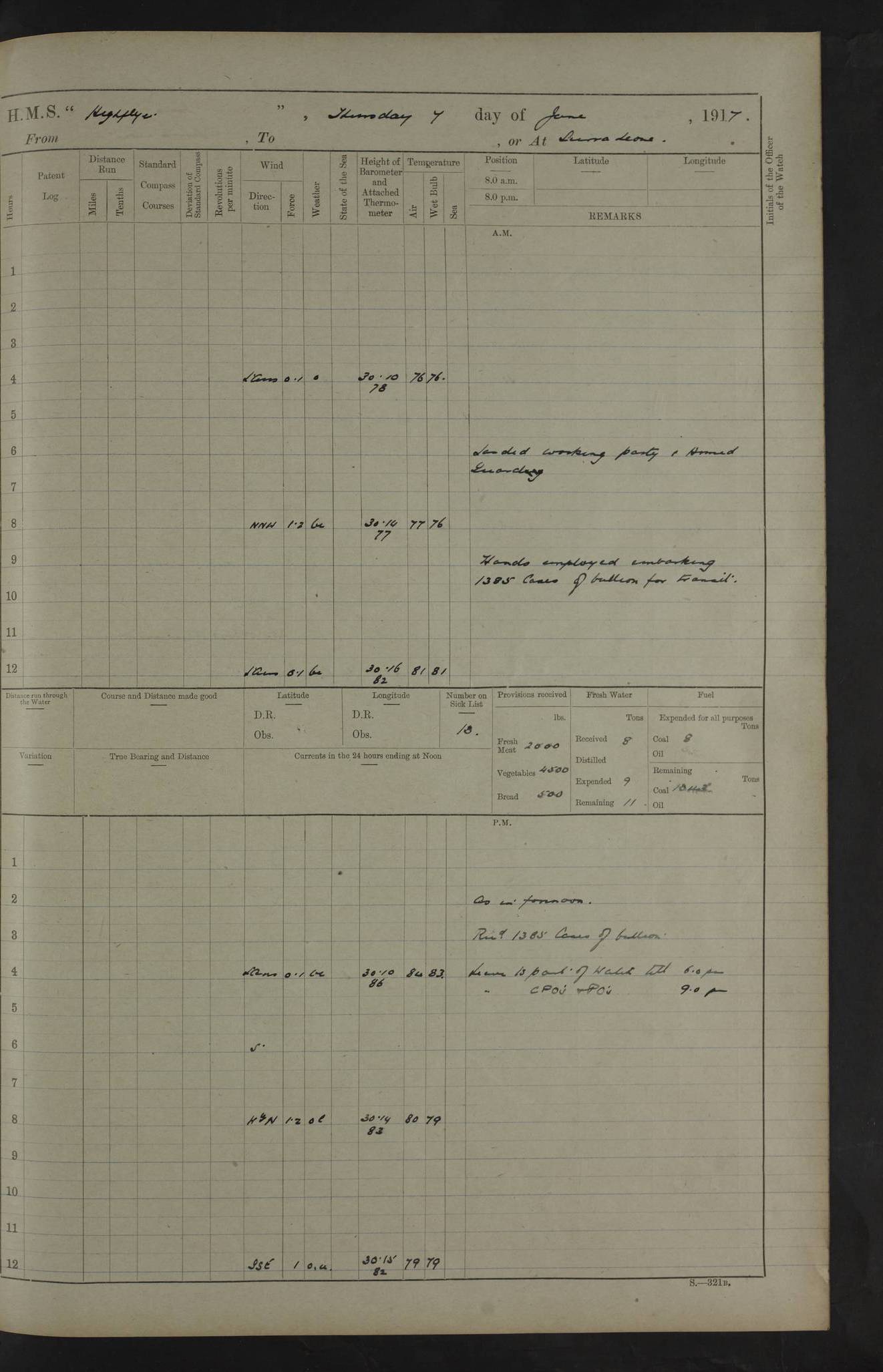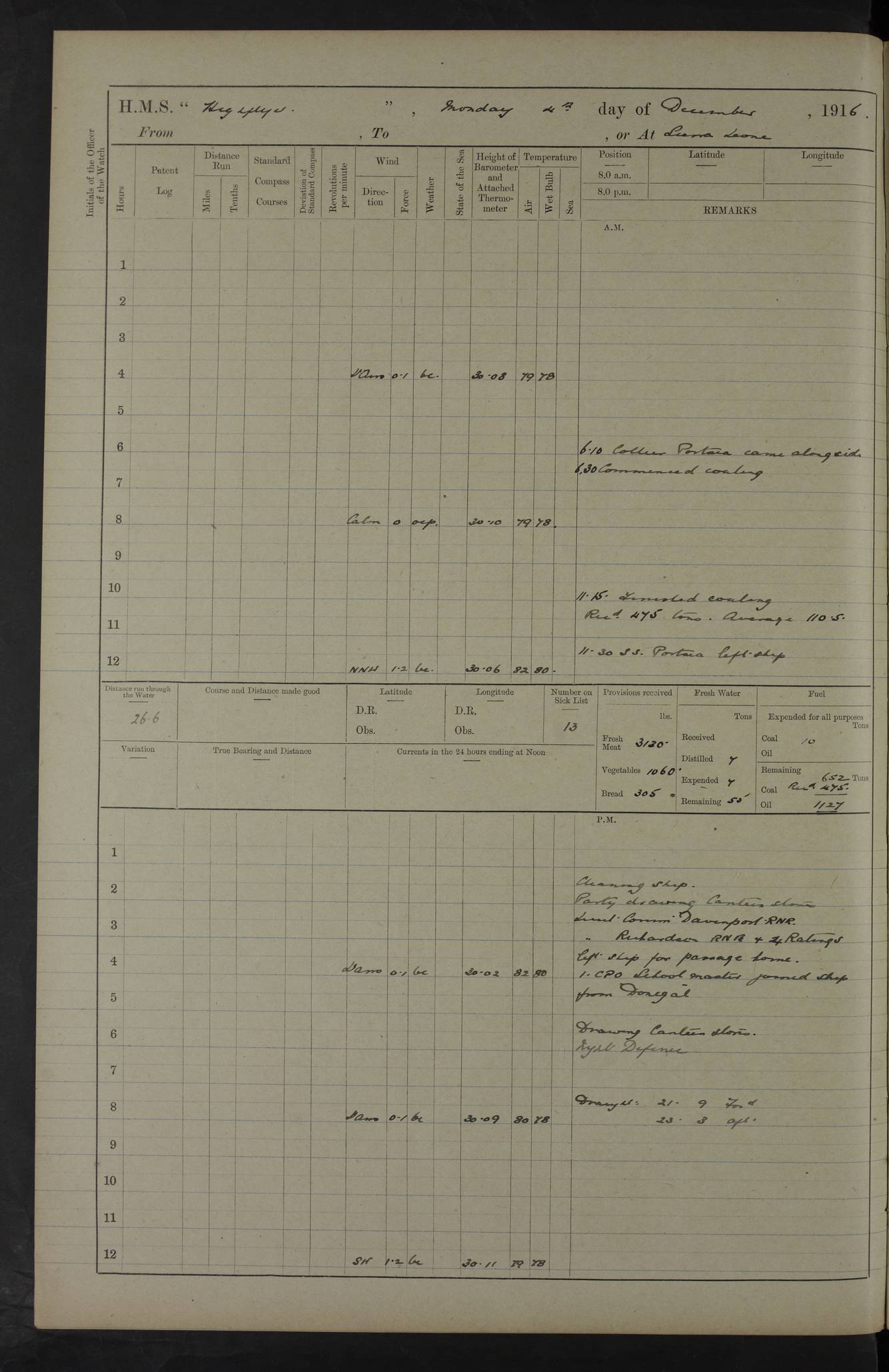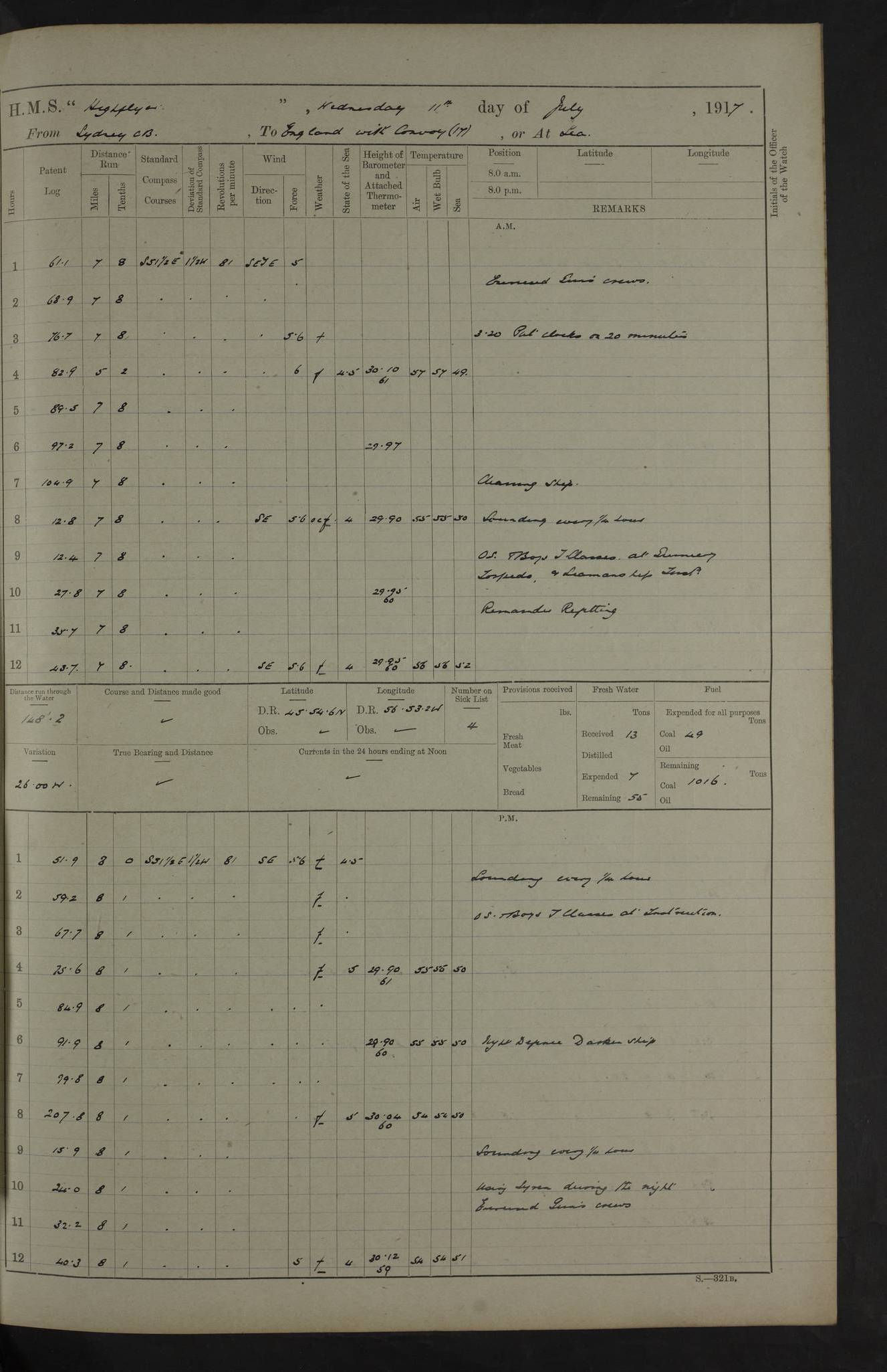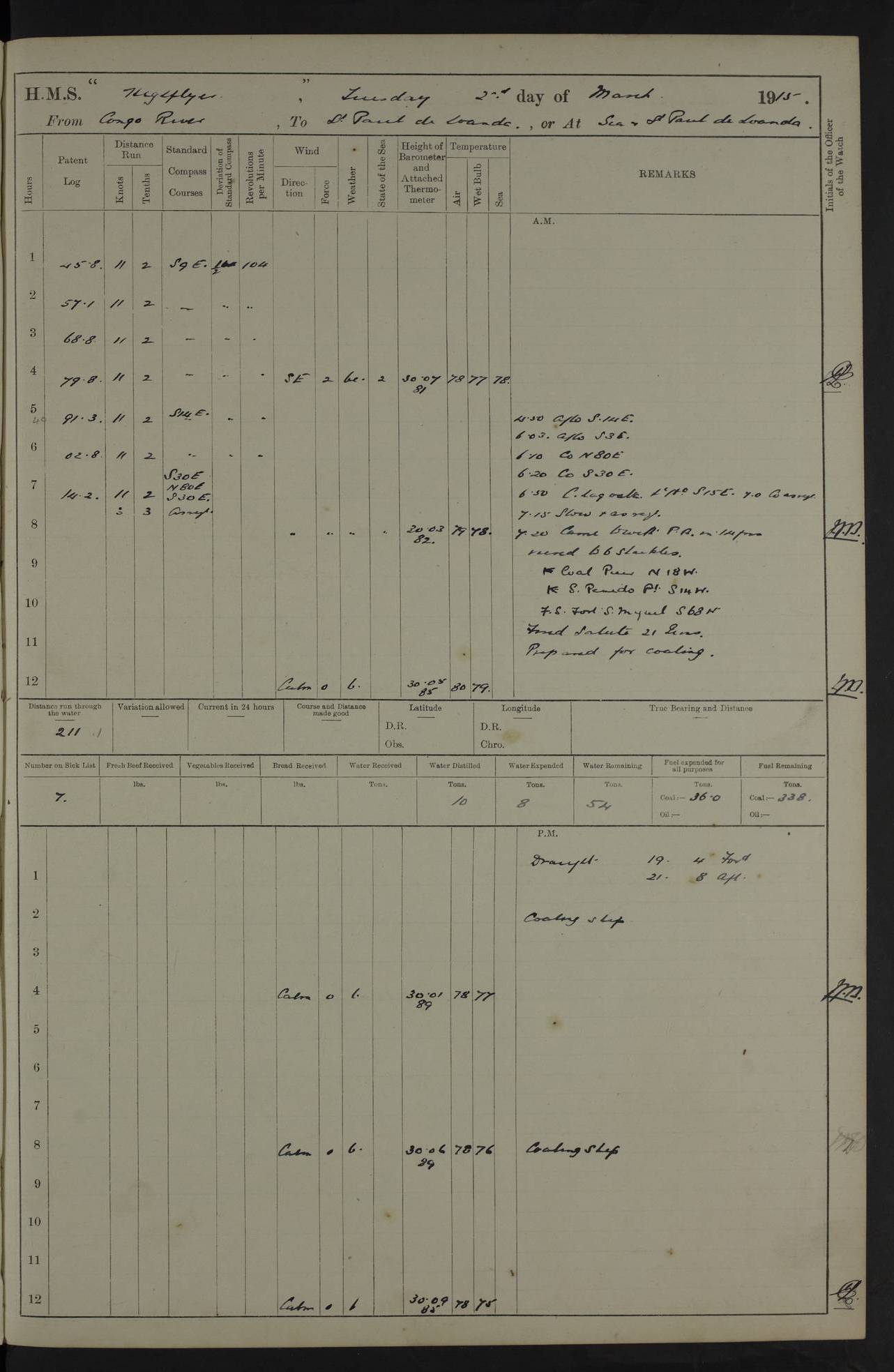 LOGS FOR JANUARY 1917 4ef4f321e53e0a0c91000902: (https://s3.amazonaws.com:443/oldweather/ADM53-44307/ADM 53-44307-129_1.jpg) 4ef4f321e53e0a0c91000903: (https://s3.amazonaws.com:443/oldweather/ADM53-44307/ADM 53-44307-130_0.jpg) 4ef4f321e53e0a0c91000904: (https://s3.amazonaws.com:443/oldweather/ADM53-44307/ADM 53-44307-130_1.jpg) 4ef4f321e53e0a0c91000905: (https://s3.amazonaws.com:443/oldweather/ADM53-44307/ADM 53-44307-131_0.jpg) 4ef4f321e53e0a0c91000906: (https://s3.amazonaws.com:443/oldweather/ADM53-44307/ADM 53-44307-131_1.jpg) 1 January 1917 Sierra Leone Lat 8.5, Long -13.2 6.30am: Party transferring provisions to DONEGAL. 10.00am: Party working on board SS VIRENT dismounting gun. 4ef4f321e53e0a0c91000907: (https://s3.amazonaws.com:443/oldweather/ADM53-44307/ADM 53-44307-132_0.jpg) 2 January 1917 Sierra Leone to St. Vincent Lat 8.7, Long -13.6 6.55am: SS ATLANTIC CITY came alongside. Coaling ship. 9.20am: Weighed and proceeded as requisite out of harbour. 4ef4f321e53e0a0c91000908: (https://s3.amazonaws.com:443/oldweather/ADM53-44307/ADM 53-44307-132_1.jpg) 3 January 1917 Sierra Leone to St. Vincent Lat 11.1, Long -17.7 2.30pm: Sighted SS on P bow steering to SE’d. 4ef4f321e53e0a0c91000909: (https://s3.amazonaws.com:443/oldweather/ADM53-44307/ADM 53-44307-133_0.jpg) 4 January 1917 Sierra Leone to St. Vincent Lat 13.8, Long -21.5 Boys and OS at school and seamanship instruction. Marines at drill. 11.30pm: Passing between St. Jago and Mayo Id. 4ef4f321e53e0a0c9100090a: (https://s3.amazonaws.com:443/oldweather/ADM53-44307/ADM 53-44307-133_1.jpg) 5 January 1917 Sierra Leone to St. Vincent Lat 16.8828, Long -25.0106 6.40am: Sighted San Nicholas Id. abeam. 11.58am: Came to SB 9 fathoms, 4½ shackles. 12.30pm: Lighters came alongside. 2.00pm: Coaling ship. 5.00pm: Stopped coaling for night. 4ef4f321e53e0a0c9100090b: (https://s3.amazonaws.com:443/oldweather/ADM53-44307/ADM 53-44307-134_0.jpg) 6 January 1917 St. Vincent Lat 16.8828, Long -25.0106 6.30am: Coaling ship from lighters. 12.30pm: Finished coaling; received 433 tons including deck cargo. 2.00pm: Prepared for sea. 4ef4f321e53e0a0c9100090c: (https://s3.amazonaws.com:443/oldweather/ADM53-44307/ADM 53-44307-134_1.jpg) 7 January 1917 St. Vincent to rendezvous to meet HMS Shannon and convoy Lat 17.4, Long -25.5 6.35am: Weighed and proceeded as requisite, 100 revs, to southward by San Antonio. 4ef4f321e53e0a0c9100090d: (https://s3.amazonaws.com:443/oldweather/ADM53-44307/ADM 53-44307-135_0.jpg) 8 January 1917 St. Vincent to meet HMS Shannon and convoy Lat 21.2, Long -26.3 9.30am: Party striking down coal. 4ef4f321e53e0a0c9100090e: (https://s3.amazonaws.com:443/oldweather/ADM53-44307/ADM 53-44307-135_1.jpg) 9 January 1917 St. Vincent to meet HMS Shannon and convoy Lat 23.9, Long -25.5 Cleaning ship. 9.00pm: Group closed up exercised during watch. 4ef4f322e53e0a0c9100090f: (https://s3.amazonaws.com:443/oldweather/ADM53-44307/ADM 53-44307-136_0.jpg) 10 January 1917 St. Vincent to meet HMS Shannon and convoy Lat 27.4, Long -25.1 2.00am: Groups closed up, exercised frequently during each watch. 6.30am: Sighted SS on southward beam steering NE’d. 4ef4f322e53e0a0c91000910: (https://s3.amazonaws.com:443/oldweather/ADM53-44307/ADM 53-44307-136_1.jpg) 11 January 1917 St. Vincent to meet HMS Shannon and convoy and to Sierra Leone Lat 29.7, Long -24.7 2.00am: Groups closed up, exercised frequently during each watch. 5.20am: Sighted SHANNON and convoy ahead – CARONIA, EMPRESS OF BRITAIN, WALMER CASTLE, TYNDAREUS, PAKEHA, NESTOR, CORINTHIC. 6.13am: Stopped. Communicated by boat with SHANNON. 6.25am: Course S17W. 115 rev. SHANNON proceeded NE’d., course as requisite to take up station with convoy. [A sketch is included showing the position of the ships. HIGHFLYER is in the middle of the front row with PAKEHA 10 cables to port and WALMER CASTLE 10 cables to starboard. NESTOR, then TYNDAREUS, follow PAKEHA. EMPRESS OF BRITAIN, then CARONIA, follow WALMER CASTLE. CORINTHIC is evenly spaced between TYNDAREUS and CARONIA.] 4ef4f322e53e0a0c91000911: (https://s3.amazonaws.com:443/oldweather/ADM53-44307/ADM 53-44307-137_0.jpg) 12 January 1917 To Sierra Leone with convoy Lat 23.9, Long -26.3 Guns’ crews closed up exercised frequently during day. Boys and OS to school and seamanship instruction. 4ef4f322e53e0a0c91000912: (https://s3.amazonaws.com:443/oldweather/ADM53-44307/ADM 53-44307-137_1.jpg) 13 January 1917 To Sierra Leone with convoy Lat 19.3, Long -28.0 3.57am: 80 rev. to allow TYNDAREUS to remedy engine defect. 4ef4f322e53e0a0c91000913: (https://s3.amazonaws.com:443/oldweather/ADM53-44307/ADM 53-44307-138_0.jpg) 14 January 1917 To Sierra Leone with convoy Lat 14.7, Long -26.9 9.00am: Mustered by Open List. 10.00am: Held Divine Service. 4ef4f322e53e0a0c91000914: (https://s3.amazonaws.com:443/oldweather/ADM53-44307/ADM 53-44307-138_1.jpg) 15 January 1917 To Sierra Leone with convoy Lat 12.3, Long -23.7 Party in stokehold trimming. 4ef4f322e53e0a0c91000915: (https://s3.amazonaws.com:443/oldweather/ADM53-44307/ADM 53-44307-139_0.jpg) 16 January 1917 To Sierra Leone with convoy Lat 10.4, Long -18.1 1.00pm: Hoisted colours half-mast. (Death on board EMPRESS OF BRITAIN.) 4ef4f322e53e0a0c91000916: (https://s3.amazonaws.com:443/oldweather/ADM53-44307/ADM 53-44307-139_1.jpg) 17 January 1917 To Sierra Leone with convoy Lat 8.5, Long -13.2 9.15am: Observed land ahead. Prepared for coaling. 10.40am: Formed single line ahead. 12.30pm: Transports proceeded independently to anchoring berths. 1.12pm: Came to with PB anchor in 10 fathoms, veered to 4 shackles, A3 berth. 5.30pm: SS MANSFIELD came alongside. 4ef4f322e53e0a0c91000917: (https://s3.amazonaws.com:443/oldweather/ADM53-44307/ADM 53-44307-140_0.jpg) 18 January 1917 Sierra Leone Lat 8.5, Long -13.2 6.00am: Commenced coaling. 2.15pm: Finished coaling; received 840 tons. 4ef4f322e53e0a0c91000918: (https://s3.amazonaws.com:443/oldweather/ADM53-44307/ADM 53-44307-140_1.jpg) 19 January 1917 Sierra Leone Lat 8.5, 