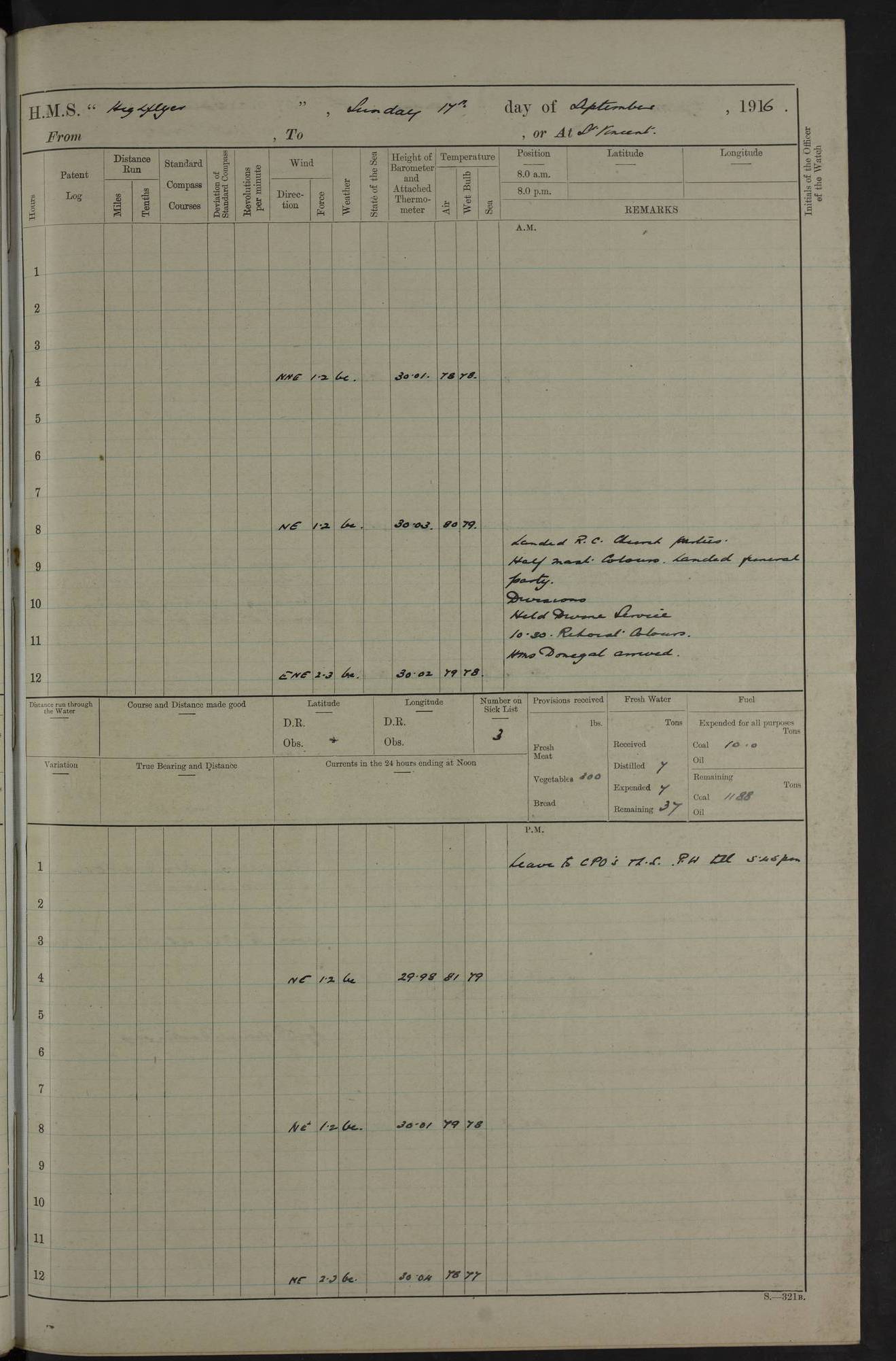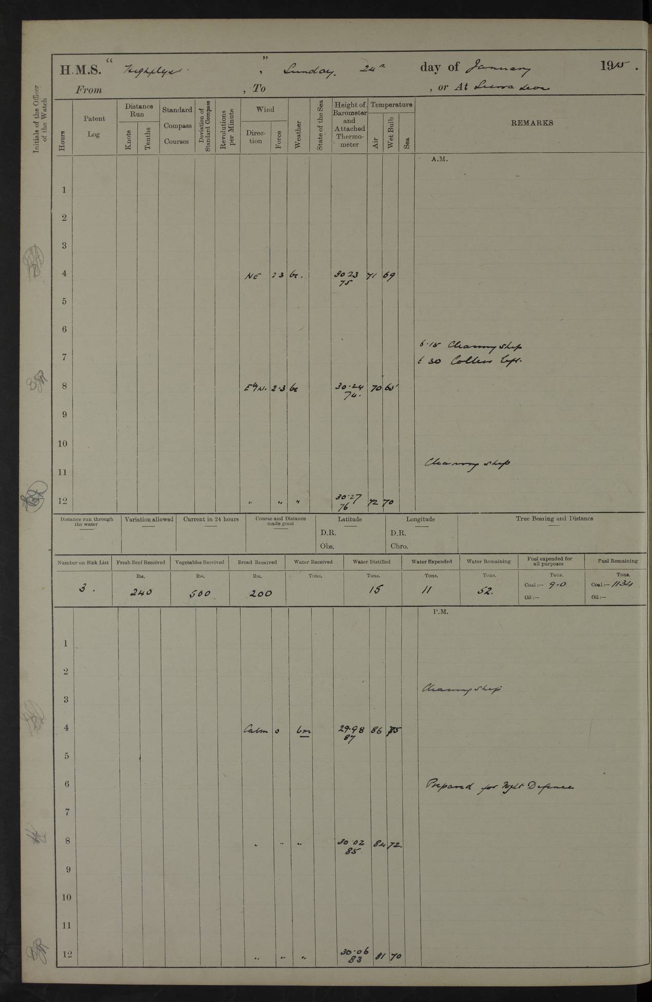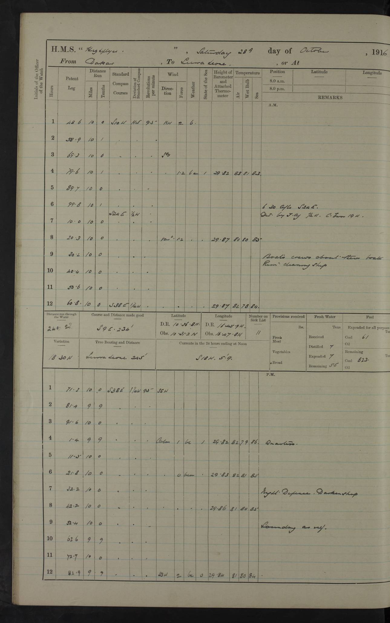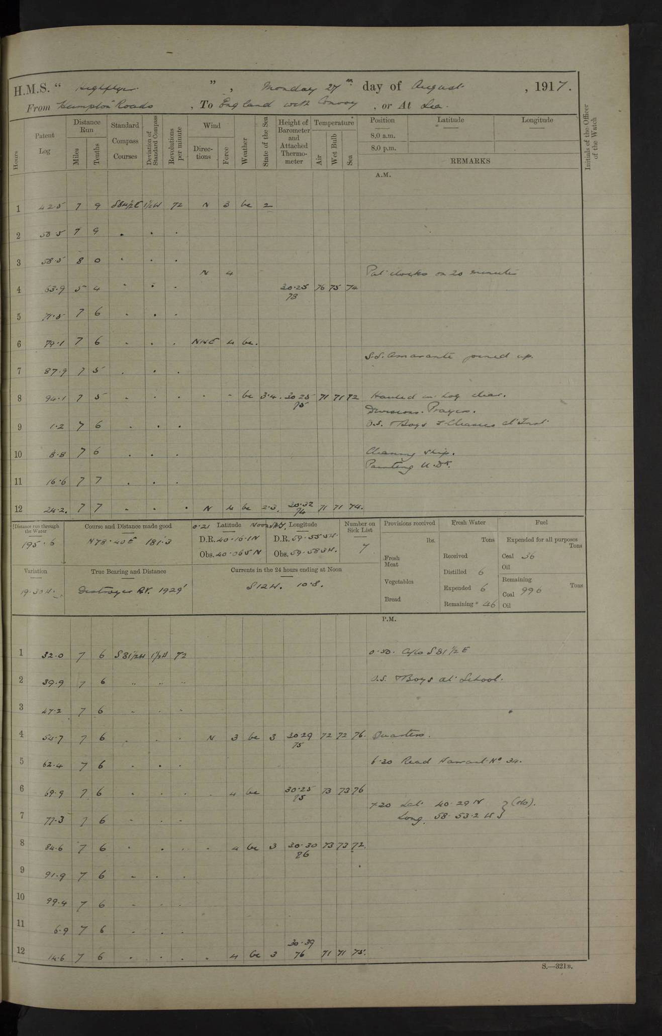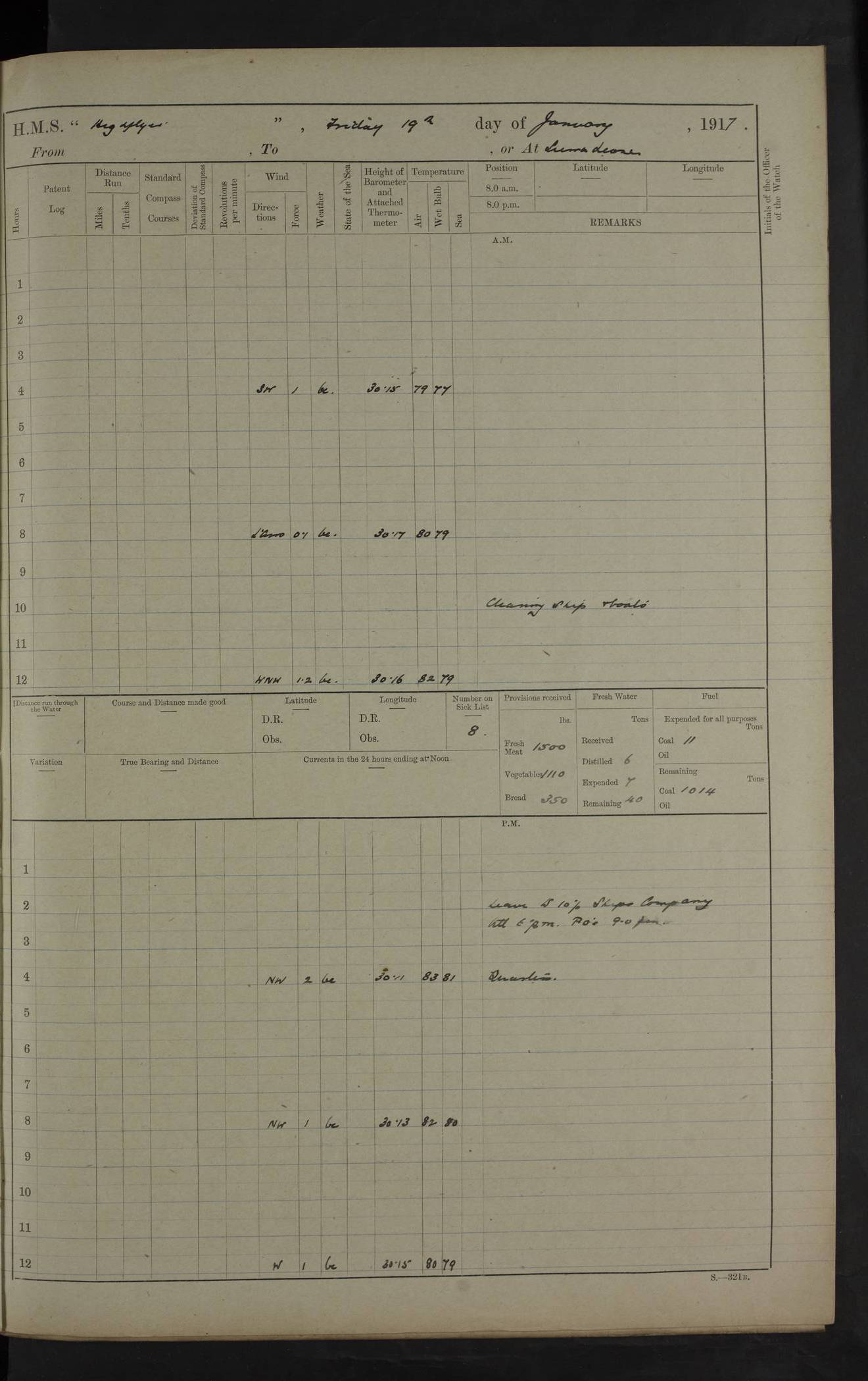 LOGS FOR JANUARY 1917 4ef4f321e53e0a0c91000902: (https://s3.amazonaws.com:443/oldweather/ADM53-44307/ADM 53-44307-129_1.jpg) 4ef4f321e53e0a0c91000903: (https://s3.amazonaws.com:443/oldweather/ADM53-44307/ADM 53-44307-130_0.jpg) 4ef4f321e53e0a0c91000904: (https://s3.amazonaws.com:443/oldweather/ADM53-44307/ADM 53-44307-130_1.jpg) 4ef4f321e53e0a0c91000905: (https://s3.amazonaws.com:443/oldweather/ADM53-44307/ADM 53-44307-131_0.jpg) 4ef4f321e53e0a0c91000906: (https://s3.amazonaws.com:443/oldweather/ADM53-44307/ADM 53-44307-131_1.jpg) 1 January 1917 Sierra Leone Lat 8.5, Long -13.2 6.30am: Party transferring provisions to DONEGAL. 10.00am: Party working on board SS VIRENT dismounting gun. 4ef4f321e53e0a0c91000907: (https://s3.amazonaws.com:443/oldweather/ADM53-44307/ADM 53-44307-132_0.jpg) 2 January 1917 Sierra Leone to St. Vincent Lat 8.7, Long -13.6 6.55am: SS ATLANTIC CITY came alongside. Coaling ship. 9.20am: Weighed and proceeded as requisite out of harbour. 4ef4f321e53e0a0c91000908: (https://s3.amazonaws.com:443/oldweather/ADM53-44307/ADM 53-44307-132_1.jpg) 3 January 1917 Sierra Leone to St. Vincent Lat 11.1, Long -17.7 2.30pm: Sighted SS on P bow steering to SE’d. 4ef4f321e53e0a0c91000909: (https://s3.amazonaws.com:443/oldweather/ADM53-44307/ADM 53-44307-133_0.jpg) 4 January 1917 Sierra Leone to St. Vincent Lat 13.8, Long -21.5 Boys and OS at school and seamanship instruction. Marines at drill. 11.30pm: Passing between St. Jago and Mayo Id. 4ef4f321e53e0a0c9100090a: (https://s3.amazonaws.com:443/oldweather/ADM53-44307/ADM 53-44307-133_1.jpg) 5 January 1917 Sierra Leone to St. Vincent Lat 16.8828, Long -25.0106 6.40am: Sighted San Nicholas Id. abeam. 11.58am: Came to SB 9 fathoms, 4½ shackles. 12.30pm: Lighters came alongside. 2.00pm: Coaling ship. 5.00pm: Stopped coaling for night. 4ef4f321e53e0a0c9100090b: (https://s3.amazonaws.com:443/oldweather/ADM53-44307/ADM 53-44307-134_0.jpg) 6 January 1917 St. Vincent Lat 16.8828, Long -25.0106 6.30am: Coaling ship from lighters. 12.30pm: Finished coaling; received 433 tons including deck cargo. 2.00pm: Prepared for sea. 4ef4f321e53e0a0c9100090c: (https://s3.amazonaws.com:443/oldweather/ADM53-44307/ADM 53-44307-134_1.jpg) 7 January 1917 St. Vincent to rendezvous to meet HMS Shannon and convoy Lat 17.4, Long -25.5 6.35am: Weighed and proceeded as requisite, 100 revs, to southward by San Antonio. 4ef4f321e53e0a0c9100090d: (https://s3.amazonaws.com:443/oldweather/ADM53-44307/ADM 53-44307-135_0.jpg) 8 January 1917 St. Vincent to meet HMS Shannon and convoy Lat 21.2, Long -26.3 9.30am: Party striking down coal. 4ef4f321e53e0a0c9100090e: (https://s3.amazonaws.com:443/oldweather/ADM53-44307/ADM 53-44307-135_1.jpg) 9 January 1917 St. Vincent to meet HMS Shannon and convoy Lat 23.9, Long -25.5 Cleaning ship. 9.00pm: Group closed up exercised during watch. 4ef4f322e53e0a0c9100090f: (https://s3.amazonaws.com:443/oldweather/ADM53-44307/ADM 53-44307-136_0.jpg) 10 January 1917 St. Vincent to meet HMS Shannon and convoy Lat 27.4, Long -25.1 2.00am: Groups closed up, exercised frequently during each watch. 6.30am: Sighted SS on southward beam steering NE’d. 4ef4f322e53e0a0c91000910: (https://s3.amazonaws.com:443/oldweather/ADM53-44307/ADM 53-44307-136_1.jpg) 11 January 1917 St. Vincent to meet HMS Shannon and convoy and to Sierra Leone Lat 29.7, Long -24.7 2.00am: Groups closed up, exercised frequently during each watch. 5.20am: Sighted SHANNON and convoy ahead – CARONIA, EMPRESS OF BRITAIN, WALMER CASTLE, TYNDAREUS, PAKEHA, NESTOR, CORINTHIC. 6.13am: Stopped. Communicated by boat with SHANNON. 6.25am: Course S17W. 115 rev. SHANNON proceeded NE’d., course as requisite to take up station with convoy. [A sketch is included showing the position of the ships. HIGHFLYER is in the middle of the front row with PAKEHA 10 cables to port and WALMER CASTLE 10 cables to starboard. NESTOR, then TYNDAREUS, follow PAKEHA. EMPRESS OF BRITAIN, then CARONIA, follow WALMER CASTLE. CORINTHIC is evenly spaced between TYNDAREUS and CARONIA.] 4ef4f322e53e0a0c91000911: (https://s3.amazonaws.com:443/oldweather/ADM53-44307/ADM 53-44307-137_0.jpg) 12 January 1917 To Sierra Leone with convoy Lat 23.9, Long -26.3 Guns’ crews closed up exercised frequently during day. Boys and OS to school and seamanship instruction. 4ef4f322e53e0a0c91000912: (https://s3.amazonaws.com:443/oldweather/ADM53-44307/ADM 53-44307-137_1.jpg) 13 January 1917 To Sierra Leone with convoy Lat 19.3, Long -28.0 3.57am: 80 rev. to allow TYNDAREUS to remedy engine defect. 4ef4f322e53e0a0c91000913: (https://s3.amazonaws.com:443/oldweather/ADM53-44307/ADM 53-44307-138_0.jpg) 14 January 1917 To Sierra Leone with convoy Lat 14.7, Long -26.9 9.00am: Mustered by Open List. 10.00am: Held Divine Service. 4ef4f322e53e0a0c91000914: (https://s3.amazonaws.com:443/oldweather/ADM53-44307/ADM 53-44307-138_1.jpg) 15 January 1917 To Sierra Leone with convoy Lat 12.3, Long -23.7 Party in stokehold trimming. 4ef4f322e53e0a0c91000915: (https://s3.amazonaws.com:443/oldweather/ADM53-44307/ADM 53-44307-139_0.jpg) 16 January 1917 To Sierra Leone with convoy Lat 10.4, Long -18.1 1.00pm: Hoisted colours half-mast. (Death on board EMPRESS OF BRITAIN.) 4ef4f322e53e0a0c91000916: (https://s3.amazonaws.com:443/oldweather/ADM53-44307/ADM 53-44307-139_1.jpg) 17 January 1917 To Sierra Leone with convoy Lat 8.5, Long -13.2 9.15am: Observed land ahead. Prepared for coaling. 10.40am: Formed single line ahead. 12.30pm: Transports proceeded independently to anchoring berths. 1.12pm: Came to with PB anchor in 10 fathoms, veered to 4 shackles, A3 berth. 5.30pm: SS MANSFIELD came alongside. 4ef4f322e53e0a0c91000917: (https://s3.amazonaws.com:443/oldweather/ADM53-44307/ADM 53-44307-140_0.jpg) 18 January 1917 Sierra Leone Lat 8.5, Long -13.2 6.00am: Commenced coaling. 2.15pm: Finished coaling; received 840 tons. 4ef4f322e53e0a0c91000918: (https://s3.amazonaws.com:443/oldweather/ADM53-44307/ADM 53-44307-140_1.jpg) 19 January 1917 Sierra Leone Lat 8.5, 