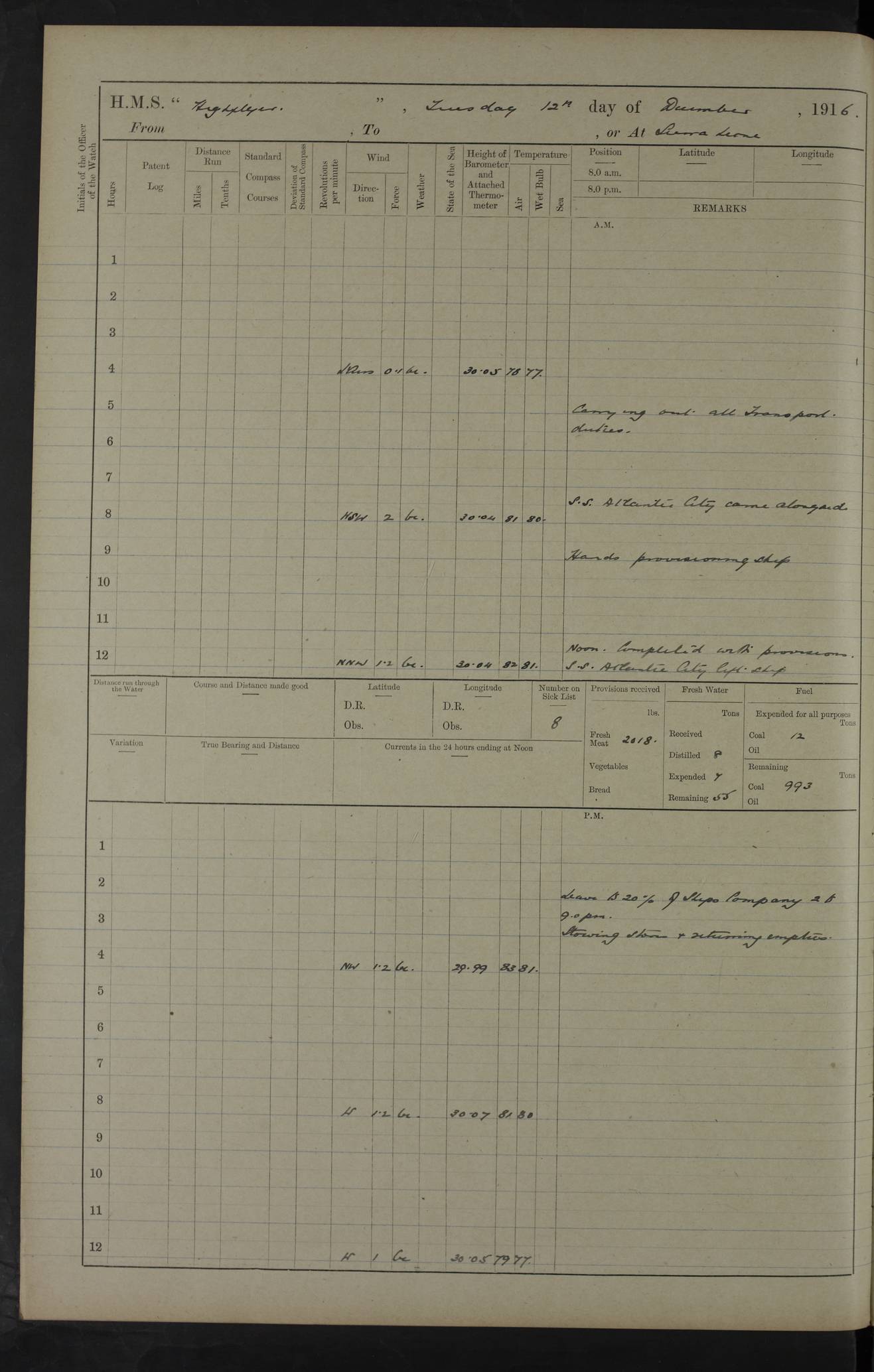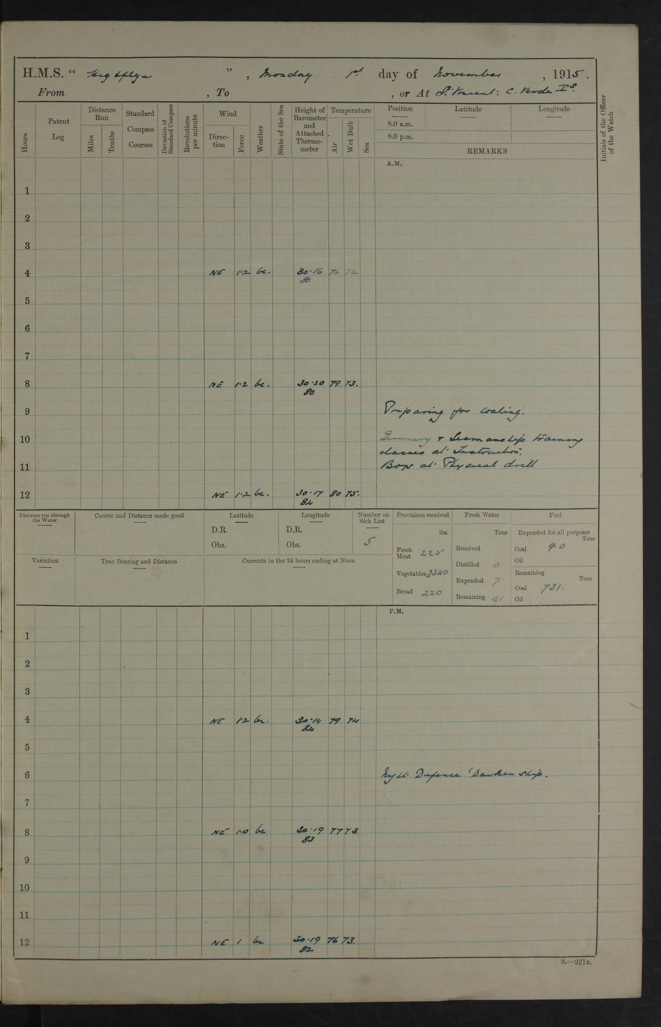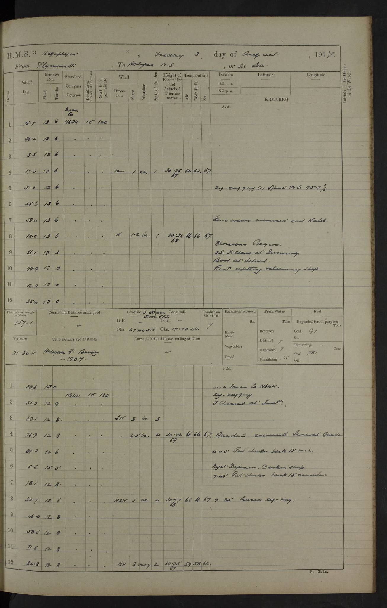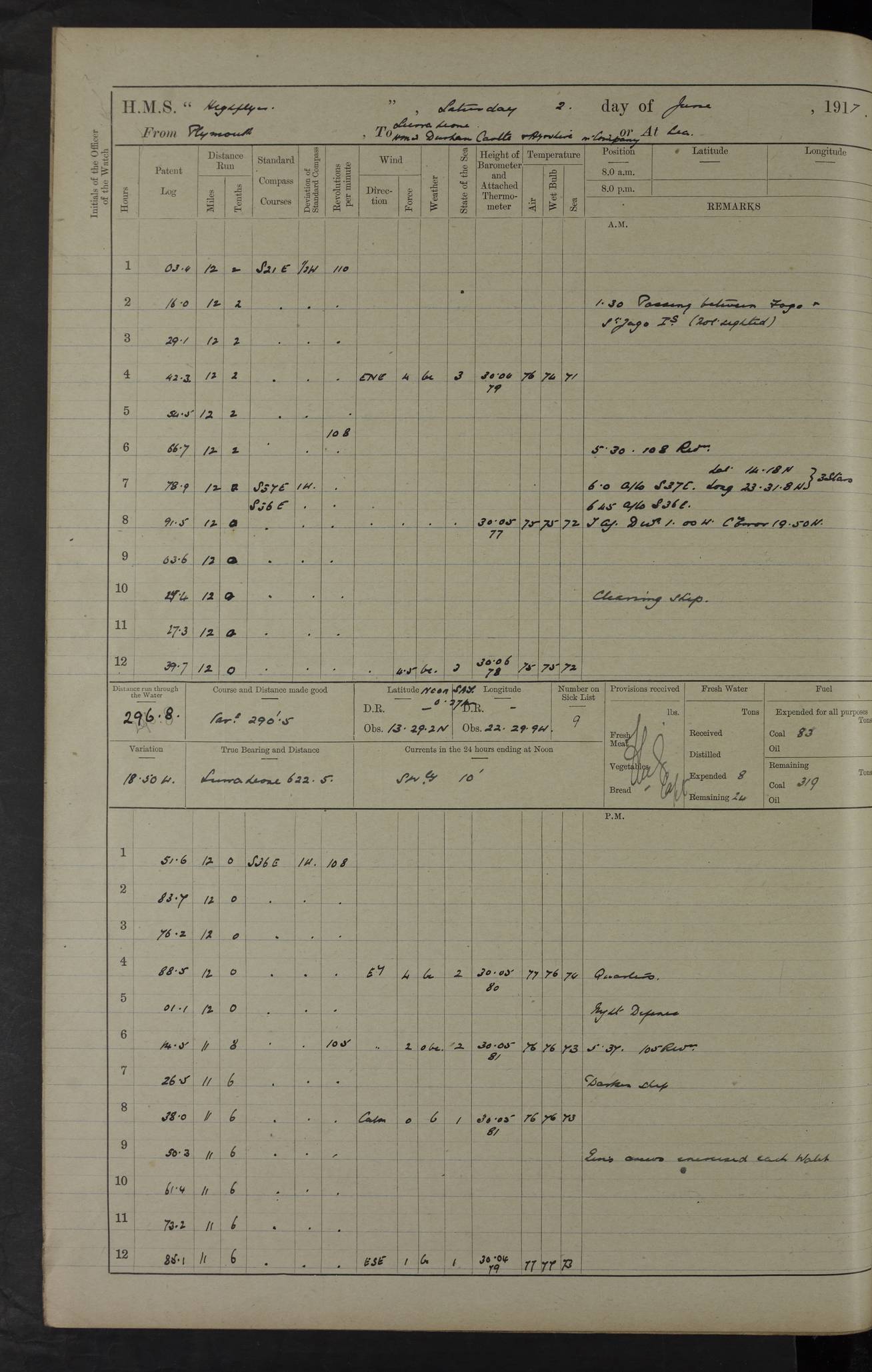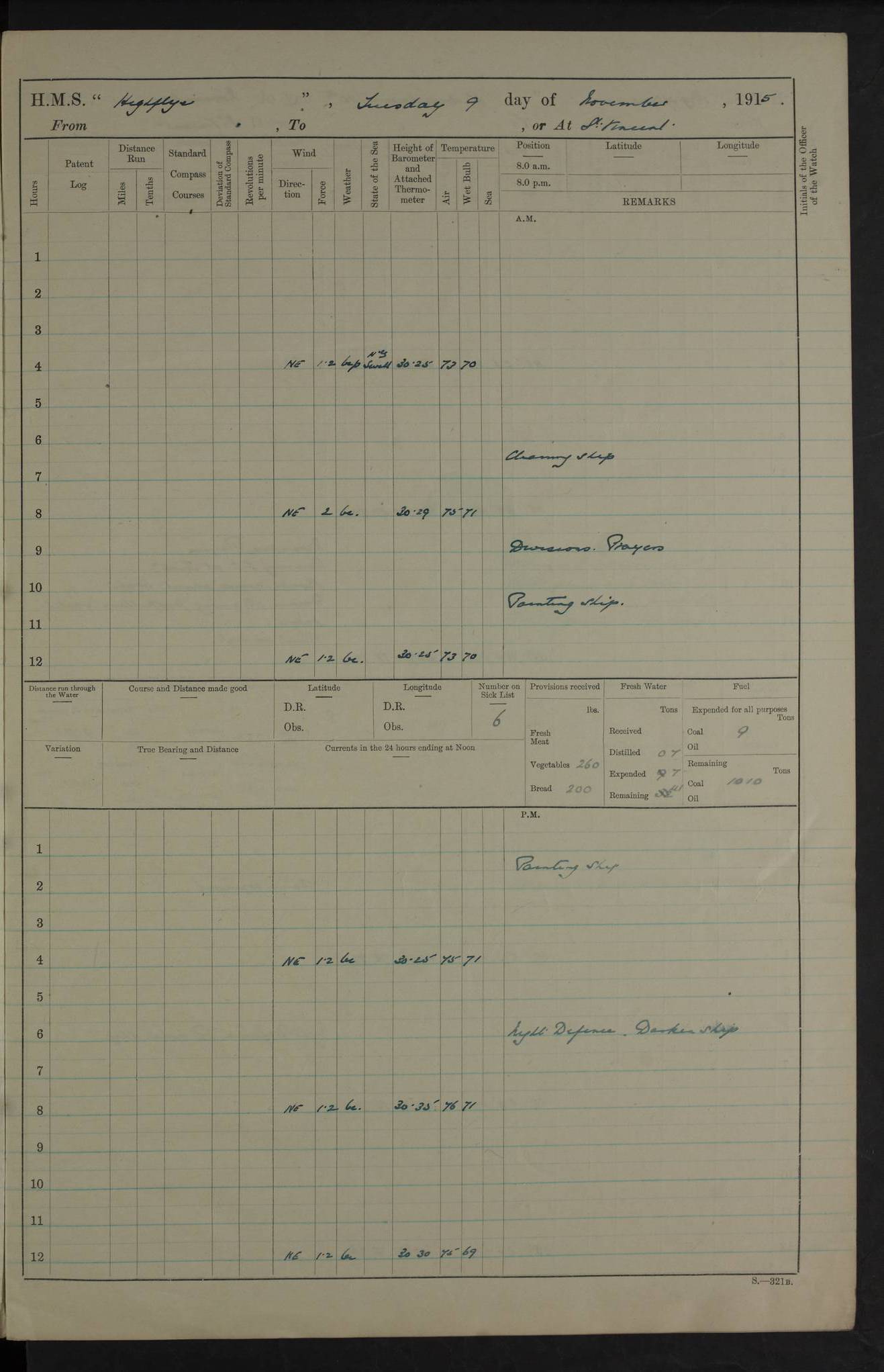 LOGS FOR JANUARY 1917 4ef4f321e53e0a0c91000902: (https://s3.amazonaws.com:443/oldweather/ADM53-44307/ADM 53-44307-129_1.jpg) 4ef4f321e53e0a0c91000903: (https://s3.amazonaws.com:443/oldweather/ADM53-44307/ADM 53-44307-130_0.jpg) 4ef4f321e53e0a0c91000904: (https://s3.amazonaws.com:443/oldweather/ADM53-44307/ADM 53-44307-130_1.jpg) 4ef4f321e53e0a0c91000905: (https://s3.amazonaws.com:443/oldweather/ADM53-44307/ADM 53-44307-131_0.jpg) 4ef4f321e53e0a0c91000906: (https://s3.amazonaws.com:443/oldweather/ADM53-44307/ADM 53-44307-131_1.jpg) 1 January 1917 Sierra Leone Lat 8.5, Long -13.2 6.30am: Party transferring provisions to DONEGAL. 10.00am: Party working on board SS VIRENT dismounting gun. 4ef4f321e53e0a0c91000907: (https://s3.amazonaws.com:443/oldweather/ADM53-44307/ADM 53-44307-132_0.jpg) 2 January 1917 Sierra Leone to St. Vincent Lat 8.7, Long -13.6 6.55am: SS ATLANTIC CITY came alongside. Coaling ship. 9.20am: Weighed and proceeded as requisite out of harbour. 4ef4f321e53e0a0c91000908: (https://s3.amazonaws.com:443/oldweather/ADM53-44307/ADM 53-44307-132_1.jpg) 3 January 1917 Sierra Leone to St. Vincent Lat 11.1, Long -17.7 2.30pm: Sighted SS on P bow steering to SE’d. 4ef4f321e53e0a0c91000909: (https://s3.amazonaws.com:443/oldweather/ADM53-44307/ADM 53-44307-133_0.jpg) 4 January 1917 Sierra Leone to St. Vincent Lat 13.8, Long -21.5 Boys and OS at school and seamanship instruction. Marines at drill. 11.30pm: Passing between St. Jago and Mayo Id. 4ef4f321e53e0a0c9100090a: (https://s3.amazonaws.com:443/oldweather/ADM53-44307/ADM 53-44307-133_1.jpg) 5 January 1917 Sierra Leone to St. Vincent Lat 16.8828, Long -25.0106 6.40am: Sighted San Nicholas Id. abeam. 11.58am: Came to SB 9 fathoms, 4½ shackles. 12.30pm: Lighters came alongside. 2.00pm: Coaling ship. 5.00pm: Stopped coaling for night. 4ef4f321e53e0a0c9100090b: (https://s3.amazonaws.com:443/oldweather/ADM53-44307/ADM 53-44307-134_0.jpg) 6 January 1917 St. Vincent Lat 16.8828, Long -25.0106 6.30am: Coaling ship from lighters. 12.30pm: Finished coaling; received 433 tons including deck cargo. 2.00pm: Prepared for sea. 4ef4f321e53e0a0c9100090c: (https://s3.amazonaws.com:443/oldweather/ADM53-44307/ADM 53-44307-134_1.jpg) 7 January 1917 St. Vincent to rendezvous to meet HMS Shannon and convoy Lat 17.4, Long -25.5 6.35am: Weighed and proceeded as requisite, 100 revs, to southward by San Antonio. 4ef4f321e53e0a0c9100090d: (https://s3.amazonaws.com:443/oldweather/ADM53-44307/ADM 53-44307-135_0.jpg) 8 January 1917 St. Vincent to meet HMS Shannon and convoy Lat 21.2, Long -26.3 9.30am: Party striking down coal. 4ef4f321e53e0a0c9100090e: (https://s3.amazonaws.com:443/oldweather/ADM53-44307/ADM 53-44307-135_1.jpg) 9 January 1917 St. Vincent to meet HMS Shannon and convoy Lat 23.9, Long -25.5 Cleaning ship. 9.00pm: Group closed up exercised during watch. 4ef4f322e53e0a0c9100090f: (https://s3.amazonaws.com:443/oldweather/ADM53-44307/ADM 53-44307-136_0.jpg) 10 January 1917 St. Vincent to meet HMS Shannon and convoy Lat 27.4, Long -25.1 2.00am: Groups closed up, exercised frequently during each watch. 6.30am: Sighted SS on southward beam steering NE’d. 4ef4f322e53e0a0c91000910: (https://s3.amazonaws.com:443/oldweather/ADM53-44307/ADM 53-44307-136_1.jpg) 11 January 1917 St. Vincent to meet HMS Shannon and convoy and to Sierra Leone Lat 29.7, Long -24.7 2.00am: Groups closed up, exercised frequently during each watch. 5.20am: Sighted SHANNON and convoy ahead – CARONIA, EMPRESS OF BRITAIN, WALMER CASTLE, TYNDAREUS, PAKEHA, NESTOR, CORINTHIC. 6.13am: Stopped. Communicated by boat with SHANNON. 6.25am: Course S17W. 115 rev. SHANNON proceeded NE’d., course as requisite to take up station with convoy. [A sketch is included showing the position of the ships. HIGHFLYER is in the middle of the front row with PAKEHA 10 cables to port and WALMER CASTLE 10 cables to starboard. NESTOR, then TYNDAREUS, follow PAKEHA. EMPRESS OF BRITAIN, then CARONIA, follow WALMER CASTLE. CORINTHIC is evenly spaced between TYNDAREUS and CARONIA.] 4ef4f322e53e0a0c91000911: (https://s3.amazonaws.com:443/oldweather/ADM53-44307/ADM 53-44307-137_0.jpg) 12 January 1917 To Sierra Leone with convoy Lat 23.9, Long -26.3 Guns’ crews closed up exercised frequently during day. Boys and OS to school and seamanship instruction. 4ef4f322e53e0a0c91000912: (https://s3.amazonaws.com:443/oldweather/ADM53-44307/ADM 53-44307-137_1.jpg) 13 January 1917 To Sierra Leone with convoy Lat 19.3, Long -28.0 3.57am: 80 rev. to allow TYNDAREUS to remedy engine defect. 4ef4f322e53e0a0c91000913: (https://s3.amazonaws.com:443/oldweather/ADM53-44307/ADM 53-44307-138_0.jpg) 14 January 1917 To Sierra Leone with convoy Lat 14.7, Long -26.9 9.00am: Mustered by Open List. 10.00am: Held Divine Service. 4ef4f322e53e0a0c91000914: (https://s3.amazonaws.com:443/oldweather/ADM53-44307/ADM 53-44307-138_1.jpg) 15 January 1917 To Sierra Leone with convoy Lat 12.3, Long -23.7 Party in stokehold trimming. 4ef4f322e53e0a0c91000915: (https://s3.amazonaws.com:443/oldweather/ADM53-44307/ADM 53-44307-139_0.jpg) 16 January 1917 To Sierra Leone with convoy Lat 10.4, Long -18.1 1.00pm: Hoisted colours half-mast. (Death on board EMPRESS OF BRITAIN.) 4ef4f322e53e0a0c91000916: (https://s3.amazonaws.com:443/oldweather/ADM53-44307/ADM 53-44307-139_1.jpg) 17 January 1917 To Sierra Leone with convoy Lat 8.5, Long -13.2 9.15am: Observed land ahead. Prepared for coaling. 10.40am: Formed single line ahead. 12.30pm: Transports proceeded independently to anchoring berths. 1.12pm: Came to with PB anchor in 10 fathoms, veered to 4 shackles, A3 berth. 5.30pm: SS MANSFIELD came alongside. 4ef4f322e53e0a0c91000917: (https://s3.amazonaws.com:443/oldweather/ADM53-44307/ADM 53-44307-140_0.jpg) 18 January 1917 Sierra Leone Lat 8.5, Long -13.2 6.00am: Commenced coaling. 2.15pm: Finished coaling; received 840 tons. 4ef4f322e53e0a0c91000918: (https://s3.amazonaws.com:443/oldweather/ADM53-44307/ADM 53-44307-140_1.jpg) 19 January 1917 Sierra Leone Lat 8.5, 