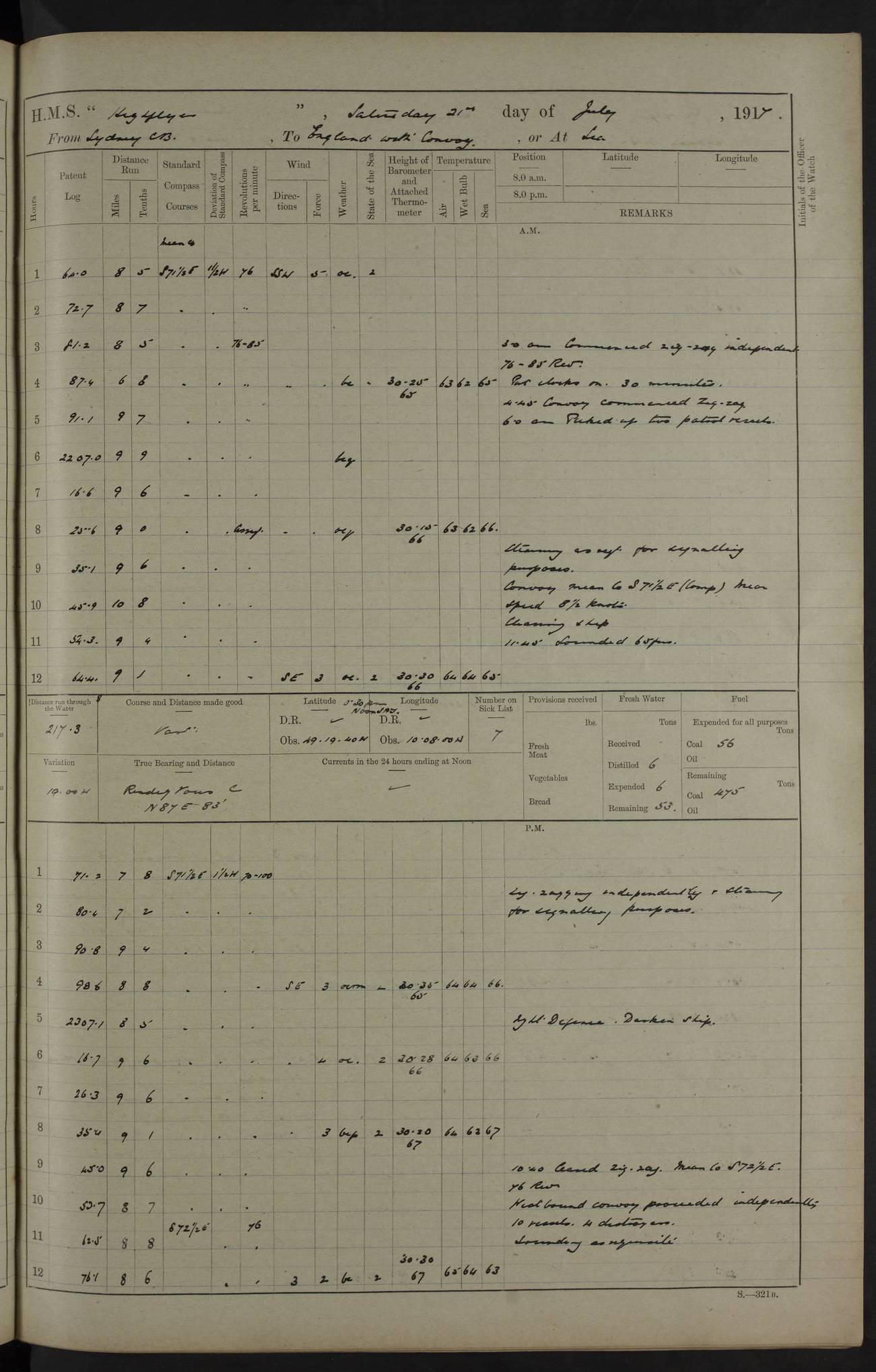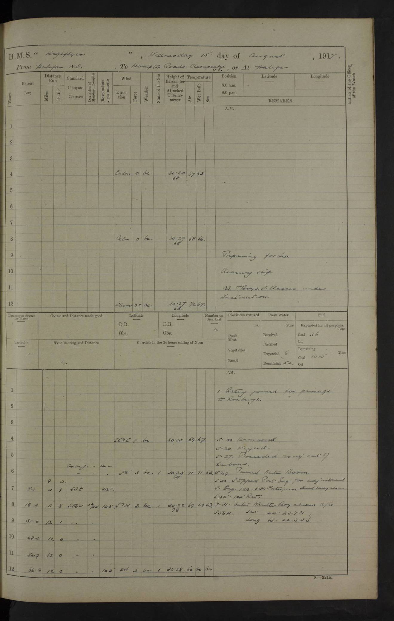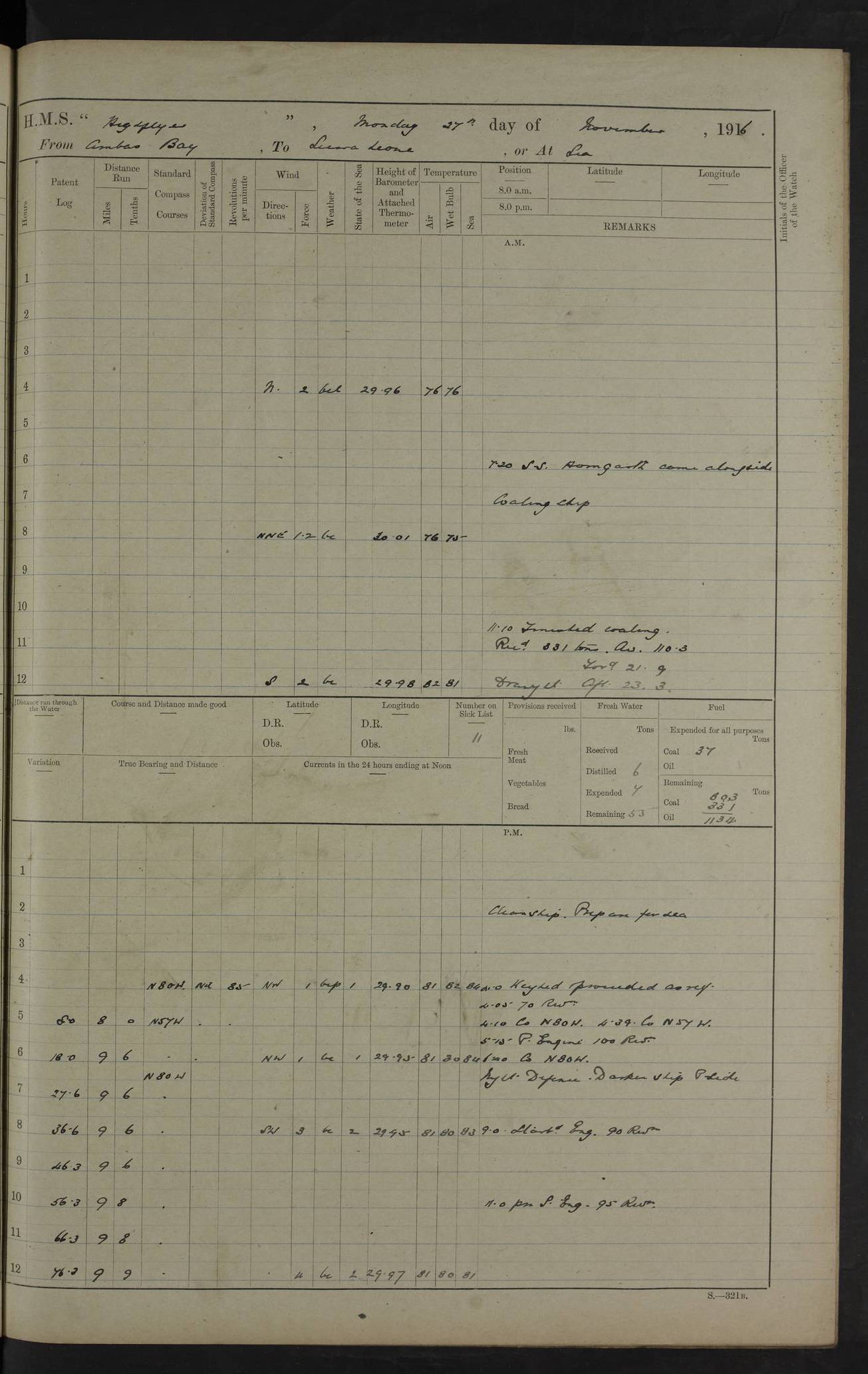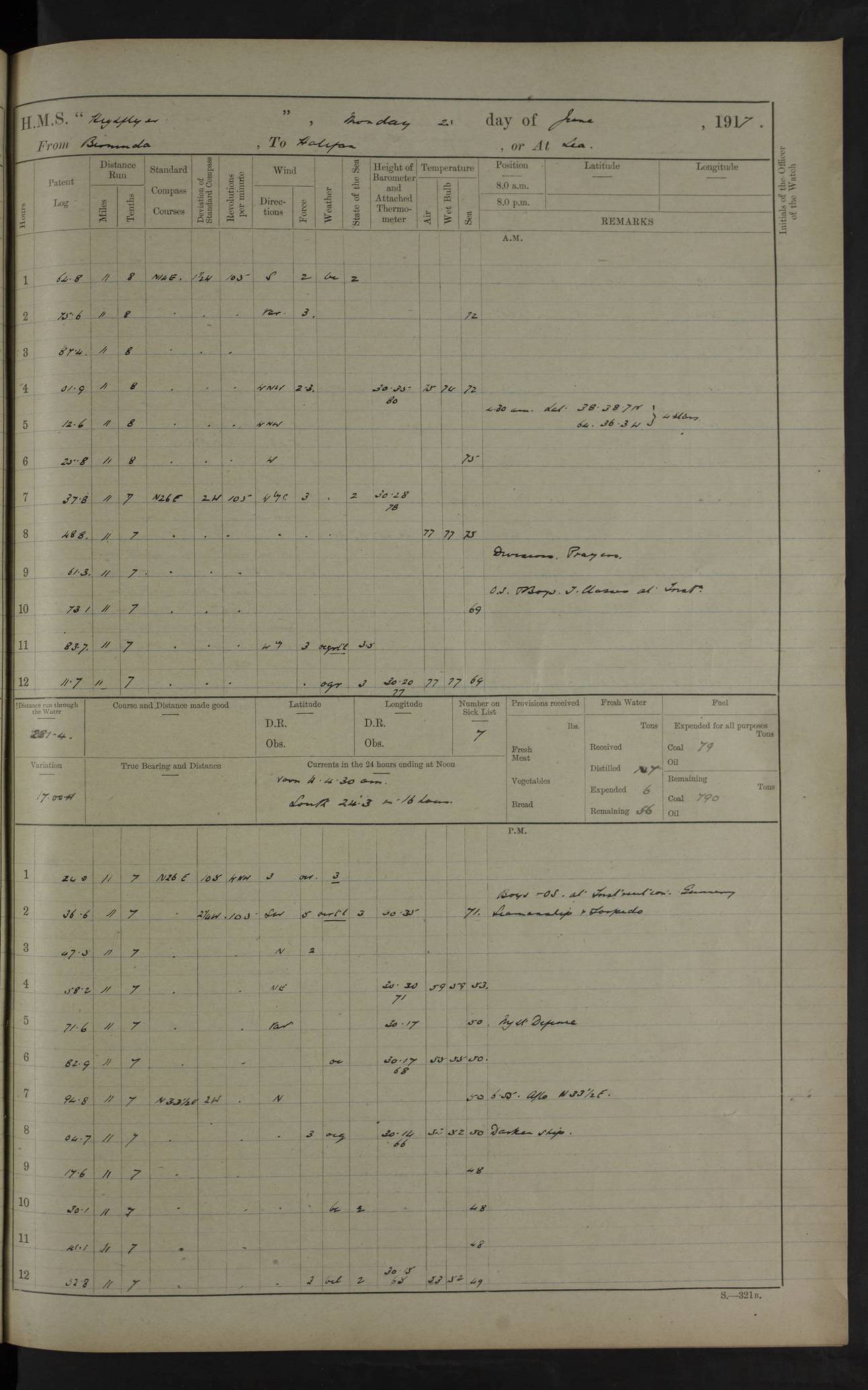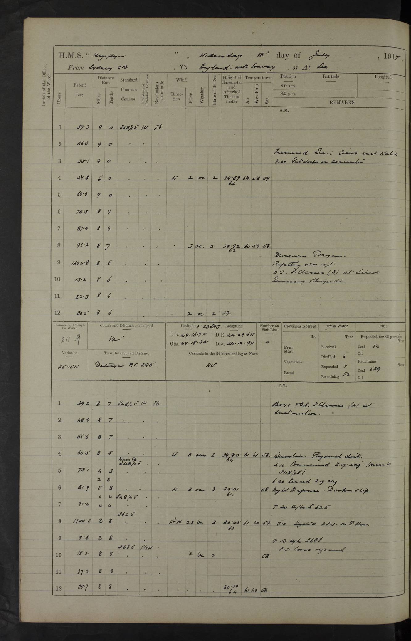 LOGS FOR JANUARY 1917 4ef4f321e53e0a0c91000902: (https://s3.amazonaws.com:443/oldweather/ADM53-44307/ADM 53-44307-129_1.jpg) 4ef4f321e53e0a0c91000903: (https://s3.amazonaws.com:443/oldweather/ADM53-44307/ADM 53-44307-130_0.jpg) 4ef4f321e53e0a0c91000904: (https://s3.amazonaws.com:443/oldweather/ADM53-44307/ADM 53-44307-130_1.jpg) 4ef4f321e53e0a0c91000905: (https://s3.amazonaws.com:443/oldweather/ADM53-44307/ADM 53-44307-131_0.jpg) 4ef4f321e53e0a0c91000906: (https://s3.amazonaws.com:443/oldweather/ADM53-44307/ADM 53-44307-131_1.jpg) 1 January 1917 Sierra Leone Lat 8.5, Long -13.2 6.30am: Party transferring provisions to DONEGAL. 10.00am: Party working on board SS VIRENT dismounting gun. 4ef4f321e53e0a0c91000907: (https://s3.amazonaws.com:443/oldweather/ADM53-44307/ADM 53-44307-132_0.jpg) 2 January 1917 Sierra Leone to St. Vincent Lat 8.7, Long -13.6 6.55am: SS ATLANTIC CITY came alongside. Coaling ship. 9.20am: Weighed and proceeded as requisite out of harbour. 4ef4f321e53e0a0c91000908: (https://s3.amazonaws.com:443/oldweather/ADM53-44307/ADM 53-44307-132_1.jpg) 3 January 1917 Sierra Leone to St. Vincent Lat 11.1, Long -17.7 2.30pm: Sighted SS on P bow steering to SE’d. 4ef4f321e53e0a0c91000909: (https://s3.amazonaws.com:443/oldweather/ADM53-44307/ADM 53-44307-133_0.jpg) 4 January 1917 Sierra Leone to St. Vincent Lat 13.8, Long -21.5 Boys and OS at school and seamanship instruction. Marines at drill. 11.30pm: Passing between St. Jago and Mayo Id. 4ef4f321e53e0a0c9100090a: (https://s3.amazonaws.com:443/oldweather/ADM53-44307/ADM 53-44307-133_1.jpg) 5 January 1917 Sierra Leone to St. Vincent Lat 16.8828, Long -25.0106 6.40am: Sighted San Nicholas Id. abeam. 11.58am: Came to SB 9 fathoms, 4½ shackles. 12.30pm: Lighters came alongside. 2.00pm: Coaling ship. 5.00pm: Stopped coaling for night. 4ef4f321e53e0a0c9100090b: (https://s3.amazonaws.com:443/oldweather/ADM53-44307/ADM 53-44307-134_0.jpg) 6 January 1917 St. Vincent Lat 16.8828, Long -25.0106 6.30am: Coaling ship from lighters. 12.30pm: Finished coaling; received 433 tons including deck cargo. 2.00pm: Prepared for sea. 4ef4f321e53e0a0c9100090c: (https://s3.amazonaws.com:443/oldweather/ADM53-44307/ADM 53-44307-134_1.jpg) 7 January 1917 St. Vincent to rendezvous to meet HMS Shannon and convoy Lat 17.4, Long -25.5 6.35am: Weighed and proceeded as requisite, 100 revs, to southward by San Antonio. 4ef4f321e53e0a0c9100090d: (https://s3.amazonaws.com:443/oldweather/ADM53-44307/ADM 53-44307-135_0.jpg) 8 January 1917 St. Vincent to meet HMS Shannon and convoy Lat 21.2, Long -26.3 9.30am: Party striking down coal. 4ef4f321e53e0a0c9100090e: (https://s3.amazonaws.com:443/oldweather/ADM53-44307/ADM 53-44307-135_1.jpg) 9 January 1917 St. Vincent to meet HMS Shannon and convoy Lat 23.9, Long -25.5 Cleaning ship. 9.00pm: Group closed up exercised during watch. 4ef4f322e53e0a0c9100090f: (https://s3.amazonaws.com:443/oldweather/ADM53-44307/ADM 53-44307-136_0.jpg) 10 January 1917 St. Vincent to meet HMS Shannon and convoy Lat 27.4, Long -25.1 2.00am: Groups closed up, exercised frequently during each watch. 6.30am: Sighted SS on southward beam steering NE’d. 4ef4f322e53e0a0c91000910: (https://s3.amazonaws.com:443/oldweather/ADM53-44307/ADM 53-44307-136_1.jpg) 11 January 1917 St. Vincent to meet HMS Shannon and convoy and to Sierra Leone Lat 29.7, Long -24.7 2.00am: Groups closed up, exercised frequently during each watch. 5.20am: Sighted SHANNON and convoy ahead – CARONIA, EMPRESS OF BRITAIN, WALMER CASTLE, TYNDAREUS, PAKEHA, NESTOR, CORINTHIC. 6.13am: Stopped. Communicated by boat with SHANNON. 6.25am: Course S17W. 115 rev. SHANNON proceeded NE’d., course as requisite to take up station with convoy. [A sketch is included showing the position of the ships. HIGHFLYER is in the middle of the front row with PAKEHA 10 cables to port and WALMER CASTLE 10 cables to starboard. NESTOR, then TYNDAREUS, follow PAKEHA. EMPRESS OF BRITAIN, then CARONIA, follow WALMER CASTLE. CORINTHIC is evenly spaced between TYNDAREUS and CARONIA.] 4ef4f322e53e0a0c91000911: (https://s3.amazonaws.com:443/oldweather/ADM53-44307/ADM 53-44307-137_0.jpg) 12 January 1917 To Sierra Leone with convoy Lat 23.9, Long -26.3 Guns’ crews closed up exercised frequently during day. Boys and OS to school and seamanship instruction. 4ef4f322e53e0a0c91000912: (https://s3.amazonaws.com:443/oldweather/ADM53-44307/ADM 53-44307-137_1.jpg) 13 January 1917 To Sierra Leone with convoy Lat 19.3, Long -28.0 3.57am: 80 rev. to allow TYNDAREUS to remedy engine defect. 4ef4f322e53e0a0c91000913: (https://s3.amazonaws.com:443/oldweather/ADM53-44307/ADM 53-44307-138_0.jpg) 14 January 1917 To Sierra Leone with convoy Lat 14.7, Long -26.9 9.00am: Mustered by Open List. 10.00am: Held Divine Service. 4ef4f322e53e0a0c91000914: (https://s3.amazonaws.com:443/oldweather/ADM53-44307/ADM 53-44307-138_1.jpg) 15 January 1917 To Sierra Leone with convoy Lat 12.3, Long -23.7 Party in stokehold trimming. 4ef4f322e53e0a0c91000915: (https://s3.amazonaws.com:443/oldweather/ADM53-44307/ADM 53-44307-139_0.jpg) 16 January 1917 To Sierra Leone with convoy Lat 10.4, Long -18.1 1.00pm: Hoisted colours half-mast. (Death on board EMPRESS OF BRITAIN.) 4ef4f322e53e0a0c91000916: (https://s3.amazonaws.com:443/oldweather/ADM53-44307/ADM 53-44307-139_1.jpg) 17 January 1917 To Sierra Leone with convoy Lat 8.5, Long -13.2 9.15am: Observed land ahead. Prepared for coaling. 10.40am: Formed single line ahead. 12.30pm: Transports proceeded independently to anchoring berths. 1.12pm: Came to with PB anchor in 10 fathoms, veered to 4 shackles, A3 berth. 5.30pm: SS MANSFIELD came alongside. 4ef4f322e53e0a0c91000917: (https://s3.amazonaws.com:443/oldweather/ADM53-44307/ADM 53-44307-140_0.jpg) 18 January 1917 Sierra Leone Lat 8.5, Long -13.2 6.00am: Commenced coaling. 2.15pm: Finished coaling; received 840 tons. 4ef4f322e53e0a0c91000918: (https://s3.amazonaws.com:443/oldweather/ADM53-44307/ADM 53-44307-140_1.jpg) 19 January 1917 Sierra Leone Lat 8.5, 