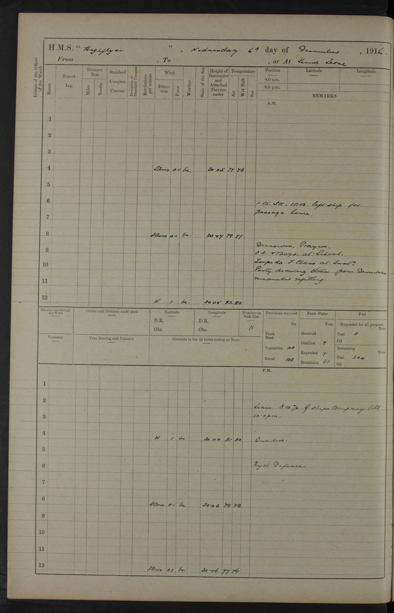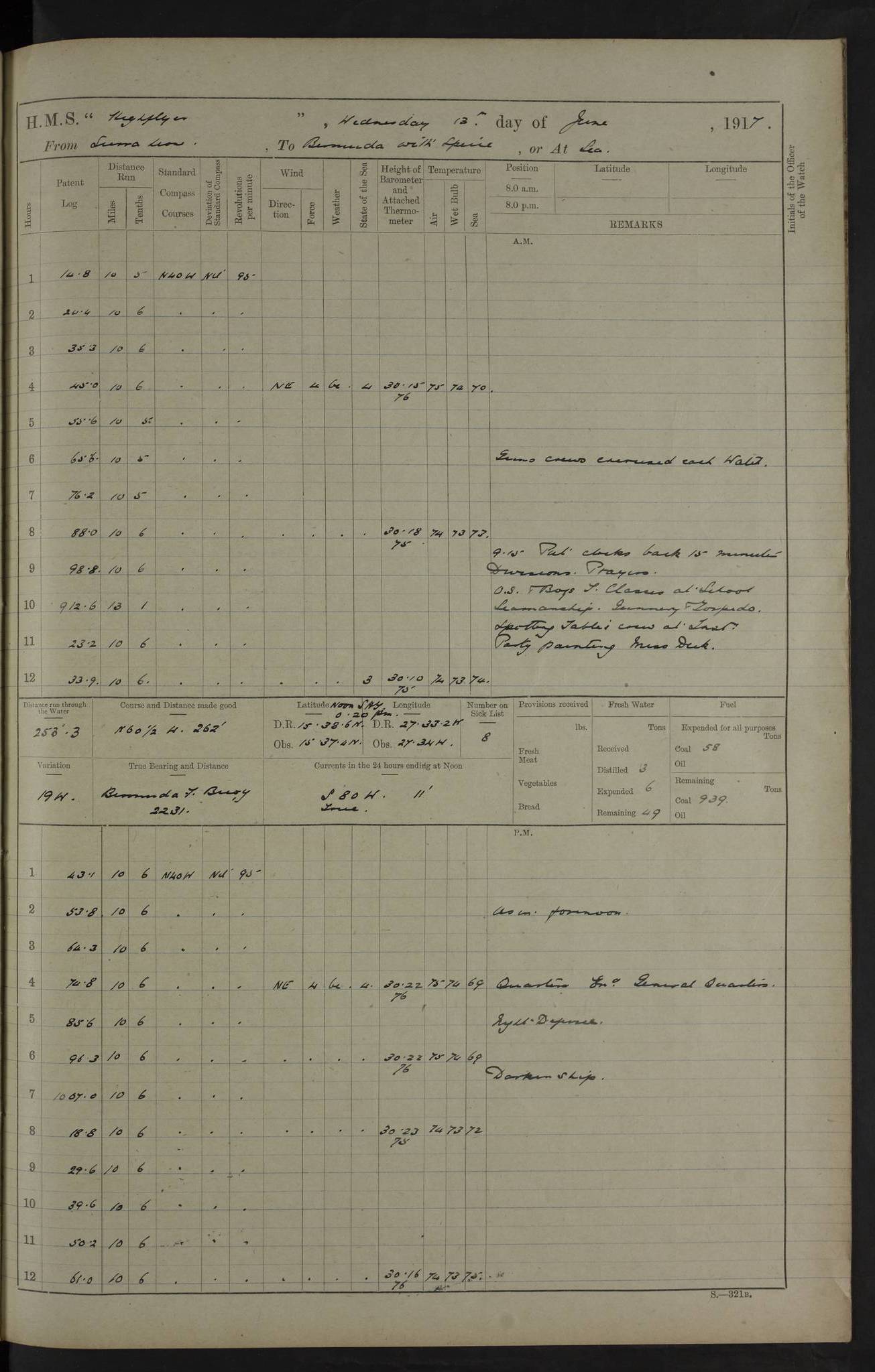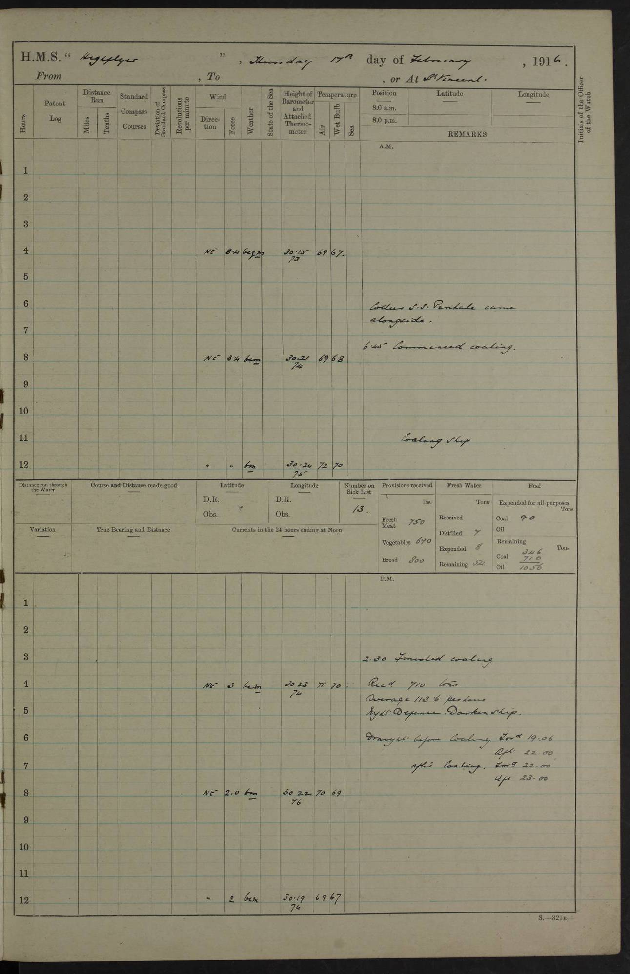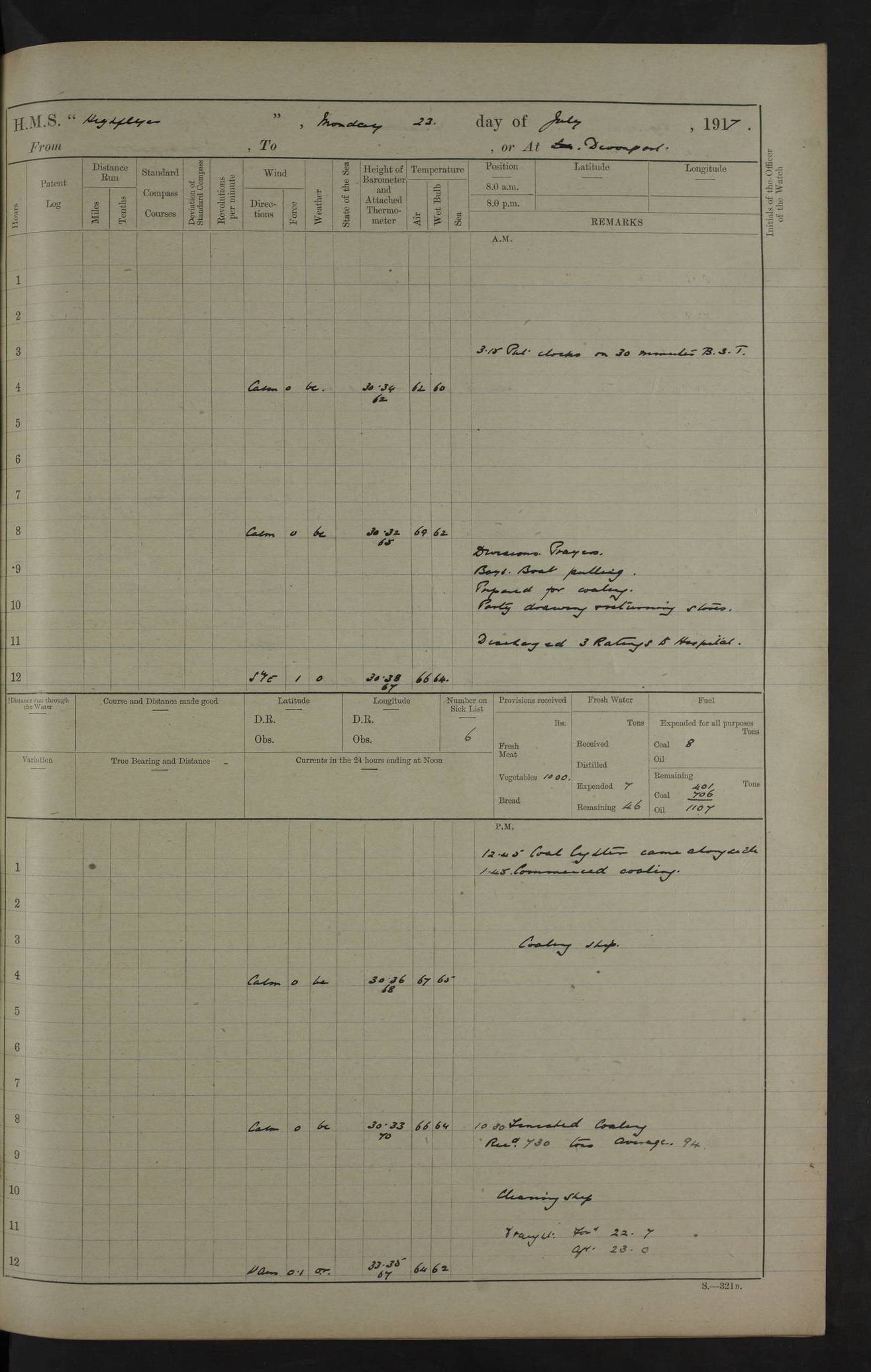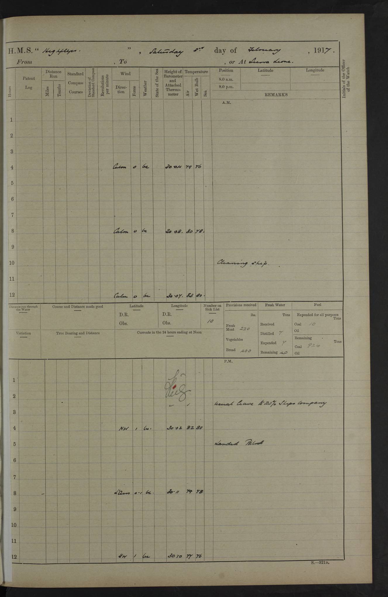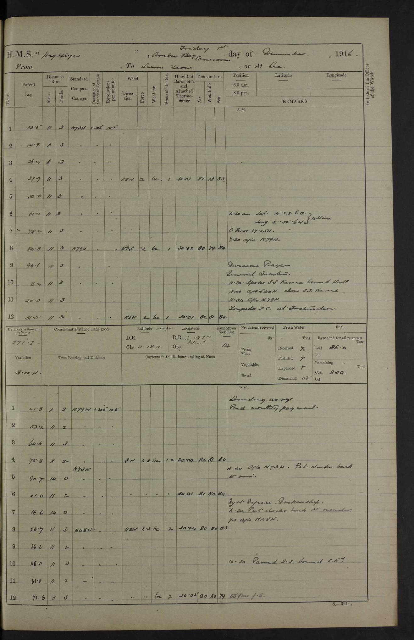 LOGS FOR JANUARY 1917 4ef4f321e53e0a0c91000902: (https://s3.amazonaws.com:443/oldweather/ADM53-44307/ADM 53-44307-129_1.jpg) 4ef4f321e53e0a0c91000903: (https://s3.amazonaws.com:443/oldweather/ADM53-44307/ADM 53-44307-130_0.jpg) 4ef4f321e53e0a0c91000904: (https://s3.amazonaws.com:443/oldweather/ADM53-44307/ADM 53-44307-130_1.jpg) 4ef4f321e53e0a0c91000905: (https://s3.amazonaws.com:443/oldweather/ADM53-44307/ADM 53-44307-131_0.jpg) 4ef4f321e53e0a0c91000906: (https://s3.amazonaws.com:443/oldweather/ADM53-44307/ADM 53-44307-131_1.jpg) 1 January 1917 Sierra Leone Lat 8.5, Long -13.2 6.30am: Party transferring provisions to DONEGAL. 10.00am: Party working on board SS VIRENT dismounting gun. 4ef4f321e53e0a0c91000907: (https://s3.amazonaws.com:443/oldweather/ADM53-44307/ADM 53-44307-132_0.jpg) 2 January 1917 Sierra Leone to St. Vincent Lat 8.7, Long -13.6 6.55am: SS ATLANTIC CITY came alongside. Coaling ship. 9.20am: Weighed and proceeded as requisite out of harbour. 4ef4f321e53e0a0c91000908: (https://s3.amazonaws.com:443/oldweather/ADM53-44307/ADM 53-44307-132_1.jpg) 3 January 1917 Sierra Leone to St. Vincent Lat 11.1, Long -17.7 2.30pm: Sighted SS on P bow steering to SE’d. 4ef4f321e53e0a0c91000909: (https://s3.amazonaws.com:443/oldweather/ADM53-44307/ADM 53-44307-133_0.jpg) 4 January 1917 Sierra Leone to St. Vincent Lat 13.8, Long -21.5 Boys and OS at school and seamanship instruction. Marines at drill. 11.30pm: Passing between St. Jago and Mayo Id. 4ef4f321e53e0a0c9100090a: (https://s3.amazonaws.com:443/oldweather/ADM53-44307/ADM 53-44307-133_1.jpg) 5 January 1917 Sierra Leone to St. Vincent Lat 16.8828, Long -25.0106 6.40am: Sighted San Nicholas Id. abeam. 11.58am: Came to SB 9 fathoms, 4½ shackles. 12.30pm: Lighters came alongside. 2.00pm: Coaling ship. 5.00pm: Stopped coaling for night. 4ef4f321e53e0a0c9100090b: (https://s3.amazonaws.com:443/oldweather/ADM53-44307/ADM 53-44307-134_0.jpg) 6 January 1917 St. Vincent Lat 16.8828, Long -25.0106 6.30am: Coaling ship from lighters. 12.30pm: Finished coaling; received 433 tons including deck cargo. 2.00pm: Prepared for sea. 4ef4f321e53e0a0c9100090c: (https://s3.amazonaws.com:443/oldweather/ADM53-44307/ADM 53-44307-134_1.jpg) 7 January 1917 St. Vincent to rendezvous to meet HMS Shannon and convoy Lat 17.4, Long -25.5 6.35am: Weighed and proceeded as requisite, 100 revs, to southward by San Antonio. 4ef4f321e53e0a0c9100090d: (https://s3.amazonaws.com:443/oldweather/ADM53-44307/ADM 53-44307-135_0.jpg) 8 January 1917 St. Vincent to meet HMS Shannon and convoy Lat 21.2, Long -26.3 9.30am: Party striking down coal. 4ef4f321e53e0a0c9100090e: (https://s3.amazonaws.com:443/oldweather/ADM53-44307/ADM 53-44307-135_1.jpg) 9 January 1917 St. Vincent to meet HMS Shannon and convoy Lat 23.9, Long -25.5 Cleaning ship. 9.00pm: Group closed up exercised during watch. 4ef4f322e53e0a0c9100090f: (https://s3.amazonaws.com:443/oldweather/ADM53-44307/ADM 53-44307-136_0.jpg) 10 January 1917 St. Vincent to meet HMS Shannon and convoy Lat 27.4, Long -25.1 2.00am: Groups closed up, exercised frequently during each watch. 6.30am: Sighted SS on southward beam steering NE’d. 4ef4f322e53e0a0c91000910: (https://s3.amazonaws.com:443/oldweather/ADM53-44307/ADM 53-44307-136_1.jpg) 11 January 1917 St. Vincent to meet HMS Shannon and convoy and to Sierra Leone Lat 29.7, Long -24.7 2.00am: Groups closed up, exercised frequently during each watch. 5.20am: Sighted SHANNON and convoy ahead – CARONIA, EMPRESS OF BRITAIN, WALMER CASTLE, TYNDAREUS, PAKEHA, NESTOR, CORINTHIC. 6.13am: Stopped. Communicated by boat with SHANNON. 6.25am: Course S17W. 115 rev. SHANNON proceeded NE’d., course as requisite to take up station with convoy. [A sketch is included showing the position of the ships. HIGHFLYER is in the middle of the front row with PAKEHA 10 cables to port and WALMER CASTLE 10 cables to starboard. NESTOR, then TYNDAREUS, follow PAKEHA. EMPRESS OF BRITAIN, then CARONIA, follow WALMER CASTLE. CORINTHIC is evenly spaced between TYNDAREUS and CARONIA.] 4ef4f322e53e0a0c91000911: (https://s3.amazonaws.com:443/oldweather/ADM53-44307/ADM 53-44307-137_0.jpg) 12 January 1917 To Sierra Leone with convoy Lat 23.9, Long -26.3 Guns’ crews closed up exercised frequently during day. Boys and OS to school and seamanship instruction. 4ef4f322e53e0a0c91000912: (https://s3.amazonaws.com:443/oldweather/ADM53-44307/ADM 53-44307-137_1.jpg) 13 January 1917 To Sierra Leone with convoy Lat 19.3, Long -28.0 3.57am: 80 rev. to allow TYNDAREUS to remedy engine defect. 4ef4f322e53e0a0c91000913: (https://s3.amazonaws.com:443/oldweather/ADM53-44307/ADM 53-44307-138_0.jpg) 14 January 1917 To Sierra Leone with convoy Lat 14.7, Long -26.9 9.00am: Mustered by Open List. 10.00am: Held Divine Service. 4ef4f322e53e0a0c91000914: (https://s3.amazonaws.com:443/oldweather/ADM53-44307/ADM 53-44307-138_1.jpg) 15 January 1917 To Sierra Leone with convoy Lat 12.3, Long -23.7 Party in stokehold trimming. 4ef4f322e53e0a0c91000915: (https://s3.amazonaws.com:443/oldweather/ADM53-44307/ADM 53-44307-139_0.jpg) 16 January 1917 To Sierra Leone with convoy Lat 10.4, Long -18.1 1.00pm: Hoisted colours half-mast. (Death on board EMPRESS OF BRITAIN.) 4ef4f322e53e0a0c91000916: (https://s3.amazonaws.com:443/oldweather/ADM53-44307/ADM 53-44307-139_1.jpg) 17 January 1917 To Sierra Leone with convoy Lat 8.5, Long -13.2 9.15am: Observed land ahead. Prepared for coaling. 10.40am: Formed single line ahead. 12.30pm: Transports proceeded independently to anchoring berths. 1.12pm: Came to with PB anchor in 10 fathoms, veered to 4 shackles, A3 berth. 5.30pm: SS MANSFIELD came alongside. 4ef4f322e53e0a0c91000917: (https://s3.amazonaws.com:443/oldweather/ADM53-44307/ADM 53-44307-140_0.jpg) 18 January 1917 Sierra Leone Lat 8.5, Long -13.2 6.00am: Commenced coaling. 2.15pm: Finished coaling; received 840 tons. 4ef4f322e53e0a0c91000918: (https://s3.amazonaws.com:443/oldweather/ADM53-44307/ADM 53-44307-140_1.jpg) 19 January 1917 Sierra Leone Lat 8.5, 