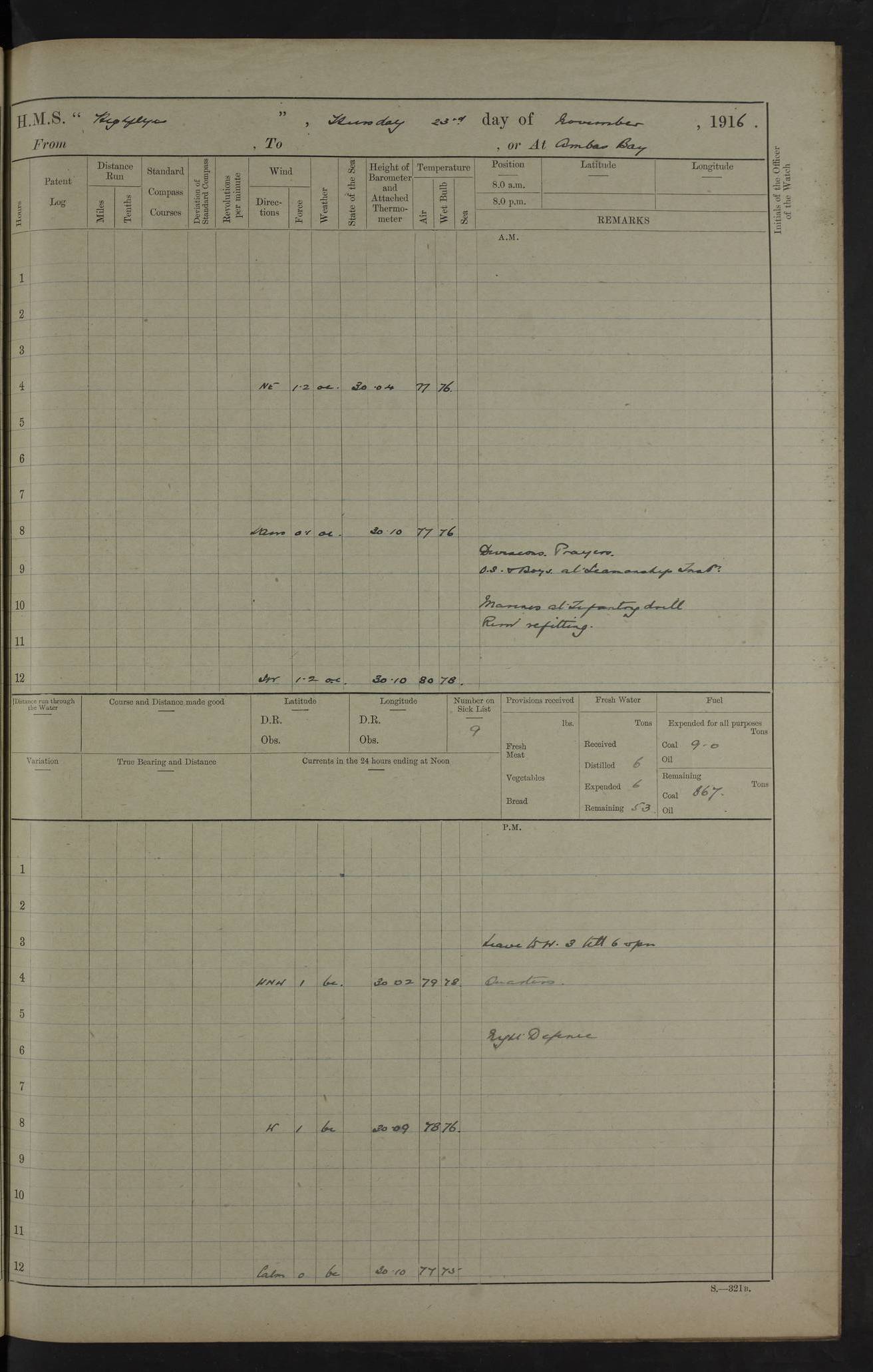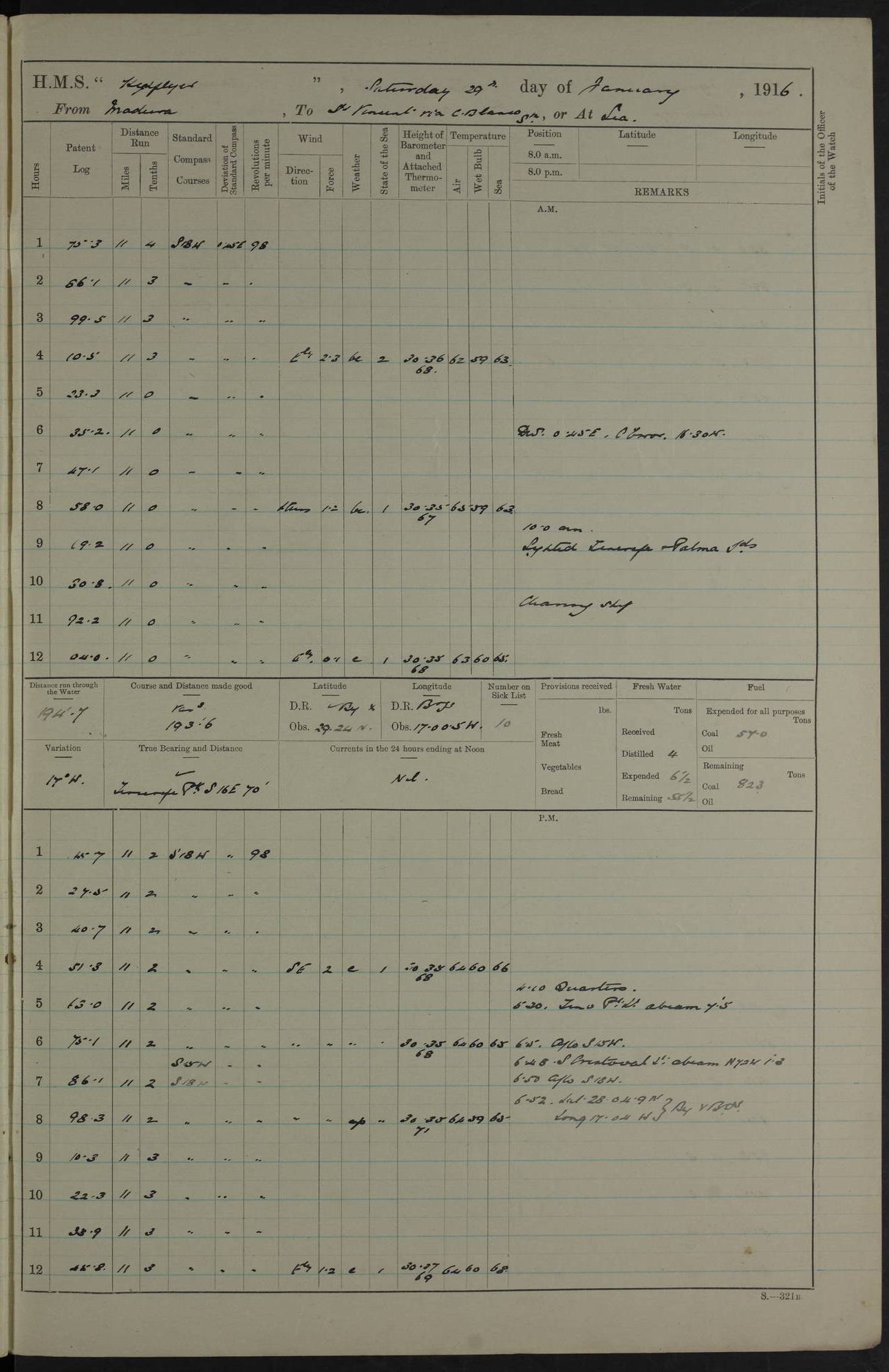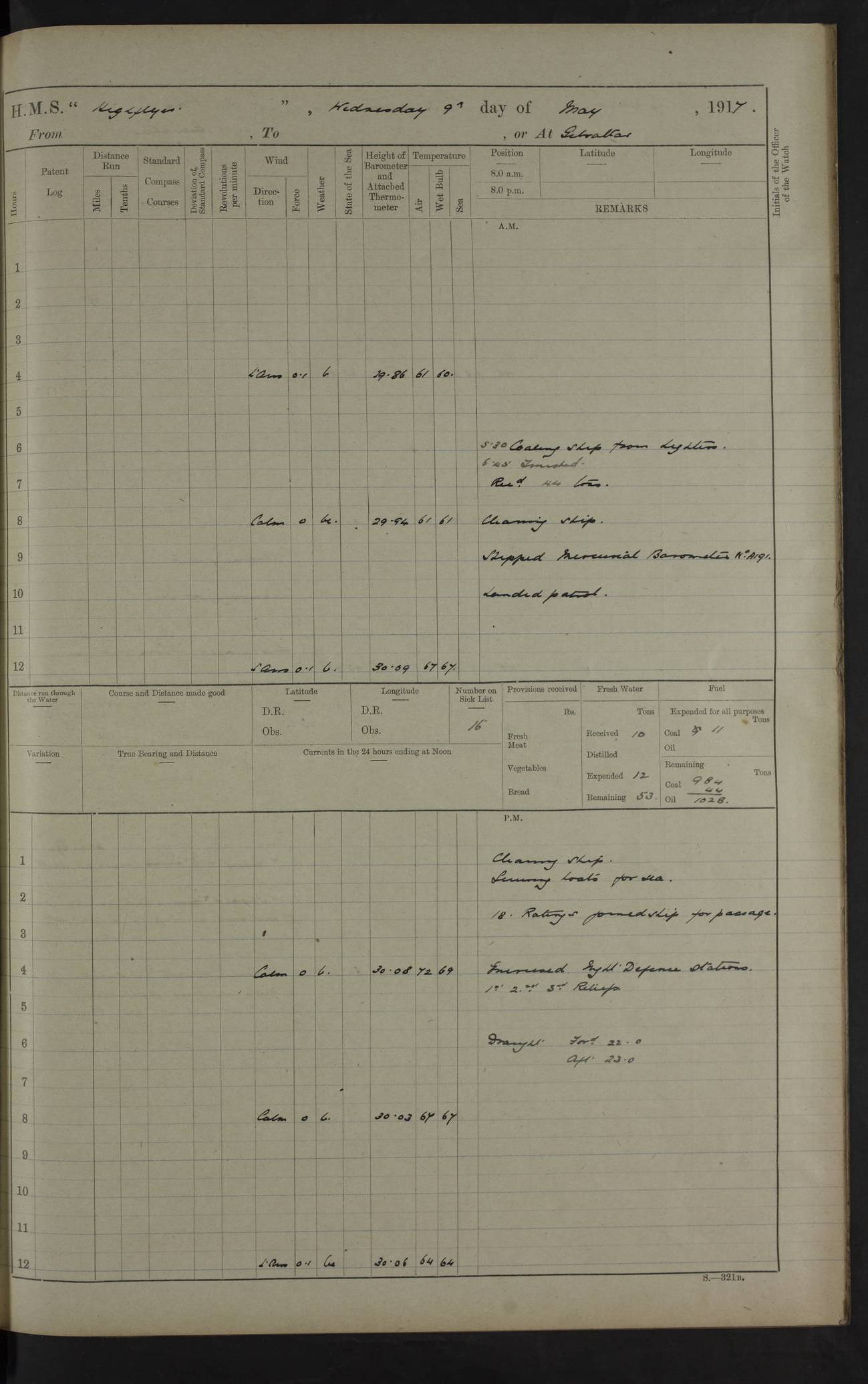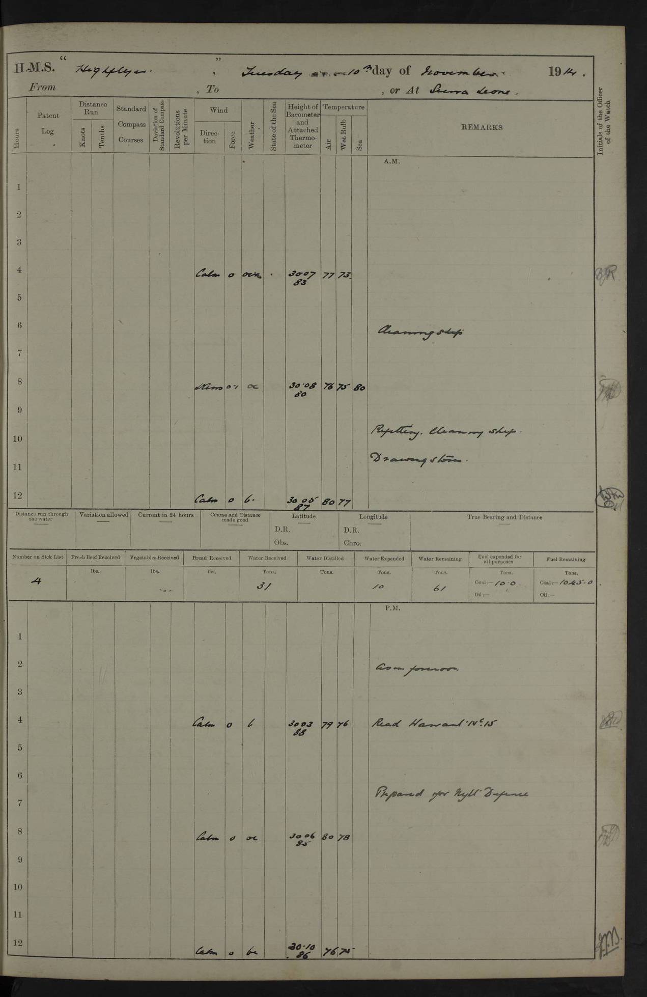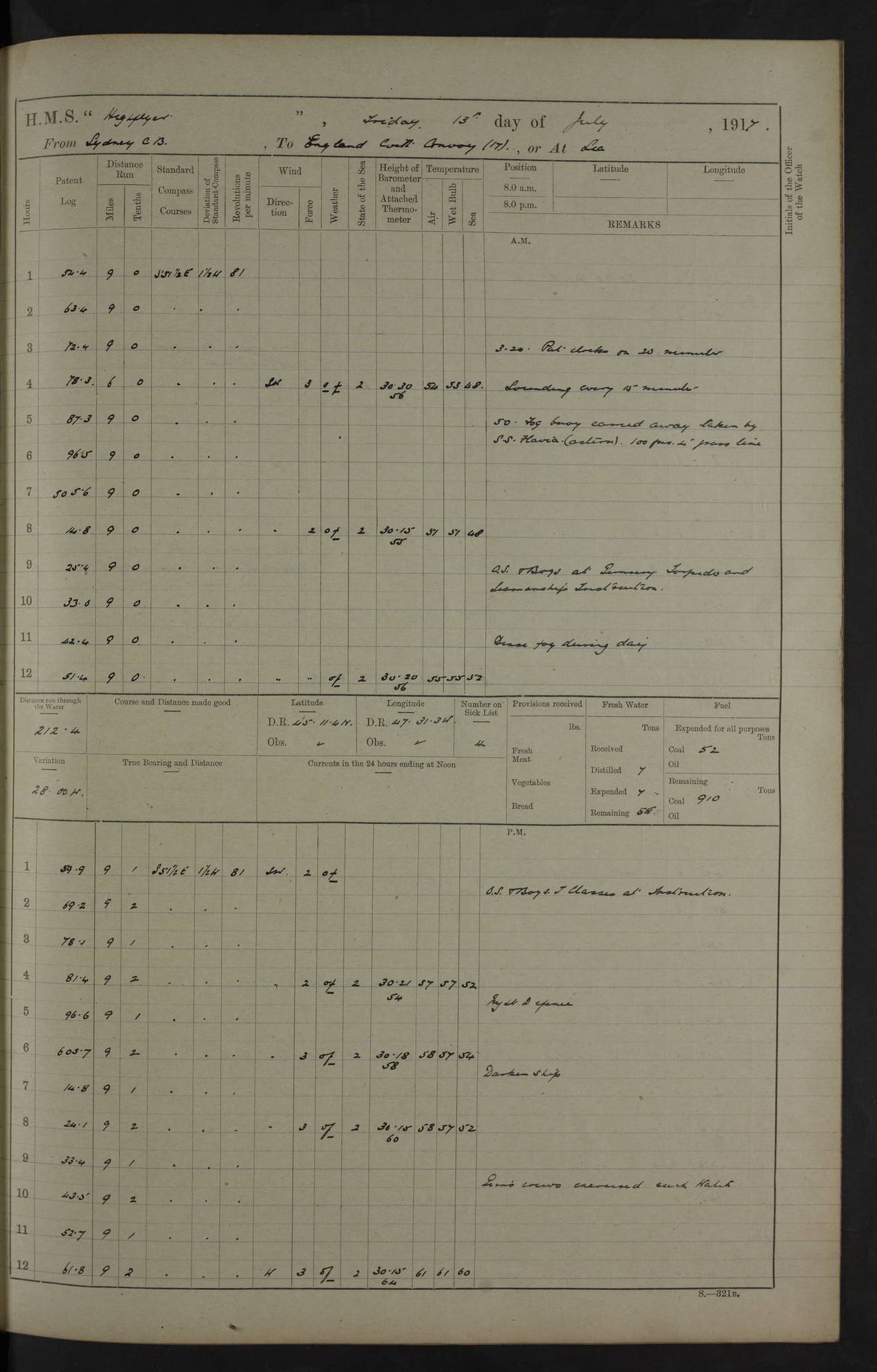 LOGS FOR JANUARY 1917 4ef4f321e53e0a0c91000902: (https://s3.amazonaws.com:443/oldweather/ADM53-44307/ADM 53-44307-129_1.jpg) 4ef4f321e53e0a0c91000903: (https://s3.amazonaws.com:443/oldweather/ADM53-44307/ADM 53-44307-130_0.jpg) 4ef4f321e53e0a0c91000904: (https://s3.amazonaws.com:443/oldweather/ADM53-44307/ADM 53-44307-130_1.jpg) 4ef4f321e53e0a0c91000905: (https://s3.amazonaws.com:443/oldweather/ADM53-44307/ADM 53-44307-131_0.jpg) 4ef4f321e53e0a0c91000906: (https://s3.amazonaws.com:443/oldweather/ADM53-44307/ADM 53-44307-131_1.jpg) 1 January 1917 Sierra Leone Lat 8.5, Long -13.2 6.30am: Party transferring provisions to DONEGAL. 10.00am: Party working on board SS VIRENT dismounting gun. 4ef4f321e53e0a0c91000907: (https://s3.amazonaws.com:443/oldweather/ADM53-44307/ADM 53-44307-132_0.jpg) 2 January 1917 Sierra Leone to St. Vincent Lat 8.7, Long -13.6 6.55am: SS ATLANTIC CITY came alongside. Coaling ship. 9.20am: Weighed and proceeded as requisite out of harbour. 4ef4f321e53e0a0c91000908: (https://s3.amazonaws.com:443/oldweather/ADM53-44307/ADM 53-44307-132_1.jpg) 3 January 1917 Sierra Leone to St. Vincent Lat 11.1, Long -17.7 2.30pm: Sighted SS on P bow steering to SE’d. 4ef4f321e53e0a0c91000909: (https://s3.amazonaws.com:443/oldweather/ADM53-44307/ADM 53-44307-133_0.jpg) 4 January 1917 Sierra Leone to St. Vincent Lat 13.8, Long -21.5 Boys and OS at school and seamanship instruction. Marines at drill. 11.30pm: Passing between St. Jago and Mayo Id. 4ef4f321e53e0a0c9100090a: (https://s3.amazonaws.com:443/oldweather/ADM53-44307/ADM 53-44307-133_1.jpg) 5 January 1917 Sierra Leone to St. Vincent Lat 16.8828, Long -25.0106 6.40am: Sighted San Nicholas Id. abeam. 11.58am: Came to SB 9 fathoms, 4½ shackles. 12.30pm: Lighters came alongside. 2.00pm: Coaling ship. 5.00pm: Stopped coaling for night. 4ef4f321e53e0a0c9100090b: (https://s3.amazonaws.com:443/oldweather/ADM53-44307/ADM 53-44307-134_0.jpg) 6 January 1917 St. Vincent Lat 16.8828, Long -25.0106 6.30am: Coaling ship from lighters. 12.30pm: Finished coaling; received 433 tons including deck cargo. 2.00pm: Prepared for sea. 4ef4f321e53e0a0c9100090c: (https://s3.amazonaws.com:443/oldweather/ADM53-44307/ADM 53-44307-134_1.jpg) 7 January 1917 St. Vincent to rendezvous to meet HMS Shannon and convoy Lat 17.4, Long -25.5 6.35am: Weighed and proceeded as requisite, 100 revs, to southward by San Antonio. 4ef4f321e53e0a0c9100090d: (https://s3.amazonaws.com:443/oldweather/ADM53-44307/ADM 53-44307-135_0.jpg) 8 January 1917 St. Vincent to meet HMS Shannon and convoy Lat 21.2, Long -26.3 9.30am: Party striking down coal. 4ef4f321e53e0a0c9100090e: (https://s3.amazonaws.com:443/oldweather/ADM53-44307/ADM 53-44307-135_1.jpg) 9 January 1917 St. Vincent to meet HMS Shannon and convoy Lat 23.9, Long -25.5 Cleaning ship. 9.00pm: Group closed up exercised during watch. 4ef4f322e53e0a0c9100090f: (https://s3.amazonaws.com:443/oldweather/ADM53-44307/ADM 53-44307-136_0.jpg) 10 January 1917 St. Vincent to meet HMS Shannon and convoy Lat 27.4, Long -25.1 2.00am: Groups closed up, exercised frequently during each watch. 6.30am: Sighted SS on southward beam steering NE’d. 4ef4f322e53e0a0c91000910: (https://s3.amazonaws.com:443/oldweather/ADM53-44307/ADM 53-44307-136_1.jpg) 11 January 1917 St. Vincent to meet HMS Shannon and convoy and to Sierra Leone Lat 29.7, Long -24.7 2.00am: Groups closed up, exercised frequently during each watch. 5.20am: Sighted SHANNON and convoy ahead – CARONIA, EMPRESS OF BRITAIN, WALMER CASTLE, TYNDAREUS, PAKEHA, NESTOR, CORINTHIC. 6.13am: Stopped. Communicated by boat with SHANNON. 6.25am: Course S17W. 115 rev. SHANNON proceeded NE’d., course as requisite to take up station with convoy. [A sketch is included showing the position of the ships. HIGHFLYER is in the middle of the front row with PAKEHA 10 cables to port and WALMER CASTLE 10 cables to starboard. NESTOR, then TYNDAREUS, follow PAKEHA. EMPRESS OF BRITAIN, then CARONIA, follow WALMER CASTLE. CORINTHIC is evenly spaced between TYNDAREUS and CARONIA.] 4ef4f322e53e0a0c91000911: (https://s3.amazonaws.com:443/oldweather/ADM53-44307/ADM 53-44307-137_0.jpg) 12 January 1917 To Sierra Leone with convoy Lat 23.9, Long -26.3 Guns’ crews closed up exercised frequently during day. Boys and OS to school and seamanship instruction. 4ef4f322e53e0a0c91000912: (https://s3.amazonaws.com:443/oldweather/ADM53-44307/ADM 53-44307-137_1.jpg) 13 January 1917 To Sierra Leone with convoy Lat 19.3, Long -28.0 3.57am: 80 rev. to allow TYNDAREUS to remedy engine defect. 4ef4f322e53e0a0c91000913: (https://s3.amazonaws.com:443/oldweather/ADM53-44307/ADM 53-44307-138_0.jpg) 14 January 1917 To Sierra Leone with convoy Lat 14.7, Long -26.9 9.00am: Mustered by Open List. 10.00am: Held Divine Service. 4ef4f322e53e0a0c91000914: (https://s3.amazonaws.com:443/oldweather/ADM53-44307/ADM 53-44307-138_1.jpg) 15 January 1917 To Sierra Leone with convoy Lat 12.3, Long -23.7 Party in stokehold trimming. 4ef4f322e53e0a0c91000915: (https://s3.amazonaws.com:443/oldweather/ADM53-44307/ADM 53-44307-139_0.jpg) 16 January 1917 To Sierra Leone with convoy Lat 10.4, Long -18.1 1.00pm: Hoisted colours half-mast. (Death on board EMPRESS OF BRITAIN.) 4ef4f322e53e0a0c91000916: (https://s3.amazonaws.com:443/oldweather/ADM53-44307/ADM 53-44307-139_1.jpg) 17 January 1917 To Sierra Leone with convoy Lat 8.5, Long -13.2 9.15am: Observed land ahead. Prepared for coaling. 10.40am: Formed single line ahead. 12.30pm: Transports proceeded independently to anchoring berths. 1.12pm: Came to with PB anchor in 10 fathoms, veered to 4 shackles, A3 berth. 5.30pm: SS MANSFIELD came alongside. 4ef4f322e53e0a0c91000917: (https://s3.amazonaws.com:443/oldweather/ADM53-44307/ADM 53-44307-140_0.jpg) 18 January 1917 Sierra Leone Lat 8.5, Long -13.2 6.00am: Commenced coaling. 2.15pm: Finished coaling; received 840 tons. 4ef4f322e53e0a0c91000918: (https://s3.amazonaws.com:443/oldweather/ADM53-44307/ADM 53-44307-140_1.jpg) 19 January 1917 Sierra Leone Lat 8.5, 