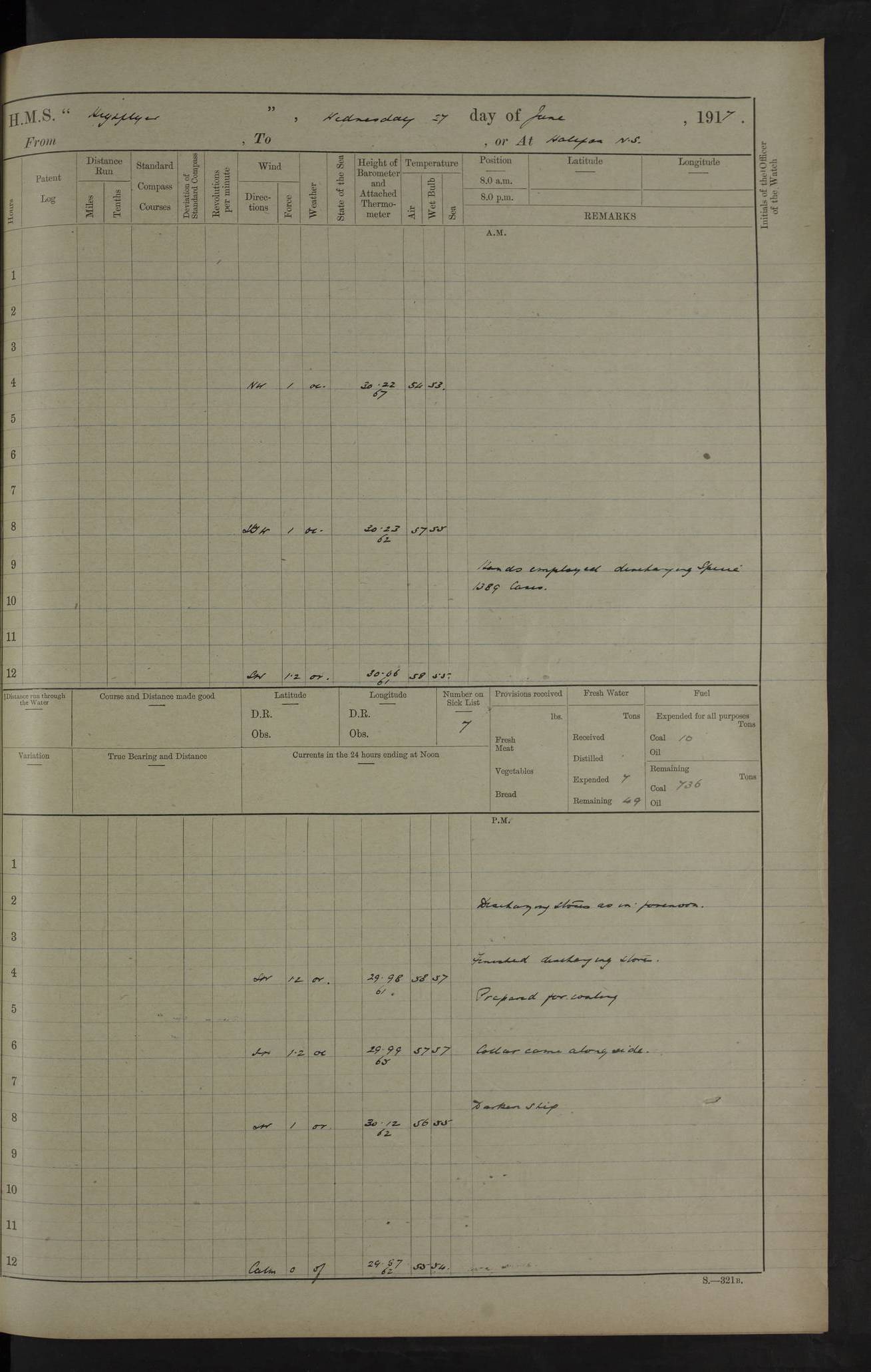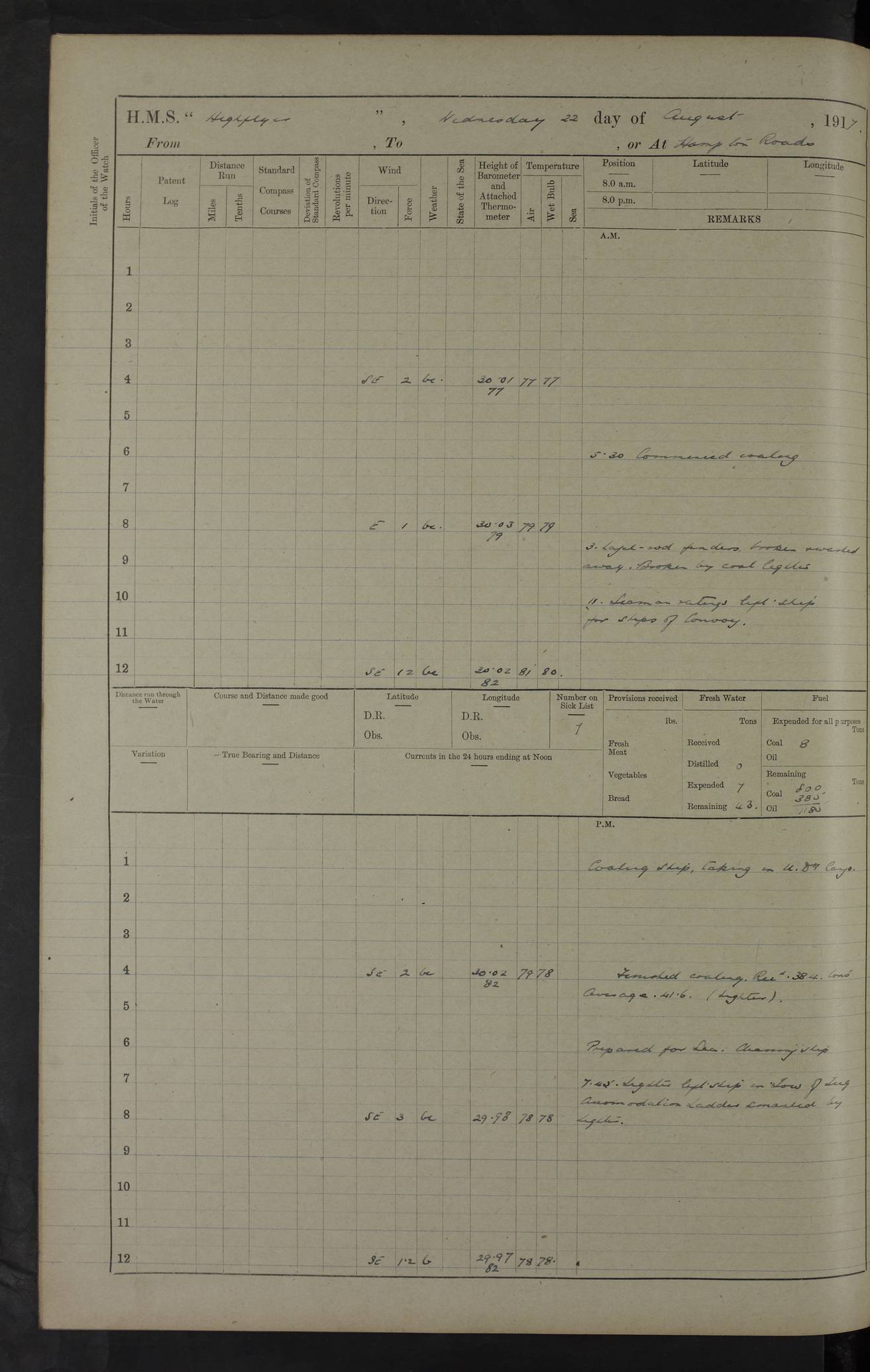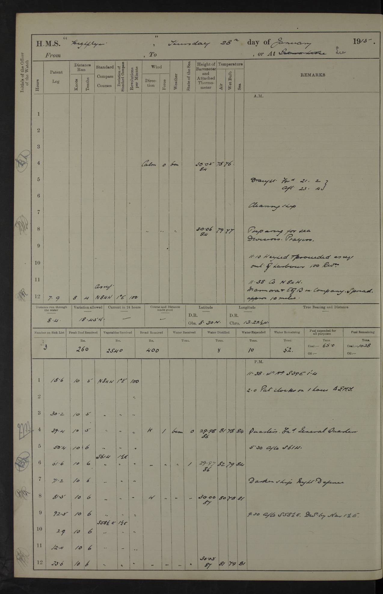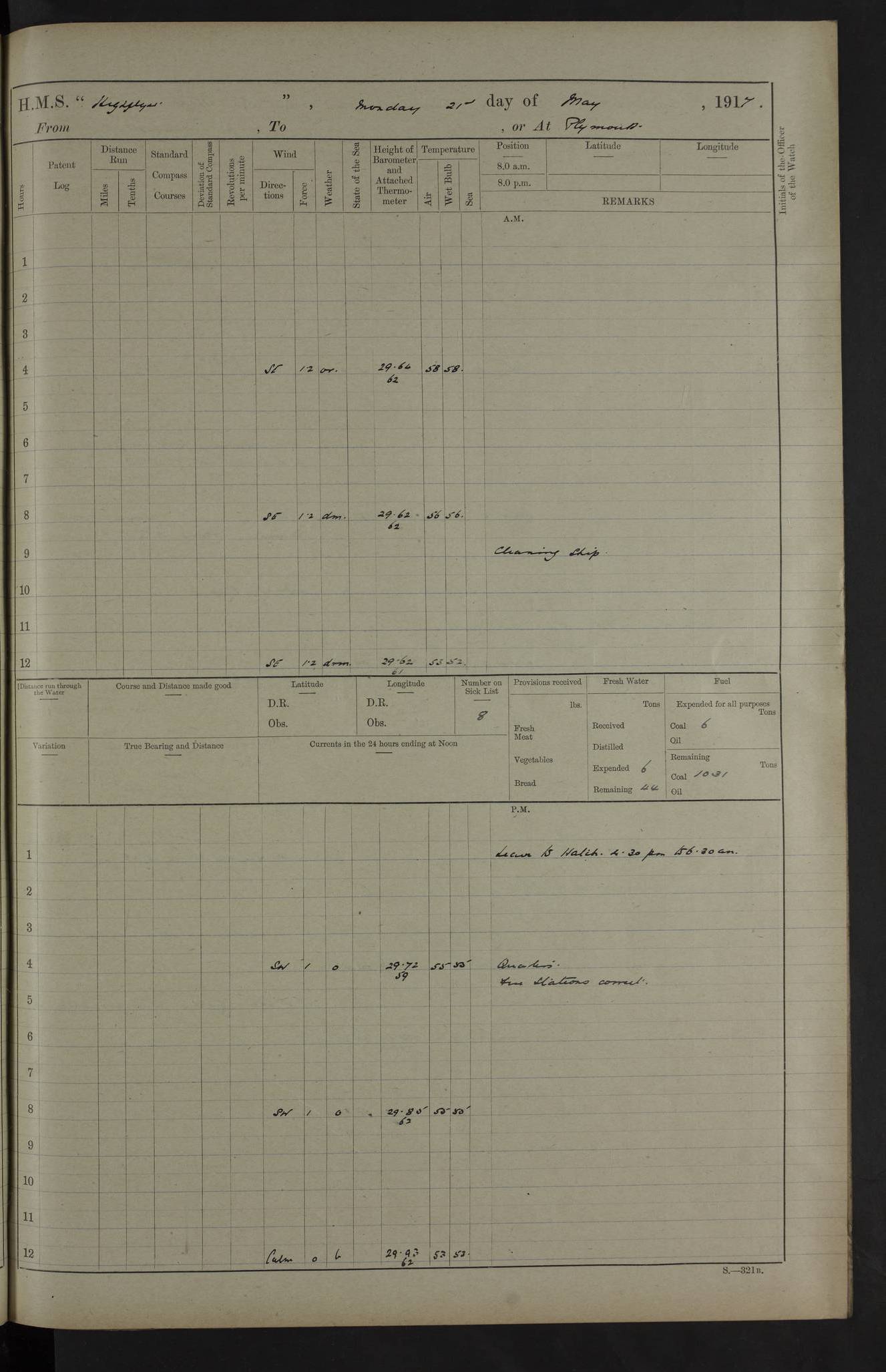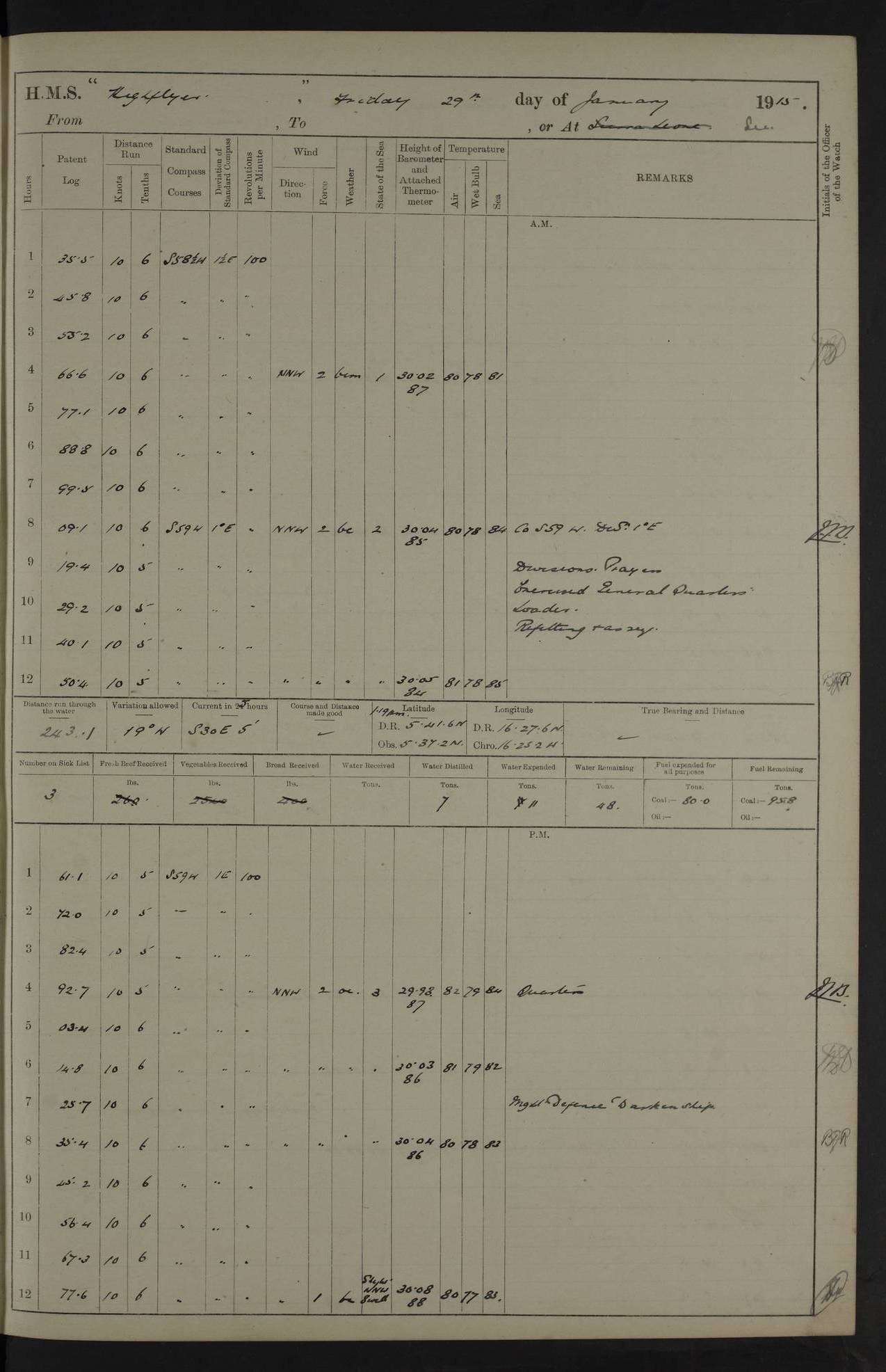 LOGS FOR JANUARY 1917 4ef4f321e53e0a0c91000902: (https://s3.amazonaws.com:443/oldweather/ADM53-44307/ADM 53-44307-129_1.jpg) 4ef4f321e53e0a0c91000903: (https://s3.amazonaws.com:443/oldweather/ADM53-44307/ADM 53-44307-130_0.jpg) 4ef4f321e53e0a0c91000904: (https://s3.amazonaws.com:443/oldweather/ADM53-44307/ADM 53-44307-130_1.jpg) 4ef4f321e53e0a0c91000905: (https://s3.amazonaws.com:443/oldweather/ADM53-44307/ADM 53-44307-131_0.jpg) 4ef4f321e53e0a0c91000906: (https://s3.amazonaws.com:443/oldweather/ADM53-44307/ADM 53-44307-131_1.jpg) 1 January 1917 Sierra Leone Lat 8.5, Long -13.2 6.30am: Party transferring provisions to DONEGAL. 10.00am: Party working on board SS VIRENT dismounting gun. 4ef4f321e53e0a0c91000907: (https://s3.amazonaws.com:443/oldweather/ADM53-44307/ADM 53-44307-132_0.jpg) 2 January 1917 Sierra Leone to St. Vincent Lat 8.7, Long -13.6 6.55am: SS ATLANTIC CITY came alongside. Coaling ship. 9.20am: Weighed and proceeded as requisite out of harbour. 4ef4f321e53e0a0c91000908: (https://s3.amazonaws.com:443/oldweather/ADM53-44307/ADM 53-44307-132_1.jpg) 3 January 1917 Sierra Leone to St. Vincent Lat 11.1, Long -17.7 2.30pm: Sighted SS on P bow steering to SE’d. 4ef4f321e53e0a0c91000909: (https://s3.amazonaws.com:443/oldweather/ADM53-44307/ADM 53-44307-133_0.jpg) 4 January 1917 Sierra Leone to St. Vincent Lat 13.8, Long -21.5 Boys and OS at school and seamanship instruction. Marines at drill. 11.30pm: Passing between St. Jago and Mayo Id. 4ef4f321e53e0a0c9100090a: (https://s3.amazonaws.com:443/oldweather/ADM53-44307/ADM 53-44307-133_1.jpg) 5 January 1917 Sierra Leone to St. Vincent Lat 16.8828, Long -25.0106 6.40am: Sighted San Nicholas Id. abeam. 11.58am: Came to SB 9 fathoms, 4½ shackles. 12.30pm: Lighters came alongside. 2.00pm: Coaling ship. 5.00pm: Stopped coaling for night. 4ef4f321e53e0a0c9100090b: (https://s3.amazonaws.com:443/oldweather/ADM53-44307/ADM 53-44307-134_0.jpg) 6 January 1917 St. Vincent Lat 16.8828, Long -25.0106 6.30am: Coaling ship from lighters. 12.30pm: Finished coaling; received 433 tons including deck cargo. 2.00pm: Prepared for sea. 4ef4f321e53e0a0c9100090c: (https://s3.amazonaws.com:443/oldweather/ADM53-44307/ADM 53-44307-134_1.jpg) 7 January 1917 St. Vincent to rendezvous to meet HMS Shannon and convoy Lat 17.4, Long -25.5 6.35am: Weighed and proceeded as requisite, 100 revs, to southward by San Antonio. 4ef4f321e53e0a0c9100090d: (https://s3.amazonaws.com:443/oldweather/ADM53-44307/ADM 53-44307-135_0.jpg) 8 January 1917 St. Vincent to meet HMS Shannon and convoy Lat 21.2, Long -26.3 9.30am: Party striking down coal. 4ef4f321e53e0a0c9100090e: (https://s3.amazonaws.com:443/oldweather/ADM53-44307/ADM 53-44307-135_1.jpg) 9 January 1917 St. Vincent to meet HMS Shannon and convoy Lat 23.9, Long -25.5 Cleaning ship. 9.00pm: Group closed up exercised during watch. 4ef4f322e53e0a0c9100090f: (https://s3.amazonaws.com:443/oldweather/ADM53-44307/ADM 53-44307-136_0.jpg) 10 January 1917 St. Vincent to meet HMS Shannon and convoy Lat 27.4, Long -25.1 2.00am: Groups closed up, exercised frequently during each watch. 6.30am: Sighted SS on southward beam steering NE’d. 4ef4f322e53e0a0c91000910: (https://s3.amazonaws.com:443/oldweather/ADM53-44307/ADM 53-44307-136_1.jpg) 11 January 1917 St. Vincent to meet HMS Shannon and convoy and to Sierra Leone Lat 29.7, Long -24.7 2.00am: Groups closed up, exercised frequently during each watch. 5.20am: Sighted SHANNON and convoy ahead – CARONIA, EMPRESS OF BRITAIN, WALMER CASTLE, TYNDAREUS, PAKEHA, NESTOR, CORINTHIC. 6.13am: Stopped. Communicated by boat with SHANNON. 6.25am: Course S17W. 115 rev. SHANNON proceeded NE’d., course as requisite to take up station with convoy. [A sketch is included showing the position of the ships. HIGHFLYER is in the middle of the front row with PAKEHA 10 cables to port and WALMER CASTLE 10 cables to starboard. NESTOR, then TYNDAREUS, follow PAKEHA. EMPRESS OF BRITAIN, then CARONIA, follow WALMER CASTLE. CORINTHIC is evenly spaced between TYNDAREUS and CARONIA.] 4ef4f322e53e0a0c91000911: (https://s3.amazonaws.com:443/oldweather/ADM53-44307/ADM 53-44307-137_0.jpg) 12 January 1917 To Sierra Leone with convoy Lat 23.9, Long -26.3 Guns’ crews closed up exercised frequently during day. Boys and OS to school and seamanship instruction. 4ef4f322e53e0a0c91000912: (https://s3.amazonaws.com:443/oldweather/ADM53-44307/ADM 53-44307-137_1.jpg) 13 January 1917 To Sierra Leone with convoy Lat 19.3, Long -28.0 3.57am: 80 rev. to allow TYNDAREUS to remedy engine defect. 4ef4f322e53e0a0c91000913: (https://s3.amazonaws.com:443/oldweather/ADM53-44307/ADM 53-44307-138_0.jpg) 14 January 1917 To Sierra Leone with convoy Lat 14.7, Long -26.9 9.00am: Mustered by Open List. 10.00am: Held Divine Service. 4ef4f322e53e0a0c91000914: (https://s3.amazonaws.com:443/oldweather/ADM53-44307/ADM 53-44307-138_1.jpg) 15 January 1917 To Sierra Leone with convoy Lat 12.3, Long -23.7 Party in stokehold trimming. 4ef4f322e53e0a0c91000915: (https://s3.amazonaws.com:443/oldweather/ADM53-44307/ADM 53-44307-139_0.jpg) 16 January 1917 To Sierra Leone with convoy Lat 10.4, Long -18.1 1.00pm: Hoisted colours half-mast. (Death on board EMPRESS OF BRITAIN.) 4ef4f322e53e0a0c91000916: (https://s3.amazonaws.com:443/oldweather/ADM53-44307/ADM 53-44307-139_1.jpg) 17 January 1917 To Sierra Leone with convoy Lat 8.5, Long -13.2 9.15am: Observed land ahead. Prepared for coaling. 10.40am: Formed single line ahead. 12.30pm: Transports proceeded independently to anchoring berths. 1.12pm: Came to with PB anchor in 10 fathoms, veered to 4 shackles, A3 berth. 5.30pm: SS MANSFIELD came alongside. 4ef4f322e53e0a0c91000917: (https://s3.amazonaws.com:443/oldweather/ADM53-44307/ADM 53-44307-140_0.jpg) 18 January 1917 Sierra Leone Lat 8.5, Long -13.2 6.00am: Commenced coaling. 2.15pm: Finished coaling; received 840 tons. 4ef4f322e53e0a0c91000918: (https://s3.amazonaws.com:443/oldweather/ADM53-44307/ADM 53-44307-140_1.jpg) 19 January 1917 Sierra Leone Lat 8.5, 