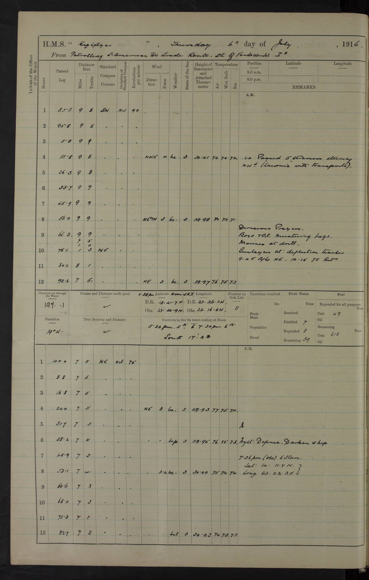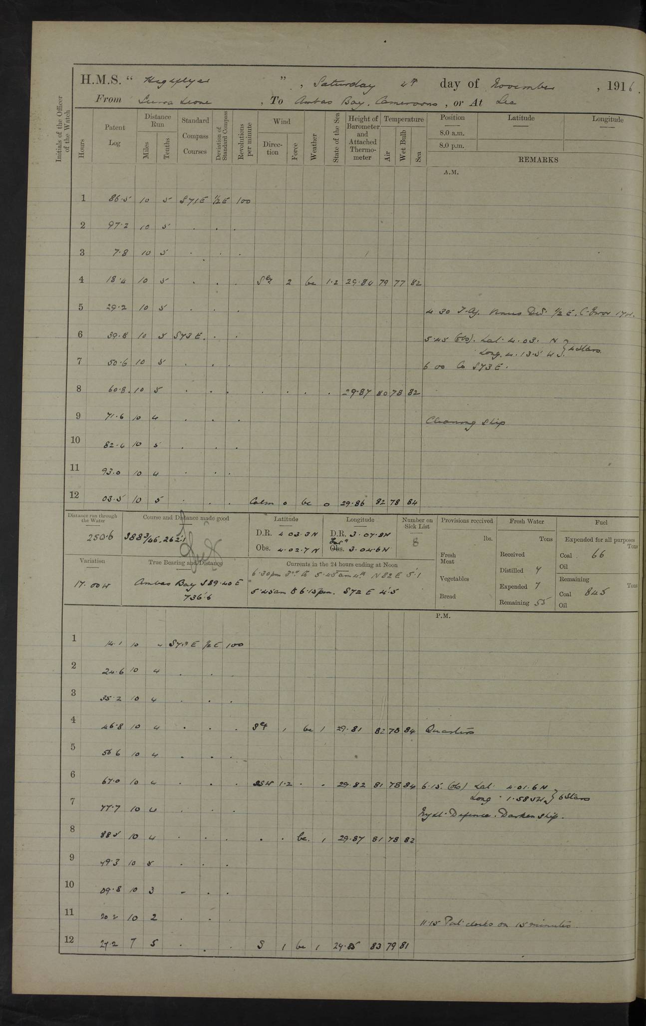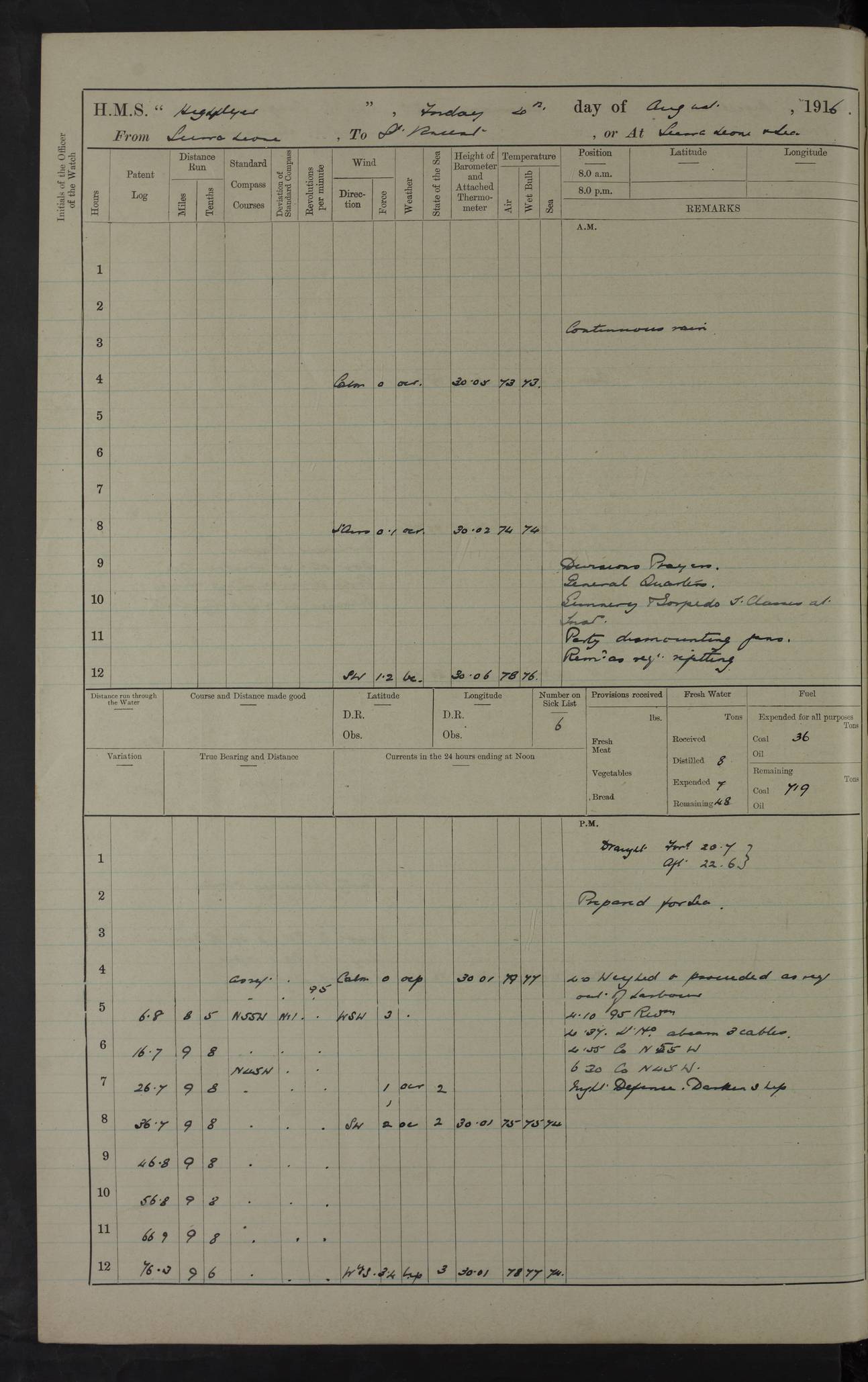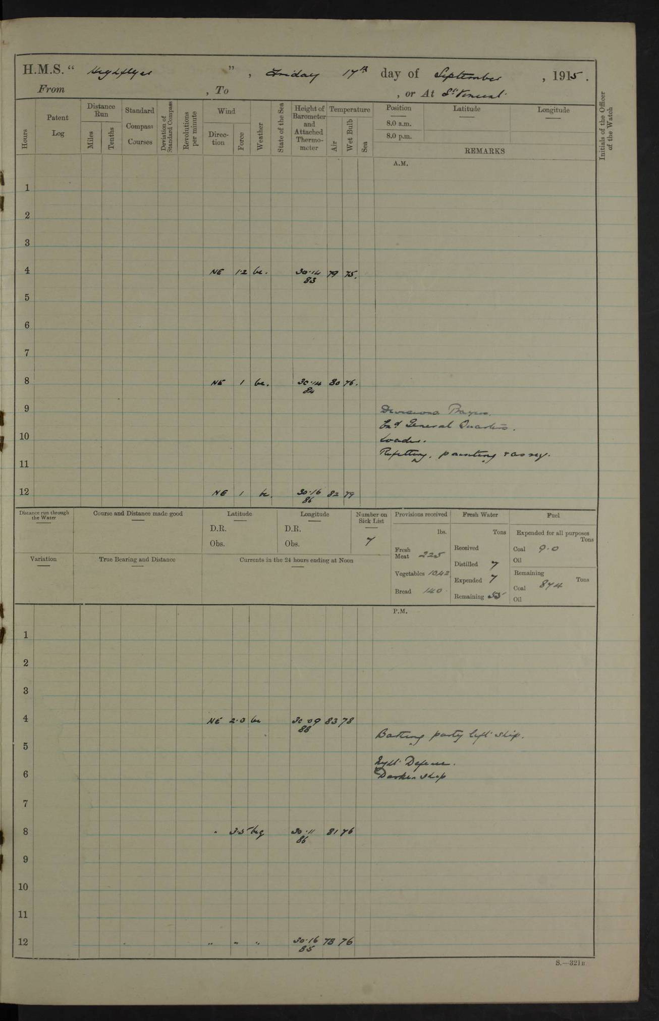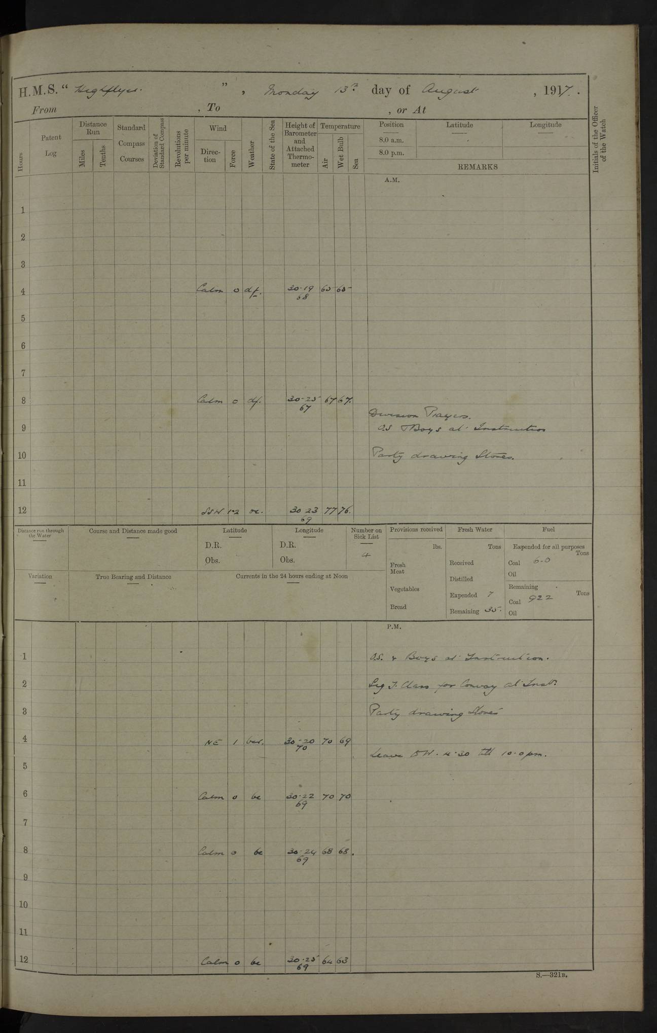 LOGS FOR JANUARY 1917 4ef4f321e53e0a0c91000902: (https://s3.amazonaws.com:443/oldweather/ADM53-44307/ADM 53-44307-129_1.jpg) 4ef4f321e53e0a0c91000903: (https://s3.amazonaws.com:443/oldweather/ADM53-44307/ADM 53-44307-130_0.jpg) 4ef4f321e53e0a0c91000904: (https://s3.amazonaws.com:443/oldweather/ADM53-44307/ADM 53-44307-130_1.jpg) 4ef4f321e53e0a0c91000905: (https://s3.amazonaws.com:443/oldweather/ADM53-44307/ADM 53-44307-131_0.jpg) 4ef4f321e53e0a0c91000906: (https://s3.amazonaws.com:443/oldweather/ADM53-44307/ADM 53-44307-131_1.jpg) 1 January 1917 Sierra Leone Lat 8.5, Long -13.2 6.30am: Party transferring provisions to DONEGAL. 10.00am: Party working on board SS VIRENT dismounting gun. 4ef4f321e53e0a0c91000907: (https://s3.amazonaws.com:443/oldweather/ADM53-44307/ADM 53-44307-132_0.jpg) 2 January 1917 Sierra Leone to St. Vincent Lat 8.7, Long -13.6 6.55am: SS ATLANTIC CITY came alongside. Coaling ship. 9.20am: Weighed and proceeded as requisite out of harbour. 4ef4f321e53e0a0c91000908: (https://s3.amazonaws.com:443/oldweather/ADM53-44307/ADM 53-44307-132_1.jpg) 3 January 1917 Sierra Leone to St. Vincent Lat 11.1, Long -17.7 2.30pm: Sighted SS on P bow steering to SE’d. 4ef4f321e53e0a0c91000909: (https://s3.amazonaws.com:443/oldweather/ADM53-44307/ADM 53-44307-133_0.jpg) 4 January 1917 Sierra Leone to St. Vincent Lat 13.8, Long -21.5 Boys and OS at school and seamanship instruction. Marines at drill. 11.30pm: Passing between St. Jago and Mayo Id. 4ef4f321e53e0a0c9100090a: (https://s3.amazonaws.com:443/oldweather/ADM53-44307/ADM 53-44307-133_1.jpg) 5 January 1917 Sierra Leone to St. Vincent Lat 16.8828, Long -25.0106 6.40am: Sighted San Nicholas Id. abeam. 11.58am: Came to SB 9 fathoms, 4½ shackles. 12.30pm: Lighters came alongside. 2.00pm: Coaling ship. 5.00pm: Stopped coaling for night. 4ef4f321e53e0a0c9100090b: (https://s3.amazonaws.com:443/oldweather/ADM53-44307/ADM 53-44307-134_0.jpg) 6 January 1917 St. Vincent Lat 16.8828, Long -25.0106 6.30am: Coaling ship from lighters. 12.30pm: Finished coaling; received 433 tons including deck cargo. 2.00pm: Prepared for sea. 4ef4f321e53e0a0c9100090c: (https://s3.amazonaws.com:443/oldweather/ADM53-44307/ADM 53-44307-134_1.jpg) 7 January 1917 St. Vincent to rendezvous to meet HMS Shannon and convoy Lat 17.4, Long -25.5 6.35am: Weighed and proceeded as requisite, 100 revs, to southward by San Antonio. 4ef4f321e53e0a0c9100090d: (https://s3.amazonaws.com:443/oldweather/ADM53-44307/ADM 53-44307-135_0.jpg) 8 January 1917 St. Vincent to meet HMS Shannon and convoy Lat 21.2, Long -26.3 9.30am: Party striking down coal. 4ef4f321e53e0a0c9100090e: (https://s3.amazonaws.com:443/oldweather/ADM53-44307/ADM 53-44307-135_1.jpg) 9 January 1917 St. Vincent to meet HMS Shannon and convoy Lat 23.9, Long -25.5 Cleaning ship. 9.00pm: Group closed up exercised during watch. 4ef4f322e53e0a0c9100090f: (https://s3.amazonaws.com:443/oldweather/ADM53-44307/ADM 53-44307-136_0.jpg) 10 January 1917 St. Vincent to meet HMS Shannon and convoy Lat 27.4, Long -25.1 2.00am: Groups closed up, exercised frequently during each watch. 6.30am: Sighted SS on southward beam steering NE’d. 4ef4f322e53e0a0c91000910: (https://s3.amazonaws.com:443/oldweather/ADM53-44307/ADM 53-44307-136_1.jpg) 11 January 1917 St. Vincent to meet HMS Shannon and convoy and to Sierra Leone Lat 29.7, Long -24.7 2.00am: Groups closed up, exercised frequently during each watch. 5.20am: Sighted SHANNON and convoy ahead – CARONIA, EMPRESS OF BRITAIN, WALMER CASTLE, TYNDAREUS, PAKEHA, NESTOR, CORINTHIC. 6.13am: Stopped. Communicated by boat with SHANNON. 6.25am: Course S17W. 115 rev. SHANNON proceeded NE’d., course as requisite to take up station with convoy. [A sketch is included showing the position of the ships. HIGHFLYER is in the middle of the front row with PAKEHA 10 cables to port and WALMER CASTLE 10 cables to starboard. NESTOR, then TYNDAREUS, follow PAKEHA. EMPRESS OF BRITAIN, then CARONIA, follow WALMER CASTLE. CORINTHIC is evenly spaced between TYNDAREUS and CARONIA.] 4ef4f322e53e0a0c91000911: (https://s3.amazonaws.com:443/oldweather/ADM53-44307/ADM 53-44307-137_0.jpg) 12 January 1917 To Sierra Leone with convoy Lat 23.9, Long -26.3 Guns’ crews closed up exercised frequently during day. Boys and OS to school and seamanship instruction. 4ef4f322e53e0a0c91000912: (https://s3.amazonaws.com:443/oldweather/ADM53-44307/ADM 53-44307-137_1.jpg) 13 January 1917 To Sierra Leone with convoy Lat 19.3, Long -28.0 3.57am: 80 rev. to allow TYNDAREUS to remedy engine defect. 4ef4f322e53e0a0c91000913: (https://s3.amazonaws.com:443/oldweather/ADM53-44307/ADM 53-44307-138_0.jpg) 14 January 1917 To Sierra Leone with convoy Lat 14.7, Long -26.9 9.00am: Mustered by Open List. 10.00am: Held Divine Service. 4ef4f322e53e0a0c91000914: (https://s3.amazonaws.com:443/oldweather/ADM53-44307/ADM 53-44307-138_1.jpg) 15 January 1917 To Sierra Leone with convoy Lat 12.3, Long -23.7 Party in stokehold trimming. 4ef4f322e53e0a0c91000915: (https://s3.amazonaws.com:443/oldweather/ADM53-44307/ADM 53-44307-139_0.jpg) 16 January 1917 To Sierra Leone with convoy Lat 10.4, Long -18.1 1.00pm: Hoisted colours half-mast. (Death on board EMPRESS OF BRITAIN.) 4ef4f322e53e0a0c91000916: (https://s3.amazonaws.com:443/oldweather/ADM53-44307/ADM 53-44307-139_1.jpg) 17 January 1917 To Sierra Leone with convoy Lat 8.5, Long -13.2 9.15am: Observed land ahead. Prepared for coaling. 10.40am: Formed single line ahead. 12.30pm: Transports proceeded independently to anchoring berths. 1.12pm: Came to with PB anchor in 10 fathoms, veered to 4 shackles, A3 berth. 5.30pm: SS MANSFIELD came alongside. 4ef4f322e53e0a0c91000917: (https://s3.amazonaws.com:443/oldweather/ADM53-44307/ADM 53-44307-140_0.jpg) 18 January 1917 Sierra Leone Lat 8.5, Long -13.2 6.00am: Commenced coaling. 2.15pm: Finished coaling; received 840 tons. 4ef4f322e53e0a0c91000918: (https://s3.amazonaws.com:443/oldweather/ADM53-44307/ADM 53-44307-140_1.jpg) 19 January 1917 Sierra Leone Lat 8.5, 