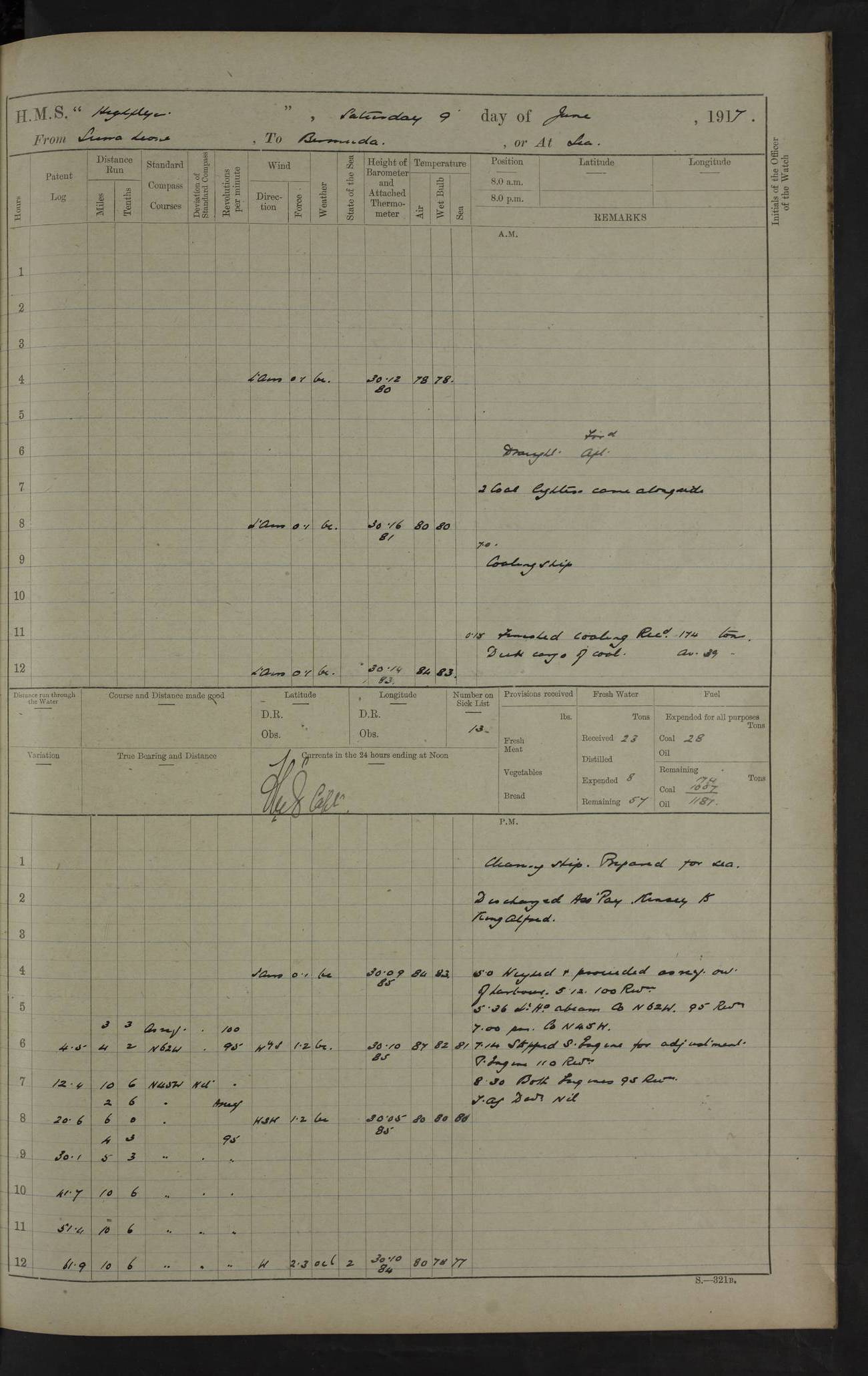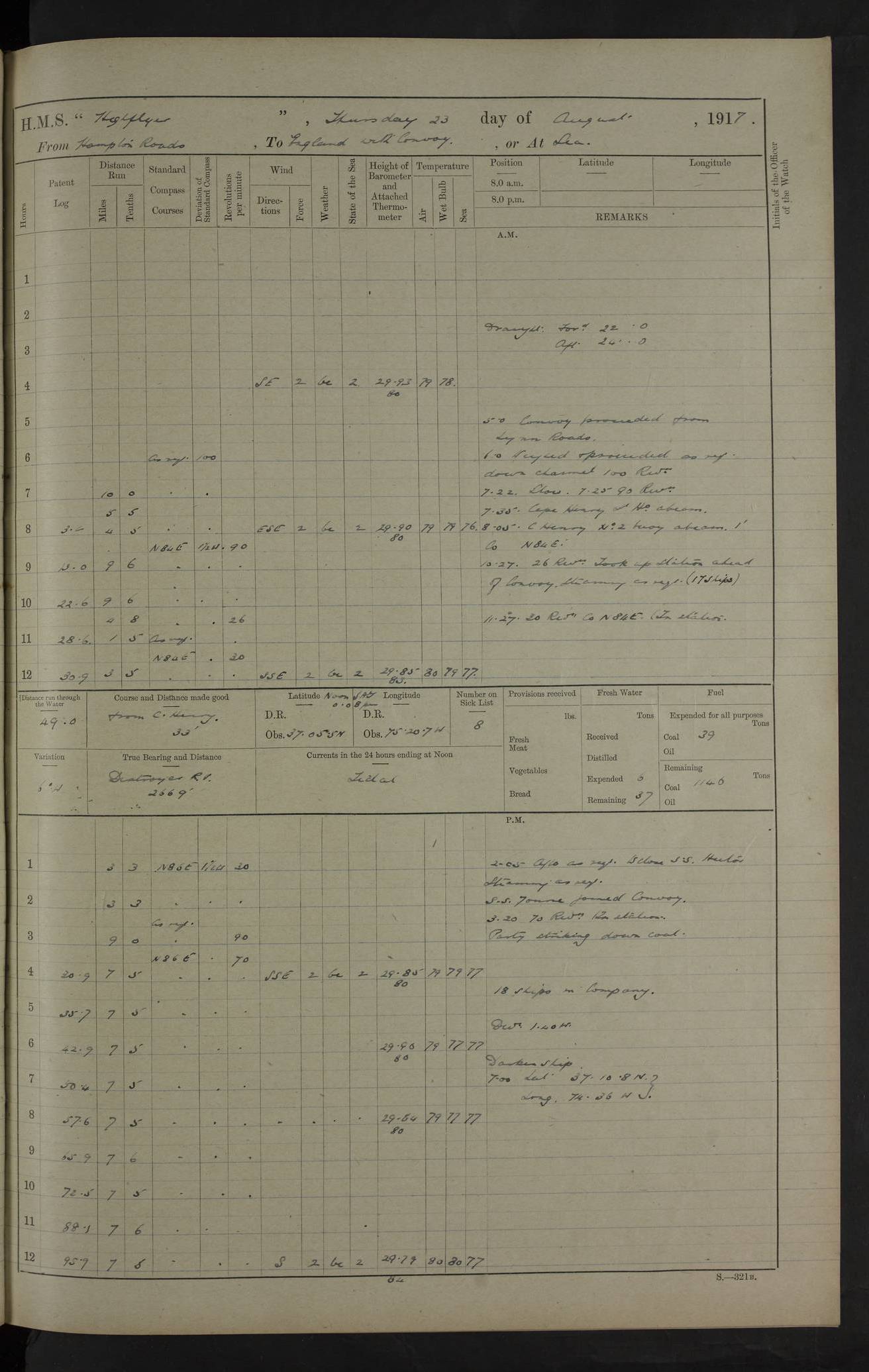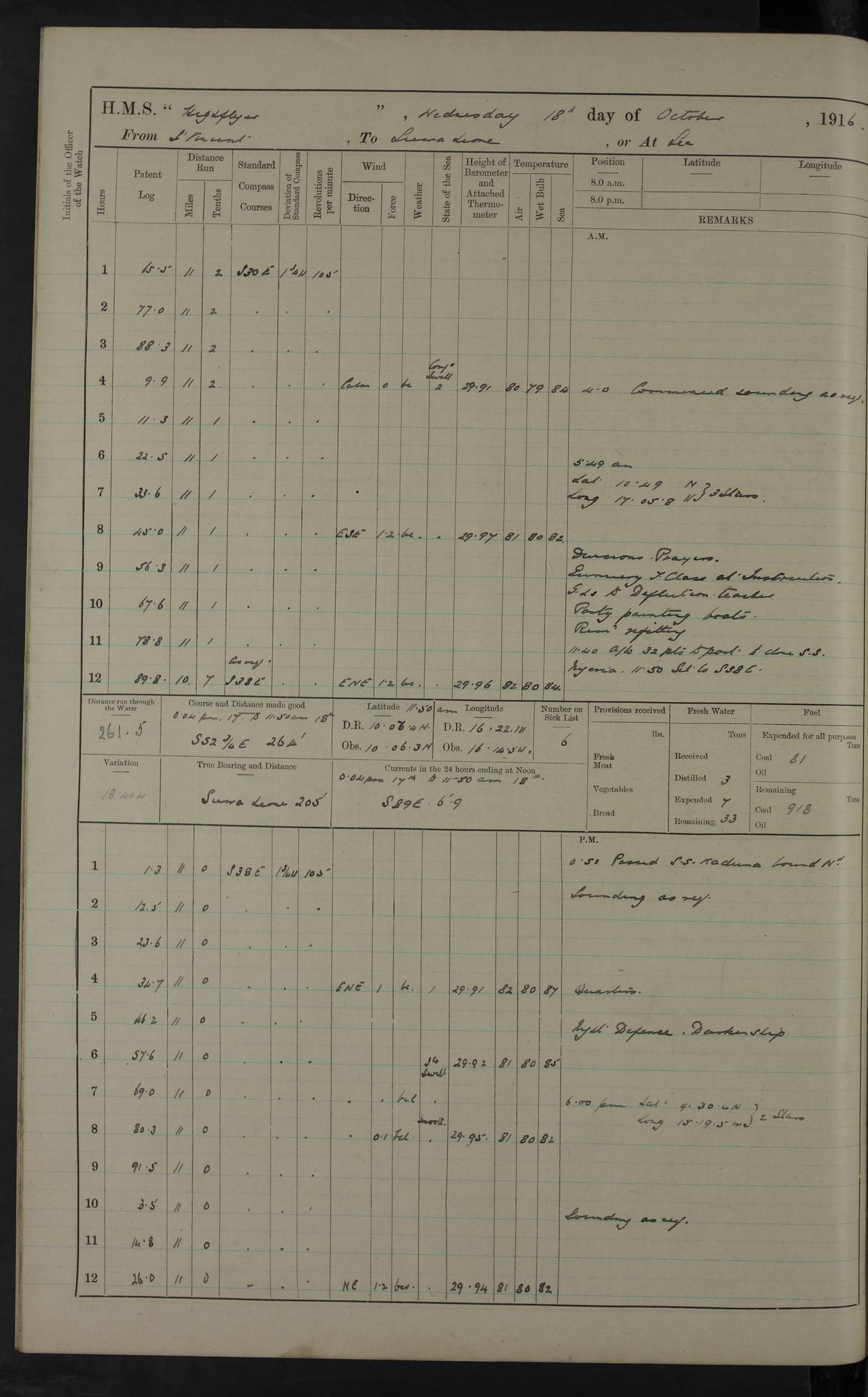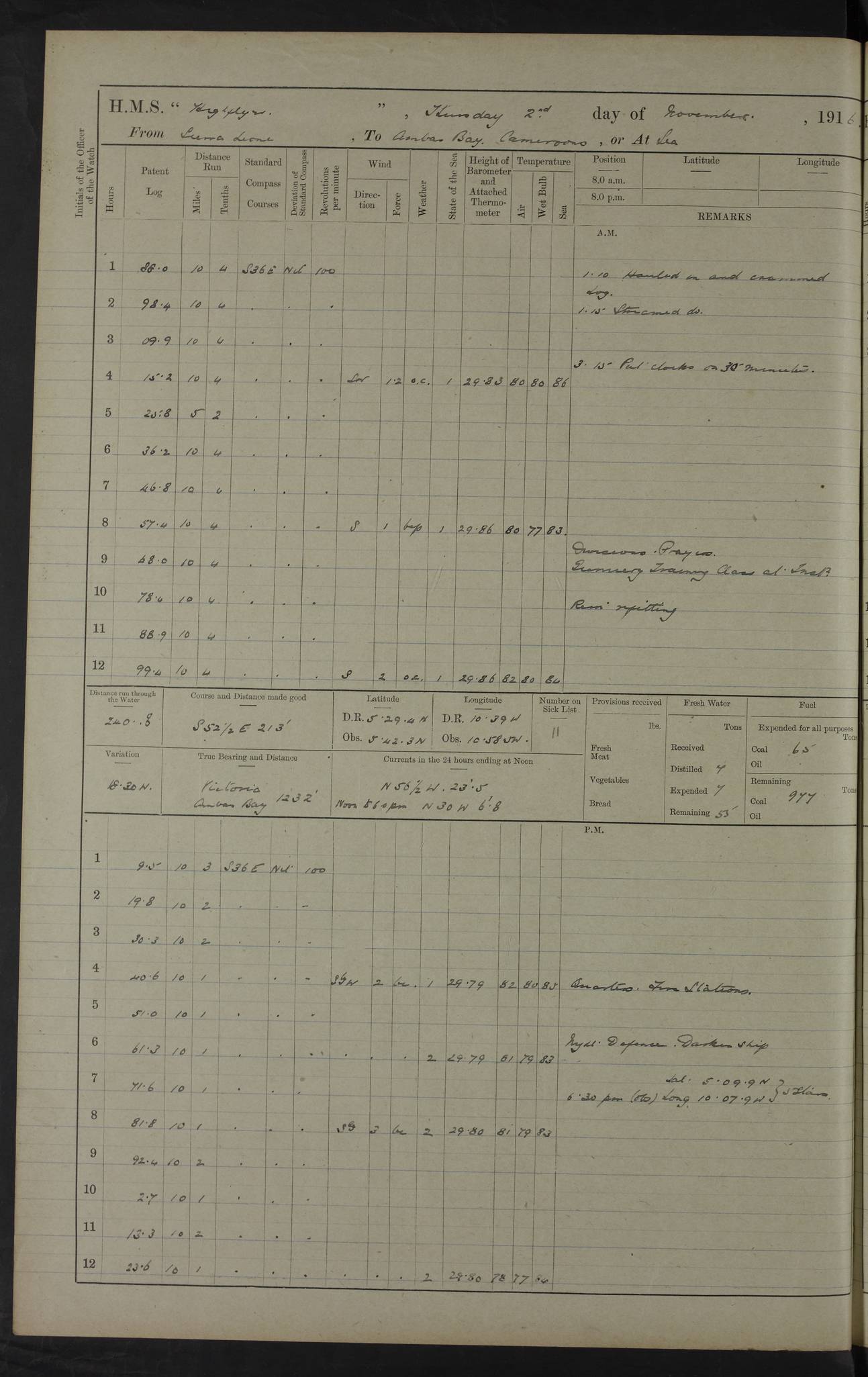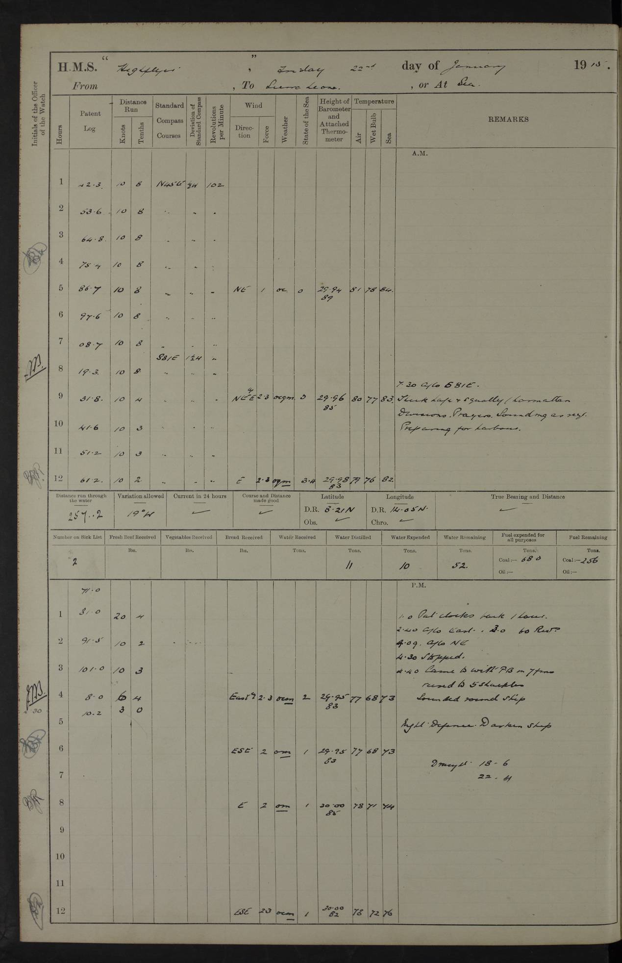 LOGS FOR JANUARY 1917 4ef4f321e53e0a0c91000902: (https://s3.amazonaws.com:443/oldweather/ADM53-44307/ADM 53-44307-129_1.jpg) 4ef4f321e53e0a0c91000903: (https://s3.amazonaws.com:443/oldweather/ADM53-44307/ADM 53-44307-130_0.jpg) 4ef4f321e53e0a0c91000904: (https://s3.amazonaws.com:443/oldweather/ADM53-44307/ADM 53-44307-130_1.jpg) 4ef4f321e53e0a0c91000905: (https://s3.amazonaws.com:443/oldweather/ADM53-44307/ADM 53-44307-131_0.jpg) 4ef4f321e53e0a0c91000906: (https://s3.amazonaws.com:443/oldweather/ADM53-44307/ADM 53-44307-131_1.jpg) 1 January 1917 Sierra Leone Lat 8.5, Long -13.2 6.30am: Party transferring provisions to DONEGAL. 10.00am: Party working on board SS VIRENT dismounting gun. 4ef4f321e53e0a0c91000907: (https://s3.amazonaws.com:443/oldweather/ADM53-44307/ADM 53-44307-132_0.jpg) 2 January 1917 Sierra Leone to St. Vincent Lat 8.7, Long -13.6 6.55am: SS ATLANTIC CITY came alongside. Coaling ship. 9.20am: Weighed and proceeded as requisite out of harbour. 4ef4f321e53e0a0c91000908: (https://s3.amazonaws.com:443/oldweather/ADM53-44307/ADM 53-44307-132_1.jpg) 3 January 1917 Sierra Leone to St. Vincent Lat 11.1, Long -17.7 2.30pm: Sighted SS on P bow steering to SE’d. 4ef4f321e53e0a0c91000909: (https://s3.amazonaws.com:443/oldweather/ADM53-44307/ADM 53-44307-133_0.jpg) 4 January 1917 Sierra Leone to St. Vincent Lat 13.8, Long -21.5 Boys and OS at school and seamanship instruction. Marines at drill. 11.30pm: Passing between St. Jago and Mayo Id. 4ef4f321e53e0a0c9100090a: (https://s3.amazonaws.com:443/oldweather/ADM53-44307/ADM 53-44307-133_1.jpg) 5 January 1917 Sierra Leone to St. Vincent Lat 16.8828, Long -25.0106 6.40am: Sighted San Nicholas Id. abeam. 11.58am: Came to SB 9 fathoms, 4½ shackles. 12.30pm: Lighters came alongside. 2.00pm: Coaling ship. 5.00pm: Stopped coaling for night. 4ef4f321e53e0a0c9100090b: (https://s3.amazonaws.com:443/oldweather/ADM53-44307/ADM 53-44307-134_0.jpg) 6 January 1917 St. Vincent Lat 16.8828, Long -25.0106 6.30am: Coaling ship from lighters. 12.30pm: Finished coaling; received 433 tons including deck cargo. 2.00pm: Prepared for sea. 4ef4f321e53e0a0c9100090c: (https://s3.amazonaws.com:443/oldweather/ADM53-44307/ADM 53-44307-134_1.jpg) 7 January 1917 St. Vincent to rendezvous to meet HMS Shannon and convoy Lat 17.4, Long -25.5 6.35am: Weighed and proceeded as requisite, 100 revs, to southward by San Antonio. 4ef4f321e53e0a0c9100090d: (https://s3.amazonaws.com:443/oldweather/ADM53-44307/ADM 53-44307-135_0.jpg) 8 January 1917 St. Vincent to meet HMS Shannon and convoy Lat 21.2, Long -26.3 9.30am: Party striking down coal. 4ef4f321e53e0a0c9100090e: (https://s3.amazonaws.com:443/oldweather/ADM53-44307/ADM 53-44307-135_1.jpg) 9 January 1917 St. Vincent to meet HMS Shannon and convoy Lat 23.9, Long -25.5 Cleaning ship. 9.00pm: Group closed up exercised during watch. 4ef4f322e53e0a0c9100090f: (https://s3.amazonaws.com:443/oldweather/ADM53-44307/ADM 53-44307-136_0.jpg) 10 January 1917 St. Vincent to meet HMS Shannon and convoy Lat 27.4, Long -25.1 2.00am: Groups closed up, exercised frequently during each watch. 6.30am: Sighted SS on southward beam steering NE’d. 4ef4f322e53e0a0c91000910: (https://s3.amazonaws.com:443/oldweather/ADM53-44307/ADM 53-44307-136_1.jpg) 11 January 1917 St. Vincent to meet HMS Shannon and convoy and to Sierra Leone Lat 29.7, Long -24.7 2.00am: Groups closed up, exercised frequently during each watch. 5.20am: Sighted SHANNON and convoy ahead – CARONIA, EMPRESS OF BRITAIN, WALMER CASTLE, TYNDAREUS, PAKEHA, NESTOR, CORINTHIC. 6.13am: Stopped. Communicated by boat with SHANNON. 6.25am: Course S17W. 115 rev. SHANNON proceeded NE’d., course as requisite to take up station with convoy. [A sketch is included showing the position of the ships. HIGHFLYER is in the middle of the front row with PAKEHA 10 cables to port and WALMER CASTLE 10 cables to starboard. NESTOR, then TYNDAREUS, follow PAKEHA. EMPRESS OF BRITAIN, then CARONIA, follow WALMER CASTLE. CORINTHIC is evenly spaced between TYNDAREUS and CARONIA.] 4ef4f322e53e0a0c91000911: (https://s3.amazonaws.com:443/oldweather/ADM53-44307/ADM 53-44307-137_0.jpg) 12 January 1917 To Sierra Leone with convoy Lat 23.9, Long -26.3 Guns’ crews closed up exercised frequently during day. Boys and OS to school and seamanship instruction. 4ef4f322e53e0a0c91000912: (https://s3.amazonaws.com:443/oldweather/ADM53-44307/ADM 53-44307-137_1.jpg) 13 January 1917 To Sierra Leone with convoy Lat 19.3, Long -28.0 3.57am: 80 rev. to allow TYNDAREUS to remedy engine defect. 4ef4f322e53e0a0c91000913: (https://s3.amazonaws.com:443/oldweather/ADM53-44307/ADM 53-44307-138_0.jpg) 14 January 1917 To Sierra Leone with convoy Lat 14.7, Long -26.9 9.00am: Mustered by Open List. 10.00am: Held Divine Service. 4ef4f322e53e0a0c91000914: (https://s3.amazonaws.com:443/oldweather/ADM53-44307/ADM 53-44307-138_1.jpg) 15 January 1917 To Sierra Leone with convoy Lat 12.3, Long -23.7 Party in stokehold trimming. 4ef4f322e53e0a0c91000915: (https://s3.amazonaws.com:443/oldweather/ADM53-44307/ADM 53-44307-139_0.jpg) 16 January 1917 To Sierra Leone with convoy Lat 10.4, Long -18.1 1.00pm: Hoisted colours half-mast. (Death on board EMPRESS OF BRITAIN.) 4ef4f322e53e0a0c91000916: (https://s3.amazonaws.com:443/oldweather/ADM53-44307/ADM 53-44307-139_1.jpg) 17 January 1917 To Sierra Leone with convoy Lat 8.5, Long -13.2 9.15am: Observed land ahead. Prepared for coaling. 10.40am: Formed single line ahead. 12.30pm: Transports proceeded independently to anchoring berths. 1.12pm: Came to with PB anchor in 10 fathoms, veered to 4 shackles, A3 berth. 5.30pm: SS MANSFIELD came alongside. 4ef4f322e53e0a0c91000917: (https://s3.amazonaws.com:443/oldweather/ADM53-44307/ADM 53-44307-140_0.jpg) 18 January 1917 Sierra Leone Lat 8.5, Long -13.2 6.00am: Commenced coaling. 2.15pm: Finished coaling; received 840 tons. 4ef4f322e53e0a0c91000918: (https://s3.amazonaws.com:443/oldweather/ADM53-44307/ADM 53-44307-140_1.jpg) 19 January 1917 Sierra Leone Lat 8.5, 