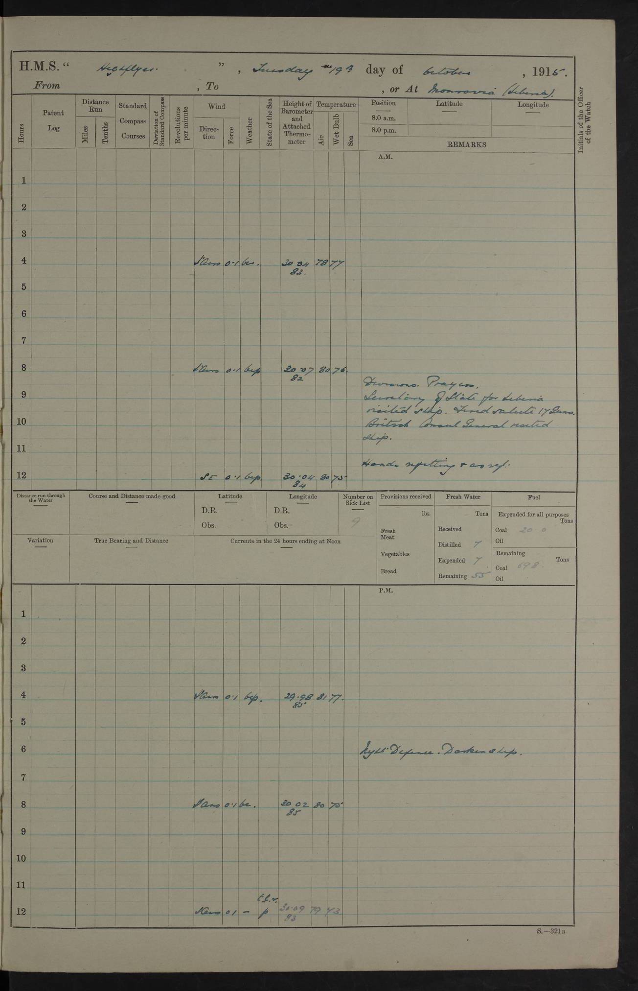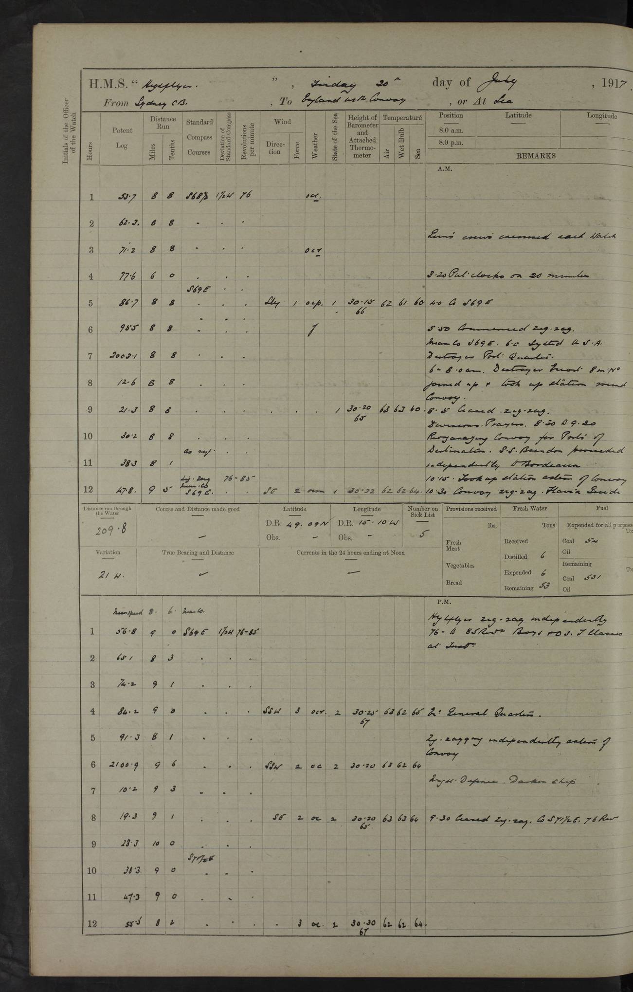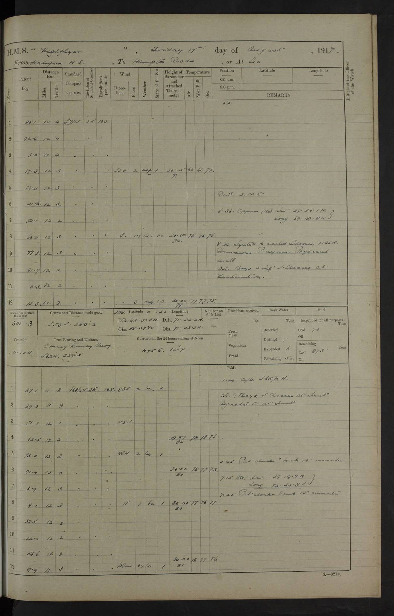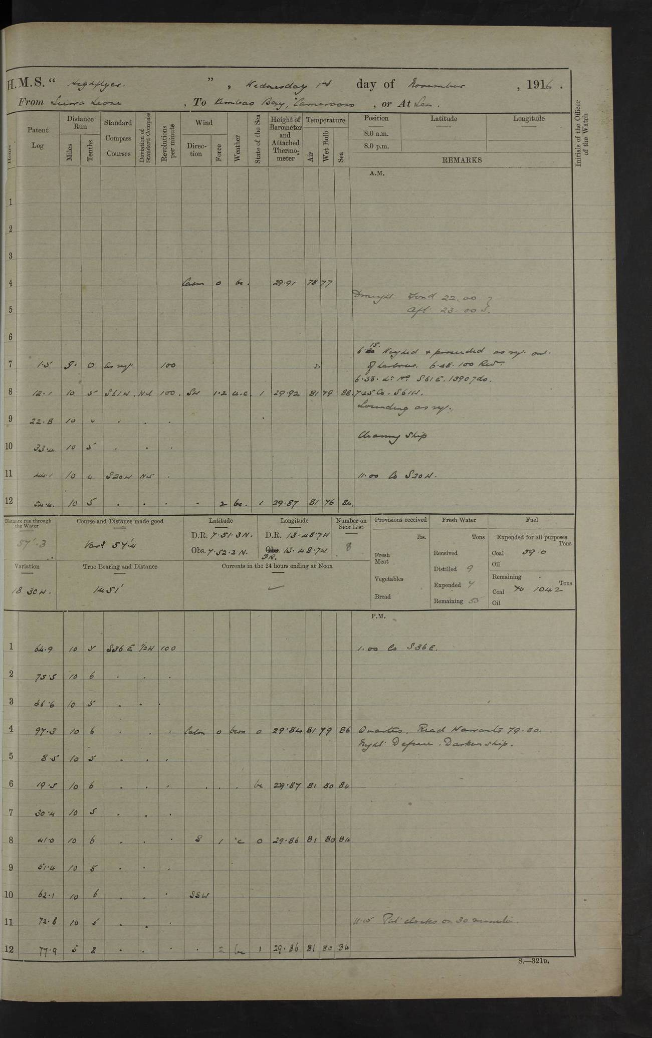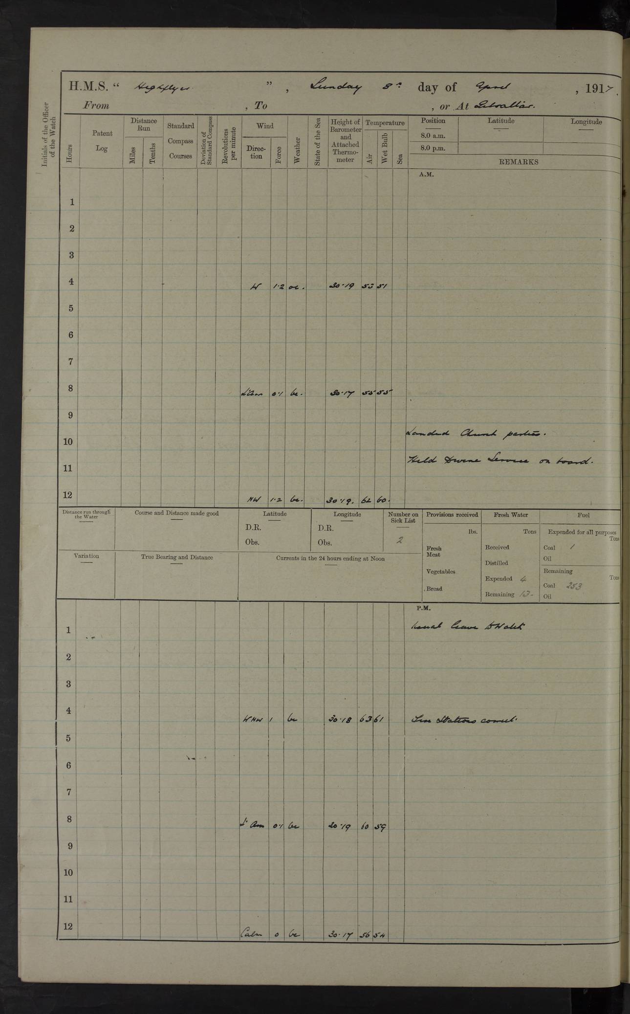 LOGS FOR JANUARY 1917 4ef4f321e53e0a0c91000902: (https://s3.amazonaws.com:443/oldweather/ADM53-44307/ADM 53-44307-129_1.jpg) 4ef4f321e53e0a0c91000903: (https://s3.amazonaws.com:443/oldweather/ADM53-44307/ADM 53-44307-130_0.jpg) 4ef4f321e53e0a0c91000904: (https://s3.amazonaws.com:443/oldweather/ADM53-44307/ADM 53-44307-130_1.jpg) 4ef4f321e53e0a0c91000905: (https://s3.amazonaws.com:443/oldweather/ADM53-44307/ADM 53-44307-131_0.jpg) 4ef4f321e53e0a0c91000906: (https://s3.amazonaws.com:443/oldweather/ADM53-44307/ADM 53-44307-131_1.jpg) 1 January 1917 Sierra Leone Lat 8.5, Long -13.2 6.30am: Party transferring provisions to DONEGAL. 10.00am: Party working on board SS VIRENT dismounting gun. 4ef4f321e53e0a0c91000907: (https://s3.amazonaws.com:443/oldweather/ADM53-44307/ADM 53-44307-132_0.jpg) 2 January 1917 Sierra Leone to St. Vincent Lat 8.7, Long -13.6 6.55am: SS ATLANTIC CITY came alongside. Coaling ship. 9.20am: Weighed and proceeded as requisite out of harbour. 4ef4f321e53e0a0c91000908: (https://s3.amazonaws.com:443/oldweather/ADM53-44307/ADM 53-44307-132_1.jpg) 3 January 1917 Sierra Leone to St. Vincent Lat 11.1, Long -17.7 2.30pm: Sighted SS on P bow steering to SE’d. 4ef4f321e53e0a0c91000909: (https://s3.amazonaws.com:443/oldweather/ADM53-44307/ADM 53-44307-133_0.jpg) 4 January 1917 Sierra Leone to St. Vincent Lat 13.8, Long -21.5 Boys and OS at school and seamanship instruction. Marines at drill. 11.30pm: Passing between St. Jago and Mayo Id. 4ef4f321e53e0a0c9100090a: (https://s3.amazonaws.com:443/oldweather/ADM53-44307/ADM 53-44307-133_1.jpg) 5 January 1917 Sierra Leone to St. Vincent Lat 16.8828, Long -25.0106 6.40am: Sighted San Nicholas Id. abeam. 11.58am: Came to SB 9 fathoms, 4½ shackles. 12.30pm: Lighters came alongside. 2.00pm: Coaling ship. 5.00pm: Stopped coaling for night. 4ef4f321e53e0a0c9100090b: (https://s3.amazonaws.com:443/oldweather/ADM53-44307/ADM 53-44307-134_0.jpg) 6 January 1917 St. Vincent Lat 16.8828, Long -25.0106 6.30am: Coaling ship from lighters. 12.30pm: Finished coaling; received 433 tons including deck cargo. 2.00pm: Prepared for sea. 4ef4f321e53e0a0c9100090c: (https://s3.amazonaws.com:443/oldweather/ADM53-44307/ADM 53-44307-134_1.jpg) 7 January 1917 St. Vincent to rendezvous to meet HMS Shannon and convoy Lat 17.4, Long -25.5 6.35am: Weighed and proceeded as requisite, 100 revs, to southward by San Antonio. 4ef4f321e53e0a0c9100090d: (https://s3.amazonaws.com:443/oldweather/ADM53-44307/ADM 53-44307-135_0.jpg) 8 January 1917 St. Vincent to meet HMS Shannon and convoy Lat 21.2, Long -26.3 9.30am: Party striking down coal. 4ef4f321e53e0a0c9100090e: (https://s3.amazonaws.com:443/oldweather/ADM53-44307/ADM 53-44307-135_1.jpg) 9 January 1917 St. Vincent to meet HMS Shannon and convoy Lat 23.9, Long -25.5 Cleaning ship. 9.00pm: Group closed up exercised during watch. 4ef4f322e53e0a0c9100090f: (https://s3.amazonaws.com:443/oldweather/ADM53-44307/ADM 53-44307-136_0.jpg) 10 January 1917 St. Vincent to meet HMS Shannon and convoy Lat 27.4, Long -25.1 2.00am: Groups closed up, exercised frequently during each watch. 6.30am: Sighted SS on southward beam steering NE’d. 4ef4f322e53e0a0c91000910: (https://s3.amazonaws.com:443/oldweather/ADM53-44307/ADM 53-44307-136_1.jpg) 11 January 1917 St. Vincent to meet HMS Shannon and convoy and to Sierra Leone Lat 29.7, Long -24.7 2.00am: Groups closed up, exercised frequently during each watch. 5.20am: Sighted SHANNON and convoy ahead – CARONIA, EMPRESS OF BRITAIN, WALMER CASTLE, TYNDAREUS, PAKEHA, NESTOR, CORINTHIC. 6.13am: Stopped. Communicated by boat with SHANNON. 6.25am: Course S17W. 115 rev. SHANNON proceeded NE’d., course as requisite to take up station with convoy. [A sketch is included showing the position of the ships. HIGHFLYER is in the middle of the front row with PAKEHA 10 cables to port and WALMER CASTLE 10 cables to starboard. NESTOR, then TYNDAREUS, follow PAKEHA. EMPRESS OF BRITAIN, then CARONIA, follow WALMER CASTLE. CORINTHIC is evenly spaced between TYNDAREUS and CARONIA.] 4ef4f322e53e0a0c91000911: (https://s3.amazonaws.com:443/oldweather/ADM53-44307/ADM 53-44307-137_0.jpg) 12 January 1917 To Sierra Leone with convoy Lat 23.9, Long -26.3 Guns’ crews closed up exercised frequently during day. Boys and OS to school and seamanship instruction. 4ef4f322e53e0a0c91000912: (https://s3.amazonaws.com:443/oldweather/ADM53-44307/ADM 53-44307-137_1.jpg) 13 January 1917 To Sierra Leone with convoy Lat 19.3, Long -28.0 3.57am: 80 rev. to allow TYNDAREUS to remedy engine defect. 4ef4f322e53e0a0c91000913: (https://s3.amazonaws.com:443/oldweather/ADM53-44307/ADM 53-44307-138_0.jpg) 14 January 1917 To Sierra Leone with convoy Lat 14.7, Long -26.9 9.00am: Mustered by Open List. 10.00am: Held Divine Service. 4ef4f322e53e0a0c91000914: (https://s3.amazonaws.com:443/oldweather/ADM53-44307/ADM 53-44307-138_1.jpg) 15 January 1917 To Sierra Leone with convoy Lat 12.3, Long -23.7 Party in stokehold trimming. 4ef4f322e53e0a0c91000915: (https://s3.amazonaws.com:443/oldweather/ADM53-44307/ADM 53-44307-139_0.jpg) 16 January 1917 To Sierra Leone with convoy Lat 10.4, Long -18.1 1.00pm: Hoisted colours half-mast. (Death on board EMPRESS OF BRITAIN.) 4ef4f322e53e0a0c91000916: (https://s3.amazonaws.com:443/oldweather/ADM53-44307/ADM 53-44307-139_1.jpg) 17 January 1917 To Sierra Leone with convoy Lat 8.5, Long -13.2 9.15am: Observed land ahead. Prepared for coaling. 10.40am: Formed single line ahead. 12.30pm: Transports proceeded independently to anchoring berths. 1.12pm: Came to with PB anchor in 10 fathoms, veered to 4 shackles, A3 berth. 5.30pm: SS MANSFIELD came alongside. 4ef4f322e53e0a0c91000917: (https://s3.amazonaws.com:443/oldweather/ADM53-44307/ADM 53-44307-140_0.jpg) 18 January 1917 Sierra Leone Lat 8.5, Long -13.2 6.00am: Commenced coaling. 2.15pm: Finished coaling; received 840 tons. 4ef4f322e53e0a0c91000918: (https://s3.amazonaws.com:443/oldweather/ADM53-44307/ADM 53-44307-140_1.jpg) 19 January 1917 Sierra Leone Lat 8.5, 