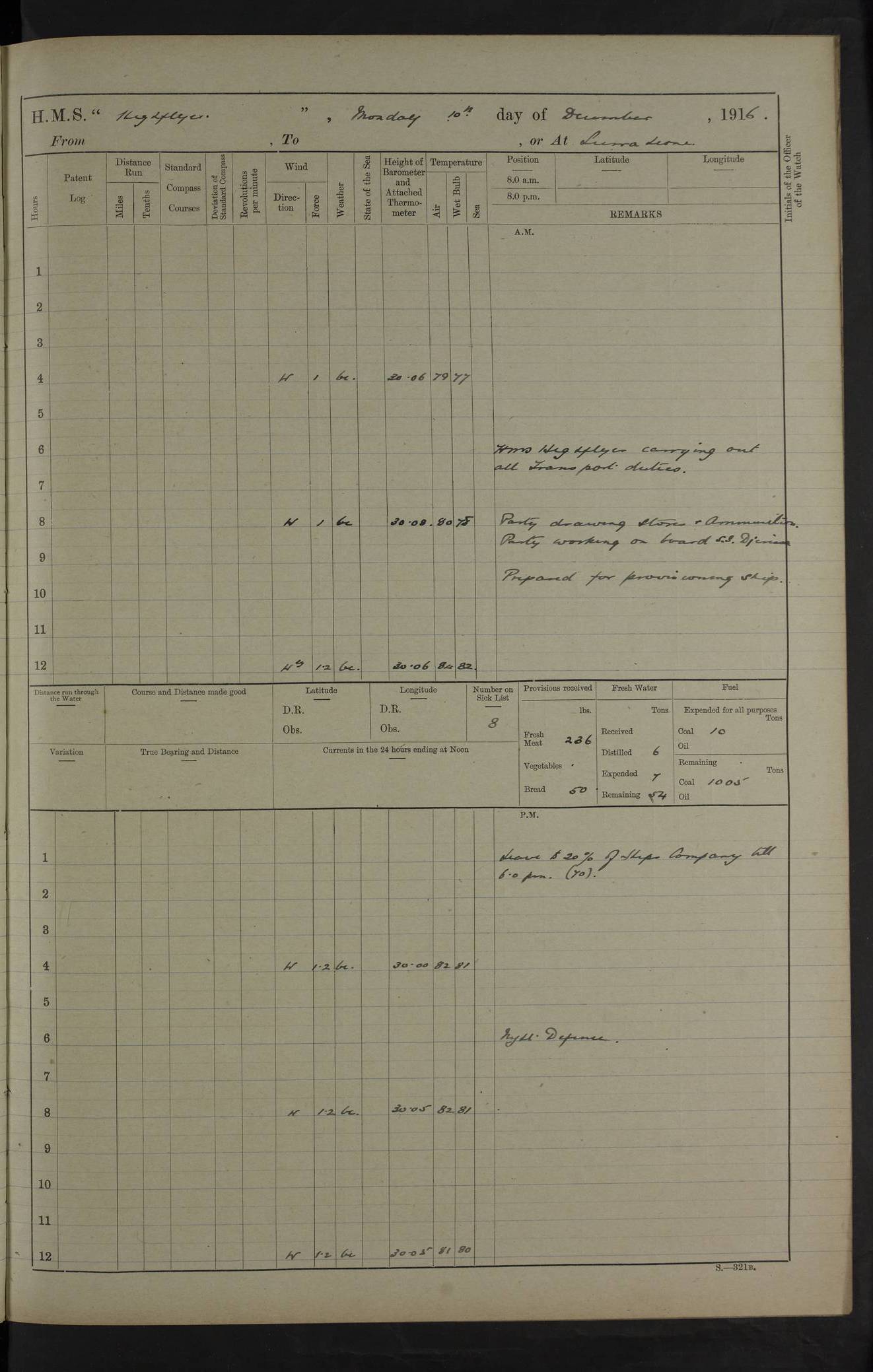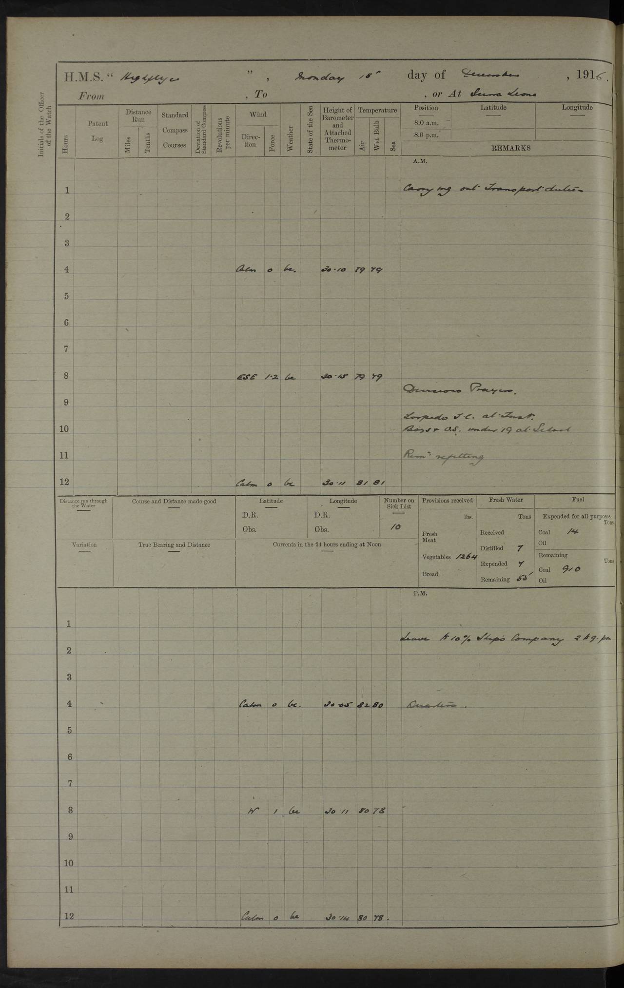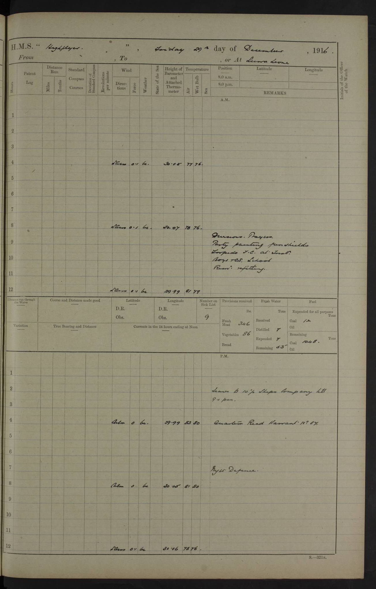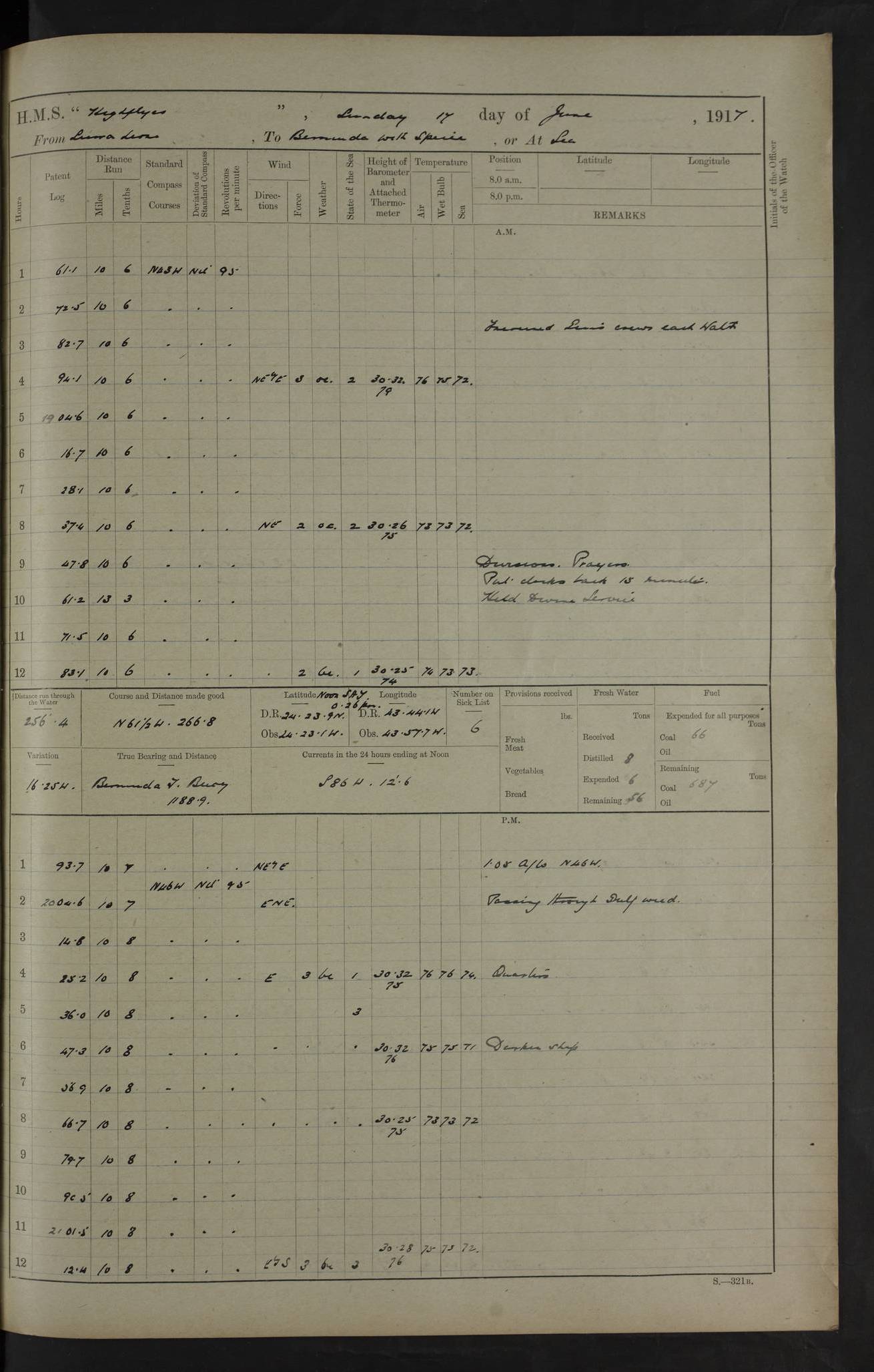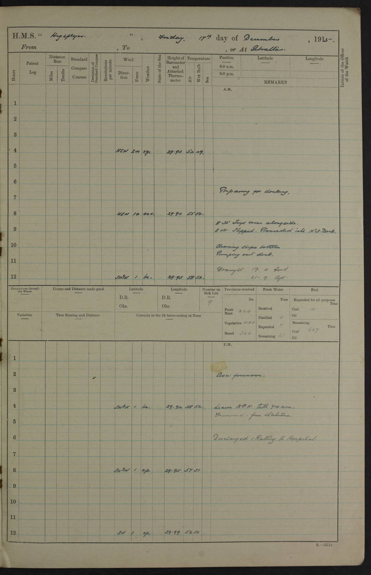LOGS FOR JANUARY 1917 4ef4f321e53e0a0c91000902: (https://s3.amazonaws.com:443/oldweather/ADM53-44307/ADM 53-44307-129_1.jpg) 4ef4f321e53e0a0c91000903: (https://s3.amazonaws.com:443/oldweather/ADM53-44307/ADM 53-44307-130_0.jpg) 4ef4f321e53e0a0c91000904: (https://s3.amazonaws.com:443/oldweather/ADM53-44307/ADM 53-44307-130_1.jpg) 4ef4f321e53e0a0c91000905: (https://s3.amazonaws.com:443/oldweather/ADM53-44307/ADM 53-44307-131_0.jpg) 4ef4f321e53e0a0c91000906: (https://s3.amazonaws.com:443/oldweather/ADM53-44307/ADM 53-44307-131_1.jpg) 1 January 1917 Sierra Leone Lat 8.5, Long -13.2 6.30am: Party transferring provisions to DONEGAL. 10.00am: Party working on board SS VIRENT dismounting gun. 4ef4f321e53e0a0c91000907: (https://s3.amazonaws.com:443/oldweather/ADM53-44307/ADM 53-44307-132_0.jpg) 2 January 1917 Sierra Leone to St. Vincent Lat 8.7, Long -13.6 6.55am: SS ATLANTIC CITY came alongside. Coaling ship. 9.20am: Weighed and proceeded as requisite out of harbour. 4ef4f321e53e0a0c91000908: (https://s3.amazonaws.com:443/oldweather/ADM53-44307/ADM 53-44307-132_1.jpg) 3 January 1917 Sierra Leone to St. Vincent Lat 11.1, Long -17.7 2.30pm: Sighted SS on P bow steering to SE’d. 4ef4f321e53e0a0c91000909: (https://s3.amazonaws.com:443/oldweather/ADM53-44307/ADM 53-44307-133_0.jpg) 4 January 1917 Sierra Leone to St. Vincent Lat 13.8, Long -21.5 Boys and OS at school and seamanship instruction. Marines at drill. 11.30pm: Passing between St. Jago and Mayo Id. 4ef4f321e53e0a0c9100090a: (https://s3.amazonaws.com:443/oldweather/ADM53-44307/ADM 53-44307-133_1.jpg) 5 January 1917 Sierra Leone to St. Vincent Lat 16.8828, Long -25.0106 6.40am: Sighted San Nicholas Id. abeam. 11.58am: Came to SB 9 fathoms, 4½ shackles. 12.30pm: Lighters came alongside. 2.00pm: Coaling ship. 5.00pm: Stopped coaling for night. 4ef4f321e53e0a0c9100090b: (https://s3.amazonaws.com:443/oldweather/ADM53-44307/ADM 53-44307-134_0.jpg) 6 January 1917 St. Vincent Lat 16.8828, Long -25.0106 6.30am: Coaling ship from lighters. 12.30pm: Finished coaling; received 433 tons including deck cargo. 2.00pm: Prepared for sea. 4ef4f321e53e0a0c9100090c: (https://s3.amazonaws.com:443/oldweather/ADM53-44307/ADM 53-44307-134_1.jpg) 7 January 1917 St. Vincent to rendezvous to meet HMS Shannon and convoy Lat 17.4, Long -25.5 6.35am: Weighed and proceeded as requisite, 100 revs, to southward by San Antonio. 4ef4f321e53e0a0c9100090d: (https://s3.amazonaws.com:443/oldweather/ADM53-44307/ADM 53-44307-135_0.jpg) 8 January 1917 St. Vincent to meet HMS Shannon and convoy Lat 21.2, Long -26.3 9.30am: Party striking down coal. 4ef4f321e53e0a0c9100090e: (https://s3.amazonaws.com:443/oldweather/ADM53-44307/ADM 53-44307-135_1.jpg) 9 January 1917 St. Vincent to meet HMS Shannon and convoy Lat 23.9, Long -25.5 Cleaning ship. 9.00pm: Group closed up exercised during watch. 4ef4f322e53e0a0c9100090f: (https://s3.amazonaws.com:443/oldweather/ADM53-44307/ADM 53-44307-136_0.jpg) 10 January 1917 St. Vincent to meet HMS Shannon and convoy Lat 27.4, Long -25.1 2.00am: Groups closed up, exercised frequently during each watch. 6.30am: Sighted SS on southward beam steering NE’d. 4ef4f322e53e0a0c91000910: (https://s3.amazonaws.com:443/oldweather/ADM53-44307/ADM 53-44307-136_1.jpg) 11 January 1917 St. Vincent to meet HMS Shannon and convoy and to Sierra Leone Lat 29.7, Long -24.7 2.00am: Groups closed up, exercised frequently during each watch. 5.20am: Sighted SHANNON and convoy ahead – CARONIA, EMPRESS OF BRITAIN, WALMER CASTLE, TYNDAREUS, PAKEHA, NESTOR, CORINTHIC. 6.13am: Stopped. Communicated by boat with SHANNON. 6.25am: Course S17W. 115 rev. SHANNON proceeded NE’d., course as requisite to take up station with convoy. [A sketch is included showing the position of the ships. HIGHFLYER is in the middle of the front row with PAKEHA 10 cables to port and WALMER CASTLE 10 cables to starboard. NESTOR, then TYNDAREUS, follow PAKEHA. EMPRESS OF BRITAIN, then CARONIA, follow WALMER CASTLE. CORINTHIC is evenly spaced between TYNDAREUS and CARONIA.] 4ef4f322e53e0a0c91000911: (https://s3.amazonaws.com:443/oldweather/ADM53-44307/ADM 53-44307-137_0.jpg) 12 January 1917 To Sierra Leone with convoy Lat 23.9, Long -26.3 Guns’ crews closed up exercised frequently during day. Boys and OS to school and seamanship instruction. 4ef4f322e53e0a0c91000912: (https://s3.amazonaws.com:443/oldweather/ADM53-44307/ADM 53-44307-137_1.jpg) 13 January 1917 To Sierra Leone with convoy Lat 19.3, Long -28.0 3.57am: 80 rev. to allow TYNDAREUS to remedy engine defect. 4ef4f322e53e0a0c91000913: (https://s3.amazonaws.com:443/oldweather/ADM53-44307/ADM 53-44307-138_0.jpg) 14 January 1917 To Sierra Leone with convoy Lat 14.7, Long -26.9 9.00am: Mustered by Open List. 10.00am: Held Divine Service. 4ef4f322e53e0a0c91000914: (https://s3.amazonaws.com:443/oldweather/ADM53-44307/ADM 53-44307-138_1.jpg) 15 January 1917 To Sierra Leone with convoy Lat 12.3, Long -23.7 Party in stokehold trimming. 4ef4f322e53e0a0c91000915: (https://s3.amazonaws.com:443/oldweather/ADM53-44307/ADM 53-44307-139_0.jpg) 16 January 1917 To Sierra Leone with convoy Lat 10.4, Long -18.1 1.00pm: Hoisted colours half-mast. (Death on board EMPRESS OF BRITAIN.) 4ef4f322e53e0a0c91000916: (https://s3.amazonaws.com:443/oldweather/ADM53-44307/ADM 53-44307-139_1.jpg) 17 January 1917 To Sierra Leone with convoy Lat 8.5, Long -13.2 9.15am: Observed land ahead. Prepared for coaling. 10.40am: Formed single line ahead. 12.30pm: Transports proceeded independently to anchoring berths. 1.12pm: Came to with PB anchor in 10 fathoms, veered to 4 shackles, A3 berth. 5.30pm: SS MANSFIELD came alongside. 4ef4f322e53e0a0c91000917: (https://s3.amazonaws.com:443/oldweather/ADM53-44307/ADM 53-44307-140_0.jpg) 18 January 1917 Sierra Leone Lat 8.5, Long -13.2 6.00am: Commenced coaling. 2.15pm: Finished coaling; received 840 tons. 4ef4f322e53e0a0c91000918: (https://s3.amazonaws.com:443/oldweather/ADM53-44307/ADM 53-44307-140_1.jpg) 19 January 1917 Sierra Leone Lat 8.5, 