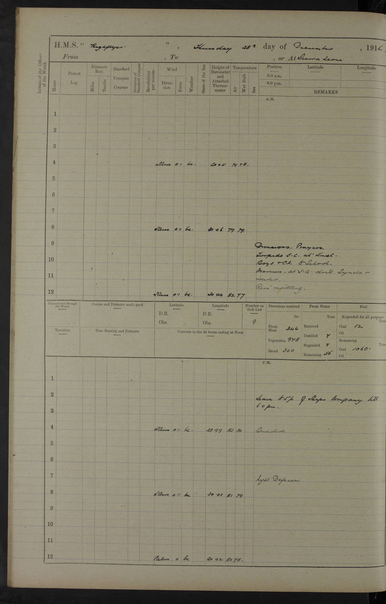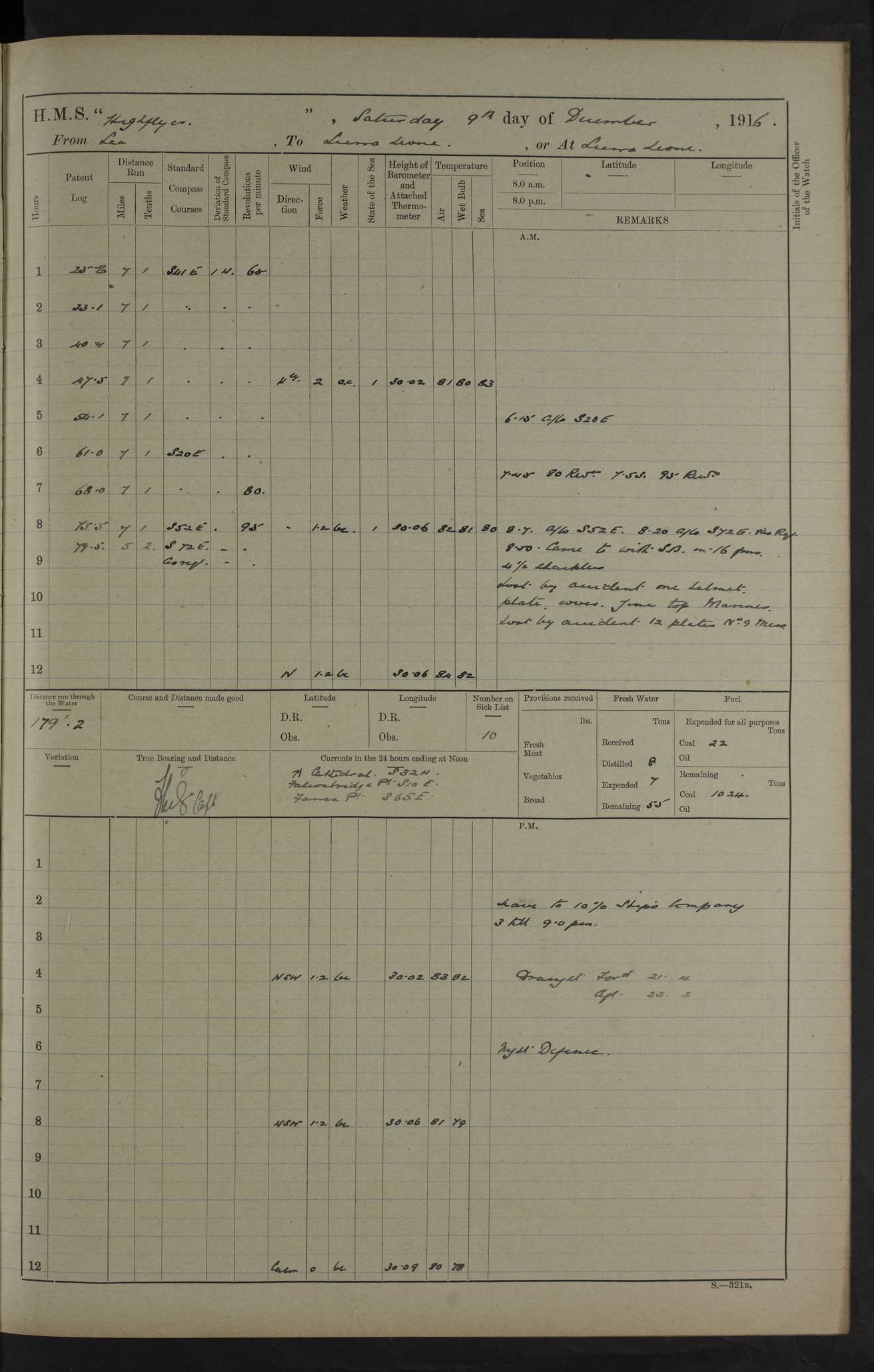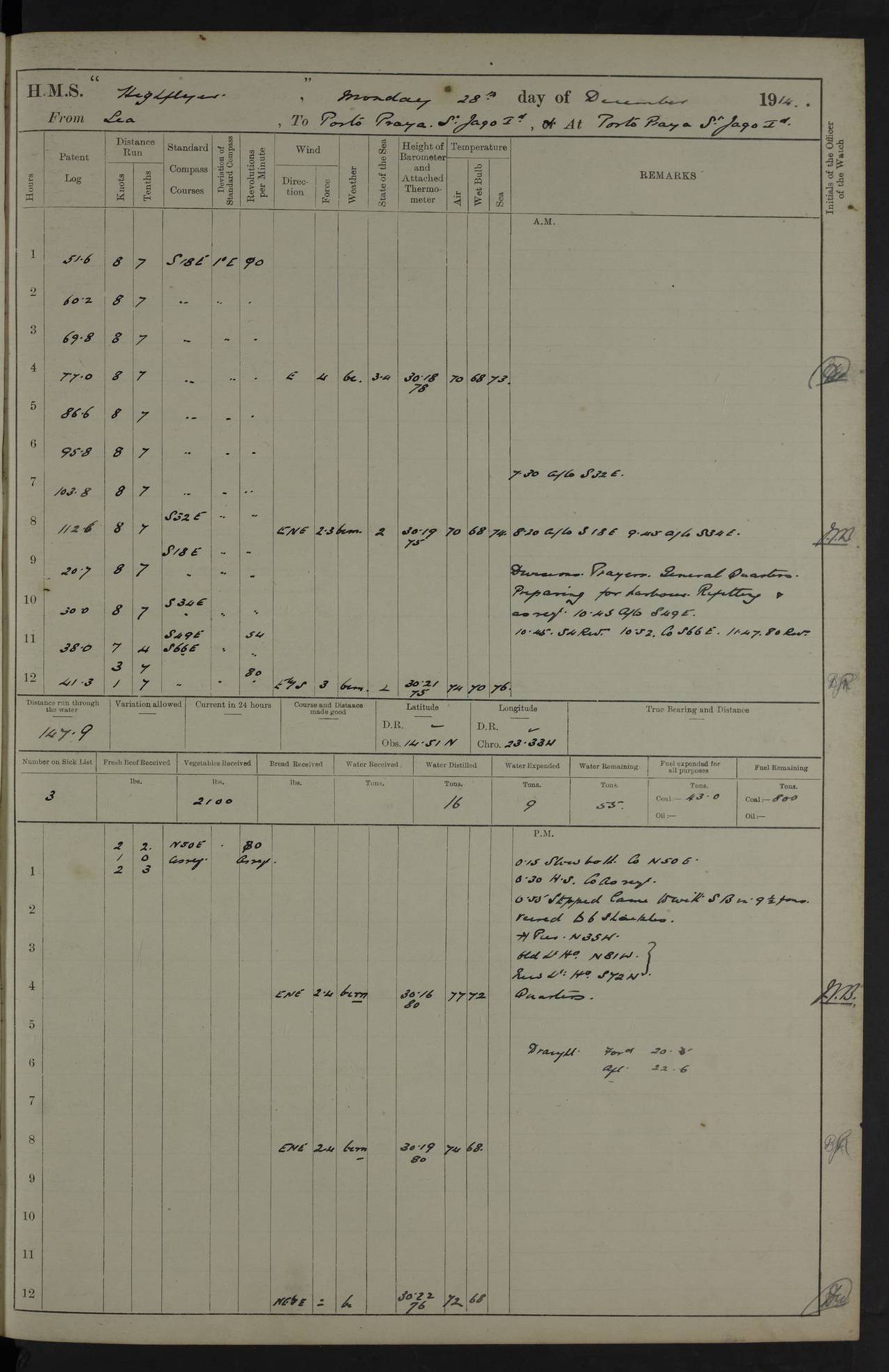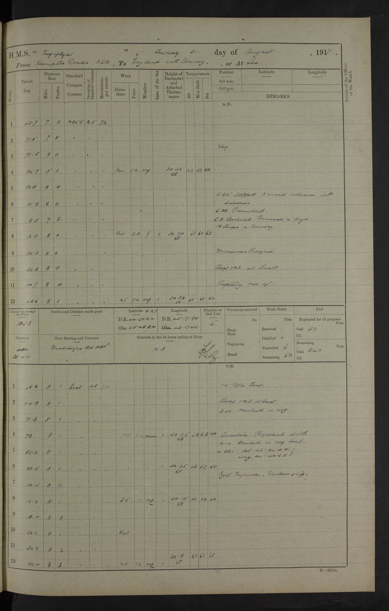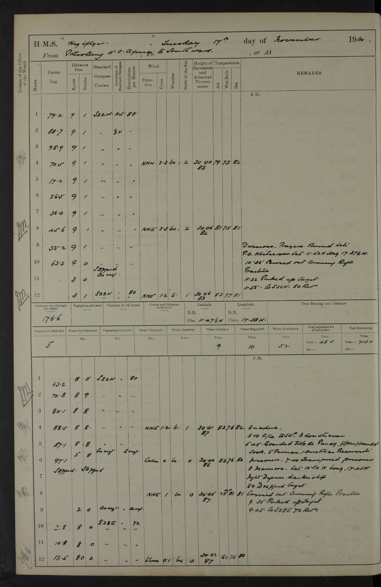 LOGS FOR JANUARY 1917 4ef4f321e53e0a0c91000902: (https://s3.amazonaws.com:443/oldweather/ADM53-44307/ADM 53-44307-129_1.jpg) 4ef4f321e53e0a0c91000903: (https://s3.amazonaws.com:443/oldweather/ADM53-44307/ADM 53-44307-130_0.jpg) 4ef4f321e53e0a0c91000904: (https://s3.amazonaws.com:443/oldweather/ADM53-44307/ADM 53-44307-130_1.jpg) 4ef4f321e53e0a0c91000905: (https://s3.amazonaws.com:443/oldweather/ADM53-44307/ADM 53-44307-131_0.jpg) 4ef4f321e53e0a0c91000906: (https://s3.amazonaws.com:443/oldweather/ADM53-44307/ADM 53-44307-131_1.jpg) 1 January 1917 Sierra Leone Lat 8.5, Long -13.2 6.30am: Party transferring provisions to DONEGAL. 10.00am: Party working on board SS VIRENT dismounting gun. 4ef4f321e53e0a0c91000907: (https://s3.amazonaws.com:443/oldweather/ADM53-44307/ADM 53-44307-132_0.jpg) 2 January 1917 Sierra Leone to St. Vincent Lat 8.7, Long -13.6 6.55am: SS ATLANTIC CITY came alongside. Coaling ship. 9.20am: Weighed and proceeded as requisite out of harbour. 4ef4f321e53e0a0c91000908: (https://s3.amazonaws.com:443/oldweather/ADM53-44307/ADM 53-44307-132_1.jpg) 3 January 1917 Sierra Leone to St. Vincent Lat 11.1, Long -17.7 2.30pm: Sighted SS on P bow steering to SE’d. 4ef4f321e53e0a0c91000909: (https://s3.amazonaws.com:443/oldweather/ADM53-44307/ADM 53-44307-133_0.jpg) 4 January 1917 Sierra Leone to St. Vincent Lat 13.8, Long -21.5 Boys and OS at school and seamanship instruction. Marines at drill. 11.30pm: Passing between St. Jago and Mayo Id. 4ef4f321e53e0a0c9100090a: (https://s3.amazonaws.com:443/oldweather/ADM53-44307/ADM 53-44307-133_1.jpg) 5 January 1917 Sierra Leone to St. Vincent Lat 16.8828, Long -25.0106 6.40am: Sighted San Nicholas Id. abeam. 11.58am: Came to SB 9 fathoms, 4½ shackles. 12.30pm: Lighters came alongside. 2.00pm: Coaling ship. 5.00pm: Stopped coaling for night. 4ef4f321e53e0a0c9100090b: (https://s3.amazonaws.com:443/oldweather/ADM53-44307/ADM 53-44307-134_0.jpg) 6 January 1917 St. Vincent Lat 16.8828, Long -25.0106 6.30am: Coaling ship from lighters. 12.30pm: Finished coaling; received 433 tons including deck cargo. 2.00pm: Prepared for sea. 4ef4f321e53e0a0c9100090c: (https://s3.amazonaws.com:443/oldweather/ADM53-44307/ADM 53-44307-134_1.jpg) 7 January 1917 St. Vincent to rendezvous to meet HMS Shannon and convoy Lat 17.4, Long -25.5 6.35am: Weighed and proceeded as requisite, 100 revs, to southward by San Antonio. 4ef4f321e53e0a0c9100090d: (https://s3.amazonaws.com:443/oldweather/ADM53-44307/ADM 53-44307-135_0.jpg) 8 January 1917 St. Vincent to meet HMS Shannon and convoy Lat 21.2, Long -26.3 9.30am: Party striking down coal. 4ef4f321e53e0a0c9100090e: (https://s3.amazonaws.com:443/oldweather/ADM53-44307/ADM 53-44307-135_1.jpg) 9 January 1917 St. Vincent to meet HMS Shannon and convoy Lat 23.9, Long -25.5 Cleaning ship. 9.00pm: Group closed up exercised during watch. 4ef4f322e53e0a0c9100090f: (https://s3.amazonaws.com:443/oldweather/ADM53-44307/ADM 53-44307-136_0.jpg) 10 January 1917 St. Vincent to meet HMS Shannon and convoy Lat 27.4, Long -25.1 2.00am: Groups closed up, exercised frequently during each watch. 6.30am: Sighted SS on southward beam steering NE’d. 4ef4f322e53e0a0c91000910: (https://s3.amazonaws.com:443/oldweather/ADM53-44307/ADM 53-44307-136_1.jpg) 11 January 1917 St. Vincent to meet HMS Shannon and convoy and to Sierra Leone Lat 29.7, Long -24.7 2.00am: Groups closed up, exercised frequently during each watch. 5.20am: Sighted SHANNON and convoy ahead – CARONIA, EMPRESS OF BRITAIN, WALMER CASTLE, TYNDAREUS, PAKEHA, NESTOR, CORINTHIC. 6.13am: Stopped. Communicated by boat with SHANNON. 6.25am: Course S17W. 115 rev. SHANNON proceeded NE’d., course as requisite to take up station with convoy. [A sketch is included showing the position of the ships. HIGHFLYER is in the middle of the front row with PAKEHA 10 cables to port and WALMER CASTLE 10 cables to starboard. NESTOR, then TYNDAREUS, follow PAKEHA. EMPRESS OF BRITAIN, then CARONIA, follow WALMER CASTLE. CORINTHIC is evenly spaced between TYNDAREUS and CARONIA.] 4ef4f322e53e0a0c91000911: (https://s3.amazonaws.com:443/oldweather/ADM53-44307/ADM 53-44307-137_0.jpg) 12 January 1917 To Sierra Leone with convoy Lat 23.9, Long -26.3 Guns’ crews closed up exercised frequently during day. Boys and OS to school and seamanship instruction. 4ef4f322e53e0a0c91000912: (https://s3.amazonaws.com:443/oldweather/ADM53-44307/ADM 53-44307-137_1.jpg) 13 January 1917 To Sierra Leone with convoy Lat 19.3, Long -28.0 3.57am: 80 rev. to allow TYNDAREUS to remedy engine defect. 4ef4f322e53e0a0c91000913: (https://s3.amazonaws.com:443/oldweather/ADM53-44307/ADM 53-44307-138_0.jpg) 14 January 1917 To Sierra Leone with convoy Lat 14.7, Long -26.9 9.00am: Mustered by Open List. 10.00am: Held Divine Service. 4ef4f322e53e0a0c91000914: (https://s3.amazonaws.com:443/oldweather/ADM53-44307/ADM 53-44307-138_1.jpg) 15 January 1917 To Sierra Leone with convoy Lat 12.3, Long -23.7 Party in stokehold trimming. 4ef4f322e53e0a0c91000915: (https://s3.amazonaws.com:443/oldweather/ADM53-44307/ADM 53-44307-139_0.jpg) 16 January 1917 To Sierra Leone with convoy Lat 10.4, Long -18.1 1.00pm: Hoisted colours half-mast. (Death on board EMPRESS OF BRITAIN.) 4ef4f322e53e0a0c91000916: (https://s3.amazonaws.com:443/oldweather/ADM53-44307/ADM 53-44307-139_1.jpg) 17 January 1917 To Sierra Leone with convoy Lat 8.5, Long -13.2 9.15am: Observed land ahead. Prepared for coaling. 10.40am: Formed single line ahead. 12.30pm: Transports proceeded independently to anchoring berths. 1.12pm: Came to with PB anchor in 10 fathoms, veered to 4 shackles, A3 berth. 5.30pm: SS MANSFIELD came alongside. 4ef4f322e53e0a0c91000917: (https://s3.amazonaws.com:443/oldweather/ADM53-44307/ADM 53-44307-140_0.jpg) 18 January 1917 Sierra Leone Lat 8.5, Long -13.2 6.00am: Commenced coaling. 2.15pm: Finished coaling; received 840 tons. 4ef4f322e53e0a0c91000918: (https://s3.amazonaws.com:443/oldweather/ADM53-44307/ADM 53-44307-140_1.jpg) 19 January 1917 Sierra Leone Lat 8.5, 