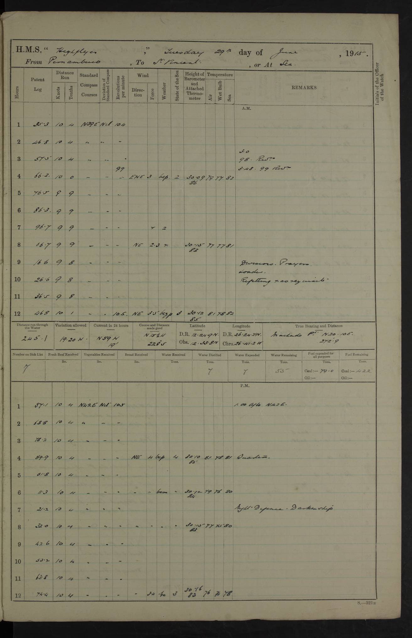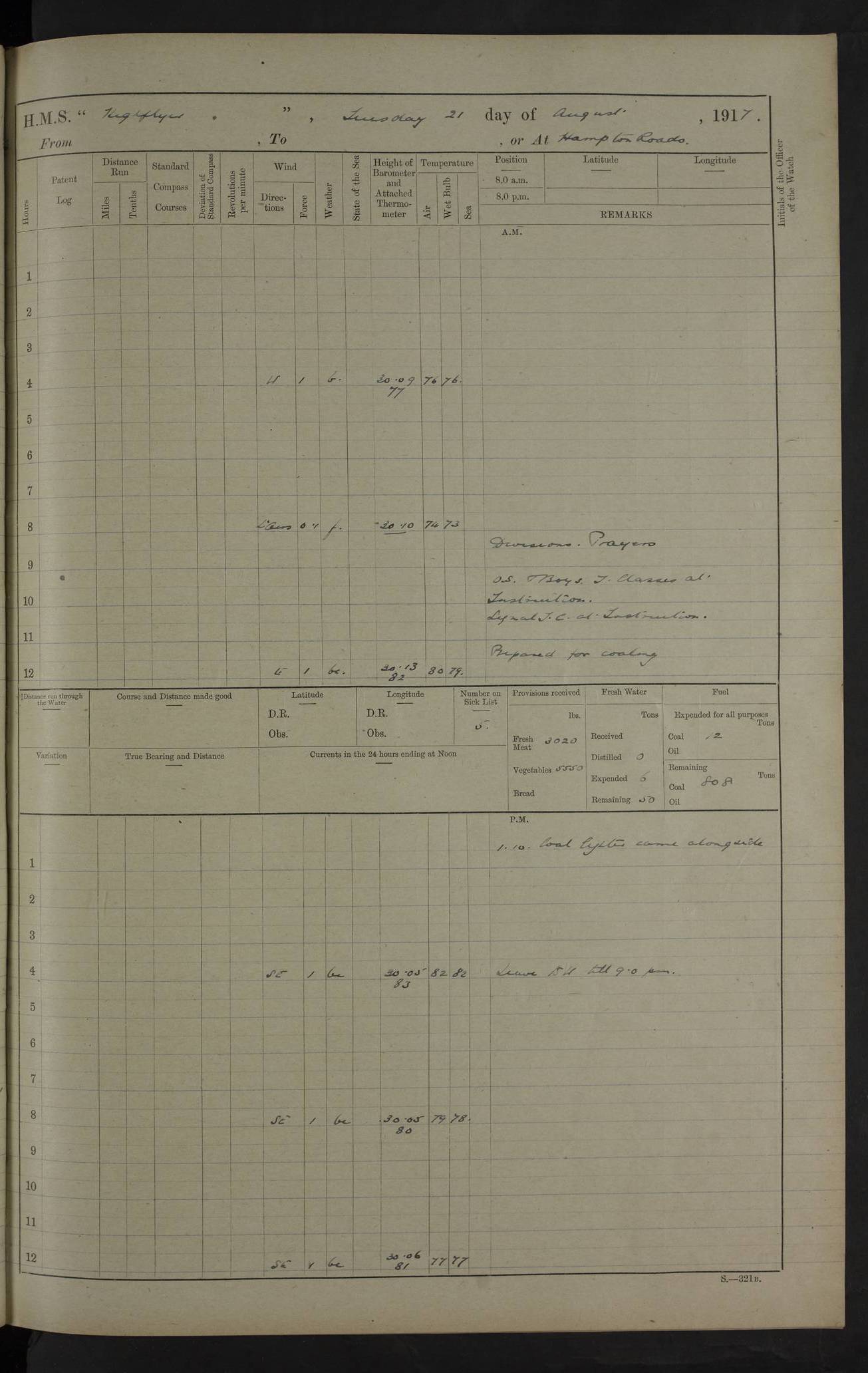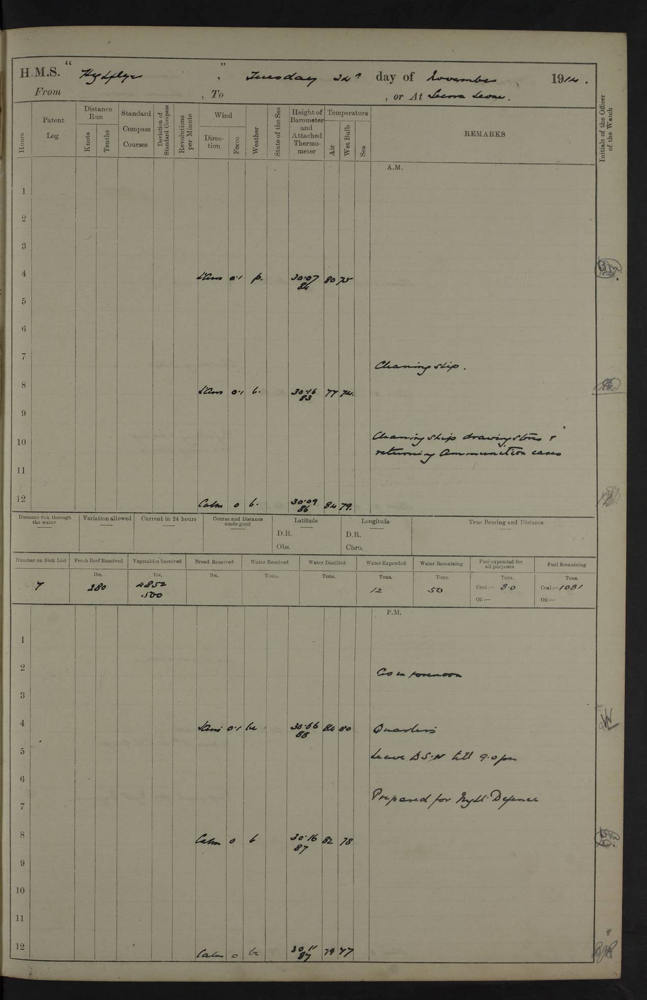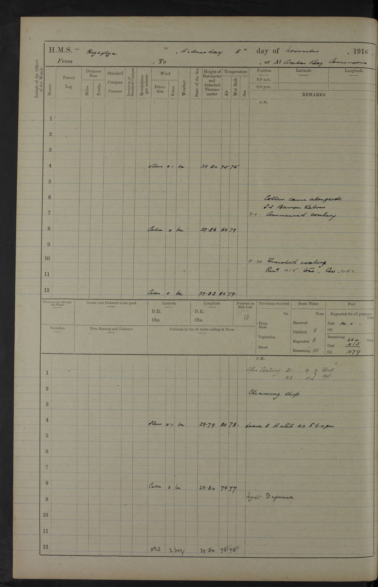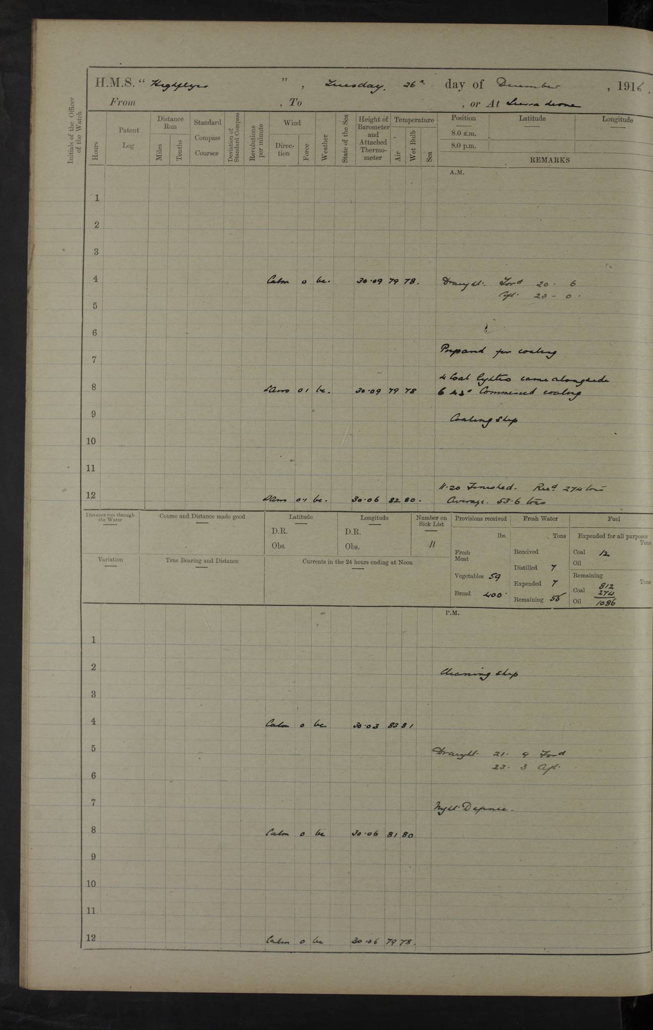 LOGS FOR JANUARY 1917 4ef4f321e53e0a0c91000902: (https://s3.amazonaws.com:443/oldweather/ADM53-44307/ADM 53-44307-129_1.jpg) 4ef4f321e53e0a0c91000903: (https://s3.amazonaws.com:443/oldweather/ADM53-44307/ADM 53-44307-130_0.jpg) 4ef4f321e53e0a0c91000904: (https://s3.amazonaws.com:443/oldweather/ADM53-44307/ADM 53-44307-130_1.jpg) 4ef4f321e53e0a0c91000905: (https://s3.amazonaws.com:443/oldweather/ADM53-44307/ADM 53-44307-131_0.jpg) 4ef4f321e53e0a0c91000906: (https://s3.amazonaws.com:443/oldweather/ADM53-44307/ADM 53-44307-131_1.jpg) 1 January 1917 Sierra Leone Lat 8.5, Long -13.2 6.30am: Party transferring provisions to DONEGAL. 10.00am: Party working on board SS VIRENT dismounting gun. 4ef4f321e53e0a0c91000907: (https://s3.amazonaws.com:443/oldweather/ADM53-44307/ADM 53-44307-132_0.jpg) 2 January 1917 Sierra Leone to St. Vincent Lat 8.7, Long -13.6 6.55am: SS ATLANTIC CITY came alongside. Coaling ship. 9.20am: Weighed and proceeded as requisite out of harbour. 4ef4f321e53e0a0c91000908: (https://s3.amazonaws.com:443/oldweather/ADM53-44307/ADM 53-44307-132_1.jpg) 3 January 1917 Sierra Leone to St. Vincent Lat 11.1, Long -17.7 2.30pm: Sighted SS on P bow steering to SE’d. 4ef4f321e53e0a0c91000909: (https://s3.amazonaws.com:443/oldweather/ADM53-44307/ADM 53-44307-133_0.jpg) 4 January 1917 Sierra Leone to St. Vincent Lat 13.8, Long -21.5 Boys and OS at school and seamanship instruction. Marines at drill. 11.30pm: Passing between St. Jago and Mayo Id. 4ef4f321e53e0a0c9100090a: (https://s3.amazonaws.com:443/oldweather/ADM53-44307/ADM 53-44307-133_1.jpg) 5 January 1917 Sierra Leone to St. Vincent Lat 16.8828, Long -25.0106 6.40am: Sighted San Nicholas Id. abeam. 11.58am: Came to SB 9 fathoms, 4½ shackles. 12.30pm: Lighters came alongside. 2.00pm: Coaling ship. 5.00pm: Stopped coaling for night. 4ef4f321e53e0a0c9100090b: (https://s3.amazonaws.com:443/oldweather/ADM53-44307/ADM 53-44307-134_0.jpg) 6 January 1917 St. Vincent Lat 16.8828, Long -25.0106 6.30am: Coaling ship from lighters. 12.30pm: Finished coaling; received 433 tons including deck cargo. 2.00pm: Prepared for sea. 4ef4f321e53e0a0c9100090c: (https://s3.amazonaws.com:443/oldweather/ADM53-44307/ADM 53-44307-134_1.jpg) 7 January 1917 St. Vincent to rendezvous to meet HMS Shannon and convoy Lat 17.4, Long -25.5 6.35am: Weighed and proceeded as requisite, 100 revs, to southward by San Antonio. 4ef4f321e53e0a0c9100090d: (https://s3.amazonaws.com:443/oldweather/ADM53-44307/ADM 53-44307-135_0.jpg) 8 January 1917 St. Vincent to meet HMS Shannon and convoy Lat 21.2, Long -26.3 9.30am: Party striking down coal. 4ef4f321e53e0a0c9100090e: (https://s3.amazonaws.com:443/oldweather/ADM53-44307/ADM 53-44307-135_1.jpg) 9 January 1917 St. Vincent to meet HMS Shannon and convoy Lat 23.9, Long -25.5 Cleaning ship. 9.00pm: Group closed up exercised during watch. 4ef4f322e53e0a0c9100090f: (https://s3.amazonaws.com:443/oldweather/ADM53-44307/ADM 53-44307-136_0.jpg) 10 January 1917 St. Vincent to meet HMS Shannon and convoy Lat 27.4, Long -25.1 2.00am: Groups closed up, exercised frequently during each watch. 6.30am: Sighted SS on southward beam steering NE’d. 4ef4f322e53e0a0c91000910: (https://s3.amazonaws.com:443/oldweather/ADM53-44307/ADM 53-44307-136_1.jpg) 11 January 1917 St. Vincent to meet HMS Shannon and convoy and to Sierra Leone Lat 29.7, Long -24.7 2.00am: Groups closed up, exercised frequently during each watch. 5.20am: Sighted SHANNON and convoy ahead – CARONIA, EMPRESS OF BRITAIN, WALMER CASTLE, TYNDAREUS, PAKEHA, NESTOR, CORINTHIC. 6.13am: Stopped. Communicated by boat with SHANNON. 6.25am: Course S17W. 115 rev. SHANNON proceeded NE’d., course as requisite to take up station with convoy. [A sketch is included showing the position of the ships. HIGHFLYER is in the middle of the front row with PAKEHA 10 cables to port and WALMER CASTLE 10 cables to starboard. NESTOR, then TYNDAREUS, follow PAKEHA. EMPRESS OF BRITAIN, then CARONIA, follow WALMER CASTLE. CORINTHIC is evenly spaced between TYNDAREUS and CARONIA.] 4ef4f322e53e0a0c91000911: (https://s3.amazonaws.com:443/oldweather/ADM53-44307/ADM 53-44307-137_0.jpg) 12 January 1917 To Sierra Leone with convoy Lat 23.9, Long -26.3 Guns’ crews closed up exercised frequently during day. Boys and OS to school and seamanship instruction. 4ef4f322e53e0a0c91000912: (https://s3.amazonaws.com:443/oldweather/ADM53-44307/ADM 53-44307-137_1.jpg) 13 January 1917 To Sierra Leone with convoy Lat 19.3, Long -28.0 3.57am: 80 rev. to allow TYNDAREUS to remedy engine defect. 4ef4f322e53e0a0c91000913: (https://s3.amazonaws.com:443/oldweather/ADM53-44307/ADM 53-44307-138_0.jpg) 14 January 1917 To Sierra Leone with convoy Lat 14.7, Long -26.9 9.00am: Mustered by Open List. 10.00am: Held Divine Service. 4ef4f322e53e0a0c91000914: (https://s3.amazonaws.com:443/oldweather/ADM53-44307/ADM 53-44307-138_1.jpg) 15 January 1917 To Sierra Leone with convoy Lat 12.3, Long -23.7 Party in stokehold trimming. 4ef4f322e53e0a0c91000915: (https://s3.amazonaws.com:443/oldweather/ADM53-44307/ADM 53-44307-139_0.jpg) 16 January 1917 To Sierra Leone with convoy Lat 10.4, Long -18.1 1.00pm: Hoisted colours half-mast. (Death on board EMPRESS OF BRITAIN.) 4ef4f322e53e0a0c91000916: (https://s3.amazonaws.com:443/oldweather/ADM53-44307/ADM 53-44307-139_1.jpg) 17 January 1917 To Sierra Leone with convoy Lat 8.5, Long -13.2 9.15am: Observed land ahead. Prepared for coaling. 10.40am: Formed single line ahead. 12.30pm: Transports proceeded independently to anchoring berths. 1.12pm: Came to with PB anchor in 10 fathoms, veered to 4 shackles, A3 berth. 5.30pm: SS MANSFIELD came alongside. 4ef4f322e53e0a0c91000917: (https://s3.amazonaws.com:443/oldweather/ADM53-44307/ADM 53-44307-140_0.jpg) 18 January 1917 Sierra Leone Lat 8.5, Long -13.2 6.00am: Commenced coaling. 2.15pm: Finished coaling; received 840 tons. 4ef4f322e53e0a0c91000918: (https://s3.amazonaws.com:443/oldweather/ADM53-44307/ADM 53-44307-140_1.jpg) 19 January 1917 Sierra Leone Lat 8.5, 