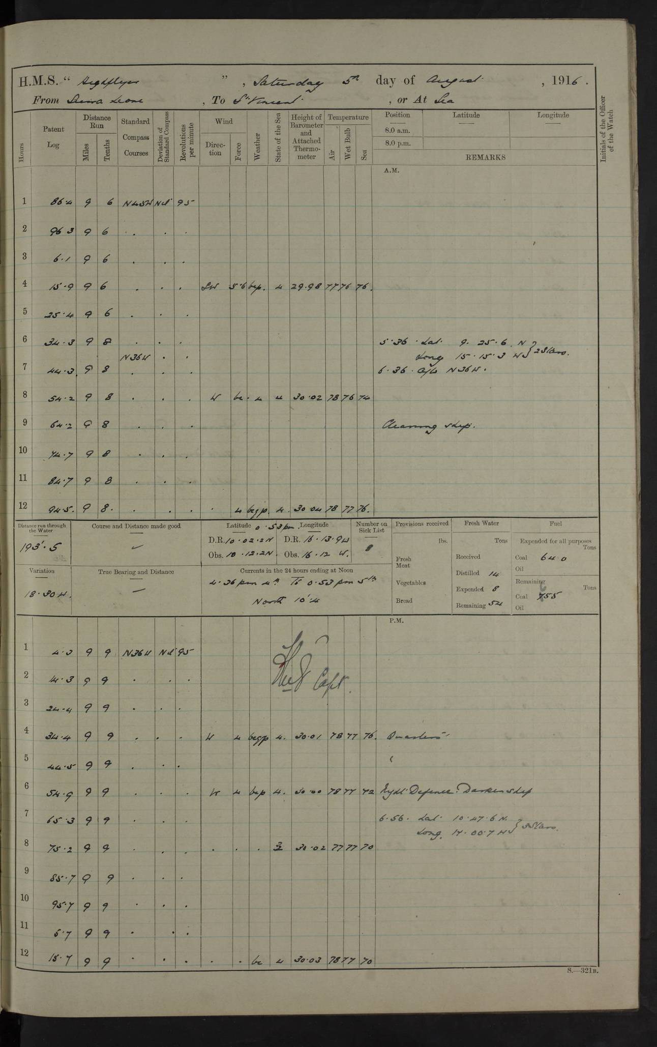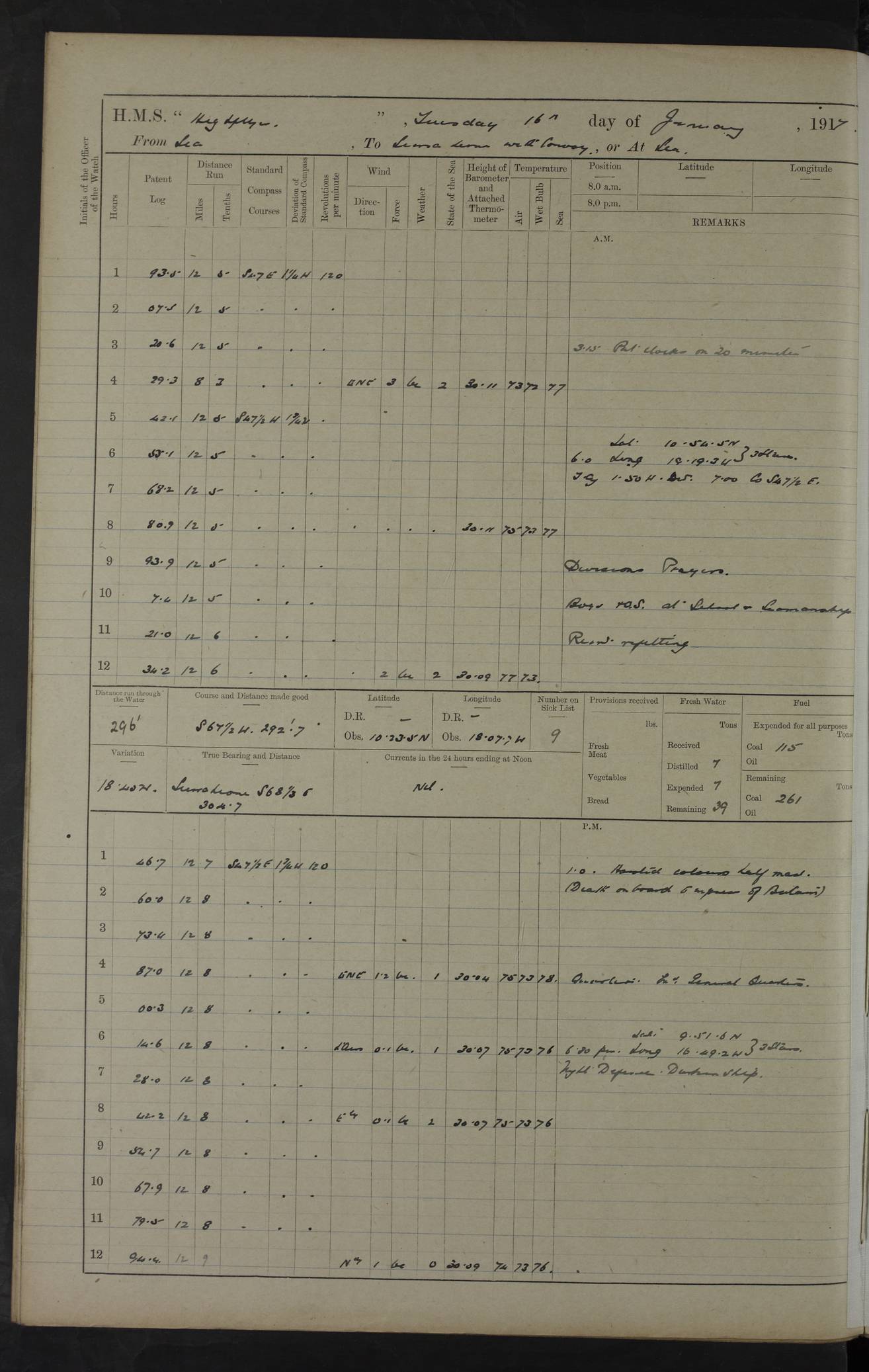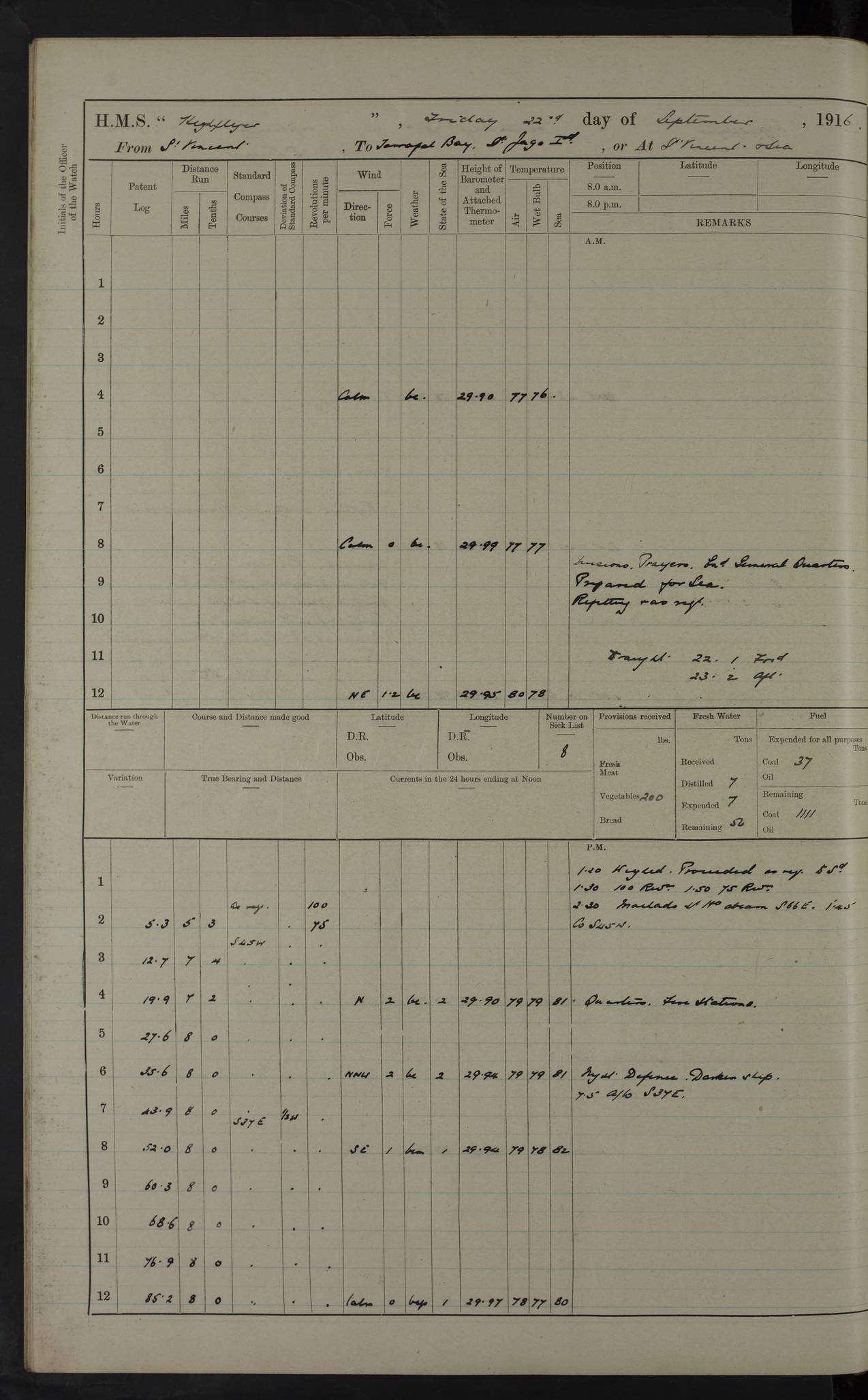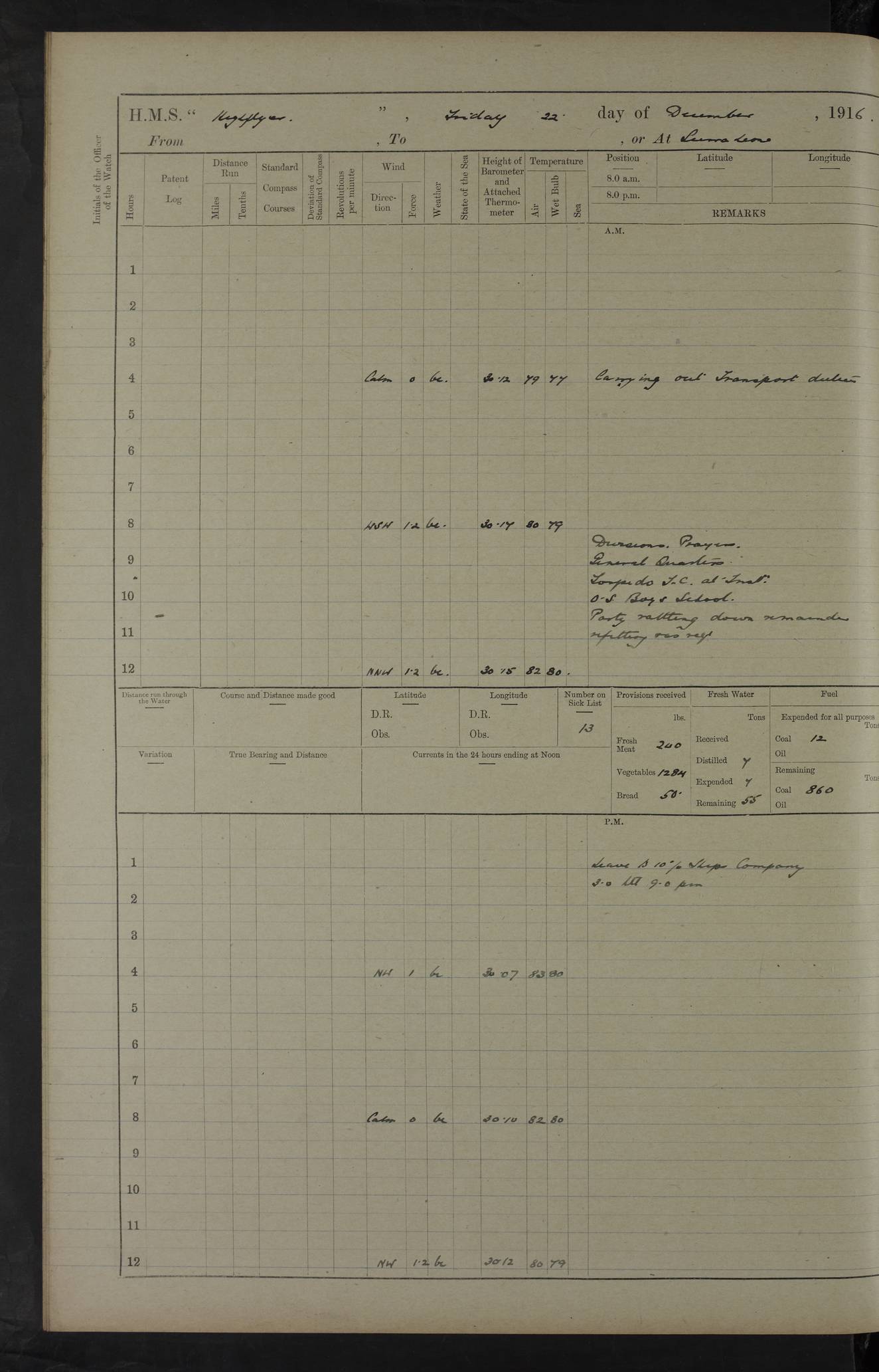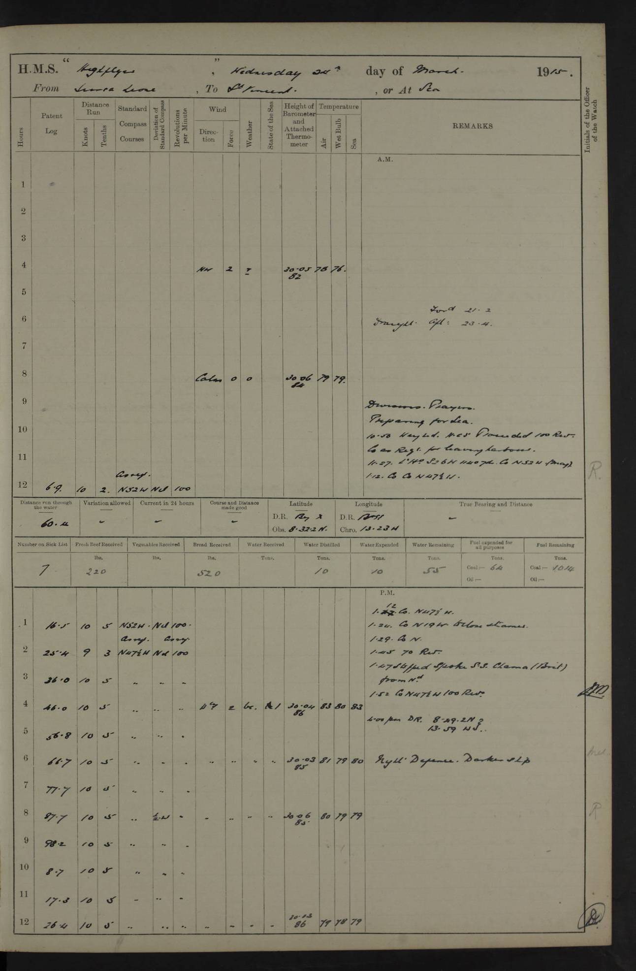 LOGS FOR JANUARY 1917 4ef4f321e53e0a0c91000902: (https://s3.amazonaws.com:443/oldweather/ADM53-44307/ADM 53-44307-129_1.jpg) 4ef4f321e53e0a0c91000903: (https://s3.amazonaws.com:443/oldweather/ADM53-44307/ADM 53-44307-130_0.jpg) 4ef4f321e53e0a0c91000904: (https://s3.amazonaws.com:443/oldweather/ADM53-44307/ADM 53-44307-130_1.jpg) 4ef4f321e53e0a0c91000905: (https://s3.amazonaws.com:443/oldweather/ADM53-44307/ADM 53-44307-131_0.jpg) 4ef4f321e53e0a0c91000906: (https://s3.amazonaws.com:443/oldweather/ADM53-44307/ADM 53-44307-131_1.jpg) 1 January 1917 Sierra Leone Lat 8.5, Long -13.2 6.30am: Party transferring provisions to DONEGAL. 10.00am: Party working on board SS VIRENT dismounting gun. 4ef4f321e53e0a0c91000907: (https://s3.amazonaws.com:443/oldweather/ADM53-44307/ADM 53-44307-132_0.jpg) 2 January 1917 Sierra Leone to St. Vincent Lat 8.7, Long -13.6 6.55am: SS ATLANTIC CITY came alongside. Coaling ship. 9.20am: Weighed and proceeded as requisite out of harbour. 4ef4f321e53e0a0c91000908: (https://s3.amazonaws.com:443/oldweather/ADM53-44307/ADM 53-44307-132_1.jpg) 3 January 1917 Sierra Leone to St. Vincent Lat 11.1, Long -17.7 2.30pm: Sighted SS on P bow steering to SE’d. 4ef4f321e53e0a0c91000909: (https://s3.amazonaws.com:443/oldweather/ADM53-44307/ADM 53-44307-133_0.jpg) 4 January 1917 Sierra Leone to St. Vincent Lat 13.8, Long -21.5 Boys and OS at school and seamanship instruction. Marines at drill. 11.30pm: Passing between St. Jago and Mayo Id. 4ef4f321e53e0a0c9100090a: (https://s3.amazonaws.com:443/oldweather/ADM53-44307/ADM 53-44307-133_1.jpg) 5 January 1917 Sierra Leone to St. Vincent Lat 16.8828, Long -25.0106 6.40am: Sighted San Nicholas Id. abeam. 11.58am: Came to SB 9 fathoms, 4½ shackles. 12.30pm: Lighters came alongside. 2.00pm: Coaling ship. 5.00pm: Stopped coaling for night. 4ef4f321e53e0a0c9100090b: (https://s3.amazonaws.com:443/oldweather/ADM53-44307/ADM 53-44307-134_0.jpg) 6 January 1917 St. Vincent Lat 16.8828, Long -25.0106 6.30am: Coaling ship from lighters. 12.30pm: Finished coaling; received 433 tons including deck cargo. 2.00pm: Prepared for sea. 4ef4f321e53e0a0c9100090c: (https://s3.amazonaws.com:443/oldweather/ADM53-44307/ADM 53-44307-134_1.jpg) 7 January 1917 St. Vincent to rendezvous to meet HMS Shannon and convoy Lat 17.4, Long -25.5 6.35am: Weighed and proceeded as requisite, 100 revs, to southward by San Antonio. 4ef4f321e53e0a0c9100090d: (https://s3.amazonaws.com:443/oldweather/ADM53-44307/ADM 53-44307-135_0.jpg) 8 January 1917 St. Vincent to meet HMS Shannon and convoy Lat 21.2, Long -26.3 9.30am: Party striking down coal. 4ef4f321e53e0a0c9100090e: (https://s3.amazonaws.com:443/oldweather/ADM53-44307/ADM 53-44307-135_1.jpg) 9 January 1917 St. Vincent to meet HMS Shannon and convoy Lat 23.9, Long -25.5 Cleaning ship. 9.00pm: Group closed up exercised during watch. 4ef4f322e53e0a0c9100090f: (https://s3.amazonaws.com:443/oldweather/ADM53-44307/ADM 53-44307-136_0.jpg) 10 January 1917 St. Vincent to meet HMS Shannon and convoy Lat 27.4, Long -25.1 2.00am: Groups closed up, exercised frequently during each watch. 6.30am: Sighted SS on southward beam steering NE’d. 4ef4f322e53e0a0c91000910: (https://s3.amazonaws.com:443/oldweather/ADM53-44307/ADM 53-44307-136_1.jpg) 11 January 1917 St. Vincent to meet HMS Shannon and convoy and to Sierra Leone Lat 29.7, Long -24.7 2.00am: Groups closed up, exercised frequently during each watch. 5.20am: Sighted SHANNON and convoy ahead – CARONIA, EMPRESS OF BRITAIN, WALMER CASTLE, TYNDAREUS, PAKEHA, NESTOR, CORINTHIC. 6.13am: Stopped. Communicated by boat with SHANNON. 6.25am: Course S17W. 115 rev. SHANNON proceeded NE’d., course as requisite to take up station with convoy. [A sketch is included showing the position of the ships. HIGHFLYER is in the middle of the front row with PAKEHA 10 cables to port and WALMER CASTLE 10 cables to starboard. NESTOR, then TYNDAREUS, follow PAKEHA. EMPRESS OF BRITAIN, then CARONIA, follow WALMER CASTLE. CORINTHIC is evenly spaced between TYNDAREUS and CARONIA.] 4ef4f322e53e0a0c91000911: (https://s3.amazonaws.com:443/oldweather/ADM53-44307/ADM 53-44307-137_0.jpg) 12 January 1917 To Sierra Leone with convoy Lat 23.9, Long -26.3 Guns’ crews closed up exercised frequently during day. Boys and OS to school and seamanship instruction. 4ef4f322e53e0a0c91000912: (https://s3.amazonaws.com:443/oldweather/ADM53-44307/ADM 53-44307-137_1.jpg) 13 January 1917 To Sierra Leone with convoy Lat 19.3, Long -28.0 3.57am: 80 rev. to allow TYNDAREUS to remedy engine defect. 4ef4f322e53e0a0c91000913: (https://s3.amazonaws.com:443/oldweather/ADM53-44307/ADM 53-44307-138_0.jpg) 14 January 1917 To Sierra Leone with convoy Lat 14.7, Long -26.9 9.00am: Mustered by Open List. 10.00am: Held Divine Service. 4ef4f322e53e0a0c91000914: (https://s3.amazonaws.com:443/oldweather/ADM53-44307/ADM 53-44307-138_1.jpg) 15 January 1917 To Sierra Leone with convoy Lat 12.3, Long -23.7 Party in stokehold trimming. 4ef4f322e53e0a0c91000915: (https://s3.amazonaws.com:443/oldweather/ADM53-44307/ADM 53-44307-139_0.jpg) 16 January 1917 To Sierra Leone with convoy Lat 10.4, Long -18.1 1.00pm: Hoisted colours half-mast. (Death on board EMPRESS OF BRITAIN.) 4ef4f322e53e0a0c91000916: (https://s3.amazonaws.com:443/oldweather/ADM53-44307/ADM 53-44307-139_1.jpg) 17 January 1917 To Sierra Leone with convoy Lat 8.5, Long -13.2 9.15am: Observed land ahead. Prepared for coaling. 10.40am: Formed single line ahead. 12.30pm: Transports proceeded independently to anchoring berths. 1.12pm: Came to with PB anchor in 10 fathoms, veered to 4 shackles, A3 berth. 5.30pm: SS MANSFIELD came alongside. 4ef4f322e53e0a0c91000917: (https://s3.amazonaws.com:443/oldweather/ADM53-44307/ADM 53-44307-140_0.jpg) 18 January 1917 Sierra Leone Lat 8.5, Long -13.2 6.00am: Commenced coaling. 2.15pm: Finished coaling; received 840 tons. 4ef4f322e53e0a0c91000918: (https://s3.amazonaws.com:443/oldweather/ADM53-44307/ADM 53-44307-140_1.jpg) 19 January 1917 Sierra Leone Lat 8.5, 