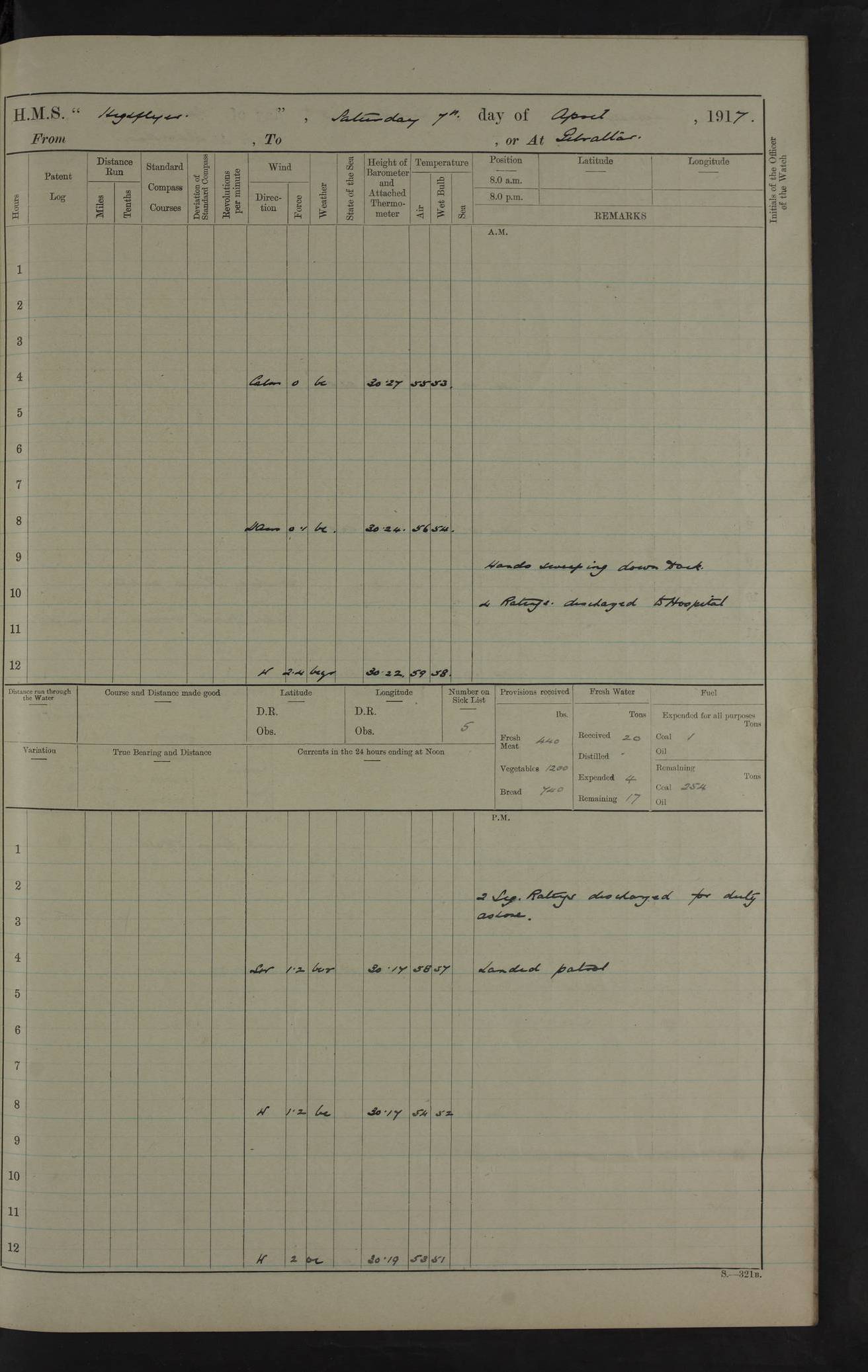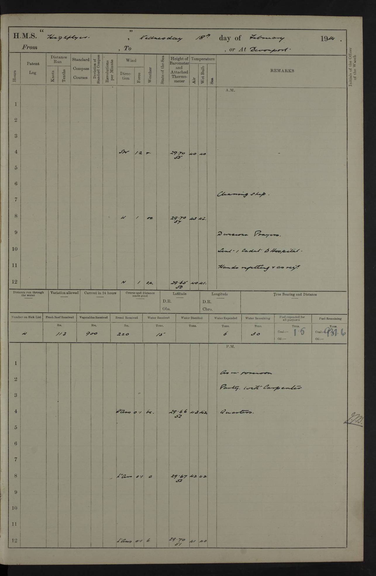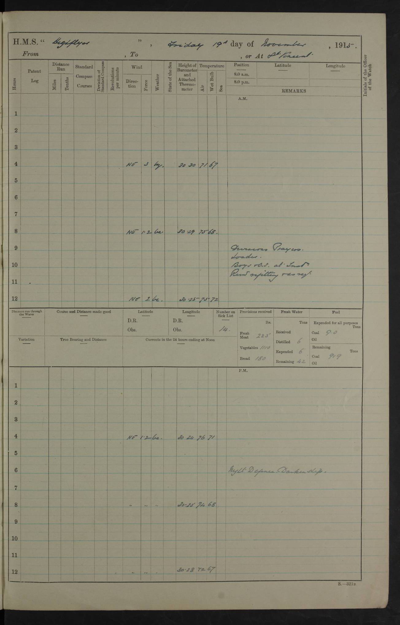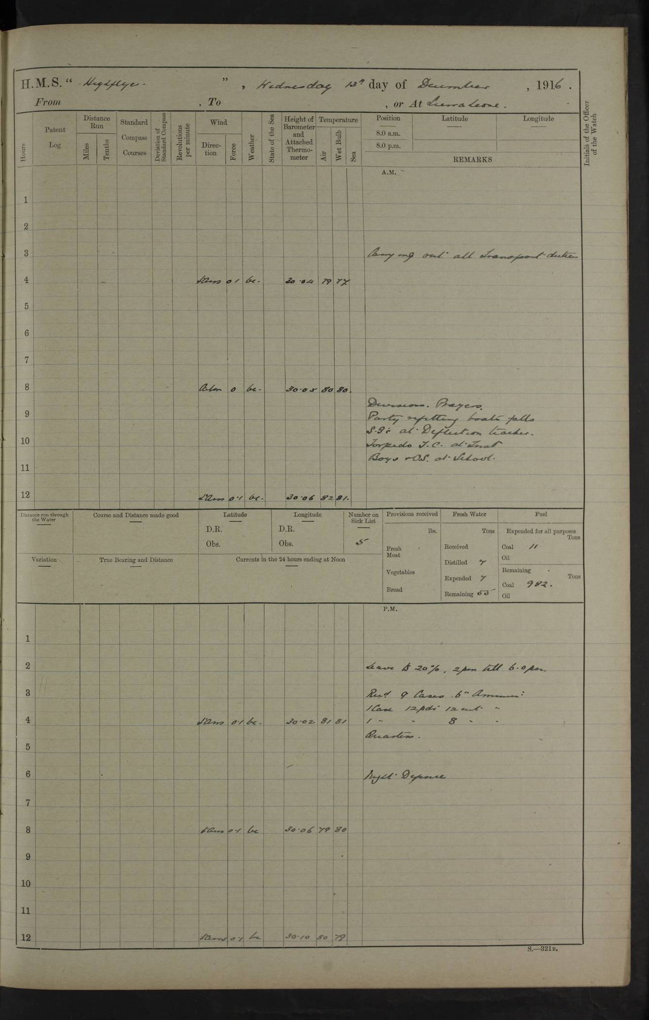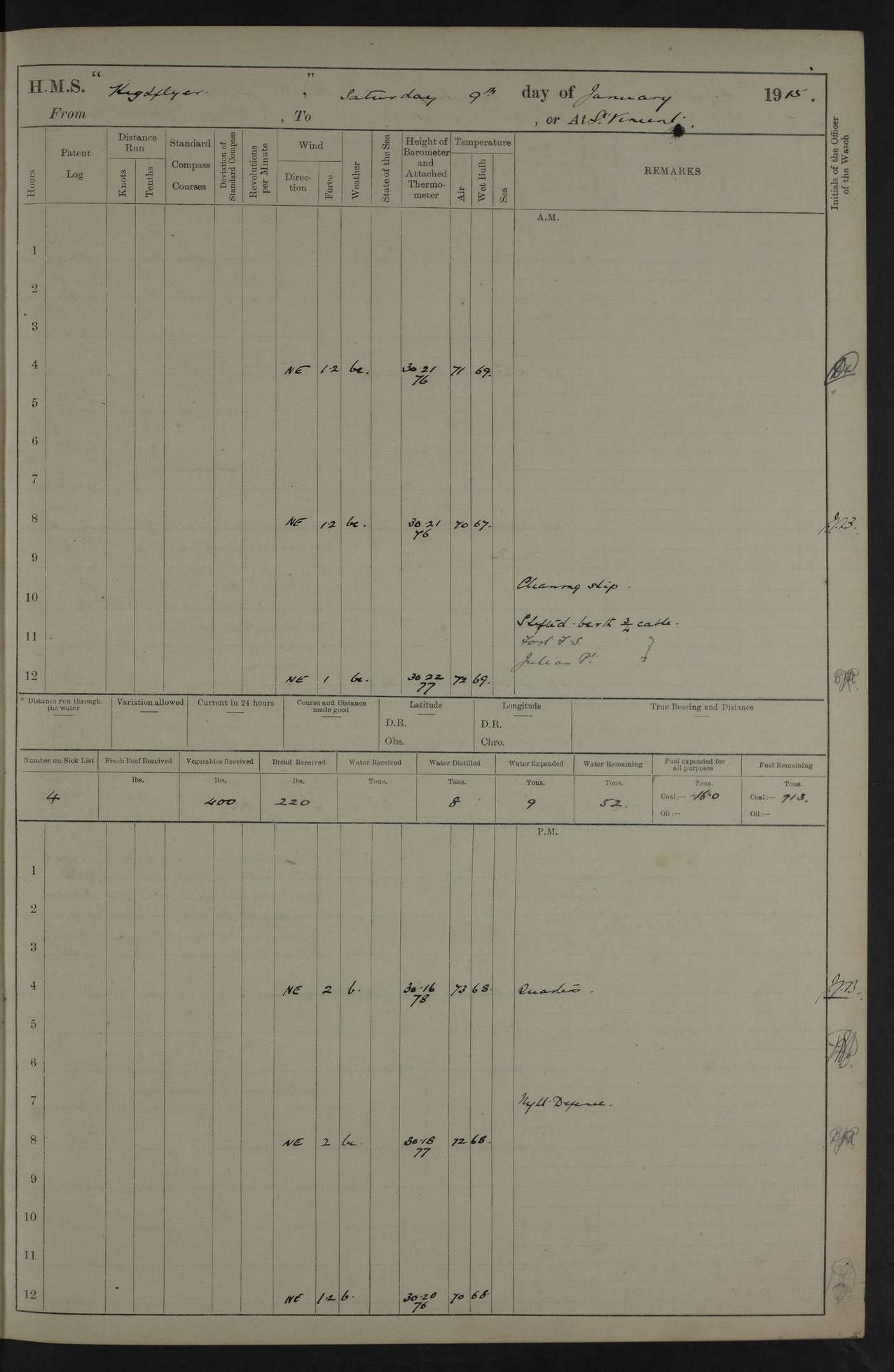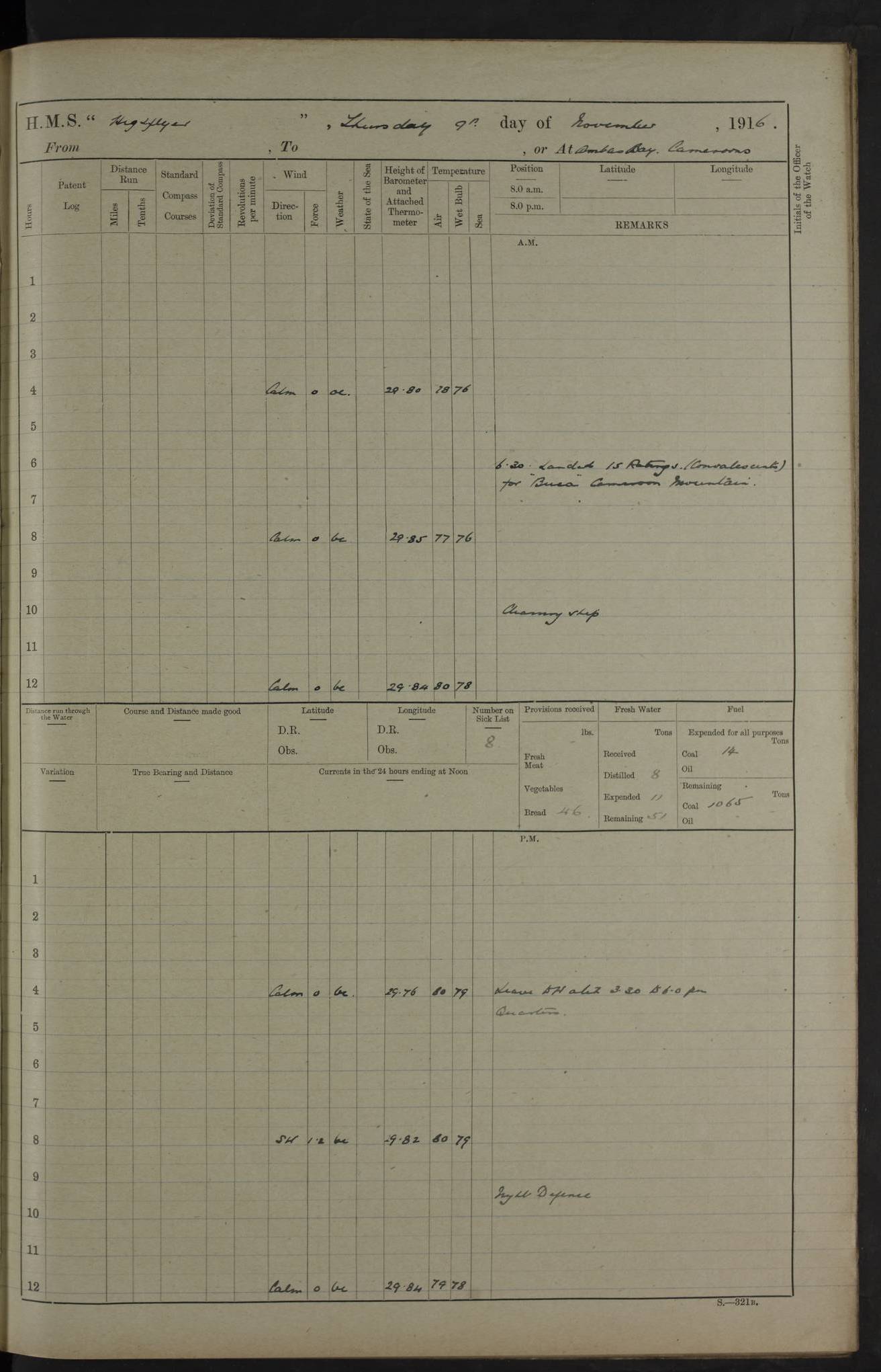 LOGS FOR JANUARY 1917 4ef4f321e53e0a0c91000902: (https://s3.amazonaws.com:443/oldweather/ADM53-44307/ADM 53-44307-129_1.jpg) 4ef4f321e53e0a0c91000903: (https://s3.amazonaws.com:443/oldweather/ADM53-44307/ADM 53-44307-130_0.jpg) 4ef4f321e53e0a0c91000904: (https://s3.amazonaws.com:443/oldweather/ADM53-44307/ADM 53-44307-130_1.jpg) 4ef4f321e53e0a0c91000905: (https://s3.amazonaws.com:443/oldweather/ADM53-44307/ADM 53-44307-131_0.jpg) 4ef4f321e53e0a0c91000906: (https://s3.amazonaws.com:443/oldweather/ADM53-44307/ADM 53-44307-131_1.jpg) 1 January 1917 Sierra Leone Lat 8.5, Long -13.2 6.30am: Party transferring provisions to DONEGAL. 10.00am: Party working on board SS VIRENT dismounting gun. 4ef4f321e53e0a0c91000907: (https://s3.amazonaws.com:443/oldweather/ADM53-44307/ADM 53-44307-132_0.jpg) 2 January 1917 Sierra Leone to St. Vincent Lat 8.7, Long -13.6 6.55am: SS ATLANTIC CITY came alongside. Coaling ship. 9.20am: Weighed and proceeded as requisite out of harbour. 4ef4f321e53e0a0c91000908: (https://s3.amazonaws.com:443/oldweather/ADM53-44307/ADM 53-44307-132_1.jpg) 3 January 1917 Sierra Leone to St. Vincent Lat 11.1, Long -17.7 2.30pm: Sighted SS on P bow steering to SE’d. 4ef4f321e53e0a0c91000909: (https://s3.amazonaws.com:443/oldweather/ADM53-44307/ADM 53-44307-133_0.jpg) 4 January 1917 Sierra Leone to St. Vincent Lat 13.8, Long -21.5 Boys and OS at school and seamanship instruction. Marines at drill. 11.30pm: Passing between St. Jago and Mayo Id. 4ef4f321e53e0a0c9100090a: (https://s3.amazonaws.com:443/oldweather/ADM53-44307/ADM 53-44307-133_1.jpg) 5 January 1917 Sierra Leone to St. Vincent Lat 16.8828, Long -25.0106 6.40am: Sighted San Nicholas Id. abeam. 11.58am: Came to SB 9 fathoms, 4½ shackles. 12.30pm: Lighters came alongside. 2.00pm: Coaling ship. 5.00pm: Stopped coaling for night. 4ef4f321e53e0a0c9100090b: (https://s3.amazonaws.com:443/oldweather/ADM53-44307/ADM 53-44307-134_0.jpg) 6 January 1917 St. Vincent Lat 16.8828, Long -25.0106 6.30am: Coaling ship from lighters. 12.30pm: Finished coaling; received 433 tons including deck cargo. 2.00pm: Prepared for sea. 4ef4f321e53e0a0c9100090c: (https://s3.amazonaws.com:443/oldweather/ADM53-44307/ADM 53-44307-134_1.jpg) 7 January 1917 St. Vincent to rendezvous to meet HMS Shannon and convoy Lat 17.4, Long -25.5 6.35am: Weighed and proceeded as requisite, 100 revs, to southward by San Antonio. 4ef4f321e53e0a0c9100090d: (https://s3.amazonaws.com:443/oldweather/ADM53-44307/ADM 53-44307-135_0.jpg) 8 January 1917 St. Vincent to meet HMS Shannon and convoy Lat 21.2, Long -26.3 9.30am: Party striking down coal. 4ef4f321e53e0a0c9100090e: (https://s3.amazonaws.com:443/oldweather/ADM53-44307/ADM 53-44307-135_1.jpg) 9 January 1917 St. Vincent to meet HMS Shannon and convoy Lat 23.9, Long -25.5 Cleaning ship. 9.00pm: Group closed up exercised during watch. 4ef4f322e53e0a0c9100090f: (https://s3.amazonaws.com:443/oldweather/ADM53-44307/ADM 53-44307-136_0.jpg) 10 January 1917 St. Vincent to meet HMS Shannon and convoy Lat 27.4, Long -25.1 2.00am: Groups closed up, exercised frequently during each watch. 6.30am: Sighted SS on southward beam steering NE’d. 4ef4f322e53e0a0c91000910: (https://s3.amazonaws.com:443/oldweather/ADM53-44307/ADM 53-44307-136_1.jpg) 11 January 1917 St. Vincent to meet HMS Shannon and convoy and to Sierra Leone Lat 29.7, Long -24.7 2.00am: Groups closed up, exercised frequently during each watch. 5.20am: Sighted SHANNON and convoy ahead – CARONIA, EMPRESS OF BRITAIN, WALMER CASTLE, TYNDAREUS, PAKEHA, NESTOR, CORINTHIC. 6.13am: Stopped. Communicated by boat with SHANNON. 6.25am: Course S17W. 115 rev. SHANNON proceeded NE’d., course as requisite to take up station with convoy. [A sketch is included showing the position of the ships. HIGHFLYER is in the middle of the front row with PAKEHA 10 cables to port and WALMER CASTLE 10 cables to starboard. NESTOR, then TYNDAREUS, follow PAKEHA. EMPRESS OF BRITAIN, then CARONIA, follow WALMER CASTLE. CORINTHIC is evenly spaced between TYNDAREUS and CARONIA.] 4ef4f322e53e0a0c91000911: (https://s3.amazonaws.com:443/oldweather/ADM53-44307/ADM 53-44307-137_0.jpg) 12 January 1917 To Sierra Leone with convoy Lat 23.9, Long -26.3 Guns’ crews closed up exercised frequently during day. Boys and OS to school and seamanship instruction. 4ef4f322e53e0a0c91000912: (https://s3.amazonaws.com:443/oldweather/ADM53-44307/ADM 53-44307-137_1.jpg) 13 January 1917 To Sierra Leone with convoy Lat 19.3, Long -28.0 3.57am: 80 rev. to allow TYNDAREUS to remedy engine defect. 4ef4f322e53e0a0c91000913: (https://s3.amazonaws.com:443/oldweather/ADM53-44307/ADM 53-44307-138_0.jpg) 14 January 1917 To Sierra Leone with convoy Lat 14.7, Long -26.9 9.00am: Mustered by Open List. 10.00am: Held Divine Service. 4ef4f322e53e0a0c91000914: (https://s3.amazonaws.com:443/oldweather/ADM53-44307/ADM 53-44307-138_1.jpg) 15 January 1917 To Sierra Leone with convoy Lat 12.3, Long -23.7 Party in stokehold trimming. 4ef4f322e53e0a0c91000915: (https://s3.amazonaws.com:443/oldweather/ADM53-44307/ADM 53-44307-139_0.jpg) 16 January 1917 To Sierra Leone with convoy Lat 10.4, Long -18.1 1.00pm: Hoisted colours half-mast. (Death on board EMPRESS OF BRITAIN.) 4ef4f322e53e0a0c91000916: (https://s3.amazonaws.com:443/oldweather/ADM53-44307/ADM 53-44307-139_1.jpg) 17 January 1917 To Sierra Leone with convoy Lat 8.5, Long -13.2 9.15am: Observed land ahead. Prepared for coaling. 10.40am: Formed single line ahead. 12.30pm: Transports proceeded independently to anchoring berths. 1.12pm: Came to with PB anchor in 10 fathoms, veered to 4 shackles, A3 berth. 5.30pm: SS MANSFIELD came alongside. 4ef4f322e53e0a0c91000917: (https://s3.amazonaws.com:443/oldweather/ADM53-44307/ADM 53-44307-140_0.jpg) 18 January 1917 Sierra Leone Lat 8.5, Long -13.2 6.00am: Commenced coaling. 2.15pm: Finished coaling; received 840 tons. 4ef4f322e53e0a0c91000918: (https://s3.amazonaws.com:443/oldweather/ADM53-44307/ADM 53-44307-140_1.jpg) 19 January 1917 Sierra Leone Lat 8.5, 