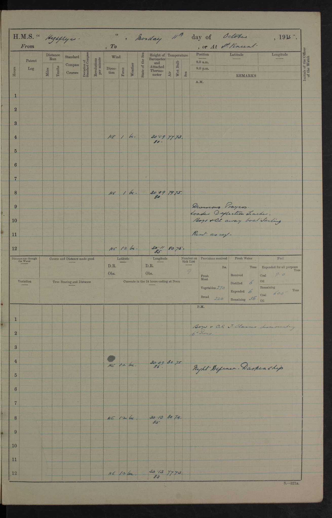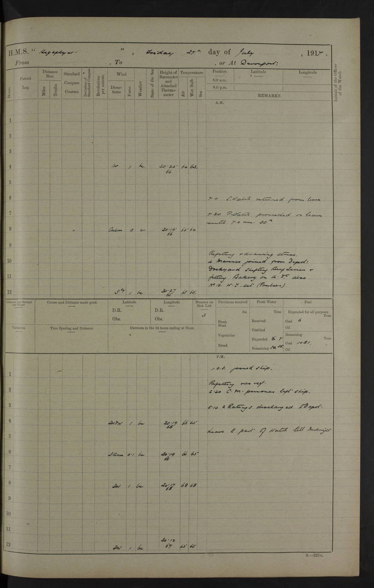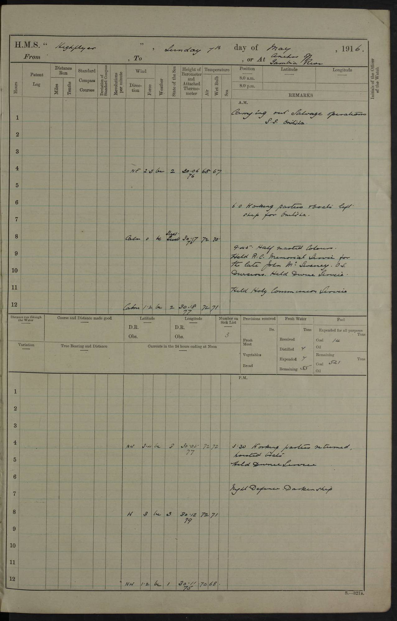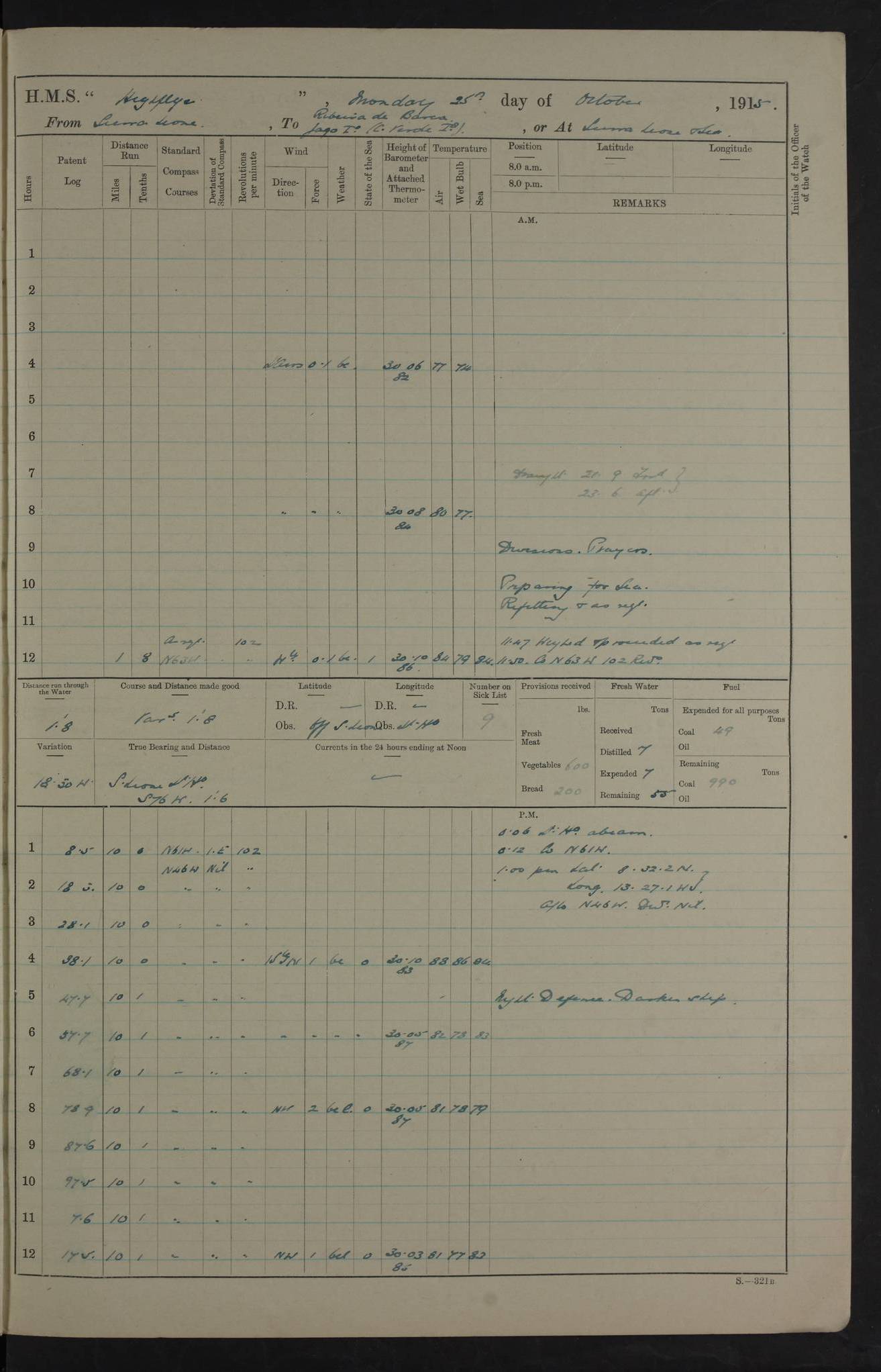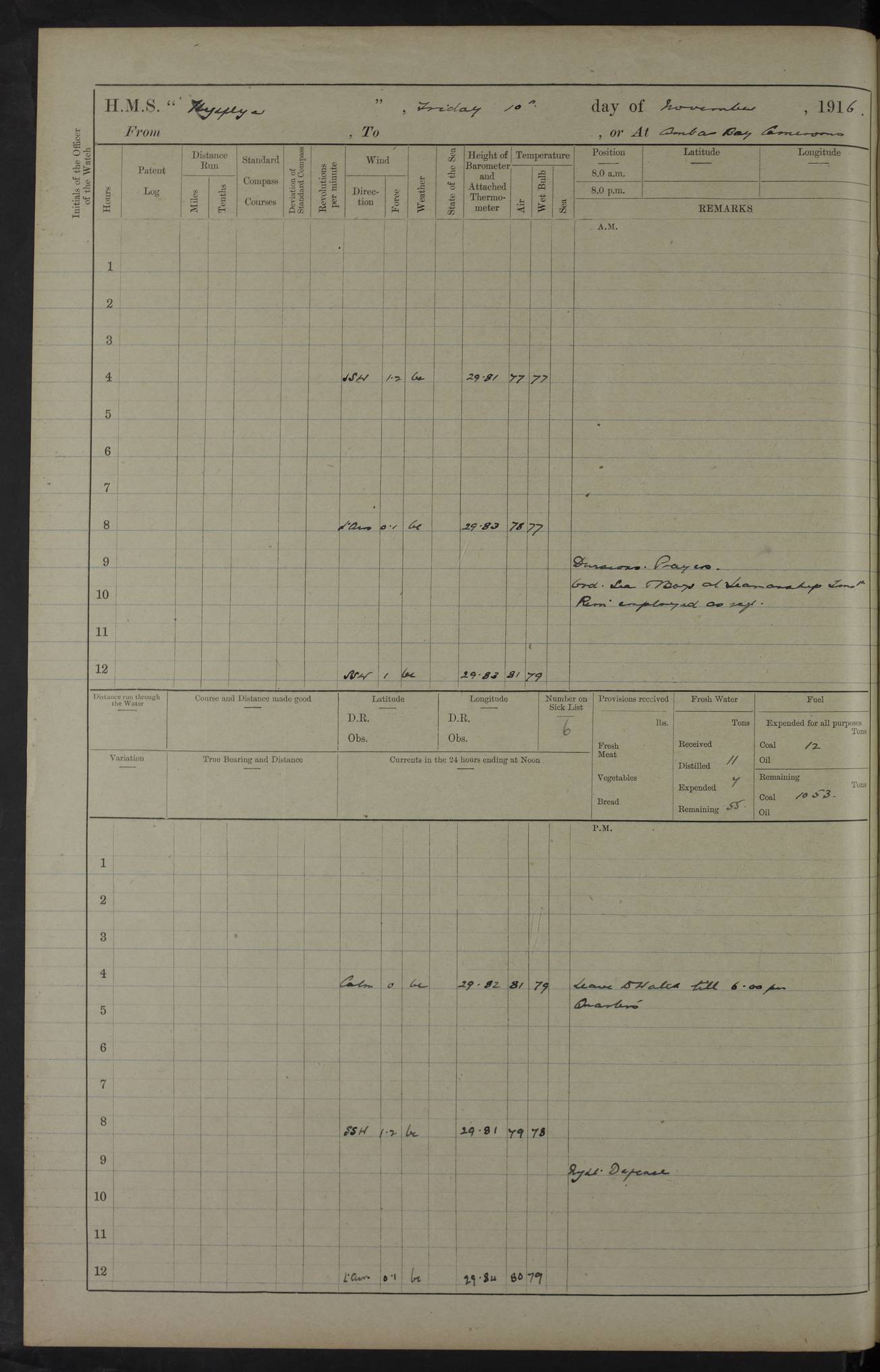 LOGS FOR JANUARY 1917 4ef4f321e53e0a0c91000902: (https://s3.amazonaws.com:443/oldweather/ADM53-44307/ADM 53-44307-129_1.jpg) 4ef4f321e53e0a0c91000903: (https://s3.amazonaws.com:443/oldweather/ADM53-44307/ADM 53-44307-130_0.jpg) 4ef4f321e53e0a0c91000904: (https://s3.amazonaws.com:443/oldweather/ADM53-44307/ADM 53-44307-130_1.jpg) 4ef4f321e53e0a0c91000905: (https://s3.amazonaws.com:443/oldweather/ADM53-44307/ADM 53-44307-131_0.jpg) 4ef4f321e53e0a0c91000906: (https://s3.amazonaws.com:443/oldweather/ADM53-44307/ADM 53-44307-131_1.jpg) 1 January 1917 Sierra Leone Lat 8.5, Long -13.2 6.30am: Party transferring provisions to DONEGAL. 10.00am: Party working on board SS VIRENT dismounting gun. 4ef4f321e53e0a0c91000907: (https://s3.amazonaws.com:443/oldweather/ADM53-44307/ADM 53-44307-132_0.jpg) 2 January 1917 Sierra Leone to St. Vincent Lat 8.7, Long -13.6 6.55am: SS ATLANTIC CITY came alongside. Coaling ship. 9.20am: Weighed and proceeded as requisite out of harbour. 4ef4f321e53e0a0c91000908: (https://s3.amazonaws.com:443/oldweather/ADM53-44307/ADM 53-44307-132_1.jpg) 3 January 1917 Sierra Leone to St. Vincent Lat 11.1, Long -17.7 2.30pm: Sighted SS on P bow steering to SE’d. 4ef4f321e53e0a0c91000909: (https://s3.amazonaws.com:443/oldweather/ADM53-44307/ADM 53-44307-133_0.jpg) 4 January 1917 Sierra Leone to St. Vincent Lat 13.8, Long -21.5 Boys and OS at school and seamanship instruction. Marines at drill. 11.30pm: Passing between St. Jago and Mayo Id. 4ef4f321e53e0a0c9100090a: (https://s3.amazonaws.com:443/oldweather/ADM53-44307/ADM 53-44307-133_1.jpg) 5 January 1917 Sierra Leone to St. Vincent Lat 16.8828, Long -25.0106 6.40am: Sighted San Nicholas Id. abeam. 11.58am: Came to SB 9 fathoms, 4½ shackles. 12.30pm: Lighters came alongside. 2.00pm: Coaling ship. 5.00pm: Stopped coaling for night. 4ef4f321e53e0a0c9100090b: (https://s3.amazonaws.com:443/oldweather/ADM53-44307/ADM 53-44307-134_0.jpg) 6 January 1917 St. Vincent Lat 16.8828, Long -25.0106 6.30am: Coaling ship from lighters. 12.30pm: Finished coaling; received 433 tons including deck cargo. 2.00pm: Prepared for sea. 4ef4f321e53e0a0c9100090c: (https://s3.amazonaws.com:443/oldweather/ADM53-44307/ADM 53-44307-134_1.jpg) 7 January 1917 St. Vincent to rendezvous to meet HMS Shannon and convoy Lat 17.4, Long -25.5 6.35am: Weighed and proceeded as requisite, 100 revs, to southward by San Antonio. 4ef4f321e53e0a0c9100090d: (https://s3.amazonaws.com:443/oldweather/ADM53-44307/ADM 53-44307-135_0.jpg) 8 January 1917 St. Vincent to meet HMS Shannon and convoy Lat 21.2, Long -26.3 9.30am: Party striking down coal. 4ef4f321e53e0a0c9100090e: (https://s3.amazonaws.com:443/oldweather/ADM53-44307/ADM 53-44307-135_1.jpg) 9 January 1917 St. Vincent to meet HMS Shannon and convoy Lat 23.9, Long -25.5 Cleaning ship. 9.00pm: Group closed up exercised during watch. 4ef4f322e53e0a0c9100090f: (https://s3.amazonaws.com:443/oldweather/ADM53-44307/ADM 53-44307-136_0.jpg) 10 January 1917 St. Vincent to meet HMS Shannon and convoy Lat 27.4, Long -25.1 2.00am: Groups closed up, exercised frequently during each watch. 6.30am: Sighted SS on southward beam steering NE’d. 4ef4f322e53e0a0c91000910: (https://s3.amazonaws.com:443/oldweather/ADM53-44307/ADM 53-44307-136_1.jpg) 11 January 1917 St. Vincent to meet HMS Shannon and convoy and to Sierra Leone Lat 29.7, Long -24.7 2.00am: Groups closed up, exercised frequently during each watch. 5.20am: Sighted SHANNON and convoy ahead – CARONIA, EMPRESS OF BRITAIN, WALMER CASTLE, TYNDAREUS, PAKEHA, NESTOR, CORINTHIC. 6.13am: Stopped. Communicated by boat with SHANNON. 6.25am: Course S17W. 115 rev. SHANNON proceeded NE’d., course as requisite to take up station with convoy. [A sketch is included showing the position of the ships. HIGHFLYER is in the middle of the front row with PAKEHA 10 cables to port and WALMER CASTLE 10 cables to starboard. NESTOR, then TYNDAREUS, follow PAKEHA. EMPRESS OF BRITAIN, then CARONIA, follow WALMER CASTLE. CORINTHIC is evenly spaced between TYNDAREUS and CARONIA.] 4ef4f322e53e0a0c91000911: (https://s3.amazonaws.com:443/oldweather/ADM53-44307/ADM 53-44307-137_0.jpg) 12 January 1917 To Sierra Leone with convoy Lat 23.9, Long -26.3 Guns’ crews closed up exercised frequently during day. Boys and OS to school and seamanship instruction. 4ef4f322e53e0a0c91000912: (https://s3.amazonaws.com:443/oldweather/ADM53-44307/ADM 53-44307-137_1.jpg) 13 January 1917 To Sierra Leone with convoy Lat 19.3, Long -28.0 3.57am: 80 rev. to allow TYNDAREUS to remedy engine defect. 4ef4f322e53e0a0c91000913: (https://s3.amazonaws.com:443/oldweather/ADM53-44307/ADM 53-44307-138_0.jpg) 14 January 1917 To Sierra Leone with convoy Lat 14.7, Long -26.9 9.00am: Mustered by Open List. 10.00am: Held Divine Service. 4ef4f322e53e0a0c91000914: (https://s3.amazonaws.com:443/oldweather/ADM53-44307/ADM 53-44307-138_1.jpg) 15 January 1917 To Sierra Leone with convoy Lat 12.3, Long -23.7 Party in stokehold trimming. 4ef4f322e53e0a0c91000915: (https://s3.amazonaws.com:443/oldweather/ADM53-44307/ADM 53-44307-139_0.jpg) 16 January 1917 To Sierra Leone with convoy Lat 10.4, Long -18.1 1.00pm: Hoisted colours half-mast. (Death on board EMPRESS OF BRITAIN.) 4ef4f322e53e0a0c91000916: (https://s3.amazonaws.com:443/oldweather/ADM53-44307/ADM 53-44307-139_1.jpg) 17 January 1917 To Sierra Leone with convoy Lat 8.5, Long -13.2 9.15am: Observed land ahead. Prepared for coaling. 10.40am: Formed single line ahead. 12.30pm: Transports proceeded independently to anchoring berths. 1.12pm: Came to with PB anchor in 10 fathoms, veered to 4 shackles, A3 berth. 5.30pm: SS MANSFIELD came alongside. 4ef4f322e53e0a0c91000917: (https://s3.amazonaws.com:443/oldweather/ADM53-44307/ADM 53-44307-140_0.jpg) 18 January 1917 Sierra Leone Lat 8.5, Long -13.2 6.00am: Commenced coaling. 2.15pm: Finished coaling; received 840 tons. 4ef4f322e53e0a0c91000918: (https://s3.amazonaws.com:443/oldweather/ADM53-44307/ADM 53-44307-140_1.jpg) 19 January 1917 Sierra Leone Lat 8.5, 