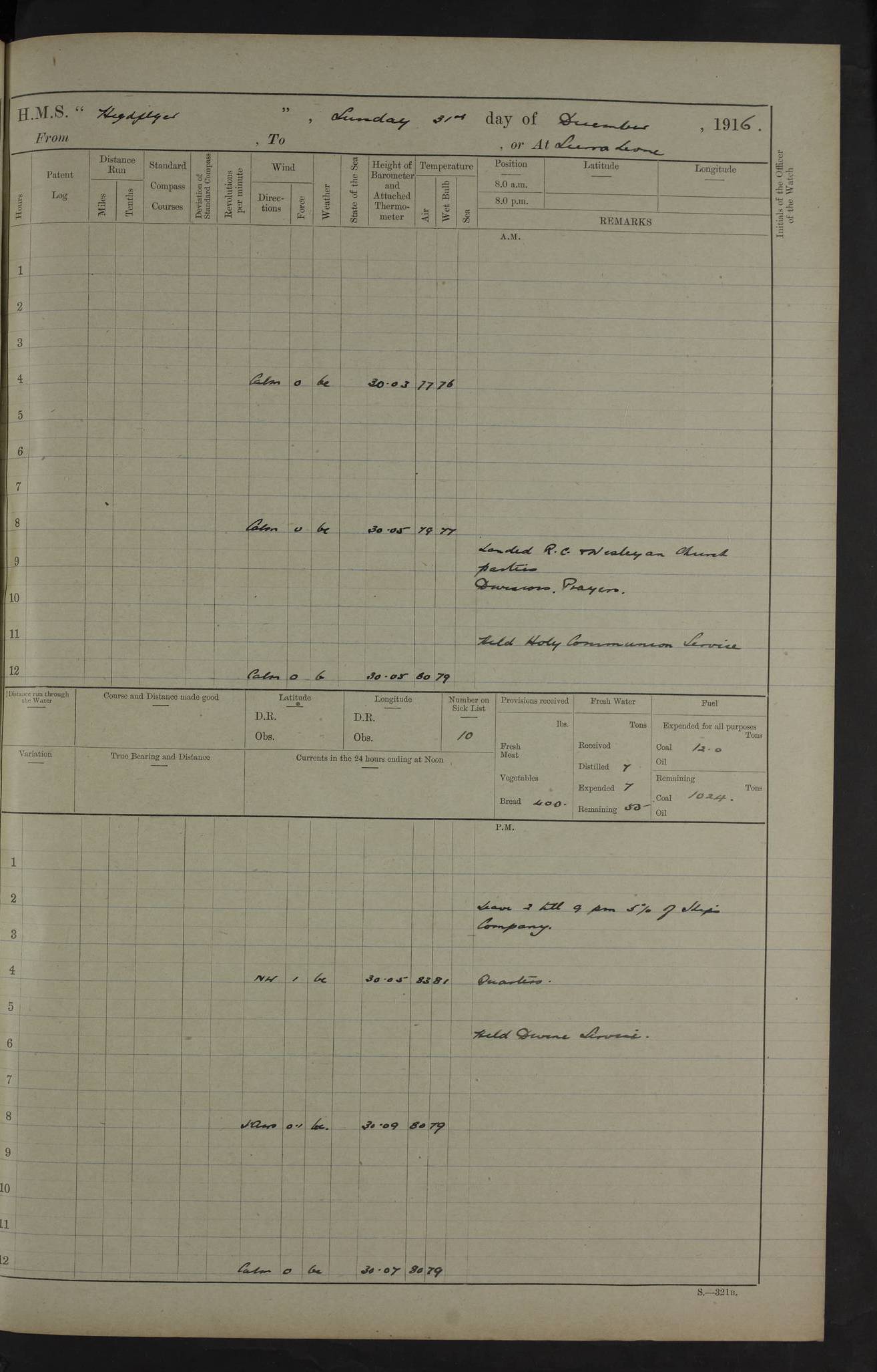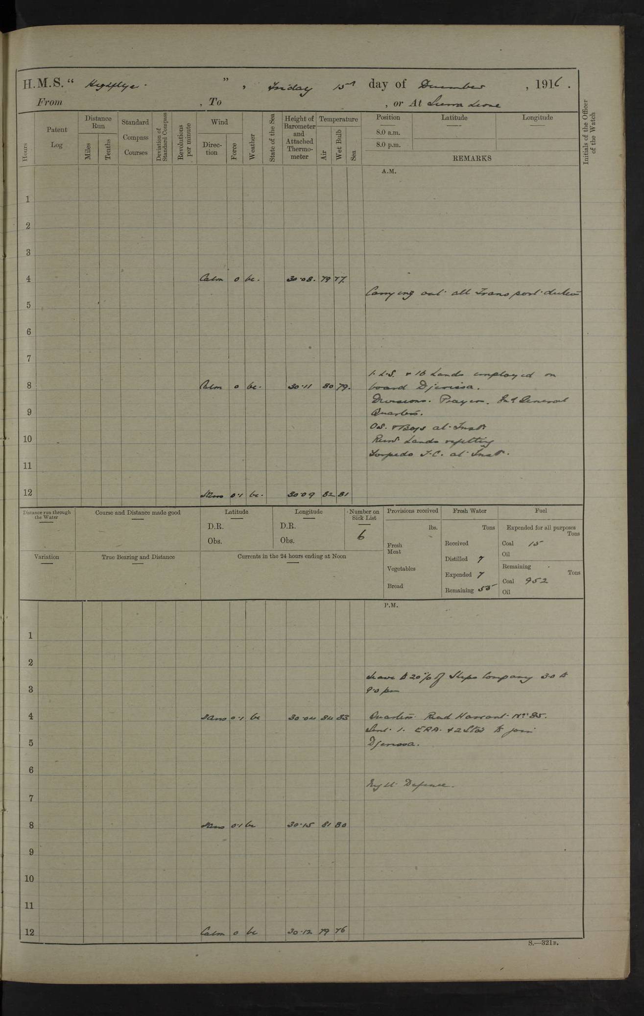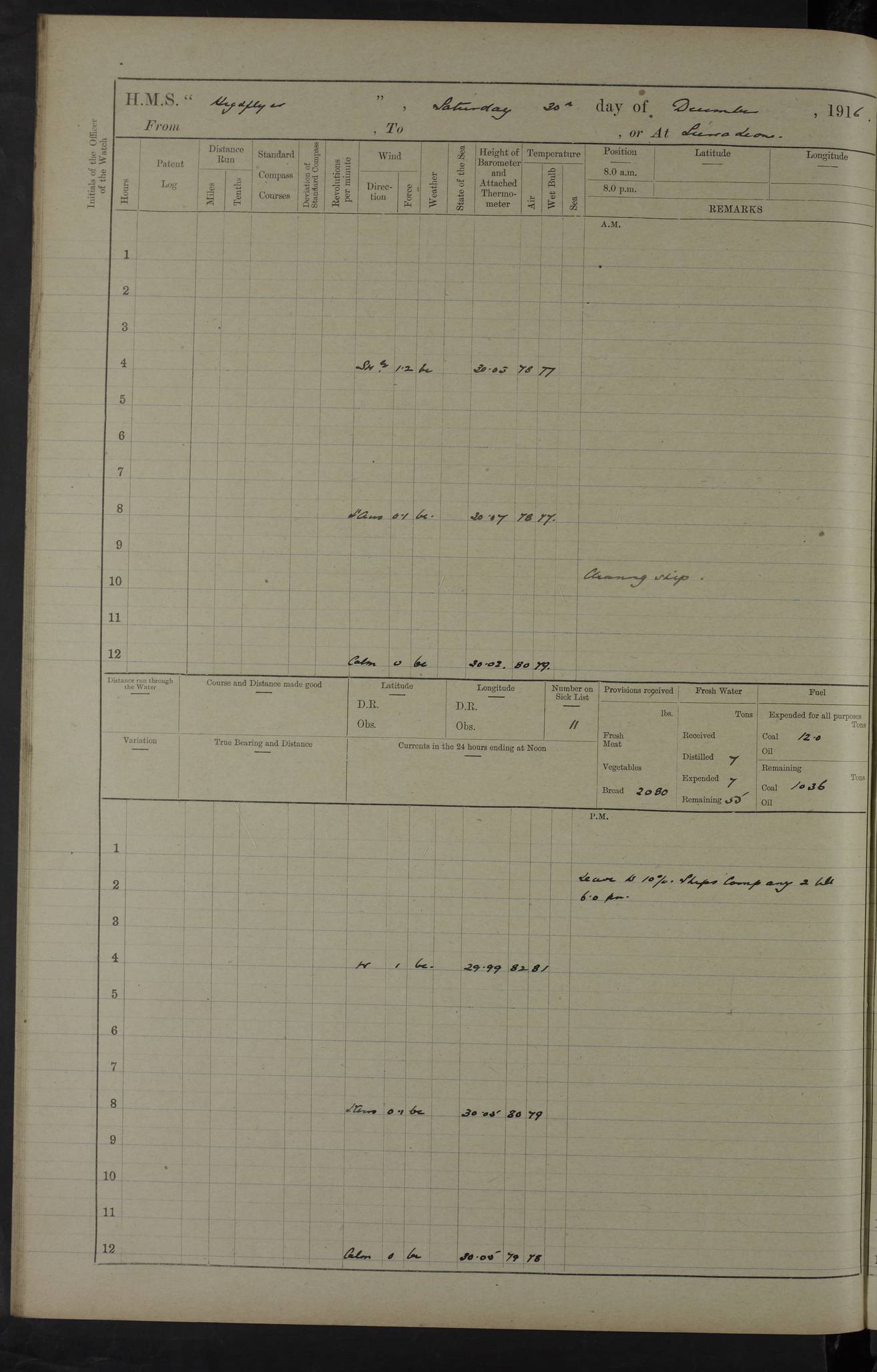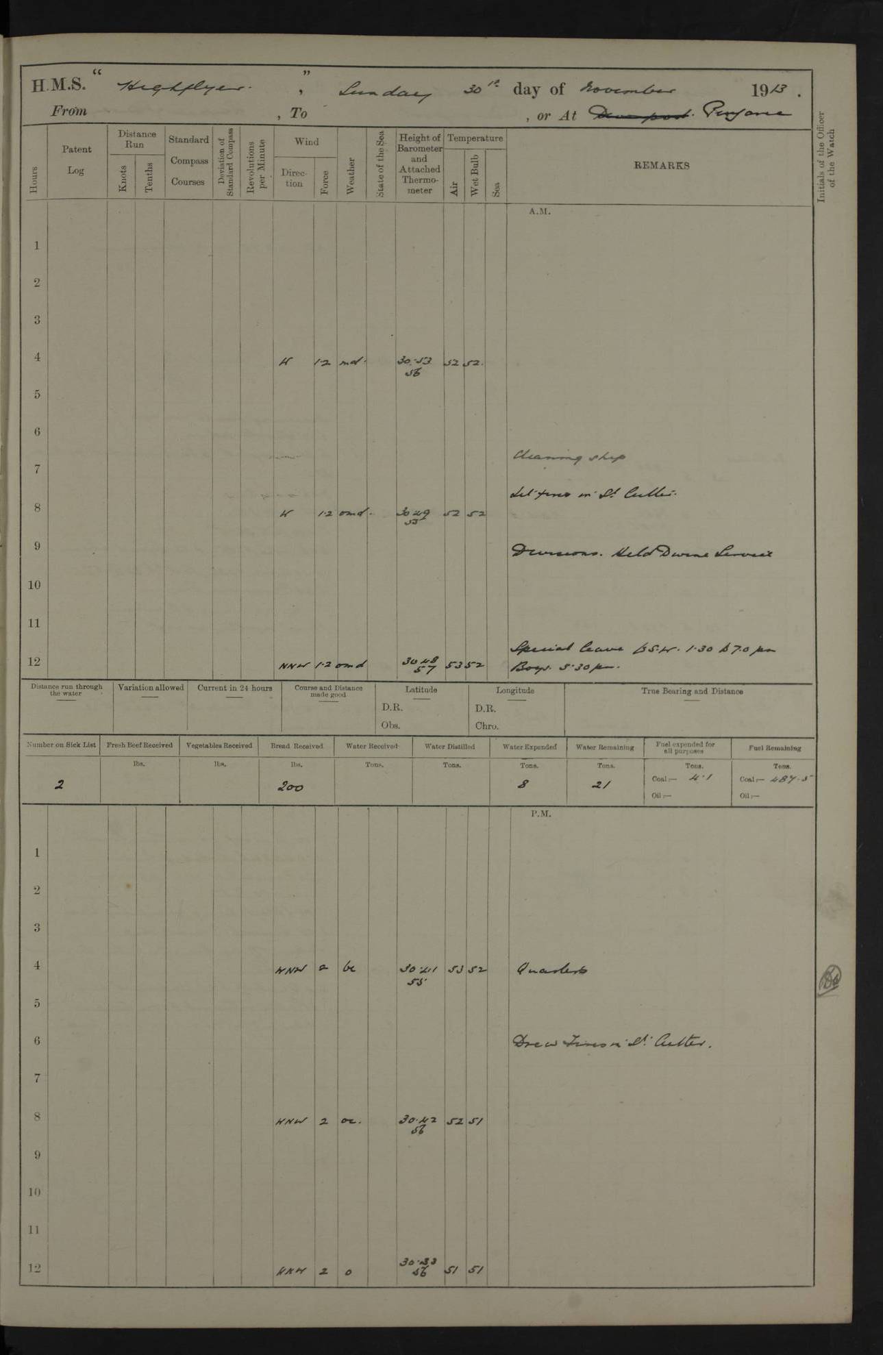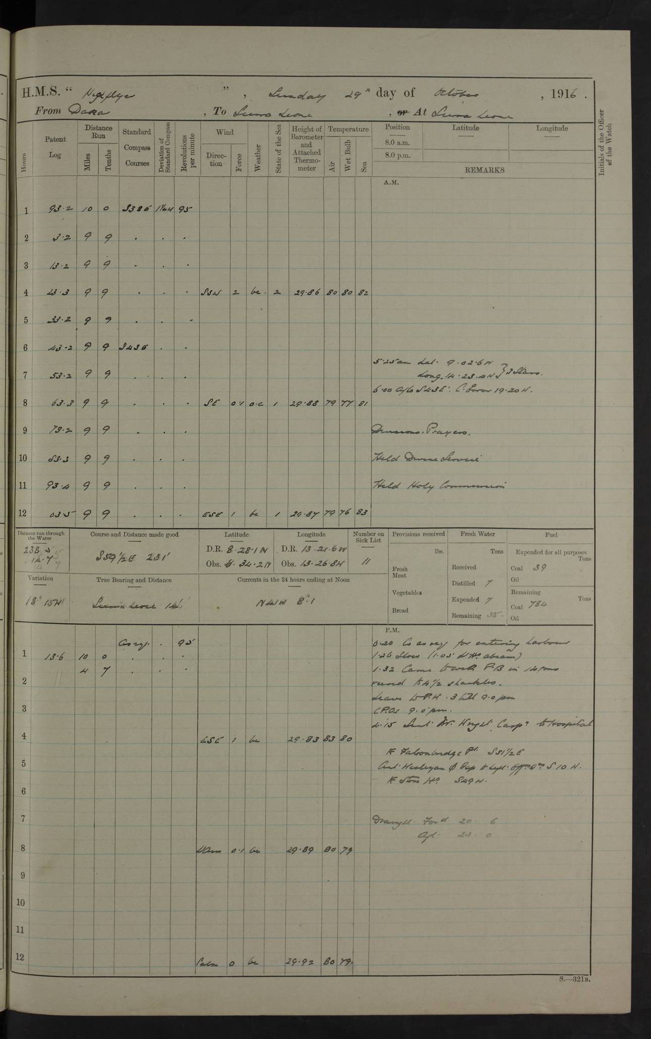 LOGS FOR JANUARY 1917 4ef4f321e53e0a0c91000902: (https://s3.amazonaws.com:443/oldweather/ADM53-44307/ADM 53-44307-129_1.jpg) 4ef4f321e53e0a0c91000903: (https://s3.amazonaws.com:443/oldweather/ADM53-44307/ADM 53-44307-130_0.jpg) 4ef4f321e53e0a0c91000904: (https://s3.amazonaws.com:443/oldweather/ADM53-44307/ADM 53-44307-130_1.jpg) 4ef4f321e53e0a0c91000905: (https://s3.amazonaws.com:443/oldweather/ADM53-44307/ADM 53-44307-131_0.jpg) 4ef4f321e53e0a0c91000906: (https://s3.amazonaws.com:443/oldweather/ADM53-44307/ADM 53-44307-131_1.jpg) 1 January 1917 Sierra Leone Lat 8.5, Long -13.2 6.30am: Party transferring provisions to DONEGAL. 10.00am: Party working on board SS VIRENT dismounting gun. 4ef4f321e53e0a0c91000907: (https://s3.amazonaws.com:443/oldweather/ADM53-44307/ADM 53-44307-132_0.jpg) 2 January 1917 Sierra Leone to St. Vincent Lat 8.7, Long -13.6 6.55am: SS ATLANTIC CITY came alongside. Coaling ship. 9.20am: Weighed and proceeded as requisite out of harbour. 4ef4f321e53e0a0c91000908: (https://s3.amazonaws.com:443/oldweather/ADM53-44307/ADM 53-44307-132_1.jpg) 3 January 1917 Sierra Leone to St. Vincent Lat 11.1, Long -17.7 2.30pm: Sighted SS on P bow steering to SE’d. 4ef4f321e53e0a0c91000909: (https://s3.amazonaws.com:443/oldweather/ADM53-44307/ADM 53-44307-133_0.jpg) 4 January 1917 Sierra Leone to St. Vincent Lat 13.8, Long -21.5 Boys and OS at school and seamanship instruction. Marines at drill. 11.30pm: Passing between St. Jago and Mayo Id. 4ef4f321e53e0a0c9100090a: (https://s3.amazonaws.com:443/oldweather/ADM53-44307/ADM 53-44307-133_1.jpg) 5 January 1917 Sierra Leone to St. Vincent Lat 16.8828, Long -25.0106 6.40am: Sighted San Nicholas Id. abeam. 11.58am: Came to SB 9 fathoms, 4½ shackles. 12.30pm: Lighters came alongside. 2.00pm: Coaling ship. 5.00pm: Stopped coaling for night. 4ef4f321e53e0a0c9100090b: (https://s3.amazonaws.com:443/oldweather/ADM53-44307/ADM 53-44307-134_0.jpg) 6 January 1917 St. Vincent Lat 16.8828, Long -25.0106 6.30am: Coaling ship from lighters. 12.30pm: Finished coaling; received 433 tons including deck cargo. 2.00pm: Prepared for sea. 4ef4f321e53e0a0c9100090c: (https://s3.amazonaws.com:443/oldweather/ADM53-44307/ADM 53-44307-134_1.jpg) 7 January 1917 St. Vincent to rendezvous to meet HMS Shannon and convoy Lat 17.4, Long -25.5 6.35am: Weighed and proceeded as requisite, 100 revs, to southward by San Antonio. 4ef4f321e53e0a0c9100090d: (https://s3.amazonaws.com:443/oldweather/ADM53-44307/ADM 53-44307-135_0.jpg) 8 January 1917 St. Vincent to meet HMS Shannon and convoy Lat 21.2, Long -26.3 9.30am: Party striking down coal. 4ef4f321e53e0a0c9100090e: (https://s3.amazonaws.com:443/oldweather/ADM53-44307/ADM 53-44307-135_1.jpg) 9 January 1917 St. Vincent to meet HMS Shannon and convoy Lat 23.9, Long -25.5 Cleaning ship. 9.00pm: Group closed up exercised during watch. 4ef4f322e53e0a0c9100090f: (https://s3.amazonaws.com:443/oldweather/ADM53-44307/ADM 53-44307-136_0.jpg) 10 January 1917 St. Vincent to meet HMS Shannon and convoy Lat 27.4, Long -25.1 2.00am: Groups closed up, exercised frequently during each watch. 6.30am: Sighted SS on southward beam steering NE’d. 4ef4f322e53e0a0c91000910: (https://s3.amazonaws.com:443/oldweather/ADM53-44307/ADM 53-44307-136_1.jpg) 11 January 1917 St. Vincent to meet HMS Shannon and convoy and to Sierra Leone Lat 29.7, Long -24.7 2.00am: Groups closed up, exercised frequently during each watch. 5.20am: Sighted SHANNON and convoy ahead – CARONIA, EMPRESS OF BRITAIN, WALMER CASTLE, TYNDAREUS, PAKEHA, NESTOR, CORINTHIC. 6.13am: Stopped. Communicated by boat with SHANNON. 6.25am: Course S17W. 115 rev. SHANNON proceeded NE’d., course as requisite to take up station with convoy. [A sketch is included showing the position of the ships. HIGHFLYER is in the middle of the front row with PAKEHA 10 cables to port and WALMER CASTLE 10 cables to starboard. NESTOR, then TYNDAREUS, follow PAKEHA. EMPRESS OF BRITAIN, then CARONIA, follow WALMER CASTLE. CORINTHIC is evenly spaced between TYNDAREUS and CARONIA.] 4ef4f322e53e0a0c91000911: (https://s3.amazonaws.com:443/oldweather/ADM53-44307/ADM 53-44307-137_0.jpg) 12 January 1917 To Sierra Leone with convoy Lat 23.9, Long -26.3 Guns’ crews closed up exercised frequently during day. Boys and OS to school and seamanship instruction. 4ef4f322e53e0a0c91000912: (https://s3.amazonaws.com:443/oldweather/ADM53-44307/ADM 53-44307-137_1.jpg) 13 January 1917 To Sierra Leone with convoy Lat 19.3, Long -28.0 3.57am: 80 rev. to allow TYNDAREUS to remedy engine defect. 4ef4f322e53e0a0c91000913: (https://s3.amazonaws.com:443/oldweather/ADM53-44307/ADM 53-44307-138_0.jpg) 14 January 1917 To Sierra Leone with convoy Lat 14.7, Long -26.9 9.00am: Mustered by Open List. 10.00am: Held Divine Service. 4ef4f322e53e0a0c91000914: (https://s3.amazonaws.com:443/oldweather/ADM53-44307/ADM 53-44307-138_1.jpg) 15 January 1917 To Sierra Leone with convoy Lat 12.3, Long -23.7 Party in stokehold trimming. 4ef4f322e53e0a0c91000915: (https://s3.amazonaws.com:443/oldweather/ADM53-44307/ADM 53-44307-139_0.jpg) 16 January 1917 To Sierra Leone with convoy Lat 10.4, Long -18.1 1.00pm: Hoisted colours half-mast. (Death on board EMPRESS OF BRITAIN.) 4ef4f322e53e0a0c91000916: (https://s3.amazonaws.com:443/oldweather/ADM53-44307/ADM 53-44307-139_1.jpg) 17 January 1917 To Sierra Leone with convoy Lat 8.5, Long -13.2 9.15am: Observed land ahead. Prepared for coaling. 10.40am: Formed single line ahead. 12.30pm: Transports proceeded independently to anchoring berths. 1.12pm: Came to with PB anchor in 10 fathoms, veered to 4 shackles, A3 berth. 5.30pm: SS MANSFIELD came alongside. 4ef4f322e53e0a0c91000917: (https://s3.amazonaws.com:443/oldweather/ADM53-44307/ADM 53-44307-140_0.jpg) 18 January 1917 Sierra Leone Lat 8.5, Long -13.2 6.00am: Commenced coaling. 2.15pm: Finished coaling; received 840 tons. 4ef4f322e53e0a0c91000918: (https://s3.amazonaws.com:443/oldweather/ADM53-44307/ADM 53-44307-140_1.jpg) 19 January 1917 Sierra Leone Lat 8.5, 