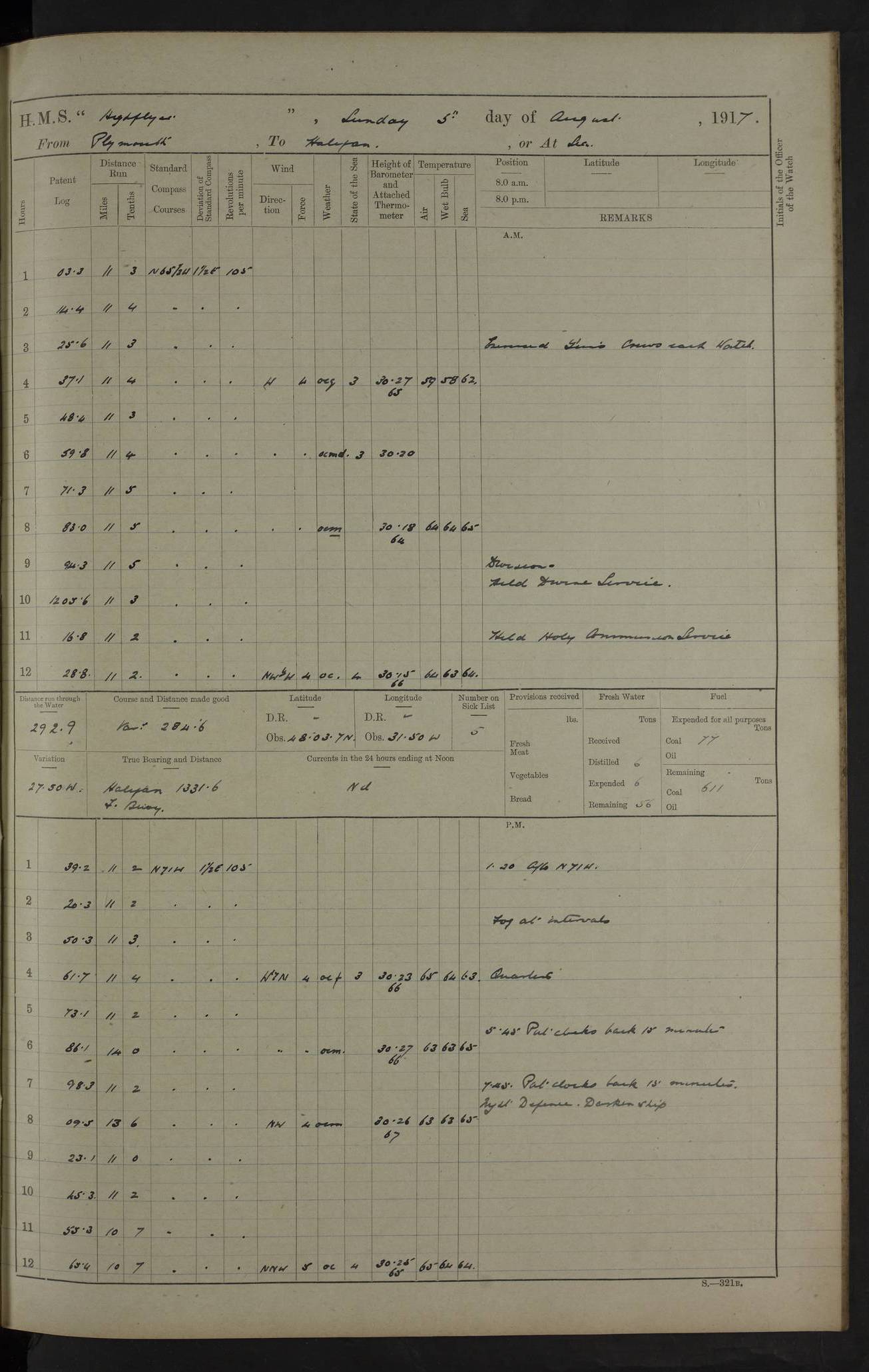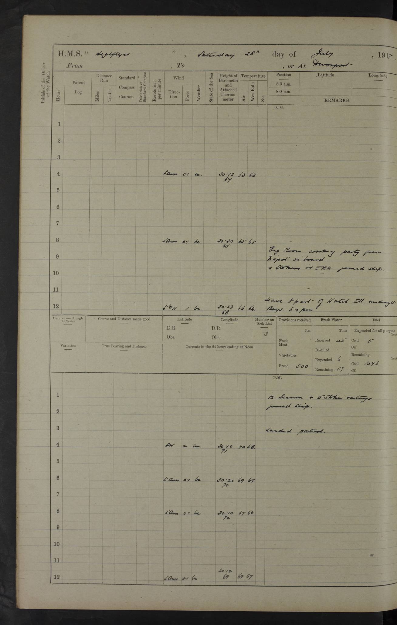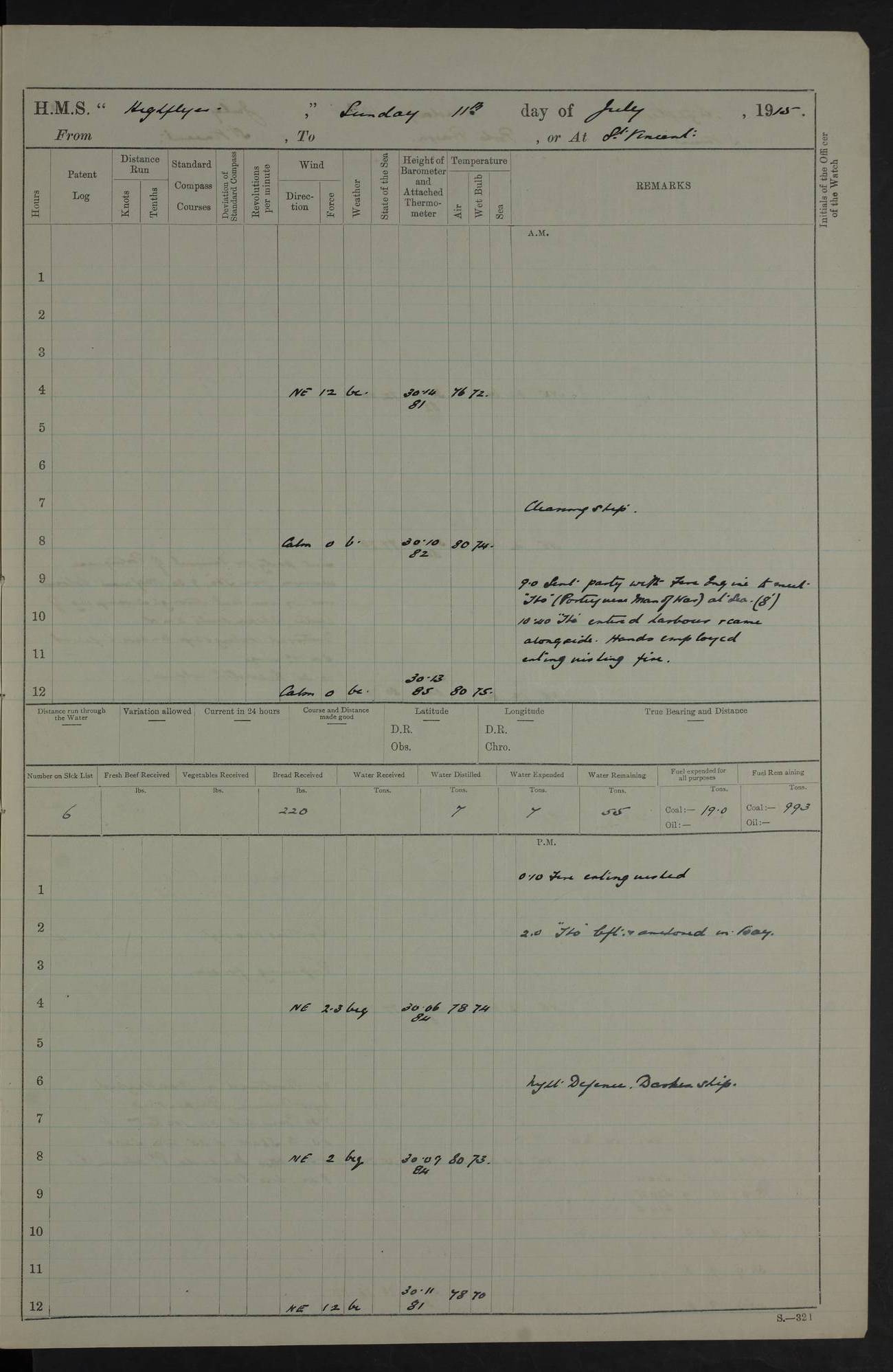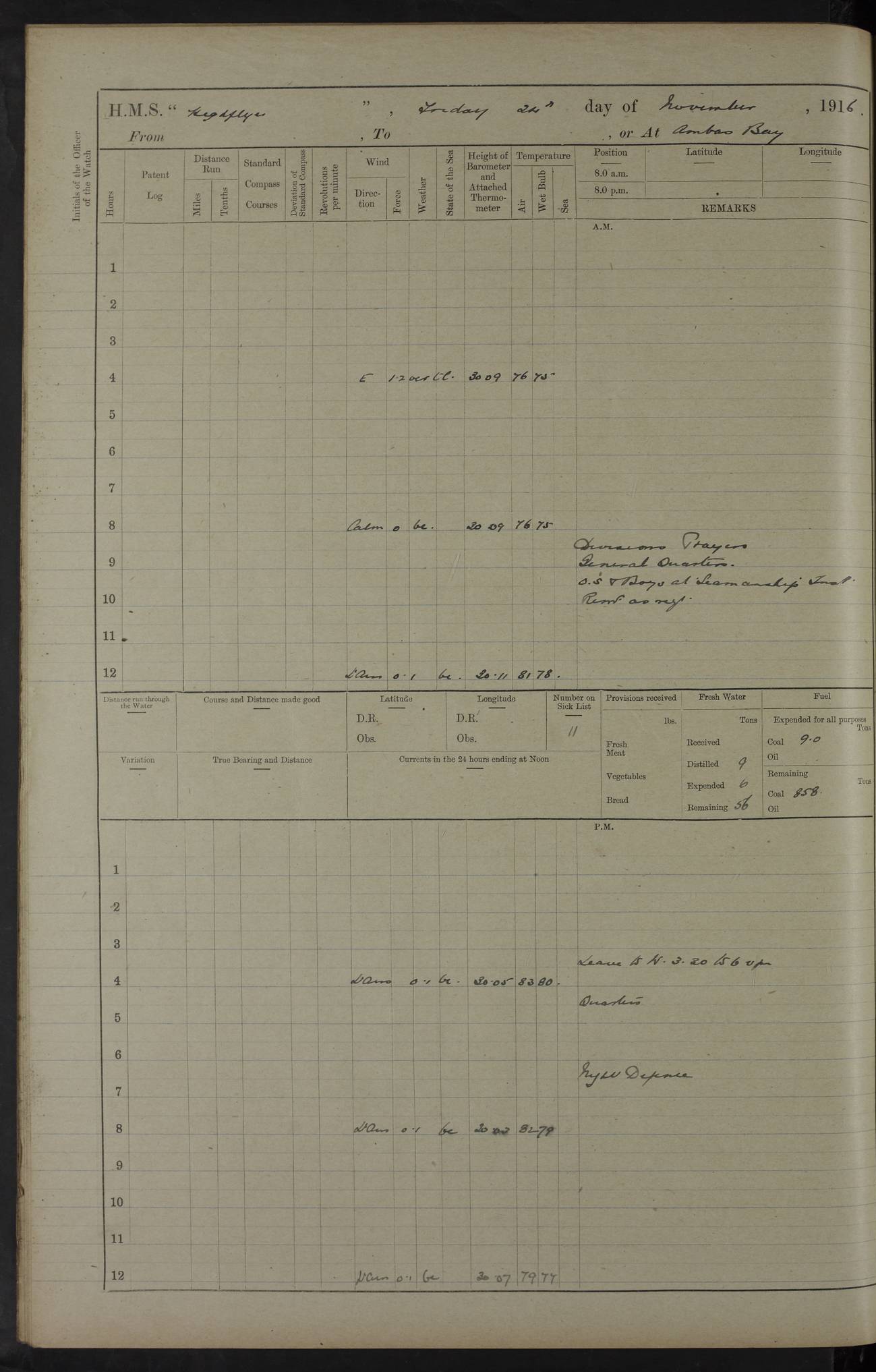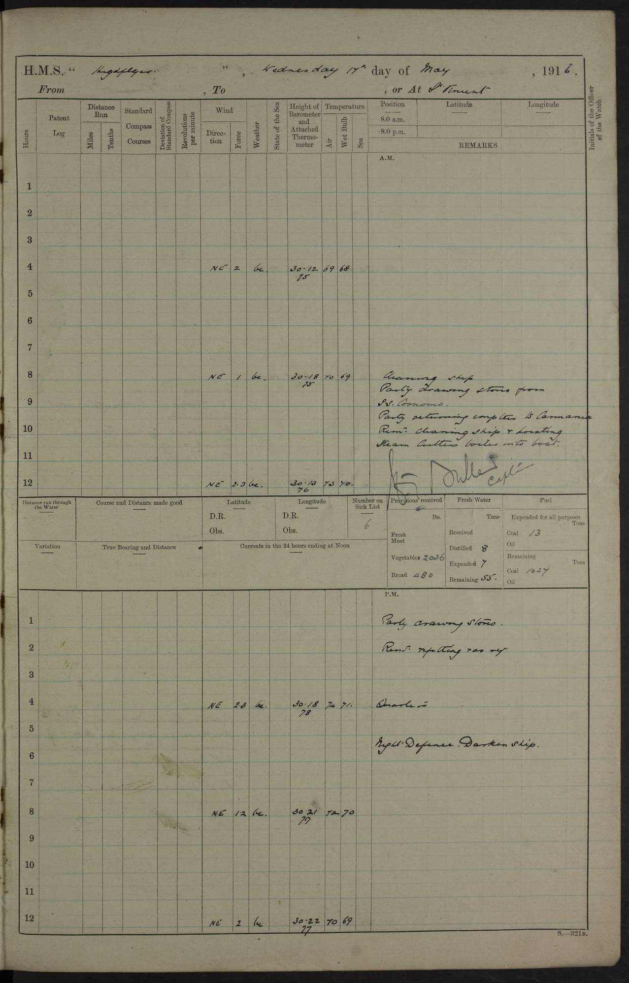 LOGS FOR JANUARY 1917 4ef4f321e53e0a0c91000902: (https://s3.amazonaws.com:443/oldweather/ADM53-44307/ADM 53-44307-129_1.jpg) 4ef4f321e53e0a0c91000903: (https://s3.amazonaws.com:443/oldweather/ADM53-44307/ADM 53-44307-130_0.jpg) 4ef4f321e53e0a0c91000904: (https://s3.amazonaws.com:443/oldweather/ADM53-44307/ADM 53-44307-130_1.jpg) 4ef4f321e53e0a0c91000905: (https://s3.amazonaws.com:443/oldweather/ADM53-44307/ADM 53-44307-131_0.jpg) 4ef4f321e53e0a0c91000906: (https://s3.amazonaws.com:443/oldweather/ADM53-44307/ADM 53-44307-131_1.jpg) 1 January 1917 Sierra Leone Lat 8.5, Long -13.2 6.30am: Party transferring provisions to DONEGAL. 10.00am: Party working on board SS VIRENT dismounting gun. 4ef4f321e53e0a0c91000907: (https://s3.amazonaws.com:443/oldweather/ADM53-44307/ADM 53-44307-132_0.jpg) 2 January 1917 Sierra Leone to St. Vincent Lat 8.7, Long -13.6 6.55am: SS ATLANTIC CITY came alongside. Coaling ship. 9.20am: Weighed and proceeded as requisite out of harbour. 4ef4f321e53e0a0c91000908: (https://s3.amazonaws.com:443/oldweather/ADM53-44307/ADM 53-44307-132_1.jpg) 3 January 1917 Sierra Leone to St. Vincent Lat 11.1, Long -17.7 2.30pm: Sighted SS on P bow steering to SE’d. 4ef4f321e53e0a0c91000909: (https://s3.amazonaws.com:443/oldweather/ADM53-44307/ADM 53-44307-133_0.jpg) 4 January 1917 Sierra Leone to St. Vincent Lat 13.8, Long -21.5 Boys and OS at school and seamanship instruction. Marines at drill. 11.30pm: Passing between St. Jago and Mayo Id. 4ef4f321e53e0a0c9100090a: (https://s3.amazonaws.com:443/oldweather/ADM53-44307/ADM 53-44307-133_1.jpg) 5 January 1917 Sierra Leone to St. Vincent Lat 16.8828, Long -25.0106 6.40am: Sighted San Nicholas Id. abeam. 11.58am: Came to SB 9 fathoms, 4½ shackles. 12.30pm: Lighters came alongside. 2.00pm: Coaling ship. 5.00pm: Stopped coaling for night. 4ef4f321e53e0a0c9100090b: (https://s3.amazonaws.com:443/oldweather/ADM53-44307/ADM 53-44307-134_0.jpg) 6 January 1917 St. Vincent Lat 16.8828, Long -25.0106 6.30am: Coaling ship from lighters. 12.30pm: Finished coaling; received 433 tons including deck cargo. 2.00pm: Prepared for sea. 4ef4f321e53e0a0c9100090c: (https://s3.amazonaws.com:443/oldweather/ADM53-44307/ADM 53-44307-134_1.jpg) 7 January 1917 St. Vincent to rendezvous to meet HMS Shannon and convoy Lat 17.4, Long -25.5 6.35am: Weighed and proceeded as requisite, 100 revs, to southward by San Antonio. 4ef4f321e53e0a0c9100090d: (https://s3.amazonaws.com:443/oldweather/ADM53-44307/ADM 53-44307-135_0.jpg) 8 January 1917 St. Vincent to meet HMS Shannon and convoy Lat 21.2, Long -26.3 9.30am: Party striking down coal. 4ef4f321e53e0a0c9100090e: (https://s3.amazonaws.com:443/oldweather/ADM53-44307/ADM 53-44307-135_1.jpg) 9 January 1917 St. Vincent to meet HMS Shannon and convoy Lat 23.9, Long -25.5 Cleaning ship. 9.00pm: Group closed up exercised during watch. 4ef4f322e53e0a0c9100090f: (https://s3.amazonaws.com:443/oldweather/ADM53-44307/ADM 53-44307-136_0.jpg) 10 January 1917 St. Vincent to meet HMS Shannon and convoy Lat 27.4, Long -25.1 2.00am: Groups closed up, exercised frequently during each watch. 6.30am: Sighted SS on southward beam steering NE’d. 4ef4f322e53e0a0c91000910: (https://s3.amazonaws.com:443/oldweather/ADM53-44307/ADM 53-44307-136_1.jpg) 11 January 1917 St. Vincent to meet HMS Shannon and convoy and to Sierra Leone Lat 29.7, Long -24.7 2.00am: Groups closed up, exercised frequently during each watch. 5.20am: Sighted SHANNON and convoy ahead – CARONIA, EMPRESS OF BRITAIN, WALMER CASTLE, TYNDAREUS, PAKEHA, NESTOR, CORINTHIC. 6.13am: Stopped. Communicated by boat with SHANNON. 6.25am: Course S17W. 115 rev. SHANNON proceeded NE’d., course as requisite to take up station with convoy. [A sketch is included showing the position of the ships. HIGHFLYER is in the middle of the front row with PAKEHA 10 cables to port and WALMER CASTLE 10 cables to starboard. NESTOR, then TYNDAREUS, follow PAKEHA. EMPRESS OF BRITAIN, then CARONIA, follow WALMER CASTLE. CORINTHIC is evenly spaced between TYNDAREUS and CARONIA.] 4ef4f322e53e0a0c91000911: (https://s3.amazonaws.com:443/oldweather/ADM53-44307/ADM 53-44307-137_0.jpg) 12 January 1917 To Sierra Leone with convoy Lat 23.9, Long -26.3 Guns’ crews closed up exercised frequently during day. Boys and OS to school and seamanship instruction. 4ef4f322e53e0a0c91000912: (https://s3.amazonaws.com:443/oldweather/ADM53-44307/ADM 53-44307-137_1.jpg) 13 January 1917 To Sierra Leone with convoy Lat 19.3, Long -28.0 3.57am: 80 rev. to allow TYNDAREUS to remedy engine defect. 4ef4f322e53e0a0c91000913: (https://s3.amazonaws.com:443/oldweather/ADM53-44307/ADM 53-44307-138_0.jpg) 14 January 1917 To Sierra Leone with convoy Lat 14.7, Long -26.9 9.00am: Mustered by Open List. 10.00am: Held Divine Service. 4ef4f322e53e0a0c91000914: (https://s3.amazonaws.com:443/oldweather/ADM53-44307/ADM 53-44307-138_1.jpg) 15 January 1917 To Sierra Leone with convoy Lat 12.3, Long -23.7 Party in stokehold trimming. 4ef4f322e53e0a0c91000915: (https://s3.amazonaws.com:443/oldweather/ADM53-44307/ADM 53-44307-139_0.jpg) 16 January 1917 To Sierra Leone with convoy Lat 10.4, Long -18.1 1.00pm: Hoisted colours half-mast. (Death on board EMPRESS OF BRITAIN.) 4ef4f322e53e0a0c91000916: (https://s3.amazonaws.com:443/oldweather/ADM53-44307/ADM 53-44307-139_1.jpg) 17 January 1917 To Sierra Leone with convoy Lat 8.5, Long -13.2 9.15am: Observed land ahead. Prepared for coaling. 10.40am: Formed single line ahead. 12.30pm: Transports proceeded independently to anchoring berths. 1.12pm: Came to with PB anchor in 10 fathoms, veered to 4 shackles, A3 berth. 5.30pm: SS MANSFIELD came alongside. 4ef4f322e53e0a0c91000917: (https://s3.amazonaws.com:443/oldweather/ADM53-44307/ADM 53-44307-140_0.jpg) 18 January 1917 Sierra Leone Lat 8.5, Long -13.2 6.00am: Commenced coaling. 2.15pm: Finished coaling; received 840 tons. 4ef4f322e53e0a0c91000918: (https://s3.amazonaws.com:443/oldweather/ADM53-44307/ADM 53-44307-140_1.jpg) 19 January 1917 Sierra Leone Lat 8.5, 