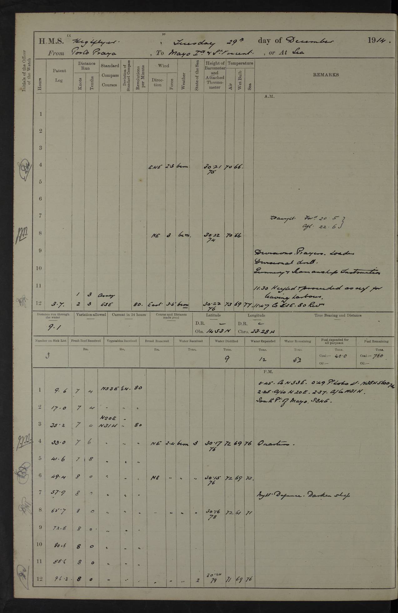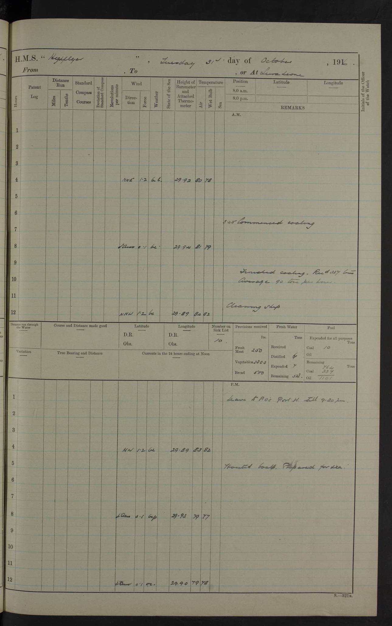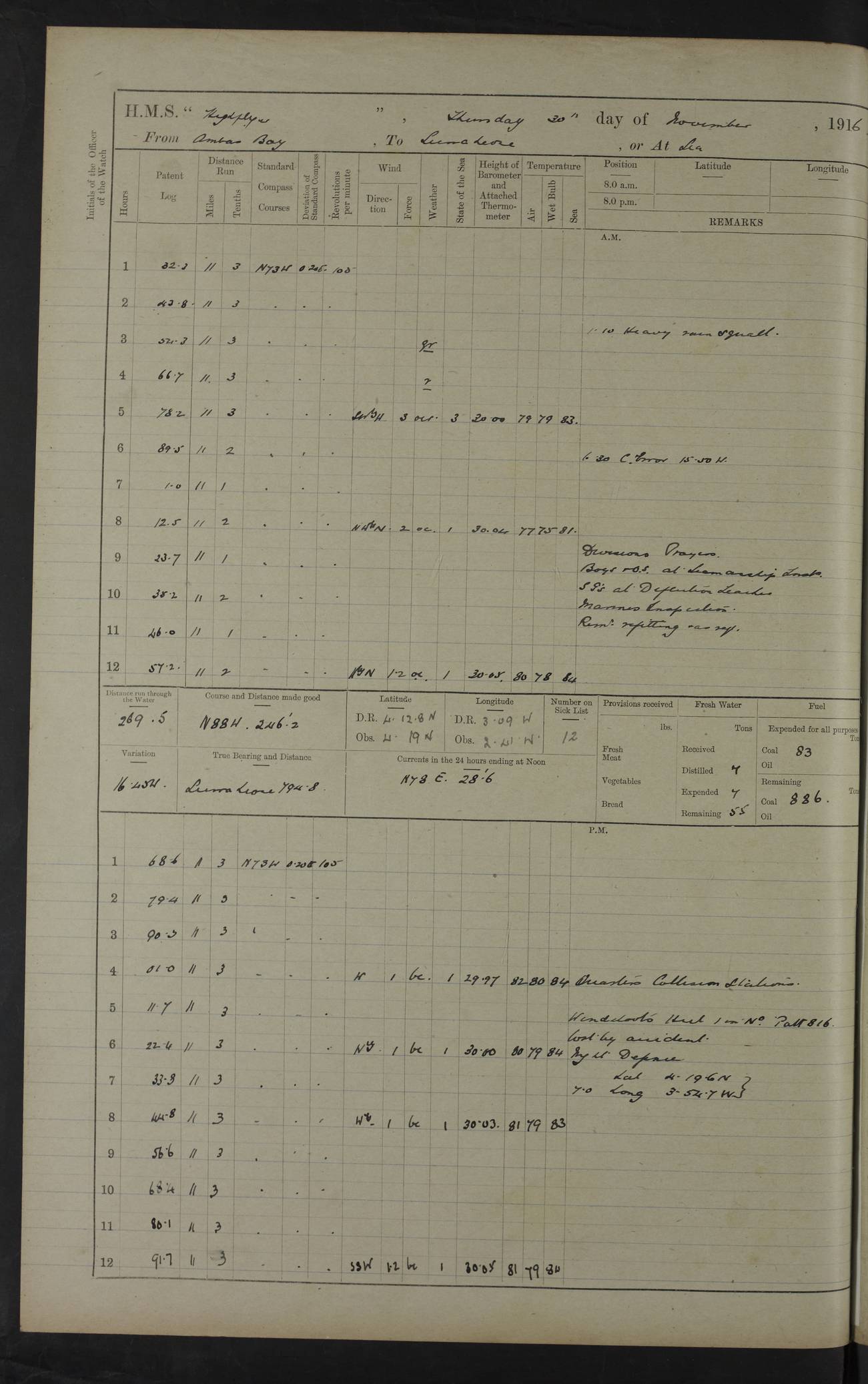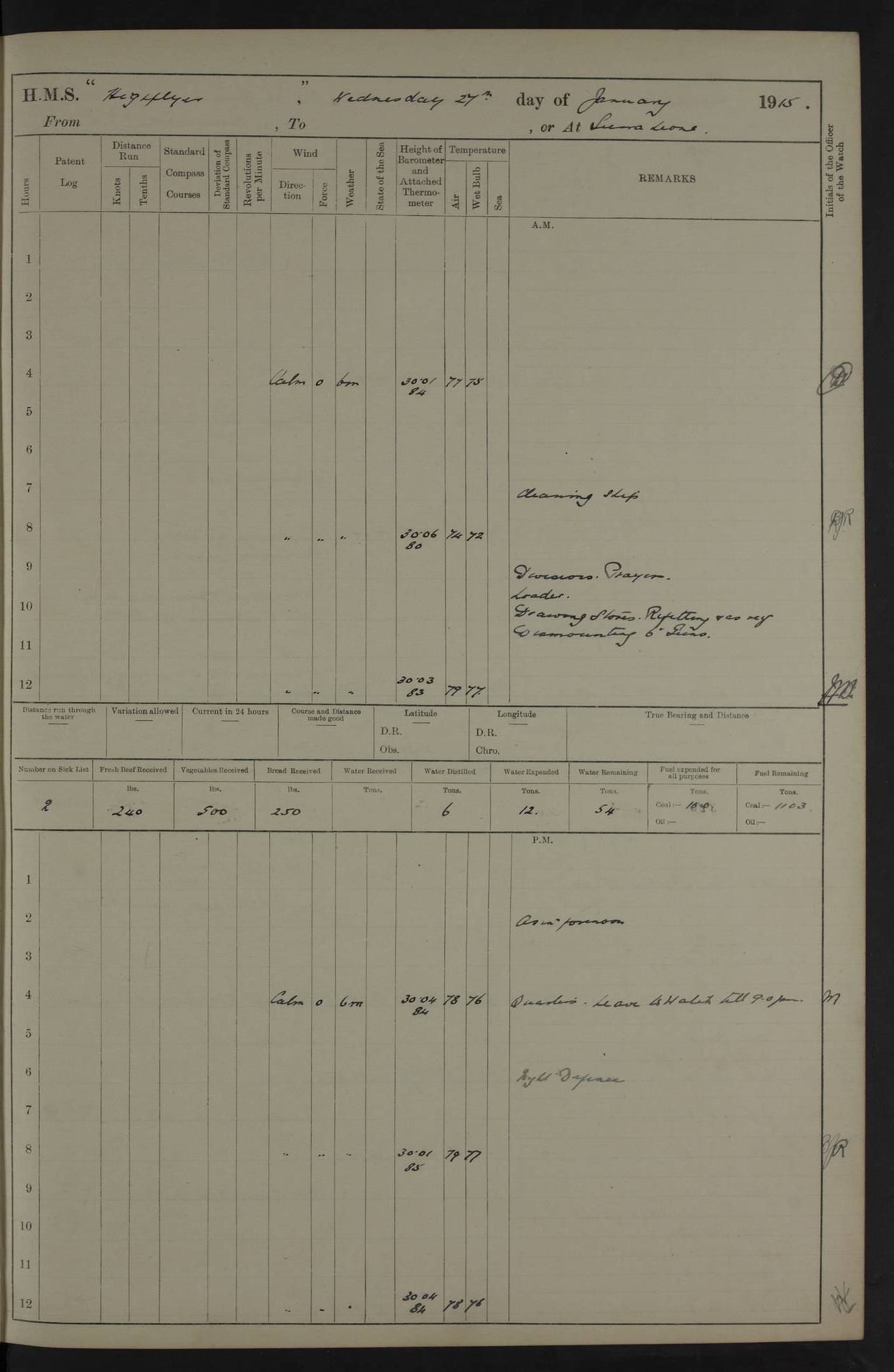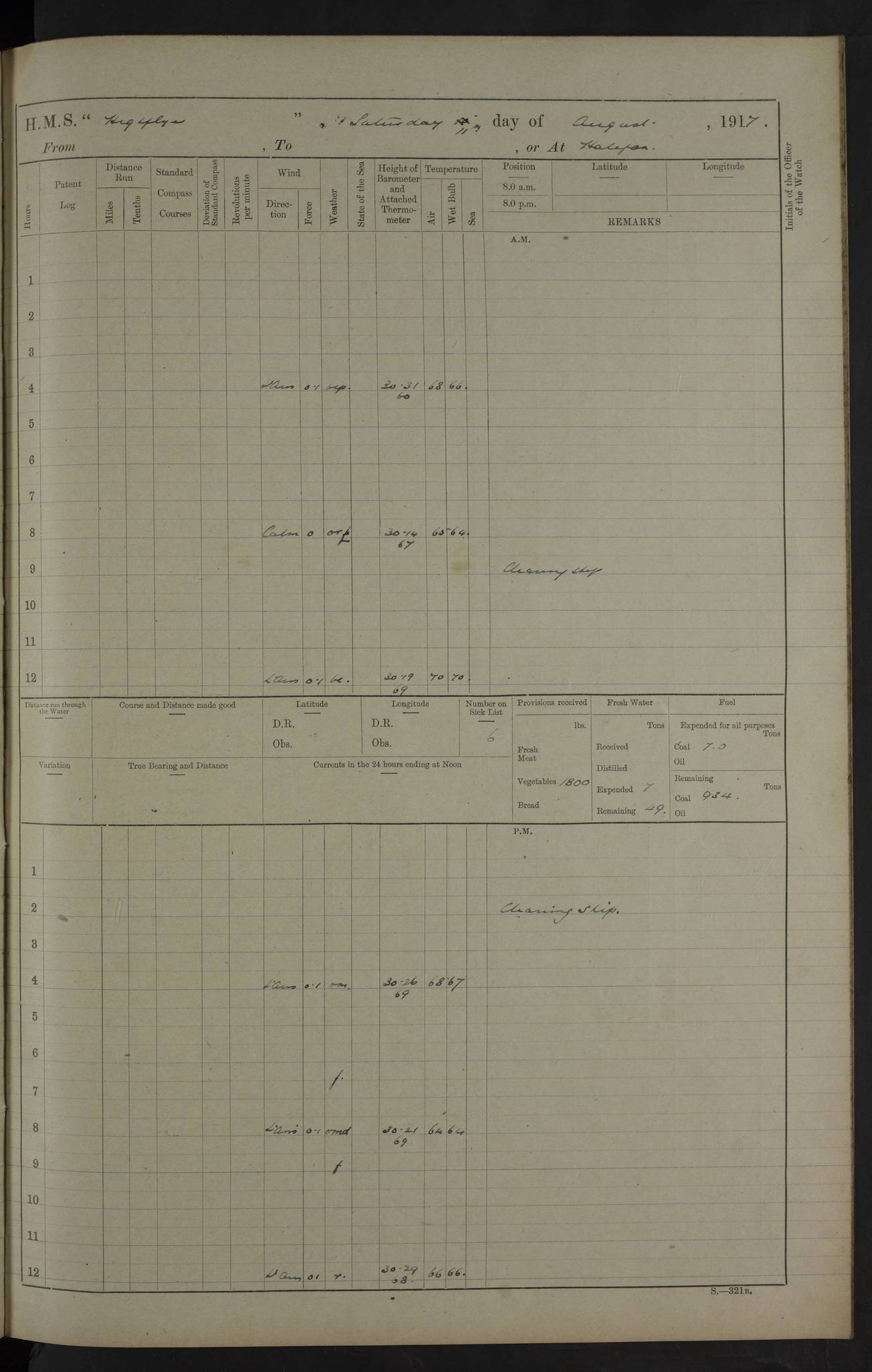 LOGS FOR JANUARY 1917 4ef4f321e53e0a0c91000902: (https://s3.amazonaws.com:443/oldweather/ADM53-44307/ADM 53-44307-129_1.jpg) 4ef4f321e53e0a0c91000903: (https://s3.amazonaws.com:443/oldweather/ADM53-44307/ADM 53-44307-130_0.jpg) 4ef4f321e53e0a0c91000904: (https://s3.amazonaws.com:443/oldweather/ADM53-44307/ADM 53-44307-130_1.jpg) 4ef4f321e53e0a0c91000905: (https://s3.amazonaws.com:443/oldweather/ADM53-44307/ADM 53-44307-131_0.jpg) 4ef4f321e53e0a0c91000906: (https://s3.amazonaws.com:443/oldweather/ADM53-44307/ADM 53-44307-131_1.jpg) 1 January 1917 Sierra Leone Lat 8.5, Long -13.2 6.30am: Party transferring provisions to DONEGAL. 10.00am: Party working on board SS VIRENT dismounting gun. 4ef4f321e53e0a0c91000907: (https://s3.amazonaws.com:443/oldweather/ADM53-44307/ADM 53-44307-132_0.jpg) 2 January 1917 Sierra Leone to St. Vincent Lat 8.7, Long -13.6 6.55am: SS ATLANTIC CITY came alongside. Coaling ship. 9.20am: Weighed and proceeded as requisite out of harbour. 4ef4f321e53e0a0c91000908: (https://s3.amazonaws.com:443/oldweather/ADM53-44307/ADM 53-44307-132_1.jpg) 3 January 1917 Sierra Leone to St. Vincent Lat 11.1, Long -17.7 2.30pm: Sighted SS on P bow steering to SE’d. 4ef4f321e53e0a0c91000909: (https://s3.amazonaws.com:443/oldweather/ADM53-44307/ADM 53-44307-133_0.jpg) 4 January 1917 Sierra Leone to St. Vincent Lat 13.8, Long -21.5 Boys and OS at school and seamanship instruction. Marines at drill. 11.30pm: Passing between St. Jago and Mayo Id. 4ef4f321e53e0a0c9100090a: (https://s3.amazonaws.com:443/oldweather/ADM53-44307/ADM 53-44307-133_1.jpg) 5 January 1917 Sierra Leone to St. Vincent Lat 16.8828, Long -25.0106 6.40am: Sighted San Nicholas Id. abeam. 11.58am: Came to SB 9 fathoms, 4½ shackles. 12.30pm: Lighters came alongside. 2.00pm: Coaling ship. 5.00pm: Stopped coaling for night. 4ef4f321e53e0a0c9100090b: (https://s3.amazonaws.com:443/oldweather/ADM53-44307/ADM 53-44307-134_0.jpg) 6 January 1917 St. Vincent Lat 16.8828, Long -25.0106 6.30am: Coaling ship from lighters. 12.30pm: Finished coaling; received 433 tons including deck cargo. 2.00pm: Prepared for sea. 4ef4f321e53e0a0c9100090c: (https://s3.amazonaws.com:443/oldweather/ADM53-44307/ADM 53-44307-134_1.jpg) 7 January 1917 St. Vincent to rendezvous to meet HMS Shannon and convoy Lat 17.4, Long -25.5 6.35am: Weighed and proceeded as requisite, 100 revs, to southward by San Antonio. 4ef4f321e53e0a0c9100090d: (https://s3.amazonaws.com:443/oldweather/ADM53-44307/ADM 53-44307-135_0.jpg) 8 January 1917 St. Vincent to meet HMS Shannon and convoy Lat 21.2, Long -26.3 9.30am: Party striking down coal. 4ef4f321e53e0a0c9100090e: (https://s3.amazonaws.com:443/oldweather/ADM53-44307/ADM 53-44307-135_1.jpg) 9 January 1917 St. Vincent to meet HMS Shannon and convoy Lat 23.9, Long -25.5 Cleaning ship. 9.00pm: Group closed up exercised during watch. 4ef4f322e53e0a0c9100090f: (https://s3.amazonaws.com:443/oldweather/ADM53-44307/ADM 53-44307-136_0.jpg) 10 January 1917 St. Vincent to meet HMS Shannon and convoy Lat 27.4, Long -25.1 2.00am: Groups closed up, exercised frequently during each watch. 6.30am: Sighted SS on southward beam steering NE’d. 4ef4f322e53e0a0c91000910: (https://s3.amazonaws.com:443/oldweather/ADM53-44307/ADM 53-44307-136_1.jpg) 11 January 1917 St. Vincent to meet HMS Shannon and convoy and to Sierra Leone Lat 29.7, Long -24.7 2.00am: Groups closed up, exercised frequently during each watch. 5.20am: Sighted SHANNON and convoy ahead – CARONIA, EMPRESS OF BRITAIN, WALMER CASTLE, TYNDAREUS, PAKEHA, NESTOR, CORINTHIC. 6.13am: Stopped. Communicated by boat with SHANNON. 6.25am: Course S17W. 115 rev. SHANNON proceeded NE’d., course as requisite to take up station with convoy. [A sketch is included showing the position of the ships. HIGHFLYER is in the middle of the front row with PAKEHA 10 cables to port and WALMER CASTLE 10 cables to starboard. NESTOR, then TYNDAREUS, follow PAKEHA. EMPRESS OF BRITAIN, then CARONIA, follow WALMER CASTLE. CORINTHIC is evenly spaced between TYNDAREUS and CARONIA.] 4ef4f322e53e0a0c91000911: (https://s3.amazonaws.com:443/oldweather/ADM53-44307/ADM 53-44307-137_0.jpg) 12 January 1917 To Sierra Leone with convoy Lat 23.9, Long -26.3 Guns’ crews closed up exercised frequently during day. Boys and OS to school and seamanship instruction. 4ef4f322e53e0a0c91000912: (https://s3.amazonaws.com:443/oldweather/ADM53-44307/ADM 53-44307-137_1.jpg) 13 January 1917 To Sierra Leone with convoy Lat 19.3, Long -28.0 3.57am: 80 rev. to allow TYNDAREUS to remedy engine defect. 4ef4f322e53e0a0c91000913: (https://s3.amazonaws.com:443/oldweather/ADM53-44307/ADM 53-44307-138_0.jpg) 14 January 1917 To Sierra Leone with convoy Lat 14.7, Long -26.9 9.00am: Mustered by Open List. 10.00am: Held Divine Service. 4ef4f322e53e0a0c91000914: (https://s3.amazonaws.com:443/oldweather/ADM53-44307/ADM 53-44307-138_1.jpg) 15 January 1917 To Sierra Leone with convoy Lat 12.3, Long -23.7 Party in stokehold trimming. 4ef4f322e53e0a0c91000915: (https://s3.amazonaws.com:443/oldweather/ADM53-44307/ADM 53-44307-139_0.jpg) 16 January 1917 To Sierra Leone with convoy Lat 10.4, Long -18.1 1.00pm: Hoisted colours half-mast. (Death on board EMPRESS OF BRITAIN.) 4ef4f322e53e0a0c91000916: (https://s3.amazonaws.com:443/oldweather/ADM53-44307/ADM 53-44307-139_1.jpg) 17 January 1917 To Sierra Leone with convoy Lat 8.5, Long -13.2 9.15am: Observed land ahead. Prepared for coaling. 10.40am: Formed single line ahead. 12.30pm: Transports proceeded independently to anchoring berths. 1.12pm: Came to with PB anchor in 10 fathoms, veered to 4 shackles, A3 berth. 5.30pm: SS MANSFIELD came alongside. 4ef4f322e53e0a0c91000917: (https://s3.amazonaws.com:443/oldweather/ADM53-44307/ADM 53-44307-140_0.jpg) 18 January 1917 Sierra Leone Lat 8.5, Long -13.2 6.00am: Commenced coaling. 2.15pm: Finished coaling; received 840 tons. 4ef4f322e53e0a0c91000918: (https://s3.amazonaws.com:443/oldweather/ADM53-44307/ADM 53-44307-140_1.jpg) 19 January 1917 Sierra Leone Lat 8.5, 