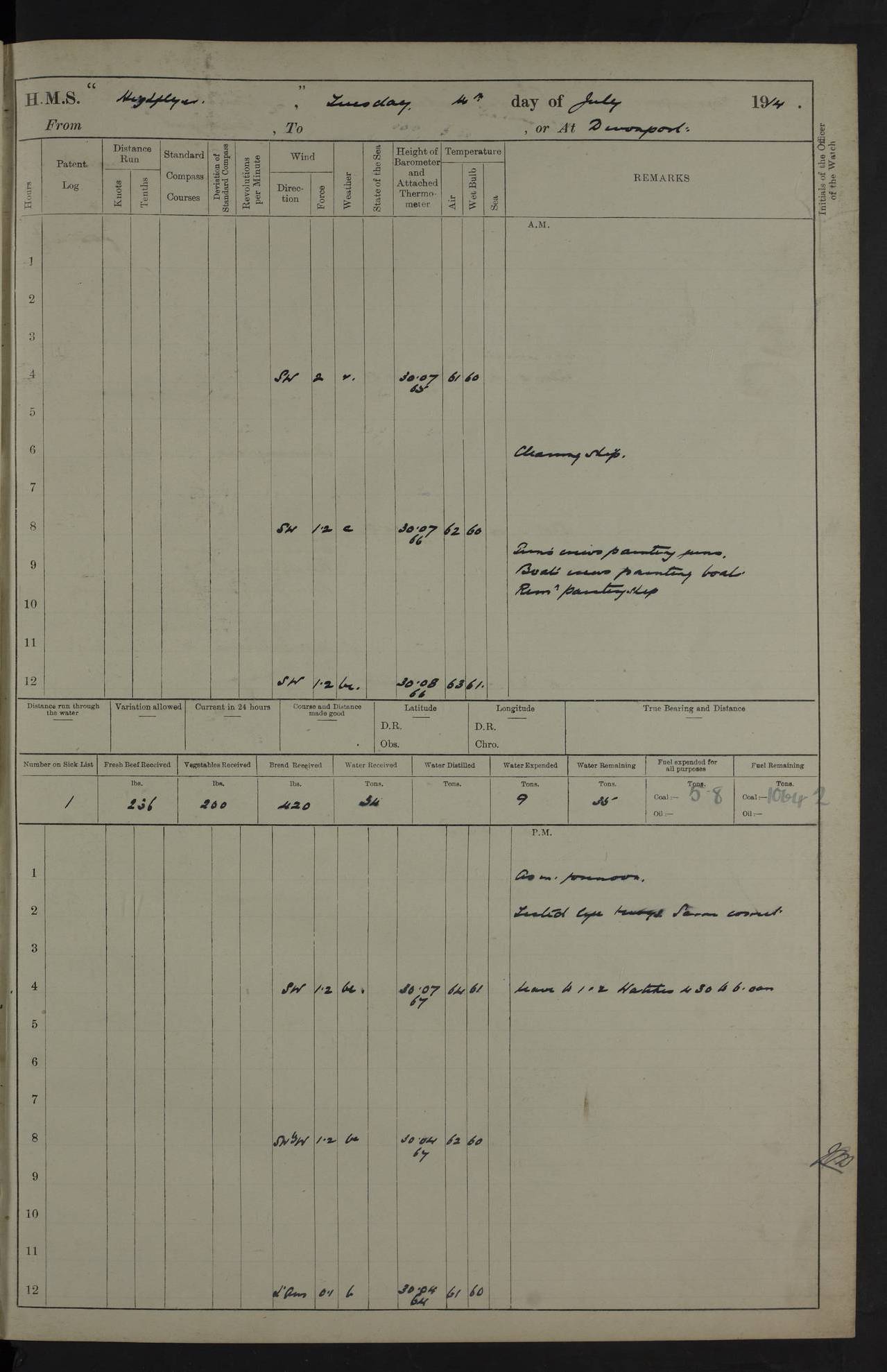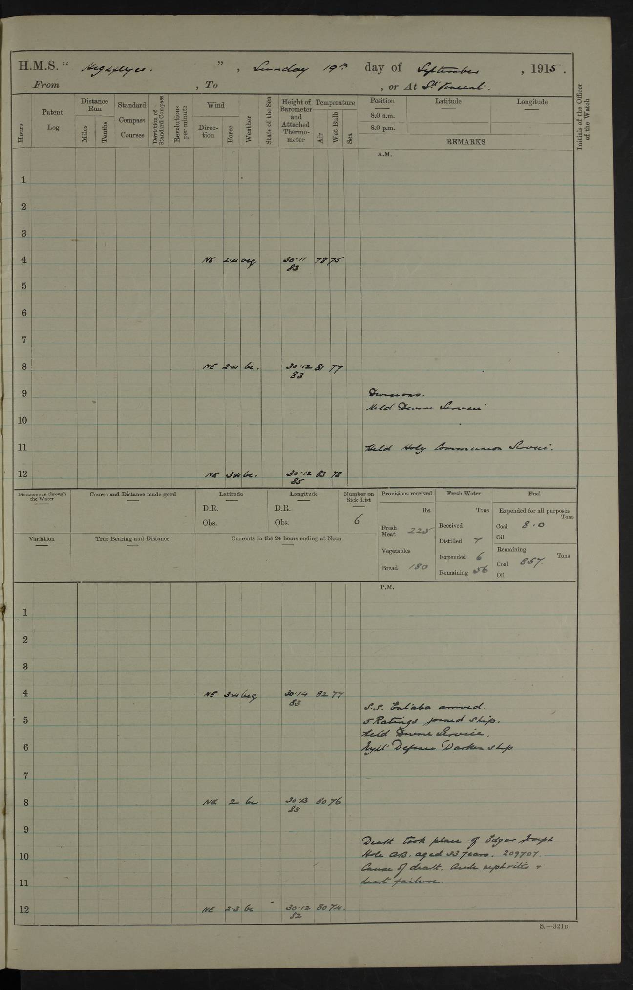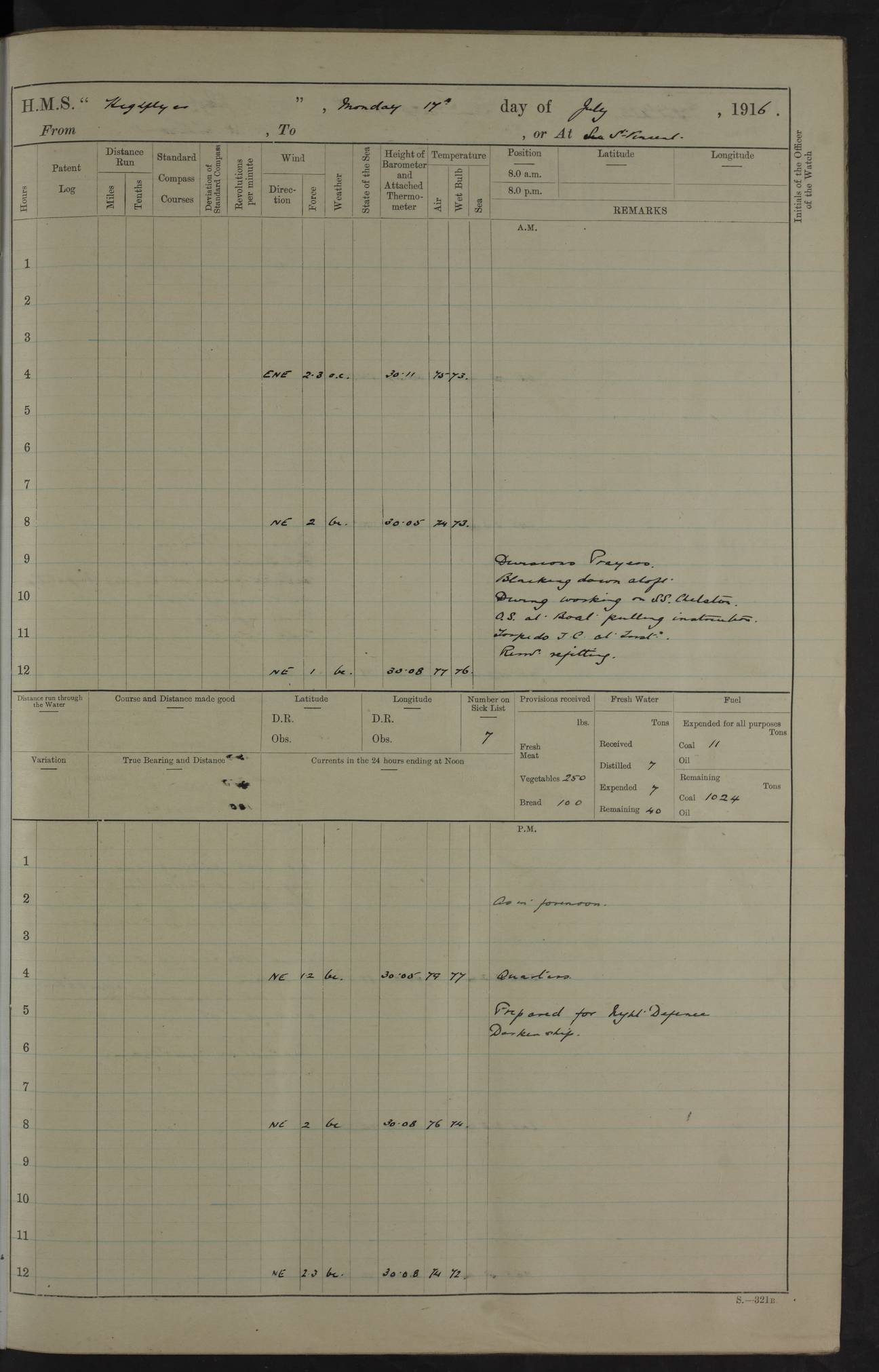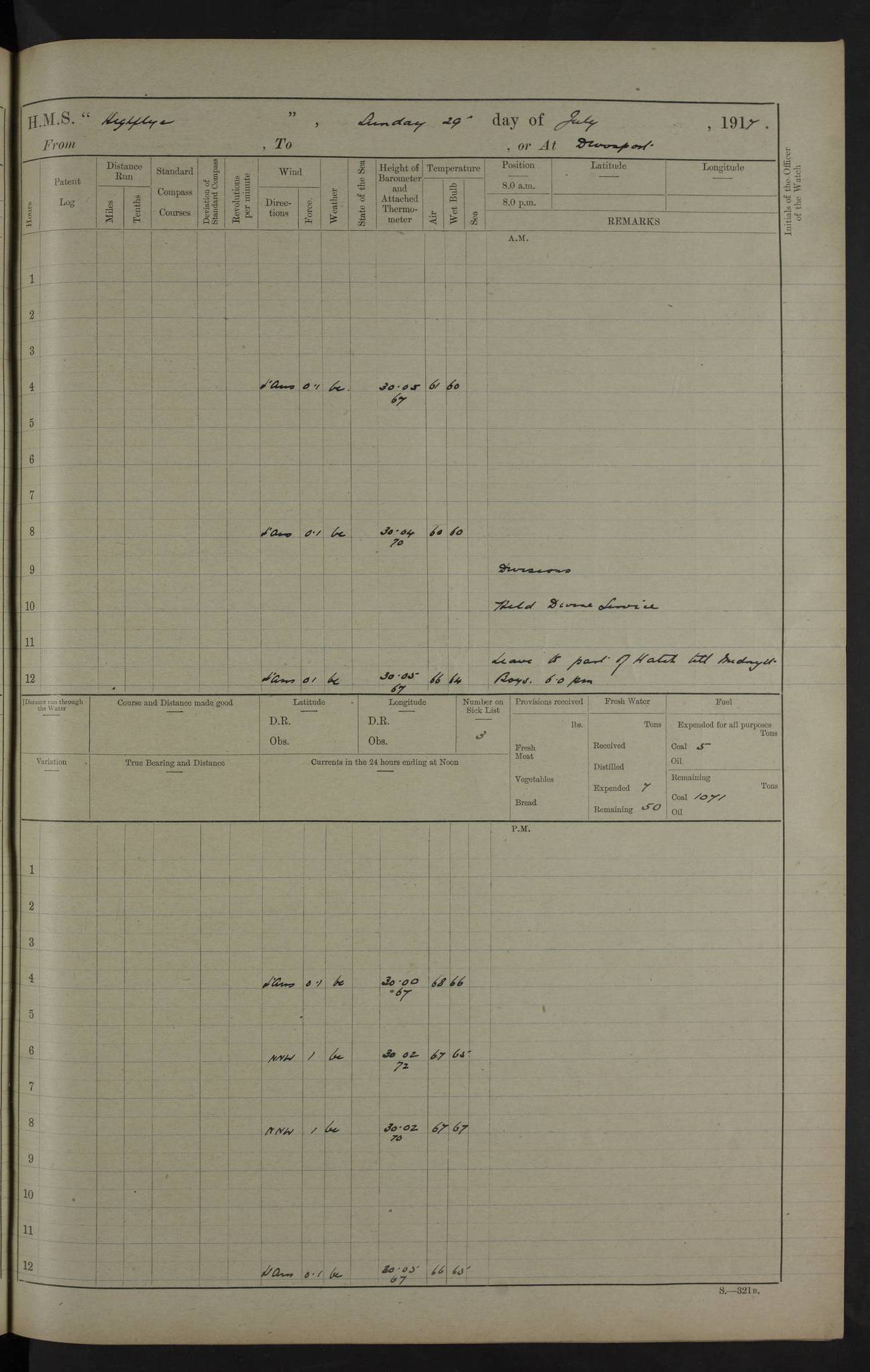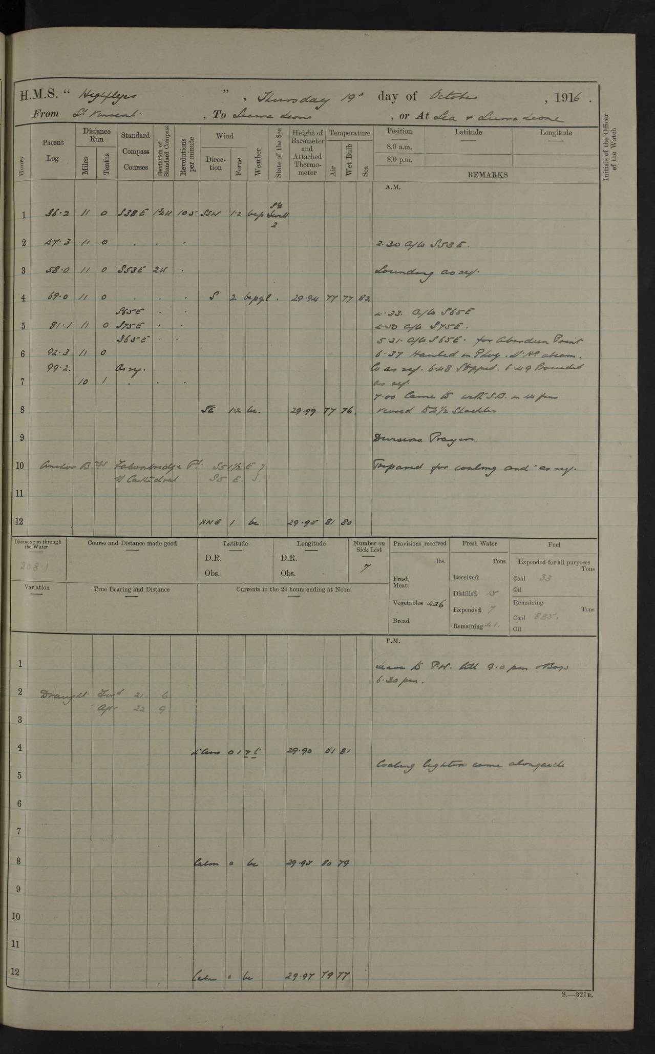 LOGS FOR JANUARY 1917 4ef4f321e53e0a0c91000902: (https://s3.amazonaws.com:443/oldweather/ADM53-44307/ADM 53-44307-129_1.jpg) 4ef4f321e53e0a0c91000903: (https://s3.amazonaws.com:443/oldweather/ADM53-44307/ADM 53-44307-130_0.jpg) 4ef4f321e53e0a0c91000904: (https://s3.amazonaws.com:443/oldweather/ADM53-44307/ADM 53-44307-130_1.jpg) 4ef4f321e53e0a0c91000905: (https://s3.amazonaws.com:443/oldweather/ADM53-44307/ADM 53-44307-131_0.jpg) 4ef4f321e53e0a0c91000906: (https://s3.amazonaws.com:443/oldweather/ADM53-44307/ADM 53-44307-131_1.jpg) 1 January 1917 Sierra Leone Lat 8.5, Long -13.2 6.30am: Party transferring provisions to DONEGAL. 10.00am: Party working on board SS VIRENT dismounting gun. 4ef4f321e53e0a0c91000907: (https://s3.amazonaws.com:443/oldweather/ADM53-44307/ADM 53-44307-132_0.jpg) 2 January 1917 Sierra Leone to St. Vincent Lat 8.7, Long -13.6 6.55am: SS ATLANTIC CITY came alongside. Coaling ship. 9.20am: Weighed and proceeded as requisite out of harbour. 4ef4f321e53e0a0c91000908: (https://s3.amazonaws.com:443/oldweather/ADM53-44307/ADM 53-44307-132_1.jpg) 3 January 1917 Sierra Leone to St. Vincent Lat 11.1, Long -17.7 2.30pm: Sighted SS on P bow steering to SE’d. 4ef4f321e53e0a0c91000909: (https://s3.amazonaws.com:443/oldweather/ADM53-44307/ADM 53-44307-133_0.jpg) 4 January 1917 Sierra Leone to St. Vincent Lat 13.8, Long -21.5 Boys and OS at school and seamanship instruction. Marines at drill. 11.30pm: Passing between St. Jago and Mayo Id. 4ef4f321e53e0a0c9100090a: (https://s3.amazonaws.com:443/oldweather/ADM53-44307/ADM 53-44307-133_1.jpg) 5 January 1917 Sierra Leone to St. Vincent Lat 16.8828, Long -25.0106 6.40am: Sighted San Nicholas Id. abeam. 11.58am: Came to SB 9 fathoms, 4½ shackles. 12.30pm: Lighters came alongside. 2.00pm: Coaling ship. 5.00pm: Stopped coaling for night. 4ef4f321e53e0a0c9100090b: (https://s3.amazonaws.com:443/oldweather/ADM53-44307/ADM 53-44307-134_0.jpg) 6 January 1917 St. Vincent Lat 16.8828, Long -25.0106 6.30am: Coaling ship from lighters. 12.30pm: Finished coaling; received 433 tons including deck cargo. 2.00pm: Prepared for sea. 4ef4f321e53e0a0c9100090c: (https://s3.amazonaws.com:443/oldweather/ADM53-44307/ADM 53-44307-134_1.jpg) 7 January 1917 St. Vincent to rendezvous to meet HMS Shannon and convoy Lat 17.4, Long -25.5 6.35am: Weighed and proceeded as requisite, 100 revs, to southward by San Antonio. 4ef4f321e53e0a0c9100090d: (https://s3.amazonaws.com:443/oldweather/ADM53-44307/ADM 53-44307-135_0.jpg) 8 January 1917 St. Vincent to meet HMS Shannon and convoy Lat 21.2, Long -26.3 9.30am: Party striking down coal. 4ef4f321e53e0a0c9100090e: (https://s3.amazonaws.com:443/oldweather/ADM53-44307/ADM 53-44307-135_1.jpg) 9 January 1917 St. Vincent to meet HMS Shannon and convoy Lat 23.9, Long -25.5 Cleaning ship. 9.00pm: Group closed up exercised during watch. 4ef4f322e53e0a0c9100090f: (https://s3.amazonaws.com:443/oldweather/ADM53-44307/ADM 53-44307-136_0.jpg) 10 January 1917 St. Vincent to meet HMS Shannon and convoy Lat 27.4, Long -25.1 2.00am: Groups closed up, exercised frequently during each watch. 6.30am: Sighted SS on southward beam steering NE’d. 4ef4f322e53e0a0c91000910: (https://s3.amazonaws.com:443/oldweather/ADM53-44307/ADM 53-44307-136_1.jpg) 11 January 1917 St. Vincent to meet HMS Shannon and convoy and to Sierra Leone Lat 29.7, Long -24.7 2.00am: Groups closed up, exercised frequently during each watch. 5.20am: Sighted SHANNON and convoy ahead – CARONIA, EMPRESS OF BRITAIN, WALMER CASTLE, TYNDAREUS, PAKEHA, NESTOR, CORINTHIC. 6.13am: Stopped. Communicated by boat with SHANNON. 6.25am: Course S17W. 115 rev. SHANNON proceeded NE’d., course as requisite to take up station with convoy. [A sketch is included showing the position of the ships. HIGHFLYER is in the middle of the front row with PAKEHA 10 cables to port and WALMER CASTLE 10 cables to starboard. NESTOR, then TYNDAREUS, follow PAKEHA. EMPRESS OF BRITAIN, then CARONIA, follow WALMER CASTLE. CORINTHIC is evenly spaced between TYNDAREUS and CARONIA.] 4ef4f322e53e0a0c91000911: (https://s3.amazonaws.com:443/oldweather/ADM53-44307/ADM 53-44307-137_0.jpg) 12 January 1917 To Sierra Leone with convoy Lat 23.9, Long -26.3 Guns’ crews closed up exercised frequently during day. Boys and OS to school and seamanship instruction. 4ef4f322e53e0a0c91000912: (https://s3.amazonaws.com:443/oldweather/ADM53-44307/ADM 53-44307-137_1.jpg) 13 January 1917 To Sierra Leone with convoy Lat 19.3, Long -28.0 3.57am: 80 rev. to allow TYNDAREUS to remedy engine defect. 4ef4f322e53e0a0c91000913: (https://s3.amazonaws.com:443/oldweather/ADM53-44307/ADM 53-44307-138_0.jpg) 14 January 1917 To Sierra Leone with convoy Lat 14.7, Long -26.9 9.00am: Mustered by Open List. 10.00am: Held Divine Service. 4ef4f322e53e0a0c91000914: (https://s3.amazonaws.com:443/oldweather/ADM53-44307/ADM 53-44307-138_1.jpg) 15 January 1917 To Sierra Leone with convoy Lat 12.3, Long -23.7 Party in stokehold trimming. 4ef4f322e53e0a0c91000915: (https://s3.amazonaws.com:443/oldweather/ADM53-44307/ADM 53-44307-139_0.jpg) 16 January 1917 To Sierra Leone with convoy Lat 10.4, Long -18.1 1.00pm: Hoisted colours half-mast. (Death on board EMPRESS OF BRITAIN.) 4ef4f322e53e0a0c91000916: (https://s3.amazonaws.com:443/oldweather/ADM53-44307/ADM 53-44307-139_1.jpg) 17 January 1917 To Sierra Leone with convoy Lat 8.5, Long -13.2 9.15am: Observed land ahead. Prepared for coaling. 10.40am: Formed single line ahead. 12.30pm: Transports proceeded independently to anchoring berths. 1.12pm: Came to with PB anchor in 10 fathoms, veered to 4 shackles, A3 berth. 5.30pm: SS MANSFIELD came alongside. 4ef4f322e53e0a0c91000917: (https://s3.amazonaws.com:443/oldweather/ADM53-44307/ADM 53-44307-140_0.jpg) 18 January 1917 Sierra Leone Lat 8.5, Long -13.2 6.00am: Commenced coaling. 2.15pm: Finished coaling; received 840 tons. 4ef4f322e53e0a0c91000918: (https://s3.amazonaws.com:443/oldweather/ADM53-44307/ADM 53-44307-140_1.jpg) 19 January 1917 Sierra Leone Lat 8.5, 