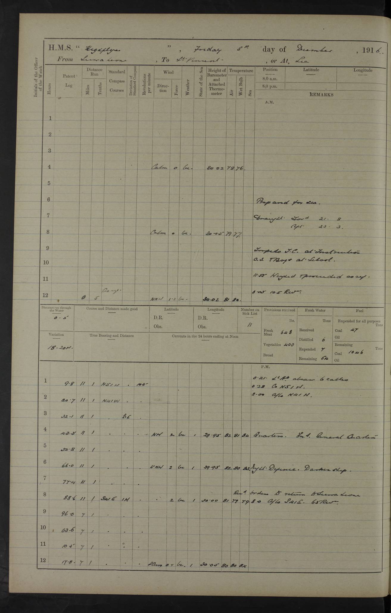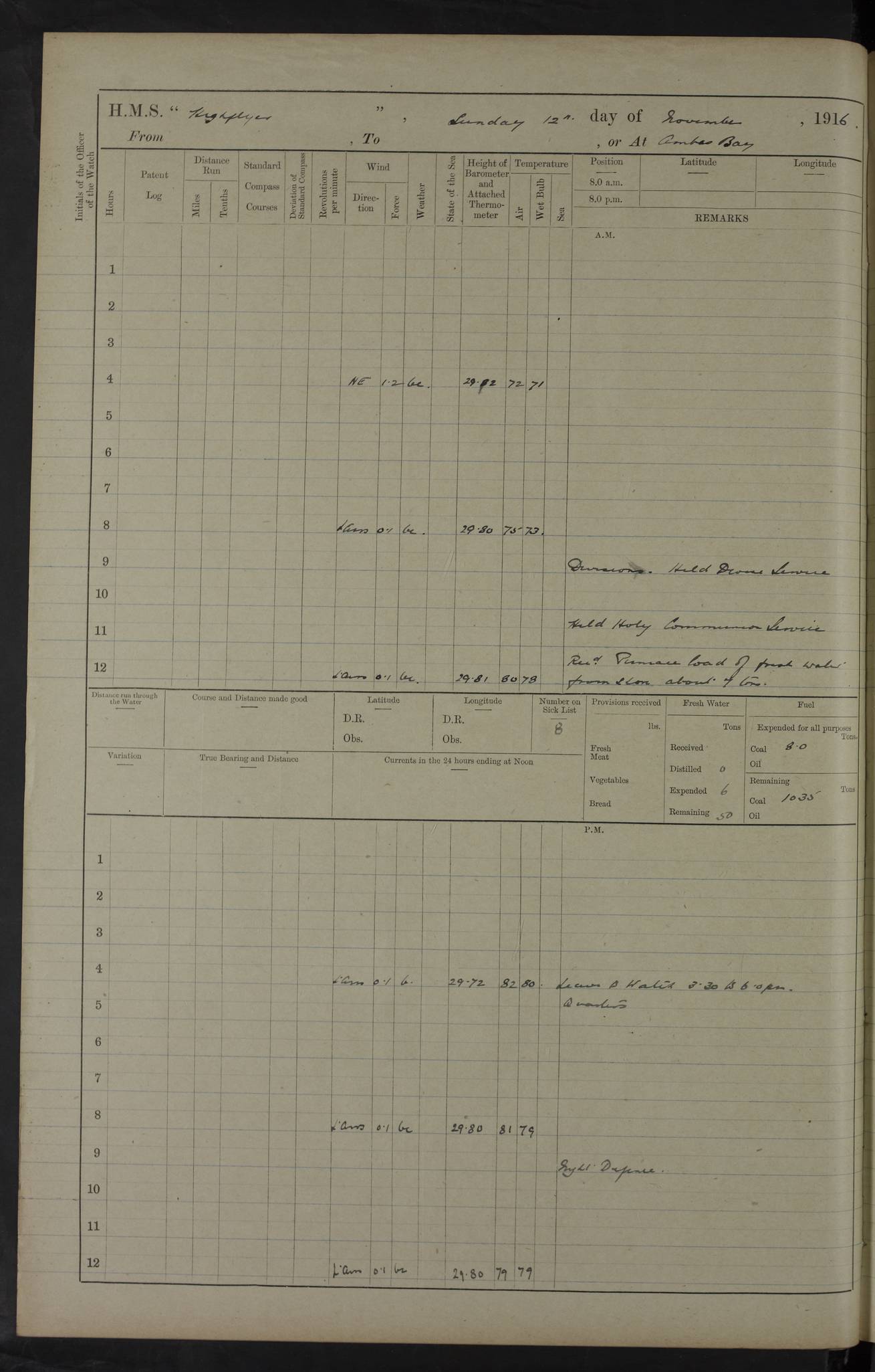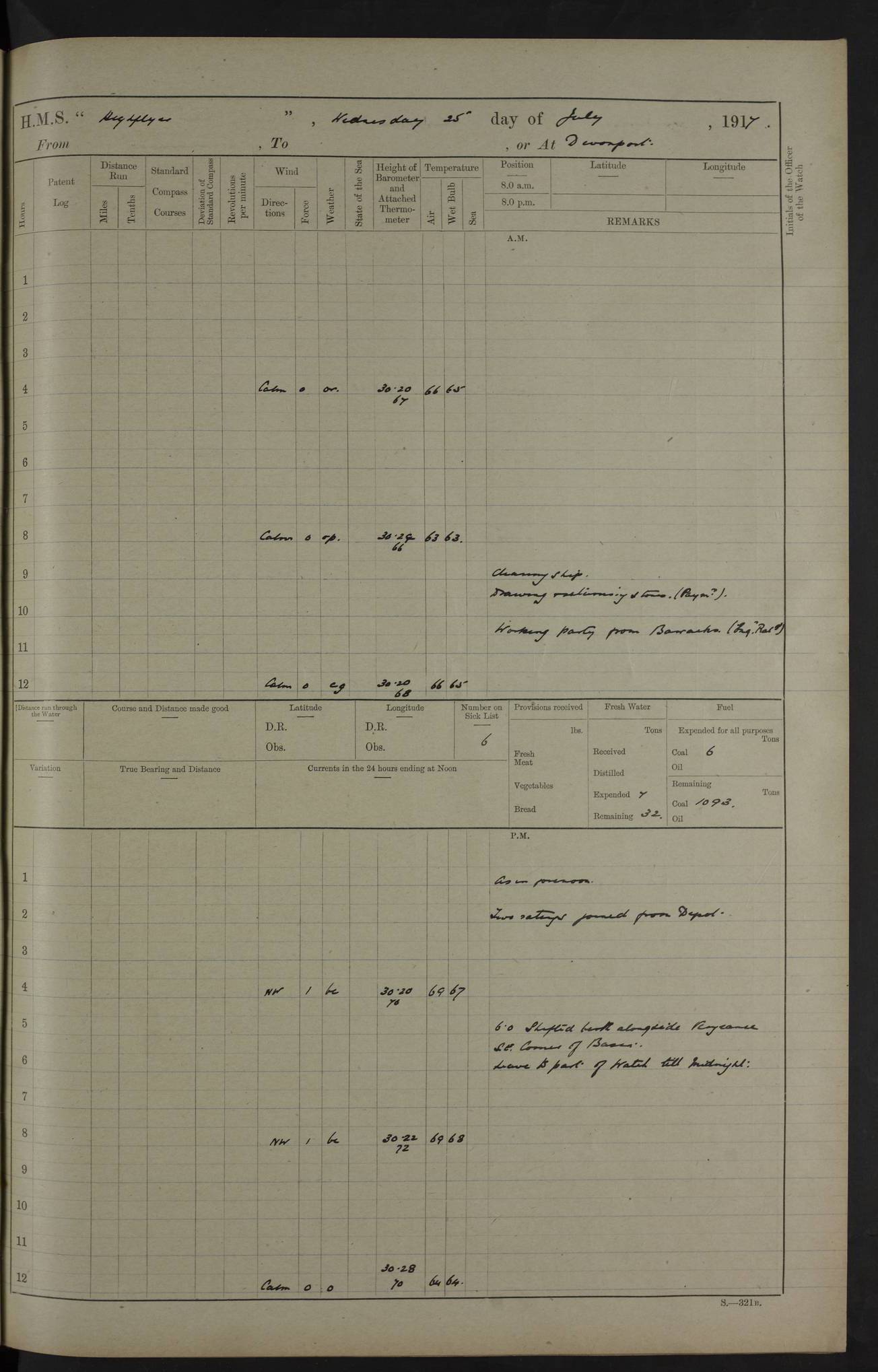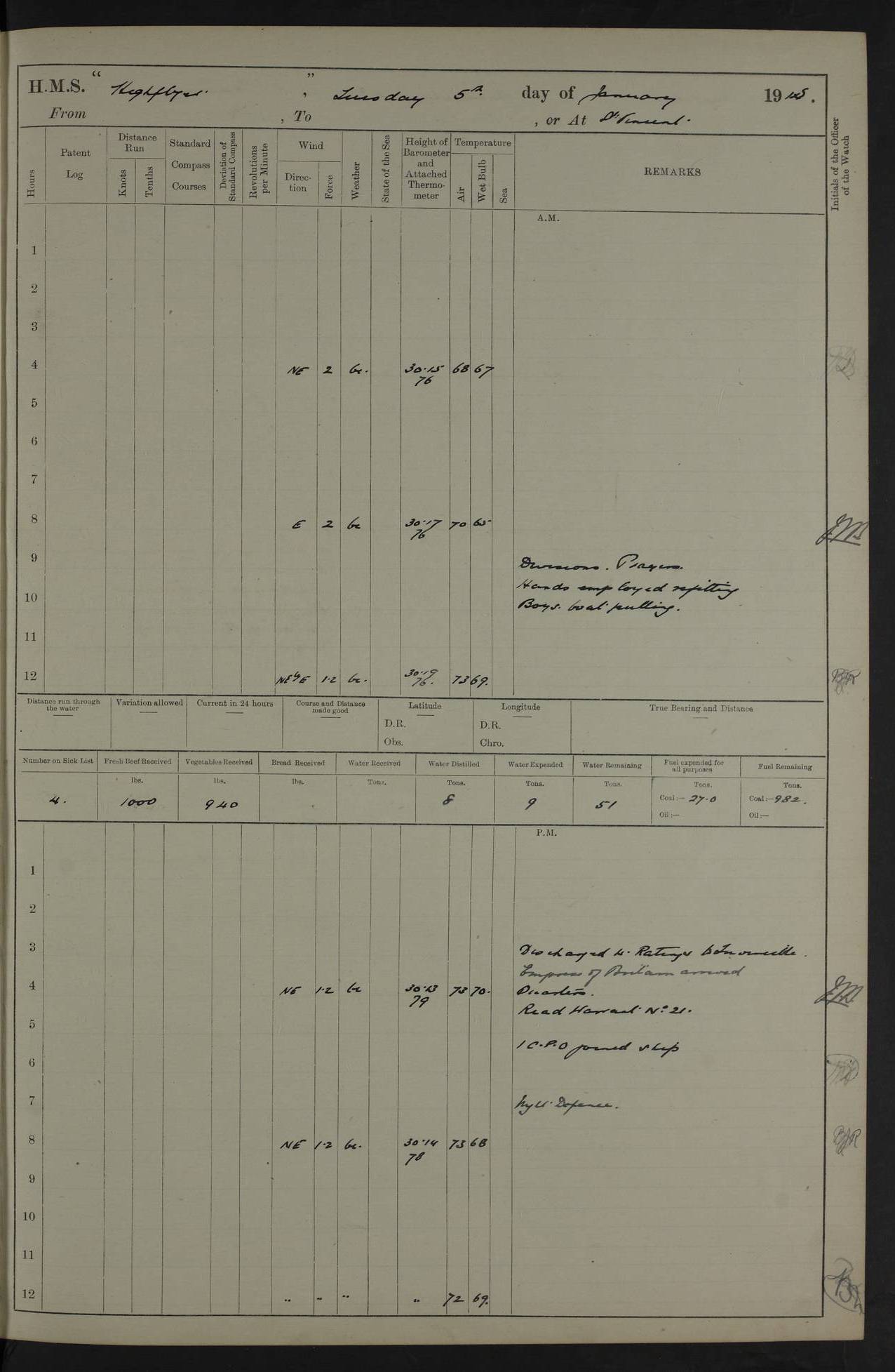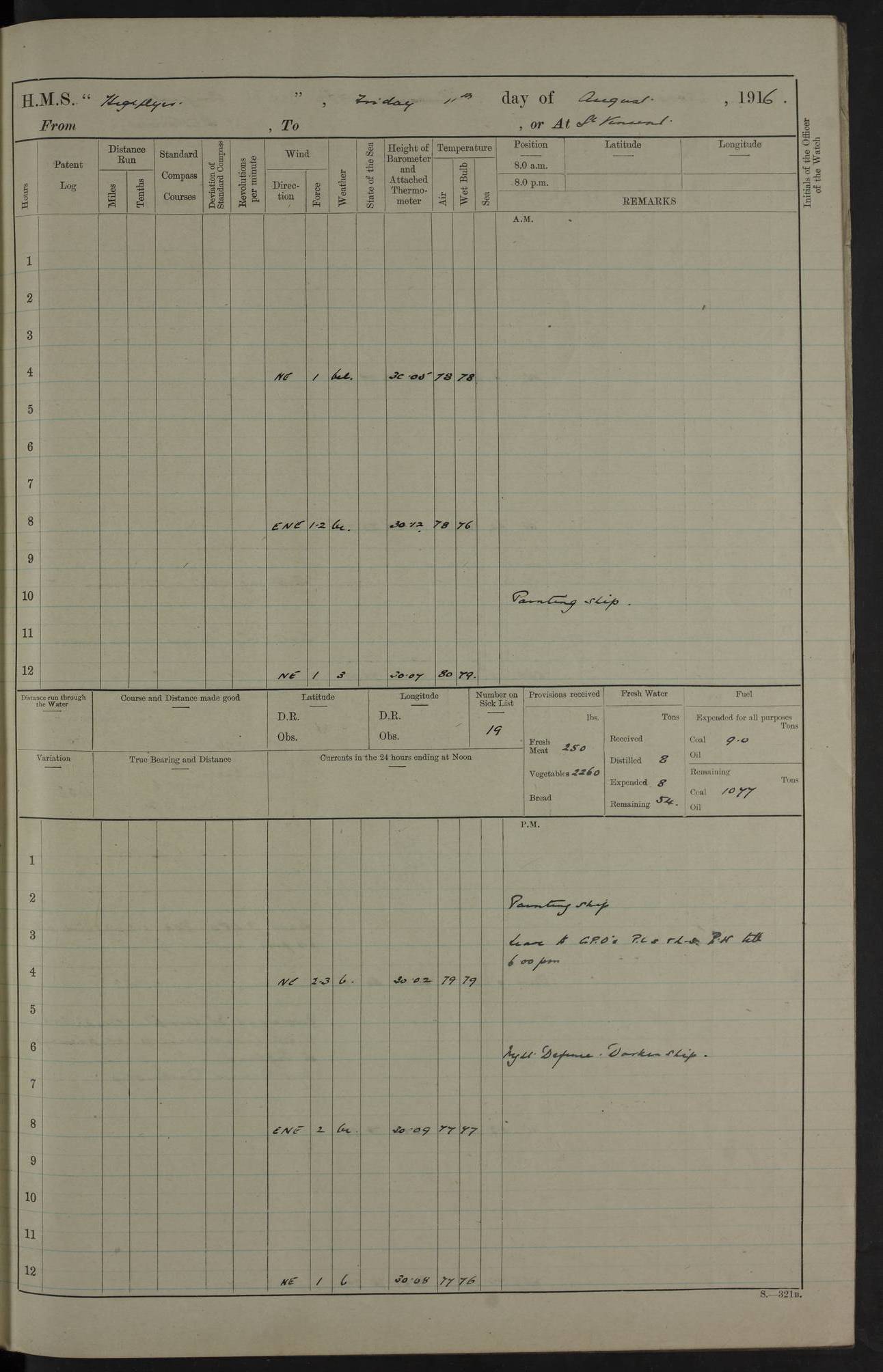 LOGS FOR JANUARY 1917 4ef4f321e53e0a0c91000902: (https://s3.amazonaws.com:443/oldweather/ADM53-44307/ADM 53-44307-129_1.jpg) 4ef4f321e53e0a0c91000903: (https://s3.amazonaws.com:443/oldweather/ADM53-44307/ADM 53-44307-130_0.jpg) 4ef4f321e53e0a0c91000904: (https://s3.amazonaws.com:443/oldweather/ADM53-44307/ADM 53-44307-130_1.jpg) 4ef4f321e53e0a0c91000905: (https://s3.amazonaws.com:443/oldweather/ADM53-44307/ADM 53-44307-131_0.jpg) 4ef4f321e53e0a0c91000906: (https://s3.amazonaws.com:443/oldweather/ADM53-44307/ADM 53-44307-131_1.jpg) 1 January 1917 Sierra Leone Lat 8.5, Long -13.2 6.30am: Party transferring provisions to DONEGAL. 10.00am: Party working on board SS VIRENT dismounting gun. 4ef4f321e53e0a0c91000907: (https://s3.amazonaws.com:443/oldweather/ADM53-44307/ADM 53-44307-132_0.jpg) 2 January 1917 Sierra Leone to St. Vincent Lat 8.7, Long -13.6 6.55am: SS ATLANTIC CITY came alongside. Coaling ship. 9.20am: Weighed and proceeded as requisite out of harbour. 4ef4f321e53e0a0c91000908: (https://s3.amazonaws.com:443/oldweather/ADM53-44307/ADM 53-44307-132_1.jpg) 3 January 1917 Sierra Leone to St. Vincent Lat 11.1, Long -17.7 2.30pm: Sighted SS on P bow steering to SE’d. 4ef4f321e53e0a0c91000909: (https://s3.amazonaws.com:443/oldweather/ADM53-44307/ADM 53-44307-133_0.jpg) 4 January 1917 Sierra Leone to St. Vincent Lat 13.8, Long -21.5 Boys and OS at school and seamanship instruction. Marines at drill. 11.30pm: Passing between St. Jago and Mayo Id. 4ef4f321e53e0a0c9100090a: (https://s3.amazonaws.com:443/oldweather/ADM53-44307/ADM 53-44307-133_1.jpg) 5 January 1917 Sierra Leone to St. Vincent Lat 16.8828, Long -25.0106 6.40am: Sighted San Nicholas Id. abeam. 11.58am: Came to SB 9 fathoms, 4½ shackles. 12.30pm: Lighters came alongside. 2.00pm: Coaling ship. 5.00pm: Stopped coaling for night. 4ef4f321e53e0a0c9100090b: (https://s3.amazonaws.com:443/oldweather/ADM53-44307/ADM 53-44307-134_0.jpg) 6 January 1917 St. Vincent Lat 16.8828, Long -25.0106 6.30am: Coaling ship from lighters. 12.30pm: Finished coaling; received 433 tons including deck cargo. 2.00pm: Prepared for sea. 4ef4f321e53e0a0c9100090c: (https://s3.amazonaws.com:443/oldweather/ADM53-44307/ADM 53-44307-134_1.jpg) 7 January 1917 St. Vincent to rendezvous to meet HMS Shannon and convoy Lat 17.4, Long -25.5 6.35am: Weighed and proceeded as requisite, 100 revs, to southward by San Antonio. 4ef4f321e53e0a0c9100090d: (https://s3.amazonaws.com:443/oldweather/ADM53-44307/ADM 53-44307-135_0.jpg) 8 January 1917 St. Vincent to meet HMS Shannon and convoy Lat 21.2, Long -26.3 9.30am: Party striking down coal. 4ef4f321e53e0a0c9100090e: (https://s3.amazonaws.com:443/oldweather/ADM53-44307/ADM 53-44307-135_1.jpg) 9 January 1917 St. Vincent to meet HMS Shannon and convoy Lat 23.9, Long -25.5 Cleaning ship. 9.00pm: Group closed up exercised during watch. 4ef4f322e53e0a0c9100090f: (https://s3.amazonaws.com:443/oldweather/ADM53-44307/ADM 53-44307-136_0.jpg) 10 January 1917 St. Vincent to meet HMS Shannon and convoy Lat 27.4, Long -25.1 2.00am: Groups closed up, exercised frequently during each watch. 6.30am: Sighted SS on southward beam steering NE’d. 4ef4f322e53e0a0c91000910: (https://s3.amazonaws.com:443/oldweather/ADM53-44307/ADM 53-44307-136_1.jpg) 11 January 1917 St. Vincent to meet HMS Shannon and convoy and to Sierra Leone Lat 29.7, Long -24.7 2.00am: Groups closed up, exercised frequently during each watch. 5.20am: Sighted SHANNON and convoy ahead – CARONIA, EMPRESS OF BRITAIN, WALMER CASTLE, TYNDAREUS, PAKEHA, NESTOR, CORINTHIC. 6.13am: Stopped. Communicated by boat with SHANNON. 6.25am: Course S17W. 115 rev. SHANNON proceeded NE’d., course as requisite to take up station with convoy. [A sketch is included showing the position of the ships. HIGHFLYER is in the middle of the front row with PAKEHA 10 cables to port and WALMER CASTLE 10 cables to starboard. NESTOR, then TYNDAREUS, follow PAKEHA. EMPRESS OF BRITAIN, then CARONIA, follow WALMER CASTLE. CORINTHIC is evenly spaced between TYNDAREUS and CARONIA.] 4ef4f322e53e0a0c91000911: (https://s3.amazonaws.com:443/oldweather/ADM53-44307/ADM 53-44307-137_0.jpg) 12 January 1917 To Sierra Leone with convoy Lat 23.9, Long -26.3 Guns’ crews closed up exercised frequently during day. Boys and OS to school and seamanship instruction. 4ef4f322e53e0a0c91000912: (https://s3.amazonaws.com:443/oldweather/ADM53-44307/ADM 53-44307-137_1.jpg) 13 January 1917 To Sierra Leone with convoy Lat 19.3, Long -28.0 3.57am: 80 rev. to allow TYNDAREUS to remedy engine defect. 4ef4f322e53e0a0c91000913: (https://s3.amazonaws.com:443/oldweather/ADM53-44307/ADM 53-44307-138_0.jpg) 14 January 1917 To Sierra Leone with convoy Lat 14.7, Long -26.9 9.00am: Mustered by Open List. 10.00am: Held Divine Service. 4ef4f322e53e0a0c91000914: (https://s3.amazonaws.com:443/oldweather/ADM53-44307/ADM 53-44307-138_1.jpg) 15 January 1917 To Sierra Leone with convoy Lat 12.3, Long -23.7 Party in stokehold trimming. 4ef4f322e53e0a0c91000915: (https://s3.amazonaws.com:443/oldweather/ADM53-44307/ADM 53-44307-139_0.jpg) 16 January 1917 To Sierra Leone with convoy Lat 10.4, Long -18.1 1.00pm: Hoisted colours half-mast. (Death on board EMPRESS OF BRITAIN.) 4ef4f322e53e0a0c91000916: (https://s3.amazonaws.com:443/oldweather/ADM53-44307/ADM 53-44307-139_1.jpg) 17 January 1917 To Sierra Leone with convoy Lat 8.5, Long -13.2 9.15am: Observed land ahead. Prepared for coaling. 10.40am: Formed single line ahead. 12.30pm: Transports proceeded independently to anchoring berths. 1.12pm: Came to with PB anchor in 10 fathoms, veered to 4 shackles, A3 berth. 5.30pm: SS MANSFIELD came alongside. 4ef4f322e53e0a0c91000917: (https://s3.amazonaws.com:443/oldweather/ADM53-44307/ADM 53-44307-140_0.jpg) 18 January 1917 Sierra Leone Lat 8.5, Long -13.2 6.00am: Commenced coaling. 2.15pm: Finished coaling; received 840 tons. 4ef4f322e53e0a0c91000918: (https://s3.amazonaws.com:443/oldweather/ADM53-44307/ADM 53-44307-140_1.jpg) 19 January 1917 Sierra Leone Lat 8.5, 