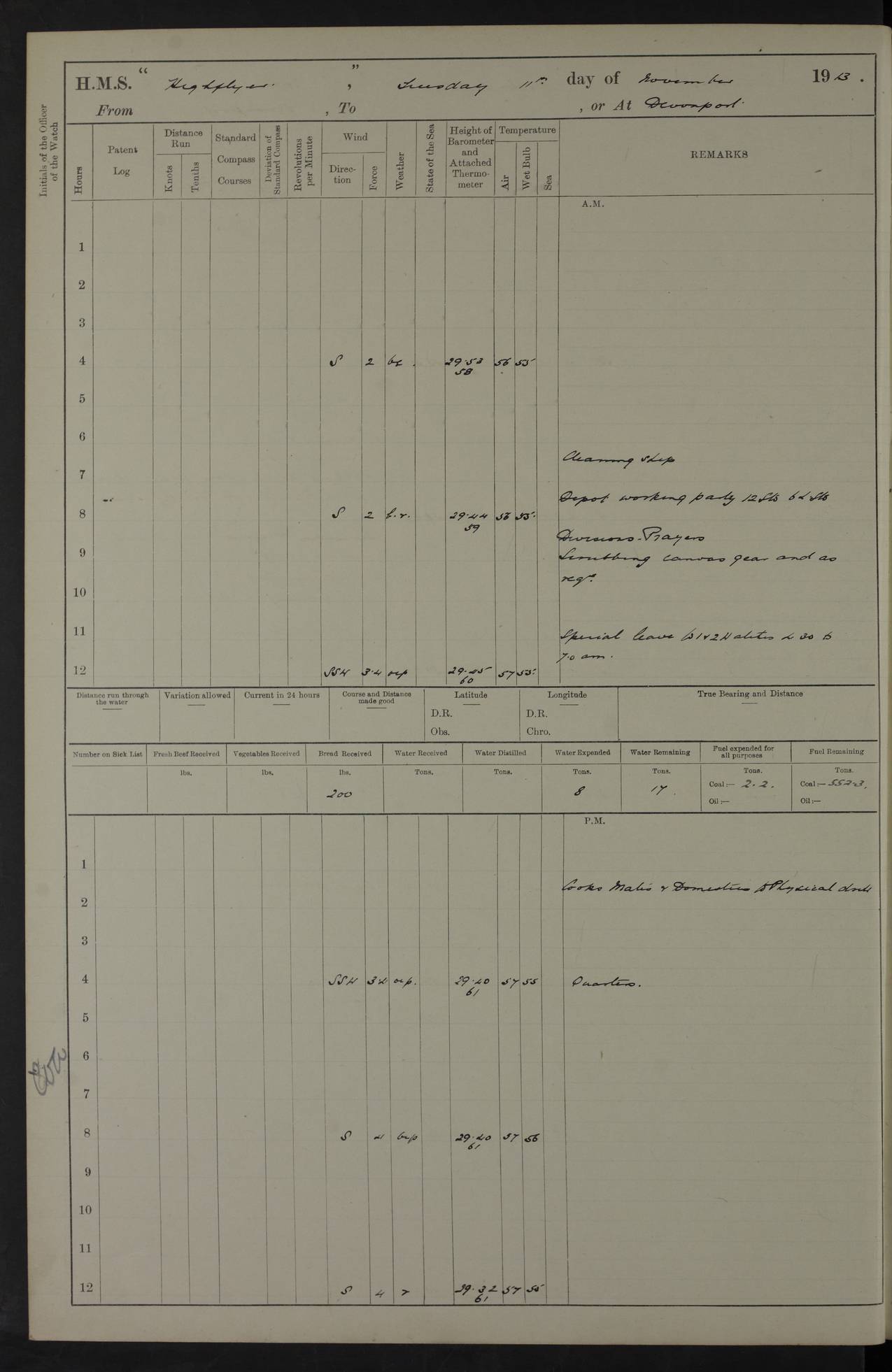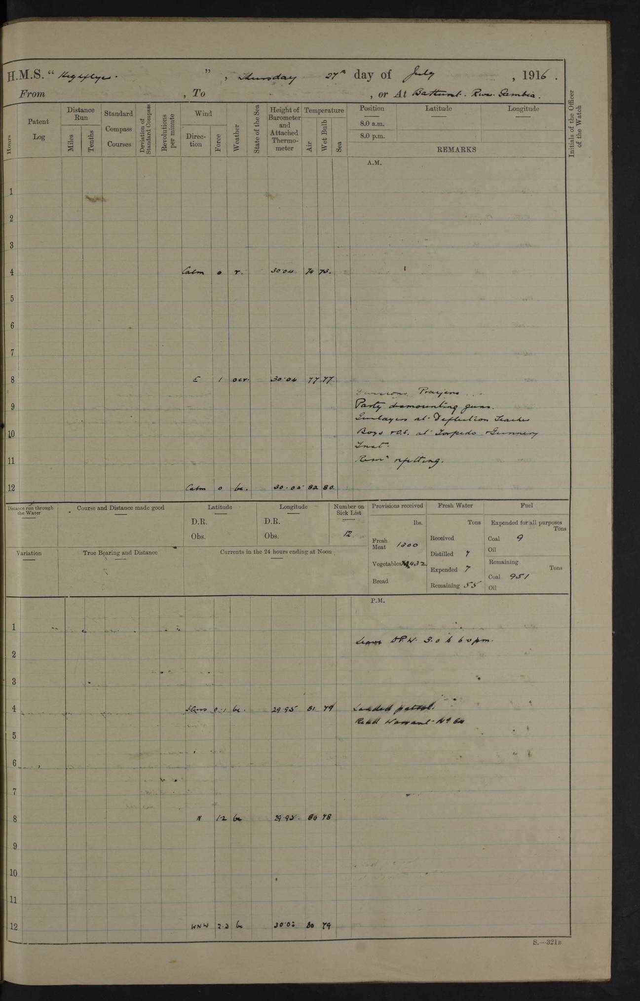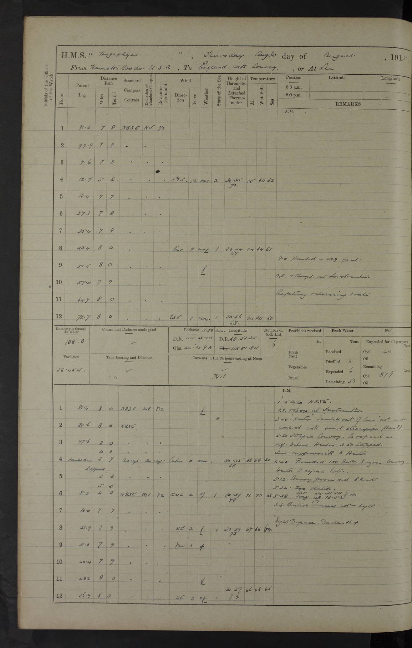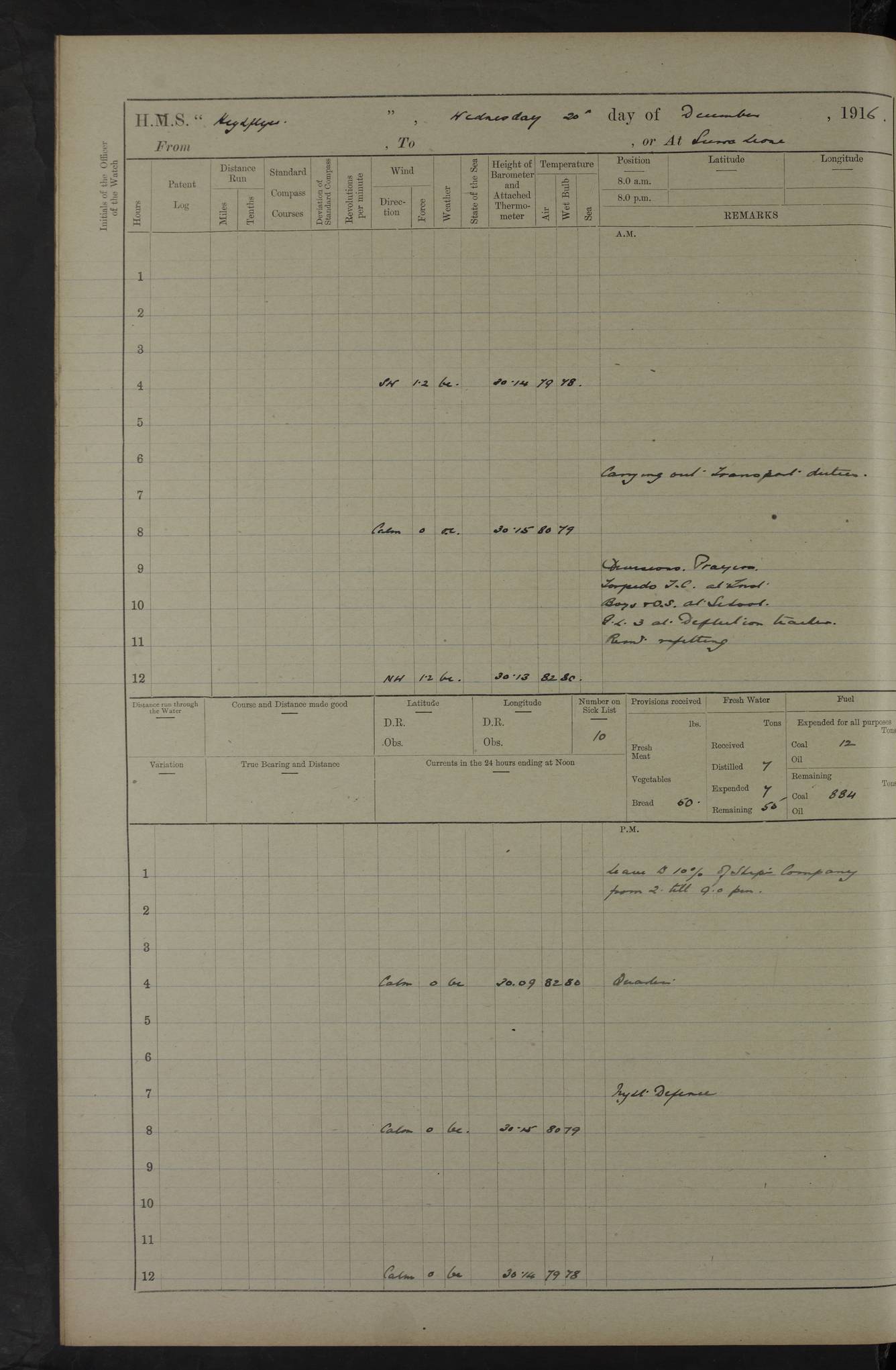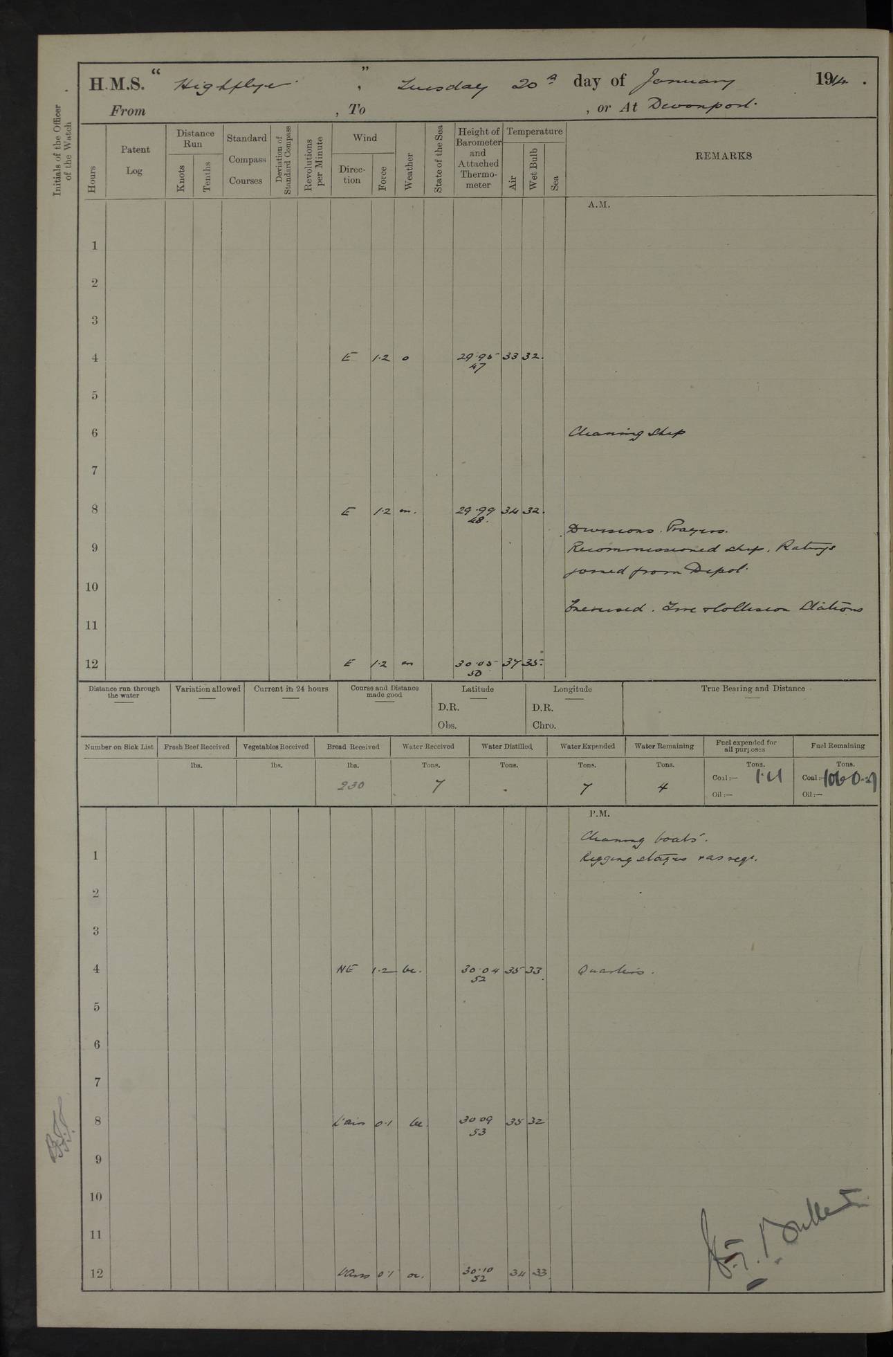 LOGS FOR JANUARY 1917 4ef4f321e53e0a0c91000902: (https://s3.amazonaws.com:443/oldweather/ADM53-44307/ADM 53-44307-129_1.jpg) 4ef4f321e53e0a0c91000903: (https://s3.amazonaws.com:443/oldweather/ADM53-44307/ADM 53-44307-130_0.jpg) 4ef4f321e53e0a0c91000904: (https://s3.amazonaws.com:443/oldweather/ADM53-44307/ADM 53-44307-130_1.jpg) 4ef4f321e53e0a0c91000905: (https://s3.amazonaws.com:443/oldweather/ADM53-44307/ADM 53-44307-131_0.jpg) 4ef4f321e53e0a0c91000906: (https://s3.amazonaws.com:443/oldweather/ADM53-44307/ADM 53-44307-131_1.jpg) 1 January 1917 Sierra Leone Lat 8.5, Long -13.2 6.30am: Party transferring provisions to DONEGAL. 10.00am: Party working on board SS VIRENT dismounting gun. 4ef4f321e53e0a0c91000907: (https://s3.amazonaws.com:443/oldweather/ADM53-44307/ADM 53-44307-132_0.jpg) 2 January 1917 Sierra Leone to St. Vincent Lat 8.7, Long -13.6 6.55am: SS ATLANTIC CITY came alongside. Coaling ship. 9.20am: Weighed and proceeded as requisite out of harbour. 4ef4f321e53e0a0c91000908: (https://s3.amazonaws.com:443/oldweather/ADM53-44307/ADM 53-44307-132_1.jpg) 3 January 1917 Sierra Leone to St. Vincent Lat 11.1, Long -17.7 2.30pm: Sighted SS on P bow steering to SE’d. 4ef4f321e53e0a0c91000909: (https://s3.amazonaws.com:443/oldweather/ADM53-44307/ADM 53-44307-133_0.jpg) 4 January 1917 Sierra Leone to St. Vincent Lat 13.8, Long -21.5 Boys and OS at school and seamanship instruction. Marines at drill. 11.30pm: Passing between St. Jago and Mayo Id. 4ef4f321e53e0a0c9100090a: (https://s3.amazonaws.com:443/oldweather/ADM53-44307/ADM 53-44307-133_1.jpg) 5 January 1917 Sierra Leone to St. Vincent Lat 16.8828, Long -25.0106 6.40am: Sighted San Nicholas Id. abeam. 11.58am: Came to SB 9 fathoms, 4½ shackles. 12.30pm: Lighters came alongside. 2.00pm: Coaling ship. 5.00pm: Stopped coaling for night. 4ef4f321e53e0a0c9100090b: (https://s3.amazonaws.com:443/oldweather/ADM53-44307/ADM 53-44307-134_0.jpg) 6 January 1917 St. Vincent Lat 16.8828, Long -25.0106 6.30am: Coaling ship from lighters. 12.30pm: Finished coaling; received 433 tons including deck cargo. 2.00pm: Prepared for sea. 4ef4f321e53e0a0c9100090c: (https://s3.amazonaws.com:443/oldweather/ADM53-44307/ADM 53-44307-134_1.jpg) 7 January 1917 St. Vincent to rendezvous to meet HMS Shannon and convoy Lat 17.4, Long -25.5 6.35am: Weighed and proceeded as requisite, 100 revs, to southward by San Antonio. 4ef4f321e53e0a0c9100090d: (https://s3.amazonaws.com:443/oldweather/ADM53-44307/ADM 53-44307-135_0.jpg) 8 January 1917 St. Vincent to meet HMS Shannon and convoy Lat 21.2, Long -26.3 9.30am: Party striking down coal. 4ef4f321e53e0a0c9100090e: (https://s3.amazonaws.com:443/oldweather/ADM53-44307/ADM 53-44307-135_1.jpg) 9 January 1917 St. Vincent to meet HMS Shannon and convoy Lat 23.9, Long -25.5 Cleaning ship. 9.00pm: Group closed up exercised during watch. 4ef4f322e53e0a0c9100090f: (https://s3.amazonaws.com:443/oldweather/ADM53-44307/ADM 53-44307-136_0.jpg) 10 January 1917 St. Vincent to meet HMS Shannon and convoy Lat 27.4, Long -25.1 2.00am: Groups closed up, exercised frequently during each watch. 6.30am: Sighted SS on southward beam steering NE’d. 4ef4f322e53e0a0c91000910: (https://s3.amazonaws.com:443/oldweather/ADM53-44307/ADM 53-44307-136_1.jpg) 11 January 1917 St. Vincent to meet HMS Shannon and convoy and to Sierra Leone Lat 29.7, Long -24.7 2.00am: Groups closed up, exercised frequently during each watch. 5.20am: Sighted SHANNON and convoy ahead – CARONIA, EMPRESS OF BRITAIN, WALMER CASTLE, TYNDAREUS, PAKEHA, NESTOR, CORINTHIC. 6.13am: Stopped. Communicated by boat with SHANNON. 6.25am: Course S17W. 115 rev. SHANNON proceeded NE’d., course as requisite to take up station with convoy. [A sketch is included showing the position of the ships. HIGHFLYER is in the middle of the front row with PAKEHA 10 cables to port and WALMER CASTLE 10 cables to starboard. NESTOR, then TYNDAREUS, follow PAKEHA. EMPRESS OF BRITAIN, then CARONIA, follow WALMER CASTLE. CORINTHIC is evenly spaced between TYNDAREUS and CARONIA.] 4ef4f322e53e0a0c91000911: (https://s3.amazonaws.com:443/oldweather/ADM53-44307/ADM 53-44307-137_0.jpg) 12 January 1917 To Sierra Leone with convoy Lat 23.9, Long -26.3 Guns’ crews closed up exercised frequently during day. Boys and OS to school and seamanship instruction. 4ef4f322e53e0a0c91000912: (https://s3.amazonaws.com:443/oldweather/ADM53-44307/ADM 53-44307-137_1.jpg) 13 January 1917 To Sierra Leone with convoy Lat 19.3, Long -28.0 3.57am: 80 rev. to allow TYNDAREUS to remedy engine defect. 4ef4f322e53e0a0c91000913: (https://s3.amazonaws.com:443/oldweather/ADM53-44307/ADM 53-44307-138_0.jpg) 14 January 1917 To Sierra Leone with convoy Lat 14.7, Long -26.9 9.00am: Mustered by Open List. 10.00am: Held Divine Service. 4ef4f322e53e0a0c91000914: (https://s3.amazonaws.com:443/oldweather/ADM53-44307/ADM 53-44307-138_1.jpg) 15 January 1917 To Sierra Leone with convoy Lat 12.3, Long -23.7 Party in stokehold trimming. 4ef4f322e53e0a0c91000915: (https://s3.amazonaws.com:443/oldweather/ADM53-44307/ADM 53-44307-139_0.jpg) 16 January 1917 To Sierra Leone with convoy Lat 10.4, Long -18.1 1.00pm: Hoisted colours half-mast. (Death on board EMPRESS OF BRITAIN.) 4ef4f322e53e0a0c91000916: (https://s3.amazonaws.com:443/oldweather/ADM53-44307/ADM 53-44307-139_1.jpg) 17 January 1917 To Sierra Leone with convoy Lat 8.5, Long -13.2 9.15am: Observed land ahead. Prepared for coaling. 10.40am: Formed single line ahead. 12.30pm: Transports proceeded independently to anchoring berths. 1.12pm: Came to with PB anchor in 10 fathoms, veered to 4 shackles, A3 berth. 5.30pm: SS MANSFIELD came alongside. 4ef4f322e53e0a0c91000917: (https://s3.amazonaws.com:443/oldweather/ADM53-44307/ADM 53-44307-140_0.jpg) 18 January 1917 Sierra Leone Lat 8.5, Long -13.2 6.00am: Commenced coaling. 2.15pm: Finished coaling; received 840 tons. 4ef4f322e53e0a0c91000918: (https://s3.amazonaws.com:443/oldweather/ADM53-44307/ADM 53-44307-140_1.jpg) 19 January 1917 Sierra Leone Lat 8.5, 