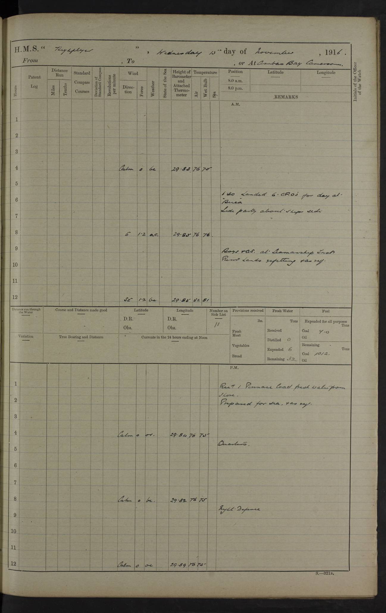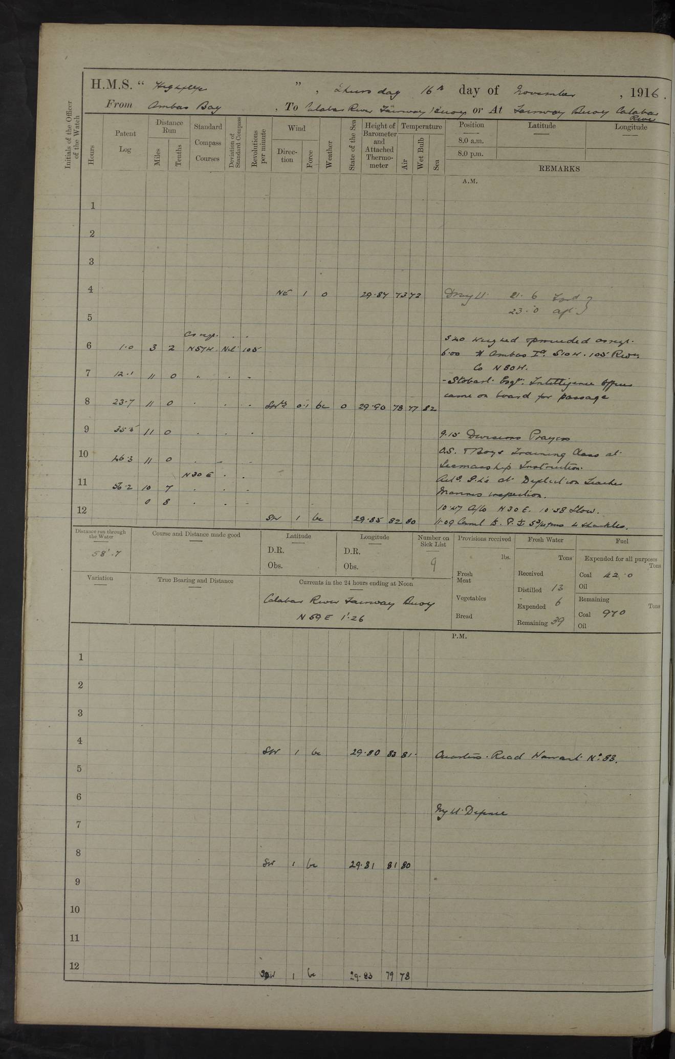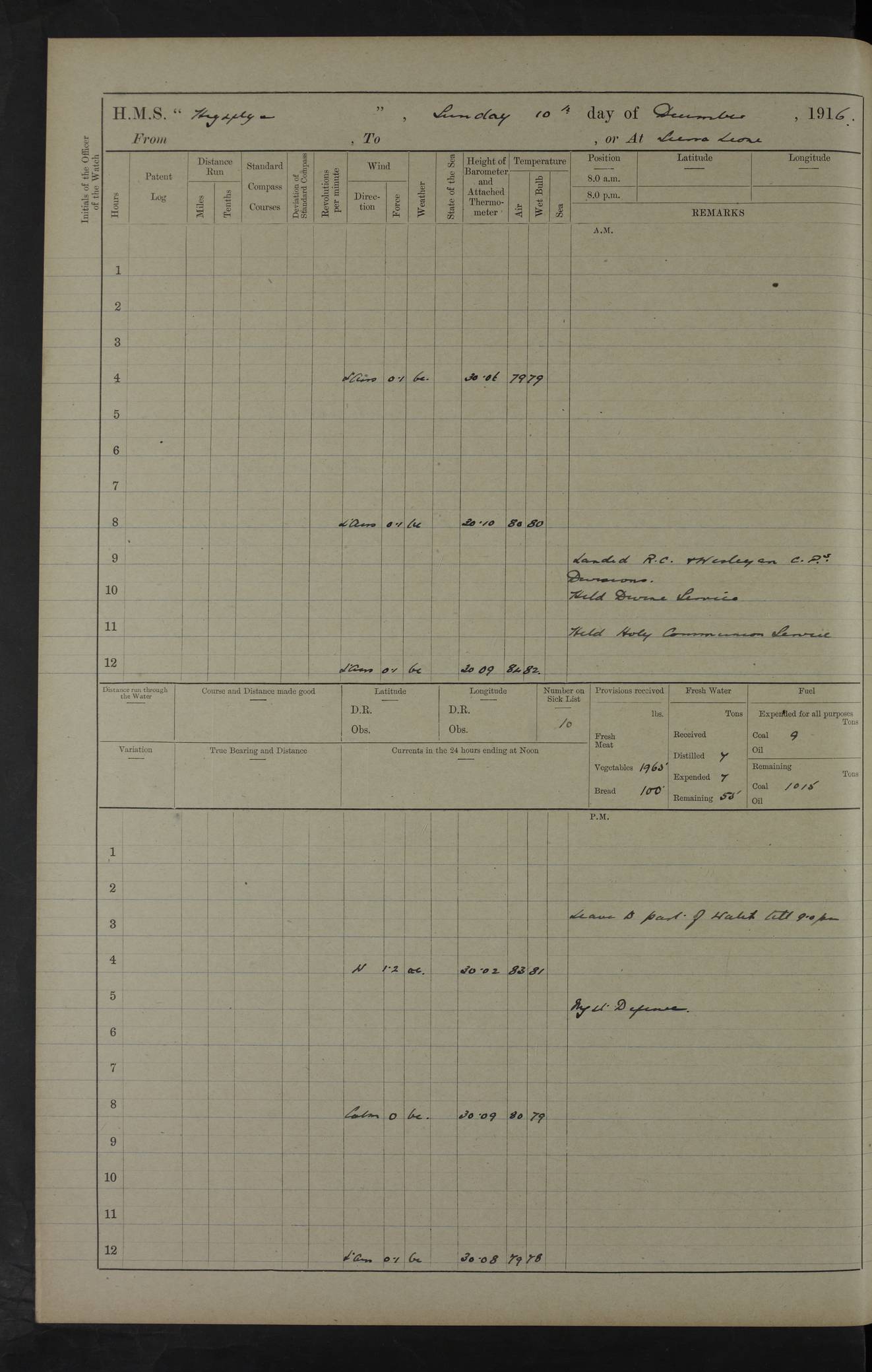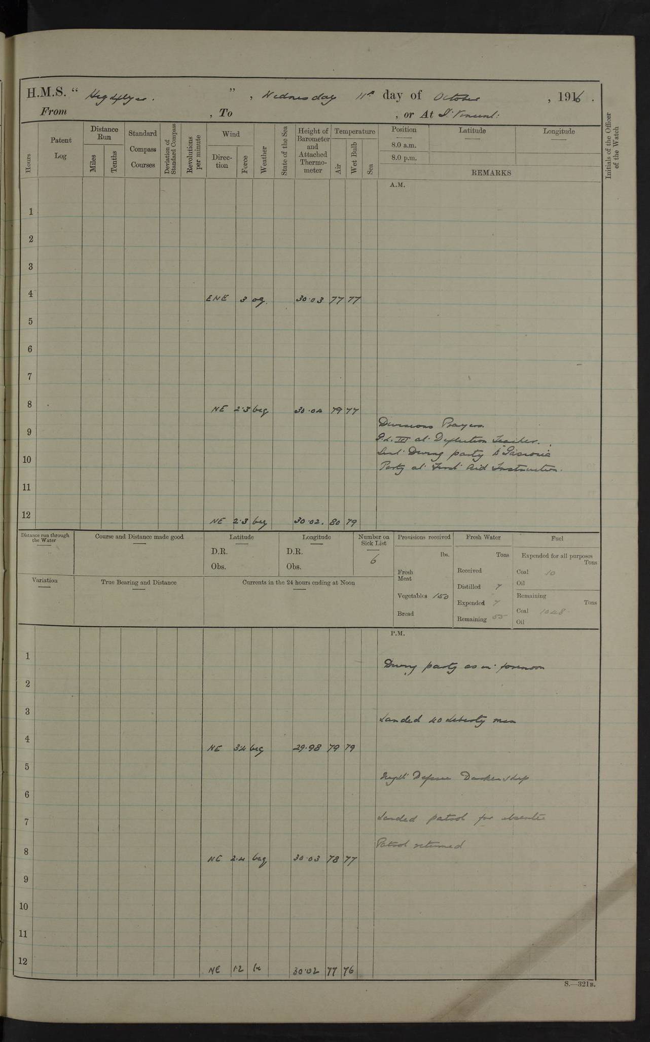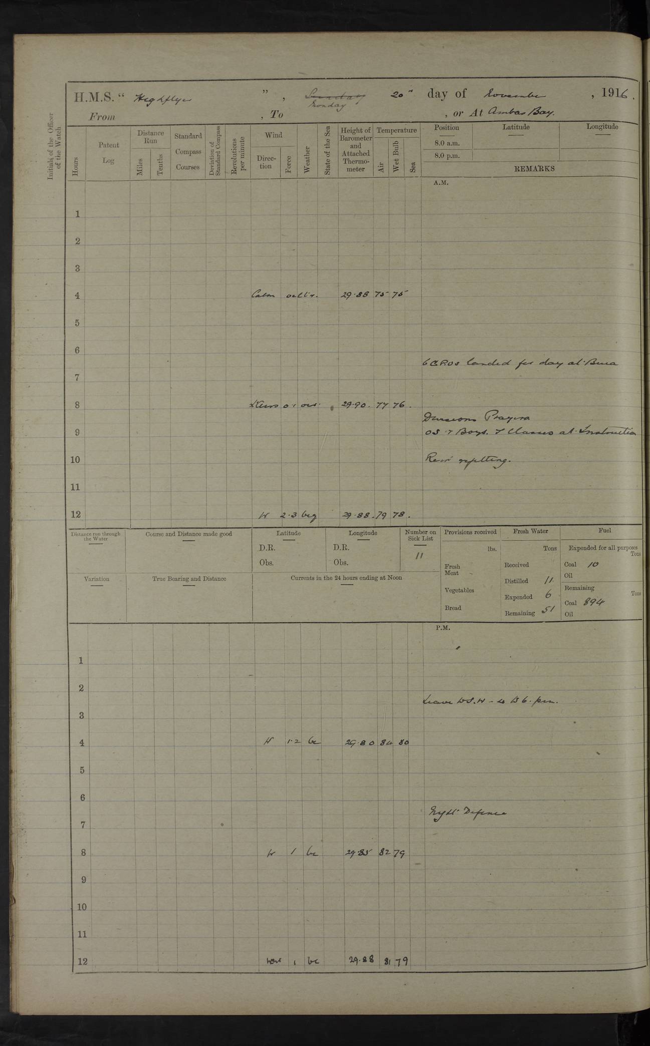 LOGS FOR JANUARY 1917 4ef4f321e53e0a0c91000902: (https://s3.amazonaws.com:443/oldweather/ADM53-44307/ADM 53-44307-129_1.jpg) 4ef4f321e53e0a0c91000903: (https://s3.amazonaws.com:443/oldweather/ADM53-44307/ADM 53-44307-130_0.jpg) 4ef4f321e53e0a0c91000904: (https://s3.amazonaws.com:443/oldweather/ADM53-44307/ADM 53-44307-130_1.jpg) 4ef4f321e53e0a0c91000905: (https://s3.amazonaws.com:443/oldweather/ADM53-44307/ADM 53-44307-131_0.jpg) 4ef4f321e53e0a0c91000906: (https://s3.amazonaws.com:443/oldweather/ADM53-44307/ADM 53-44307-131_1.jpg) 1 January 1917 Sierra Leone Lat 8.5, Long -13.2 6.30am: Party transferring provisions to DONEGAL. 10.00am: Party working on board SS VIRENT dismounting gun. 4ef4f321e53e0a0c91000907: (https://s3.amazonaws.com:443/oldweather/ADM53-44307/ADM 53-44307-132_0.jpg) 2 January 1917 Sierra Leone to St. Vincent Lat 8.7, Long -13.6 6.55am: SS ATLANTIC CITY came alongside. Coaling ship. 9.20am: Weighed and proceeded as requisite out of harbour. 4ef4f321e53e0a0c91000908: (https://s3.amazonaws.com:443/oldweather/ADM53-44307/ADM 53-44307-132_1.jpg) 3 January 1917 Sierra Leone to St. Vincent Lat 11.1, Long -17.7 2.30pm: Sighted SS on P bow steering to SE’d. 4ef4f321e53e0a0c91000909: (https://s3.amazonaws.com:443/oldweather/ADM53-44307/ADM 53-44307-133_0.jpg) 4 January 1917 Sierra Leone to St. Vincent Lat 13.8, Long -21.5 Boys and OS at school and seamanship instruction. Marines at drill. 11.30pm: Passing between St. Jago and Mayo Id. 4ef4f321e53e0a0c9100090a: (https://s3.amazonaws.com:443/oldweather/ADM53-44307/ADM 53-44307-133_1.jpg) 5 January 1917 Sierra Leone to St. Vincent Lat 16.8828, Long -25.0106 6.40am: Sighted San Nicholas Id. abeam. 11.58am: Came to SB 9 fathoms, 4½ shackles. 12.30pm: Lighters came alongside. 2.00pm: Coaling ship. 5.00pm: Stopped coaling for night. 4ef4f321e53e0a0c9100090b: (https://s3.amazonaws.com:443/oldweather/ADM53-44307/ADM 53-44307-134_0.jpg) 6 January 1917 St. Vincent Lat 16.8828, Long -25.0106 6.30am: Coaling ship from lighters. 12.30pm: Finished coaling; received 433 tons including deck cargo. 2.00pm: Prepared for sea. 4ef4f321e53e0a0c9100090c: (https://s3.amazonaws.com:443/oldweather/ADM53-44307/ADM 53-44307-134_1.jpg) 7 January 1917 St. Vincent to rendezvous to meet HMS Shannon and convoy Lat 17.4, Long -25.5 6.35am: Weighed and proceeded as requisite, 100 revs, to southward by San Antonio. 4ef4f321e53e0a0c9100090d: (https://s3.amazonaws.com:443/oldweather/ADM53-44307/ADM 53-44307-135_0.jpg) 8 January 1917 St. Vincent to meet HMS Shannon and convoy Lat 21.2, Long -26.3 9.30am: Party striking down coal. 4ef4f321e53e0a0c9100090e: (https://s3.amazonaws.com:443/oldweather/ADM53-44307/ADM 53-44307-135_1.jpg) 9 January 1917 St. Vincent to meet HMS Shannon and convoy Lat 23.9, Long -25.5 Cleaning ship. 9.00pm: Group closed up exercised during watch. 4ef4f322e53e0a0c9100090f: (https://s3.amazonaws.com:443/oldweather/ADM53-44307/ADM 53-44307-136_0.jpg) 10 January 1917 St. Vincent to meet HMS Shannon and convoy Lat 27.4, Long -25.1 2.00am: Groups closed up, exercised frequently during each watch. 6.30am: Sighted SS on southward beam steering NE’d. 4ef4f322e53e0a0c91000910: (https://s3.amazonaws.com:443/oldweather/ADM53-44307/ADM 53-44307-136_1.jpg) 11 January 1917 St. Vincent to meet HMS Shannon and convoy and to Sierra Leone Lat 29.7, Long -24.7 2.00am: Groups closed up, exercised frequently during each watch. 5.20am: Sighted SHANNON and convoy ahead – CARONIA, EMPRESS OF BRITAIN, WALMER CASTLE, TYNDAREUS, PAKEHA, NESTOR, CORINTHIC. 6.13am: Stopped. Communicated by boat with SHANNON. 6.25am: Course S17W. 115 rev. SHANNON proceeded NE’d., course as requisite to take up station with convoy. [A sketch is included showing the position of the ships. HIGHFLYER is in the middle of the front row with PAKEHA 10 cables to port and WALMER CASTLE 10 cables to starboard. NESTOR, then TYNDAREUS, follow PAKEHA. EMPRESS OF BRITAIN, then CARONIA, follow WALMER CASTLE. CORINTHIC is evenly spaced between TYNDAREUS and CARONIA.] 4ef4f322e53e0a0c91000911: (https://s3.amazonaws.com:443/oldweather/ADM53-44307/ADM 53-44307-137_0.jpg) 12 January 1917 To Sierra Leone with convoy Lat 23.9, Long -26.3 Guns’ crews closed up exercised frequently during day. Boys and OS to school and seamanship instruction. 4ef4f322e53e0a0c91000912: (https://s3.amazonaws.com:443/oldweather/ADM53-44307/ADM 53-44307-137_1.jpg) 13 January 1917 To Sierra Leone with convoy Lat 19.3, Long -28.0 3.57am: 80 rev. to allow TYNDAREUS to remedy engine defect. 4ef4f322e53e0a0c91000913: (https://s3.amazonaws.com:443/oldweather/ADM53-44307/ADM 53-44307-138_0.jpg) 14 January 1917 To Sierra Leone with convoy Lat 14.7, Long -26.9 9.00am: Mustered by Open List. 10.00am: Held Divine Service. 4ef4f322e53e0a0c91000914: (https://s3.amazonaws.com:443/oldweather/ADM53-44307/ADM 53-44307-138_1.jpg) 15 January 1917 To Sierra Leone with convoy Lat 12.3, Long -23.7 Party in stokehold trimming. 4ef4f322e53e0a0c91000915: (https://s3.amazonaws.com:443/oldweather/ADM53-44307/ADM 53-44307-139_0.jpg) 16 January 1917 To Sierra Leone with convoy Lat 10.4, Long -18.1 1.00pm: Hoisted colours half-mast. (Death on board EMPRESS OF BRITAIN.) 4ef4f322e53e0a0c91000916: (https://s3.amazonaws.com:443/oldweather/ADM53-44307/ADM 53-44307-139_1.jpg) 17 January 1917 To Sierra Leone with convoy Lat 8.5, Long -13.2 9.15am: Observed land ahead. Prepared for coaling. 10.40am: Formed single line ahead. 12.30pm: Transports proceeded independently to anchoring berths. 1.12pm: Came to with PB anchor in 10 fathoms, veered to 4 shackles, A3 berth. 5.30pm: SS MANSFIELD came alongside. 4ef4f322e53e0a0c91000917: (https://s3.amazonaws.com:443/oldweather/ADM53-44307/ADM 53-44307-140_0.jpg) 18 January 1917 Sierra Leone Lat 8.5, Long -13.2 6.00am: Commenced coaling. 2.15pm: Finished coaling; received 840 tons. 4ef4f322e53e0a0c91000918: (https://s3.amazonaws.com:443/oldweather/ADM53-44307/ADM 53-44307-140_1.jpg) 19 January 1917 Sierra Leone Lat 8.5, 