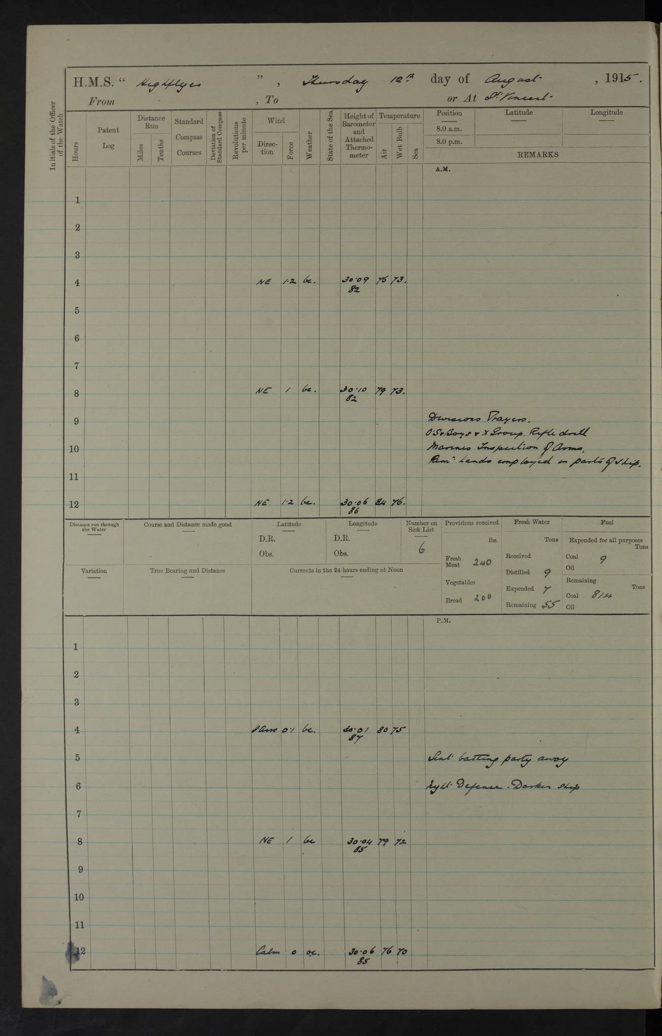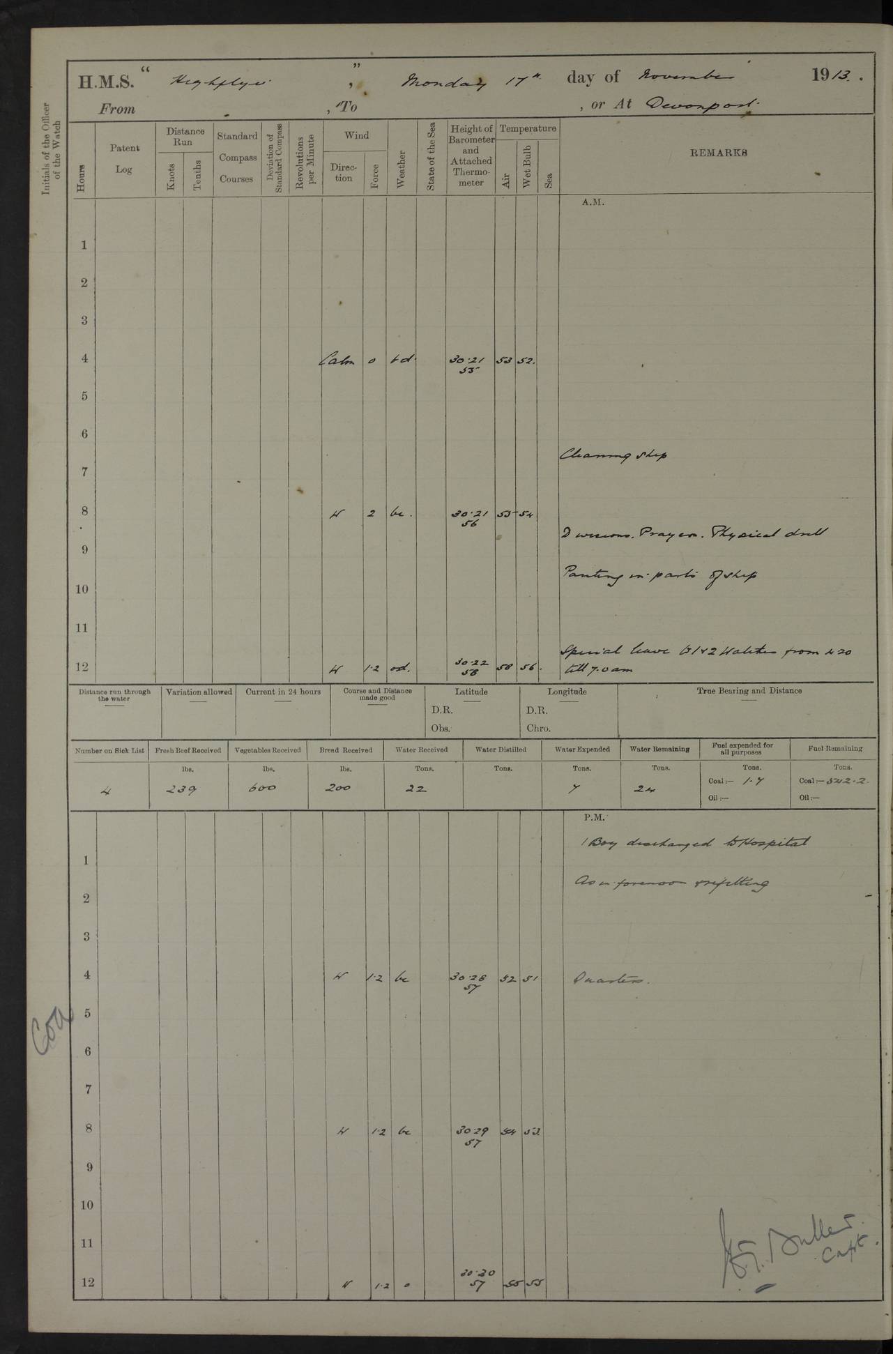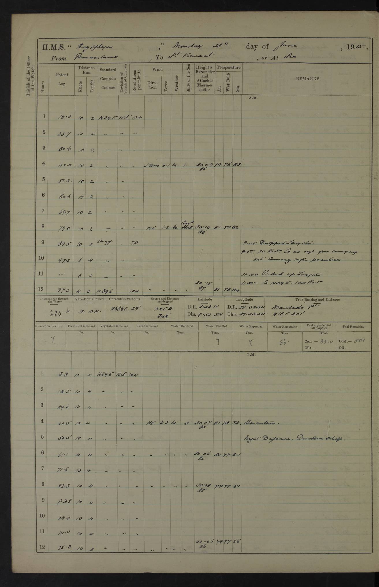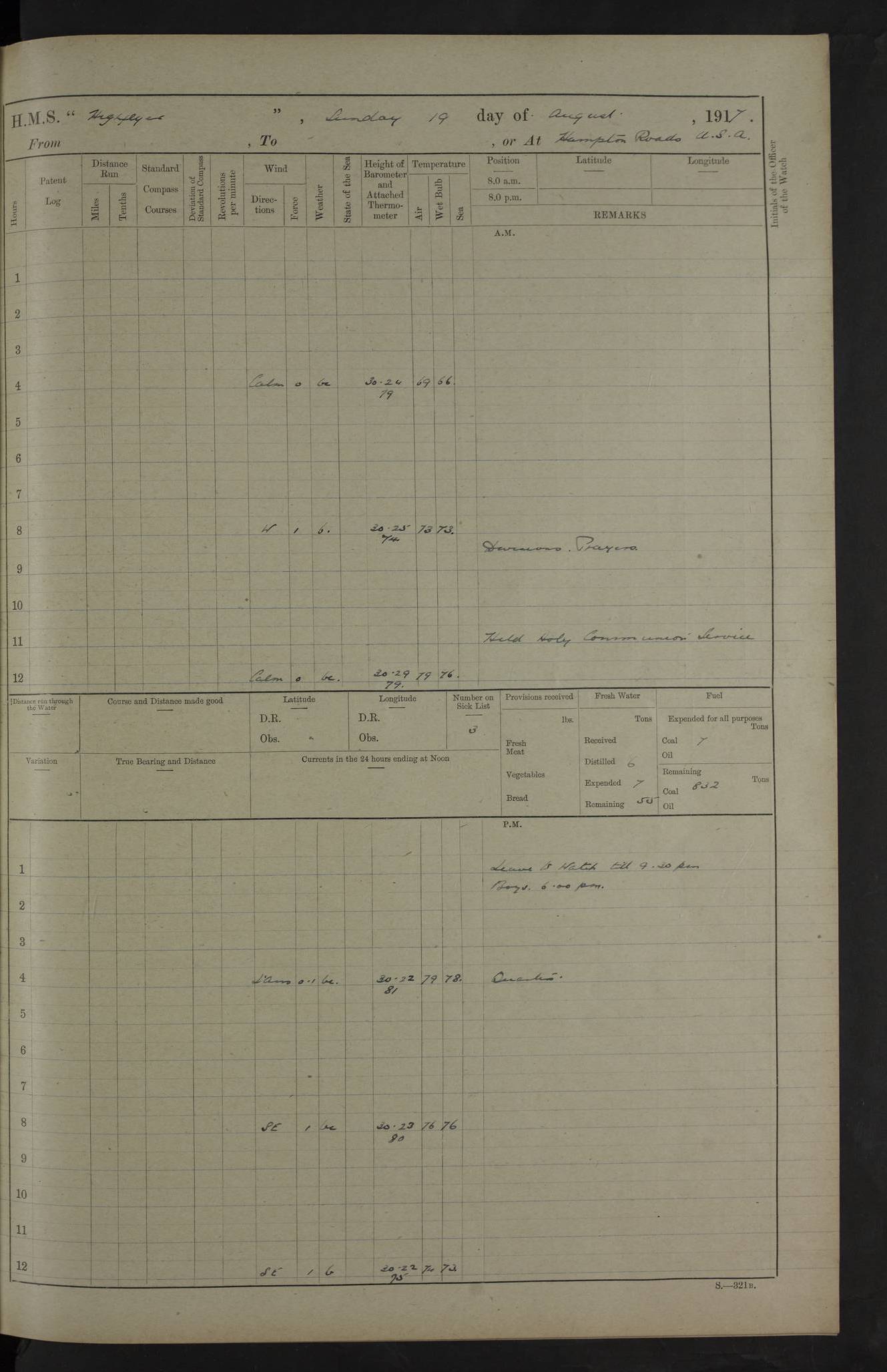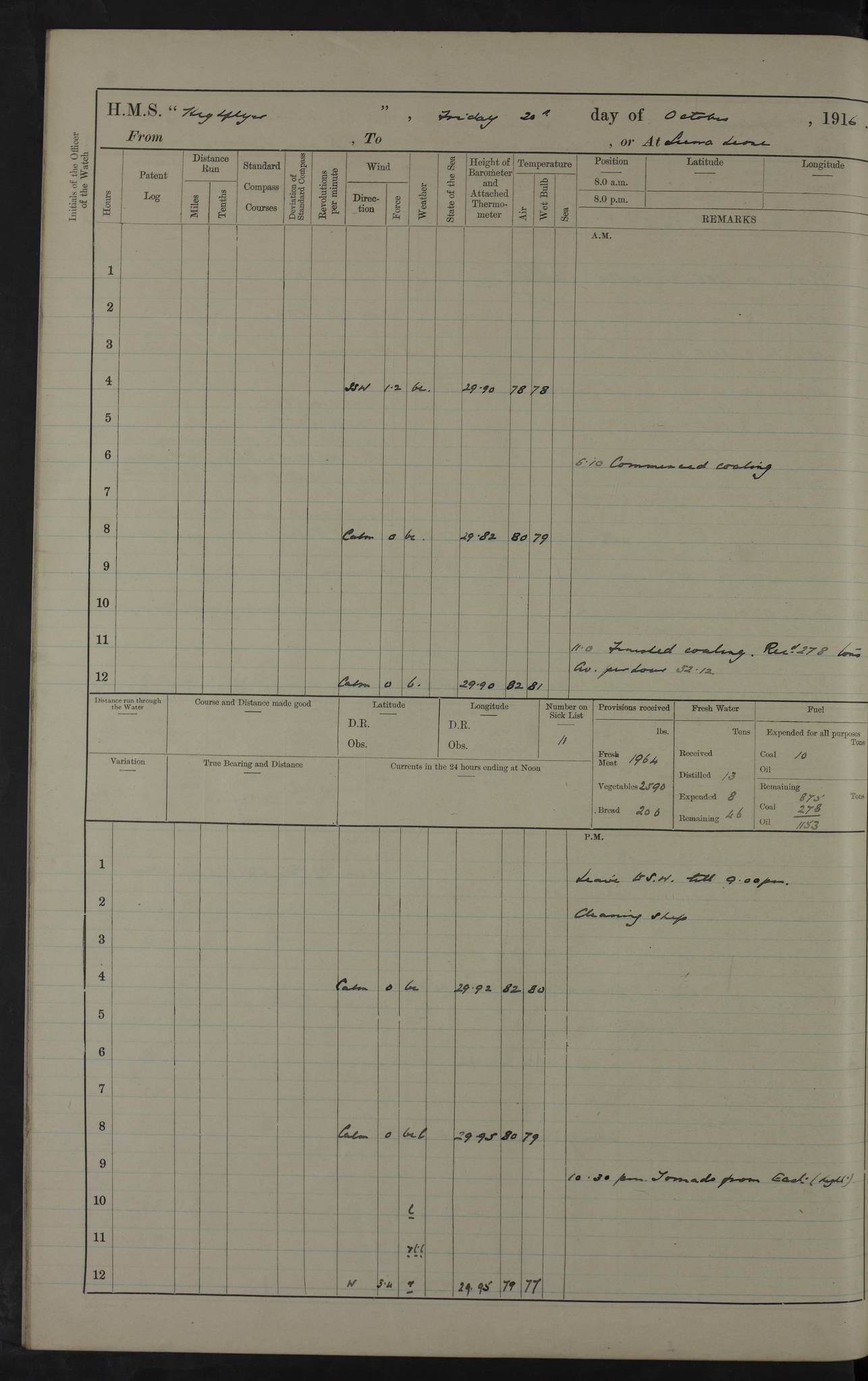 LOGS FOR JANUARY 1917 4ef4f321e53e0a0c91000902: (https://s3.amazonaws.com:443/oldweather/ADM53-44307/ADM 53-44307-129_1.jpg) 4ef4f321e53e0a0c91000903: (https://s3.amazonaws.com:443/oldweather/ADM53-44307/ADM 53-44307-130_0.jpg) 4ef4f321e53e0a0c91000904: (https://s3.amazonaws.com:443/oldweather/ADM53-44307/ADM 53-44307-130_1.jpg) 4ef4f321e53e0a0c91000905: (https://s3.amazonaws.com:443/oldweather/ADM53-44307/ADM 53-44307-131_0.jpg) 4ef4f321e53e0a0c91000906: (https://s3.amazonaws.com:443/oldweather/ADM53-44307/ADM 53-44307-131_1.jpg) 1 January 1917 Sierra Leone Lat 8.5, Long -13.2 6.30am: Party transferring provisions to DONEGAL. 10.00am: Party working on board SS VIRENT dismounting gun. 4ef4f321e53e0a0c91000907: (https://s3.amazonaws.com:443/oldweather/ADM53-44307/ADM 53-44307-132_0.jpg) 2 January 1917 Sierra Leone to St. Vincent Lat 8.7, Long -13.6 6.55am: SS ATLANTIC CITY came alongside. Coaling ship. 9.20am: Weighed and proceeded as requisite out of harbour. 4ef4f321e53e0a0c91000908: (https://s3.amazonaws.com:443/oldweather/ADM53-44307/ADM 53-44307-132_1.jpg) 3 January 1917 Sierra Leone to St. Vincent Lat 11.1, Long -17.7 2.30pm: Sighted SS on P bow steering to SE’d. 4ef4f321e53e0a0c91000909: (https://s3.amazonaws.com:443/oldweather/ADM53-44307/ADM 53-44307-133_0.jpg) 4 January 1917 Sierra Leone to St. Vincent Lat 13.8, Long -21.5 Boys and OS at school and seamanship instruction. Marines at drill. 11.30pm: Passing between St. Jago and Mayo Id. 4ef4f321e53e0a0c9100090a: (https://s3.amazonaws.com:443/oldweather/ADM53-44307/ADM 53-44307-133_1.jpg) 5 January 1917 Sierra Leone to St. Vincent Lat 16.8828, Long -25.0106 6.40am: Sighted San Nicholas Id. abeam. 11.58am: Came to SB 9 fathoms, 4½ shackles. 12.30pm: Lighters came alongside. 2.00pm: Coaling ship. 5.00pm: Stopped coaling for night. 4ef4f321e53e0a0c9100090b: (https://s3.amazonaws.com:443/oldweather/ADM53-44307/ADM 53-44307-134_0.jpg) 6 January 1917 St. Vincent Lat 16.8828, Long -25.0106 6.30am: Coaling ship from lighters. 12.30pm: Finished coaling; received 433 tons including deck cargo. 2.00pm: Prepared for sea. 4ef4f321e53e0a0c9100090c: (https://s3.amazonaws.com:443/oldweather/ADM53-44307/ADM 53-44307-134_1.jpg) 7 January 1917 St. Vincent to rendezvous to meet HMS Shannon and convoy Lat 17.4, Long -25.5 6.35am: Weighed and proceeded as requisite, 100 revs, to southward by San Antonio. 4ef4f321e53e0a0c9100090d: (https://s3.amazonaws.com:443/oldweather/ADM53-44307/ADM 53-44307-135_0.jpg) 8 January 1917 St. Vincent to meet HMS Shannon and convoy Lat 21.2, Long -26.3 9.30am: Party striking down coal. 4ef4f321e53e0a0c9100090e: (https://s3.amazonaws.com:443/oldweather/ADM53-44307/ADM 53-44307-135_1.jpg) 9 January 1917 St. Vincent to meet HMS Shannon and convoy Lat 23.9, Long -25.5 Cleaning ship. 9.00pm: Group closed up exercised during watch. 4ef4f322e53e0a0c9100090f: (https://s3.amazonaws.com:443/oldweather/ADM53-44307/ADM 53-44307-136_0.jpg) 10 January 1917 St. Vincent to meet HMS Shannon and convoy Lat 27.4, Long -25.1 2.00am: Groups closed up, exercised frequently during each watch. 6.30am: Sighted SS on southward beam steering NE’d. 4ef4f322e53e0a0c91000910: (https://s3.amazonaws.com:443/oldweather/ADM53-44307/ADM 53-44307-136_1.jpg) 11 January 1917 St. Vincent to meet HMS Shannon and convoy and to Sierra Leone Lat 29.7, Long -24.7 2.00am: Groups closed up, exercised frequently during each watch. 5.20am: Sighted SHANNON and convoy ahead – CARONIA, EMPRESS OF BRITAIN, WALMER CASTLE, TYNDAREUS, PAKEHA, NESTOR, CORINTHIC. 6.13am: Stopped. Communicated by boat with SHANNON. 6.25am: Course S17W. 115 rev. SHANNON proceeded NE’d., course as requisite to take up station with convoy. [A sketch is included showing the position of the ships. HIGHFLYER is in the middle of the front row with PAKEHA 10 cables to port and WALMER CASTLE 10 cables to starboard. NESTOR, then TYNDAREUS, follow PAKEHA. EMPRESS OF BRITAIN, then CARONIA, follow WALMER CASTLE. CORINTHIC is evenly spaced between TYNDAREUS and CARONIA.] 4ef4f322e53e0a0c91000911: (https://s3.amazonaws.com:443/oldweather/ADM53-44307/ADM 53-44307-137_0.jpg) 12 January 1917 To Sierra Leone with convoy Lat 23.9, Long -26.3 Guns’ crews closed up exercised frequently during day. Boys and OS to school and seamanship instruction. 4ef4f322e53e0a0c91000912: (https://s3.amazonaws.com:443/oldweather/ADM53-44307/ADM 53-44307-137_1.jpg) 13 January 1917 To Sierra Leone with convoy Lat 19.3, Long -28.0 3.57am: 80 rev. to allow TYNDAREUS to remedy engine defect. 4ef4f322e53e0a0c91000913: (https://s3.amazonaws.com:443/oldweather/ADM53-44307/ADM 53-44307-138_0.jpg) 14 January 1917 To Sierra Leone with convoy Lat 14.7, Long -26.9 9.00am: Mustered by Open List. 10.00am: Held Divine Service. 4ef4f322e53e0a0c91000914: (https://s3.amazonaws.com:443/oldweather/ADM53-44307/ADM 53-44307-138_1.jpg) 15 January 1917 To Sierra Leone with convoy Lat 12.3, Long -23.7 Party in stokehold trimming. 4ef4f322e53e0a0c91000915: (https://s3.amazonaws.com:443/oldweather/ADM53-44307/ADM 53-44307-139_0.jpg) 16 January 1917 To Sierra Leone with convoy Lat 10.4, Long -18.1 1.00pm: Hoisted colours half-mast. (Death on board EMPRESS OF BRITAIN.) 4ef4f322e53e0a0c91000916: (https://s3.amazonaws.com:443/oldweather/ADM53-44307/ADM 53-44307-139_1.jpg) 17 January 1917 To Sierra Leone with convoy Lat 8.5, Long -13.2 9.15am: Observed land ahead. Prepared for coaling. 10.40am: Formed single line ahead. 12.30pm: Transports proceeded independently to anchoring berths. 1.12pm: Came to with PB anchor in 10 fathoms, veered to 4 shackles, A3 berth. 5.30pm: SS MANSFIELD came alongside. 4ef4f322e53e0a0c91000917: (https://s3.amazonaws.com:443/oldweather/ADM53-44307/ADM 53-44307-140_0.jpg) 18 January 1917 Sierra Leone Lat 8.5, Long -13.2 6.00am: Commenced coaling. 2.15pm: Finished coaling; received 840 tons. 4ef4f322e53e0a0c91000918: (https://s3.amazonaws.com:443/oldweather/ADM53-44307/ADM 53-44307-140_1.jpg) 19 January 1917 Sierra Leone Lat 8.5, 