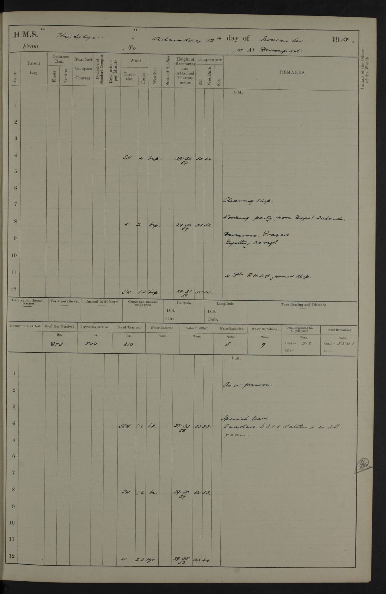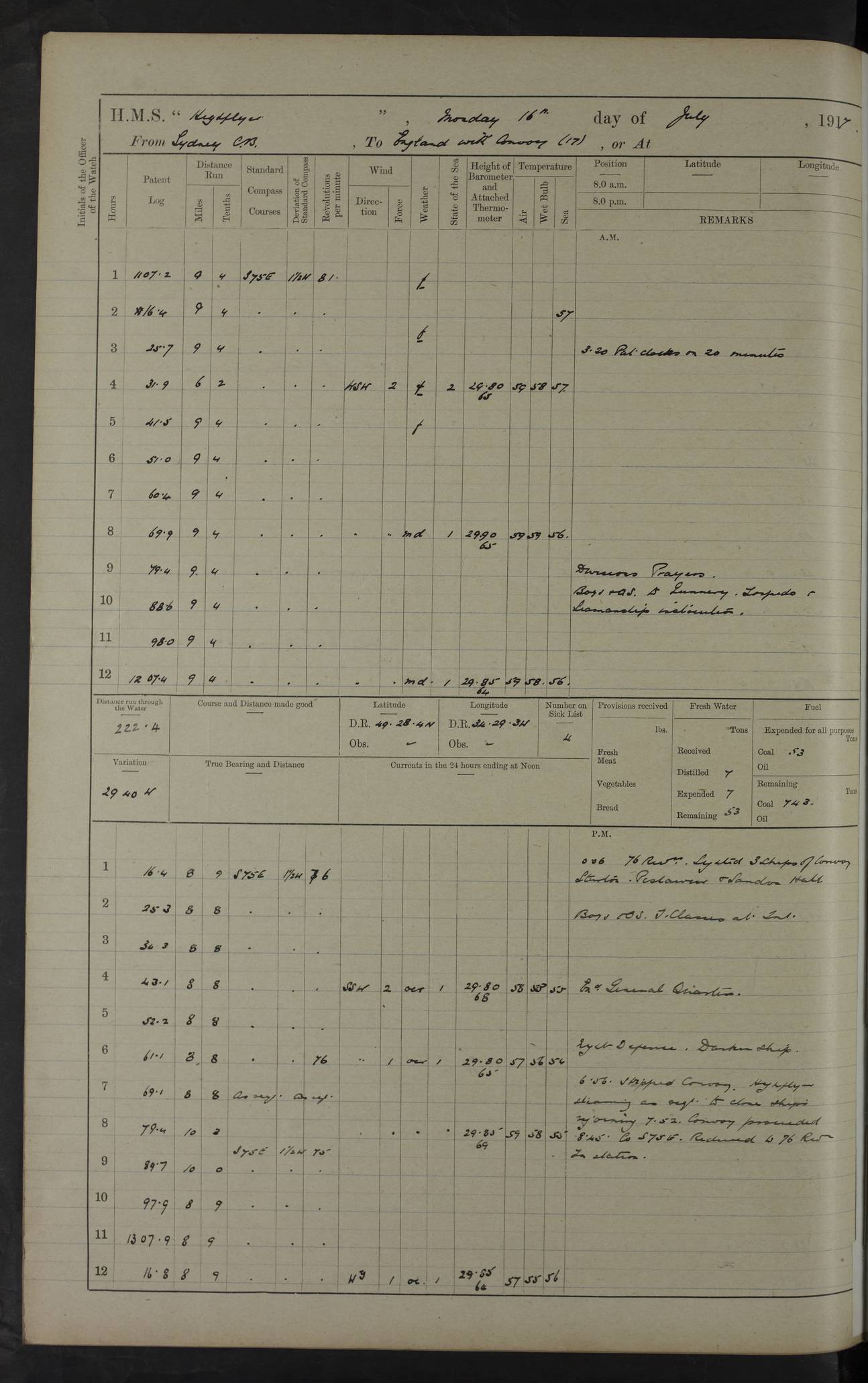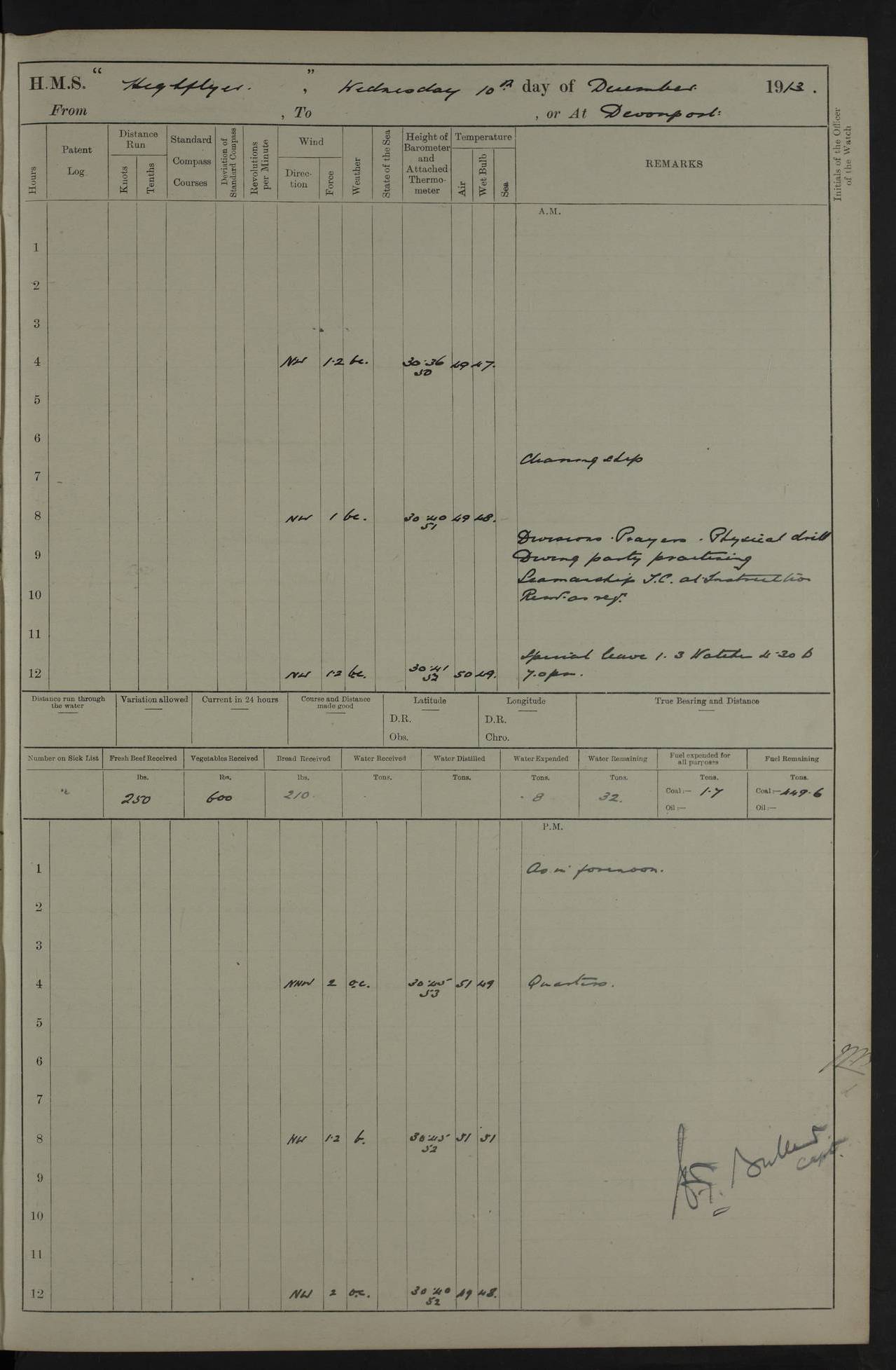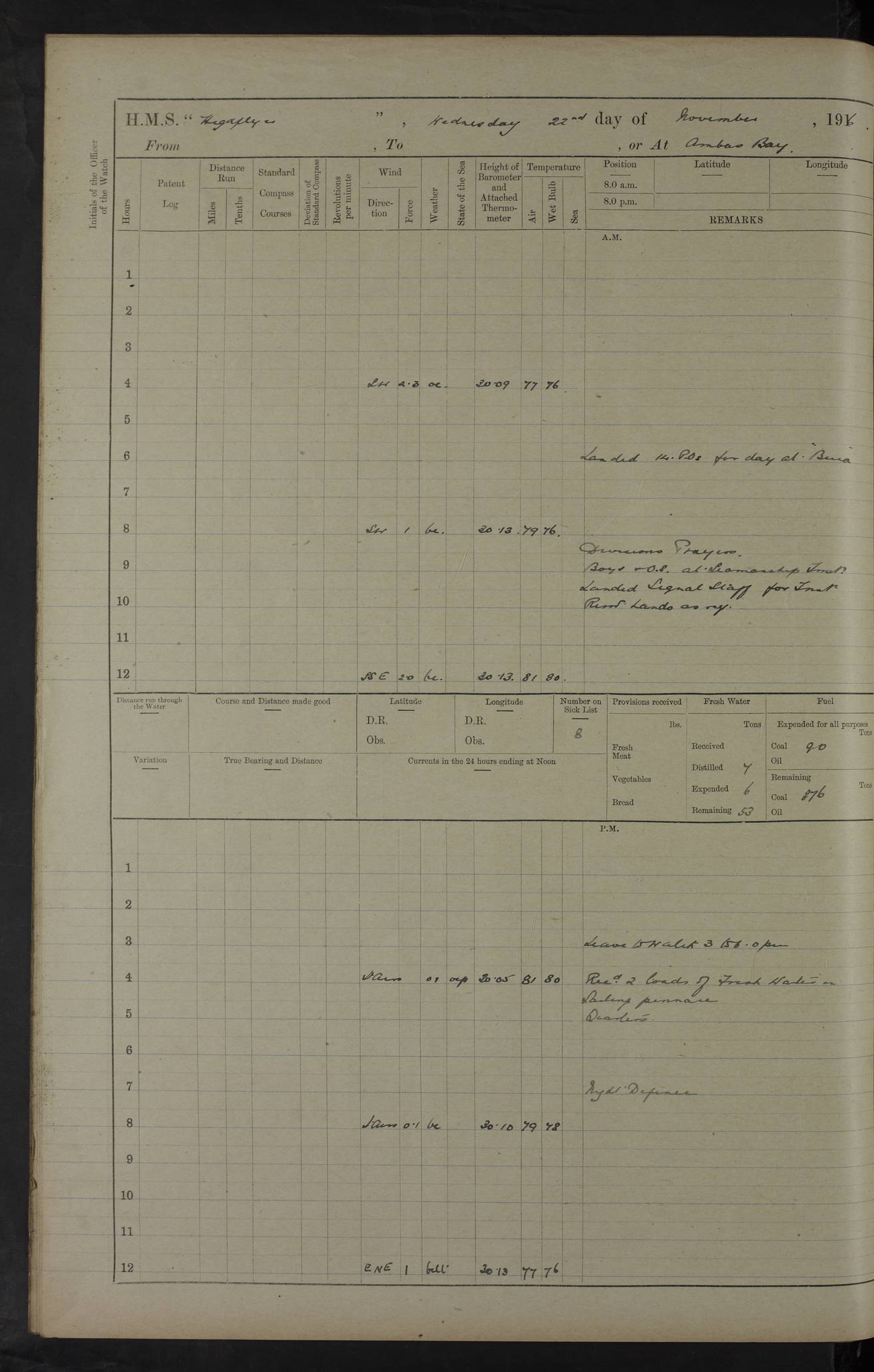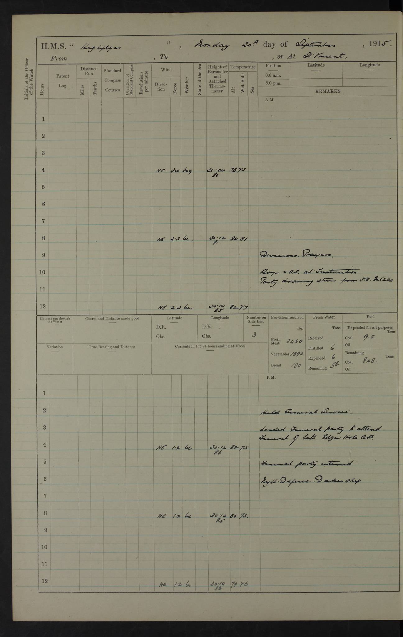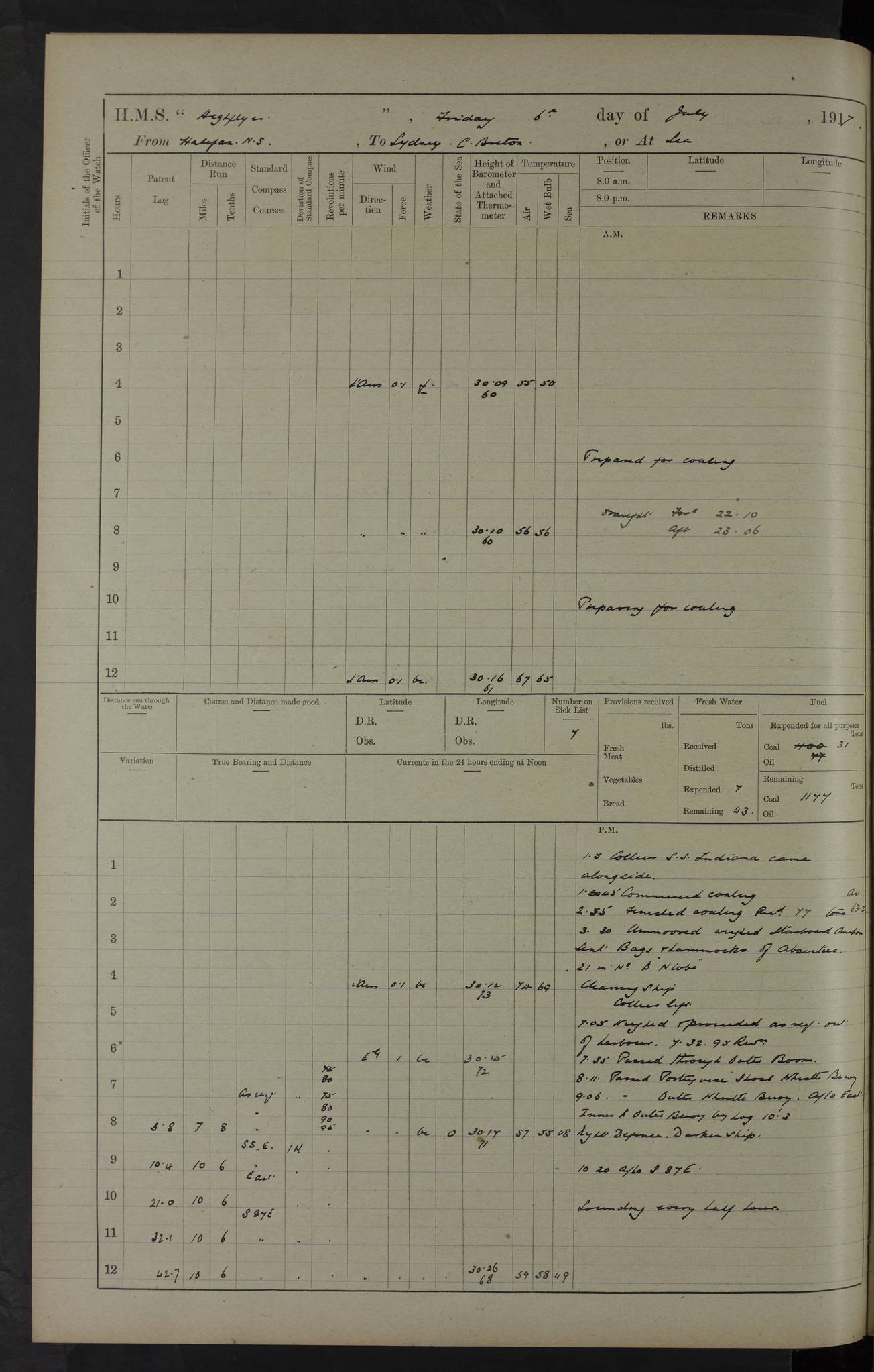 LOGS FOR JANUARY 1917 4ef4f321e53e0a0c91000902: (https://s3.amazonaws.com:443/oldweather/ADM53-44307/ADM 53-44307-129_1.jpg) 4ef4f321e53e0a0c91000903: (https://s3.amazonaws.com:443/oldweather/ADM53-44307/ADM 53-44307-130_0.jpg) 4ef4f321e53e0a0c91000904: (https://s3.amazonaws.com:443/oldweather/ADM53-44307/ADM 53-44307-130_1.jpg) 4ef4f321e53e0a0c91000905: (https://s3.amazonaws.com:443/oldweather/ADM53-44307/ADM 53-44307-131_0.jpg) 4ef4f321e53e0a0c91000906: (https://s3.amazonaws.com:443/oldweather/ADM53-44307/ADM 53-44307-131_1.jpg) 1 January 1917 Sierra Leone Lat 8.5, Long -13.2 6.30am: Party transferring provisions to DONEGAL. 10.00am: Party working on board SS VIRENT dismounting gun. 4ef4f321e53e0a0c91000907: (https://s3.amazonaws.com:443/oldweather/ADM53-44307/ADM 53-44307-132_0.jpg) 2 January 1917 Sierra Leone to St. Vincent Lat 8.7, Long -13.6 6.55am: SS ATLANTIC CITY came alongside. Coaling ship. 9.20am: Weighed and proceeded as requisite out of harbour. 4ef4f321e53e0a0c91000908: (https://s3.amazonaws.com:443/oldweather/ADM53-44307/ADM 53-44307-132_1.jpg) 3 January 1917 Sierra Leone to St. Vincent Lat 11.1, Long -17.7 2.30pm: Sighted SS on P bow steering to SE’d. 4ef4f321e53e0a0c91000909: (https://s3.amazonaws.com:443/oldweather/ADM53-44307/ADM 53-44307-133_0.jpg) 4 January 1917 Sierra Leone to St. Vincent Lat 13.8, Long -21.5 Boys and OS at school and seamanship instruction. Marines at drill. 11.30pm: Passing between St. Jago and Mayo Id. 4ef4f321e53e0a0c9100090a: (https://s3.amazonaws.com:443/oldweather/ADM53-44307/ADM 53-44307-133_1.jpg) 5 January 1917 Sierra Leone to St. Vincent Lat 16.8828, Long -25.0106 6.40am: Sighted San Nicholas Id. abeam. 11.58am: Came to SB 9 fathoms, 4½ shackles. 12.30pm: Lighters came alongside. 2.00pm: Coaling ship. 5.00pm: Stopped coaling for night. 4ef4f321e53e0a0c9100090b: (https://s3.amazonaws.com:443/oldweather/ADM53-44307/ADM 53-44307-134_0.jpg) 6 January 1917 St. Vincent Lat 16.8828, Long -25.0106 6.30am: Coaling ship from lighters. 12.30pm: Finished coaling; received 433 tons including deck cargo. 2.00pm: Prepared for sea. 4ef4f321e53e0a0c9100090c: (https://s3.amazonaws.com:443/oldweather/ADM53-44307/ADM 53-44307-134_1.jpg) 7 January 1917 St. Vincent to rendezvous to meet HMS Shannon and convoy Lat 17.4, Long -25.5 6.35am: Weighed and proceeded as requisite, 100 revs, to southward by San Antonio. 4ef4f321e53e0a0c9100090d: (https://s3.amazonaws.com:443/oldweather/ADM53-44307/ADM 53-44307-135_0.jpg) 8 January 1917 St. Vincent to meet HMS Shannon and convoy Lat 21.2, Long -26.3 9.30am: Party striking down coal. 4ef4f321e53e0a0c9100090e: (https://s3.amazonaws.com:443/oldweather/ADM53-44307/ADM 53-44307-135_1.jpg) 9 January 1917 St. Vincent to meet HMS Shannon and convoy Lat 23.9, Long -25.5 Cleaning ship. 9.00pm: Group closed up exercised during watch. 4ef4f322e53e0a0c9100090f: (https://s3.amazonaws.com:443/oldweather/ADM53-44307/ADM 53-44307-136_0.jpg) 10 January 1917 St. Vincent to meet HMS Shannon and convoy Lat 27.4, Long -25.1 2.00am: Groups closed up, exercised frequently during each watch. 6.30am: Sighted SS on southward beam steering NE’d. 4ef4f322e53e0a0c91000910: (https://s3.amazonaws.com:443/oldweather/ADM53-44307/ADM 53-44307-136_1.jpg) 11 January 1917 St. Vincent to meet HMS Shannon and convoy and to Sierra Leone Lat 29.7, Long -24.7 2.00am: Groups closed up, exercised frequently during each watch. 5.20am: Sighted SHANNON and convoy ahead – CARONIA, EMPRESS OF BRITAIN, WALMER CASTLE, TYNDAREUS, PAKEHA, NESTOR, CORINTHIC. 6.13am: Stopped. Communicated by boat with SHANNON. 6.25am: Course S17W. 115 rev. SHANNON proceeded NE’d., course as requisite to take up station with convoy. [A sketch is included showing the position of the ships. HIGHFLYER is in the middle of the front row with PAKEHA 10 cables to port and WALMER CASTLE 10 cables to starboard. NESTOR, then TYNDAREUS, follow PAKEHA. EMPRESS OF BRITAIN, then CARONIA, follow WALMER CASTLE. CORINTHIC is evenly spaced between TYNDAREUS and CARONIA.] 4ef4f322e53e0a0c91000911: (https://s3.amazonaws.com:443/oldweather/ADM53-44307/ADM 53-44307-137_0.jpg) 12 January 1917 To Sierra Leone with convoy Lat 23.9, Long -26.3 Guns’ crews closed up exercised frequently during day. Boys and OS to school and seamanship instruction. 4ef4f322e53e0a0c91000912: (https://s3.amazonaws.com:443/oldweather/ADM53-44307/ADM 53-44307-137_1.jpg) 13 January 1917 To Sierra Leone with convoy Lat 19.3, Long -28.0 3.57am: 80 rev. to allow TYNDAREUS to remedy engine defect. 4ef4f322e53e0a0c91000913: (https://s3.amazonaws.com:443/oldweather/ADM53-44307/ADM 53-44307-138_0.jpg) 14 January 1917 To Sierra Leone with convoy Lat 14.7, Long -26.9 9.00am: Mustered by Open List. 10.00am: Held Divine Service. 4ef4f322e53e0a0c91000914: (https://s3.amazonaws.com:443/oldweather/ADM53-44307/ADM 53-44307-138_1.jpg) 15 January 1917 To Sierra Leone with convoy Lat 12.3, Long -23.7 Party in stokehold trimming. 4ef4f322e53e0a0c91000915: (https://s3.amazonaws.com:443/oldweather/ADM53-44307/ADM 53-44307-139_0.jpg) 16 January 1917 To Sierra Leone with convoy Lat 10.4, Long -18.1 1.00pm: Hoisted colours half-mast. (Death on board EMPRESS OF BRITAIN.) 4ef4f322e53e0a0c91000916: (https://s3.amazonaws.com:443/oldweather/ADM53-44307/ADM 53-44307-139_1.jpg) 17 January 1917 To Sierra Leone with convoy Lat 8.5, Long -13.2 9.15am: Observed land ahead. Prepared for coaling. 10.40am: Formed single line ahead. 12.30pm: Transports proceeded independently to anchoring berths. 1.12pm: Came to with PB anchor in 10 fathoms, veered to 4 shackles, A3 berth. 5.30pm: SS MANSFIELD came alongside. 4ef4f322e53e0a0c91000917: (https://s3.amazonaws.com:443/oldweather/ADM53-44307/ADM 53-44307-140_0.jpg) 18 January 1917 Sierra Leone Lat 8.5, Long -13.2 6.00am: Commenced coaling. 2.15pm: Finished coaling; received 840 tons. 4ef4f322e53e0a0c91000918: (https://s3.amazonaws.com:443/oldweather/ADM53-44307/ADM 53-44307-140_1.jpg) 19 January 1917 Sierra Leone Lat 8.5, 