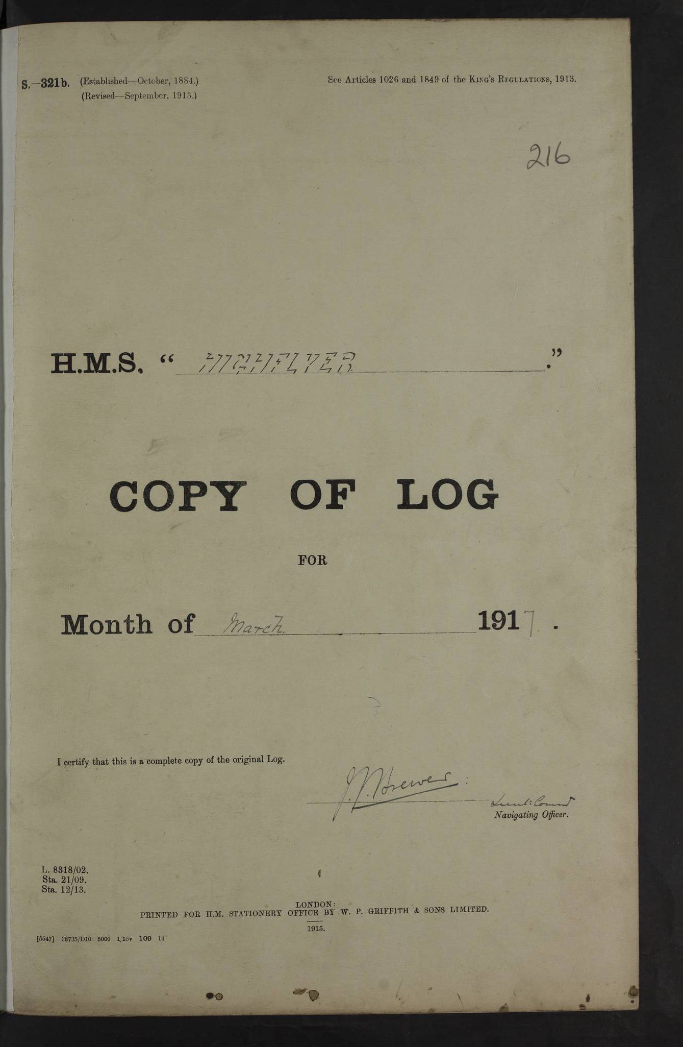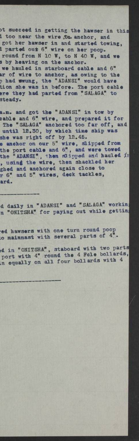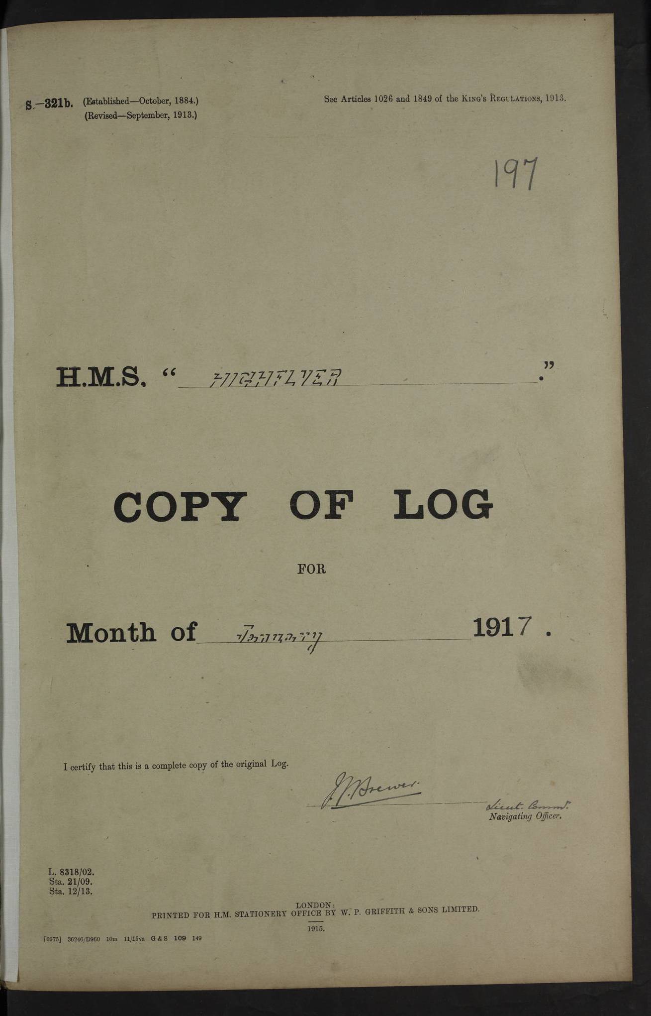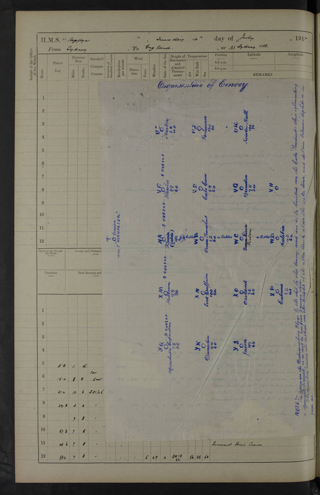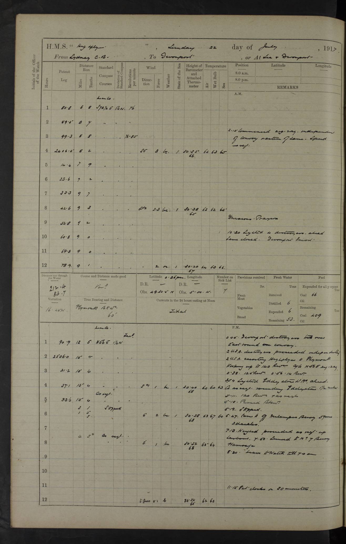 LOGS FOR JANUARY 1917 4ef4f321e53e0a0c91000902: (https://s3.amazonaws.com:443/oldweather/ADM53-44307/ADM 53-44307-129_1.jpg) 4ef4f321e53e0a0c91000903: (https://s3.amazonaws.com:443/oldweather/ADM53-44307/ADM 53-44307-130_0.jpg) 4ef4f321e53e0a0c91000904: (https://s3.amazonaws.com:443/oldweather/ADM53-44307/ADM 53-44307-130_1.jpg) 4ef4f321e53e0a0c91000905: (https://s3.amazonaws.com:443/oldweather/ADM53-44307/ADM 53-44307-131_0.jpg) 4ef4f321e53e0a0c91000906: (https://s3.amazonaws.com:443/oldweather/ADM53-44307/ADM 53-44307-131_1.jpg) 1 January 1917 Sierra Leone Lat 8.5, Long -13.2 6.30am: Party transferring provisions to DONEGAL. 10.00am: Party working on board SS VIRENT dismounting gun. 4ef4f321e53e0a0c91000907: (https://s3.amazonaws.com:443/oldweather/ADM53-44307/ADM 53-44307-132_0.jpg) 2 January 1917 Sierra Leone to St. Vincent Lat 8.7, Long -13.6 6.55am: SS ATLANTIC CITY came alongside. Coaling ship. 9.20am: Weighed and proceeded as requisite out of harbour. 4ef4f321e53e0a0c91000908: (https://s3.amazonaws.com:443/oldweather/ADM53-44307/ADM 53-44307-132_1.jpg) 3 January 1917 Sierra Leone to St. Vincent Lat 11.1, Long -17.7 2.30pm: Sighted SS on P bow steering to SE’d. 4ef4f321e53e0a0c91000909: (https://s3.amazonaws.com:443/oldweather/ADM53-44307/ADM 53-44307-133_0.jpg) 4 January 1917 Sierra Leone to St. Vincent Lat 13.8, Long -21.5 Boys and OS at school and seamanship instruction. Marines at drill. 11.30pm: Passing between St. Jago and Mayo Id. 4ef4f321e53e0a0c9100090a: (https://s3.amazonaws.com:443/oldweather/ADM53-44307/ADM 53-44307-133_1.jpg) 5 January 1917 Sierra Leone to St. Vincent Lat 16.8828, Long -25.0106 6.40am: Sighted San Nicholas Id. abeam. 11.58am: Came to SB 9 fathoms, 4½ shackles. 12.30pm: Lighters came alongside. 2.00pm: Coaling ship. 5.00pm: Stopped coaling for night. 4ef4f321e53e0a0c9100090b: (https://s3.amazonaws.com:443/oldweather/ADM53-44307/ADM 53-44307-134_0.jpg) 6 January 1917 St. Vincent Lat 16.8828, Long -25.0106 6.30am: Coaling ship from lighters. 12.30pm: Finished coaling; received 433 tons including deck cargo. 2.00pm: Prepared for sea. 4ef4f321e53e0a0c9100090c: (https://s3.amazonaws.com:443/oldweather/ADM53-44307/ADM 53-44307-134_1.jpg) 7 January 1917 St. Vincent to rendezvous to meet HMS Shannon and convoy Lat 17.4, Long -25.5 6.35am: Weighed and proceeded as requisite, 100 revs, to southward by San Antonio. 4ef4f321e53e0a0c9100090d: (https://s3.amazonaws.com:443/oldweather/ADM53-44307/ADM 53-44307-135_0.jpg) 8 January 1917 St. Vincent to meet HMS Shannon and convoy Lat 21.2, Long -26.3 9.30am: Party striking down coal. 4ef4f321e53e0a0c9100090e: (https://s3.amazonaws.com:443/oldweather/ADM53-44307/ADM 53-44307-135_1.jpg) 9 January 1917 St. Vincent to meet HMS Shannon and convoy Lat 23.9, Long -25.5 Cleaning ship. 9.00pm: Group closed up exercised during watch. 4ef4f322e53e0a0c9100090f: (https://s3.amazonaws.com:443/oldweather/ADM53-44307/ADM 53-44307-136_0.jpg) 10 January 1917 St. Vincent to meet HMS Shannon and convoy Lat 27.4, Long -25.1 2.00am: Groups closed up, exercised frequently during each watch. 6.30am: Sighted SS on southward beam steering NE’d. 4ef4f322e53e0a0c91000910: (https://s3.amazonaws.com:443/oldweather/ADM53-44307/ADM 53-44307-136_1.jpg) 11 January 1917 St. Vincent to meet HMS Shannon and convoy and to Sierra Leone Lat 29.7, Long -24.7 2.00am: Groups closed up, exercised frequently during each watch. 5.20am: Sighted SHANNON and convoy ahead – CARONIA, EMPRESS OF BRITAIN, WALMER CASTLE, TYNDAREUS, PAKEHA, NESTOR, CORINTHIC. 6.13am: Stopped. Communicated by boat with SHANNON. 6.25am: Course S17W. 115 rev. SHANNON proceeded NE’d., course as requisite to take up station with convoy. [A sketch is included showing the position of the ships. HIGHFLYER is in the middle of the front row with PAKEHA 10 cables to port and WALMER CASTLE 10 cables to starboard. NESTOR, then TYNDAREUS, follow PAKEHA. EMPRESS OF BRITAIN, then CARONIA, follow WALMER CASTLE. CORINTHIC is evenly spaced between TYNDAREUS and CARONIA.] 4ef4f322e53e0a0c91000911: (https://s3.amazonaws.com:443/oldweather/ADM53-44307/ADM 53-44307-137_0.jpg) 12 January 1917 To Sierra Leone with convoy Lat 23.9, Long -26.3 Guns’ crews closed up exercised frequently during day. Boys and OS to school and seamanship instruction. 4ef4f322e53e0a0c91000912: (https://s3.amazonaws.com:443/oldweather/ADM53-44307/ADM 53-44307-137_1.jpg) 13 January 1917 To Sierra Leone with convoy Lat 19.3, Long -28.0 3.57am: 80 rev. to allow TYNDAREUS to remedy engine defect. 4ef4f322e53e0a0c91000913: (https://s3.amazonaws.com:443/oldweather/ADM53-44307/ADM 53-44307-138_0.jpg) 14 January 1917 To Sierra Leone with convoy Lat 14.7, Long -26.9 9.00am: Mustered by Open List. 10.00am: Held Divine Service. 4ef4f322e53e0a0c91000914: (https://s3.amazonaws.com:443/oldweather/ADM53-44307/ADM 53-44307-138_1.jpg) 15 January 1917 To Sierra Leone with convoy Lat 12.3, Long -23.7 Party in stokehold trimming. 4ef4f322e53e0a0c91000915: (https://s3.amazonaws.com:443/oldweather/ADM53-44307/ADM 53-44307-139_0.jpg) 16 January 1917 To Sierra Leone with convoy Lat 10.4, Long -18.1 1.00pm: Hoisted colours half-mast. (Death on board EMPRESS OF BRITAIN.) 4ef4f322e53e0a0c91000916: (https://s3.amazonaws.com:443/oldweather/ADM53-44307/ADM 53-44307-139_1.jpg) 17 January 1917 To Sierra Leone with convoy Lat 8.5, Long -13.2 9.15am: Observed land ahead. Prepared for coaling. 10.40am: Formed single line ahead. 12.30pm: Transports proceeded independently to anchoring berths. 1.12pm: Came to with PB anchor in 10 fathoms, veered to 4 shackles, A3 berth. 5.30pm: SS MANSFIELD came alongside. 4ef4f322e53e0a0c91000917: (https://s3.amazonaws.com:443/oldweather/ADM53-44307/ADM 53-44307-140_0.jpg) 18 January 1917 Sierra Leone Lat 8.5, Long -13.2 6.00am: Commenced coaling. 2.15pm: Finished coaling; received 840 tons. 4ef4f322e53e0a0c91000918: (https://s3.amazonaws.com:443/oldweather/ADM53-44307/ADM 53-44307-140_1.jpg) 19 January 1917 Sierra Leone Lat 8.5, 