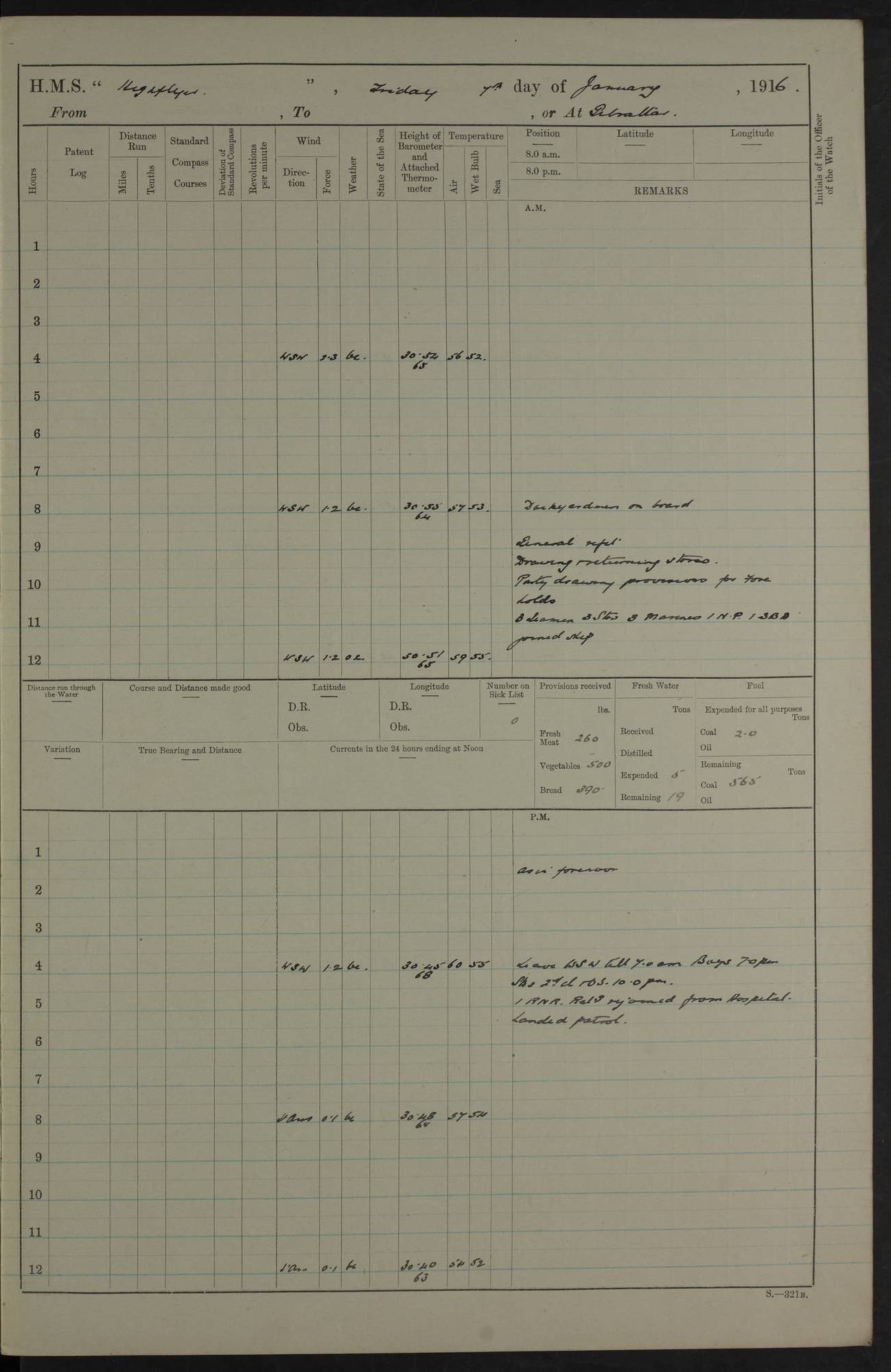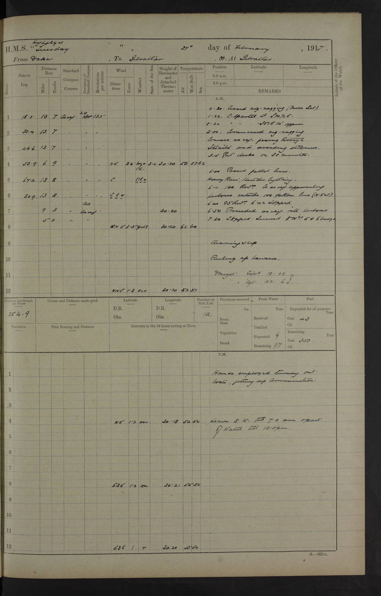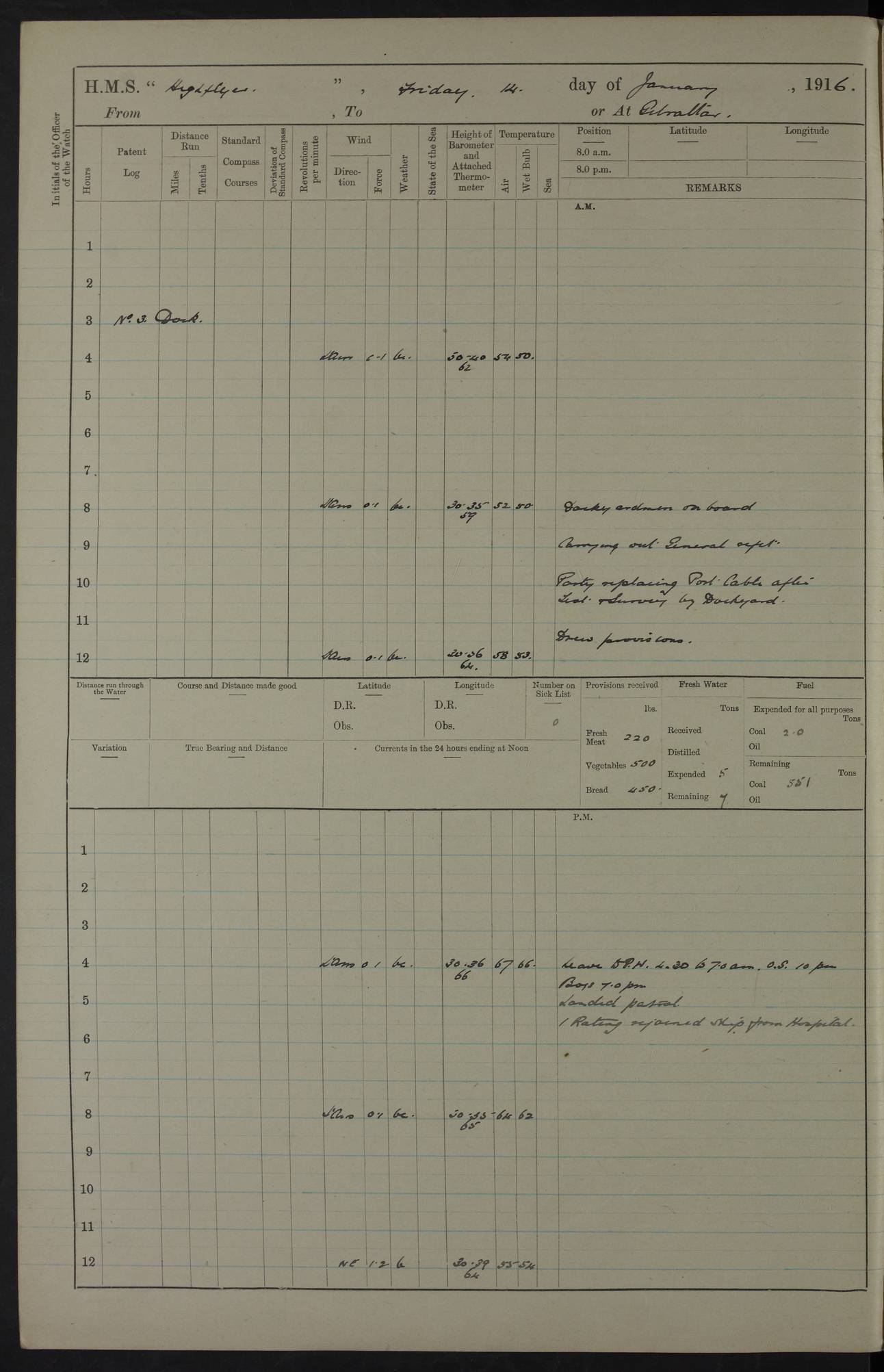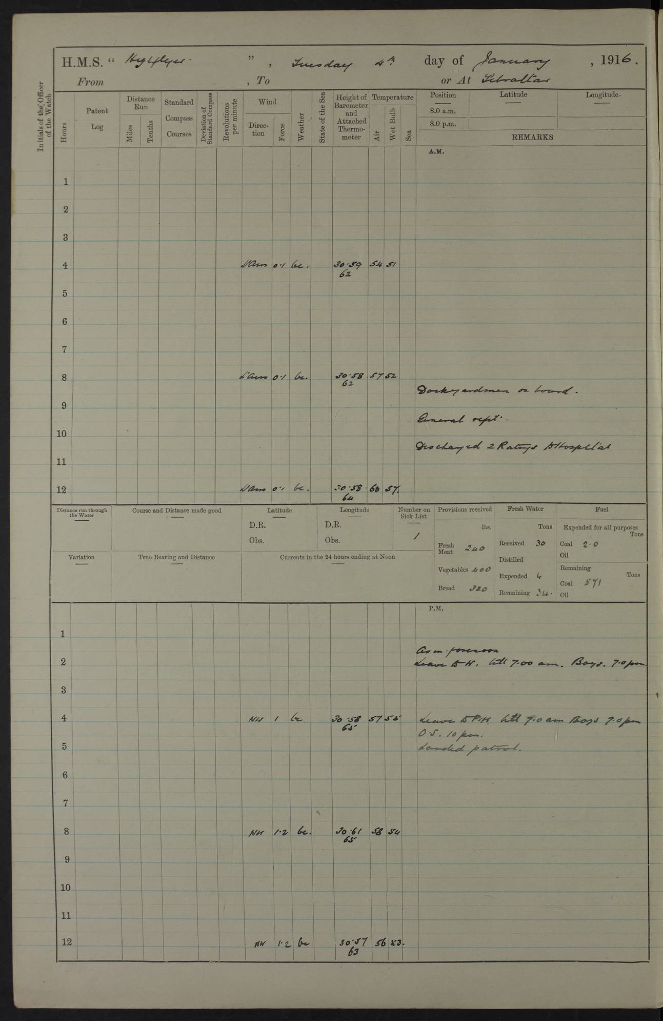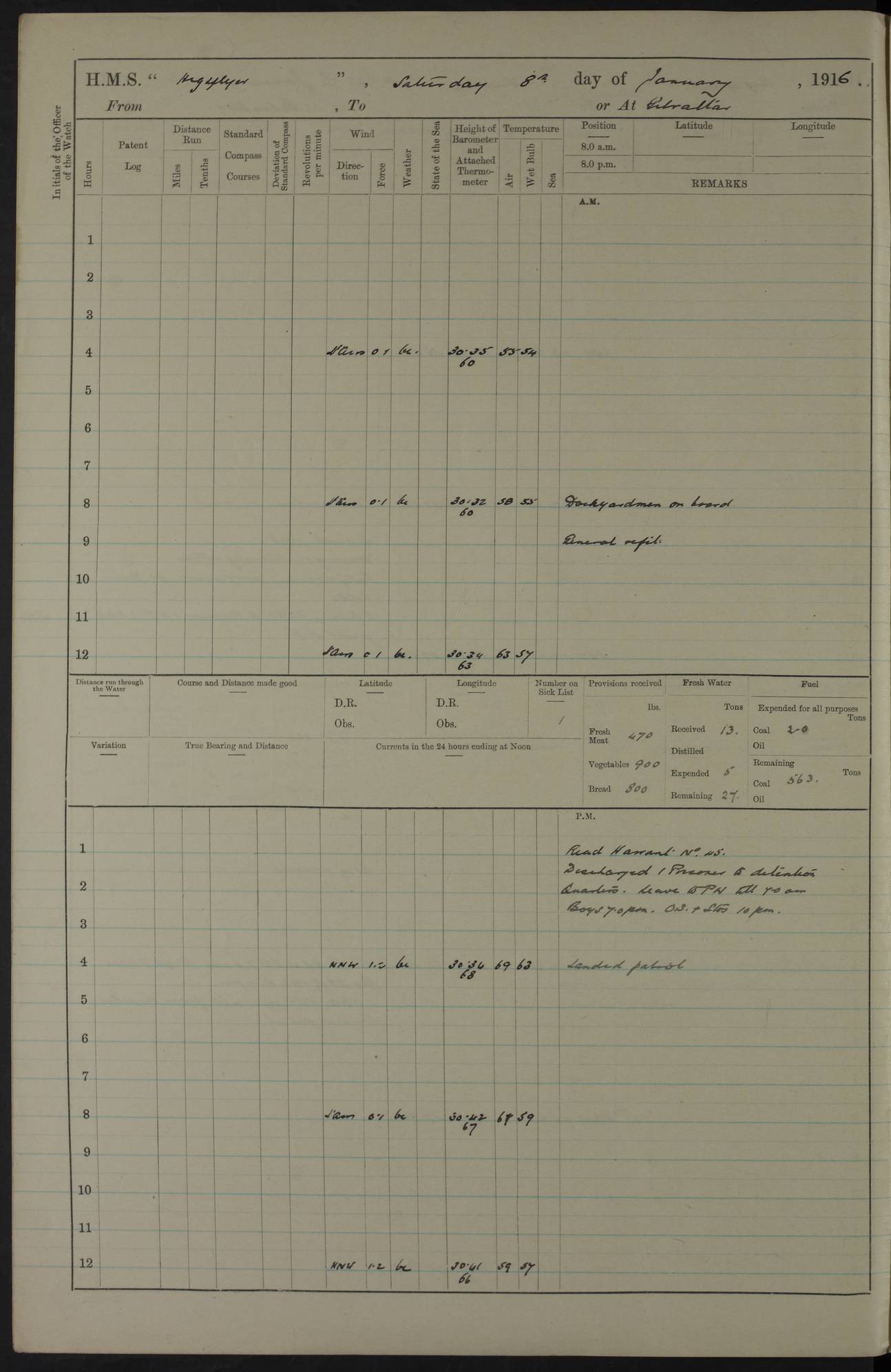 LOGS FOR JANUARY 1916 4f96113fa2fc8e2def000829: (http://s3.amazonaws.com/oldweather/ADM53-44302/ADM 53-44302-001_0.jpg) 4f961140a2fc8e2def00082a: (http://s3.amazonaws.com/oldweather/ADM53-44302/ADM 53-44302-001_1.jpg) 4f961140a2fc8e2def00082b: (http://s3.amazonaws.com/oldweather/ADM53-44302/ADM 53-44302-002_0.jpg) 4f961140a2fc8e2def00082c: (http://s3.amazonaws.com/oldweather/ADM53-44302/ADM 53-44302-002_1.jpg) 4f961141a2fc8e2def00082d: (http://s3.amazonaws.com/oldweather/ADM53-44302/ADM 53-44302-003_0.jpg) 4f961141a2fc8e2def00082e: (http://s3.amazonaws.com/oldweather/ADM53-44302/ADM 53-44302-003_1.jpg) 4f961141a2fc8e2def00082f: (http://s3.amazonaws.com/oldweather/ADM53-44302/ADM 53-44302-004_0.jpg) 4f961142a2fc8e2def000830: (http://s3.amazonaws.com/oldweather/ADM53-44302/ADM 53-44302-004_1.jpg) 4f961142a2fc8e2def000831: (http://s3.amazonaws.com/oldweather/ADM53-44302/ADM 53-44302-005_0.jpg) 4f961142a2fc8e2def000832: (http://s3.amazonaws.com/oldweather/ADM53-44302/ADM 53-44302-005_1.jpg) 1 January 1916 Gibraltar Lat 36.1, Long -5.3 9.00am: Dockyardmen on board. 5.30pm: Mr. Ritchie, Artificer Engineer joined ship. 4f961143a2fc8e2def000833: (http://s3.amazonaws.com/oldweather/ADM53-44302/ADM 53-44302-006_0.jpg) 2 January 1916 Gibraltar Lat 36.1, Long -5.3 9.30am: Landed church parties. 4f961143a2fc8e2def000834: (http://s3.amazonaws.com/oldweather/ADM53-44302/ADM 53-44302-006_1.jpg) 3 January 1916 Gibraltar Lat 36.1, Long -5.3 11.00am: Replaced topmasts. 1.00pm: Commander Casement discharged to hospital. 4f961143a2fc8e2def000835: (http://s3.amazonaws.com/oldweather/ADM53-44302/ADM 53-44302-007_0.jpg) 4 January 1916 Gibraltar Lat 36.1, Long -5.3 General refit. 10.30am: Discharged 2 Ratings to hospital. 4f961144a2fc8e2def000836: (http://s3.amazonaws.com/oldweather/ADM53-44302/ADM 53-44302-007_1.jpg) 5 January 1916 Gibraltar Lat 36.1, Long -5.3 7.30am: Dockyardmen on board. 9.00am: Discharged one Rating to hospital. 4f961144a2fc8e2def000837: (http://s3.amazonaws.com/oldweather/ADM53-44302/ADM 53-44302-008_0.jpg) 6 January 1916 Gibraltar Lat 36.1, Long -5.3 10.00am: Returning and drawing stores. 4f961144a2fc8e2def000838: (http://s3.amazonaws.com/oldweather/ADM53-44302/ADM 53-44302-008_1.jpg) 7 January 1916 Gibraltar Lat 36.1, Long -5.3 10.00am: Party drawing provisions for fore holds. 11.00am: 3 Seamen, 3 Stokers, 3 Marines, 1 NP, 1 SBS joined ship. 4f961145a2fc8e2def000839: (http://s3.amazonaws.com/oldweather/ADM53-44302/ADM 53-44302-009_0.jpg) 8 January 1916 Gibraltar Lat 36.1, Long -5.3 1.30pm: Discharged 1 prisoner to detention quarter. 4f961145a2fc8e2def00083a: (http://s3.amazonaws.com/oldweather/ADM53-44302/ADM 53-44302-009_1.jpg) 9 January 1916 Gibraltar Lat 36.1, Long -5.3 10.00am: Captain presented Persian Gulf Gen. Service Medals to Mr. Ward, Artificer Engineer, and 5 Ratings. 4f961145a2fc8e2def00083b: (http://s3.amazonaws.com/oldweather/ADM53-44302/ADM 53-44302-010_0.jpg) 10 January 1916 Gibraltar Lat 36.1, Long -5.3 5.00pm: Discharged Mr. Ward Art Eng, 1 Ch. SBS, 1 RNR, 3 Marines, 2 POI., 3 Stoker, 1 Marine to HMS TERRIBLE for passage home. 4f961146a2fc8e2def00083c: (http://s3.amazonaws.com/oldweather/ADM53-44302/ADM 53-44302-010_1.jpg) 11 January 1916 Gibraltar Lat 36.1, Long -5.3 9.00am: Carrying out general refit. 10.00am: Replaced starboard cable after cleaning and testing (carried out by Dockyard). 4f961146a2fc8e2def00083d: (http://s3.amazonaws.com/oldweather/ADM53-44302/ADM 53-44302-011_0.jpg) 12 January 1916 Gibraltar Lat 36.1, Long -5.3 Carrying out general refit. 4f961146a2fc8e2def00083e: (http://s3.amazonaws.com/oldweather/ADM53-44302/ADM 53-44302-011_1.jpg) 13 January 1916 Gibraltar Lat 36.1, Long -5.3 Carrying out general refit. 10.00am: Marines landed for drill. 4f961147a2fc8e2def00083f: (http://s3.amazonaws.com/oldweather/ADM53-44302/ADM 53-44302-012_0.jpg) 14 January 1916 Gibraltar Lat 36.1, Long -5.3 10.00am: Party replacing port cable after test and survey by Dockyard. 4f961147a2fc8e2def000840: (http://s3.amazonaws.com/oldweather/ADM53-44302/ADM 53-44302-012_1.jpg) 15 January 1916 Gibraltar Lat 36.1, Long -5.3 9.00am: Carrying out general refit. Party working about cable. 4f961147a2fc8e2def000841: (http://s3.amazonaws.com/oldweather/ADM53-44302/ADM 53-44302-013_0.jpg) 16 January 1916 Gibraltar Lat 36.1, Long -5.3 9.00am: Landed church parties. 4f961148a2fc8e2def000842: (http://s3.amazonaws.com/oldweather/ADM53-44302/ADM 53-44302-013_1.jpg) 17 January 1916 Gibraltar Lat 36.1, Long -5.3 1.00pm: 42 Ratings left ship for passage to England. 4f961148a2fc8e2def000843: (http://s3.amazonaws.com/oldweather/ADM53-44302/ADM 53-44302-014_0.jpg) 18 January 1916 Gibraltar Lat 36.1, Long -5.3 10.00am: Party drawing torpedoes. 3.00pm: Partially flooded dock. 4f961148a2fc8e2def000844: (http://s3.amazonaws.com/oldweather/ADM53-44302/ADM 53-44302-014_1.jpg) 19 January 1916 Gibraltar Lat 36.1, Long -5.3 8.30am: Flooded dock. 9.00am: Shifted berth to No 5 billet S Mole. 4f961149a2fc8e2def000845: (http://s3.amazonaws.com/oldweather/ADM53-44302/ADM 53-44302-015_0.jpg) 20 January 1916 Gibraltar Lat 36.1, Long -5.3 10.30am: Marines landed for drill. 11.00am: Drawing Engineers’ stores. 4f961149a2fc8e2def000846: (http://s3.amazonaws.com/oldweather/ADM53-44302/ADM 53-44302-015_1.jpg) 21 January 1916 Gibraltar Lat 36.1, Long -5.3 9.00am: Ammunitioning ship. 4f961149a2fc8e2def000847: (http://s3.amazonaws.com/oldweather/ADM53-44302/ADM 53-44302-016_0.jpg) 22 January 1916 Gibraltar Lat 36.1, Long -5.3 9.00am: Ammunitioning ship. 1.30pm: One Marine discharged to Detention Quarters. 4f96114aa2fc8e2def000848: (http://s3.amazonaws.com/oldweather/ADM53-44302/ADM 53-44302-016_1.jpg) 23 January 1916 Gibraltar Lat 36.1, Long -5.3 9.00am: Landed church parties. 4f96114aa2fc8e2def000849: (http://s3.amazonaws.com/oldweather/ADM53-44302/ADM 53-44302-017_0.jpg) 24 January 1916 Gibraltar Lat 36.1, Long -5.3 7.30am: Commenced coaling. Dockyard labour shore party. 1.30pm: Finished coaling; received 565 tons. 2.0