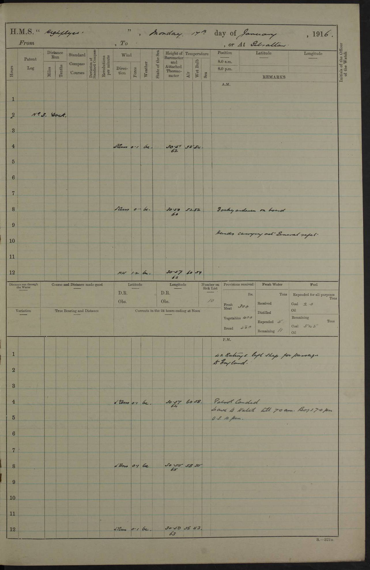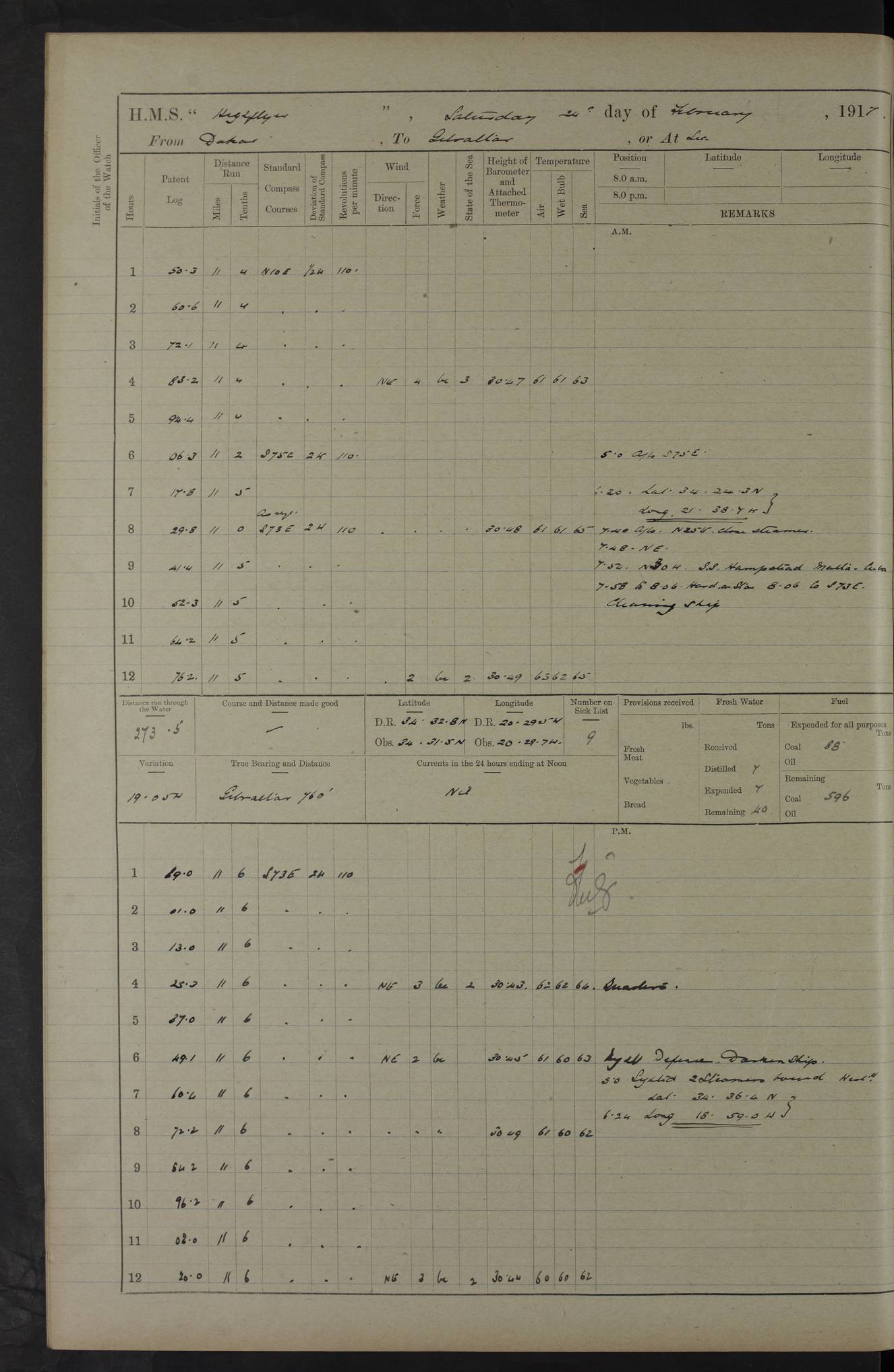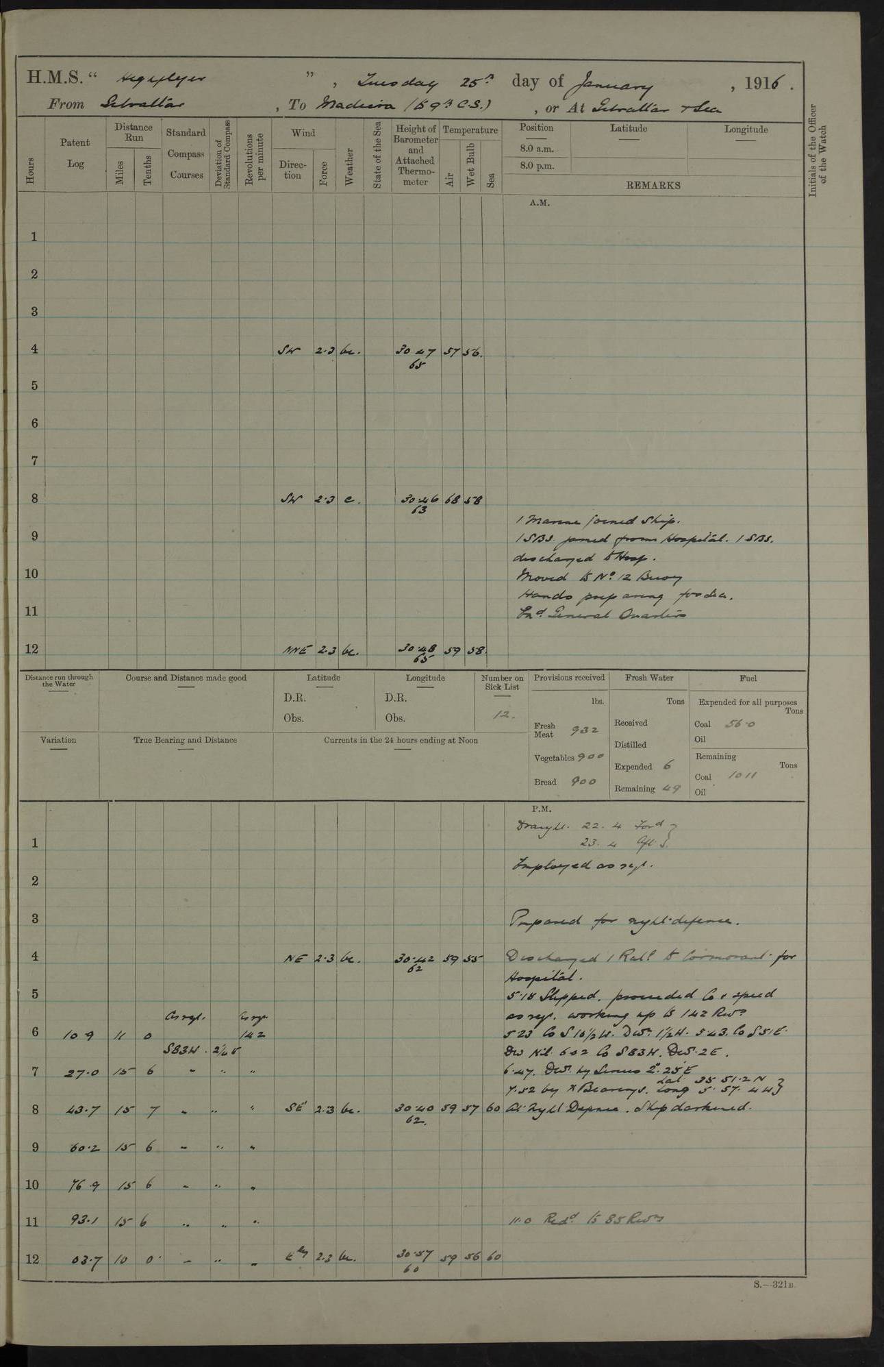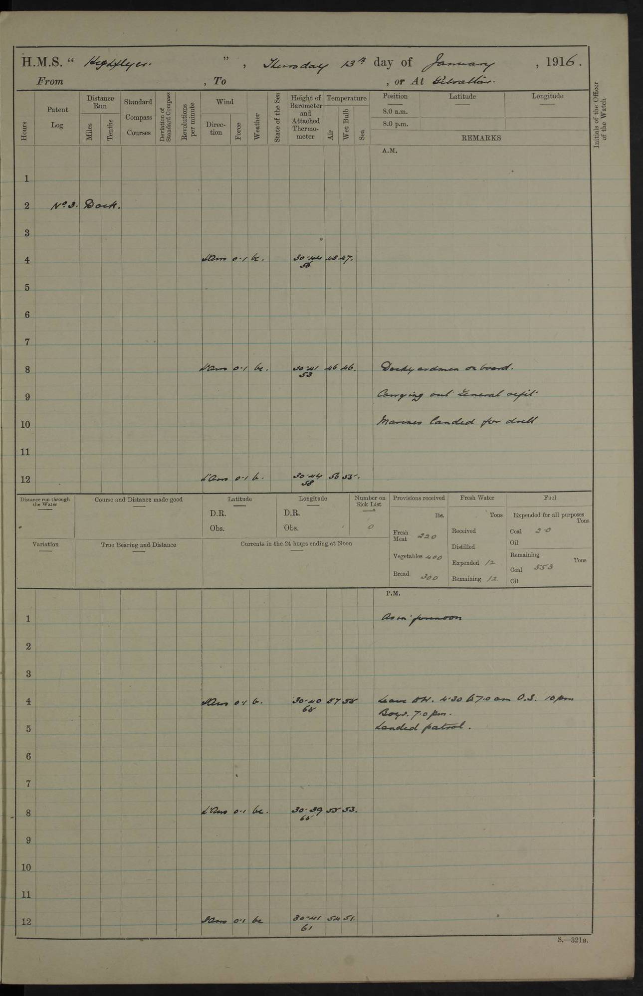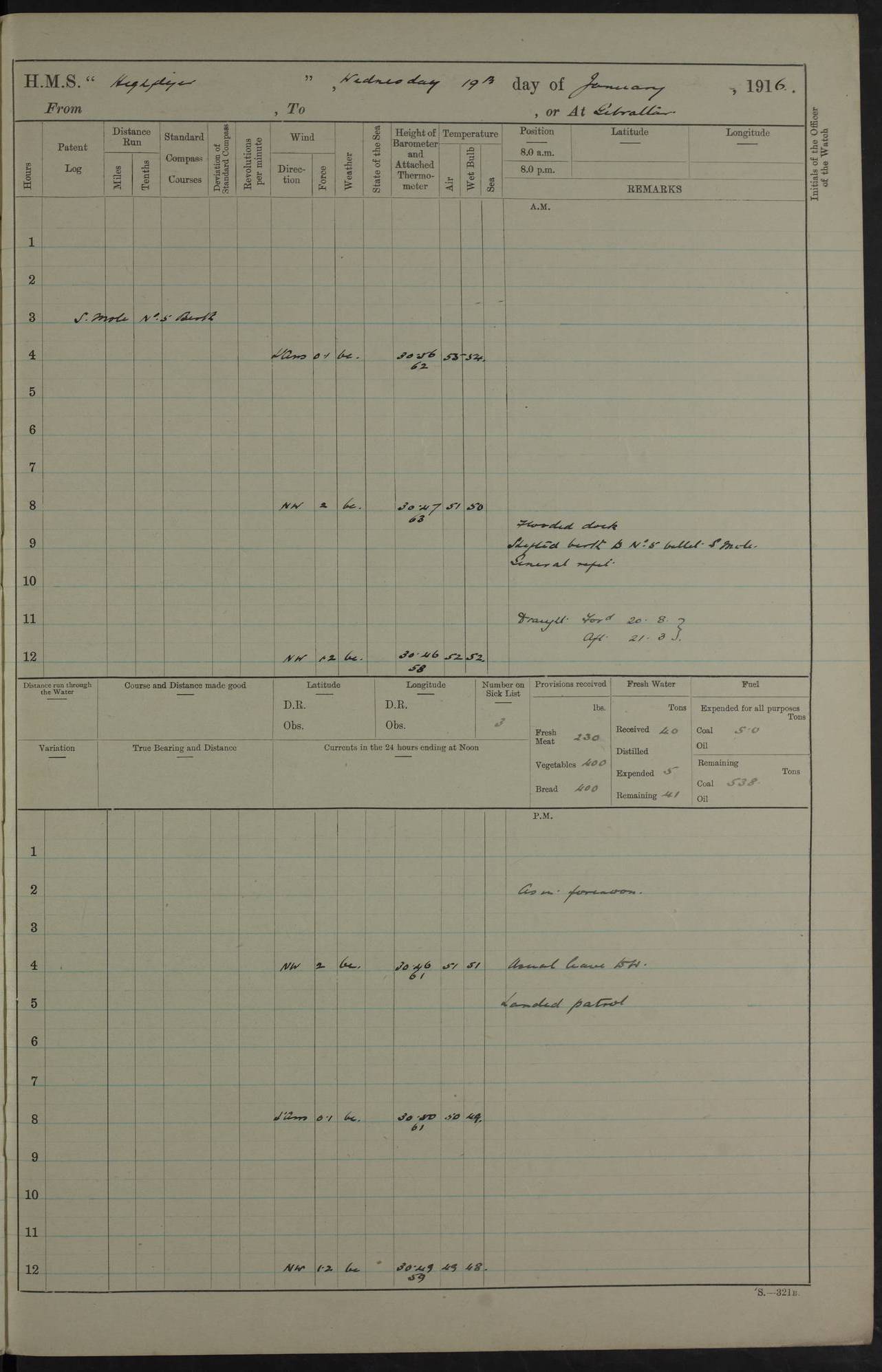 LOGS FOR JANUARY 1916 4f96113fa2fc8e2def000829: (http://s3.amazonaws.com/oldweather/ADM53-44302/ADM 53-44302-001_0.jpg) 4f961140a2fc8e2def00082a: (http://s3.amazonaws.com/oldweather/ADM53-44302/ADM 53-44302-001_1.jpg) 4f961140a2fc8e2def00082b: (http://s3.amazonaws.com/oldweather/ADM53-44302/ADM 53-44302-002_0.jpg) 4f961140a2fc8e2def00082c: (http://s3.amazonaws.com/oldweather/ADM53-44302/ADM 53-44302-002_1.jpg) 4f961141a2fc8e2def00082d: (http://s3.amazonaws.com/oldweather/ADM53-44302/ADM 53-44302-003_0.jpg) 4f961141a2fc8e2def00082e: (http://s3.amazonaws.com/oldweather/ADM53-44302/ADM 53-44302-003_1.jpg) 4f961141a2fc8e2def00082f: (http://s3.amazonaws.com/oldweather/ADM53-44302/ADM 53-44302-004_0.jpg) 4f961142a2fc8e2def000830: (http://s3.amazonaws.com/oldweather/ADM53-44302/ADM 53-44302-004_1.jpg) 4f961142a2fc8e2def000831: (http://s3.amazonaws.com/oldweather/ADM53-44302/ADM 53-44302-005_0.jpg) 4f961142a2fc8e2def000832: (http://s3.amazonaws.com/oldweather/ADM53-44302/ADM 53-44302-005_1.jpg) 1 January 1916 Gibraltar Lat 36.1, Long -5.3 9.00am: Dockyardmen on board. 5.30pm: Mr. Ritchie, Artificer Engineer joined ship. 4f961143a2fc8e2def000833: (http://s3.amazonaws.com/oldweather/ADM53-44302/ADM 53-44302-006_0.jpg) 2 January 1916 Gibraltar Lat 36.1, Long -5.3 9.30am: Landed church parties. 4f961143a2fc8e2def000834: (http://s3.amazonaws.com/oldweather/ADM53-44302/ADM 53-44302-006_1.jpg) 3 January 1916 Gibraltar Lat 36.1, Long -5.3 11.00am: Replaced topmasts. 1.00pm: Commander Casement discharged to hospital. 4f961143a2fc8e2def000835: (http://s3.amazonaws.com/oldweather/ADM53-44302/ADM 53-44302-007_0.jpg) 4 January 1916 Gibraltar Lat 36.1, Long -5.3 General refit. 10.30am: Discharged 2 Ratings to hospital. 4f961144a2fc8e2def000836: (http://s3.amazonaws.com/oldweather/ADM53-44302/ADM 53-44302-007_1.jpg) 5 January 1916 Gibraltar Lat 36.1, Long -5.3 7.30am: Dockyardmen on board. 9.00am: Discharged one Rating to hospital. 4f961144a2fc8e2def000837: (http://s3.amazonaws.com/oldweather/ADM53-44302/ADM 53-44302-008_0.jpg) 6 January 1916 Gibraltar Lat 36.1, Long -5.3 10.00am: Returning and drawing stores. 4f961144a2fc8e2def000838: (http://s3.amazonaws.com/oldweather/ADM53-44302/ADM 53-44302-008_1.jpg) 7 January 1916 Gibraltar Lat 36.1, Long -5.3 10.00am: Party drawing provisions for fore holds. 11.00am: 3 Seamen, 3 Stokers, 3 Marines, 1 NP, 1 SBS joined ship. 4f961145a2fc8e2def000839: (http://s3.amazonaws.com/oldweather/ADM53-44302/ADM 53-44302-009_0.jpg) 8 January 1916 Gibraltar Lat 36.1, Long -5.3 1.30pm: Discharged 1 prisoner to detention quarter. 4f961145a2fc8e2def00083a: (http://s3.amazonaws.com/oldweather/ADM53-44302/ADM 53-44302-009_1.jpg) 9 January 1916 Gibraltar Lat 36.1, Long -5.3 10.00am: Captain presented Persian Gulf Gen. Service Medals to Mr. Ward, Artificer Engineer, and 5 Ratings. 4f961145a2fc8e2def00083b: (http://s3.amazonaws.com/oldweather/ADM53-44302/ADM 53-44302-010_0.jpg) 10 January 1916 Gibraltar Lat 36.1, Long -5.3 5.00pm: Discharged Mr. Ward Art Eng, 1 Ch. SBS, 1 RNR, 3 Marines, 2 POI., 3 Stoker, 1 Marine to HMS TERRIBLE for passage home. 4f961146a2fc8e2def00083c: (http://s3.amazonaws.com/oldweather/ADM53-44302/ADM 53-44302-010_1.jpg) 11 January 1916 Gibraltar Lat 36.1, Long -5.3 9.00am: Carrying out general refit. 10.00am: Replaced starboard cable after cleaning and testing (carried out by Dockyard). 4f961146a2fc8e2def00083d: (http://s3.amazonaws.com/oldweather/ADM53-44302/ADM 53-44302-011_0.jpg) 12 January 1916 Gibraltar Lat 36.1, Long -5.3 Carrying out general refit. 4f961146a2fc8e2def00083e: (http://s3.amazonaws.com/oldweather/ADM53-44302/ADM 53-44302-011_1.jpg) 13 January 1916 Gibraltar Lat 36.1, Long -5.3 Carrying out general refit. 10.00am: Marines landed for drill. 4f961147a2fc8e2def00083f: (http://s3.amazonaws.com/oldweather/ADM53-44302/ADM 53-44302-012_0.jpg) 14 January 1916 Gibraltar Lat 36.1, Long -5.3 10.00am: Party replacing port cable after test and survey by Dockyard. 4f961147a2fc8e2def000840: (http://s3.amazonaws.com/oldweather/ADM53-44302/ADM 53-44302-012_1.jpg) 15 January 1916 Gibraltar Lat 36.1, Long -5.3 9.00am: Carrying out general refit. Party working about cable. 4f961147a2fc8e2def000841: (http://s3.amazonaws.com/oldweather/ADM53-44302/ADM 53-44302-013_0.jpg) 16 January 1916 Gibraltar Lat 36.1, Long -5.3 9.00am: Landed church parties. 4f961148a2fc8e2def000842: (http://s3.amazonaws.com/oldweather/ADM53-44302/ADM 53-44302-013_1.jpg) 17 January 1916 Gibraltar Lat 36.1, Long -5.3 1.00pm: 42 Ratings left ship for passage to England. 4f961148a2fc8e2def000843: (http://s3.amazonaws.com/oldweather/ADM53-44302/ADM 53-44302-014_0.jpg) 18 January 1916 Gibraltar Lat 36.1, Long -5.3 10.00am: Party drawing torpedoes. 3.00pm: Partially flooded dock. 4f961148a2fc8e2def000844: (http://s3.amazonaws.com/oldweather/ADM53-44302/ADM 53-44302-014_1.jpg) 19 January 1916 Gibraltar Lat 36.1, Long -5.3 8.30am: Flooded dock. 9.00am: Shifted berth to No 5 billet S Mole. 4f961149a2fc8e2def000845: (http://s3.amazonaws.com/oldweather/ADM53-44302/ADM 53-44302-015_0.jpg) 20 January 1916 Gibraltar Lat 36.1, Long -5.3 10.30am: Marines landed for drill. 11.00am: Drawing Engineers’ stores. 4f961149a2fc8e2def000846: (http://s3.amazonaws.com/oldweather/ADM53-44302/ADM 53-44302-015_1.jpg) 21 January 1916 Gibraltar Lat 36.1, Long -5.3 9.00am: Ammunitioning ship. 4f961149a2fc8e2def000847: (http://s3.amazonaws.com/oldweather/ADM53-44302/ADM 53-44302-016_0.jpg) 22 January 1916 Gibraltar Lat 36.1, Long -5.3 9.00am: Ammunitioning ship. 1.30pm: One Marine discharged to Detention Quarters. 4f96114aa2fc8e2def000848: (http://s3.amazonaws.com/oldweather/ADM53-44302/ADM 53-44302-016_1.jpg) 23 January 1916 Gibraltar Lat 36.1, Long -5.3 9.00am: Landed church parties. 4f96114aa2fc8e2def000849: (http://s3.amazonaws.com/oldweather/ADM53-44302/ADM 53-44302-017_0.jpg) 24 January 1916 Gibraltar Lat 36.1, Long -5.3 7.30am: Commenced coaling. Dockyard labour shore party. 1.30pm: Finished coaling; received 565 tons. 2.0