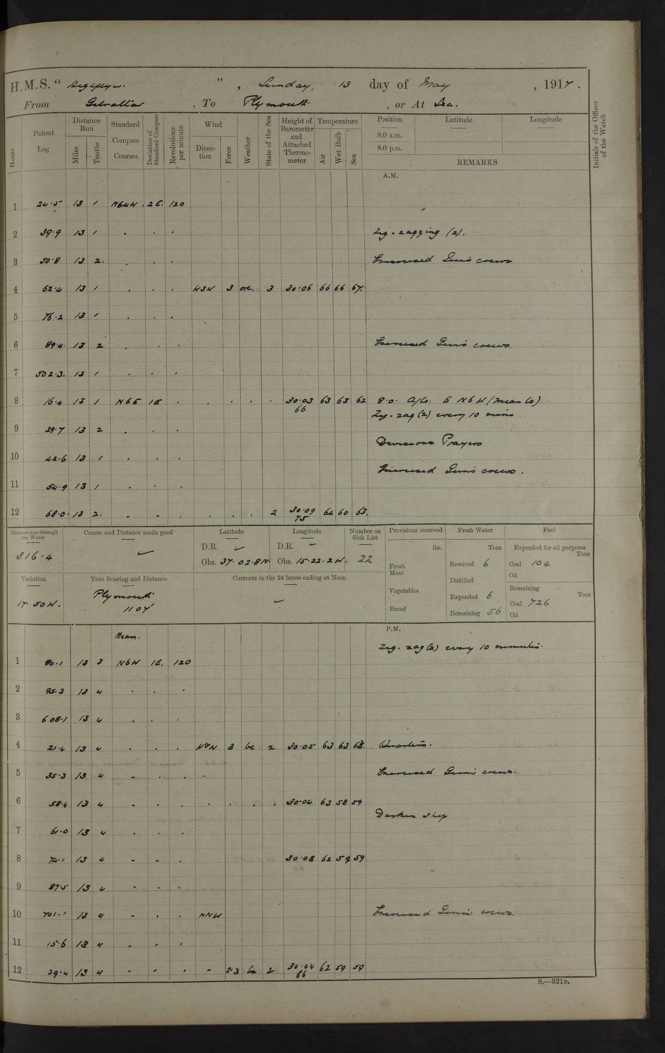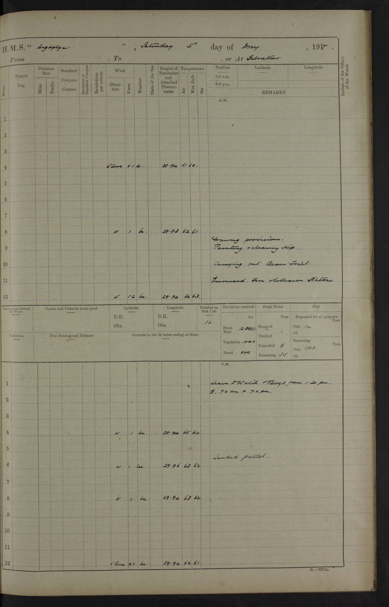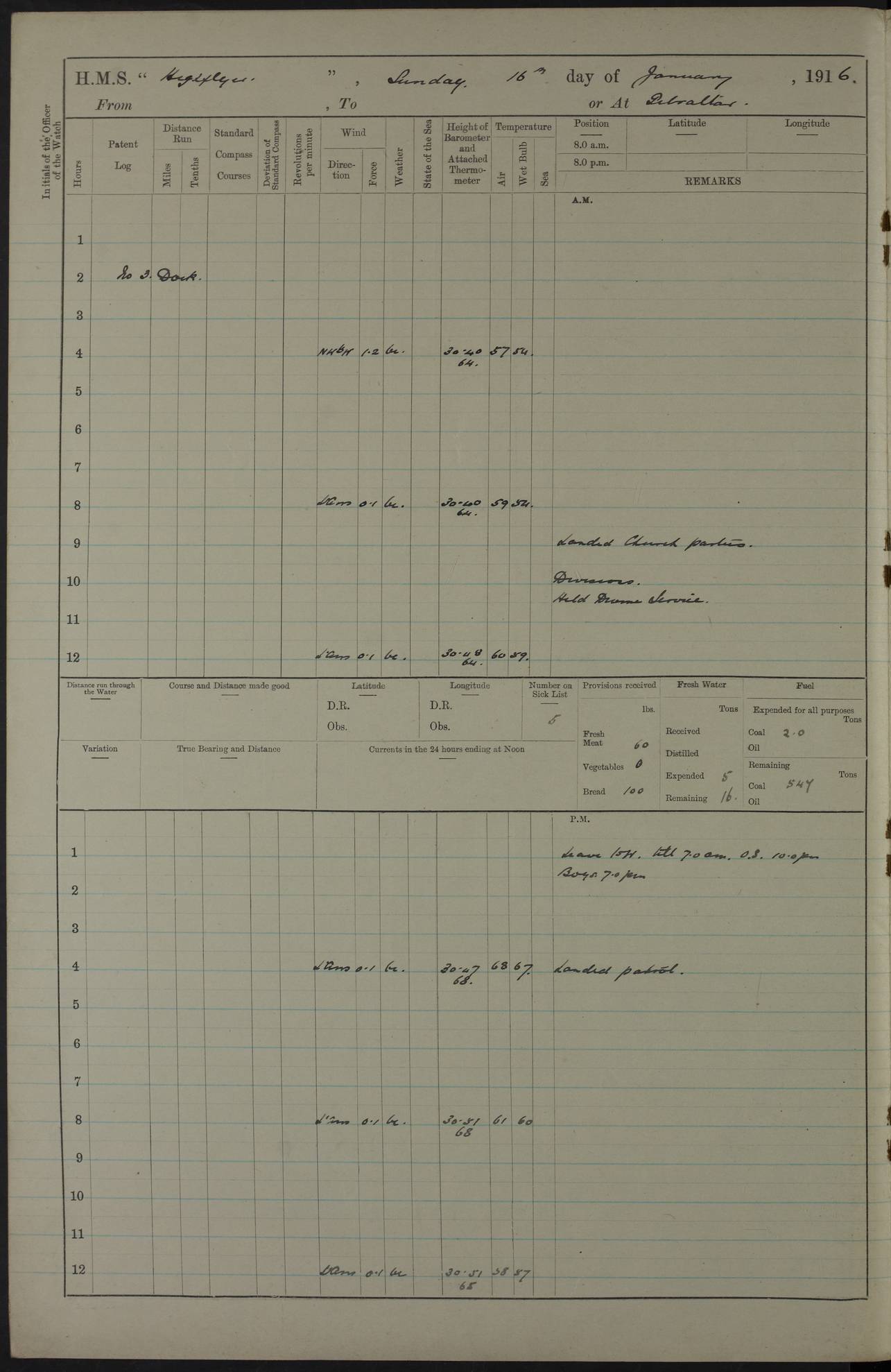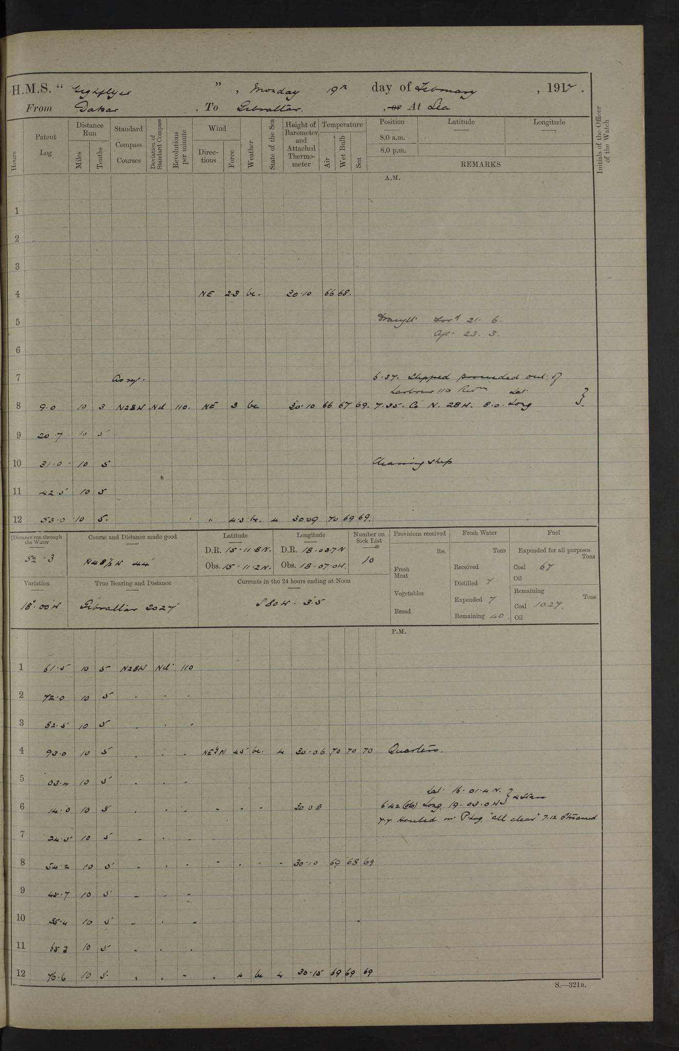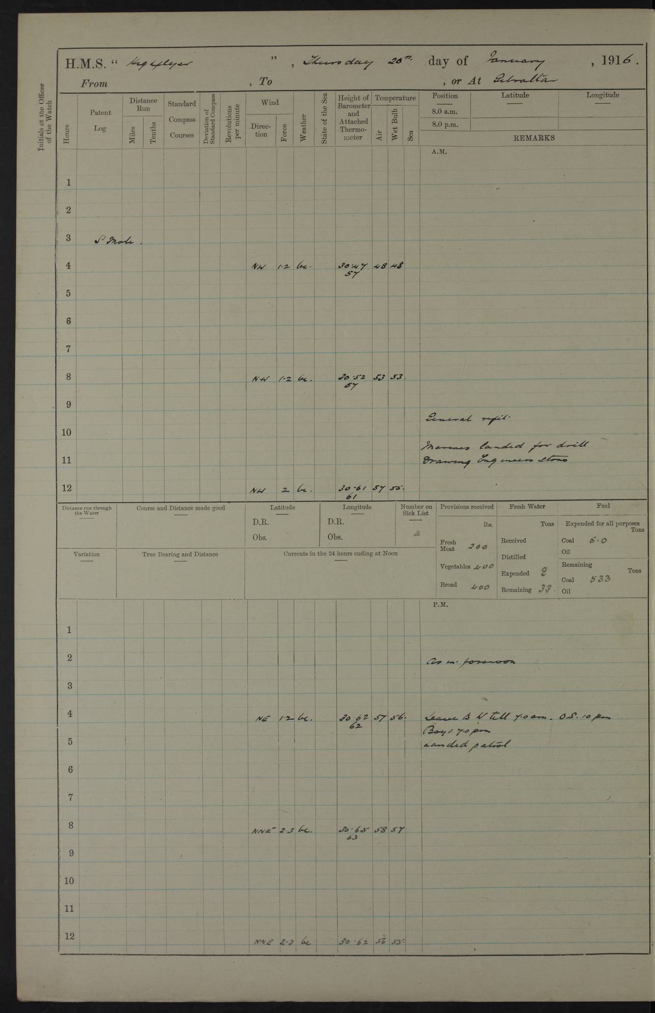 LOGS FOR JANUARY 1916 4f96113fa2fc8e2def000829: (http://s3.amazonaws.com/oldweather/ADM53-44302/ADM 53-44302-001_0.jpg) 4f961140a2fc8e2def00082a: (http://s3.amazonaws.com/oldweather/ADM53-44302/ADM 53-44302-001_1.jpg) 4f961140a2fc8e2def00082b: (http://s3.amazonaws.com/oldweather/ADM53-44302/ADM 53-44302-002_0.jpg) 4f961140a2fc8e2def00082c: (http://s3.amazonaws.com/oldweather/ADM53-44302/ADM 53-44302-002_1.jpg) 4f961141a2fc8e2def00082d: (http://s3.amazonaws.com/oldweather/ADM53-44302/ADM 53-44302-003_0.jpg) 4f961141a2fc8e2def00082e: (http://s3.amazonaws.com/oldweather/ADM53-44302/ADM 53-44302-003_1.jpg) 4f961141a2fc8e2def00082f: (http://s3.amazonaws.com/oldweather/ADM53-44302/ADM 53-44302-004_0.jpg) 4f961142a2fc8e2def000830: (http://s3.amazonaws.com/oldweather/ADM53-44302/ADM 53-44302-004_1.jpg) 4f961142a2fc8e2def000831: (http://s3.amazonaws.com/oldweather/ADM53-44302/ADM 53-44302-005_0.jpg) 4f961142a2fc8e2def000832: (http://s3.amazonaws.com/oldweather/ADM53-44302/ADM 53-44302-005_1.jpg) 1 January 1916 Gibraltar Lat 36.1, Long -5.3 9.00am: Dockyardmen on board. 5.30pm: Mr. Ritchie, Artificer Engineer joined ship. 4f961143a2fc8e2def000833: (http://s3.amazonaws.com/oldweather/ADM53-44302/ADM 53-44302-006_0.jpg) 2 January 1916 Gibraltar Lat 36.1, Long -5.3 9.30am: Landed church parties. 4f961143a2fc8e2def000834: (http://s3.amazonaws.com/oldweather/ADM53-44302/ADM 53-44302-006_1.jpg) 3 January 1916 Gibraltar Lat 36.1, Long -5.3 11.00am: Replaced topmasts. 1.00pm: Commander Casement discharged to hospital. 4f961143a2fc8e2def000835: (http://s3.amazonaws.com/oldweather/ADM53-44302/ADM 53-44302-007_0.jpg) 4 January 1916 Gibraltar Lat 36.1, Long -5.3 General refit. 10.30am: Discharged 2 Ratings to hospital. 4f961144a2fc8e2def000836: (http://s3.amazonaws.com/oldweather/ADM53-44302/ADM 53-44302-007_1.jpg) 5 January 1916 Gibraltar Lat 36.1, Long -5.3 7.30am: Dockyardmen on board. 9.00am: Discharged one Rating to hospital. 4f961144a2fc8e2def000837: (http://s3.amazonaws.com/oldweather/ADM53-44302/ADM 53-44302-008_0.jpg) 6 January 1916 Gibraltar Lat 36.1, Long -5.3 10.00am: Returning and drawing stores. 4f961144a2fc8e2def000838: (http://s3.amazonaws.com/oldweather/ADM53-44302/ADM 53-44302-008_1.jpg) 7 January 1916 Gibraltar Lat 36.1, Long -5.3 10.00am: Party drawing provisions for fore holds. 11.00am: 3 Seamen, 3 Stokers, 3 Marines, 1 NP, 1 SBS joined ship. 4f961145a2fc8e2def000839: (http://s3.amazonaws.com/oldweather/ADM53-44302/ADM 53-44302-009_0.jpg) 8 January 1916 Gibraltar Lat 36.1, Long -5.3 1.30pm: Discharged 1 prisoner to detention quarter. 4f961145a2fc8e2def00083a: (http://s3.amazonaws.com/oldweather/ADM53-44302/ADM 53-44302-009_1.jpg) 9 January 1916 Gibraltar Lat 36.1, Long -5.3 10.00am: Captain presented Persian Gulf Gen. Service Medals to Mr. Ward, Artificer Engineer, and 5 Ratings. 4f961145a2fc8e2def00083b: (http://s3.amazonaws.com/oldweather/ADM53-44302/ADM 53-44302-010_0.jpg) 10 January 1916 Gibraltar Lat 36.1, Long -5.3 5.00pm: Discharged Mr. Ward Art Eng, 1 Ch. SBS, 1 RNR, 3 Marines, 2 POI., 3 Stoker, 1 Marine to HMS TERRIBLE for passage home. 4f961146a2fc8e2def00083c: (http://s3.amazonaws.com/oldweather/ADM53-44302/ADM 53-44302-010_1.jpg) 11 January 1916 Gibraltar Lat 36.1, Long -5.3 9.00am: Carrying out general refit. 10.00am: Replaced starboard cable after cleaning and testing (carried out by Dockyard). 4f961146a2fc8e2def00083d: (http://s3.amazonaws.com/oldweather/ADM53-44302/ADM 53-44302-011_0.jpg) 12 January 1916 Gibraltar Lat 36.1, Long -5.3 Carrying out general refit. 4f961146a2fc8e2def00083e: (http://s3.amazonaws.com/oldweather/ADM53-44302/ADM 53-44302-011_1.jpg) 13 January 1916 Gibraltar Lat 36.1, Long -5.3 Carrying out general refit. 10.00am: Marines landed for drill. 4f961147a2fc8e2def00083f: (http://s3.amazonaws.com/oldweather/ADM53-44302/ADM 53-44302-012_0.jpg) 14 January 1916 Gibraltar Lat 36.1, Long -5.3 10.00am: Party replacing port cable after test and survey by Dockyard. 4f961147a2fc8e2def000840: (http://s3.amazonaws.com/oldweather/ADM53-44302/ADM 53-44302-012_1.jpg) 15 January 1916 Gibraltar Lat 36.1, Long -5.3 9.00am: Carrying out general refit. Party working about cable. 4f961147a2fc8e2def000841: (http://s3.amazonaws.com/oldweather/ADM53-44302/ADM 53-44302-013_0.jpg) 16 January 1916 Gibraltar Lat 36.1, Long -5.3 9.00am: Landed church parties. 4f961148a2fc8e2def000842: (http://s3.amazonaws.com/oldweather/ADM53-44302/ADM 53-44302-013_1.jpg) 17 January 1916 Gibraltar Lat 36.1, Long -5.3 1.00pm: 42 Ratings left ship for passage to England. 4f961148a2fc8e2def000843: (http://s3.amazonaws.com/oldweather/ADM53-44302/ADM 53-44302-014_0.jpg) 18 January 1916 Gibraltar Lat 36.1, Long -5.3 10.00am: Party drawing torpedoes. 3.00pm: Partially flooded dock. 4f961148a2fc8e2def000844: (http://s3.amazonaws.com/oldweather/ADM53-44302/ADM 53-44302-014_1.jpg) 19 January 1916 Gibraltar Lat 36.1, Long -5.3 8.30am: Flooded dock. 9.00am: Shifted berth to No 5 billet S Mole. 4f961149a2fc8e2def000845: (http://s3.amazonaws.com/oldweather/ADM53-44302/ADM 53-44302-015_0.jpg) 20 January 1916 Gibraltar Lat 36.1, Long -5.3 10.30am: Marines landed for drill. 11.00am: Drawing Engineers’ stores. 4f961149a2fc8e2def000846: (http://s3.amazonaws.com/oldweather/ADM53-44302/ADM 53-44302-015_1.jpg) 21 January 1916 Gibraltar Lat 36.1, Long -5.3 9.00am: Ammunitioning ship. 4f961149a2fc8e2def000847: (http://s3.amazonaws.com/oldweather/ADM53-44302/ADM 53-44302-016_0.jpg) 22 January 1916 Gibraltar Lat 36.1, Long -5.3 9.00am: Ammunitioning ship. 1.30pm: One Marine discharged to Detention Quarters. 4f96114aa2fc8e2def000848: (http://s3.amazonaws.com/oldweather/ADM53-44302/ADM 53-44302-016_1.jpg) 23 January 1916 Gibraltar Lat 36.1, Long -5.3 9.00am: Landed church parties. 4f96114aa2fc8e2def000849: (http://s3.amazonaws.com/oldweather/ADM53-44302/ADM 53-44302-017_0.jpg) 24 January 1916 Gibraltar Lat 36.1, Long -5.3 7.30am: Commenced coaling. Dockyard labour shore party. 1.30pm: Finished coaling; received 565 tons. 2.0