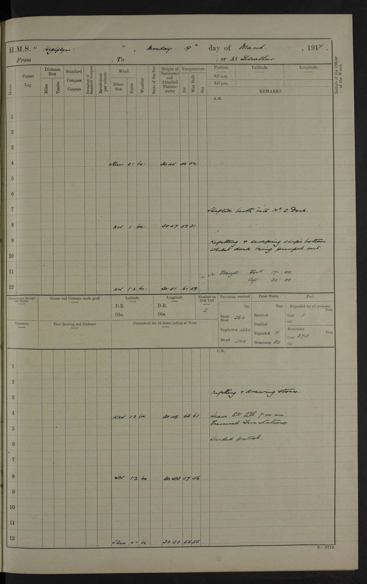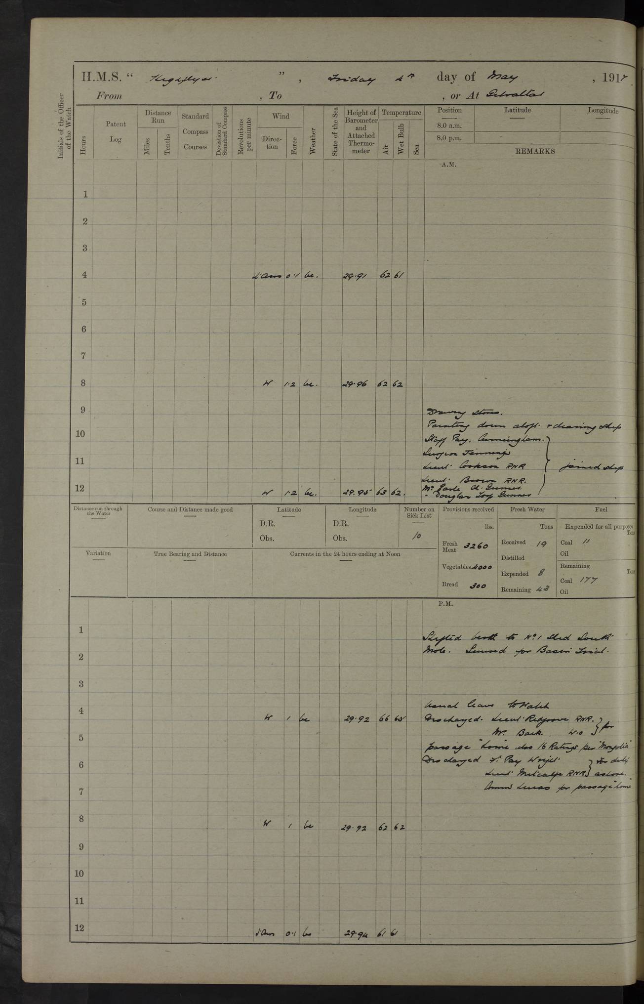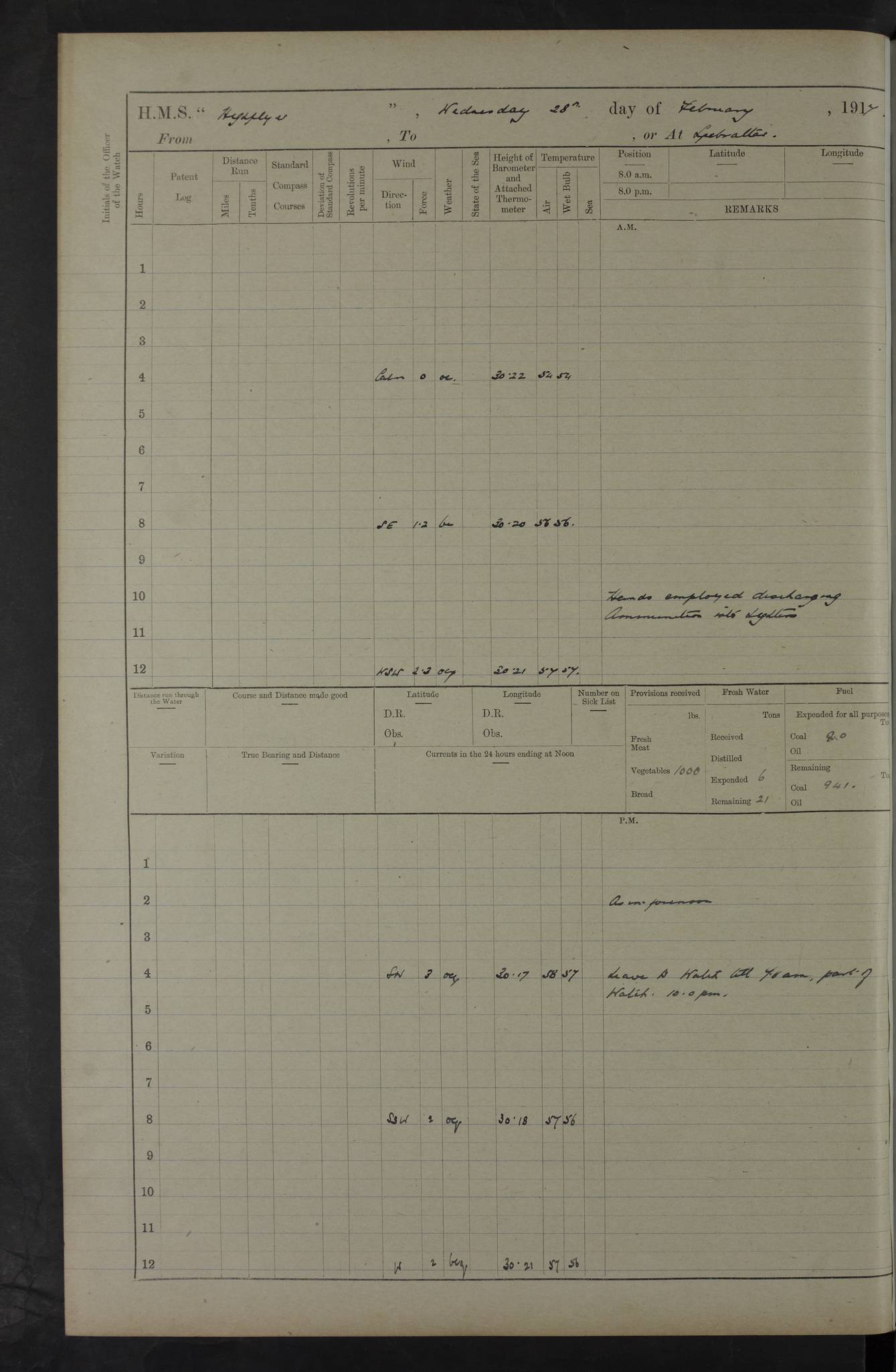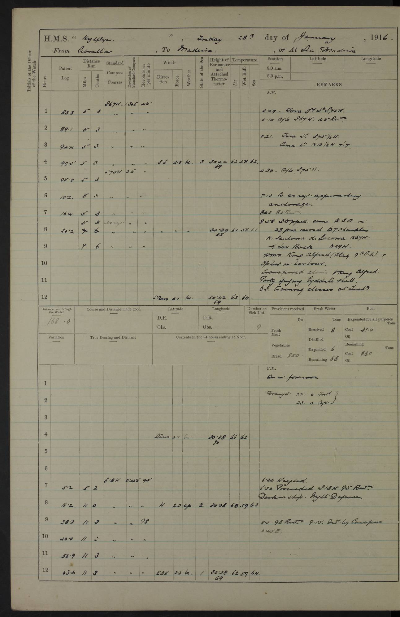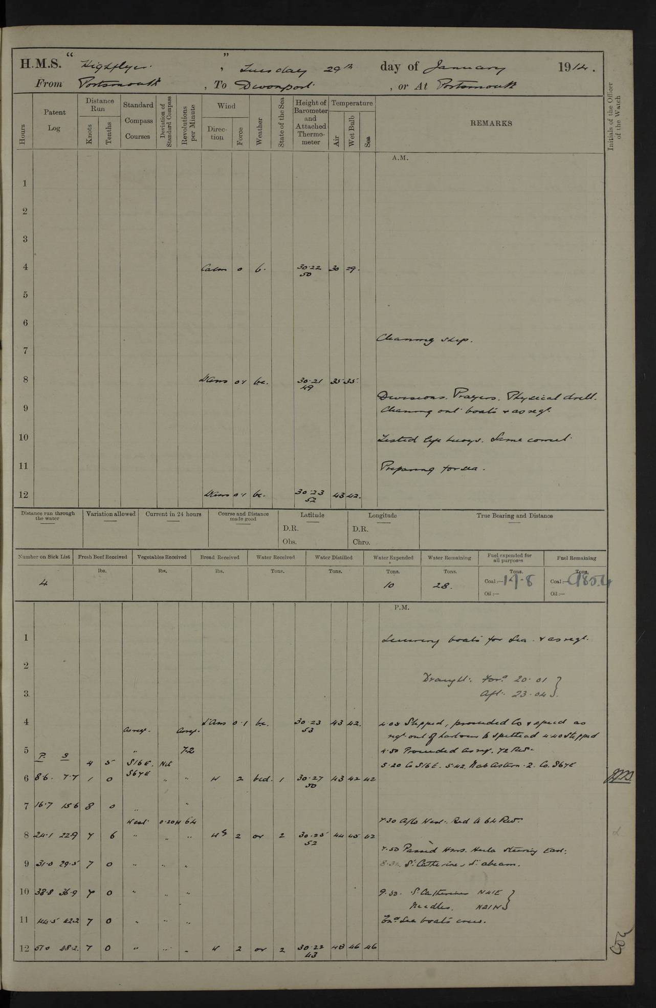 LOGS FOR JANUARY 1916 4f96113fa2fc8e2def000829: (http://s3.amazonaws.com/oldweather/ADM53-44302/ADM 53-44302-001_0.jpg) 4f961140a2fc8e2def00082a: (http://s3.amazonaws.com/oldweather/ADM53-44302/ADM 53-44302-001_1.jpg) 4f961140a2fc8e2def00082b: (http://s3.amazonaws.com/oldweather/ADM53-44302/ADM 53-44302-002_0.jpg) 4f961140a2fc8e2def00082c: (http://s3.amazonaws.com/oldweather/ADM53-44302/ADM 53-44302-002_1.jpg) 4f961141a2fc8e2def00082d: (http://s3.amazonaws.com/oldweather/ADM53-44302/ADM 53-44302-003_0.jpg) 4f961141a2fc8e2def00082e: (http://s3.amazonaws.com/oldweather/ADM53-44302/ADM 53-44302-003_1.jpg) 4f961141a2fc8e2def00082f: (http://s3.amazonaws.com/oldweather/ADM53-44302/ADM 53-44302-004_0.jpg) 4f961142a2fc8e2def000830: (http://s3.amazonaws.com/oldweather/ADM53-44302/ADM 53-44302-004_1.jpg) 4f961142a2fc8e2def000831: (http://s3.amazonaws.com/oldweather/ADM53-44302/ADM 53-44302-005_0.jpg) 4f961142a2fc8e2def000832: (http://s3.amazonaws.com/oldweather/ADM53-44302/ADM 53-44302-005_1.jpg) 1 January 1916 Gibraltar Lat 36.1, Long -5.3 9.00am: Dockyardmen on board. 5.30pm: Mr. Ritchie, Artificer Engineer joined ship. 4f961143a2fc8e2def000833: (http://s3.amazonaws.com/oldweather/ADM53-44302/ADM 53-44302-006_0.jpg) 2 January 1916 Gibraltar Lat 36.1, Long -5.3 9.30am: Landed church parties. 4f961143a2fc8e2def000834: (http://s3.amazonaws.com/oldweather/ADM53-44302/ADM 53-44302-006_1.jpg) 3 January 1916 Gibraltar Lat 36.1, Long -5.3 11.00am: Replaced topmasts. 1.00pm: Commander Casement discharged to hospital. 4f961143a2fc8e2def000835: (http://s3.amazonaws.com/oldweather/ADM53-44302/ADM 53-44302-007_0.jpg) 4 January 1916 Gibraltar Lat 36.1, Long -5.3 General refit. 10.30am: Discharged 2 Ratings to hospital. 4f961144a2fc8e2def000836: (http://s3.amazonaws.com/oldweather/ADM53-44302/ADM 53-44302-007_1.jpg) 5 January 1916 Gibraltar Lat 36.1, Long -5.3 7.30am: Dockyardmen on board. 9.00am: Discharged one Rating to hospital. 4f961144a2fc8e2def000837: (http://s3.amazonaws.com/oldweather/ADM53-44302/ADM 53-44302-008_0.jpg) 6 January 1916 Gibraltar Lat 36.1, Long -5.3 10.00am: Returning and drawing stores. 4f961144a2fc8e2def000838: (http://s3.amazonaws.com/oldweather/ADM53-44302/ADM 53-44302-008_1.jpg) 7 January 1916 Gibraltar Lat 36.1, Long -5.3 10.00am: Party drawing provisions for fore holds. 11.00am: 3 Seamen, 3 Stokers, 3 Marines, 1 NP, 1 SBS joined ship. 4f961145a2fc8e2def000839: (http://s3.amazonaws.com/oldweather/ADM53-44302/ADM 53-44302-009_0.jpg) 8 January 1916 Gibraltar Lat 36.1, Long -5.3 1.30pm: Discharged 1 prisoner to detention quarter. 4f961145a2fc8e2def00083a: (http://s3.amazonaws.com/oldweather/ADM53-44302/ADM 53-44302-009_1.jpg) 9 January 1916 Gibraltar Lat 36.1, Long -5.3 10.00am: Captain presented Persian Gulf Gen. Service Medals to Mr. Ward, Artificer Engineer, and 5 Ratings. 4f961145a2fc8e2def00083b: (http://s3.amazonaws.com/oldweather/ADM53-44302/ADM 53-44302-010_0.jpg) 10 January 1916 Gibraltar Lat 36.1, Long -5.3 5.00pm: Discharged Mr. Ward Art Eng, 1 Ch. SBS, 1 RNR, 3 Marines, 2 POI., 3 Stoker, 1 Marine to HMS TERRIBLE for passage home. 4f961146a2fc8e2def00083c: (http://s3.amazonaws.com/oldweather/ADM53-44302/ADM 53-44302-010_1.jpg) 11 January 1916 Gibraltar Lat 36.1, Long -5.3 9.00am: Carrying out general refit. 10.00am: Replaced starboard cable after cleaning and testing (carried out by Dockyard). 4f961146a2fc8e2def00083d: (http://s3.amazonaws.com/oldweather/ADM53-44302/ADM 53-44302-011_0.jpg) 12 January 1916 Gibraltar Lat 36.1, Long -5.3 Carrying out general refit. 4f961146a2fc8e2def00083e: (http://s3.amazonaws.com/oldweather/ADM53-44302/ADM 53-44302-011_1.jpg) 13 January 1916 Gibraltar Lat 36.1, Long -5.3 Carrying out general refit. 10.00am: Marines landed for drill. 4f961147a2fc8e2def00083f: (http://s3.amazonaws.com/oldweather/ADM53-44302/ADM 53-44302-012_0.jpg) 14 January 1916 Gibraltar Lat 36.1, Long -5.3 10.00am: Party replacing port cable after test and survey by Dockyard. 4f961147a2fc8e2def000840: (http://s3.amazonaws.com/oldweather/ADM53-44302/ADM 53-44302-012_1.jpg) 15 January 1916 Gibraltar Lat 36.1, Long -5.3 9.00am: Carrying out general refit. Party working about cable. 4f961147a2fc8e2def000841: (http://s3.amazonaws.com/oldweather/ADM53-44302/ADM 53-44302-013_0.jpg) 16 January 1916 Gibraltar Lat 36.1, Long -5.3 9.00am: Landed church parties. 4f961148a2fc8e2def000842: (http://s3.amazonaws.com/oldweather/ADM53-44302/ADM 53-44302-013_1.jpg) 17 January 1916 Gibraltar Lat 36.1, Long -5.3 1.00pm: 42 Ratings left ship for passage to England. 4f961148a2fc8e2def000843: (http://s3.amazonaws.com/oldweather/ADM53-44302/ADM 53-44302-014_0.jpg) 18 January 1916 Gibraltar Lat 36.1, Long -5.3 10.00am: Party drawing torpedoes. 3.00pm: Partially flooded dock. 4f961148a2fc8e2def000844: (http://s3.amazonaws.com/oldweather/ADM53-44302/ADM 53-44302-014_1.jpg) 19 January 1916 Gibraltar Lat 36.1, Long -5.3 8.30am: Flooded dock. 9.00am: Shifted berth to No 5 billet S Mole. 4f961149a2fc8e2def000845: (http://s3.amazonaws.com/oldweather/ADM53-44302/ADM 53-44302-015_0.jpg) 20 January 1916 Gibraltar Lat 36.1, Long -5.3 10.30am: Marines landed for drill. 11.00am: Drawing Engineers’ stores. 4f961149a2fc8e2def000846: (http://s3.amazonaws.com/oldweather/ADM53-44302/ADM 53-44302-015_1.jpg) 21 January 1916 Gibraltar Lat 36.1, Long -5.3 9.00am: Ammunitioning ship. 4f961149a2fc8e2def000847: (http://s3.amazonaws.com/oldweather/ADM53-44302/ADM 53-44302-016_0.jpg) 22 January 1916 Gibraltar Lat 36.1, Long -5.3 9.00am: Ammunitioning ship. 1.30pm: One Marine discharged to Detention Quarters. 4f96114aa2fc8e2def000848: (http://s3.amazonaws.com/oldweather/ADM53-44302/ADM 53-44302-016_1.jpg) 23 January 1916 Gibraltar Lat 36.1, Long -5.3 9.00am: Landed church parties. 4f96114aa2fc8e2def000849: (http://s3.amazonaws.com/oldweather/ADM53-44302/ADM 53-44302-017_0.jpg) 24 January 1916 Gibraltar Lat 36.1, Long -5.3 7.30am: Commenced coaling. Dockyard labour shore party. 1.30pm: Finished coaling; received 565 tons. 2.0