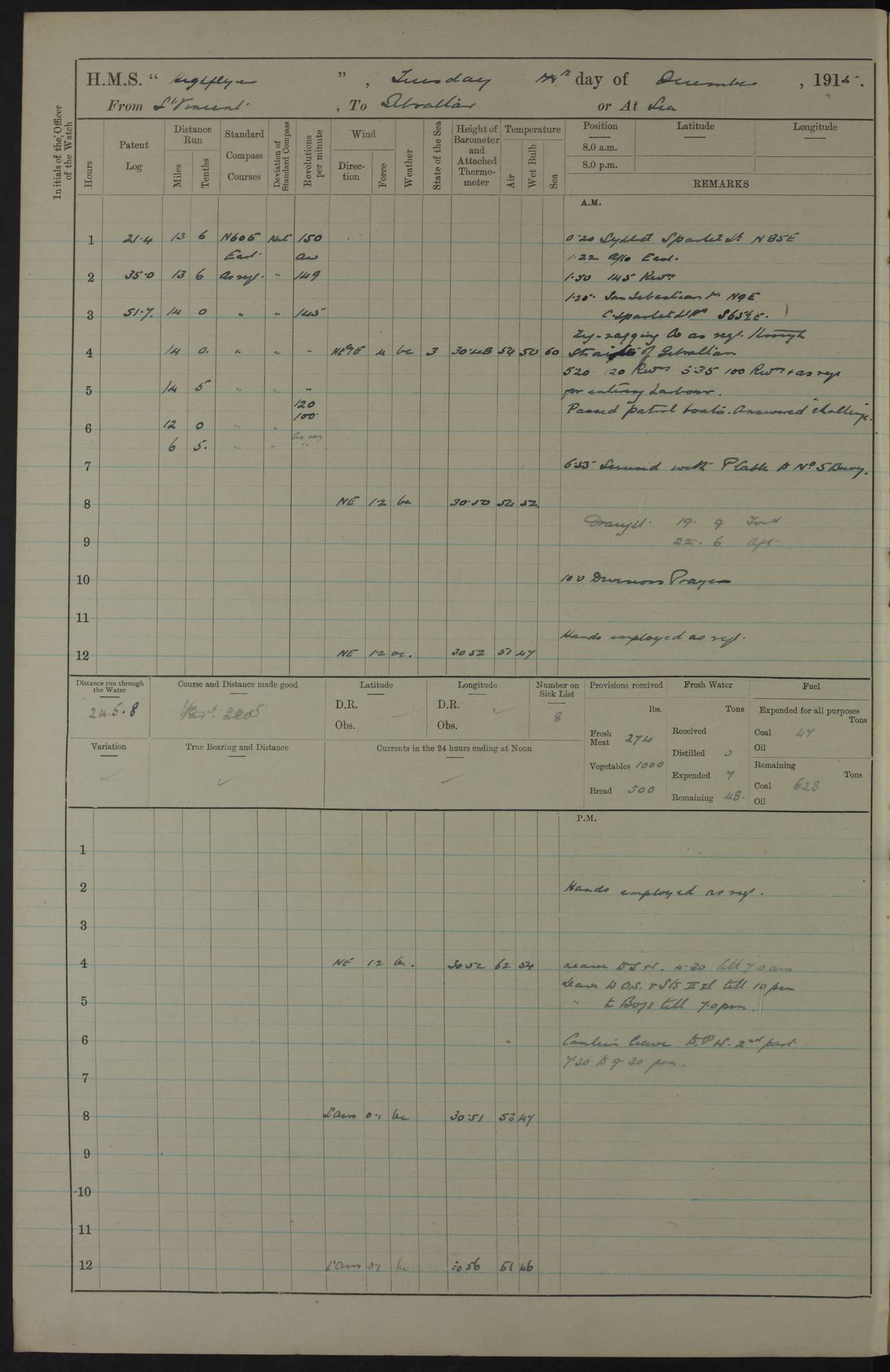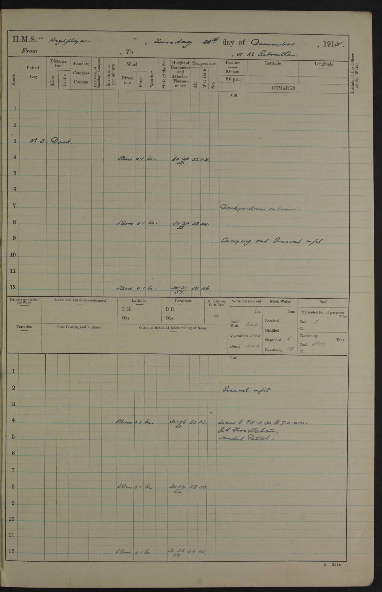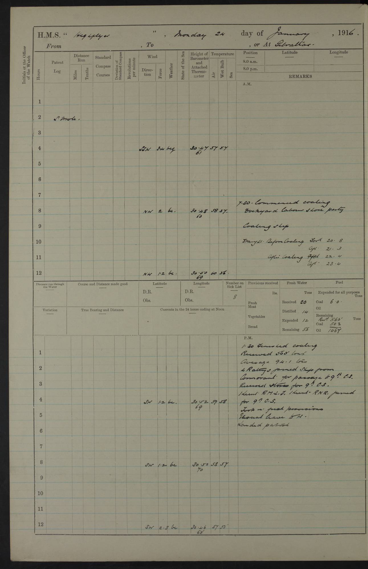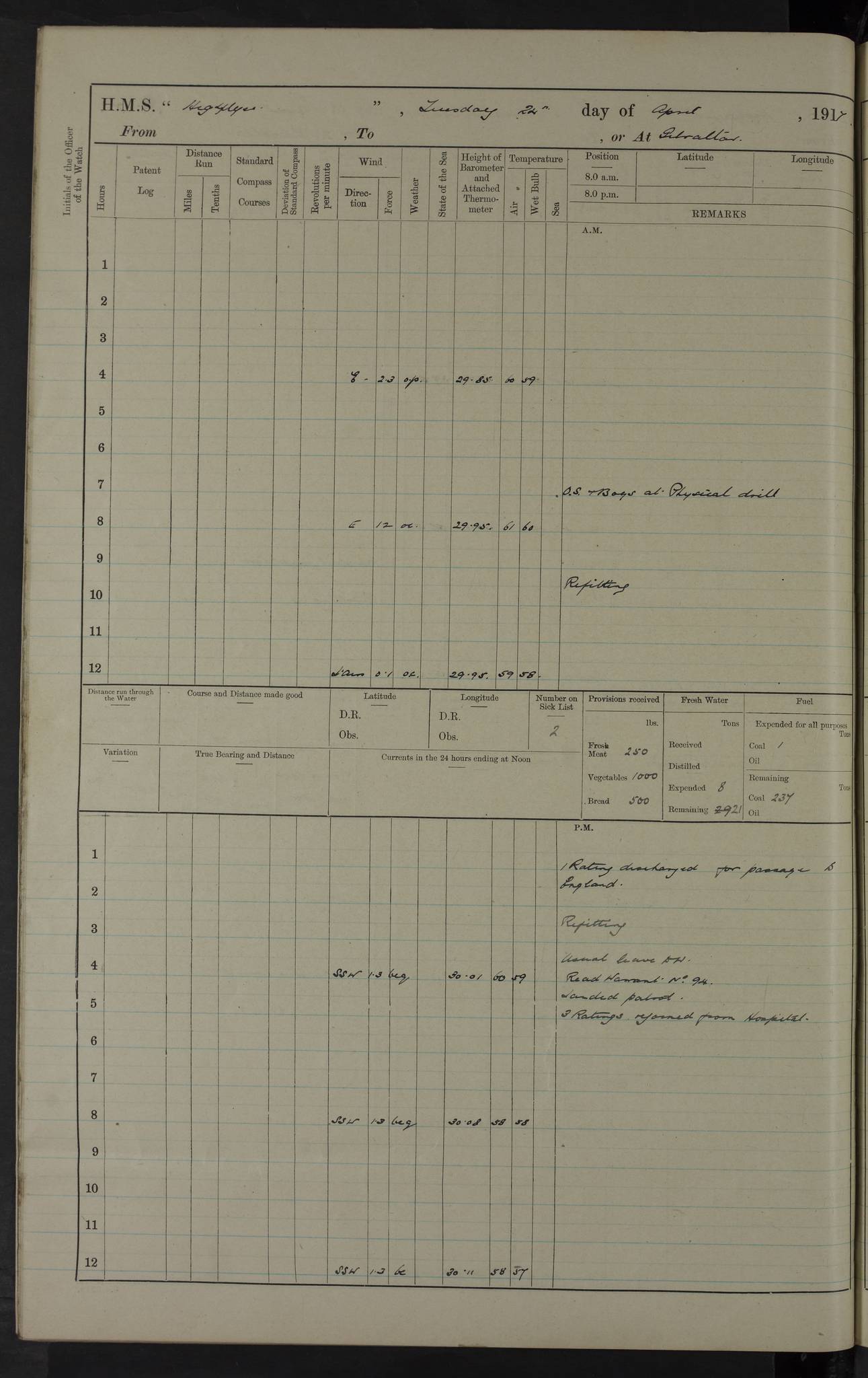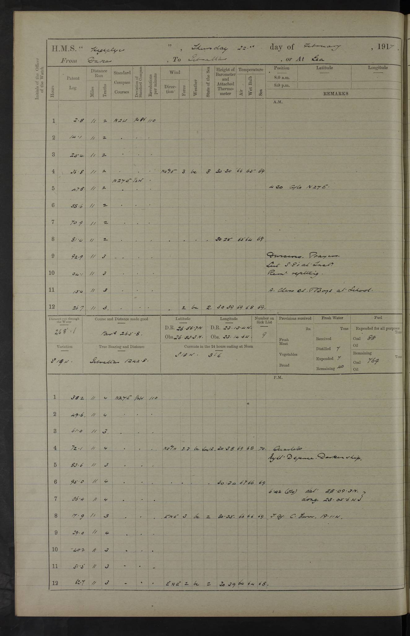LOGS FOR JANUARY 1916 4f96113fa2fc8e2def000829: (http://s3.amazonaws.com/oldweather/ADM53-44302/ADM 53-44302-001_0.jpg) 4f961140a2fc8e2def00082a: (http://s3.amazonaws.com/oldweather/ADM53-44302/ADM 53-44302-001_1.jpg) 4f961140a2fc8e2def00082b: (http://s3.amazonaws.com/oldweather/ADM53-44302/ADM 53-44302-002_0.jpg) 4f961140a2fc8e2def00082c: (http://s3.amazonaws.com/oldweather/ADM53-44302/ADM 53-44302-002_1.jpg) 4f961141a2fc8e2def00082d: (http://s3.amazonaws.com/oldweather/ADM53-44302/ADM 53-44302-003_0.jpg) 4f961141a2fc8e2def00082e: (http://s3.amazonaws.com/oldweather/ADM53-44302/ADM 53-44302-003_1.jpg) 4f961141a2fc8e2def00082f: (http://s3.amazonaws.com/oldweather/ADM53-44302/ADM 53-44302-004_0.jpg) 4f961142a2fc8e2def000830: (http://s3.amazonaws.com/oldweather/ADM53-44302/ADM 53-44302-004_1.jpg) 4f961142a2fc8e2def000831: (http://s3.amazonaws.com/oldweather/ADM53-44302/ADM 53-44302-005_0.jpg) 4f961142a2fc8e2def000832: (http://s3.amazonaws.com/oldweather/ADM53-44302/ADM 53-44302-005_1.jpg) 1 January 1916 Gibraltar Lat 36.1, Long -5.3 9.00am: Dockyardmen on board. 5.30pm: Mr. Ritchie, Artificer Engineer joined ship. 4f961143a2fc8e2def000833: (http://s3.amazonaws.com/oldweather/ADM53-44302/ADM 53-44302-006_0.jpg) 2 January 1916 Gibraltar Lat 36.1, Long -5.3 9.30am: Landed church parties. 4f961143a2fc8e2def000834: (http://s3.amazonaws.com/oldweather/ADM53-44302/ADM 53-44302-006_1.jpg) 3 January 1916 Gibraltar Lat 36.1, Long -5.3 11.00am: Replaced topmasts. 1.00pm: Commander Casement discharged to hospital. 4f961143a2fc8e2def000835: (http://s3.amazonaws.com/oldweather/ADM53-44302/ADM 53-44302-007_0.jpg) 4 January 1916 Gibraltar Lat 36.1, Long -5.3 General refit. 10.30am: Discharged 2 Ratings to hospital. 4f961144a2fc8e2def000836: (http://s3.amazonaws.com/oldweather/ADM53-44302/ADM 53-44302-007_1.jpg) 5 January 1916 Gibraltar Lat 36.1, Long -5.3 7.30am: Dockyardmen on board. 9.00am: Discharged one Rating to hospital. 4f961144a2fc8e2def000837: (http://s3.amazonaws.com/oldweather/ADM53-44302/ADM 53-44302-008_0.jpg) 6 January 1916 Gibraltar Lat 36.1, Long -5.3 10.00am: Returning and drawing stores. 4f961144a2fc8e2def000838: (http://s3.amazonaws.com/oldweather/ADM53-44302/ADM 53-44302-008_1.jpg) 7 January 1916 Gibraltar Lat 36.1, Long -5.3 10.00am: Party drawing provisions for fore holds. 11.00am: 3 Seamen, 3 Stokers, 3 Marines, 1 NP, 1 SBS joined ship. 4f961145a2fc8e2def000839: (http://s3.amazonaws.com/oldweather/ADM53-44302/ADM 53-44302-009_0.jpg) 8 January 1916 Gibraltar Lat 36.1, Long -5.3 1.30pm: Discharged 1 prisoner to detention quarter. 4f961145a2fc8e2def00083a: (http://s3.amazonaws.com/oldweather/ADM53-44302/ADM 53-44302-009_1.jpg) 9 January 1916 Gibraltar Lat 36.1, Long -5.3 10.00am: Captain presented Persian Gulf Gen. Service Medals to Mr. Ward, Artificer Engineer, and 5 Ratings. 4f961145a2fc8e2def00083b: (http://s3.amazonaws.com/oldweather/ADM53-44302/ADM 53-44302-010_0.jpg) 10 January 1916 Gibraltar Lat 36.1, Long -5.3 5.00pm: Discharged Mr. Ward Art Eng, 1 Ch. SBS, 1 RNR, 3 Marines, 2 POI., 3 Stoker, 1 Marine to HMS TERRIBLE for passage home. 4f961146a2fc8e2def00083c: (http://s3.amazonaws.com/oldweather/ADM53-44302/ADM 53-44302-010_1.jpg) 11 January 1916 Gibraltar Lat 36.1, Long -5.3 9.00am: Carrying out general refit. 10.00am: Replaced starboard cable after cleaning and testing (carried out by Dockyard). 4f961146a2fc8e2def00083d: (http://s3.amazonaws.com/oldweather/ADM53-44302/ADM 53-44302-011_0.jpg) 12 January 1916 Gibraltar Lat 36.1, Long -5.3 Carrying out general refit. 4f961146a2fc8e2def00083e: (http://s3.amazonaws.com/oldweather/ADM53-44302/ADM 53-44302-011_1.jpg) 13 January 1916 Gibraltar Lat 36.1, Long -5.3 Carrying out general refit. 10.00am: Marines landed for drill. 4f961147a2fc8e2def00083f: (http://s3.amazonaws.com/oldweather/ADM53-44302/ADM 53-44302-012_0.jpg) 14 January 1916 Gibraltar Lat 36.1, Long -5.3 10.00am: Party replacing port cable after test and survey by Dockyard. 4f961147a2fc8e2def000840: (http://s3.amazonaws.com/oldweather/ADM53-44302/ADM 53-44302-012_1.jpg) 15 January 1916 Gibraltar Lat 36.1, Long -5.3 9.00am: Carrying out general refit. Party working about cable. 4f961147a2fc8e2def000841: (http://s3.amazonaws.com/oldweather/ADM53-44302/ADM 53-44302-013_0.jpg) 16 January 1916 Gibraltar Lat 36.1, Long -5.3 9.00am: Landed church parties. 4f961148a2fc8e2def000842: (http://s3.amazonaws.com/oldweather/ADM53-44302/ADM 53-44302-013_1.jpg) 17 January 1916 Gibraltar Lat 36.1, Long -5.3 1.00pm: 42 Ratings left ship for passage to England. 4f961148a2fc8e2def000843: (http://s3.amazonaws.com/oldweather/ADM53-44302/ADM 53-44302-014_0.jpg) 18 January 1916 Gibraltar Lat 36.1, Long -5.3 10.00am: Party drawing torpedoes. 3.00pm: Partially flooded dock. 4f961148a2fc8e2def000844: (http://s3.amazonaws.com/oldweather/ADM53-44302/ADM 53-44302-014_1.jpg) 19 January 1916 Gibraltar Lat 36.1, Long -5.3 8.30am: Flooded dock. 9.00am: Shifted berth to No 5 billet S Mole. 4f961149a2fc8e2def000845: (http://s3.amazonaws.com/oldweather/ADM53-44302/ADM 53-44302-015_0.jpg) 20 January 1916 Gibraltar Lat 36.1, Long -5.3 10.30am: Marines landed for drill. 11.00am: Drawing Engineers’ stores. 4f961149a2fc8e2def000846: (http://s3.amazonaws.com/oldweather/ADM53-44302/ADM 53-44302-015_1.jpg) 21 January 1916 Gibraltar Lat 36.1, Long -5.3 9.00am: Ammunitioning ship. 4f961149a2fc8e2def000847: (http://s3.amazonaws.com/oldweather/ADM53-44302/ADM 53-44302-016_0.jpg) 22 January 1916 Gibraltar Lat 36.1, Long -5.3 9.00am: Ammunitioning ship. 1.30pm: One Marine discharged to Detention Quarters. 4f96114aa2fc8e2def000848: (http://s3.amazonaws.com/oldweather/ADM53-44302/ADM 53-44302-016_1.jpg) 23 January 1916 Gibraltar Lat 36.1, Long -5.3 9.00am: Landed church parties. 4f96114aa2fc8e2def000849: (http://s3.amazonaws.com/oldweather/ADM53-44302/ADM 53-44302-017_0.jpg) 24 January 1916 Gibraltar Lat 36.1, Long -5.3 7.30am: Commenced coaling. Dockyard labour shore party. 1.30pm: Finished coaling; received 565 tons. 2.0