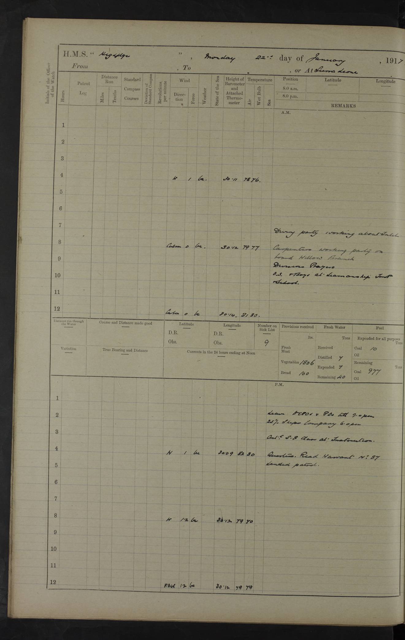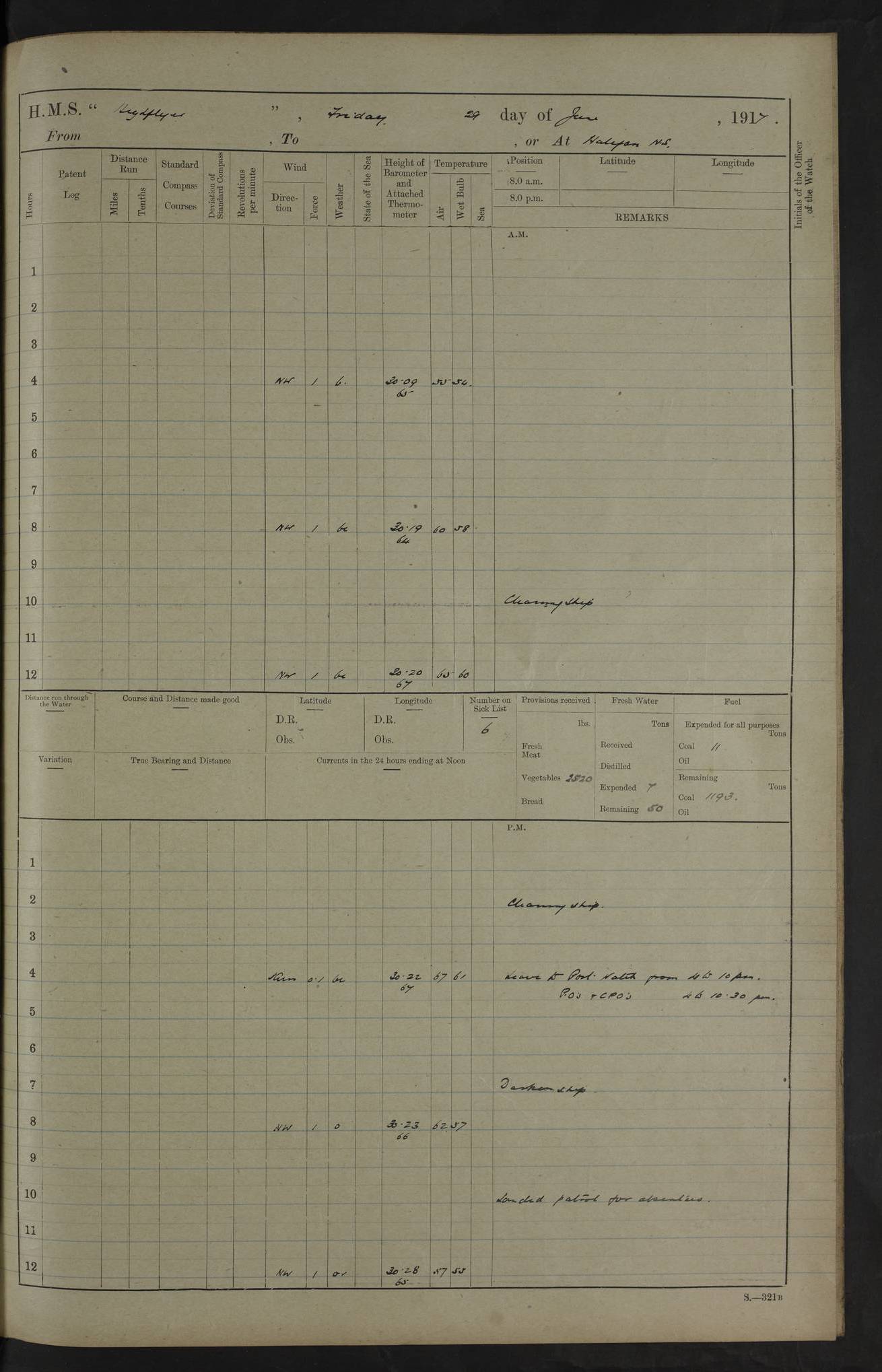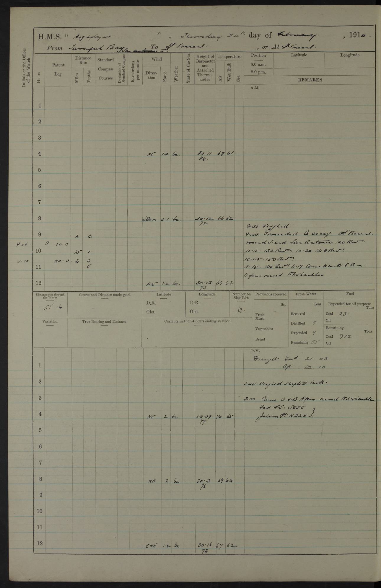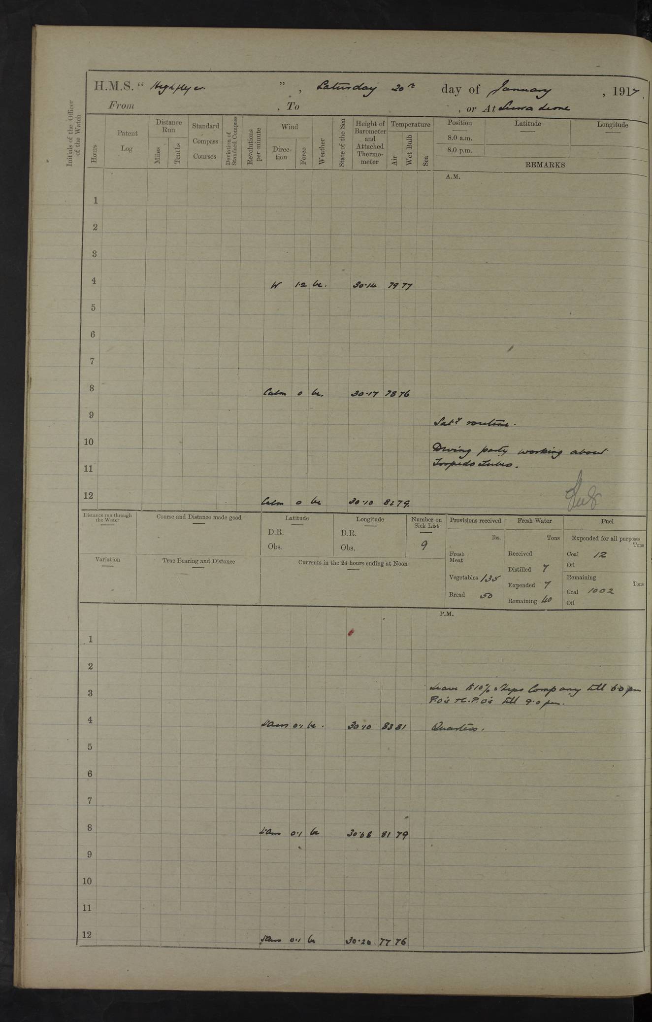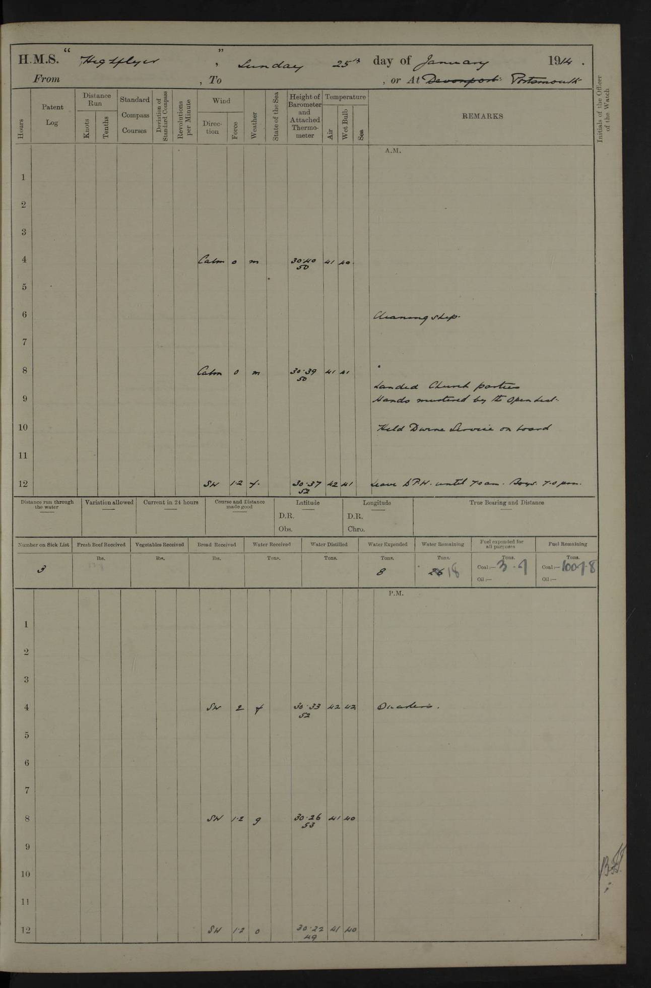 LOGS FOR JANUARY 1916 4f96113fa2fc8e2def000829: (http://s3.amazonaws.com/oldweather/ADM53-44302/ADM 53-44302-001_0.jpg) 4f961140a2fc8e2def00082a: (http://s3.amazonaws.com/oldweather/ADM53-44302/ADM 53-44302-001_1.jpg) 4f961140a2fc8e2def00082b: (http://s3.amazonaws.com/oldweather/ADM53-44302/ADM 53-44302-002_0.jpg) 4f961140a2fc8e2def00082c: (http://s3.amazonaws.com/oldweather/ADM53-44302/ADM 53-44302-002_1.jpg) 4f961141a2fc8e2def00082d: (http://s3.amazonaws.com/oldweather/ADM53-44302/ADM 53-44302-003_0.jpg) 4f961141a2fc8e2def00082e: (http://s3.amazonaws.com/oldweather/ADM53-44302/ADM 53-44302-003_1.jpg) 4f961141a2fc8e2def00082f: (http://s3.amazonaws.com/oldweather/ADM53-44302/ADM 53-44302-004_0.jpg) 4f961142a2fc8e2def000830: (http://s3.amazonaws.com/oldweather/ADM53-44302/ADM 53-44302-004_1.jpg) 4f961142a2fc8e2def000831: (http://s3.amazonaws.com/oldweather/ADM53-44302/ADM 53-44302-005_0.jpg) 4f961142a2fc8e2def000832: (http://s3.amazonaws.com/oldweather/ADM53-44302/ADM 53-44302-005_1.jpg) 1 January 1916 Gibraltar Lat 36.1, Long -5.3 9.00am: Dockyardmen on board. 5.30pm: Mr. Ritchie, Artificer Engineer joined ship. 4f961143a2fc8e2def000833: (http://s3.amazonaws.com/oldweather/ADM53-44302/ADM 53-44302-006_0.jpg) 2 January 1916 Gibraltar Lat 36.1, Long -5.3 9.30am: Landed church parties. 4f961143a2fc8e2def000834: (http://s3.amazonaws.com/oldweather/ADM53-44302/ADM 53-44302-006_1.jpg) 3 January 1916 Gibraltar Lat 36.1, Long -5.3 11.00am: Replaced topmasts. 1.00pm: Commander Casement discharged to hospital. 4f961143a2fc8e2def000835: (http://s3.amazonaws.com/oldweather/ADM53-44302/ADM 53-44302-007_0.jpg) 4 January 1916 Gibraltar Lat 36.1, Long -5.3 General refit. 10.30am: Discharged 2 Ratings to hospital. 4f961144a2fc8e2def000836: (http://s3.amazonaws.com/oldweather/ADM53-44302/ADM 53-44302-007_1.jpg) 5 January 1916 Gibraltar Lat 36.1, Long -5.3 7.30am: Dockyardmen on board. 9.00am: Discharged one Rating to hospital. 4f961144a2fc8e2def000837: (http://s3.amazonaws.com/oldweather/ADM53-44302/ADM 53-44302-008_0.jpg) 6 January 1916 Gibraltar Lat 36.1, Long -5.3 10.00am: Returning and drawing stores. 4f961144a2fc8e2def000838: (http://s3.amazonaws.com/oldweather/ADM53-44302/ADM 53-44302-008_1.jpg) 7 January 1916 Gibraltar Lat 36.1, Long -5.3 10.00am: Party drawing provisions for fore holds. 11.00am: 3 Seamen, 3 Stokers, 3 Marines, 1 NP, 1 SBS joined ship. 4f961145a2fc8e2def000839: (http://s3.amazonaws.com/oldweather/ADM53-44302/ADM 53-44302-009_0.jpg) 8 January 1916 Gibraltar Lat 36.1, Long -5.3 1.30pm: Discharged 1 prisoner to detention quarter. 4f961145a2fc8e2def00083a: (http://s3.amazonaws.com/oldweather/ADM53-44302/ADM 53-44302-009_1.jpg) 9 January 1916 Gibraltar Lat 36.1, Long -5.3 10.00am: Captain presented Persian Gulf Gen. Service Medals to Mr. Ward, Artificer Engineer, and 5 Ratings. 4f961145a2fc8e2def00083b: (http://s3.amazonaws.com/oldweather/ADM53-44302/ADM 53-44302-010_0.jpg) 10 January 1916 Gibraltar Lat 36.1, Long -5.3 5.00pm: Discharged Mr. Ward Art Eng, 1 Ch. SBS, 1 RNR, 3 Marines, 2 POI., 3 Stoker, 1 Marine to HMS TERRIBLE for passage home. 4f961146a2fc8e2def00083c: (http://s3.amazonaws.com/oldweather/ADM53-44302/ADM 53-44302-010_1.jpg) 11 January 1916 Gibraltar Lat 36.1, Long -5.3 9.00am: Carrying out general refit. 10.00am: Replaced starboard cable after cleaning and testing (carried out by Dockyard). 4f961146a2fc8e2def00083d: (http://s3.amazonaws.com/oldweather/ADM53-44302/ADM 53-44302-011_0.jpg) 12 January 1916 Gibraltar Lat 36.1, Long -5.3 Carrying out general refit. 4f961146a2fc8e2def00083e: (http://s3.amazonaws.com/oldweather/ADM53-44302/ADM 53-44302-011_1.jpg) 13 January 1916 Gibraltar Lat 36.1, Long -5.3 Carrying out general refit. 10.00am: Marines landed for drill. 4f961147a2fc8e2def00083f: (http://s3.amazonaws.com/oldweather/ADM53-44302/ADM 53-44302-012_0.jpg) 14 January 1916 Gibraltar Lat 36.1, Long -5.3 10.00am: Party replacing port cable after test and survey by Dockyard. 4f961147a2fc8e2def000840: (http://s3.amazonaws.com/oldweather/ADM53-44302/ADM 53-44302-012_1.jpg) 15 January 1916 Gibraltar Lat 36.1, Long -5.3 9.00am: Carrying out general refit. Party working about cable. 4f961147a2fc8e2def000841: (http://s3.amazonaws.com/oldweather/ADM53-44302/ADM 53-44302-013_0.jpg) 16 January 1916 Gibraltar Lat 36.1, Long -5.3 9.00am: Landed church parties. 4f961148a2fc8e2def000842: (http://s3.amazonaws.com/oldweather/ADM53-44302/ADM 53-44302-013_1.jpg) 17 January 1916 Gibraltar Lat 36.1, Long -5.3 1.00pm: 42 Ratings left ship for passage to England. 4f961148a2fc8e2def000843: (http://s3.amazonaws.com/oldweather/ADM53-44302/ADM 53-44302-014_0.jpg) 18 January 1916 Gibraltar Lat 36.1, Long -5.3 10.00am: Party drawing torpedoes. 3.00pm: Partially flooded dock. 4f961148a2fc8e2def000844: (http://s3.amazonaws.com/oldweather/ADM53-44302/ADM 53-44302-014_1.jpg) 19 January 1916 Gibraltar Lat 36.1, Long -5.3 8.30am: Flooded dock. 9.00am: Shifted berth to No 5 billet S Mole. 4f961149a2fc8e2def000845: (http://s3.amazonaws.com/oldweather/ADM53-44302/ADM 53-44302-015_0.jpg) 20 January 1916 Gibraltar Lat 36.1, Long -5.3 10.30am: Marines landed for drill. 11.00am: Drawing Engineers’ stores. 4f961149a2fc8e2def000846: (http://s3.amazonaws.com/oldweather/ADM53-44302/ADM 53-44302-015_1.jpg) 21 January 1916 Gibraltar Lat 36.1, Long -5.3 9.00am: Ammunitioning ship. 4f961149a2fc8e2def000847: (http://s3.amazonaws.com/oldweather/ADM53-44302/ADM 53-44302-016_0.jpg) 22 January 1916 Gibraltar Lat 36.1, Long -5.3 9.00am: Ammunitioning ship. 1.30pm: One Marine discharged to Detention Quarters. 4f96114aa2fc8e2def000848: (http://s3.amazonaws.com/oldweather/ADM53-44302/ADM 53-44302-016_1.jpg) 23 January 1916 Gibraltar Lat 36.1, Long -5.3 9.00am: Landed church parties. 4f96114aa2fc8e2def000849: (http://s3.amazonaws.com/oldweather/ADM53-44302/ADM 53-44302-017_0.jpg) 24 January 1916 Gibraltar Lat 36.1, Long -5.3 7.30am: Commenced coaling. Dockyard labour shore party. 1.30pm: Finished coaling; received 565 tons. 2.0