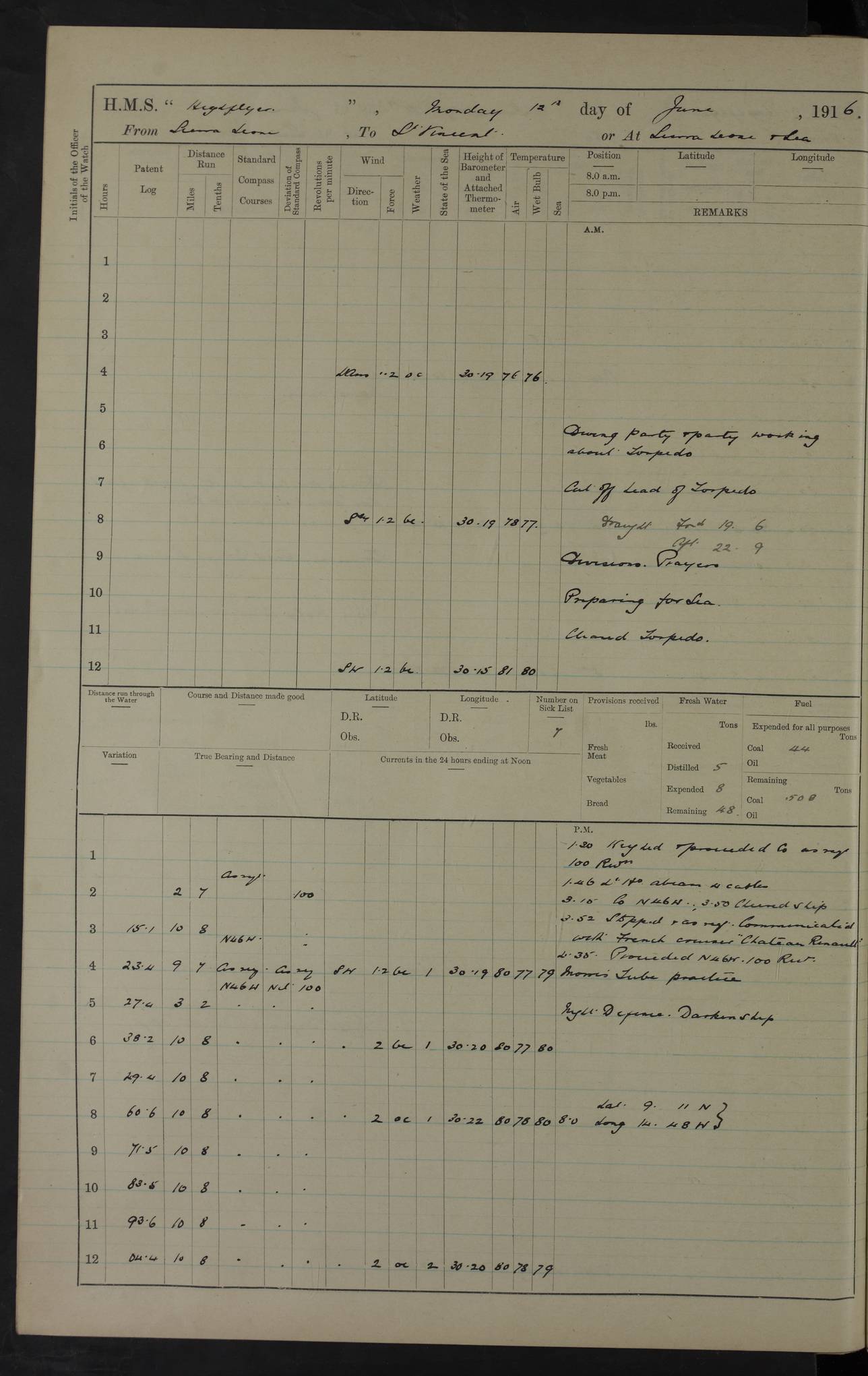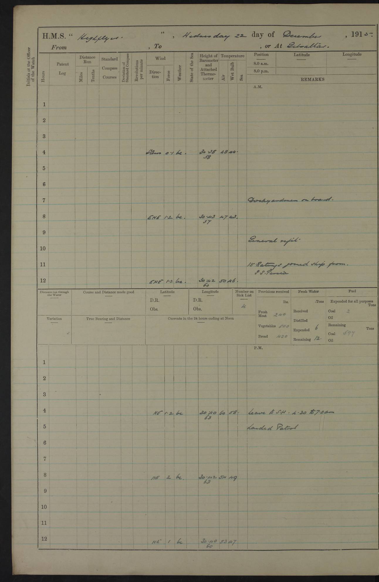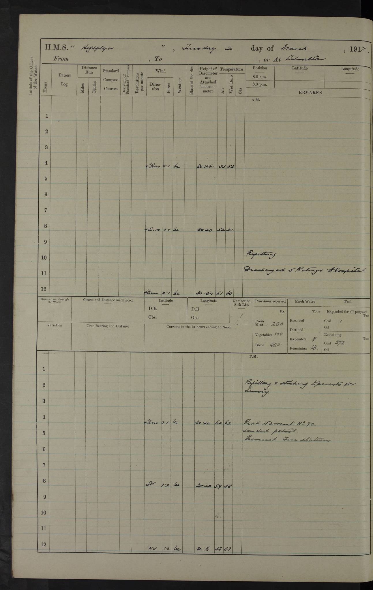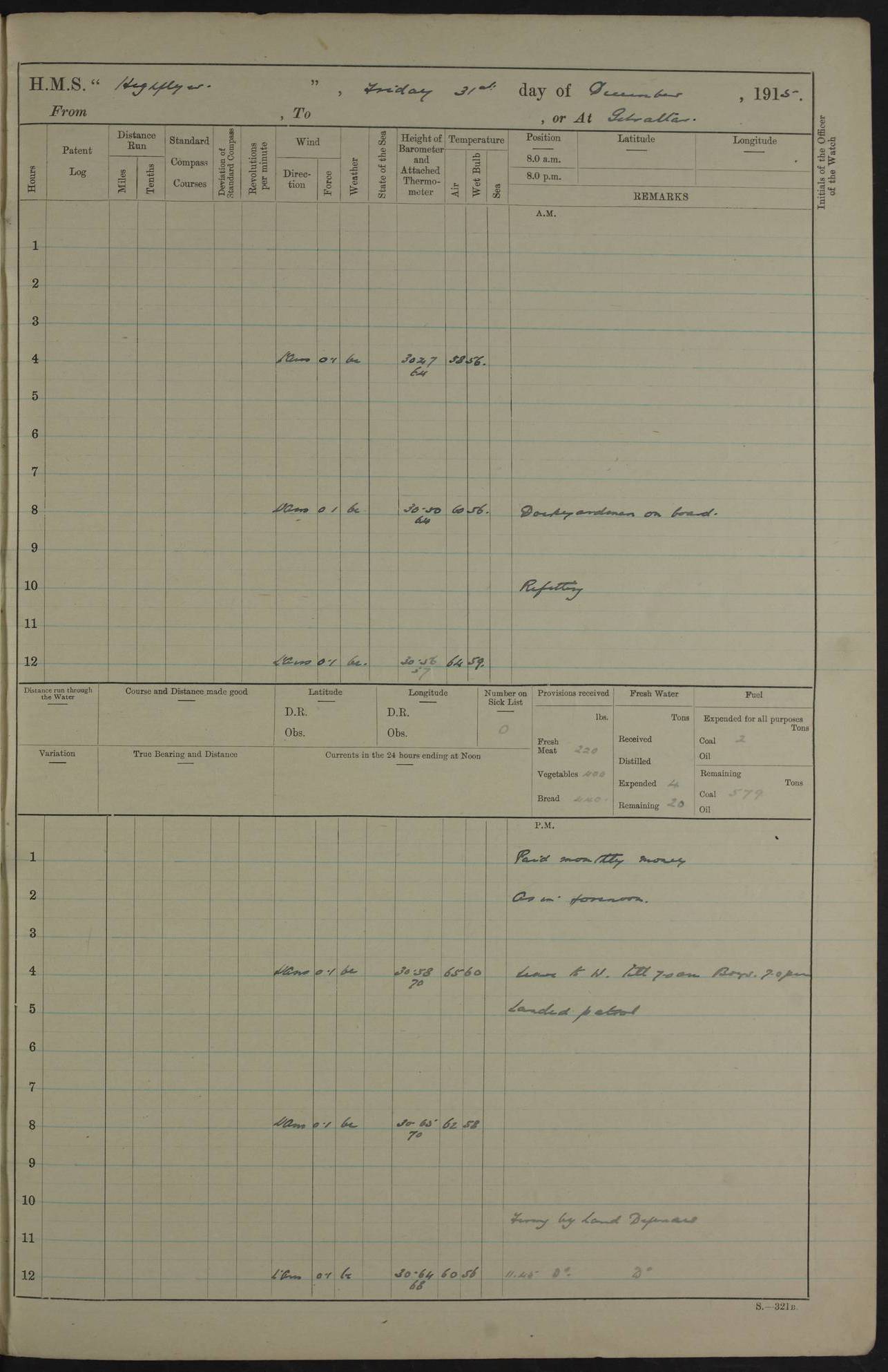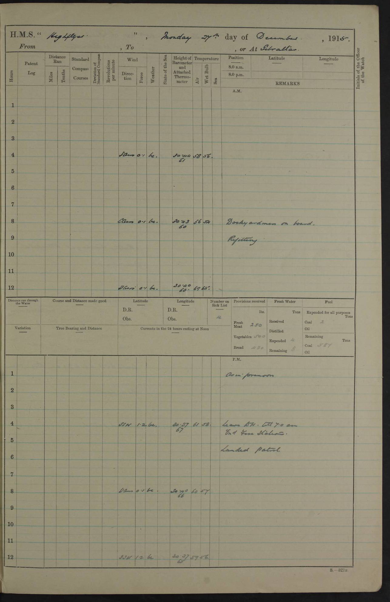 LOGS FOR JANUARY 1916 4f96113fa2fc8e2def000829: (http://s3.amazonaws.com/oldweather/ADM53-44302/ADM 53-44302-001_0.jpg) 4f961140a2fc8e2def00082a: (http://s3.amazonaws.com/oldweather/ADM53-44302/ADM 53-44302-001_1.jpg) 4f961140a2fc8e2def00082b: (http://s3.amazonaws.com/oldweather/ADM53-44302/ADM 53-44302-002_0.jpg) 4f961140a2fc8e2def00082c: (http://s3.amazonaws.com/oldweather/ADM53-44302/ADM 53-44302-002_1.jpg) 4f961141a2fc8e2def00082d: (http://s3.amazonaws.com/oldweather/ADM53-44302/ADM 53-44302-003_0.jpg) 4f961141a2fc8e2def00082e: (http://s3.amazonaws.com/oldweather/ADM53-44302/ADM 53-44302-003_1.jpg) 4f961141a2fc8e2def00082f: (http://s3.amazonaws.com/oldweather/ADM53-44302/ADM 53-44302-004_0.jpg) 4f961142a2fc8e2def000830: (http://s3.amazonaws.com/oldweather/ADM53-44302/ADM 53-44302-004_1.jpg) 4f961142a2fc8e2def000831: (http://s3.amazonaws.com/oldweather/ADM53-44302/ADM 53-44302-005_0.jpg) 4f961142a2fc8e2def000832: (http://s3.amazonaws.com/oldweather/ADM53-44302/ADM 53-44302-005_1.jpg) 1 January 1916 Gibraltar Lat 36.1, Long -5.3 9.00am: Dockyardmen on board. 5.30pm: Mr. Ritchie, Artificer Engineer joined ship. 4f961143a2fc8e2def000833: (http://s3.amazonaws.com/oldweather/ADM53-44302/ADM 53-44302-006_0.jpg) 2 January 1916 Gibraltar Lat 36.1, Long -5.3 9.30am: Landed church parties. 4f961143a2fc8e2def000834: (http://s3.amazonaws.com/oldweather/ADM53-44302/ADM 53-44302-006_1.jpg) 3 January 1916 Gibraltar Lat 36.1, Long -5.3 11.00am: Replaced topmasts. 1.00pm: Commander Casement discharged to hospital. 4f961143a2fc8e2def000835: (http://s3.amazonaws.com/oldweather/ADM53-44302/ADM 53-44302-007_0.jpg) 4 January 1916 Gibraltar Lat 36.1, Long -5.3 General refit. 10.30am: Discharged 2 Ratings to hospital. 4f961144a2fc8e2def000836: (http://s3.amazonaws.com/oldweather/ADM53-44302/ADM 53-44302-007_1.jpg) 5 January 1916 Gibraltar Lat 36.1, Long -5.3 7.30am: Dockyardmen on board. 9.00am: Discharged one Rating to hospital. 4f961144a2fc8e2def000837: (http://s3.amazonaws.com/oldweather/ADM53-44302/ADM 53-44302-008_0.jpg) 6 January 1916 Gibraltar Lat 36.1, Long -5.3 10.00am: Returning and drawing stores. 4f961144a2fc8e2def000838: (http://s3.amazonaws.com/oldweather/ADM53-44302/ADM 53-44302-008_1.jpg) 7 January 1916 Gibraltar Lat 36.1, Long -5.3 10.00am: Party drawing provisions for fore holds. 11.00am: 3 Seamen, 3 Stokers, 3 Marines, 1 NP, 1 SBS joined ship. 4f961145a2fc8e2def000839: (http://s3.amazonaws.com/oldweather/ADM53-44302/ADM 53-44302-009_0.jpg) 8 January 1916 Gibraltar Lat 36.1, Long -5.3 1.30pm: Discharged 1 prisoner to detention quarter. 4f961145a2fc8e2def00083a: (http://s3.amazonaws.com/oldweather/ADM53-44302/ADM 53-44302-009_1.jpg) 9 January 1916 Gibraltar Lat 36.1, Long -5.3 10.00am: Captain presented Persian Gulf Gen. Service Medals to Mr. Ward, Artificer Engineer, and 5 Ratings. 4f961145a2fc8e2def00083b: (http://s3.amazonaws.com/oldweather/ADM53-44302/ADM 53-44302-010_0.jpg) 10 January 1916 Gibraltar Lat 36.1, Long -5.3 5.00pm: Discharged Mr. Ward Art Eng, 1 Ch. SBS, 1 RNR, 3 Marines, 2 POI., 3 Stoker, 1 Marine to HMS TERRIBLE for passage home. 4f961146a2fc8e2def00083c: (http://s3.amazonaws.com/oldweather/ADM53-44302/ADM 53-44302-010_1.jpg) 11 January 1916 Gibraltar Lat 36.1, Long -5.3 9.00am: Carrying out general refit. 10.00am: Replaced starboard cable after cleaning and testing (carried out by Dockyard). 4f961146a2fc8e2def00083d: (http://s3.amazonaws.com/oldweather/ADM53-44302/ADM 53-44302-011_0.jpg) 12 January 1916 Gibraltar Lat 36.1, Long -5.3 Carrying out general refit. 4f961146a2fc8e2def00083e: (http://s3.amazonaws.com/oldweather/ADM53-44302/ADM 53-44302-011_1.jpg) 13 January 1916 Gibraltar Lat 36.1, Long -5.3 Carrying out general refit. 10.00am: Marines landed for drill. 4f961147a2fc8e2def00083f: (http://s3.amazonaws.com/oldweather/ADM53-44302/ADM 53-44302-012_0.jpg) 14 January 1916 Gibraltar Lat 36.1, Long -5.3 10.00am: Party replacing port cable after test and survey by Dockyard. 4f961147a2fc8e2def000840: (http://s3.amazonaws.com/oldweather/ADM53-44302/ADM 53-44302-012_1.jpg) 15 January 1916 Gibraltar Lat 36.1, Long -5.3 9.00am: Carrying out general refit. Party working about cable. 4f961147a2fc8e2def000841: (http://s3.amazonaws.com/oldweather/ADM53-44302/ADM 53-44302-013_0.jpg) 16 January 1916 Gibraltar Lat 36.1, Long -5.3 9.00am: Landed church parties. 4f961148a2fc8e2def000842: (http://s3.amazonaws.com/oldweather/ADM53-44302/ADM 53-44302-013_1.jpg) 17 January 1916 Gibraltar Lat 36.1, Long -5.3 1.00pm: 42 Ratings left ship for passage to England. 4f961148a2fc8e2def000843: (http://s3.amazonaws.com/oldweather/ADM53-44302/ADM 53-44302-014_0.jpg) 18 January 1916 Gibraltar Lat 36.1, Long -5.3 10.00am: Party drawing torpedoes. 3.00pm: Partially flooded dock. 4f961148a2fc8e2def000844: (http://s3.amazonaws.com/oldweather/ADM53-44302/ADM 53-44302-014_1.jpg) 19 January 1916 Gibraltar Lat 36.1, Long -5.3 8.30am: Flooded dock. 9.00am: Shifted berth to No 5 billet S Mole. 4f961149a2fc8e2def000845: (http://s3.amazonaws.com/oldweather/ADM53-44302/ADM 53-44302-015_0.jpg) 20 January 1916 Gibraltar Lat 36.1, Long -5.3 10.30am: Marines landed for drill. 11.00am: Drawing Engineers’ stores. 4f961149a2fc8e2def000846: (http://s3.amazonaws.com/oldweather/ADM53-44302/ADM 53-44302-015_1.jpg) 21 January 1916 Gibraltar Lat 36.1, Long -5.3 9.00am: Ammunitioning ship. 4f961149a2fc8e2def000847: (http://s3.amazonaws.com/oldweather/ADM53-44302/ADM 53-44302-016_0.jpg) 22 January 1916 Gibraltar Lat 36.1, Long -5.3 9.00am: Ammunitioning ship. 1.30pm: One Marine discharged to Detention Quarters. 4f96114aa2fc8e2def000848: (http://s3.amazonaws.com/oldweather/ADM53-44302/ADM 53-44302-016_1.jpg) 23 January 1916 Gibraltar Lat 36.1, Long -5.3 9.00am: Landed church parties. 4f96114aa2fc8e2def000849: (http://s3.amazonaws.com/oldweather/ADM53-44302/ADM 53-44302-017_0.jpg) 24 January 1916 Gibraltar Lat 36.1, Long -5.3 7.30am: Commenced coaling. Dockyard labour shore party. 1.30pm: Finished coaling; received 565 tons. 2.0