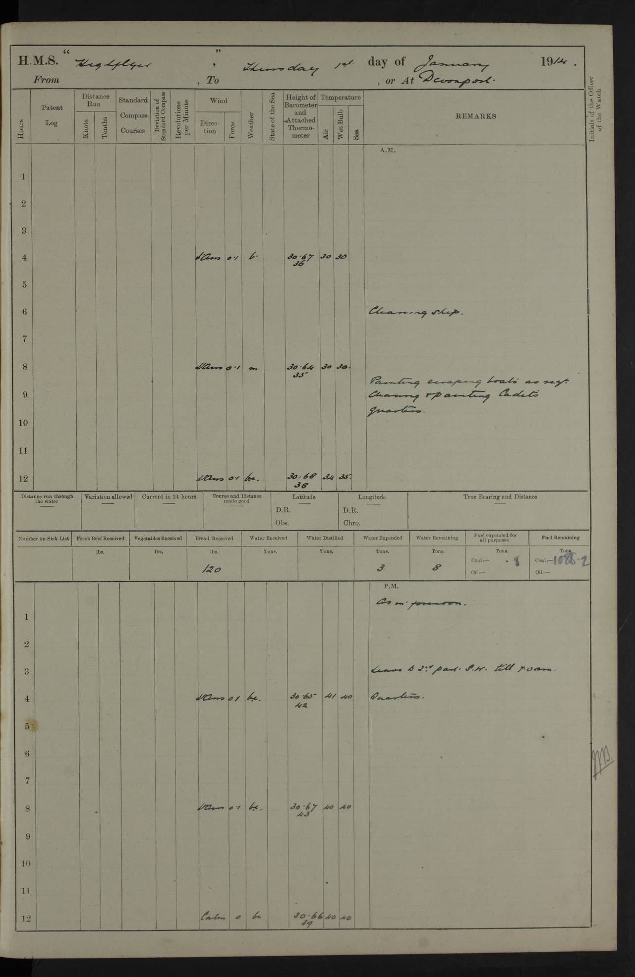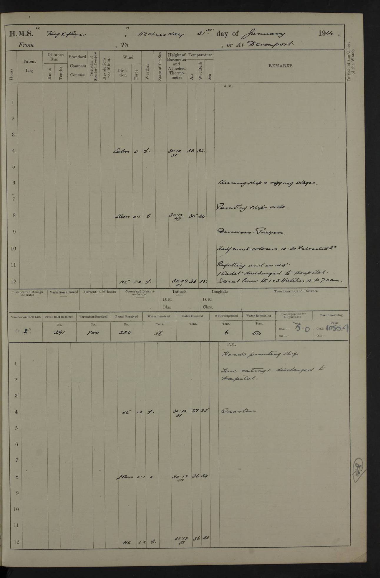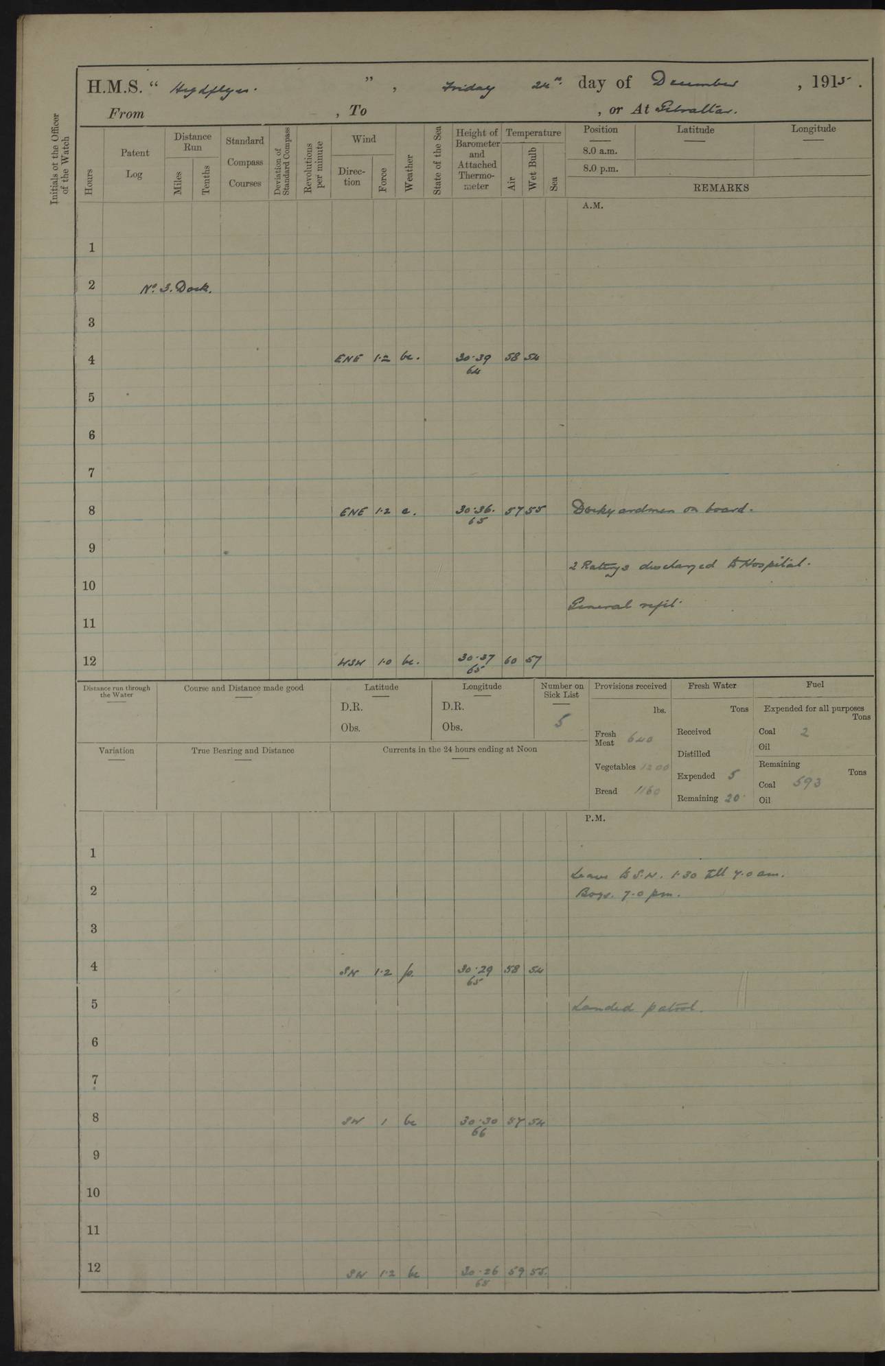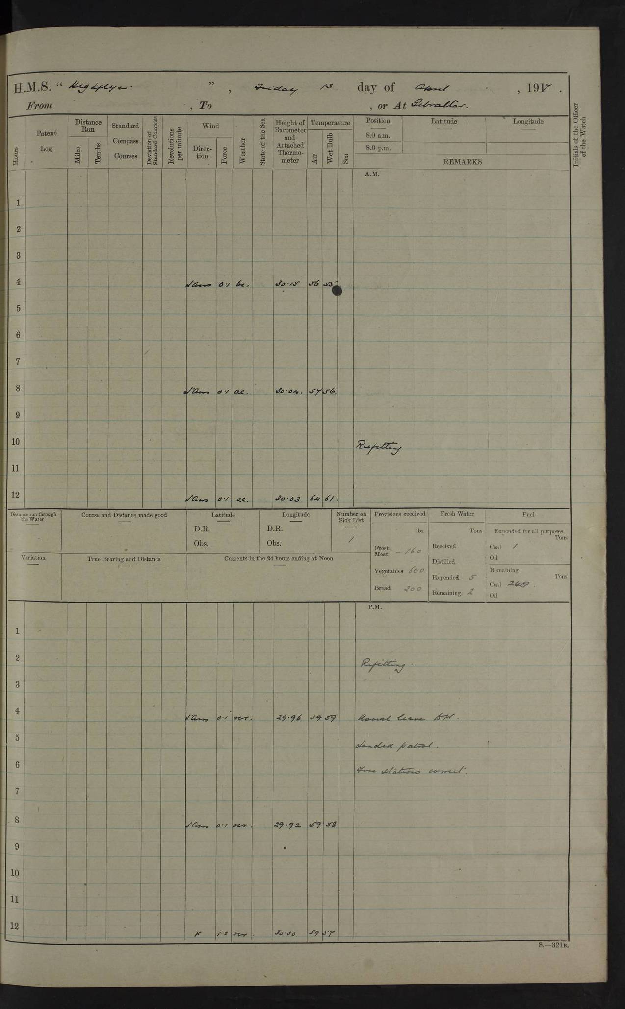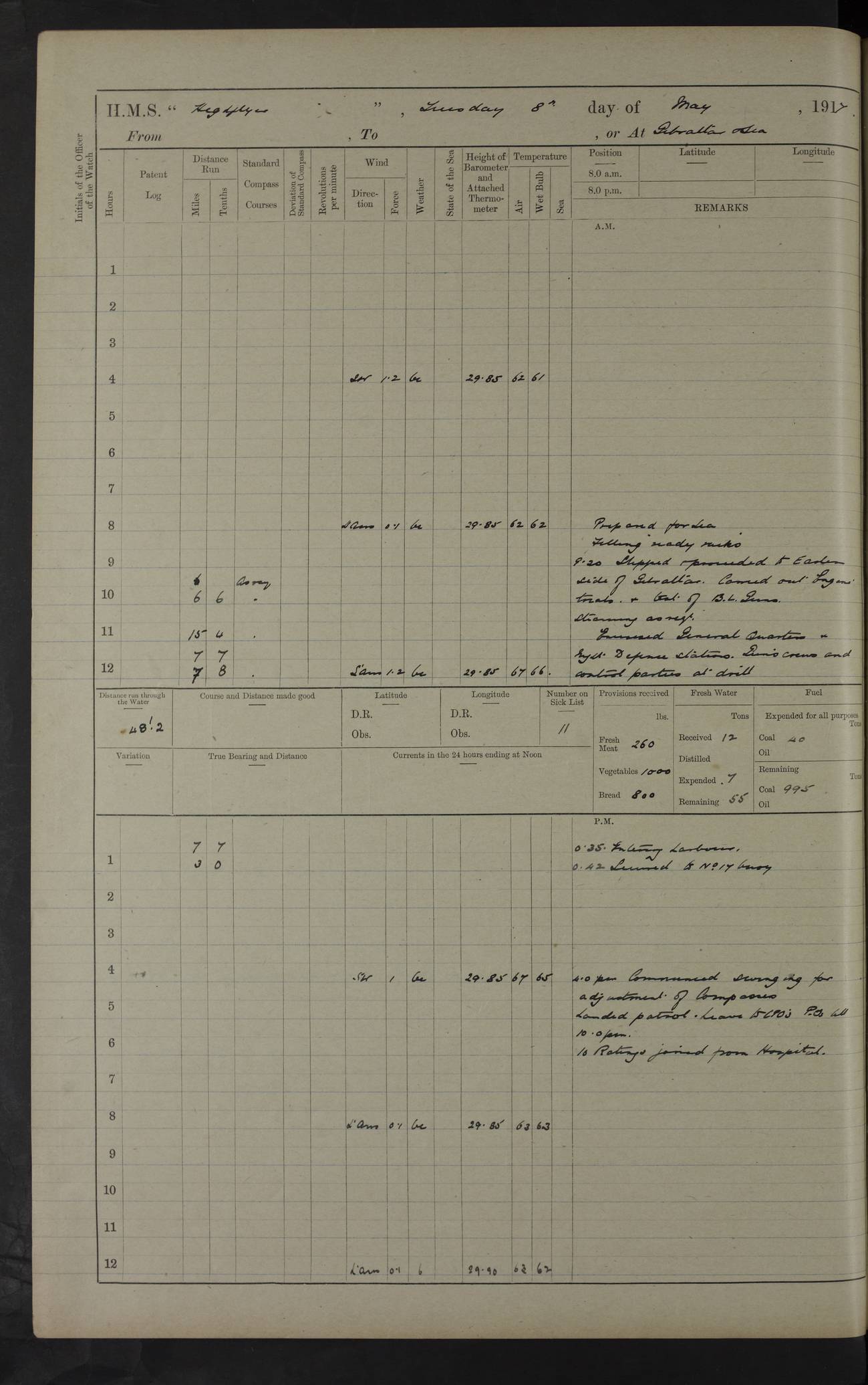 LOGS FOR JANUARY 1916 4f96113fa2fc8e2def000829: (http://s3.amazonaws.com/oldweather/ADM53-44302/ADM 53-44302-001_0.jpg) 4f961140a2fc8e2def00082a: (http://s3.amazonaws.com/oldweather/ADM53-44302/ADM 53-44302-001_1.jpg) 4f961140a2fc8e2def00082b: (http://s3.amazonaws.com/oldweather/ADM53-44302/ADM 53-44302-002_0.jpg) 4f961140a2fc8e2def00082c: (http://s3.amazonaws.com/oldweather/ADM53-44302/ADM 53-44302-002_1.jpg) 4f961141a2fc8e2def00082d: (http://s3.amazonaws.com/oldweather/ADM53-44302/ADM 53-44302-003_0.jpg) 4f961141a2fc8e2def00082e: (http://s3.amazonaws.com/oldweather/ADM53-44302/ADM 53-44302-003_1.jpg) 4f961141a2fc8e2def00082f: (http://s3.amazonaws.com/oldweather/ADM53-44302/ADM 53-44302-004_0.jpg) 4f961142a2fc8e2def000830: (http://s3.amazonaws.com/oldweather/ADM53-44302/ADM 53-44302-004_1.jpg) 4f961142a2fc8e2def000831: (http://s3.amazonaws.com/oldweather/ADM53-44302/ADM 53-44302-005_0.jpg) 4f961142a2fc8e2def000832: (http://s3.amazonaws.com/oldweather/ADM53-44302/ADM 53-44302-005_1.jpg) 1 January 1916 Gibraltar Lat 36.1, Long -5.3 9.00am: Dockyardmen on board. 5.30pm: Mr. Ritchie, Artificer Engineer joined ship. 4f961143a2fc8e2def000833: (http://s3.amazonaws.com/oldweather/ADM53-44302/ADM 53-44302-006_0.jpg) 2 January 1916 Gibraltar Lat 36.1, Long -5.3 9.30am: Landed church parties. 4f961143a2fc8e2def000834: (http://s3.amazonaws.com/oldweather/ADM53-44302/ADM 53-44302-006_1.jpg) 3 January 1916 Gibraltar Lat 36.1, Long -5.3 11.00am: Replaced topmasts. 1.00pm: Commander Casement discharged to hospital. 4f961143a2fc8e2def000835: (http://s3.amazonaws.com/oldweather/ADM53-44302/ADM 53-44302-007_0.jpg) 4 January 1916 Gibraltar Lat 36.1, Long -5.3 General refit. 10.30am: Discharged 2 Ratings to hospital. 4f961144a2fc8e2def000836: (http://s3.amazonaws.com/oldweather/ADM53-44302/ADM 53-44302-007_1.jpg) 5 January 1916 Gibraltar Lat 36.1, Long -5.3 7.30am: Dockyardmen on board. 9.00am: Discharged one Rating to hospital. 4f961144a2fc8e2def000837: (http://s3.amazonaws.com/oldweather/ADM53-44302/ADM 53-44302-008_0.jpg) 6 January 1916 Gibraltar Lat 36.1, Long -5.3 10.00am: Returning and drawing stores. 4f961144a2fc8e2def000838: (http://s3.amazonaws.com/oldweather/ADM53-44302/ADM 53-44302-008_1.jpg) 7 January 1916 Gibraltar Lat 36.1, Long -5.3 10.00am: Party drawing provisions for fore holds. 11.00am: 3 Seamen, 3 Stokers, 3 Marines, 1 NP, 1 SBS joined ship. 4f961145a2fc8e2def000839: (http://s3.amazonaws.com/oldweather/ADM53-44302/ADM 53-44302-009_0.jpg) 8 January 1916 Gibraltar Lat 36.1, Long -5.3 1.30pm: Discharged 1 prisoner to detention quarter. 4f961145a2fc8e2def00083a: (http://s3.amazonaws.com/oldweather/ADM53-44302/ADM 53-44302-009_1.jpg) 9 January 1916 Gibraltar Lat 36.1, Long -5.3 10.00am: Captain presented Persian Gulf Gen. Service Medals to Mr. Ward, Artificer Engineer, and 5 Ratings. 4f961145a2fc8e2def00083b: (http://s3.amazonaws.com/oldweather/ADM53-44302/ADM 53-44302-010_0.jpg) 10 January 1916 Gibraltar Lat 36.1, Long -5.3 5.00pm: Discharged Mr. Ward Art Eng, 1 Ch. SBS, 1 RNR, 3 Marines, 2 POI., 3 Stoker, 1 Marine to HMS TERRIBLE for passage home. 4f961146a2fc8e2def00083c: (http://s3.amazonaws.com/oldweather/ADM53-44302/ADM 53-44302-010_1.jpg) 11 January 1916 Gibraltar Lat 36.1, Long -5.3 9.00am: Carrying out general refit. 10.00am: Replaced starboard cable after cleaning and testing (carried out by Dockyard). 4f961146a2fc8e2def00083d: (http://s3.amazonaws.com/oldweather/ADM53-44302/ADM 53-44302-011_0.jpg) 12 January 1916 Gibraltar Lat 36.1, Long -5.3 Carrying out general refit. 4f961146a2fc8e2def00083e: (http://s3.amazonaws.com/oldweather/ADM53-44302/ADM 53-44302-011_1.jpg) 13 January 1916 Gibraltar Lat 36.1, Long -5.3 Carrying out general refit. 10.00am: Marines landed for drill. 4f961147a2fc8e2def00083f: (http://s3.amazonaws.com/oldweather/ADM53-44302/ADM 53-44302-012_0.jpg) 14 January 1916 Gibraltar Lat 36.1, Long -5.3 10.00am: Party replacing port cable after test and survey by Dockyard. 4f961147a2fc8e2def000840: (http://s3.amazonaws.com/oldweather/ADM53-44302/ADM 53-44302-012_1.jpg) 15 January 1916 Gibraltar Lat 36.1, Long -5.3 9.00am: Carrying out general refit. Party working about cable. 4f961147a2fc8e2def000841: (http://s3.amazonaws.com/oldweather/ADM53-44302/ADM 53-44302-013_0.jpg) 16 January 1916 Gibraltar Lat 36.1, Long -5.3 9.00am: Landed church parties. 4f961148a2fc8e2def000842: (http://s3.amazonaws.com/oldweather/ADM53-44302/ADM 53-44302-013_1.jpg) 17 January 1916 Gibraltar Lat 36.1, Long -5.3 1.00pm: 42 Ratings left ship for passage to England. 4f961148a2fc8e2def000843: (http://s3.amazonaws.com/oldweather/ADM53-44302/ADM 53-44302-014_0.jpg) 18 January 1916 Gibraltar Lat 36.1, Long -5.3 10.00am: Party drawing torpedoes. 3.00pm: Partially flooded dock. 4f961148a2fc8e2def000844: (http://s3.amazonaws.com/oldweather/ADM53-44302/ADM 53-44302-014_1.jpg) 19 January 1916 Gibraltar Lat 36.1, Long -5.3 8.30am: Flooded dock. 9.00am: Shifted berth to No 5 billet S Mole. 4f961149a2fc8e2def000845: (http://s3.amazonaws.com/oldweather/ADM53-44302/ADM 53-44302-015_0.jpg) 20 January 1916 Gibraltar Lat 36.1, Long -5.3 10.30am: Marines landed for drill. 11.00am: Drawing Engineers’ stores. 4f961149a2fc8e2def000846: (http://s3.amazonaws.com/oldweather/ADM53-44302/ADM 53-44302-015_1.jpg) 21 January 1916 Gibraltar Lat 36.1, Long -5.3 9.00am: Ammunitioning ship. 4f961149a2fc8e2def000847: (http://s3.amazonaws.com/oldweather/ADM53-44302/ADM 53-44302-016_0.jpg) 22 January 1916 Gibraltar Lat 36.1, Long -5.3 9.00am: Ammunitioning ship. 1.30pm: One Marine discharged to Detention Quarters. 4f96114aa2fc8e2def000848: (http://s3.amazonaws.com/oldweather/ADM53-44302/ADM 53-44302-016_1.jpg) 23 January 1916 Gibraltar Lat 36.1, Long -5.3 9.00am: Landed church parties. 4f96114aa2fc8e2def000849: (http://s3.amazonaws.com/oldweather/ADM53-44302/ADM 53-44302-017_0.jpg) 24 January 1916 Gibraltar Lat 36.1, Long -5.3 7.30am: Commenced coaling. Dockyard labour shore party. 1.30pm: Finished coaling; received 565 tons. 2.0