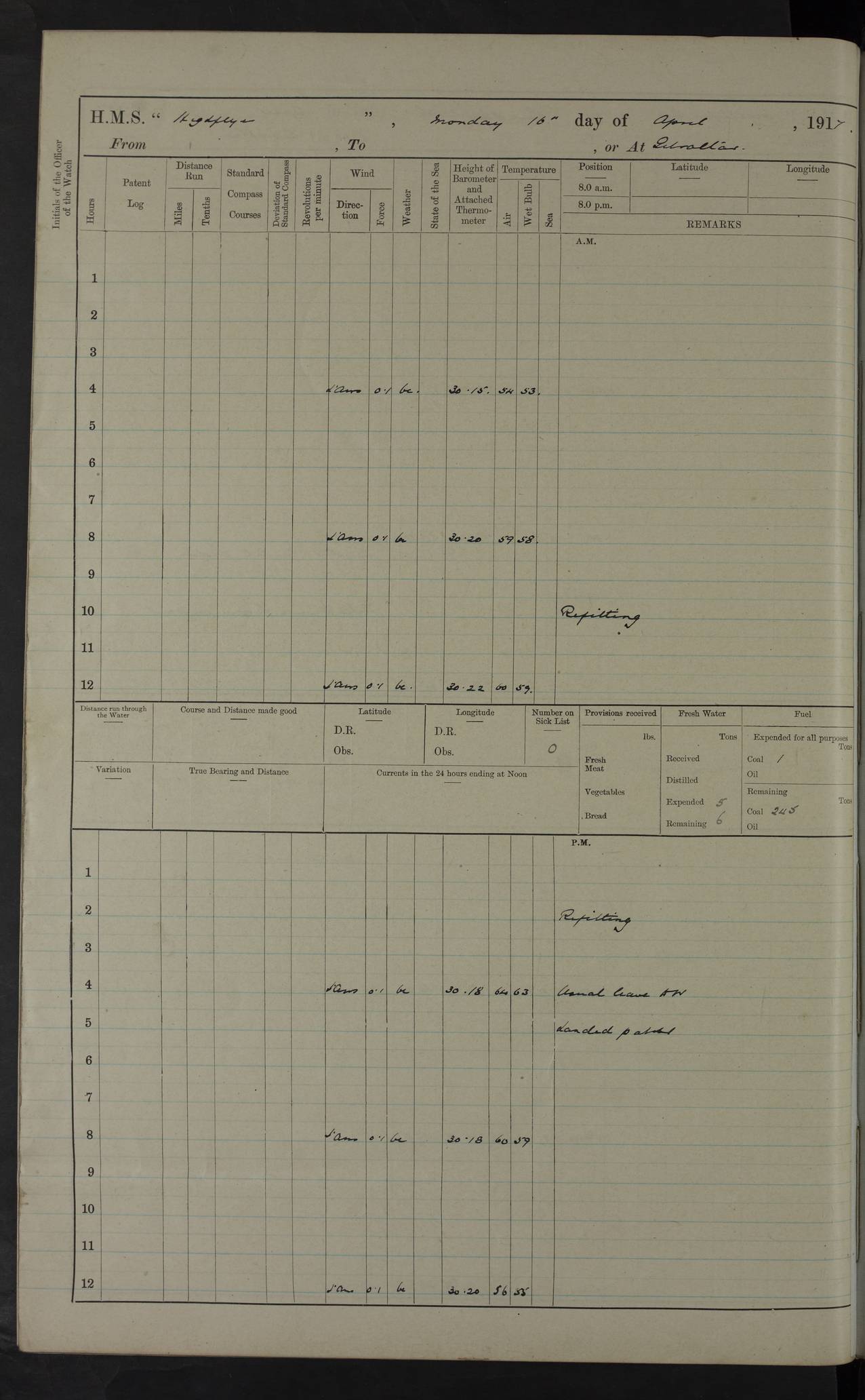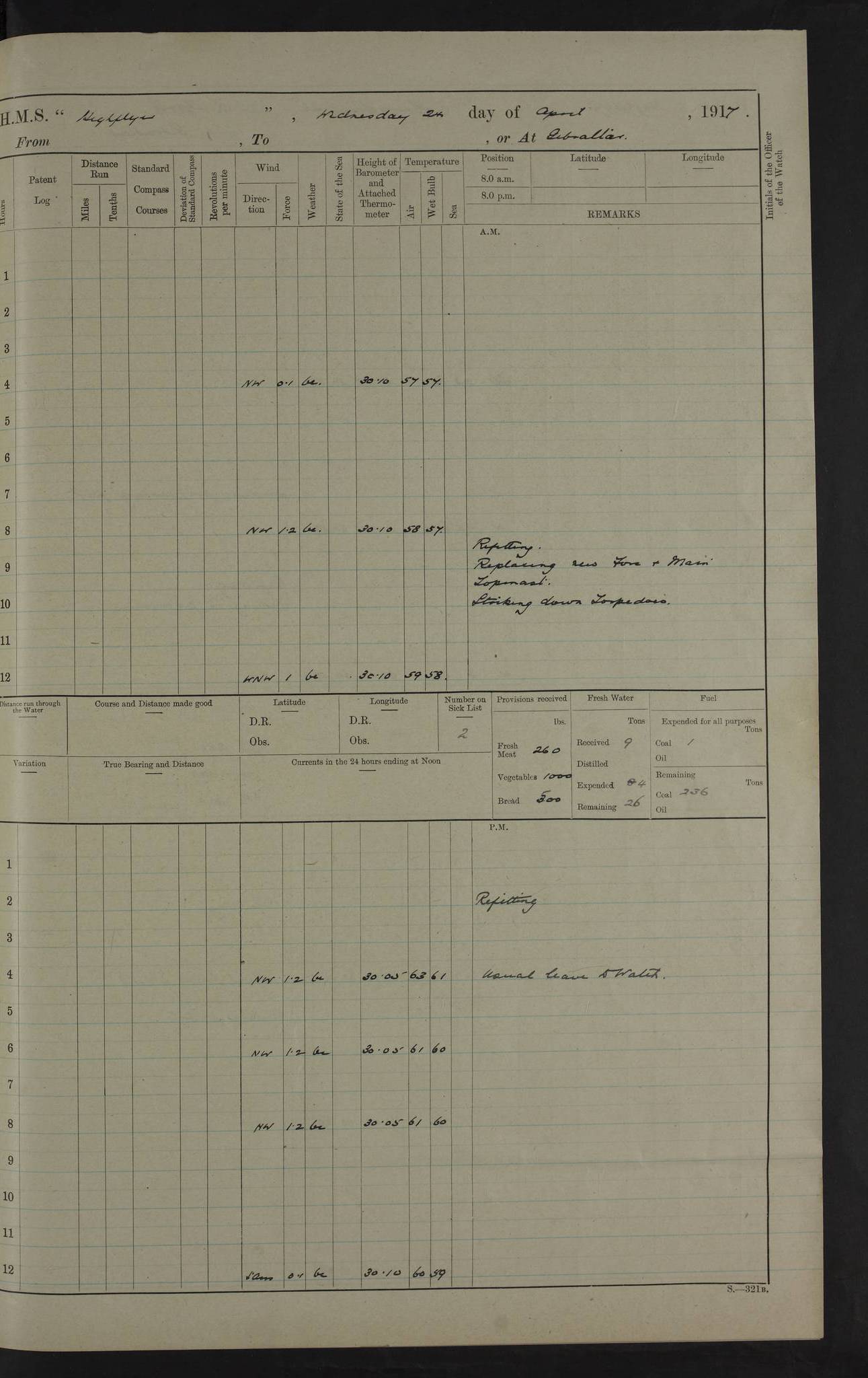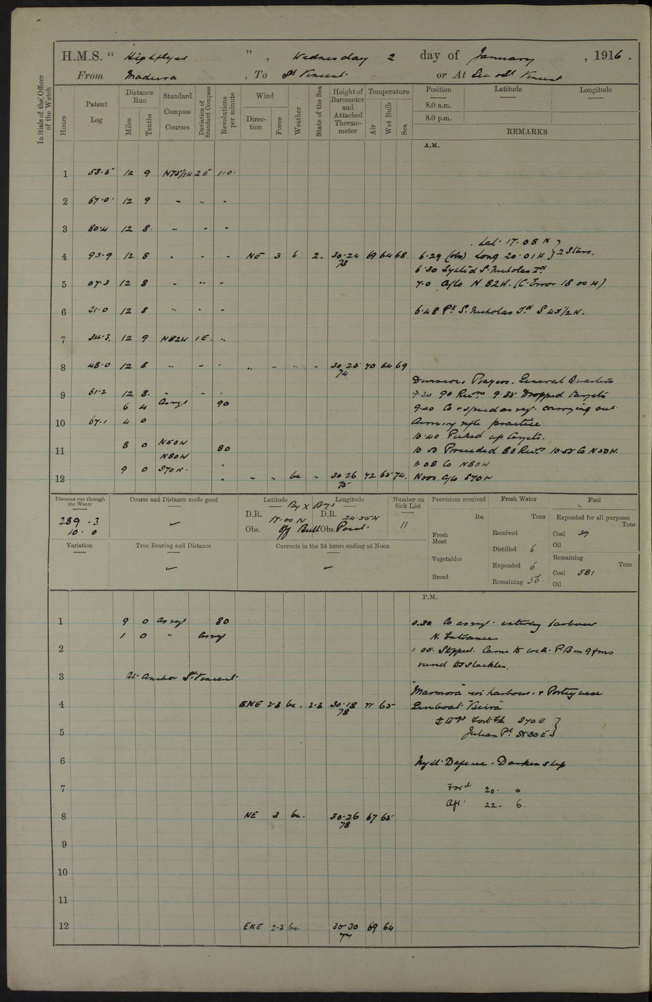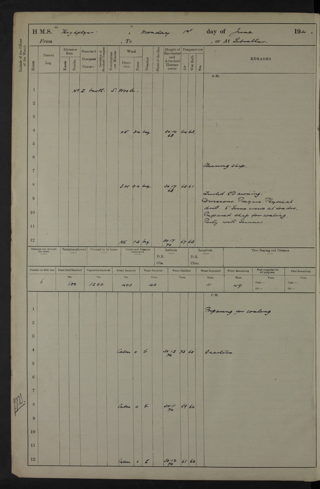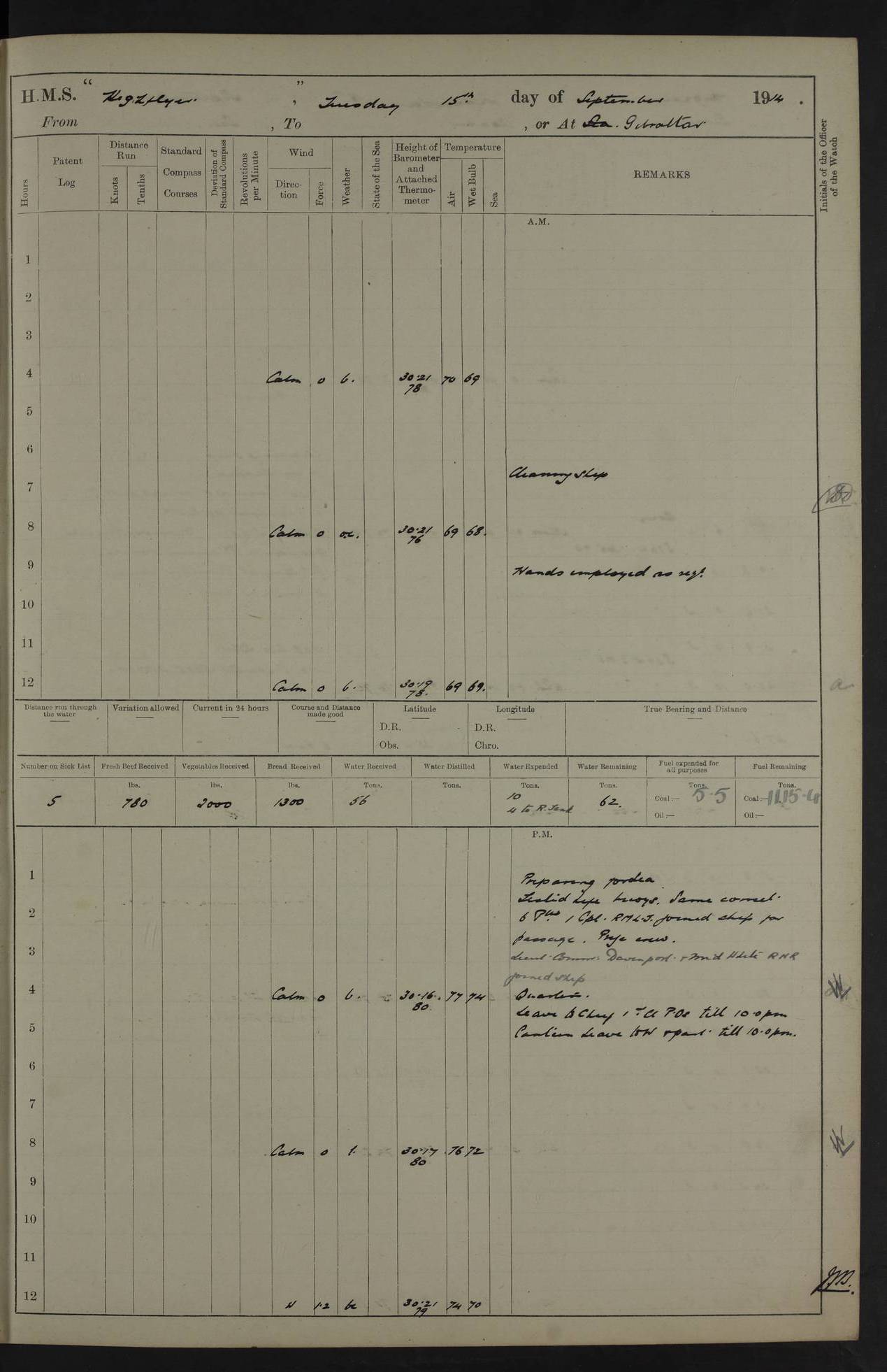LOGS FOR JANUARY 1916 4f96113fa2fc8e2def000829: (http://s3.amazonaws.com/oldweather/ADM53-44302/ADM 53-44302-001_0.jpg) 4f961140a2fc8e2def00082a: (http://s3.amazonaws.com/oldweather/ADM53-44302/ADM 53-44302-001_1.jpg) 4f961140a2fc8e2def00082b: (http://s3.amazonaws.com/oldweather/ADM53-44302/ADM 53-44302-002_0.jpg) 4f961140a2fc8e2def00082c: (http://s3.amazonaws.com/oldweather/ADM53-44302/ADM 53-44302-002_1.jpg) 4f961141a2fc8e2def00082d: (http://s3.amazonaws.com/oldweather/ADM53-44302/ADM 53-44302-003_0.jpg) 4f961141a2fc8e2def00082e: (http://s3.amazonaws.com/oldweather/ADM53-44302/ADM 53-44302-003_1.jpg) 4f961141a2fc8e2def00082f: (http://s3.amazonaws.com/oldweather/ADM53-44302/ADM 53-44302-004_0.jpg) 4f961142a2fc8e2def000830: (http://s3.amazonaws.com/oldweather/ADM53-44302/ADM 53-44302-004_1.jpg) 4f961142a2fc8e2def000831: (http://s3.amazonaws.com/oldweather/ADM53-44302/ADM 53-44302-005_0.jpg) 4f961142a2fc8e2def000832: (http://s3.amazonaws.com/oldweather/ADM53-44302/ADM 53-44302-005_1.jpg) 1 January 1916 Gibraltar Lat 36.1, Long -5.3 9.00am: Dockyardmen on board. 5.30pm: Mr. Ritchie, Artificer Engineer joined ship. 4f961143a2fc8e2def000833: (http://s3.amazonaws.com/oldweather/ADM53-44302/ADM 53-44302-006_0.jpg) 2 January 1916 Gibraltar Lat 36.1, Long -5.3 9.30am: Landed church parties. 4f961143a2fc8e2def000834: (http://s3.amazonaws.com/oldweather/ADM53-44302/ADM 53-44302-006_1.jpg) 3 January 1916 Gibraltar Lat 36.1, Long -5.3 11.00am: Replaced topmasts. 1.00pm: Commander Casement discharged to hospital. 4f961143a2fc8e2def000835: (http://s3.amazonaws.com/oldweather/ADM53-44302/ADM 53-44302-007_0.jpg) 4 January 1916 Gibraltar Lat 36.1, Long -5.3 General refit. 10.30am: Discharged 2 Ratings to hospital. 4f961144a2fc8e2def000836: (http://s3.amazonaws.com/oldweather/ADM53-44302/ADM 53-44302-007_1.jpg) 5 January 1916 Gibraltar Lat 36.1, Long -5.3 7.30am: Dockyardmen on board. 9.00am: Discharged one Rating to hospital. 4f961144a2fc8e2def000837: (http://s3.amazonaws.com/oldweather/ADM53-44302/ADM 53-44302-008_0.jpg) 6 January 1916 Gibraltar Lat 36.1, Long -5.3 10.00am: Returning and drawing stores. 4f961144a2fc8e2def000838: (http://s3.amazonaws.com/oldweather/ADM53-44302/ADM 53-44302-008_1.jpg) 7 January 1916 Gibraltar Lat 36.1, Long -5.3 10.00am: Party drawing provisions for fore holds. 11.00am: 3 Seamen, 3 Stokers, 3 Marines, 1 NP, 1 SBS joined ship. 4f961145a2fc8e2def000839: (http://s3.amazonaws.com/oldweather/ADM53-44302/ADM 53-44302-009_0.jpg) 8 January 1916 Gibraltar Lat 36.1, Long -5.3 1.30pm: Discharged 1 prisoner to detention quarter. 4f961145a2fc8e2def00083a: (http://s3.amazonaws.com/oldweather/ADM53-44302/ADM 53-44302-009_1.jpg) 9 January 1916 Gibraltar Lat 36.1, Long -5.3 10.00am: Captain presented Persian Gulf Gen. Service Medals to Mr. Ward, Artificer Engineer, and 5 Ratings. 4f961145a2fc8e2def00083b: (http://s3.amazonaws.com/oldweather/ADM53-44302/ADM 53-44302-010_0.jpg) 10 January 1916 Gibraltar Lat 36.1, Long -5.3 5.00pm: Discharged Mr. Ward Art Eng, 1 Ch. SBS, 1 RNR, 3 Marines, 2 POI., 3 Stoker, 1 Marine to HMS TERRIBLE for passage home. 4f961146a2fc8e2def00083c: (http://s3.amazonaws.com/oldweather/ADM53-44302/ADM 53-44302-010_1.jpg) 11 January 1916 Gibraltar Lat 36.1, Long -5.3 9.00am: Carrying out general refit. 10.00am: Replaced starboard cable after cleaning and testing (carried out by Dockyard). 4f961146a2fc8e2def00083d: (http://s3.amazonaws.com/oldweather/ADM53-44302/ADM 53-44302-011_0.jpg) 12 January 1916 Gibraltar Lat 36.1, Long -5.3 Carrying out general refit. 4f961146a2fc8e2def00083e: (http://s3.amazonaws.com/oldweather/ADM53-44302/ADM 53-44302-011_1.jpg) 13 January 1916 Gibraltar Lat 36.1, Long -5.3 Carrying out general refit. 10.00am: Marines landed for drill. 4f961147a2fc8e2def00083f: (http://s3.amazonaws.com/oldweather/ADM53-44302/ADM 53-44302-012_0.jpg) 14 January 1916 Gibraltar Lat 36.1, Long -5.3 10.00am: Party replacing port cable after test and survey by Dockyard. 4f961147a2fc8e2def000840: (http://s3.amazonaws.com/oldweather/ADM53-44302/ADM 53-44302-012_1.jpg) 15 January 1916 Gibraltar Lat 36.1, Long -5.3 9.00am: Carrying out general refit. Party working about cable. 4f961147a2fc8e2def000841: (http://s3.amazonaws.com/oldweather/ADM53-44302/ADM 53-44302-013_0.jpg) 16 January 1916 Gibraltar Lat 36.1, Long -5.3 9.00am: Landed church parties. 4f961148a2fc8e2def000842: (http://s3.amazonaws.com/oldweather/ADM53-44302/ADM 53-44302-013_1.jpg) 17 January 1916 Gibraltar Lat 36.1, Long -5.3 1.00pm: 42 Ratings left ship for passage to England. 4f961148a2fc8e2def000843: (http://s3.amazonaws.com/oldweather/ADM53-44302/ADM 53-44302-014_0.jpg) 18 January 1916 Gibraltar Lat 36.1, Long -5.3 10.00am: Party drawing torpedoes. 3.00pm: Partially flooded dock. 4f961148a2fc8e2def000844: (http://s3.amazonaws.com/oldweather/ADM53-44302/ADM 53-44302-014_1.jpg) 19 January 1916 Gibraltar Lat 36.1, Long -5.3 8.30am: Flooded dock. 9.00am: Shifted berth to No 5 billet S Mole. 4f961149a2fc8e2def000845: (http://s3.amazonaws.com/oldweather/ADM53-44302/ADM 53-44302-015_0.jpg) 20 January 1916 Gibraltar Lat 36.1, Long -5.3 10.30am: Marines landed for drill. 11.00am: Drawing Engineers’ stores. 4f961149a2fc8e2def000846: (http://s3.amazonaws.com/oldweather/ADM53-44302/ADM 53-44302-015_1.jpg) 21 January 1916 Gibraltar Lat 36.1, Long -5.3 9.00am: Ammunitioning ship. 4f961149a2fc8e2def000847: (http://s3.amazonaws.com/oldweather/ADM53-44302/ADM 53-44302-016_0.jpg) 22 January 1916 Gibraltar Lat 36.1, Long -5.3 9.00am: Ammunitioning ship. 1.30pm: One Marine discharged to Detention Quarters. 4f96114aa2fc8e2def000848: (http://s3.amazonaws.com/oldweather/ADM53-44302/ADM 53-44302-016_1.jpg) 23 January 1916 Gibraltar Lat 36.1, Long -5.3 9.00am: Landed church parties. 4f96114aa2fc8e2def000849: (http://s3.amazonaws.com/oldweather/ADM53-44302/ADM 53-44302-017_0.jpg) 24 January 1916 Gibraltar Lat 36.1, Long -5.3 7.30am: Commenced coaling. Dockyard labour shore party. 1.30pm: Finished coaling; received 565 tons. 2.0