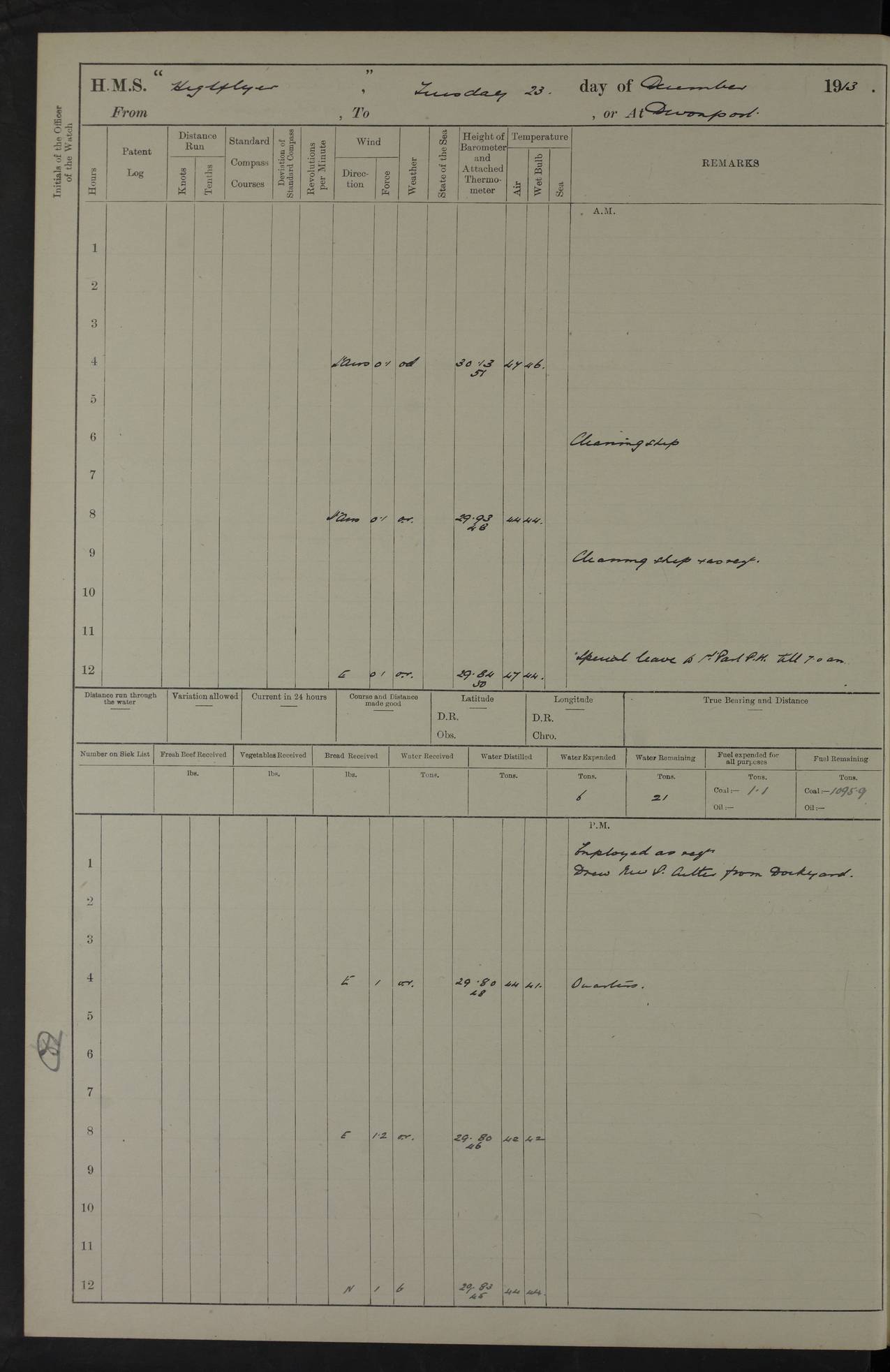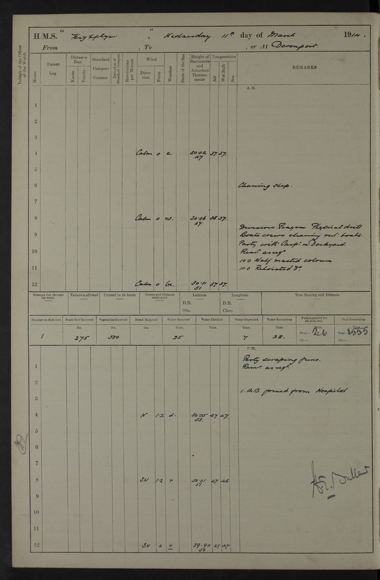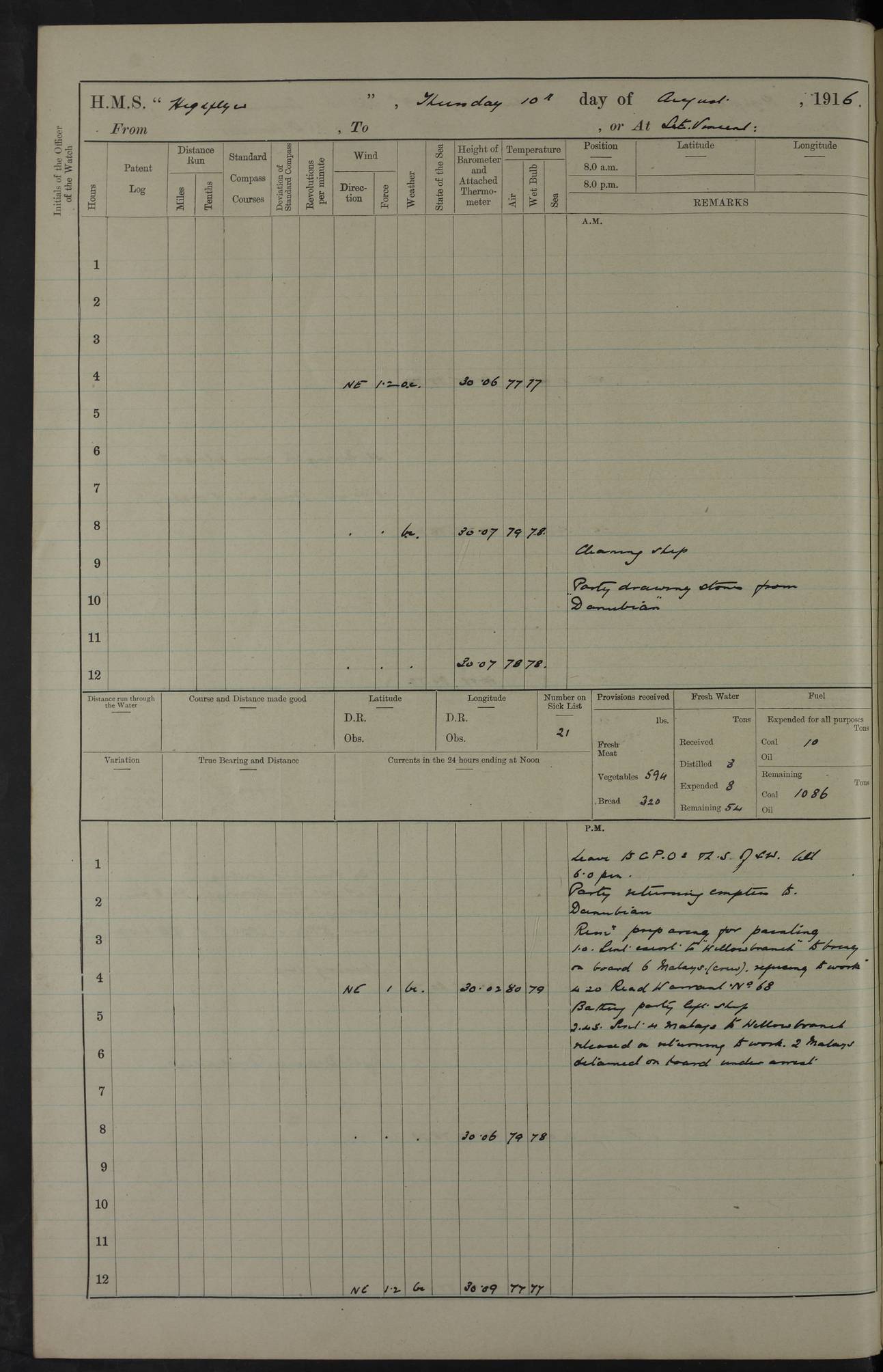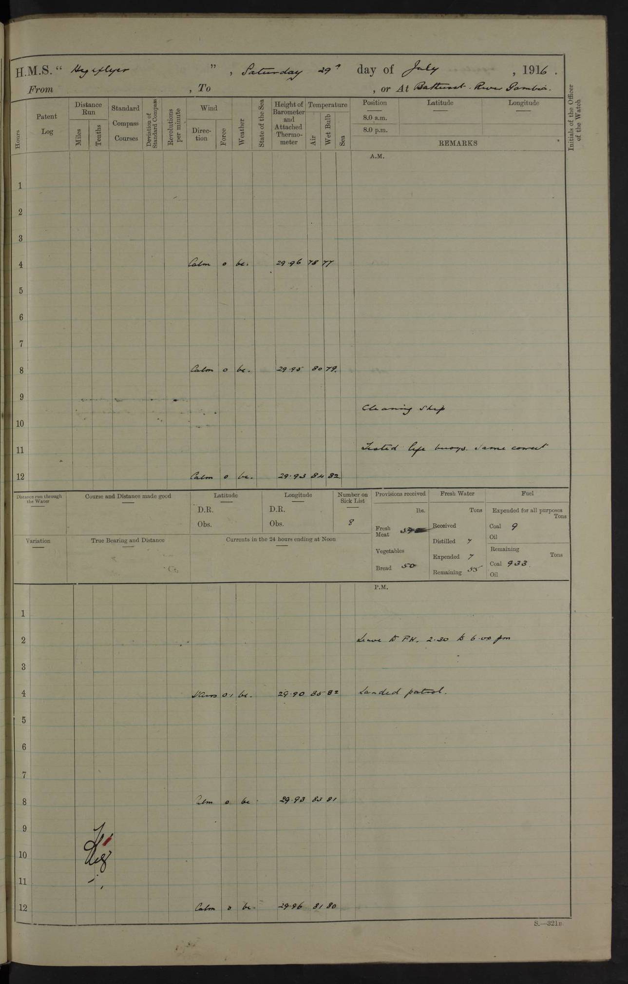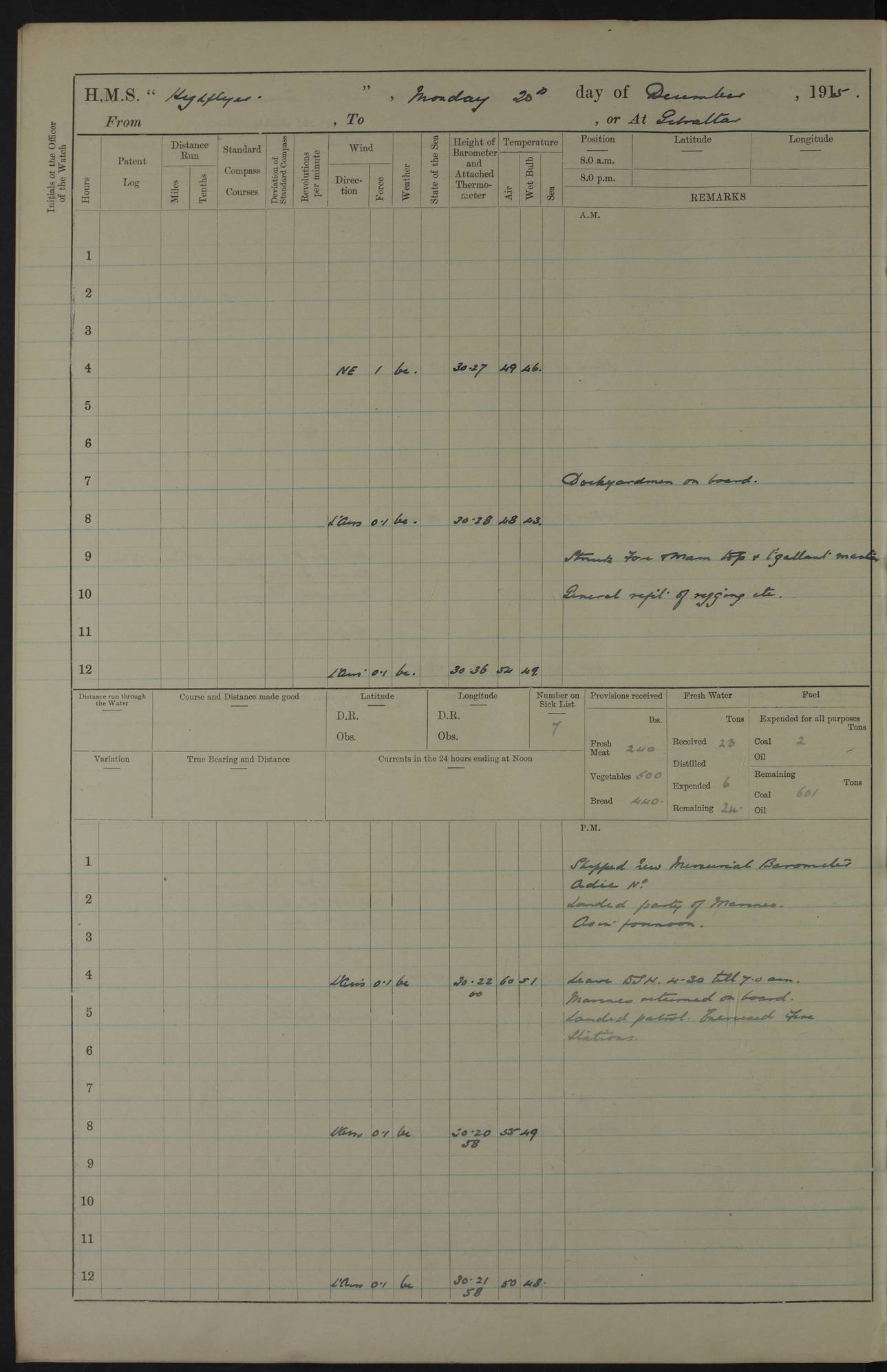 LOGS FOR JANUARY 1916 4f96113fa2fc8e2def000829: (http://s3.amazonaws.com/oldweather/ADM53-44302/ADM 53-44302-001_0.jpg) 4f961140a2fc8e2def00082a: (http://s3.amazonaws.com/oldweather/ADM53-44302/ADM 53-44302-001_1.jpg) 4f961140a2fc8e2def00082b: (http://s3.amazonaws.com/oldweather/ADM53-44302/ADM 53-44302-002_0.jpg) 4f961140a2fc8e2def00082c: (http://s3.amazonaws.com/oldweather/ADM53-44302/ADM 53-44302-002_1.jpg) 4f961141a2fc8e2def00082d: (http://s3.amazonaws.com/oldweather/ADM53-44302/ADM 53-44302-003_0.jpg) 4f961141a2fc8e2def00082e: (http://s3.amazonaws.com/oldweather/ADM53-44302/ADM 53-44302-003_1.jpg) 4f961141a2fc8e2def00082f: (http://s3.amazonaws.com/oldweather/ADM53-44302/ADM 53-44302-004_0.jpg) 4f961142a2fc8e2def000830: (http://s3.amazonaws.com/oldweather/ADM53-44302/ADM 53-44302-004_1.jpg) 4f961142a2fc8e2def000831: (http://s3.amazonaws.com/oldweather/ADM53-44302/ADM 53-44302-005_0.jpg) 4f961142a2fc8e2def000832: (http://s3.amazonaws.com/oldweather/ADM53-44302/ADM 53-44302-005_1.jpg) 1 January 1916 Gibraltar Lat 36.1, Long -5.3 9.00am: Dockyardmen on board. 5.30pm: Mr. Ritchie, Artificer Engineer joined ship. 4f961143a2fc8e2def000833: (http://s3.amazonaws.com/oldweather/ADM53-44302/ADM 53-44302-006_0.jpg) 2 January 1916 Gibraltar Lat 36.1, Long -5.3 9.30am: Landed church parties. 4f961143a2fc8e2def000834: (http://s3.amazonaws.com/oldweather/ADM53-44302/ADM 53-44302-006_1.jpg) 3 January 1916 Gibraltar Lat 36.1, Long -5.3 11.00am: Replaced topmasts. 1.00pm: Commander Casement discharged to hospital. 4f961143a2fc8e2def000835: (http://s3.amazonaws.com/oldweather/ADM53-44302/ADM 53-44302-007_0.jpg) 4 January 1916 Gibraltar Lat 36.1, Long -5.3 General refit. 10.30am: Discharged 2 Ratings to hospital. 4f961144a2fc8e2def000836: (http://s3.amazonaws.com/oldweather/ADM53-44302/ADM 53-44302-007_1.jpg) 5 January 1916 Gibraltar Lat 36.1, Long -5.3 7.30am: Dockyardmen on board. 9.00am: Discharged one Rating to hospital. 4f961144a2fc8e2def000837: (http://s3.amazonaws.com/oldweather/ADM53-44302/ADM 53-44302-008_0.jpg) 6 January 1916 Gibraltar Lat 36.1, Long -5.3 10.00am: Returning and drawing stores. 4f961144a2fc8e2def000838: (http://s3.amazonaws.com/oldweather/ADM53-44302/ADM 53-44302-008_1.jpg) 7 January 1916 Gibraltar Lat 36.1, Long -5.3 10.00am: Party drawing provisions for fore holds. 11.00am: 3 Seamen, 3 Stokers, 3 Marines, 1 NP, 1 SBS joined ship. 4f961145a2fc8e2def000839: (http://s3.amazonaws.com/oldweather/ADM53-44302/ADM 53-44302-009_0.jpg) 8 January 1916 Gibraltar Lat 36.1, Long -5.3 1.30pm: Discharged 1 prisoner to detention quarter. 4f961145a2fc8e2def00083a: (http://s3.amazonaws.com/oldweather/ADM53-44302/ADM 53-44302-009_1.jpg) 9 January 1916 Gibraltar Lat 36.1, Long -5.3 10.00am: Captain presented Persian Gulf Gen. Service Medals to Mr. Ward, Artificer Engineer, and 5 Ratings. 4f961145a2fc8e2def00083b: (http://s3.amazonaws.com/oldweather/ADM53-44302/ADM 53-44302-010_0.jpg) 10 January 1916 Gibraltar Lat 36.1, Long -5.3 5.00pm: Discharged Mr. Ward Art Eng, 1 Ch. SBS, 1 RNR, 3 Marines, 2 POI., 3 Stoker, 1 Marine to HMS TERRIBLE for passage home. 4f961146a2fc8e2def00083c: (http://s3.amazonaws.com/oldweather/ADM53-44302/ADM 53-44302-010_1.jpg) 11 January 1916 Gibraltar Lat 36.1, Long -5.3 9.00am: Carrying out general refit. 10.00am: Replaced starboard cable after cleaning and testing (carried out by Dockyard). 4f961146a2fc8e2def00083d: (http://s3.amazonaws.com/oldweather/ADM53-44302/ADM 53-44302-011_0.jpg) 12 January 1916 Gibraltar Lat 36.1, Long -5.3 Carrying out general refit. 4f961146a2fc8e2def00083e: (http://s3.amazonaws.com/oldweather/ADM53-44302/ADM 53-44302-011_1.jpg) 13 January 1916 Gibraltar Lat 36.1, Long -5.3 Carrying out general refit. 10.00am: Marines landed for drill. 4f961147a2fc8e2def00083f: (http://s3.amazonaws.com/oldweather/ADM53-44302/ADM 53-44302-012_0.jpg) 14 January 1916 Gibraltar Lat 36.1, Long -5.3 10.00am: Party replacing port cable after test and survey by Dockyard. 4f961147a2fc8e2def000840: (http://s3.amazonaws.com/oldweather/ADM53-44302/ADM 53-44302-012_1.jpg) 15 January 1916 Gibraltar Lat 36.1, Long -5.3 9.00am: Carrying out general refit. Party working about cable. 4f961147a2fc8e2def000841: (http://s3.amazonaws.com/oldweather/ADM53-44302/ADM 53-44302-013_0.jpg) 16 January 1916 Gibraltar Lat 36.1, Long -5.3 9.00am: Landed church parties. 4f961148a2fc8e2def000842: (http://s3.amazonaws.com/oldweather/ADM53-44302/ADM 53-44302-013_1.jpg) 17 January 1916 Gibraltar Lat 36.1, Long -5.3 1.00pm: 42 Ratings left ship for passage to England. 4f961148a2fc8e2def000843: (http://s3.amazonaws.com/oldweather/ADM53-44302/ADM 53-44302-014_0.jpg) 18 January 1916 Gibraltar Lat 36.1, Long -5.3 10.00am: Party drawing torpedoes. 3.00pm: Partially flooded dock. 4f961148a2fc8e2def000844: (http://s3.amazonaws.com/oldweather/ADM53-44302/ADM 53-44302-014_1.jpg) 19 January 1916 Gibraltar Lat 36.1, Long -5.3 8.30am: Flooded dock. 9.00am: Shifted berth to No 5 billet S Mole. 4f961149a2fc8e2def000845: (http://s3.amazonaws.com/oldweather/ADM53-44302/ADM 53-44302-015_0.jpg) 20 January 1916 Gibraltar Lat 36.1, Long -5.3 10.30am: Marines landed for drill. 11.00am: Drawing Engineers’ stores. 4f961149a2fc8e2def000846: (http://s3.amazonaws.com/oldweather/ADM53-44302/ADM 53-44302-015_1.jpg) 21 January 1916 Gibraltar Lat 36.1, Long -5.3 9.00am: Ammunitioning ship. 4f961149a2fc8e2def000847: (http://s3.amazonaws.com/oldweather/ADM53-44302/ADM 53-44302-016_0.jpg) 22 January 1916 Gibraltar Lat 36.1, Long -5.3 9.00am: Ammunitioning ship. 1.30pm: One Marine discharged to Detention Quarters. 4f96114aa2fc8e2def000848: (http://s3.amazonaws.com/oldweather/ADM53-44302/ADM 53-44302-016_1.jpg) 23 January 1916 Gibraltar Lat 36.1, Long -5.3 9.00am: Landed church parties. 4f96114aa2fc8e2def000849: (http://s3.amazonaws.com/oldweather/ADM53-44302/ADM 53-44302-017_0.jpg) 24 January 1916 Gibraltar Lat 36.1, Long -5.3 7.30am: Commenced coaling. Dockyard labour shore party. 1.30pm: Finished coaling; received 565 tons. 2.0