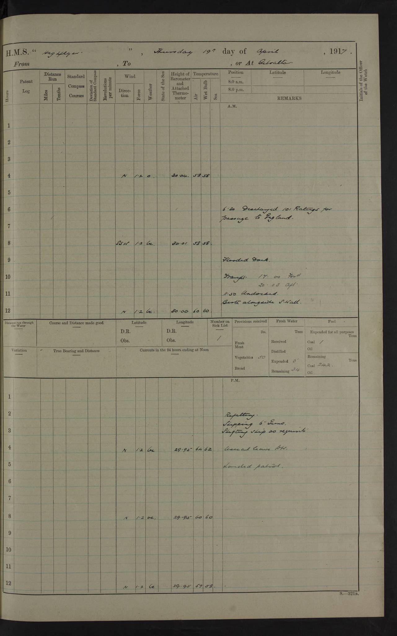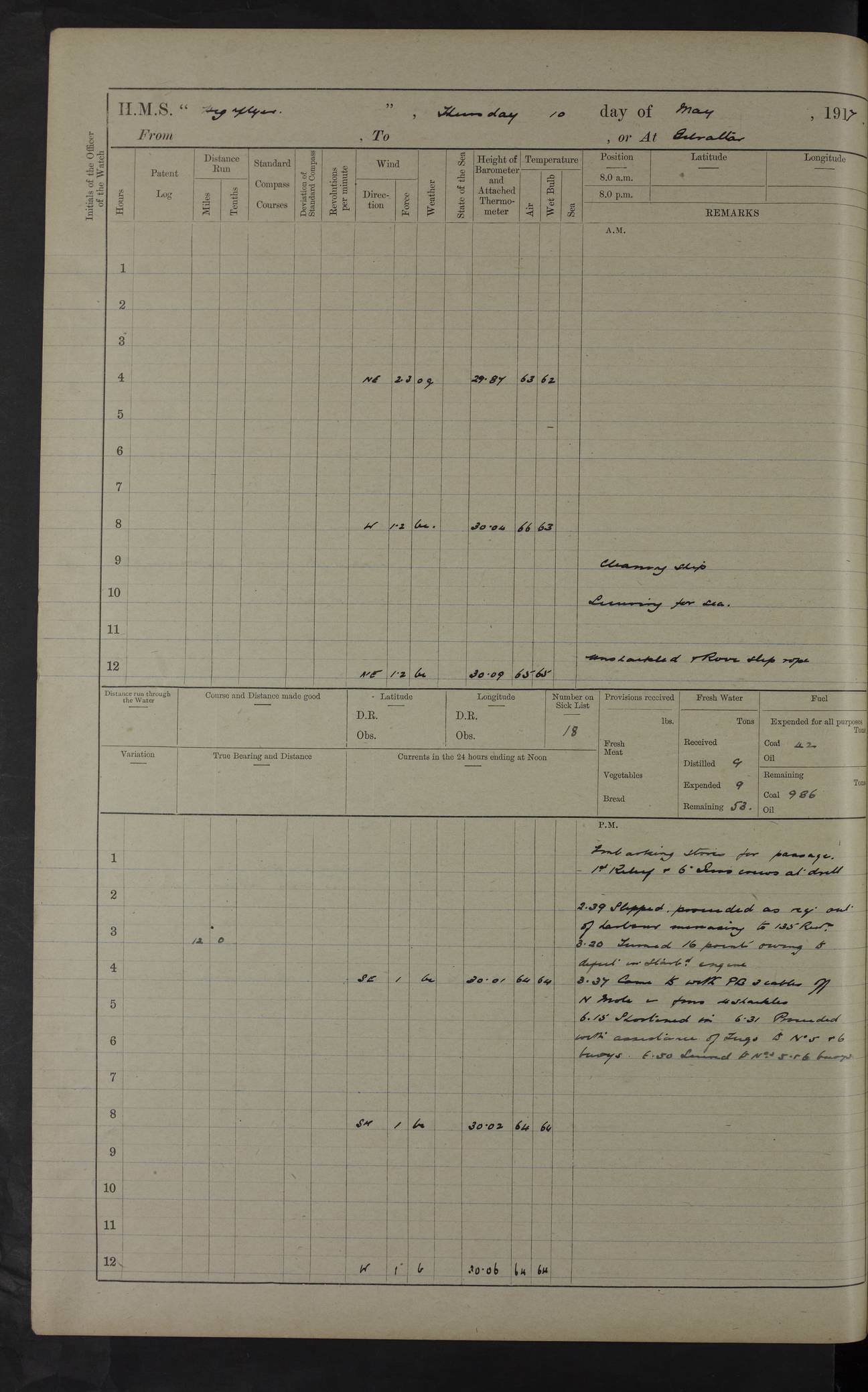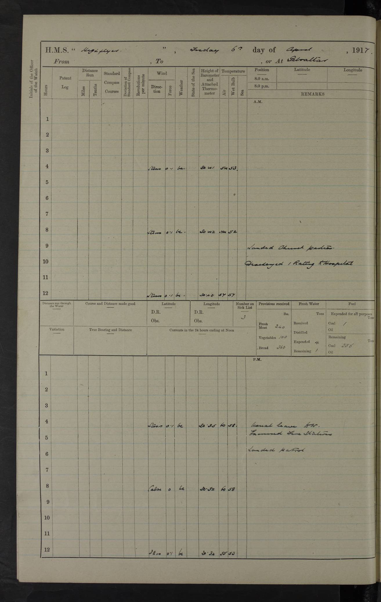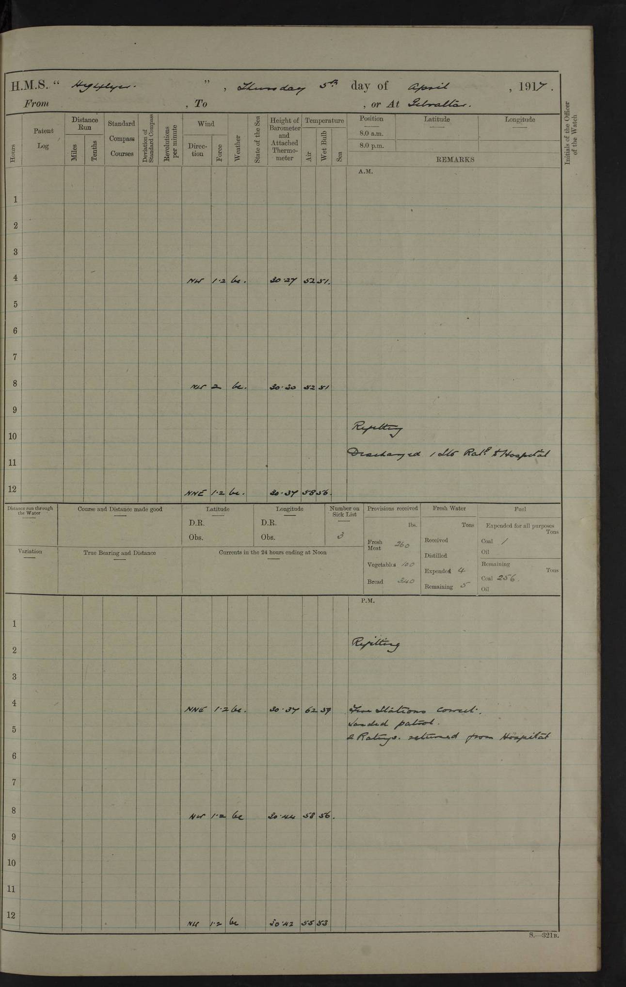 4ef4f325e53e0a0c91000969: (https://s3.amazonaws.com:443/oldweather/ADM53-44307/ADM 53-44307-181_0.jpg) [Blank page.] LOGS FOR APRIL 1917 4ef4f325e53e0a0c9100096a: (https://s3.amazonaws.com:443/oldweather/ADM53-44307/ADM 53-44307-181_1.jpg) 4ef4f325e53e0a0c9100096b: (https://s3.amazonaws.com:443/oldweather/ADM53-44307/ADM 53-44307-182_0.jpg) 4ef4f325e53e0a0c9100096c: (https://s3.amazonaws.com:443/oldweather/ADM53-44307/ADM 53-44307-182_1.jpg) 4ef4f325e53e0a0c9100096d: (https://s3.amazonaws.com:443/oldweather/ADM53-44307/ADM 53-44307-183_0.jpg) 4ef4f325e53e0a0c9100096e: (https://s3.amazonaws.com:443/oldweather/ADM53-44307/ADM 53-44307-183_1.jpg) 1 April 1917 Gibraltar Lat 36.1, Long -5.3 9.00am: Church parties landed. 4.30pm: Landed patrol. 4ef4f325e53e0a0c9100096f: (https://s3.amazonaws.com:443/oldweather/ADM53-44307/ADM 53-44307-184_0.jpg) 2 April 1917 Gibraltar Lat 36.1, Long -5.3 10.00am: Discharged 1 Rating to hospital. 1.00pm: Eng. Lieut. Burt left ship for passage to England. 2.00pm: 1 Stoker PO left ship. 4ef4f325e53e0a0c91000970: (https://s3.amazonaws.com:443/oldweather/ADM53-44307/ADM 53-44307-184_1.jpg) 3 April 1917 Gibraltar Lat 36.1, Long -5.3 9.00am: 25 Ratings joined from SUTLEJ. 10.00am: Discharged 4 Ratings to hospital. 4.00pm: 4 Ratings rejoined from hospital. 4ef4f325e53e0a0c91000971: (https://s3.amazonaws.com:443/oldweather/ADM53-44307/ADM 53-44307-185_0.jpg) 4 April 1917 Gibraltar Lat 36.1, Long -5.3 Refitting. 11.00am: Discharged 3 Ratings to hospital. 5.30pm: 1 Stoker joined from CORMORANT. 4ef4f325e53e0a0c91000972: (https://s3.amazonaws.com:443/oldweather/ADM53-44307/ADM 53-44307-185_1.jpg) 5 April 1917 Gibraltar Lat 36.1, Long -5.3 Refitting. 10.30am: Discharged 1 Stoker Rating to hospital. 4.30pm: Landed patrol. 5.00pm: 2 Ratings returned from hospital. 4ef4f325e53e0a0c91000973: (https://s3.amazonaws.com:443/oldweather/ADM53-44307/ADM 53-44307-186_0.jpg) 6 April 1917 Gibraltar Lat 36.1, Long -5.3 9.00am: Landed church parties. 10.00am: Discharged 1 Rating to hospital. 5.30pm: Landed patrol. 4ef4f325e53e0a0c91000974: (https://s3.amazonaws.com:443/oldweather/ADM53-44307/ADM 53-44307-186_1.jpg) 7 April 1917 Gibraltar Lat 36.1, Long -5.3 9.00am: Hands sweeping down dock. 2.00pm: 2 Sig. Ratings discharged for duty ashore. 4.00pm: Landed patrol. 4ef4f325e53e0a0c91000975: (https://s3.amazonaws.com:443/oldweather/ADM53-44307/ADM 53-44307-187_0.jpg) 8 April 1917 Gibraltar Lat 36.1, Long -5.3 9.30am: Landed church parties. 4ef4f325e53e0a0c91000976: (https://s3.amazonaws.com:443/oldweather/ADM53-44307/ADM 53-44307-187_1.jpg) 9 April 1917 Gibraltar Lat 36.1, Long -5.3 Refitting and as requisite. 5.30pm: Landed patrol. 4ef4f325e53e0a0c91000977: (https://s3.amazonaws.com:443/oldweather/ADM53-44307/ADM 53-44307-188_0.jpg) 10 April 1917 Gibraltar Lat 36.1, Long -5.3 Refitting. 4.30pm: Landed patrol. 5.00pm: 4 Ratings rejoined from hospital. 4ef4f325e53e0a0c91000978: (https://s3.amazonaws.com:443/oldweather/ADM53-44307/ADM 53-44307-188_1.jpg) 11 April 1917 Gibraltar Lat 36.1, Long -5.3 12.30pm: Read Warrant No 91. 2.00pm: Discharged 116 Ratings for passage to England. 4.00pm: 4 Ratings rejoined from hospital. 4ef4f325e53e0a0c91000979: (https://s3.amazonaws.com:443/oldweather/ADM53-44307/ADM 53-44307-189_0.jpg) 12 April 1917 Gibraltar Lat 36.1, Long -5.3 Refitting. 2.00pm: Discharged 50 Ratings for passage to England. 4ef4f325e53e0a0c9100097a: (https://s3.amazonaws.com:443/oldweather/ADM53-44307/ADM 53-44307-189_1.jpg) 13 April 1917 Gibraltar Lat 36.1, Long -5.3 Refitting. 5.00pm: Landed patrol. 4ef4f325e53e0a0c9100097b: (https://s3.amazonaws.com:443/oldweather/ADM53-44307/ADM 53-44307-190_0.jpg) 14 April 1917 Gibraltar Lat 36.1, Long -5.3 Refitting. 5.00pm: Landed patrol. 4ef4f325e53e0a0c9100097c: (https://s3.amazonaws.com:443/oldweather/ADM53-44307/ADM 53-44307-190_1.jpg) 15 April 1917 Gibraltar Lat 36.1, Long -5.3 8.30am: Landed church parties. 4.00pm: Landed patrol. 4ef4f325e53e0a0c9100097d: (https://s3.amazonaws.com:443/oldweather/ADM53-44307/ADM 53-44307-191_0.jpg) 16 April 1917 Gibraltar Lat 36.1, Long -5.3 Refitting. 5.00pm: Landed patrol. 4ef4f325e53e0a0c9100097e: (https://s3.amazonaws.com:443/oldweather/ADM53-44307/ADM 53-44307-191_1.jpg) 17 April 1917 Gibraltar Lat 36.1, Long -5.3 Refitting 4.00pm: 2 Ratings rejoined from hospital. 4ef4f326e53e0a0c9100097f: (https://s3.amazonaws.com:443/oldweather/ADM53-44307/ADM 53-44307-192_0.jpg) 18 April 1917 Gibraltar Lat 36.1, Long -5.3 Refitting. 4.00pm: 2 Ratings rejoined from hospital. 4.30pm: Landed patrol. 4ef4f326e53e0a0c91000980: (https://s3.amazonaws.com:443/oldweather/ADM53-44307/ADM 53-44307-192_1.jpg) 19 April 1917 Gibraltar Lat 36.1, Long -5.3 6.30am: Discharged 101 Ratings for passage to England. 9.00am: Flooded dock. 2.30pm: Shipping 6” guns. 5.00pm: Landed patrol. 4ef4f326e53e0a0c91000981: (https://s3.amazonaws.com:443/oldweather/ADM53-44307/ADM 53-44307-193_0.jpg) 20 April 1917 Gibraltar Lat 36.1, Long -5.3 Refitting. Party painting boats in dockyard. 4.00pm: Read Warrants Nos 92, 93. 4ef4f326e53e0a0c91000982: (https://s3.amazonaws.com:443/oldweather/ADM53-44307/ADM 53-44307-193_1.jpg) 21 April 1917 Gibraltar Lat 36.1, Long -5.3 2.00pm: 320 Ratings joined ship. Recommissioned (partial) ship. 4.00pm: Sent working party to LEASOWE CASTLE. 4.30pm: 11 Ratings joined ship from hospital. 4ef4f326e53e0a0c91000983: (https://s3.amazonaws.com:443/oldweather/ADM53-44307/ADM 53-44307-194_0.jpg) 22 April 1917 Gibraltar Lat 36.1, Long -5.3 9.00am: Landed church parties. 12.30pm: 49 Ratings left ship for passage to England. 4ef4f326e53e0a0c91000984: (https://s3.amazonaws.com:443/oldweather/ADM53-44307/ADM 53-44307-194_1.jpg) 23 April 1917 Gibraltar Lat 36.1, Long -5.3 9.00am: Medical inspection. 1.00pm: 12 Ratings discharged to Depot. 4ef4f326e53e0a0c91000985: (https://s3.amazonaws.com:443/oldweather/ADM53-44307/ADM 53-44307-195_0.jpg) 24 April 1917 Gibraltar Lat 36.1, Long -5.3 1.00pm: 1 Rating discharged for passage to England
