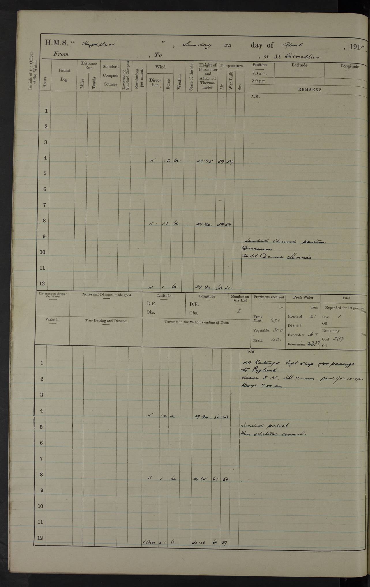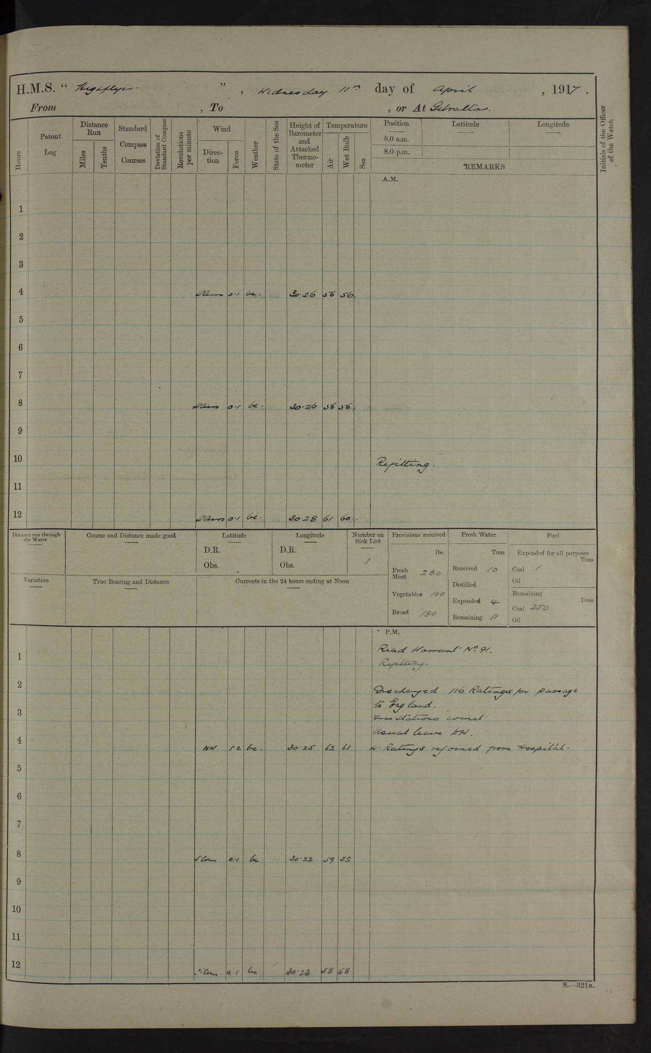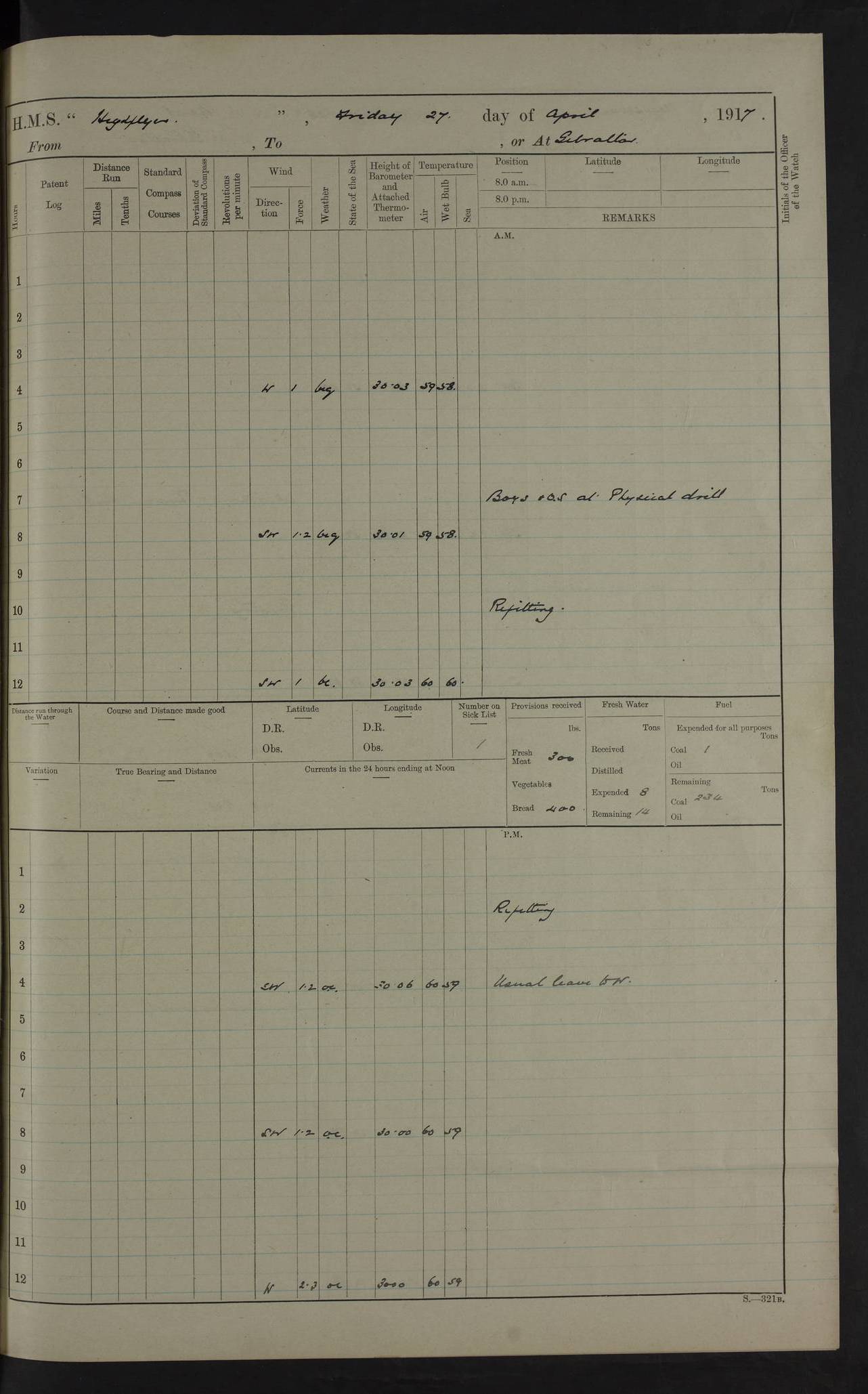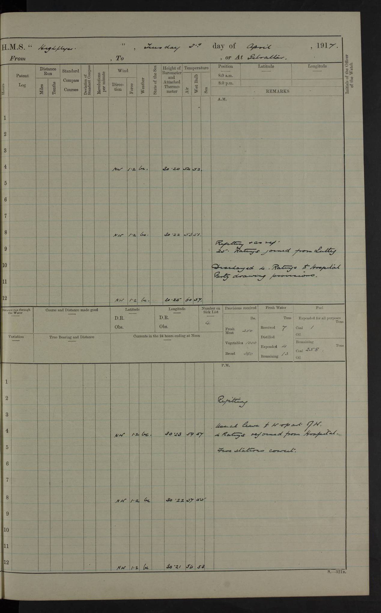 4ef4f325e53e0a0c91000969: (https://s3.amazonaws.com:443/oldweather/ADM53-44307/ADM 53-44307-181_0.jpg) [Blank page.] LOGS FOR APRIL 1917 4ef4f325e53e0a0c9100096a: (https://s3.amazonaws.com:443/oldweather/ADM53-44307/ADM 53-44307-181_1.jpg) 4ef4f325e53e0a0c9100096b: (https://s3.amazonaws.com:443/oldweather/ADM53-44307/ADM 53-44307-182_0.jpg) 4ef4f325e53e0a0c9100096c: (https://s3.amazonaws.com:443/oldweather/ADM53-44307/ADM 53-44307-182_1.jpg) 4ef4f325e53e0a0c9100096d: (https://s3.amazonaws.com:443/oldweather/ADM53-44307/ADM 53-44307-183_0.jpg) 4ef4f325e53e0a0c9100096e: (https://s3.amazonaws.com:443/oldweather/ADM53-44307/ADM 53-44307-183_1.jpg) 1 April 1917 Gibraltar Lat 36.1, Long -5.3 9.00am: Church parties landed. 4.30pm: Landed patrol. 4ef4f325e53e0a0c9100096f: (https://s3.amazonaws.com:443/oldweather/ADM53-44307/ADM 53-44307-184_0.jpg) 2 April 1917 Gibraltar Lat 36.1, Long -5.3 10.00am: Discharged 1 Rating to hospital. 1.00pm: Eng. Lieut. Burt left ship for passage to England. 2.00pm: 1 Stoker PO left ship. 4ef4f325e53e0a0c91000970: (https://s3.amazonaws.com:443/oldweather/ADM53-44307/ADM 53-44307-184_1.jpg) 3 April 1917 Gibraltar Lat 36.1, Long -5.3 9.00am: 25 Ratings joined from SUTLEJ. 10.00am: Discharged 4 Ratings to hospital. 4.00pm: 4 Ratings rejoined from hospital. 4ef4f325e53e0a0c91000971: (https://s3.amazonaws.com:443/oldweather/ADM53-44307/ADM 53-44307-185_0.jpg) 4 April 1917 Gibraltar Lat 36.1, Long -5.3 Refitting. 11.00am: Discharged 3 Ratings to hospital. 5.30pm: 1 Stoker joined from CORMORANT. 4ef4f325e53e0a0c91000972: (https://s3.amazonaws.com:443/oldweather/ADM53-44307/ADM 53-44307-185_1.jpg) 5 April 1917 Gibraltar Lat 36.1, Long -5.3 Refitting. 10.30am: Discharged 1 Stoker Rating to hospital. 4.30pm: Landed patrol. 5.00pm: 2 Ratings returned from hospital. 4ef4f325e53e0a0c91000973: (https://s3.amazonaws.com:443/oldweather/ADM53-44307/ADM 53-44307-186_0.jpg) 6 April 1917 Gibraltar Lat 36.1, Long -5.3 9.00am: Landed church parties. 10.00am: Discharged 1 Rating to hospital. 5.30pm: Landed patrol. 4ef4f325e53e0a0c91000974: (https://s3.amazonaws.com:443/oldweather/ADM53-44307/ADM 53-44307-186_1.jpg) 7 April 1917 Gibraltar Lat 36.1, Long -5.3 9.00am: Hands sweeping down dock. 2.00pm: 2 Sig. Ratings discharged for duty ashore. 4.00pm: Landed patrol. 4ef4f325e53e0a0c91000975: (https://s3.amazonaws.com:443/oldweather/ADM53-44307/ADM 53-44307-187_0.jpg) 8 April 1917 Gibraltar Lat 36.1, Long -5.3 9.30am: Landed church parties. 4ef4f325e53e0a0c91000976: (https://s3.amazonaws.com:443/oldweather/ADM53-44307/ADM 53-44307-187_1.jpg) 9 April 1917 Gibraltar Lat 36.1, Long -5.3 Refitting and as requisite. 5.30pm: Landed patrol. 4ef4f325e53e0a0c91000977: (https://s3.amazonaws.com:443/oldweather/ADM53-44307/ADM 53-44307-188_0.jpg) 10 April 1917 Gibraltar Lat 36.1, Long -5.3 Refitting. 4.30pm: Landed patrol. 5.00pm: 4 Ratings rejoined from hospital. 4ef4f325e53e0a0c91000978: (https://s3.amazonaws.com:443/oldweather/ADM53-44307/ADM 53-44307-188_1.jpg) 11 April 1917 Gibraltar Lat 36.1, Long -5.3 12.30pm: Read Warrant No 91. 2.00pm: Discharged 116 Ratings for passage to England. 4.00pm: 4 Ratings rejoined from hospital. 4ef4f325e53e0a0c91000979: (https://s3.amazonaws.com:443/oldweather/ADM53-44307/ADM 53-44307-189_0.jpg) 12 April 1917 Gibraltar Lat 36.1, Long -5.3 Refitting. 2.00pm: Discharged 50 Ratings for passage to England. 4ef4f325e53e0a0c9100097a: (https://s3.amazonaws.com:443/oldweather/ADM53-44307/ADM 53-44307-189_1.jpg) 13 April 1917 Gibraltar Lat 36.1, Long -5.3 Refitting. 5.00pm: Landed patrol. 4ef4f325e53e0a0c9100097b: (https://s3.amazonaws.com:443/oldweather/ADM53-44307/ADM 53-44307-190_0.jpg) 14 April 1917 Gibraltar Lat 36.1, Long -5.3 Refitting. 5.00pm: Landed patrol. 4ef4f325e53e0a0c9100097c: (https://s3.amazonaws.com:443/oldweather/ADM53-44307/ADM 53-44307-190_1.jpg) 15 April 1917 Gibraltar Lat 36.1, Long -5.3 8.30am: Landed church parties. 4.00pm: Landed patrol. 4ef4f325e53e0a0c9100097d: (https://s3.amazonaws.com:443/oldweather/ADM53-44307/ADM 53-44307-191_0.jpg) 16 April 1917 Gibraltar Lat 36.1, Long -5.3 Refitting. 5.00pm: Landed patrol. 4ef4f325e53e0a0c9100097e: (https://s3.amazonaws.com:443/oldweather/ADM53-44307/ADM 53-44307-191_1.jpg) 17 April 1917 Gibraltar Lat 36.1, Long -5.3 Refitting 4.00pm: 2 Ratings rejoined from hospital. 4ef4f326e53e0a0c9100097f: (https://s3.amazonaws.com:443/oldweather/ADM53-44307/ADM 53-44307-192_0.jpg) 18 April 1917 Gibraltar Lat 36.1, Long -5.3 Refitting. 4.00pm: 2 Ratings rejoined from hospital. 4.30pm: Landed patrol. 4ef4f326e53e0a0c91000980: (https://s3.amazonaws.com:443/oldweather/ADM53-44307/ADM 53-44307-192_1.jpg) 19 April 1917 Gibraltar Lat 36.1, Long -5.3 6.30am: Discharged 101 Ratings for passage to England. 9.00am: Flooded dock. 2.30pm: Shipping 6” guns. 5.00pm: Landed patrol. 4ef4f326e53e0a0c91000981: (https://s3.amazonaws.com:443/oldweather/ADM53-44307/ADM 53-44307-193_0.jpg) 20 April 1917 Gibraltar Lat 36.1, Long -5.3 Refitting. Party painting boats in dockyard. 4.00pm: Read Warrants Nos 92, 93. 4ef4f326e53e0a0c91000982: (https://s3.amazonaws.com:443/oldweather/ADM53-44307/ADM 53-44307-193_1.jpg) 21 April 1917 Gibraltar Lat 36.1, Long -5.3 2.00pm: 320 Ratings joined ship. Recommissioned (partial) ship. 4.00pm: Sent working party to LEASOWE CASTLE. 4.30pm: 11 Ratings joined ship from hospital. 4ef4f326e53e0a0c91000983: (https://s3.amazonaws.com:443/oldweather/ADM53-44307/ADM 53-44307-194_0.jpg) 22 April 1917 Gibraltar Lat 36.1, Long -5.3 9.00am: Landed church parties. 12.30pm: 49 Ratings left ship for passage to England. 4ef4f326e53e0a0c91000984: (https://s3.amazonaws.com:443/oldweather/ADM53-44307/ADM 53-44307-194_1.jpg) 23 April 1917 Gibraltar Lat 36.1, Long -5.3 9.00am: Medical inspection. 1.00pm: 12 Ratings discharged to Depot. 4ef4f326e53e0a0c91000985: (https://s3.amazonaws.com:443/oldweather/ADM53-44307/ADM 53-44307-195_0.jpg) 24 April 1917 Gibraltar Lat 36.1, Long -5.3 1.00pm: 1 Rating discharged for passage to England