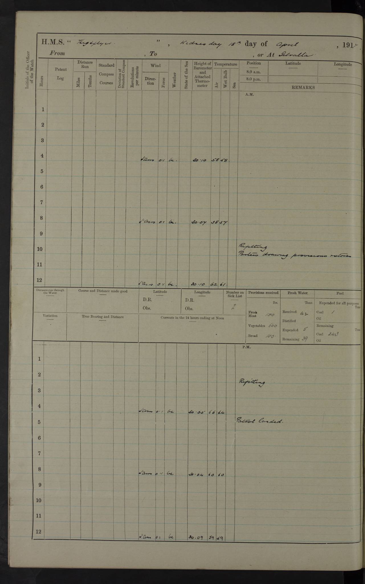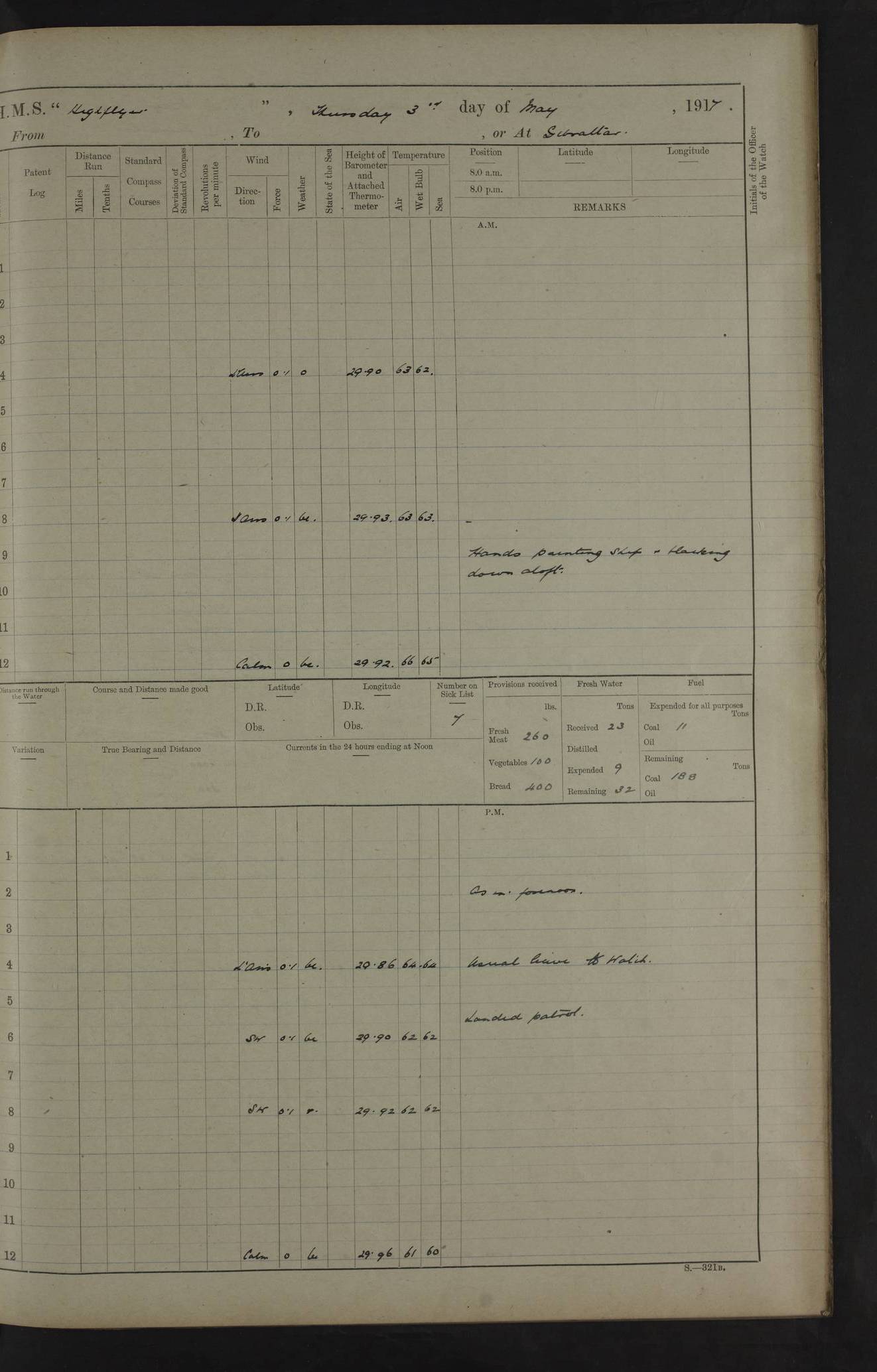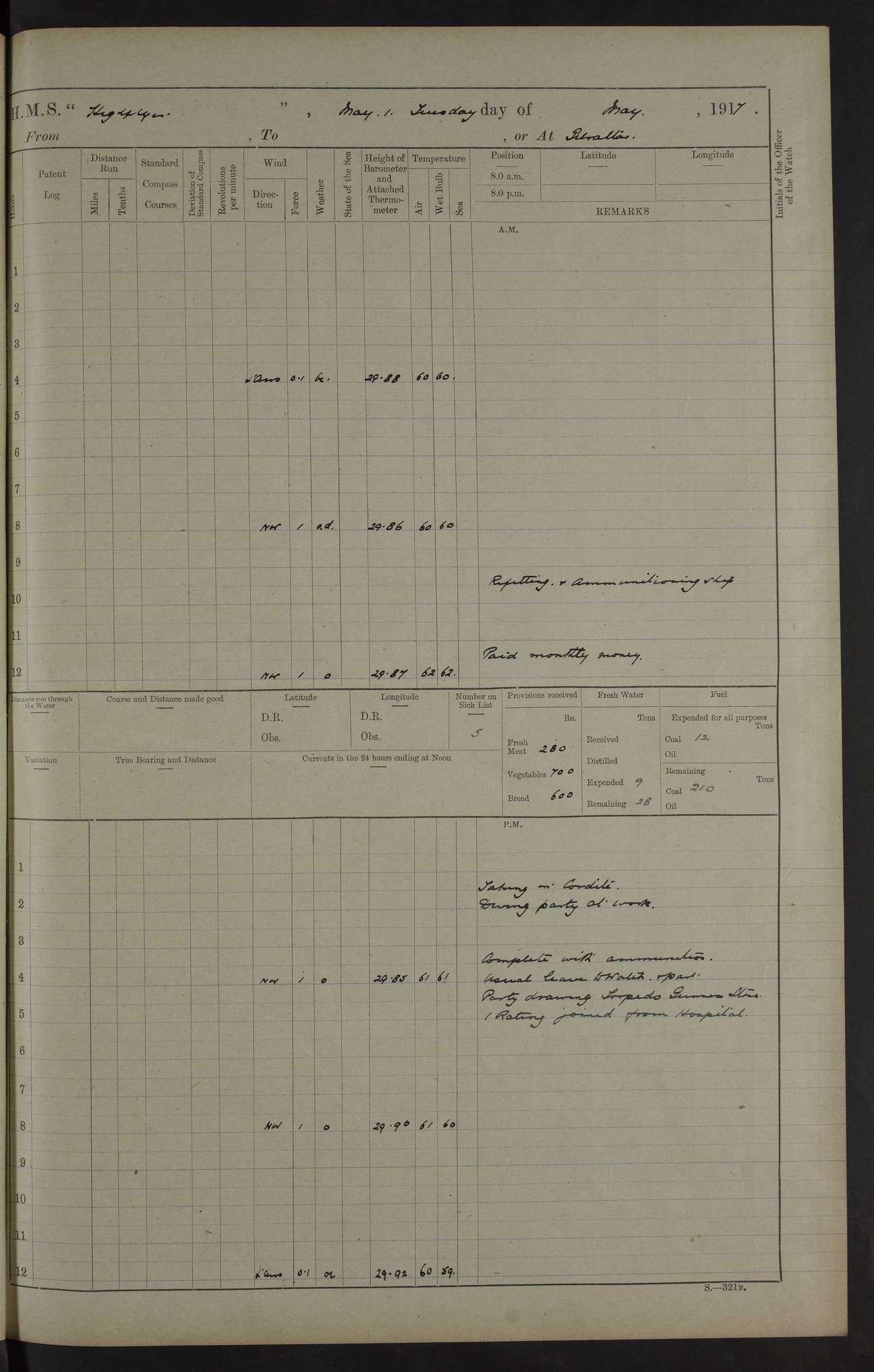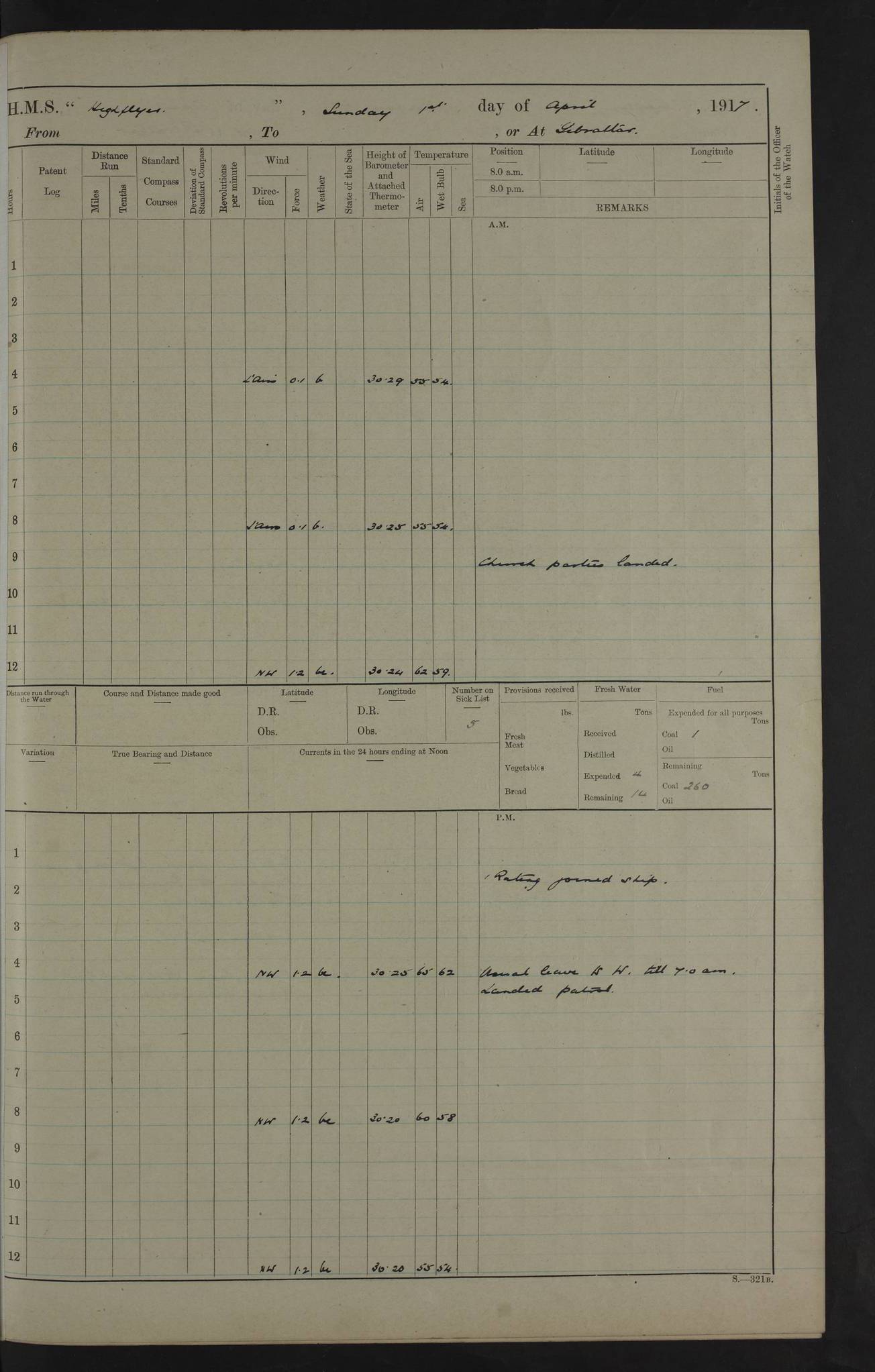 4ef4f325e53e0a0c91000969: (https://s3.amazonaws.com:443/oldweather/ADM53-44307/ADM 53-44307-181_0.jpg) [Blank page.] LOGS FOR APRIL 1917 4ef4f325e53e0a0c9100096a: (https://s3.amazonaws.com:443/oldweather/ADM53-44307/ADM 53-44307-181_1.jpg) 4ef4f325e53e0a0c9100096b: (https://s3.amazonaws.com:443/oldweather/ADM53-44307/ADM 53-44307-182_0.jpg) 4ef4f325e53e0a0c9100096c: (https://s3.amazonaws.com:443/oldweather/ADM53-44307/ADM 53-44307-182_1.jpg) 4ef4f325e53e0a0c9100096d: (https://s3.amazonaws.com:443/oldweather/ADM53-44307/ADM 53-44307-183_0.jpg) 4ef4f325e53e0a0c9100096e: (https://s3.amazonaws.com:443/oldweather/ADM53-44307/ADM 53-44307-183_1.jpg) 1 April 1917 Gibraltar Lat 36.1, Long -5.3 9.00am: Church parties landed. 4.30pm: Landed patrol. 4ef4f325e53e0a0c9100096f: (https://s3.amazonaws.com:443/oldweather/ADM53-44307/ADM 53-44307-184_0.jpg) 2 April 1917 Gibraltar Lat 36.1, Long -5.3 10.00am: Discharged 1 Rating to hospital. 1.00pm: Eng. Lieut. Burt left ship for passage to England. 2.00pm: 1 Stoker PO left ship. 4ef4f325e53e0a0c91000970: (https://s3.amazonaws.com:443/oldweather/ADM53-44307/ADM 53-44307-184_1.jpg) 3 April 1917 Gibraltar Lat 36.1, Long -5.3 9.00am: 25 Ratings joined from SUTLEJ. 10.00am: Discharged 4 Ratings to hospital. 4.00pm: 4 Ratings rejoined from hospital. 4ef4f325e53e0a0c91000971: (https://s3.amazonaws.com:443/oldweather/ADM53-44307/ADM 53-44307-185_0.jpg) 4 April 1917 Gibraltar Lat 36.1, Long -5.3 Refitting. 11.00am: Discharged 3 Ratings to hospital. 5.30pm: 1 Stoker joined from CORMORANT. 4ef4f325e53e0a0c91000972: (https://s3.amazonaws.com:443/oldweather/ADM53-44307/ADM 53-44307-185_1.jpg) 5 April 1917 Gibraltar Lat 36.1, Long -5.3 Refitting. 10.30am: Discharged 1 Stoker Rating to hospital. 4.30pm: Landed patrol. 5.00pm: 2 Ratings returned from hospital. 4ef4f325e53e0a0c91000973: (https://s3.amazonaws.com:443/oldweather/ADM53-44307/ADM 53-44307-186_0.jpg) 6 April 1917 Gibraltar Lat 36.1, Long -5.3 9.00am: Landed church parties. 10.00am: Discharged 1 Rating to hospital. 5.30pm: Landed patrol. 4ef4f325e53e0a0c91000974: (https://s3.amazonaws.com:443/oldweather/ADM53-44307/ADM 53-44307-186_1.jpg) 7 April 1917 Gibraltar Lat 36.1, Long -5.3 9.00am: Hands sweeping down dock. 2.00pm: 2 Sig. Ratings discharged for duty ashore. 4.00pm: Landed patrol. 4ef4f325e53e0a0c91000975: (https://s3.amazonaws.com:443/oldweather/ADM53-44307/ADM 53-44307-187_0.jpg) 8 April 1917 Gibraltar Lat 36.1, Long -5.3 9.30am: Landed church parties. 4ef4f325e53e0a0c91000976: (https://s3.amazonaws.com:443/oldweather/ADM53-44307/ADM 53-44307-187_1.jpg) 9 April 1917 Gibraltar Lat 36.1, Long -5.3 Refitting and as requisite. 5.30pm: Landed patrol. 4ef4f325e53e0a0c91000977: (https://s3.amazonaws.com:443/oldweather/ADM53-44307/ADM 53-44307-188_0.jpg) 10 April 1917 Gibraltar Lat 36.1, Long -5.3 Refitting. 4.30pm: Landed patrol. 5.00pm: 4 Ratings rejoined from hospital. 4ef4f325e53e0a0c91000978: (https://s3.amazonaws.com:443/oldweather/ADM53-44307/ADM 53-44307-188_1.jpg) 11 April 1917 Gibraltar Lat 36.1, Long -5.3 12.30pm: Read Warrant No 91. 2.00pm: Discharged 116 Ratings for passage to England. 4.00pm: 4 Ratings rejoined from hospital. 4ef4f325e53e0a0c91000979: (https://s3.amazonaws.com:443/oldweather/ADM53-44307/ADM 53-44307-189_0.jpg) 12 April 1917 Gibraltar Lat 36.1, Long -5.3 Refitting. 2.00pm: Discharged 50 Ratings for passage to England. 4ef4f325e53e0a0c9100097a: (https://s3.amazonaws.com:443/oldweather/ADM53-44307/ADM 53-44307-189_1.jpg) 13 April 1917 Gibraltar Lat 36.1, Long -5.3 Refitting. 5.00pm: Landed patrol. 4ef4f325e53e0a0c9100097b: (https://s3.amazonaws.com:443/oldweather/ADM53-44307/ADM 53-44307-190_0.jpg) 14 April 1917 Gibraltar Lat 36.1, Long -5.3 Refitting. 5.00pm: Landed patrol. 4ef4f325e53e0a0c9100097c: (https://s3.amazonaws.com:443/oldweather/ADM53-44307/ADM 53-44307-190_1.jpg) 15 April 1917 Gibraltar Lat 36.1, Long -5.3 8.30am: Landed church parties. 4.00pm: Landed patrol. 4ef4f325e53e0a0c9100097d: (https://s3.amazonaws.com:443/oldweather/ADM53-44307/ADM 53-44307-191_0.jpg) 16 April 1917 Gibraltar Lat 36.1, Long -5.3 Refitting. 5.00pm: Landed patrol. 4ef4f325e53e0a0c9100097e: (https://s3.amazonaws.com:443/oldweather/ADM53-44307/ADM 53-44307-191_1.jpg) 17 April 1917 Gibraltar Lat 36.1, Long -5.3 Refitting 4.00pm: 2 Ratings rejoined from hospital. 4ef4f326e53e0a0c9100097f: (https://s3.amazonaws.com:443/oldweather/ADM53-44307/ADM 53-44307-192_0.jpg) 18 April 1917 Gibraltar Lat 36.1, Long -5.3 Refitting. 4.00pm: 2 Ratings rejoined from hospital. 4.30pm: Landed patrol. 4ef4f326e53e0a0c91000980: (https://s3.amazonaws.com:443/oldweather/ADM53-44307/ADM 53-44307-192_1.jpg) 19 April 1917 Gibraltar Lat 36.1, Long -5.3 6.30am: Discharged 101 Ratings for passage to England. 9.00am: Flooded dock. 2.30pm: Shipping 6” guns. 5.00pm: Landed patrol. 4ef4f326e53e0a0c91000981: (https://s3.amazonaws.com:443/oldweather/ADM53-44307/ADM 53-44307-193_0.jpg) 20 April 1917 Gibraltar Lat 36.1, Long -5.3 Refitting. Party painting boats in dockyard. 4.00pm: Read Warrants Nos 92, 93. 4ef4f326e53e0a0c91000982: (https://s3.amazonaws.com:443/oldweather/ADM53-44307/ADM 53-44307-193_1.jpg) 21 April 1917 Gibraltar Lat 36.1, Long -5.3 2.00pm: 320 Ratings joined ship. Recommissioned (partial) ship. 4.00pm: Sent working party to LEASOWE CASTLE. 4.30pm: 11 Ratings joined ship from hospital. 4ef4f326e53e0a0c91000983: (https://s3.amazonaws.com:443/oldweather/ADM53-44307/ADM 53-44307-194_0.jpg) 22 April 1917 Gibraltar Lat 36.1, Long -5.3 9.00am: Landed church parties. 12.30pm: 49 Ratings left ship for passage to England. 4ef4f326e53e0a0c91000984: (https://s3.amazonaws.com:443/oldweather/ADM53-44307/ADM 53-44307-194_1.jpg) 23 April 1917 Gibraltar Lat 36.1, Long -5.3 9.00am: Medical inspection. 1.00pm: 12 Ratings discharged to Depot. 4ef4f326e53e0a0c91000985: (https://s3.amazonaws.com:443/oldweather/ADM53-44307/ADM 53-44307-195_0.jpg) 24 April 1917 Gibraltar Lat 36.1, Long -5.3 1.00pm: 1 Rating discharged for passage to England