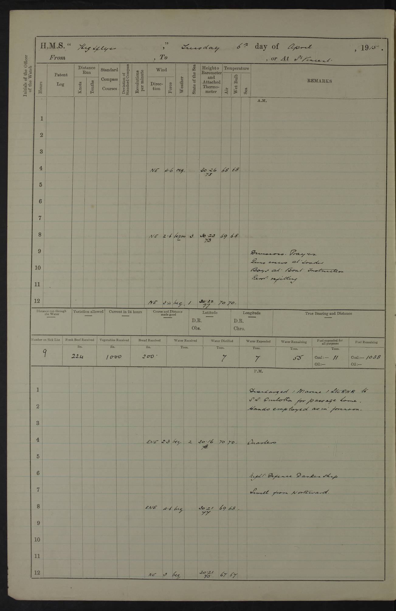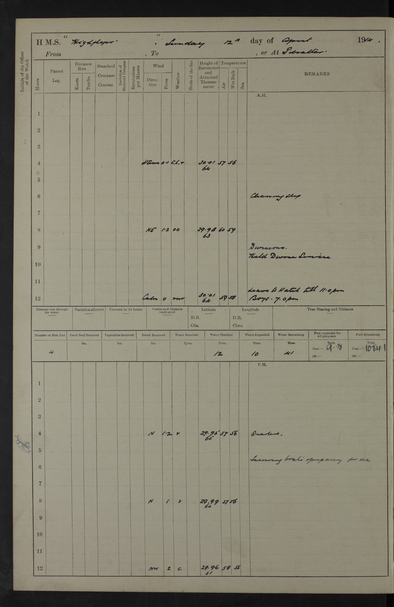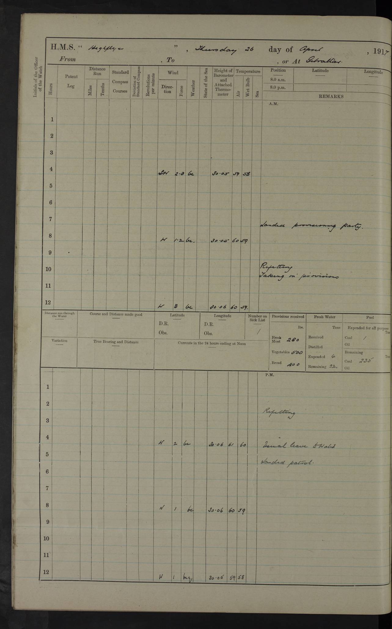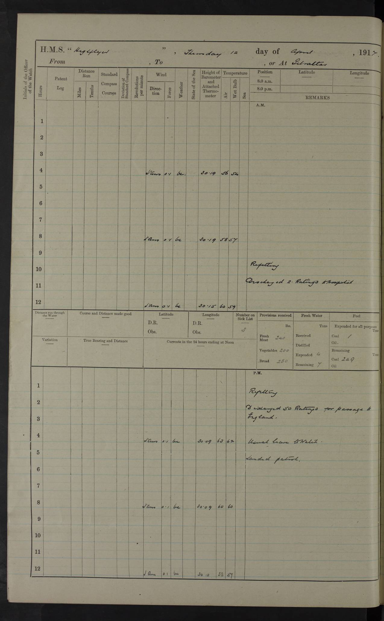 4ef4f325e53e0a0c91000969: (https://s3.amazonaws.com:443/oldweather/ADM53-44307/ADM 53-44307-181_0.jpg) [Blank page.] LOGS FOR APRIL 1917 4ef4f325e53e0a0c9100096a: (https://s3.amazonaws.com:443/oldweather/ADM53-44307/ADM 53-44307-181_1.jpg) 4ef4f325e53e0a0c9100096b: (https://s3.amazonaws.com:443/oldweather/ADM53-44307/ADM 53-44307-182_0.jpg) 4ef4f325e53e0a0c9100096c: (https://s3.amazonaws.com:443/oldweather/ADM53-44307/ADM 53-44307-182_1.jpg) 4ef4f325e53e0a0c9100096d: (https://s3.amazonaws.com:443/oldweather/ADM53-44307/ADM 53-44307-183_0.jpg) 4ef4f325e53e0a0c9100096e: (https://s3.amazonaws.com:443/oldweather/ADM53-44307/ADM 53-44307-183_1.jpg) 1 April 1917 Gibraltar Lat 36.1, Long -5.3 9.00am: Church parties landed. 4.30pm: Landed patrol. 4ef4f325e53e0a0c9100096f: (https://s3.amazonaws.com:443/oldweather/ADM53-44307/ADM 53-44307-184_0.jpg) 2 April 1917 Gibraltar Lat 36.1, Long -5.3 10.00am: Discharged 1 Rating to hospital. 1.00pm: Eng. Lieut. Burt left ship for passage to England. 2.00pm: 1 Stoker PO left ship. 4ef4f325e53e0a0c91000970: (https://s3.amazonaws.com:443/oldweather/ADM53-44307/ADM 53-44307-184_1.jpg) 3 April 1917 Gibraltar Lat 36.1, Long -5.3 9.00am: 25 Ratings joined from SUTLEJ. 10.00am: Discharged 4 Ratings to hospital. 4.00pm: 4 Ratings rejoined from hospital. 4ef4f325e53e0a0c91000971: (https://s3.amazonaws.com:443/oldweather/ADM53-44307/ADM 53-44307-185_0.jpg) 4 April 1917 Gibraltar Lat 36.1, Long -5.3 Refitting. 11.00am: Discharged 3 Ratings to hospital. 5.30pm: 1 Stoker joined from CORMORANT. 4ef4f325e53e0a0c91000972: (https://s3.amazonaws.com:443/oldweather/ADM53-44307/ADM 53-44307-185_1.jpg) 5 April 1917 Gibraltar Lat 36.1, Long -5.3 Refitting. 10.30am: Discharged 1 Stoker Rating to hospital. 4.30pm: Landed patrol. 5.00pm: 2 Ratings returned from hospital. 4ef4f325e53e0a0c91000973: (https://s3.amazonaws.com:443/oldweather/ADM53-44307/ADM 53-44307-186_0.jpg) 6 April 1917 Gibraltar Lat 36.1, Long -5.3 9.00am: Landed church parties. 10.00am: Discharged 1 Rating to hospital. 5.30pm: Landed patrol. 4ef4f325e53e0a0c91000974: (https://s3.amazonaws.com:443/oldweather/ADM53-44307/ADM 53-44307-186_1.jpg) 7 April 1917 Gibraltar Lat 36.1, Long -5.3 9.00am: Hands sweeping down dock. 2.00pm: 2 Sig. Ratings discharged for duty ashore. 4.00pm: Landed patrol. 4ef4f325e53e0a0c91000975: (https://s3.amazonaws.com:443/oldweather/ADM53-44307/ADM 53-44307-187_0.jpg) 8 April 1917 Gibraltar Lat 36.1, Long -5.3 9.30am: Landed church parties. 4ef4f325e53e0a0c91000976: (https://s3.amazonaws.com:443/oldweather/ADM53-44307/ADM 53-44307-187_1.jpg) 9 April 1917 Gibraltar Lat 36.1, Long -5.3 Refitting and as requisite. 5.30pm: Landed patrol. 4ef4f325e53e0a0c91000977: (https://s3.amazonaws.com:443/oldweather/ADM53-44307/ADM 53-44307-188_0.jpg) 10 April 1917 Gibraltar Lat 36.1, Long -5.3 Refitting. 4.30pm: Landed patrol. 5.00pm: 4 Ratings rejoined from hospital. 4ef4f325e53e0a0c91000978: (https://s3.amazonaws.com:443/oldweather/ADM53-44307/ADM 53-44307-188_1.jpg) 11 April 1917 Gibraltar Lat 36.1, Long -5.3 12.30pm: Read Warrant No 91. 2.00pm: Discharged 116 Ratings for passage to England. 4.00pm: 4 Ratings rejoined from hospital. 4ef4f325e53e0a0c91000979: (https://s3.amazonaws.com:443/oldweather/ADM53-44307/ADM 53-44307-189_0.jpg) 12 April 1917 Gibraltar Lat 36.1, Long -5.3 Refitting. 2.00pm: Discharged 50 Ratings for passage to England. 4ef4f325e53e0a0c9100097a: (https://s3.amazonaws.com:443/oldweather/ADM53-44307/ADM 53-44307-189_1.jpg) 13 April 1917 Gibraltar Lat 36.1, Long -5.3 Refitting. 5.00pm: Landed patrol. 4ef4f325e53e0a0c9100097b: (https://s3.amazonaws.com:443/oldweather/ADM53-44307/ADM 53-44307-190_0.jpg) 14 April 1917 Gibraltar Lat 36.1, Long -5.3 Refitting. 5.00pm: Landed patrol. 4ef4f325e53e0a0c9100097c: (https://s3.amazonaws.com:443/oldweather/ADM53-44307/ADM 53-44307-190_1.jpg) 15 April 1917 Gibraltar Lat 36.1, Long -5.3 8.30am: Landed church parties. 4.00pm: Landed patrol. 4ef4f325e53e0a0c9100097d: (https://s3.amazonaws.com:443/oldweather/ADM53-44307/ADM 53-44307-191_0.jpg) 16 April 1917 Gibraltar Lat 36.1, Long -5.3 Refitting. 5.00pm: Landed patrol. 4ef4f325e53e0a0c9100097e: (https://s3.amazonaws.com:443/oldweather/ADM53-44307/ADM 53-44307-191_1.jpg) 17 April 1917 Gibraltar Lat 36.1, Long -5.3 Refitting 4.00pm: 2 Ratings rejoined from hospital. 4ef4f326e53e0a0c9100097f: (https://s3.amazonaws.com:443/oldweather/ADM53-44307/ADM 53-44307-192_0.jpg) 18 April 1917 Gibraltar Lat 36.1, Long -5.3 Refitting. 4.00pm: 2 Ratings rejoined from hospital. 4.30pm: Landed patrol. 4ef4f326e53e0a0c91000980: (https://s3.amazonaws.com:443/oldweather/ADM53-44307/ADM 53-44307-192_1.jpg) 19 April 1917 Gibraltar Lat 36.1, Long -5.3 6.30am: Discharged 101 Ratings for passage to England. 9.00am: Flooded dock. 2.30pm: Shipping 6” guns. 5.00pm: Landed patrol. 4ef4f326e53e0a0c91000981: (https://s3.amazonaws.com:443/oldweather/ADM53-44307/ADM 53-44307-193_0.jpg) 20 April 1917 Gibraltar Lat 36.1, Long -5.3 Refitting. Party painting boats in dockyard. 4.00pm: Read Warrants Nos 92, 93. 4ef4f326e53e0a0c91000982: (https://s3.amazonaws.com:443/oldweather/ADM53-44307/ADM 53-44307-193_1.jpg) 21 April 1917 Gibraltar Lat 36.1, Long -5.3 2.00pm: 320 Ratings joined ship. Recommissioned (partial) ship. 4.00pm: Sent working party to LEASOWE CASTLE. 4.30pm: 11 Ratings joined ship from hospital. 4ef4f326e53e0a0c91000983: (https://s3.amazonaws.com:443/oldweather/ADM53-44307/ADM 53-44307-194_0.jpg) 22 April 1917 Gibraltar Lat 36.1, Long -5.3 9.00am: Landed church parties. 12.30pm: 49 Ratings left ship for passage to England. 4ef4f326e53e0a0c91000984: (https://s3.amazonaws.com:443/oldweather/ADM53-44307/ADM 53-44307-194_1.jpg) 23 April 1917 Gibraltar Lat 36.1, Long -5.3 9.00am: Medical inspection. 1.00pm: 12 Ratings discharged to Depot. 4ef4f326e53e0a0c91000985: (https://s3.amazonaws.com:443/oldweather/ADM53-44307/ADM 53-44307-195_0.jpg) 24 April 1917 Gibraltar Lat 36.1, Long -5.3 1.00pm: 1 Rating discharged for passage to England