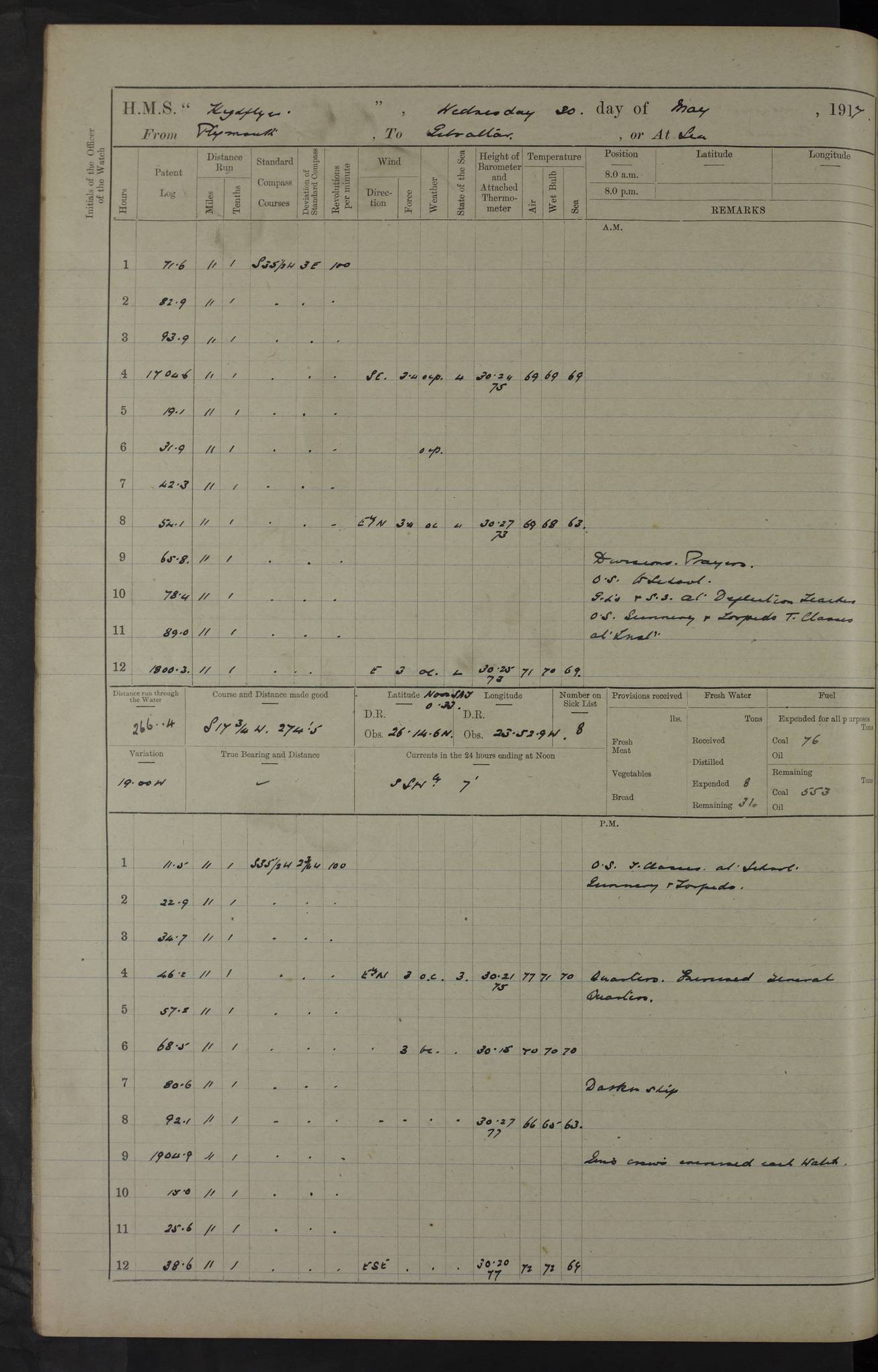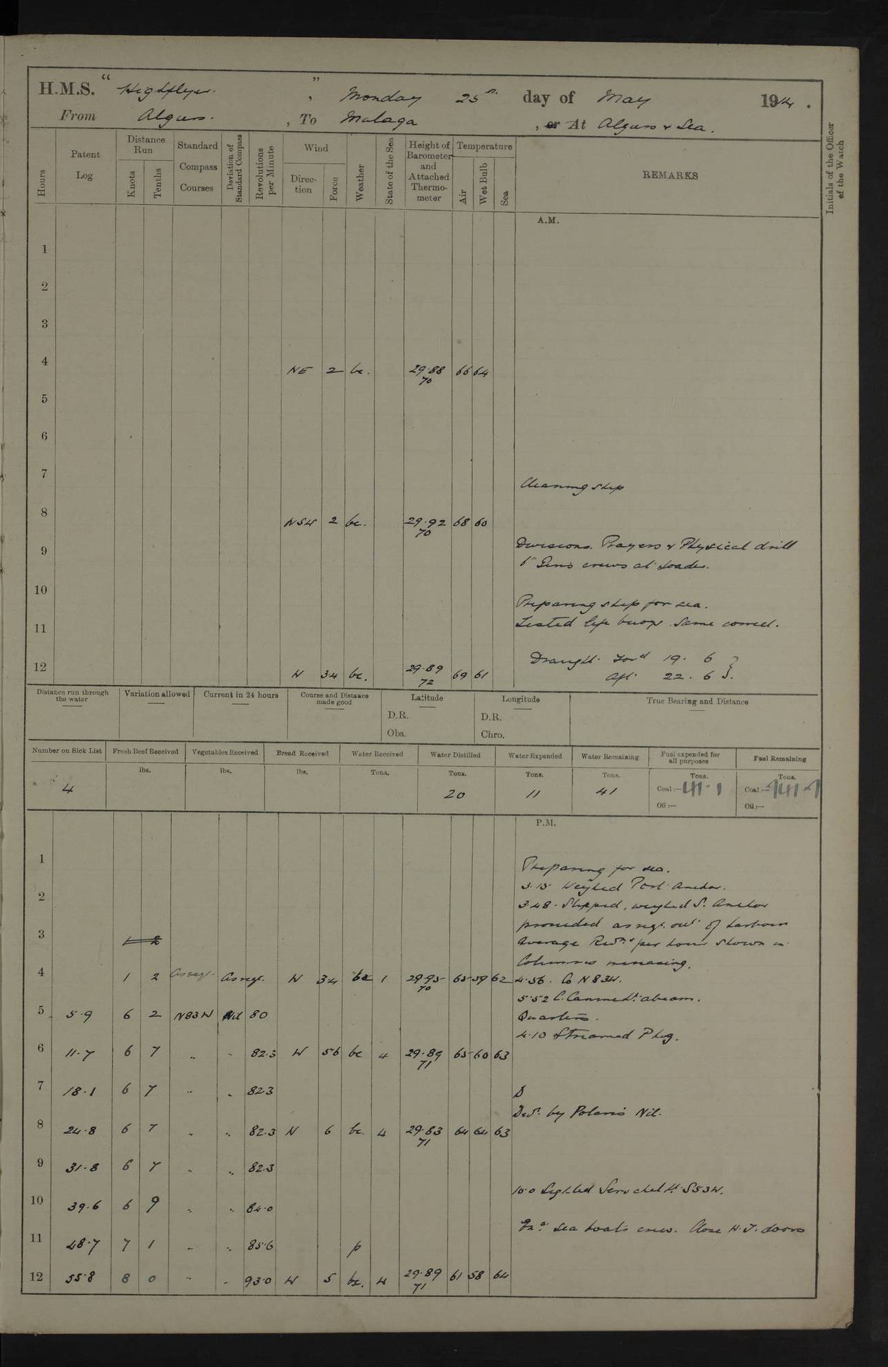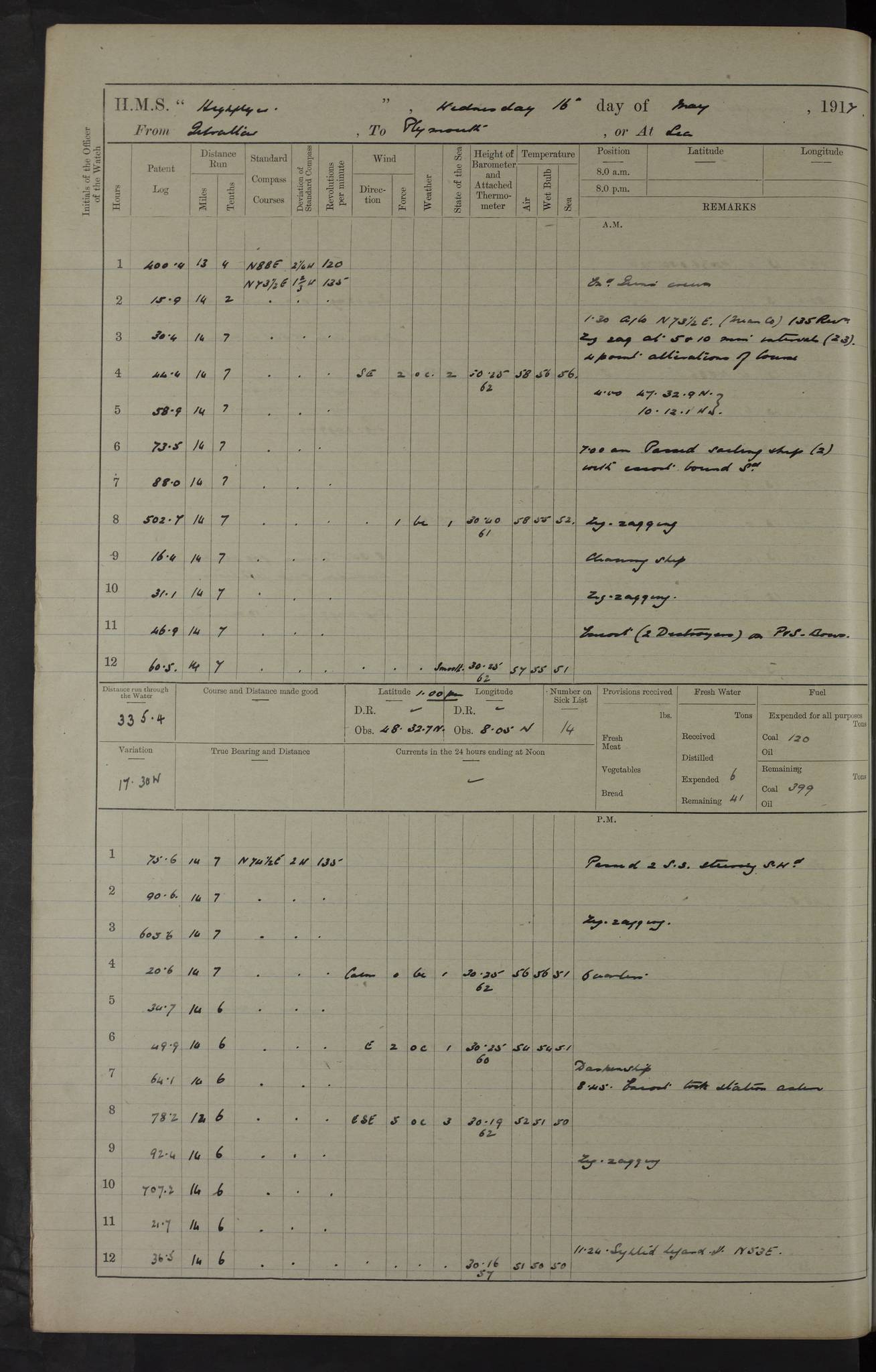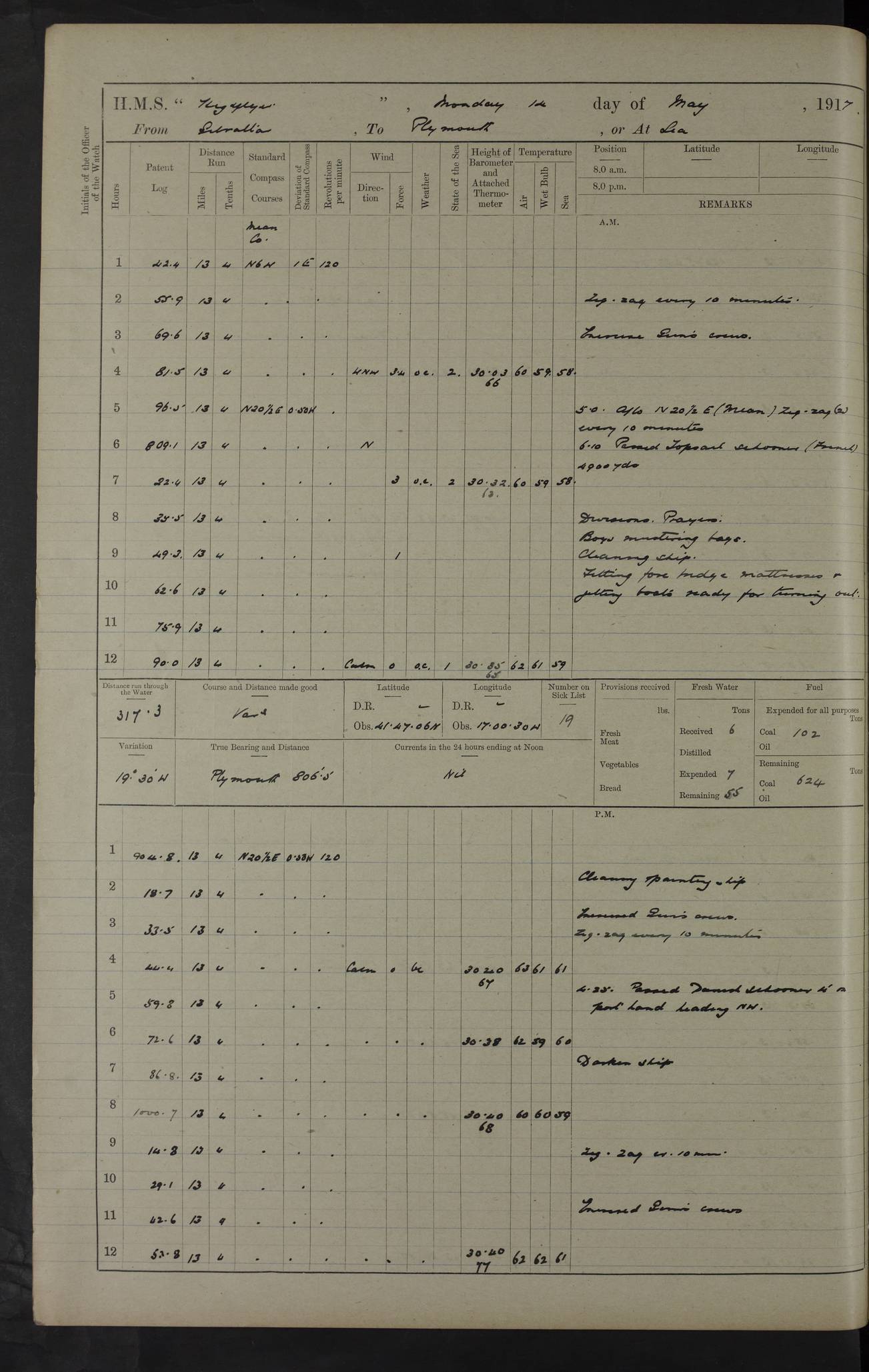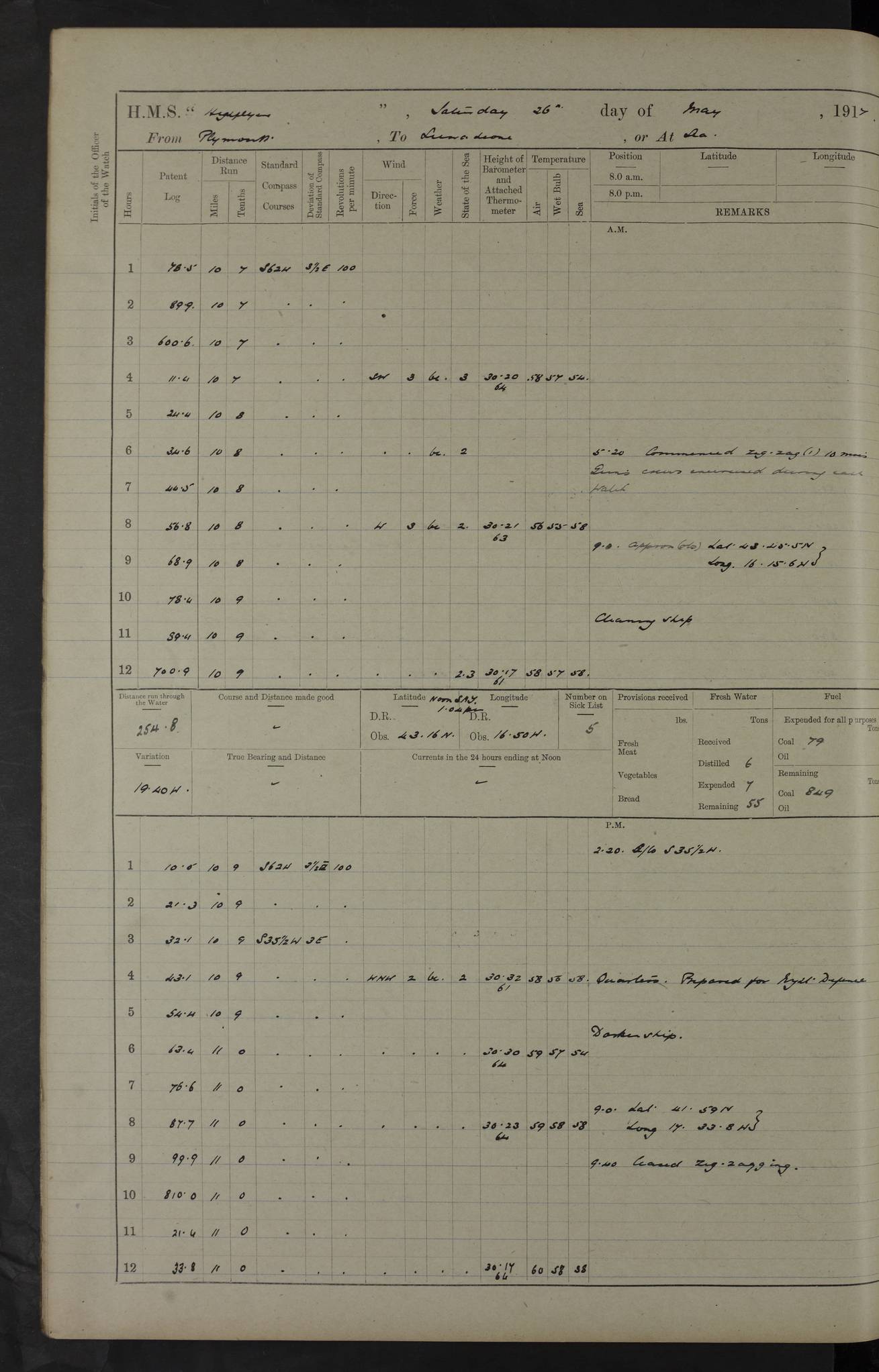 4f961044a2fc8e2def000549: (http://s3.amazonaws.com/oldweather/ADM53-44291/ADM 53-44291-152_0.jpg) 6 April 1914 Tangier to Gibraltar Lat 35.8, Long -5.8 1.39pm: Proceeded N30E. 4.25pm: As requisite for entering harbour S entrance and securing alongside detached mole. 4f961044a2fc8e2def00054a: (http://s3.amazonaws.com/oldweather/ADM53-44291/ADM 53-44291-152_1.jpg) 7 April 1914 Gibraltar Lat 36.1, Long -5.3 Preparing for coaling. 4f961044a2fc8e2def00054b: (http://s3.amazonaws.com/oldweather/ADM53-44291/ADM 53-44291-153_0.jpg) 8 April 1914 Gibraltar Lat 36.1, Long -5.3 6.55am: Commenced coaling. 11.40am: Finished coaling; received 400 tons 4f961045a2fc8e2def00054c: (http://s3.amazonaws.com/oldweather/ADM53-44291/ADM 53-44291-153_1.jpg) 9 April 1914 Gibraltar Lat 36.1, Long -5.3 Party with Carpenter. Remainder painting ship’s side. 4f961045a2fc8e2def00054d: (http://s3.amazonaws.com/oldweather/ADM53-44291/ADM 53-44291-154_0.jpg) 10 April 1914 Gibraltar Lat 36.1, Long -5.3 Landed church parties. 4f961045a2fc8e2def00054e: (http://s3.amazonaws.com/oldweather/ADM53-44291/ADM 53-44291-154_1.jpg) 11 April 1914 Gibraltar Lat 36.1, Long -5.3 Cleaning ship. 4f961046a2fc8e2def00054f: (http://s3.amazonaws.com/oldweather/ADM53-44291/ADM 53-44291-155_0.jpg) 12 April 1914 Gibraltar Lat 36.1, Long -5.3 Securing boats and preparing for sea. 4f961046a2fc8e2def000550: (http://s3.amazonaws.com/oldweather/ADM53-44291/ADM 53-44291-155_1.jpg) 13 April 1914 Gibraltar to Villefranche Lat 36.2, Long -4.5 7.45am: Slipped and proceeded. Course and speed out of S entrance and for rounding Europa Point 8.50am: Submarines B 26, 27 carried out attack. 9.55pm: Cape de Gata abeam, 8’. 4f961046a2fc8e2def000551: (http://s3.amazonaws.com/oldweather/ADM53-44291/ADM 53-44291-156_0.jpg) 14 April 1914 Gibraltar to Villefranche Lat 38.2, Long 0.12 5.31pm: Cape Antonio abeam3.32’. 4f961047a2fc8e2def000552: (http://s3.amazonaws.com/oldweather/ADM53-44291/ADM 53-44291-156_1.jpg) 15 April 1914 Gibraltar to Villefranche Lat 41.3, Long 4.4 9.00am: Dropped target. Carried out sub calibre practice. 4f961047a2fc8e2def000553: (http://s3.amazonaws.com/oldweather/ADM53-44291/ADM 53-44291-157_0.jpg) 16 April 1914 Gibraltar to Villefranche Lat 43.7033, Long 7.3126 3.01am: Cape Camaral Lt. abeam N46W. 6.50am: Course as requisite for entering harbour. 7.20am: Secured to No 2 buoy. 3.00pm: Fired salute of 7 guns. 4f961047a2fc8e2def000554: (http://s3.amazonaws.com/oldweather/ADM53-44291/ADM 53-44291-157_1.jpg) 17 April 1914 Villefranche Lat 43.7033, Long 7.3126 9.00am: Monsieur Le Prefect des Alpes Maritimes visited ship. 9.30am: Fired salute of 7 guns. 4f961048a2fc8e2def000555: (http://s3.amazonaws.com/oldweather/ADM53-44291/ADM 53-44291-158_0.jpg) 18 April 1914 Villefranche Lat 43.7033, Long 7.3126 10.00am: Col. Commanding Forces visited ship. 12.30pm: Mayor of Nice visited ship 4f961048a2fc8e2def000556: (http://s3.amazonaws.com/oldweather/ADM53-44291/ADM 53-44291-158_1.jpg) 19 April 1914 Villefranche Lat 43.7033, Long 7.3126 Visited French destroyer. Call returned. 4f961048a2fc8e2def000557: (http://s3.amazonaws.com/oldweather/ADM53-44291/ADM 53-44291-159_0.jpg) 20 April 1914 Villefranche Lat 43.7033, Long 7.3126 12.30pm: French cruiser JEANNE D’ARC arrived. 4f961049a2fc8e2def000558: (http://s3.amazonaws.com/oldweather/ADM53-44291/ADM 53-44291-159_1.jpg) 21 April 1914 Villefranche Lat 43.7033, Long 7.3126 Refitting, painting and as requisite. 4f961049a2fc8e2def000559: (http://s3.amazonaws.com/oldweather/ADM53-44291/ADM 53-44291-160_0.jpg) 22 April 1914 Villefranche Lat 43.7033, Long 7.3126 Training class at seamanship instruction. 4f961049a2fc8e2def00055a: (http://s3.amazonaws.com/oldweather/ADM53-44291/ADM 53-44291-160_1.jpg) 23 April 1914 Villefranche Lat 43.7033, Long 7.3126 Boats’ crews cleaning out boats. 4f96104aa2fc8e2def00055b: (http://s3.amazonaws.com/oldweather/ADM53-44291/ADM 53-44291-161_0.jpg) 24 April 1914 Villefranche to Leghorn Lat 43.6, Long 8.7 6.05am: Slipped and proceeded. Course as requisite out of harbour. 5.06pm: Gorgona Id. abeam4.75’. 7.07pm: Set P and S anchors. 4f96104aa2fc8e2def00055c: (http://s3.amazonaws.com/oldweather/ADM53-44291/ADM 53-44291-161_1.jpg) 25 April 1914 Leghorn Lat 43.6, Long 10.3 Cleaning ship. 4f96104aa2fc8e2def00055d: (http://s3.amazonaws.com/oldweather/ADM53-44291/ADM 53-44291-162_0.jpg) 26 April 1914 Leghorn Lat 43.6, Long 10.3 9.00am: Visited Italian destroyer. 4f96104aa2fc8e2def00055e: (http://s3.amazonaws.com/oldweather/ADM53-44291/ADM 53-44291-162_1.jpg) 27 April 1914 Leghorn Lat 43.6, Long 10.3 Hands employed as requisite. 4f96104ba2fc8e2def00055f: (http://s3.amazonaws.com/oldweather/ADM53-44291/ADM 53-44291-163_0.jpg) 28 April 1914 Leghorn to Port Ferraio, Elba and Naples Lat 43.1, Long 10.3 9.10am: Slipped. Weighed both anchors. As requisite leaving harbour. 1.35pm: Stopped. Let go PB [port bower] in 7 fathoms. 3.00pm: Landed British Consul. 5.14pm: Proceeded N35E. 4f96104ba2fc8e2def000560: (http://s3.amazonaws.com/oldweather/ADM53-44291/ADM 53-44291-163_1.jpg) 29 April 1914 Leghorn via Point Ferraio to Naples Lat 40.9, Long 13.8 8.31am: Cape Circeo abeam. 2.45pm: Let go both anchors. Secured with stern to San Vincenzo Mole at C berth. 4f96104ba2fc8e2def000561: (http://s3.amazonaws.com/oldweather/ADM53-44291/ADM 53-44291-164_0.jpg) 30 April 1914 Naples Lat 40.8308, Long 14.2879 Italian RA visited ship. LOGS FOR MAY 1914 4f96104ca2fc8e2def000562: (http://s3.amazonaws.com/oldweather/ADM53-44291/ADM 53-44291-164_1.jpg) 1 May 1914 Naples Lat 40.8308, Long 14.2879 Cleaning out boats. 4f96104ca2fc8e2def000563: (http://s3.amazonaws.com/oldweather/ADM53-44291/ADM 53-44291-165_0.jpg) 2 May 1914 Naples Lat 40.8308, Long 14.2879 Cleaning ship. Fired salute 15 guns. 4f96104ca2fc8e2def000564: (http://s3.amazonaws.com/oldweather/ADM53-44291/ADM 53-44291-165_1.jpg) 3 May 1914 Naples Lat 40.8308, Long 14.2879 Cleaning ship. 4f96104da2fc8e2def000565: (http://s3.amazonaws.com/oldweather/ADM53-44291/