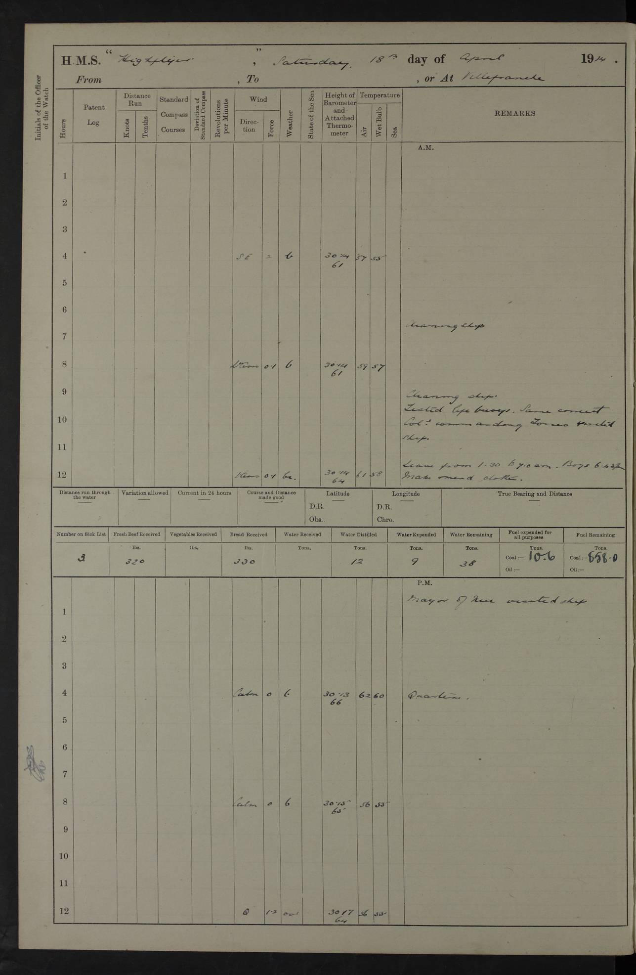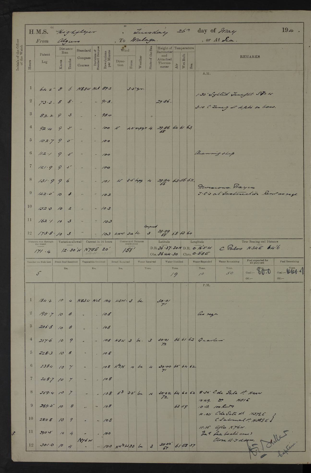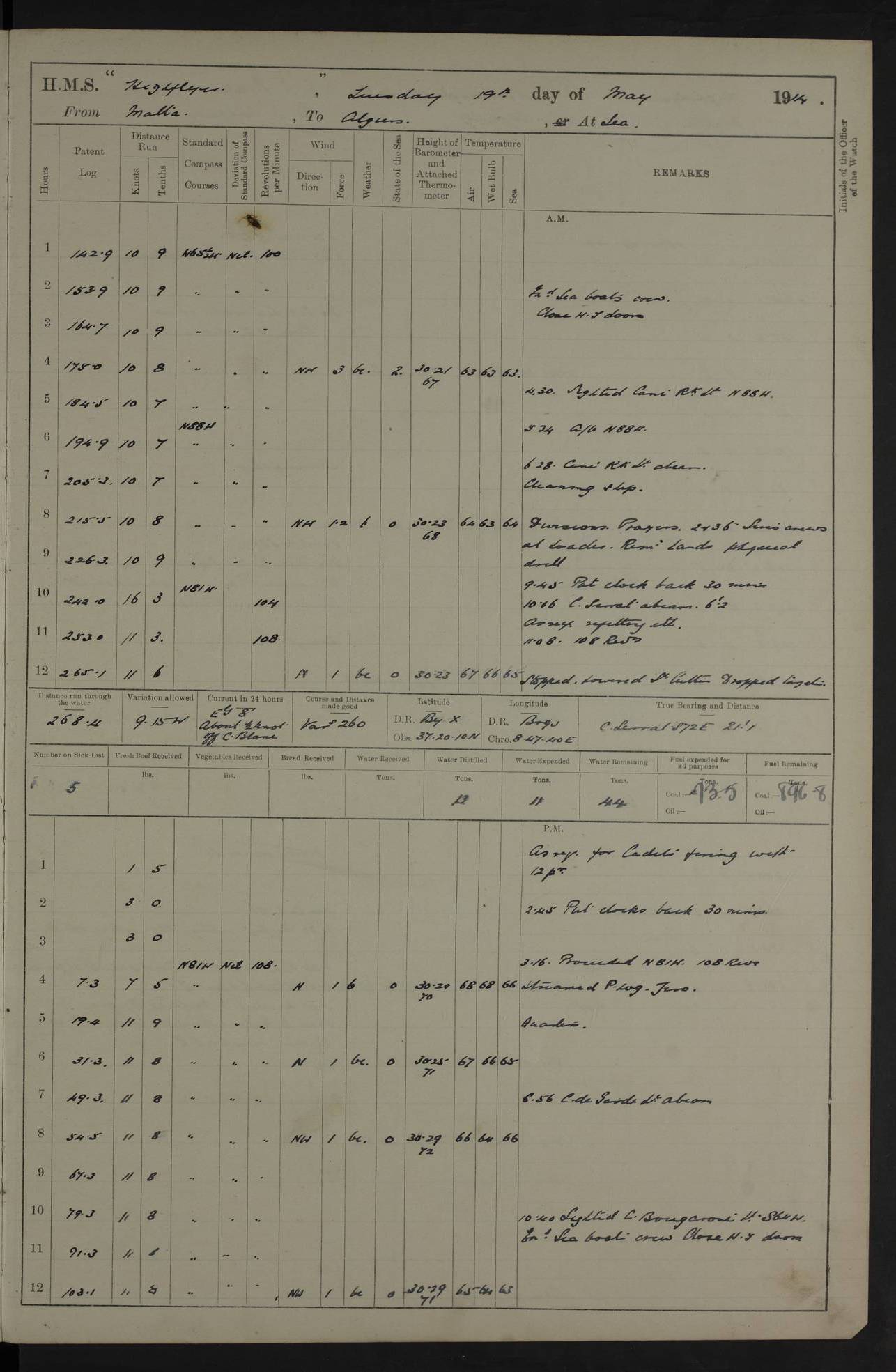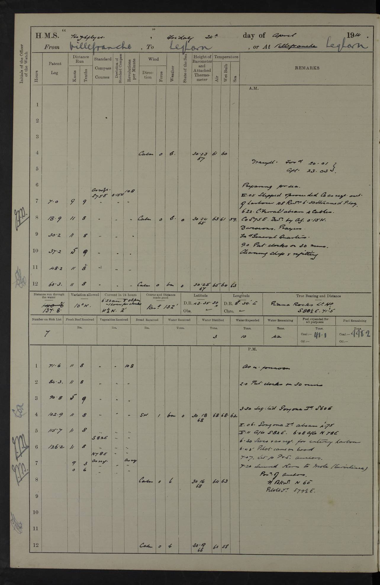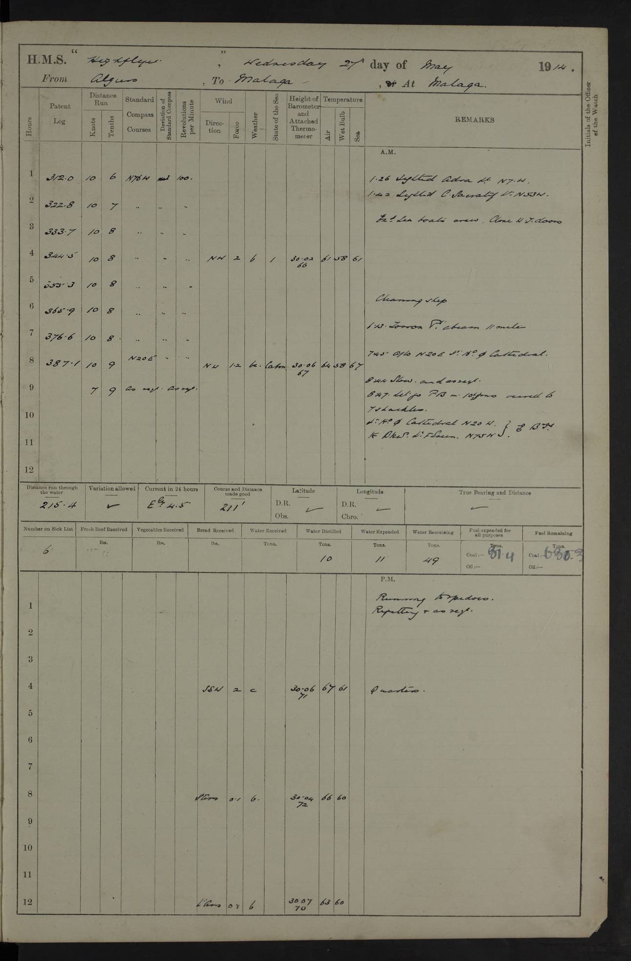 4f961044a2fc8e2def000549: (http://s3.amazonaws.com/oldweather/ADM53-44291/ADM 53-44291-152_0.jpg) 6 April 1914 Tangier to Gibraltar Lat 35.8, Long -5.8 1.39pm: Proceeded N30E. 4.25pm: As requisite for entering harbour S entrance and securing alongside detached mole. 4f961044a2fc8e2def00054a: (http://s3.amazonaws.com/oldweather/ADM53-44291/ADM 53-44291-152_1.jpg) 7 April 1914 Gibraltar Lat 36.1, Long -5.3 Preparing for coaling. 4f961044a2fc8e2def00054b: (http://s3.amazonaws.com/oldweather/ADM53-44291/ADM 53-44291-153_0.jpg) 8 April 1914 Gibraltar Lat 36.1, Long -5.3 6.55am: Commenced coaling. 11.40am: Finished coaling; received 400 tons 4f961045a2fc8e2def00054c: (http://s3.amazonaws.com/oldweather/ADM53-44291/ADM 53-44291-153_1.jpg) 9 April 1914 Gibraltar Lat 36.1, Long -5.3 Party with Carpenter. Remainder painting ship’s side. 4f961045a2fc8e2def00054d: (http://s3.amazonaws.com/oldweather/ADM53-44291/ADM 53-44291-154_0.jpg) 10 April 1914 Gibraltar Lat 36.1, Long -5.3 Landed church parties. 4f961045a2fc8e2def00054e: (http://s3.amazonaws.com/oldweather/ADM53-44291/ADM 53-44291-154_1.jpg) 11 April 1914 Gibraltar Lat 36.1, Long -5.3 Cleaning ship. 4f961046a2fc8e2def00054f: (http://s3.amazonaws.com/oldweather/ADM53-44291/ADM 53-44291-155_0.jpg) 12 April 1914 Gibraltar Lat 36.1, Long -5.3 Securing boats and preparing for sea. 4f961046a2fc8e2def000550: (http://s3.amazonaws.com/oldweather/ADM53-44291/ADM 53-44291-155_1.jpg) 13 April 1914 Gibraltar to Villefranche Lat 36.2, Long -4.5 7.45am: Slipped and proceeded. Course and speed out of S entrance and for rounding Europa Point 8.50am: Submarines B 26, 27 carried out attack. 9.55pm: Cape de Gata abeam, 8’. 4f961046a2fc8e2def000551: (http://s3.amazonaws.com/oldweather/ADM53-44291/ADM 53-44291-156_0.jpg) 14 April 1914 Gibraltar to Villefranche Lat 38.2, Long 0.12 5.31pm: Cape Antonio abeam3.32’. 4f961047a2fc8e2def000552: (http://s3.amazonaws.com/oldweather/ADM53-44291/ADM 53-44291-156_1.jpg) 15 April 1914 Gibraltar to Villefranche Lat 41.3, Long 4.4 9.00am: Dropped target. Carried out sub calibre practice. 4f961047a2fc8e2def000553: (http://s3.amazonaws.com/oldweather/ADM53-44291/ADM 53-44291-157_0.jpg) 16 April 1914 Gibraltar to Villefranche Lat 43.7033, Long 7.3126 3.01am: Cape Camaral Lt. abeam N46W. 6.50am: Course as requisite for entering harbour. 7.20am: Secured to No 2 buoy. 3.00pm: Fired salute of 7 guns. 4f961047a2fc8e2def000554: (http://s3.amazonaws.com/oldweather/ADM53-44291/ADM 53-44291-157_1.jpg) 17 April 1914 Villefranche Lat 43.7033, Long 7.3126 9.00am: Monsieur Le Prefect des Alpes Maritimes visited ship. 9.30am: Fired salute of 7 guns. 4f961048a2fc8e2def000555: (http://s3.amazonaws.com/oldweather/ADM53-44291/ADM 53-44291-158_0.jpg) 18 April 1914 Villefranche Lat 43.7033, Long 7.3126 10.00am: Col. Commanding Forces visited ship. 12.30pm: Mayor of Nice visited ship 4f961048a2fc8e2def000556: (http://s3.amazonaws.com/oldweather/ADM53-44291/ADM 53-44291-158_1.jpg) 19 April 1914 Villefranche Lat 43.7033, Long 7.3126 Visited French destroyer. Call returned. 4f961048a2fc8e2def000557: (http://s3.amazonaws.com/oldweather/ADM53-44291/ADM 53-44291-159_0.jpg) 20 April 1914 Villefranche Lat 43.7033, Long 7.3126 12.30pm: French cruiser JEANNE D’ARC arrived. 4f961049a2fc8e2def000558: (http://s3.amazonaws.com/oldweather/ADM53-44291/ADM 53-44291-159_1.jpg) 21 April 1914 Villefranche Lat 43.7033, Long 7.3126 Refitting, painting and as requisite. 4f961049a2fc8e2def000559: (http://s3.amazonaws.com/oldweather/ADM53-44291/ADM 53-44291-160_0.jpg) 22 April 1914 Villefranche Lat 43.7033, Long 7.3126 Training class at seamanship instruction. 4f961049a2fc8e2def00055a: (http://s3.amazonaws.com/oldweather/ADM53-44291/ADM 53-44291-160_1.jpg) 23 April 1914 Villefranche Lat 43.7033, Long 7.3126 Boats’ crews cleaning out boats. 4f96104aa2fc8e2def00055b: (http://s3.amazonaws.com/oldweather/ADM53-44291/ADM 53-44291-161_0.jpg) 24 April 1914 Villefranche to Leghorn Lat 43.6, Long 8.7 6.05am: Slipped and proceeded. Course as requisite out of harbour. 5.06pm: Gorgona Id. abeam4.75’. 7.07pm: Set P and S anchors. 4f96104aa2fc8e2def00055c: (http://s3.amazonaws.com/oldweather/ADM53-44291/ADM 53-44291-161_1.jpg) 25 April 1914 Leghorn Lat 43.6, Long 10.3 Cleaning ship. 4f96104aa2fc8e2def00055d: (http://s3.amazonaws.com/oldweather/ADM53-44291/ADM 53-44291-162_0.jpg) 26 April 1914 Leghorn Lat 43.6, Long 10.3 9.00am: Visited Italian destroyer. 4f96104aa2fc8e2def00055e: (http://s3.amazonaws.com/oldweather/ADM53-44291/ADM 53-44291-162_1.jpg) 27 April 1914 Leghorn Lat 43.6, Long 10.3 Hands employed as requisite. 4f96104ba2fc8e2def00055f: (http://s3.amazonaws.com/oldweather/ADM53-44291/ADM 53-44291-163_0.jpg) 28 April 1914 Leghorn to Port Ferraio, Elba and Naples Lat 43.1, Long 10.3 9.10am: Slipped. Weighed both anchors. As requisite leaving harbour. 1.35pm: Stopped. Let go PB [port bower] in 7 fathoms. 3.00pm: Landed British Consul. 5.14pm: Proceeded N35E. 4f96104ba2fc8e2def000560: (http://s3.amazonaws.com/oldweather/ADM53-44291/ADM 53-44291-163_1.jpg) 29 April 1914 Leghorn via Point Ferraio to Naples Lat 40.9, Long 13.8 8.31am: Cape Circeo abeam. 2.45pm: Let go both anchors. Secured with stern to San Vincenzo Mole at C berth. 4f96104ba2fc8e2def000561: (http://s3.amazonaws.com/oldweather/ADM53-44291/ADM 53-44291-164_0.jpg) 30 April 1914 Naples Lat 40.8308, Long 14.2879 Italian RA visited ship. LOGS FOR MAY 1914 4f96104ca2fc8e2def000562: (http://s3.amazonaws.com/oldweather/ADM53-44291/ADM 53-44291-164_1.jpg) 1 May 1914 Naples Lat 40.8308, Long 14.2879 Cleaning out boats. 4f96104ca2fc8e2def000563: (http://s3.amazonaws.com/oldweather/ADM53-44291/ADM 53-44291-165_0.jpg) 2 May 1914 Naples Lat 40.8308, Long 14.2879 Cleaning ship. Fired salute 15 guns. 4f96104ca2fc8e2def000564: (http://s3.amazonaws.com/oldweather/ADM53-44291/ADM 53-44291-165_1.jpg) 3 May 1914 Naples Lat 40.8308, Long 14.2879 Cleaning ship. 4f96104da2fc8e2def000565: (http://s3.amazonaws.com/oldweather/ADM53-44291/