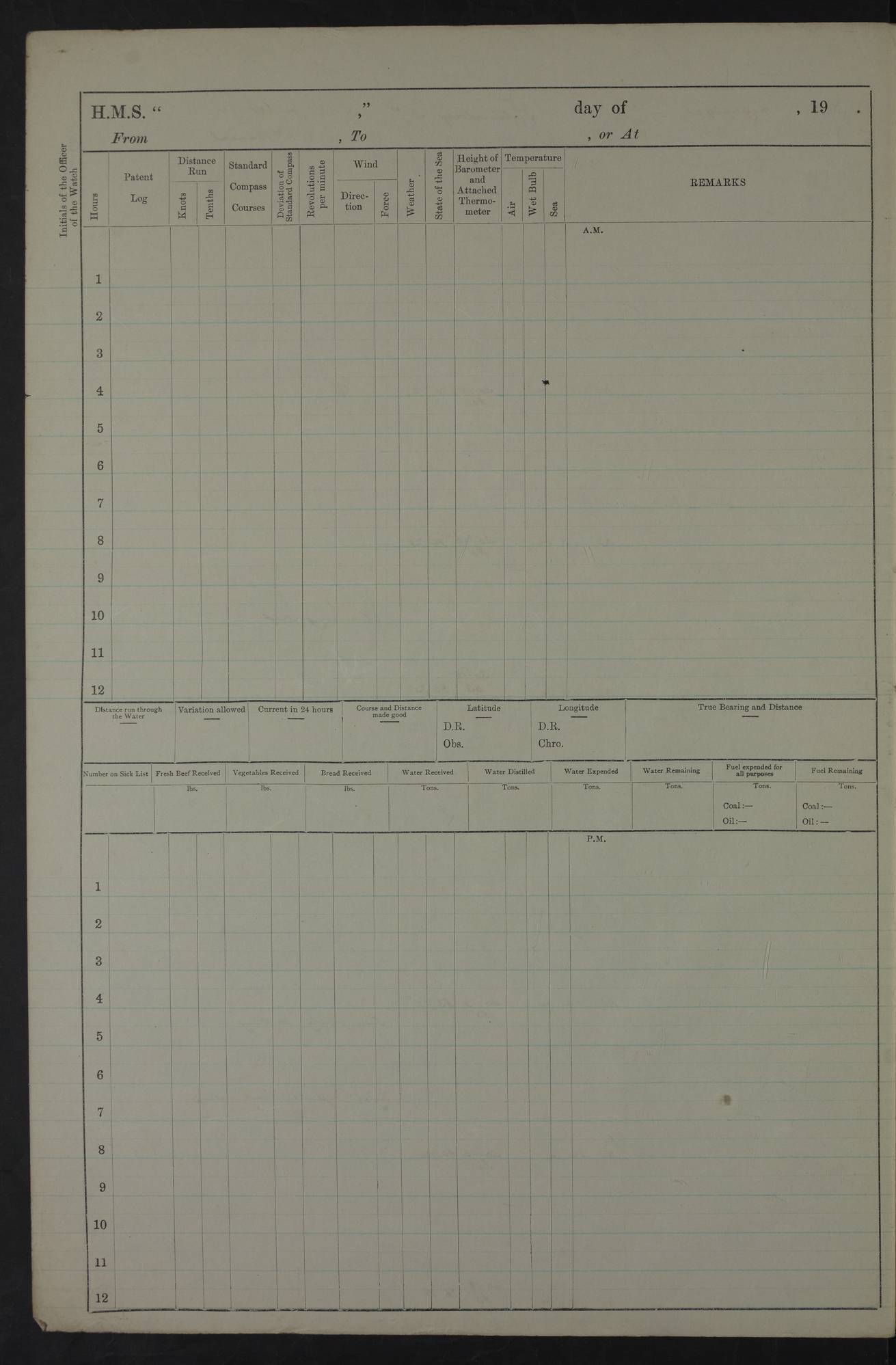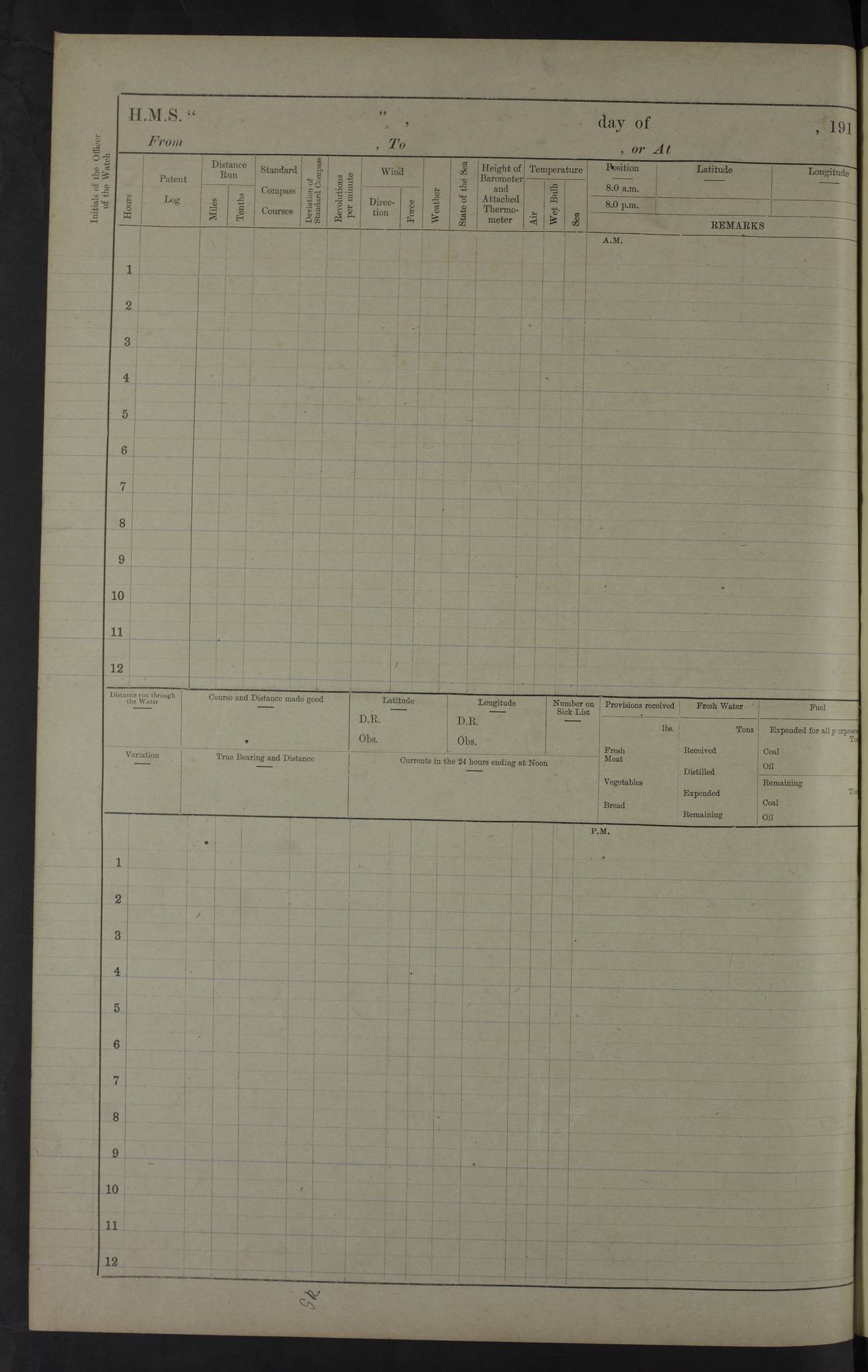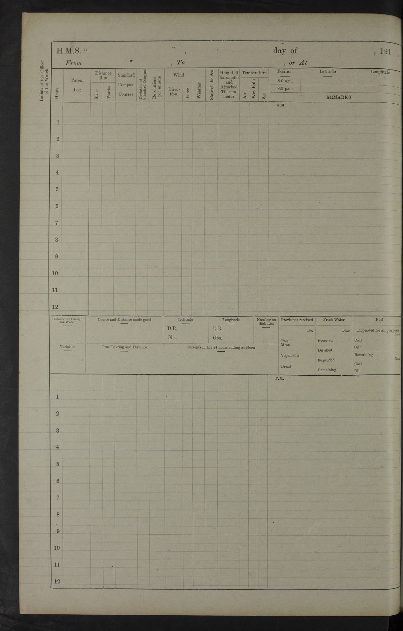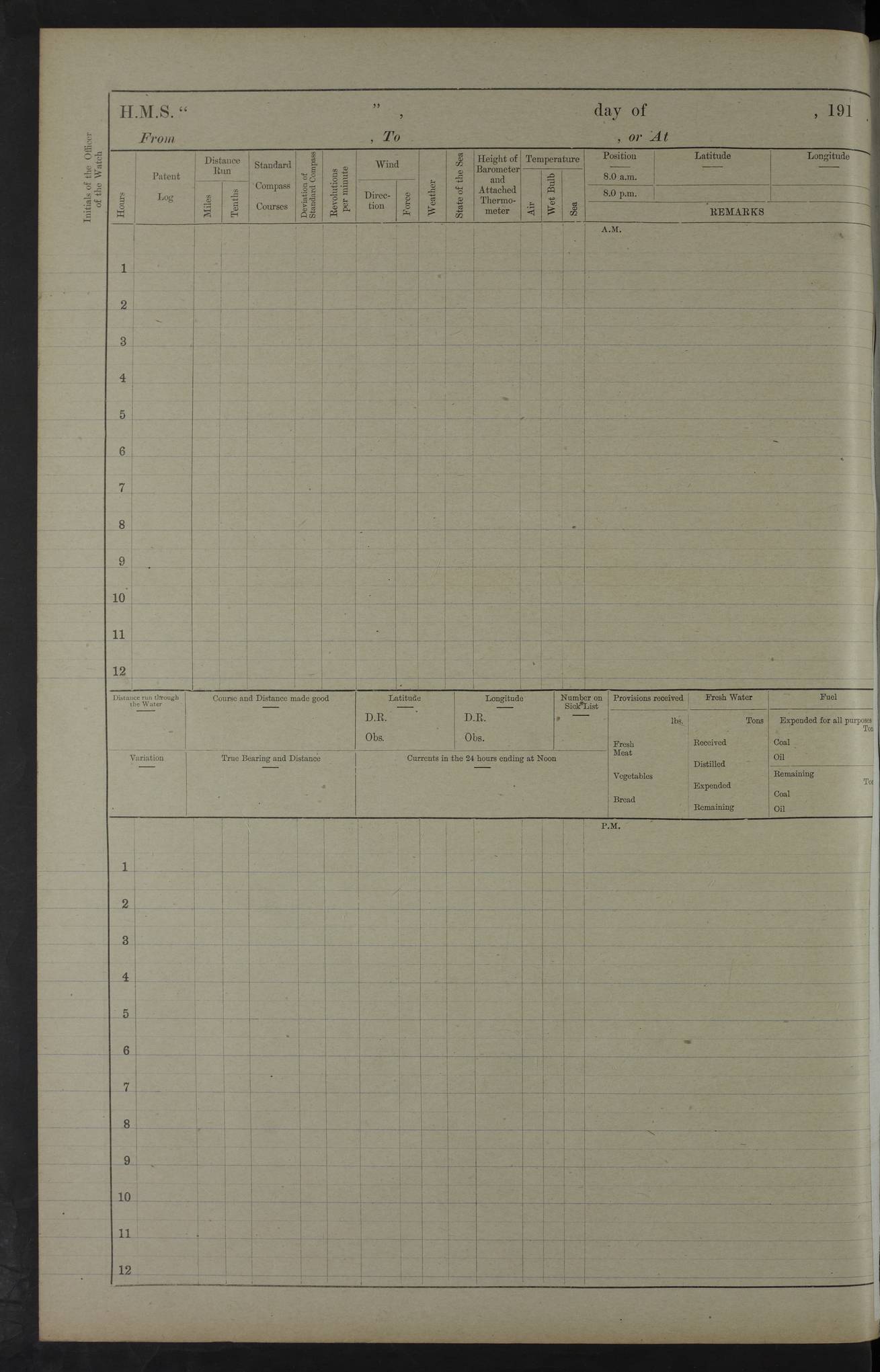 Notes: 1. Latitude/longitude, including for days in port, show representative decimal positions for each day, as calculated by the Old Weather project's analysis program. As such, they differ by varying amounts from the positions recorded, usually at noon, in the log pages. In addition, some latitudes/longitudes have been amended in edited logs for errors in the logs, for errors in identifying locations by the analysis program, or simply for greater accuracy. In all cases, refer to the log-page scans for the positions as originally recorded. Not all log pages contain this information and the ships' positions have therefore often been estimated. 2. Full account of any day is available by clicking on the link above that day. Groups of links refer to log book covers and introductory information; some may be blank. Editor’s notes: The editor’s additions are marked in italic. |