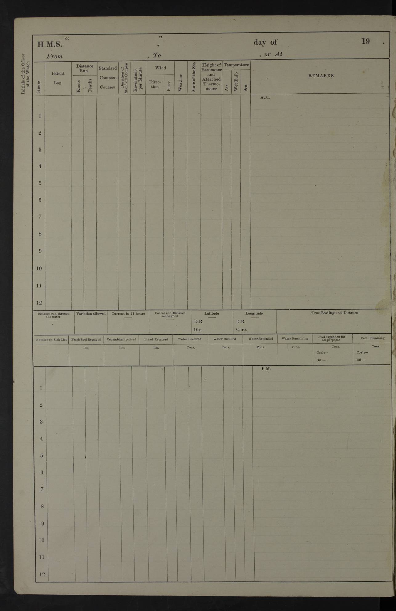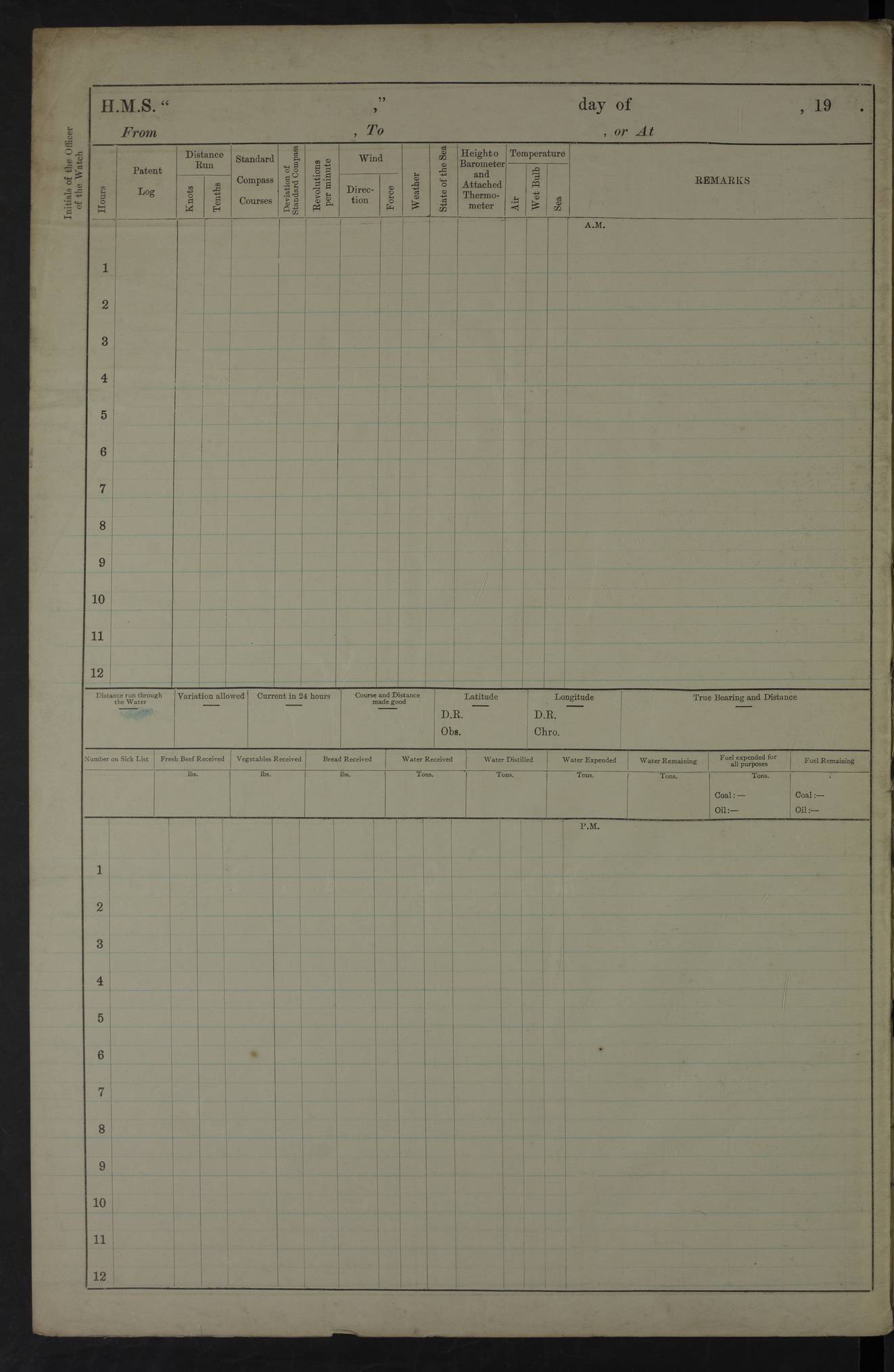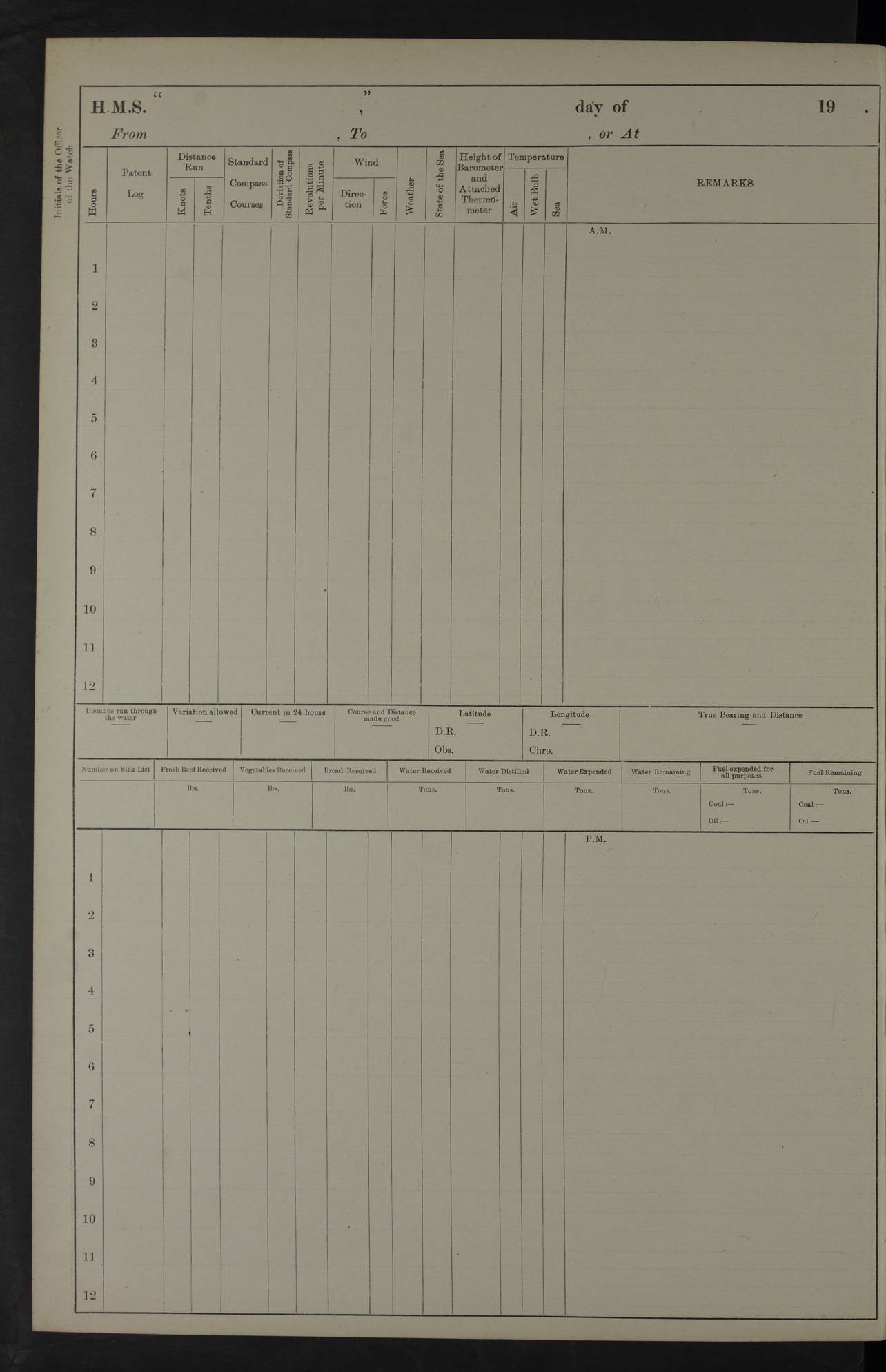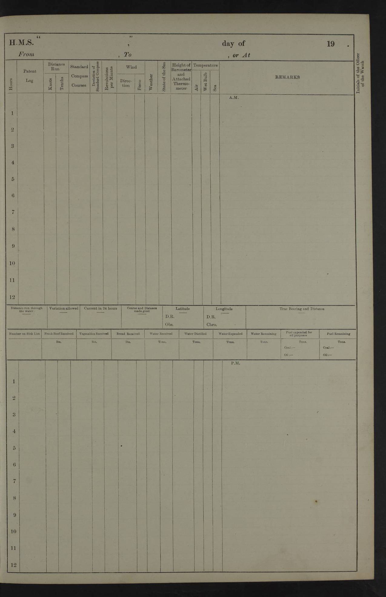 Notes: 1. Latitude/longitude, including for days in port, show representative decimal positions for each day, as calculated by the Old Weather project's analysis program. As such, they differ by varying amounts from the positions recorded, usually at noon, in the log pages. In addition, some latitudes/longitudes have been amended in edited logs for errors in the logs, for errors in identifying locations by the analysis program, or simply for greater accuracy. In all cases, refer to the log-page scans for the positions as originally recorded. Not all log pages contain this information and the ships' positions have therefore often been estimated. 2. Full account of any day is available by clicking on the link above that day. Groups of links refer to log book covers and introductory information; some may be blank. Editor’s notes: The editor’s additions are marked in italic. |