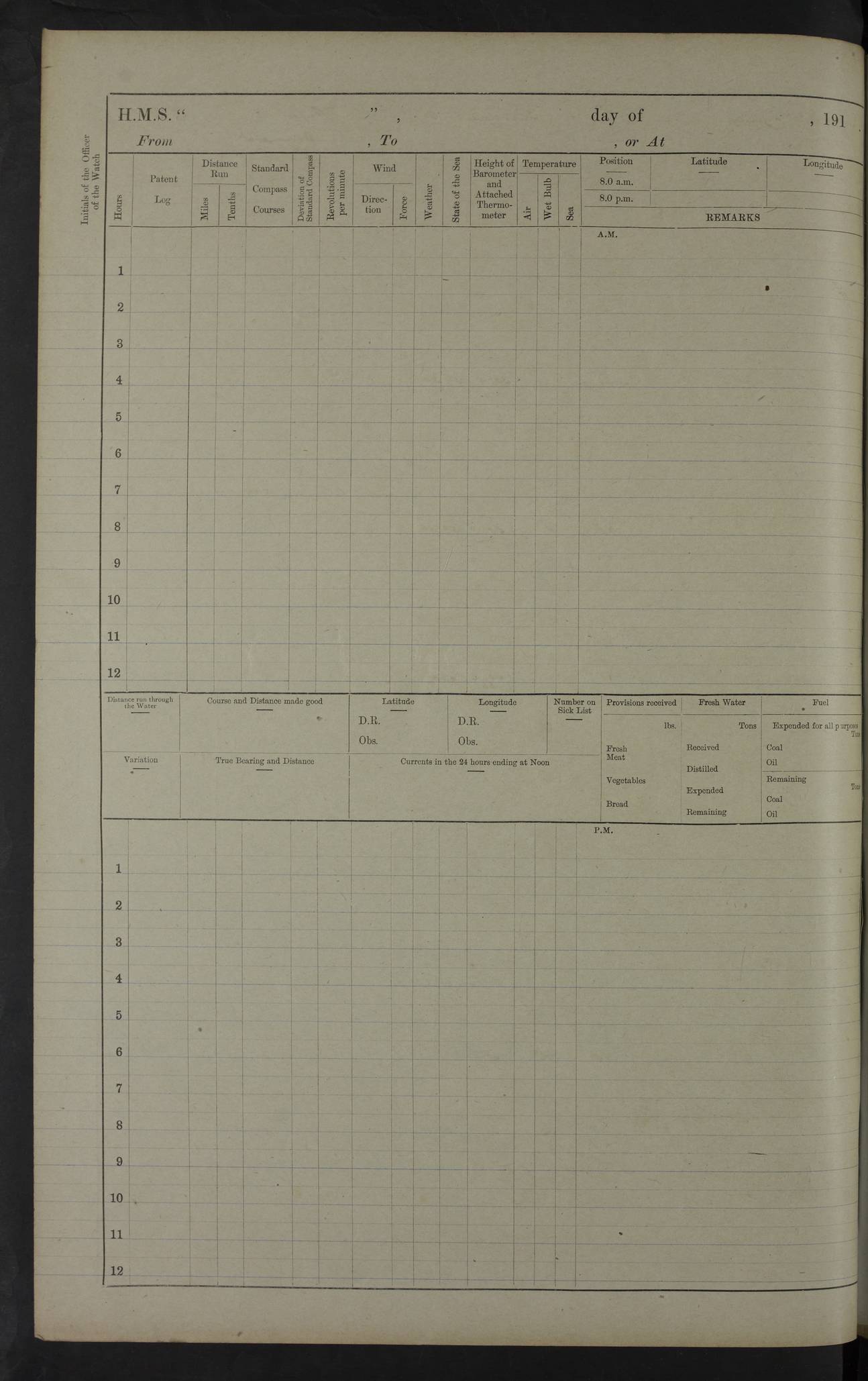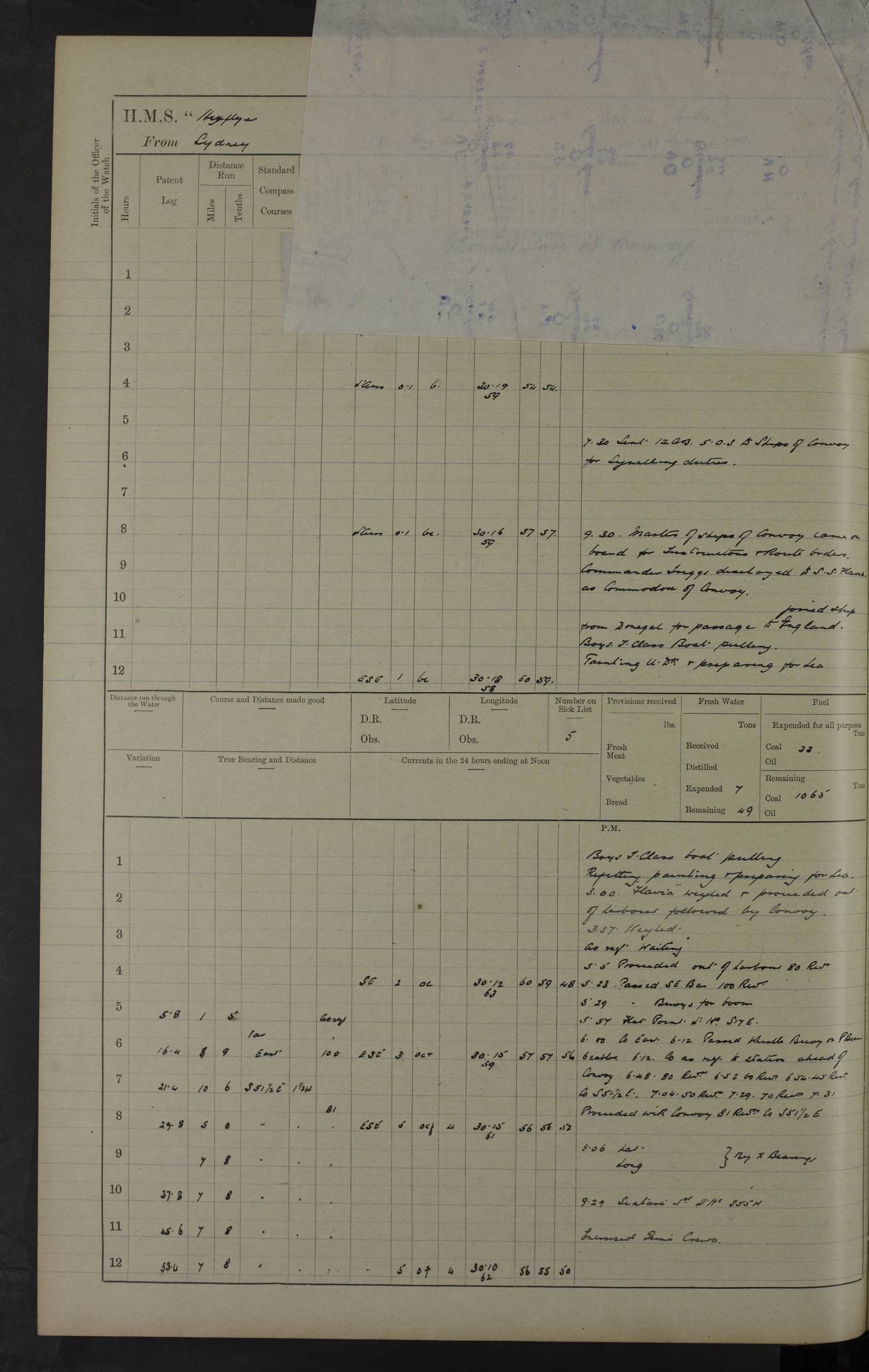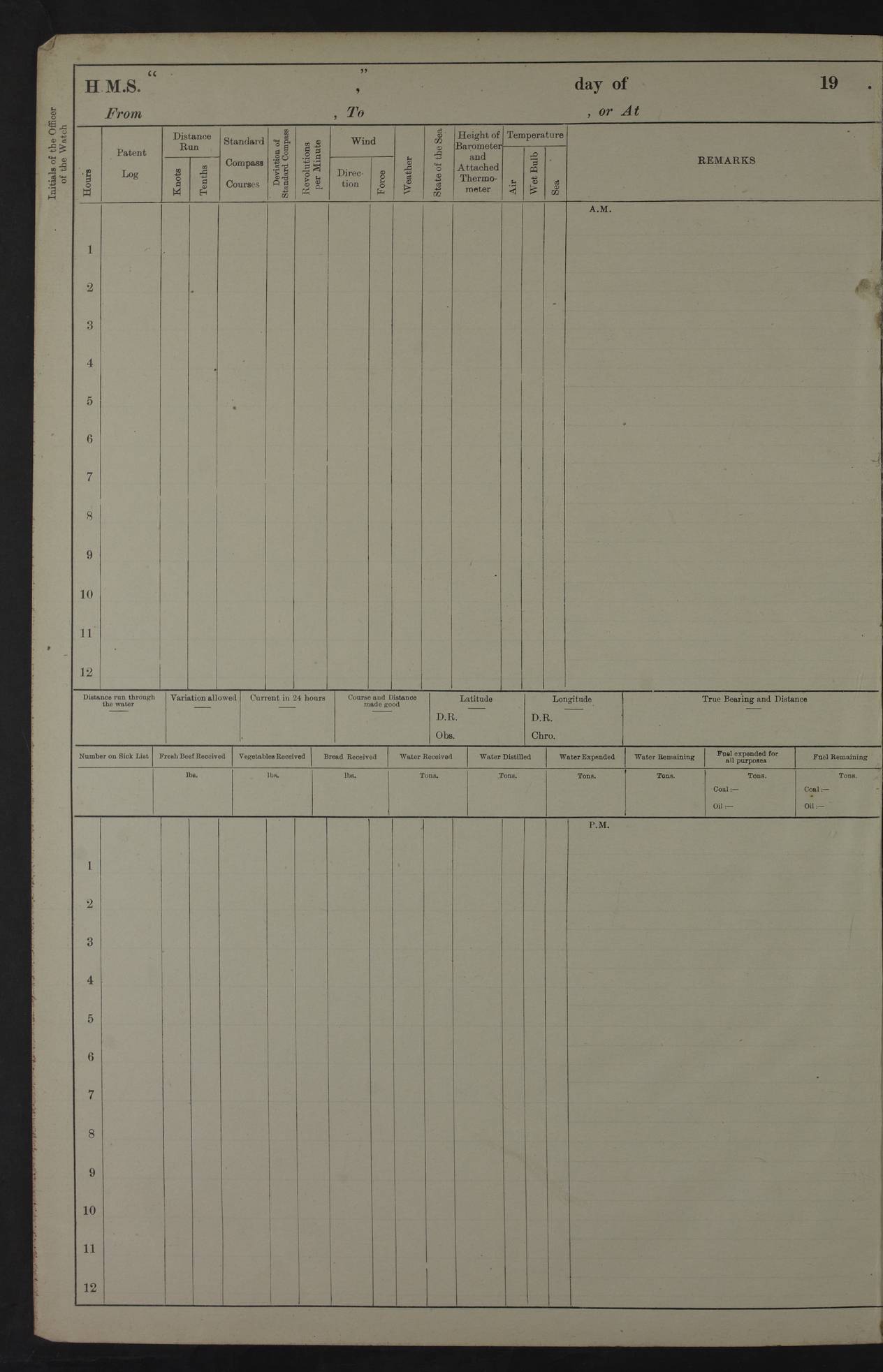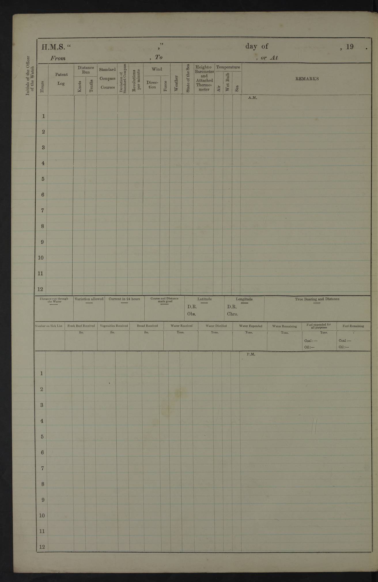 Notes: 1. Latitude/longitude, including for days in port, show representative decimal positions for each day, as calculated by the Old Weather project's analysis program. As such, they differ by varying amounts from the positions recorded, usually at noon, in the log pages. In addition, some latitudes/longitudes have been amended in edited logs for errors in the logs, for errors in identifying locations by the analysis program, or simply for greater accuracy. In all cases, refer to the log-page scans for the positions as originally recorded. Not all log pages contain this information and the ships' positions have therefore often been estimated. 2. Full account of any day is available by clicking on the link above that day. Groups of links refer to log book covers and introductory information; some may be blank. Editor’s notes: The editor’s additions are marked in italic. |